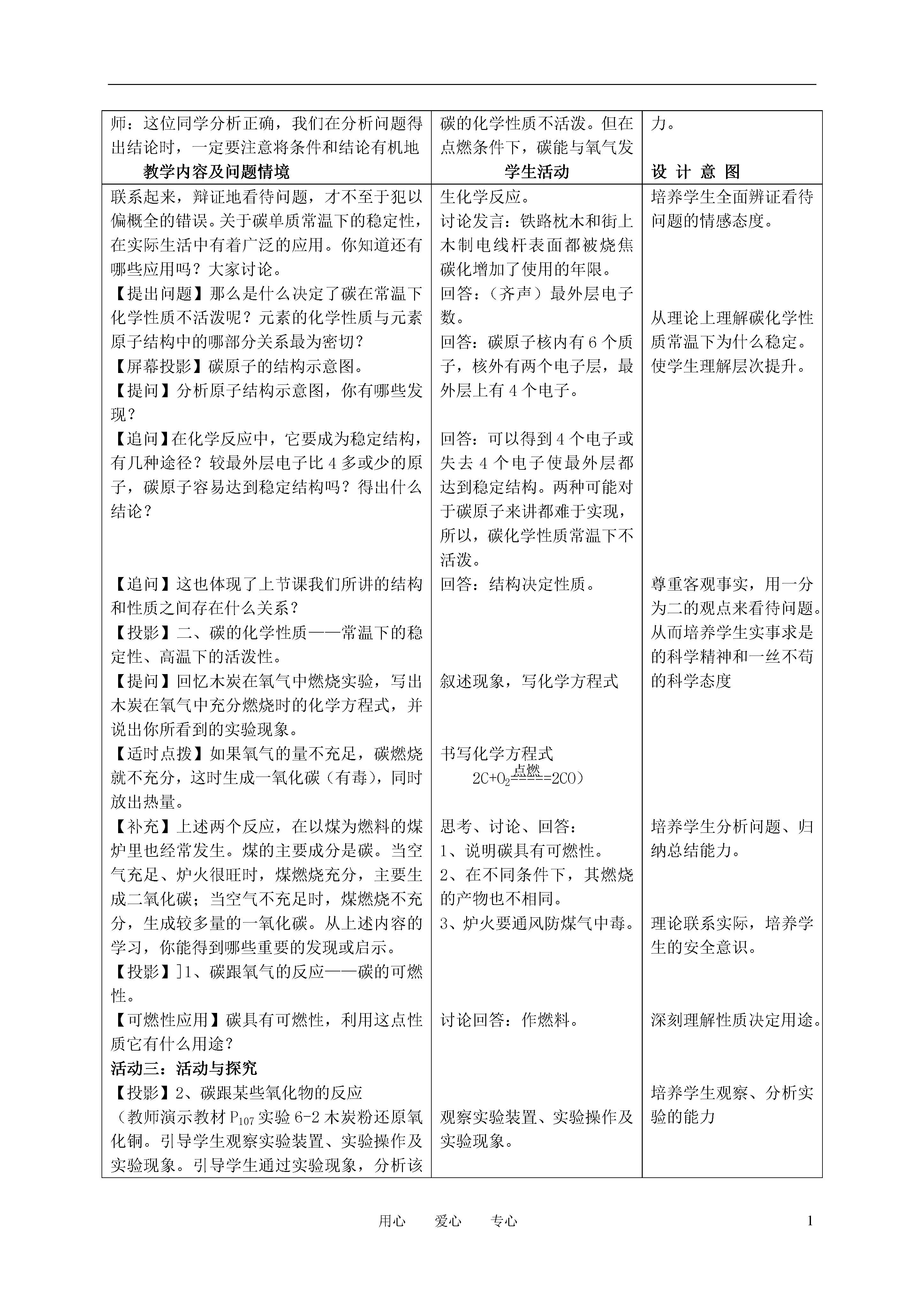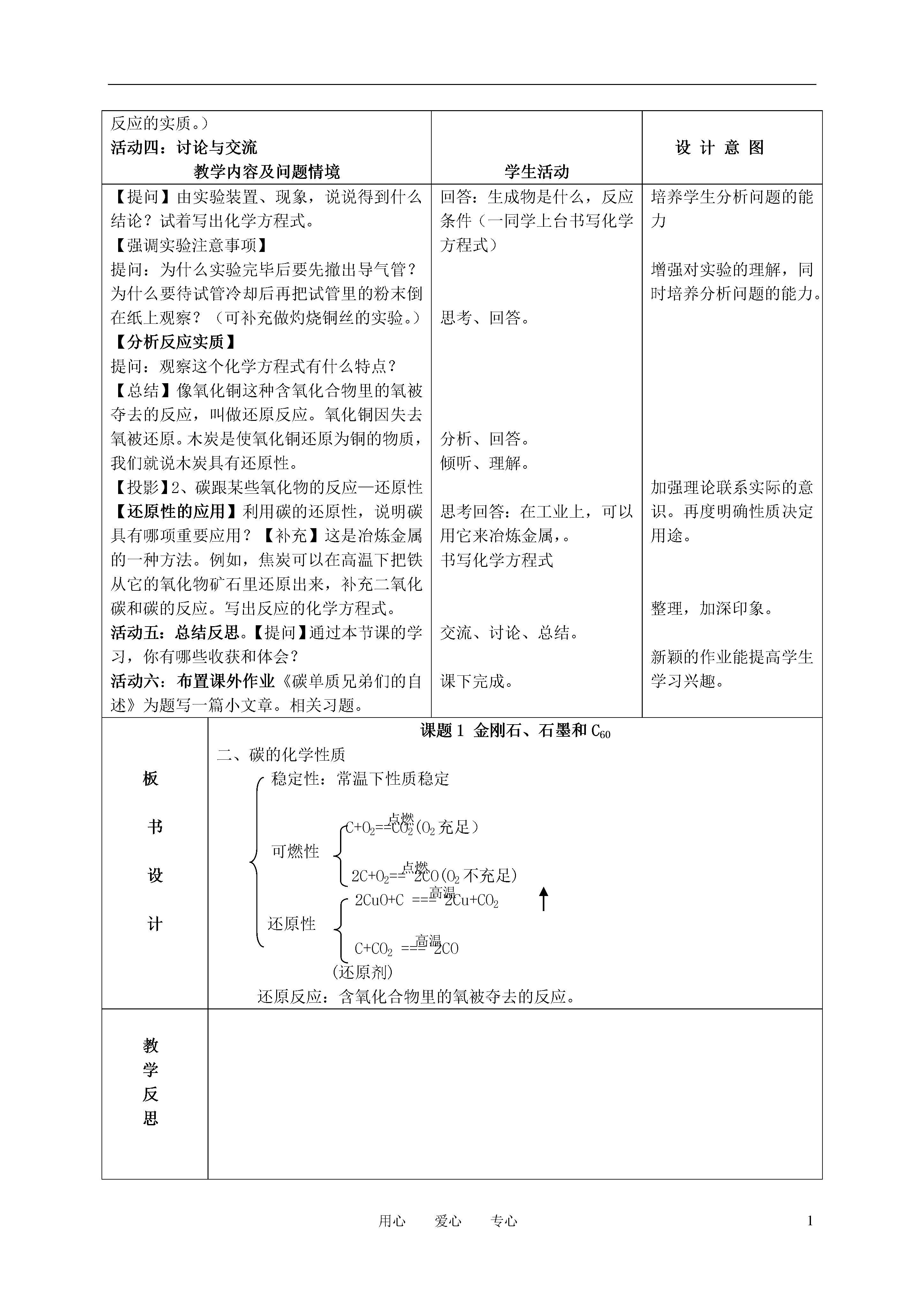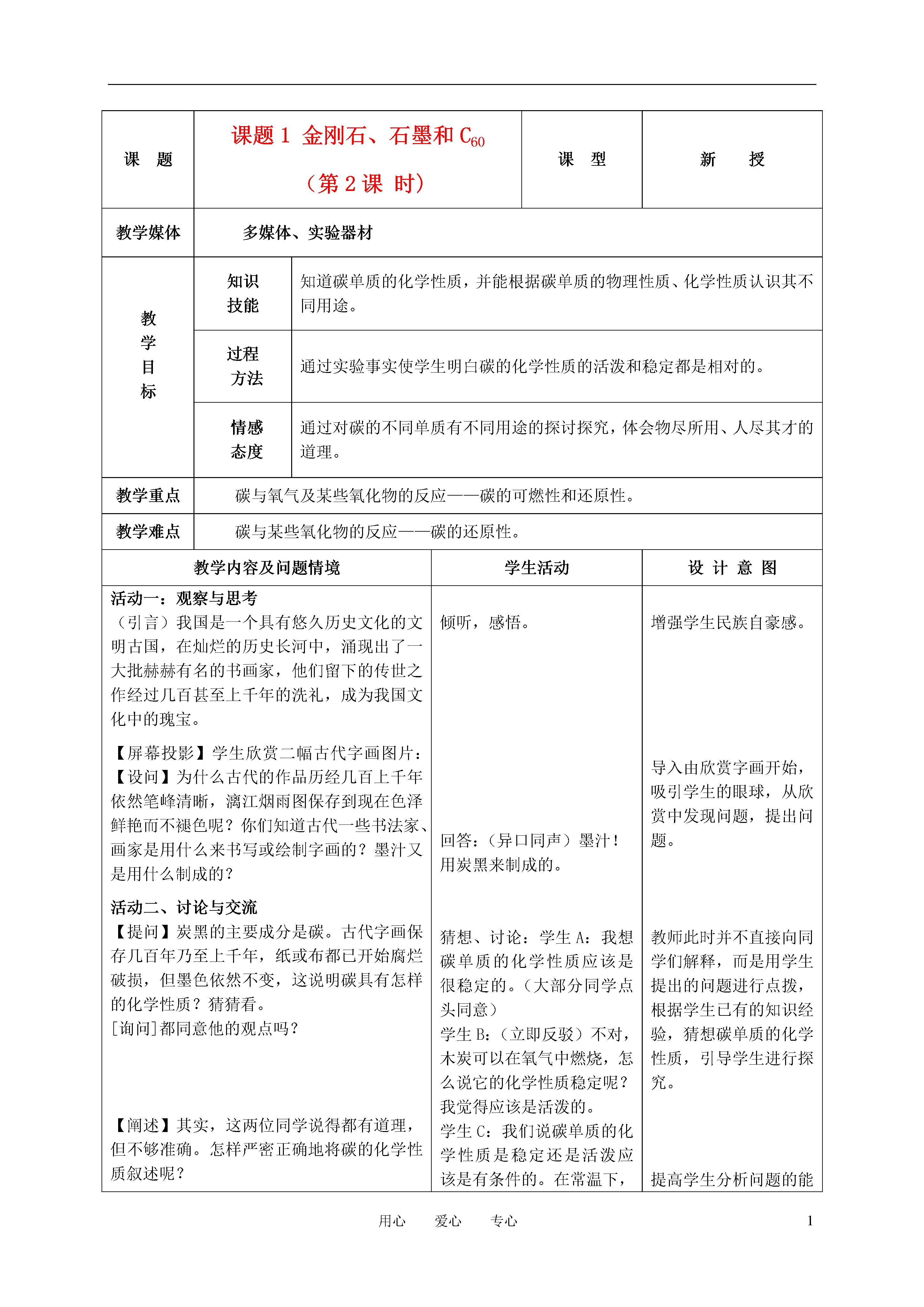 1用心爱心专心课题课题1金刚石、石墨和C60(第2课时)课型新授教学媒体多媒体、实验器材教学目标知识技能知道碳单质的化学性质,并能根据碳单质的物理性质、化学性质认识其不同用途。过程方法通过实验事实使学生明白碳的化学性质的活泼和稳定都是相对的。情感态度通过对碳的不同单质有不同用途的探讨探究,体会物尽所用、人尽其才的道理。教学重点碳与氧气及某些氧化物的反应——碳的可燃性和还原性。教学难点碳与某些氧化物的反应——碳的还原性。教学内容及问题情境学生活动设计意图活动一:观察与思考(引言)我国是一个具有悠久历史文化的文明古国,在灿烂的历史长河中,涌现出了一大批赫赫有名的书画家,他们留下的传世之作经过几百甚至上千年的洗礼,成为我国文化中的瑰宝。【屏幕投影】学生欣赏二幅古代字画图片:【设问】为什么古代的作品历经几百上千年依然笔峰清晰,漓江烟雨图保存到现在色泽鲜艳而不褪色呢?你们知道古代一些书法家、画家是用什么来书写或绘制字画的?墨汁又是用什么制成的?活动二、讨论与交流【提问】炭黑的主要成分是碳。古代字画保存几百年乃至上千年,纸或布都已开始腐烂破损,但墨色依然不变,这说明碳具有怎样的化学性质?猜猜看。[询问]都同意他的观点吗?【阐述】其实,这两位同学说得都有道理,但不够准确。怎样严密正确地将碳的化学性质叙述呢?师:这位同学分析正确,我们在分析问题得出结论时,一定要注意将条件和结论有机地教学内容及问题情境倾听,感悟。回答:(异口同声)墨汁!用炭黑来制成的。猜想、讨论:学生A:我想碳单质的化学性质应该是很稳定的。(大部分同学点头同意)学生B:(立即反驳)不对,木炭可以在氧气中燃烧,怎么说它的化学性质稳定呢?我觉得应该是活泼的。学生C:我们说碳单质的化学性质是稳定还是活泼应该是有条件的。在常温下,碳的化学性质不活泼。但在点燃条件下,碳能与氧气发学生活动增强学生民族自豪感。导入由欣赏字画开始,吸引学生的眼球,从欣赏中发现问题,提出问题。教师此时并不直接向同学们解释,而是用学生提出的问题进行点拨,根据学生已有的知识经验,猜想碳单质的化学性质,引导学生进行探究。提高学生分析问题的能力。设计意图联系起来,辩证地看待问题,才不至于犯以偏概全的错误。关于碳单质常温下的稳定性,在实际生活中有着广泛的应用。你知道还有哪些应用吗?大家讨论。【提出问题】那么是什么决定了碳在常温下化学性质不活泼呢?元素的化学性质与元素原子结构中的哪部分关系最为密切?【屏幕投影】碳原子的结构示意图。【提问】分析原子结构示意图,你有哪些发现?【追问】在化学反应中,它要成为稳定结构,有几种途径?较最外层电子比4多或少的原子,碳原子容易达到稳定结构吗?得出什么结论?【追问】这也体现了上节课我们所讲的结构和性质之间存在什么关系?【投影】二、碳的化学性质——常温下的稳定性、高温下的活泼性。【提问】回忆木炭在氧气中燃烧实验,写出木炭在氧气中充分燃烧时的化学方程式,并说出你所看到的实验现象。【适时点拨】如果氧气的量不充足,碳燃烧就不充分,这时生成一氧化碳(有毒),同时放出热量。【补充】上述两个反应,在以煤为燃料的煤炉里也经常发生。煤的主要成分是碳。当空气充足、炉火很旺时,煤燃烧充分,主要生成二氧化碳;当空气不充足时,煤燃烧不充分,生成较多量的一氧化碳。从上述内容的学习,你能得到哪些重要的发现或启示。【投影】]1、碳跟氧气的反应——碳的可燃性。【可燃性应用】碳具有可燃性,利用这点性质它有什么用途?活动三:活动与探究【投影】2、碳跟某些氧化物的反应(教师演示教材P107实验6-2木炭粉还原氧化铜。引导学生观察实验装置、实验操作及实验现象。引导学生通过实验现象,分析该反应的实质。)活动四:讨论与交流教学内容及问题情境生化学反应。讨论发言:铁路枕木和街上木制电线杆表面都被烧焦碳化增加了使用的年限。回答:(齐声)最外层电子数。回答:碳原子核内有6个质子,核外有两个电子层,最外层上有4个电子。回答:可以得到4个电子或失去4个电子使最外层都达到稳定结构。两种可能对于碳原子来讲都难于实现,所以,碳化学性质常温下不活泼。回答:结构决定性质。叙述现象,写化学方程式点燃书写化学方程式2C+O2=====2CO)思考、讨论、回答:1、说明碳具有可燃性。2、在不同条件下,其燃烧的产物也不相同。3、炉火要通风防煤气中毒。讨论回答:作燃料。观察实验装置、实验操作及实验现象。学生活动培养学生全面辨证看待问题的情感态度。从理论上理解碳化学性质常温下为什么稳定。使学生理解层次提升。尊重客观事实