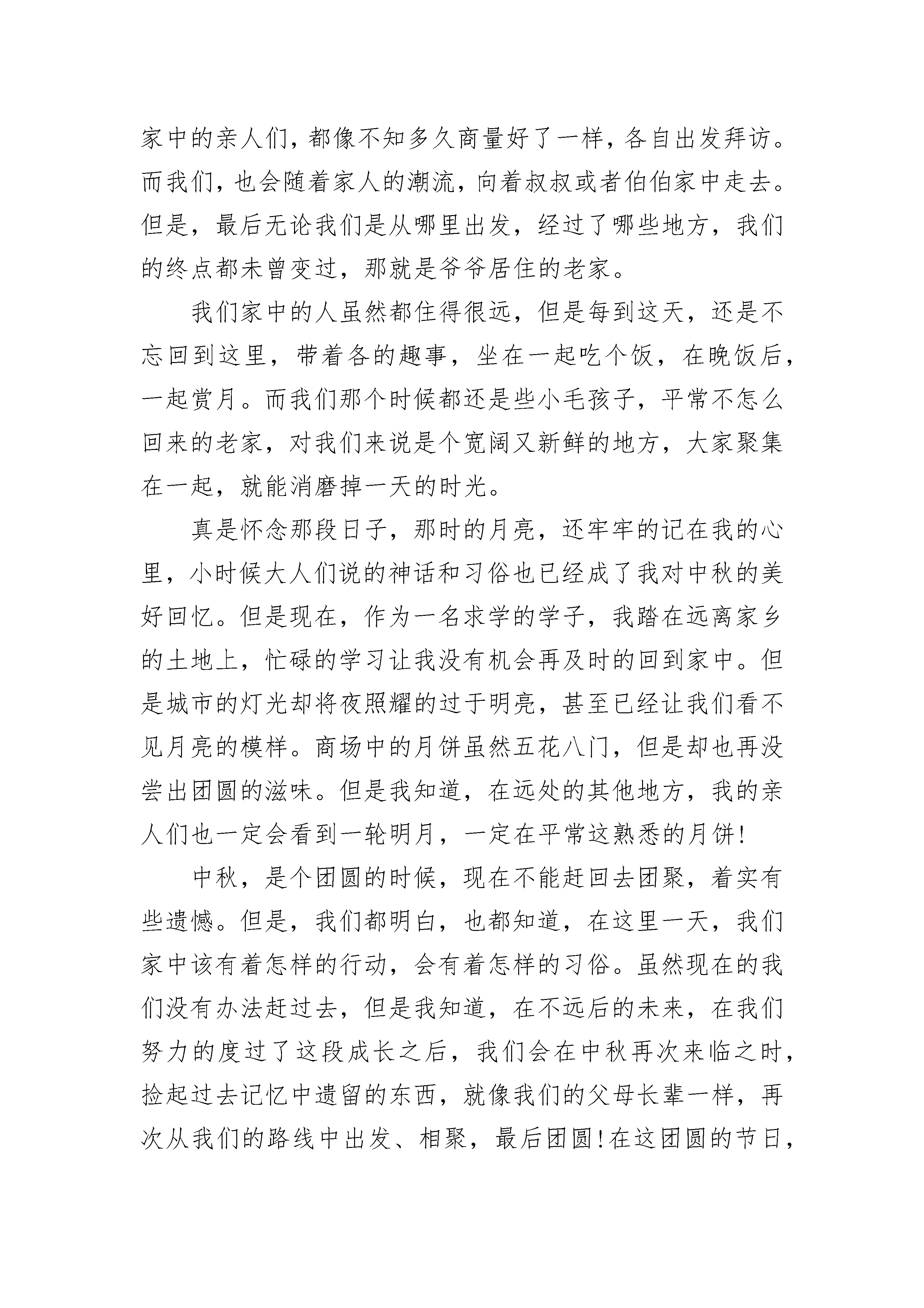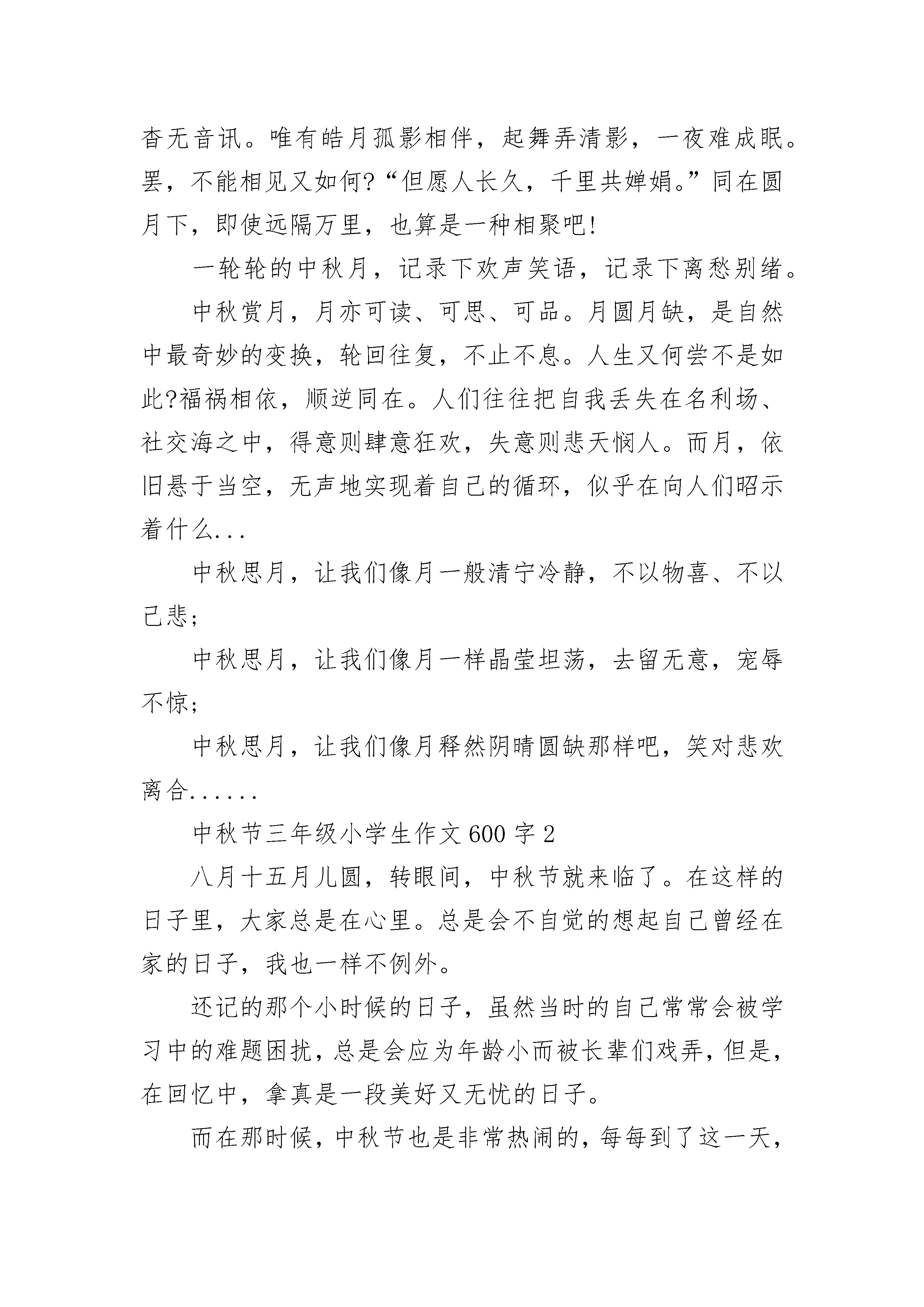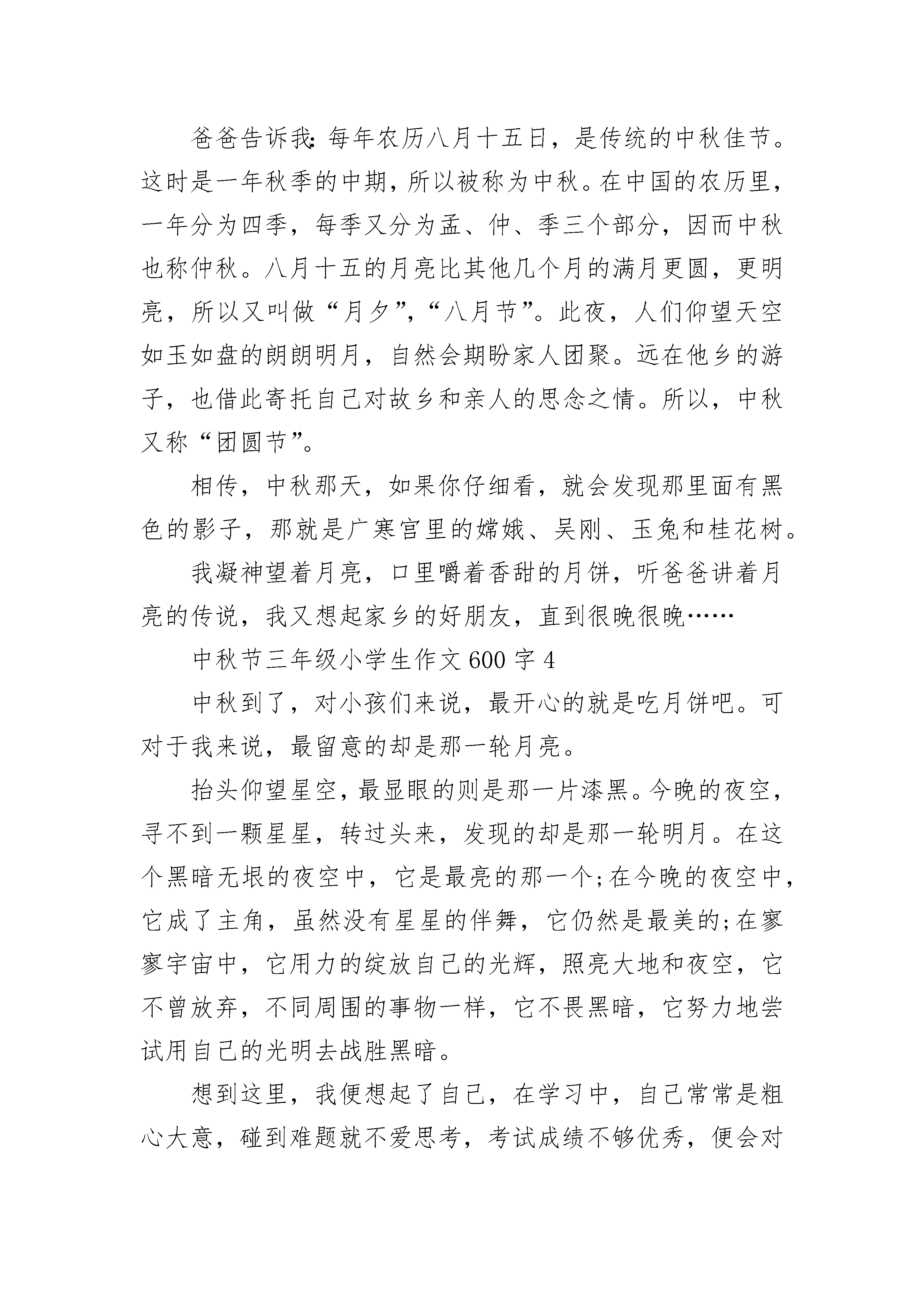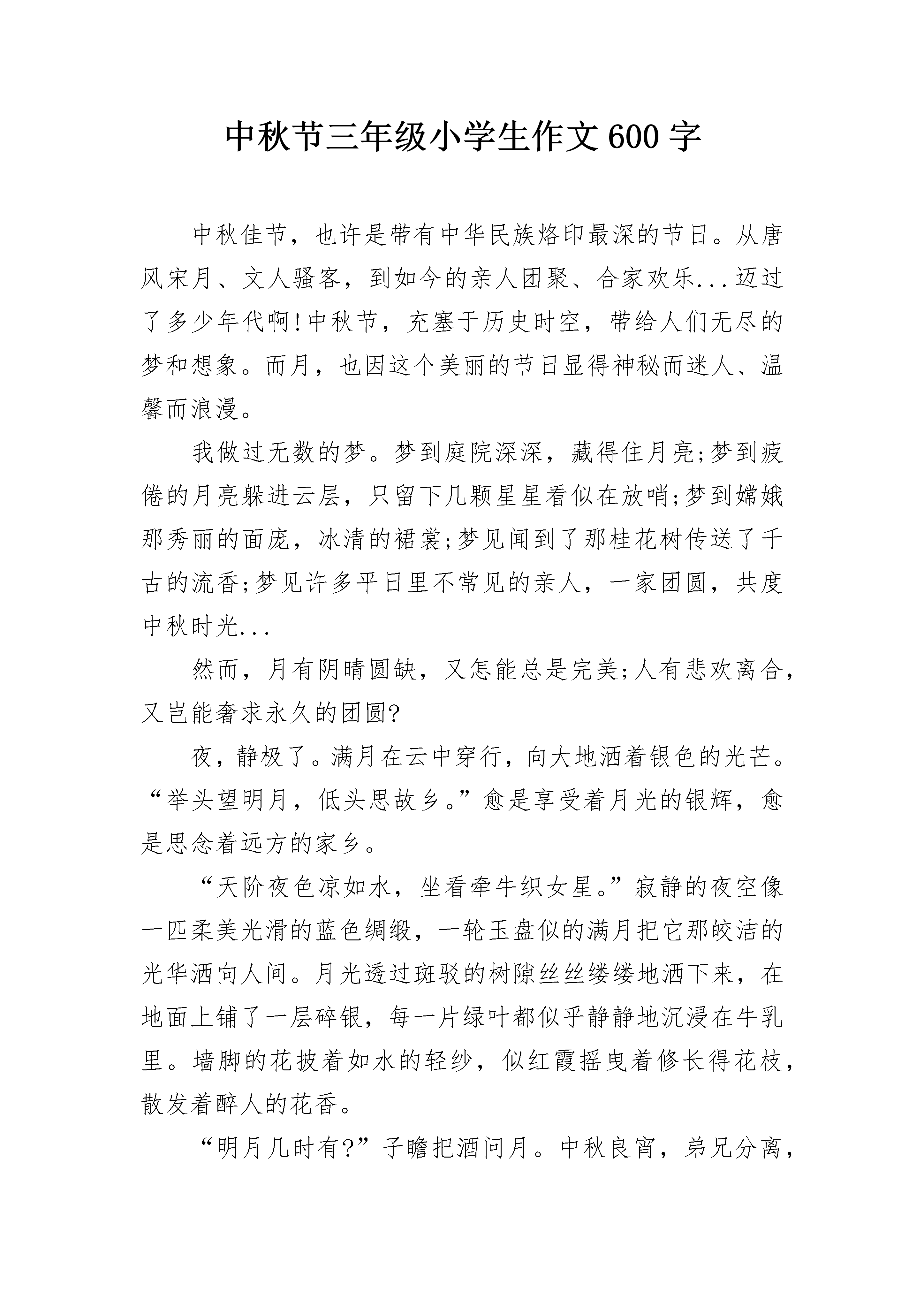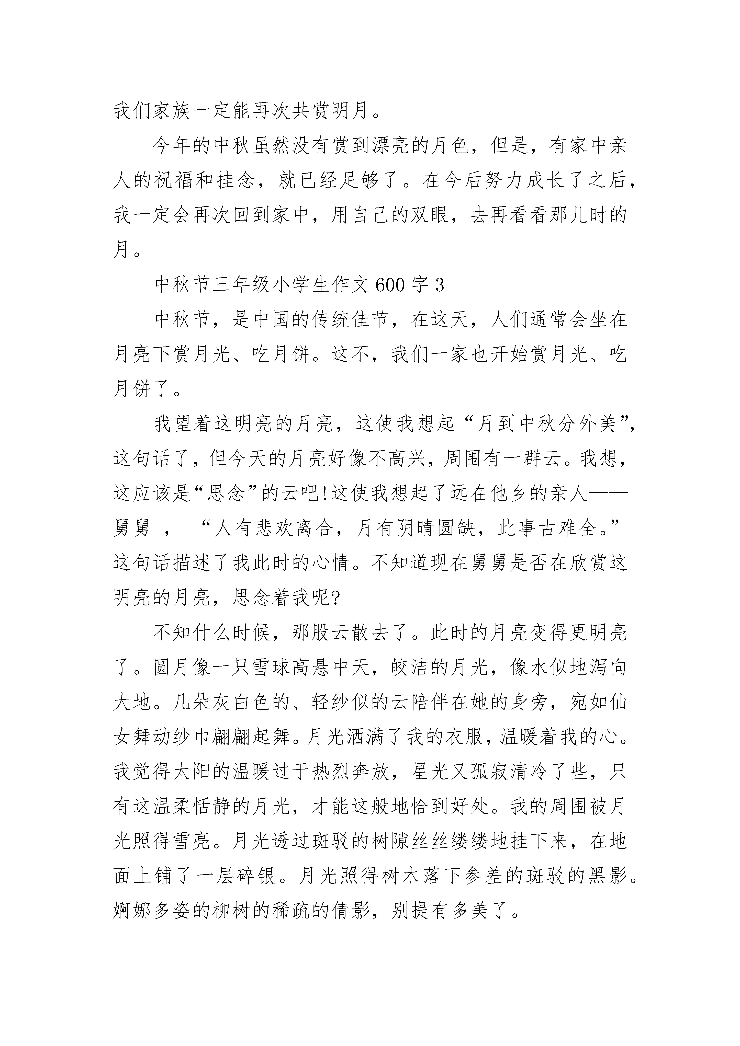 中秋节三年级小学生作文600字中秋佳节,也许是带有中华民族烙印最深的节日。从唐风宋月、文人骚客,到如今的亲人团聚、合家欢乐...迈过了多少年代啊!中秋节,充塞于历史时空,带给人们无尽的梦和想象。而月,也因这个美丽的节日显得神秘而迷人、温馨而浪漫。我做过无数的梦。梦到庭院深深,藏得住月亮;梦到疲倦的月亮躲进云层,只留下几颗星星看似在放哨;梦到嫦娥那秀丽的面庞,冰清的裙裳;梦见闻到了那桂花树传送了千古的流香;梦见许多平日里不常见的亲人,一家团圆,共度中秋时光...然而,月有阴晴圆缺,又怎能总是完美;人有悲欢离合,又岂能奢求永久的团圆?夜,静极了。满月在云中穿行,向大地洒着银色的光芒。“举头望明月,低头思故乡。”愈是享受着月光的银辉,愈是思念着远方的家乡。“天阶夜色凉如水,坐看牵牛织女星。”寂静的夜空像一匹柔美光滑的蓝色绸缎,一轮玉盘似的满月把它那皎洁的光华洒向人间。月光透过斑驳的树隙丝丝缕缕地洒下来,在地面上铺了一层碎银,每一片绿叶都似乎静静地沉浸在牛乳里。墙脚的花披着如水的轻纱,似红霞摇曳着修长得花枝,散发着醉人的花香。“明月几时有?”子瞻把酒问月。中秋良宵,弟兄分离,杳无音讯。唯有皓月孤影相伴,起舞弄清影,一夜难成眠。罢,不能相见又如何?“但愿人长久,千里共婵娟。”同在圆月下,即使远隔万里,也算是一种相聚吧!一轮轮的中秋月,记录下欢声笑语,记录下离愁别绪。中秋赏月,月亦可读、可思、可品。月圆月缺,是自然中最奇妙的变换,轮回往复,不止不息。人生又何尝不是如此?福祸相依,顺逆同在。人们往往把自我丢失在名利场、社交海之中,得意则肆意狂欢,失意则悲天悯人。而月,依旧悬于当空,无声地实现着自己的循环,似乎在向人们昭示着什么...中秋思月,让我们像月一般清宁冷静,不以物喜、不以己悲;中秋思月,让我们像月一样晶莹坦荡,去留无意,宠辱不惊;中秋思月,让我们像月释然阴晴圆缺那样吧,笑对悲欢离合......中秋节三年级小学生作文600字2八月十五月儿圆,转眼间,中秋节就来临了。在这样的日子里,大家总是在心里。总是会不自觉的想起自己曾经在家的日子,我也一样不例外。还记的那个小时候的日子,虽然当时的自己常常会被学习中的难题困扰,总是会应为年龄小而被长辈们戏弄,但是,在回忆中,拿真是一段美好又无忧的日子。而在那时候,中秋节也是非常热闹的,每每到了这一天,家中的亲人们,都像不知多久商量好了一样,各自出发拜访。而我们,也会随着家人的潮流,向着叔叔或者伯伯家中走去。但是,最后无论我们是从哪里出发,经过了哪些地方,我们的终点都未曾变过,那就是爷爷居住的老家。我们家中的人虽然都住得很远,但是每到这天,还是不忘回到这里,带着各的趣事,坐在一起吃个饭,在晚饭后,一起赏月。而我们那个时候都还是些小毛孩子,平常不怎么回来的老家,对我们来说是个宽阔又新鲜的地方,大家聚集在一起,就能消磨掉一天的时光。真是怀念那段日子,那时的月亮,还牢牢的记在我的心里,小时候大人们说的神话和习俗也已经成了我对中秋的美好回忆。但是现在,作为一名求学的学子,我踏在远离家乡的土地上,忙碌的学习让我没有机会再及时的回到家中。但是城市的灯光却将夜照耀的过于明亮,甚至已经让我们看不见月亮的模样。商场中的月饼虽然五花八门,但是却也再没尝出团圆的滋味。但是我知道,在远处的其他地方,我的亲人们也一定会看到一轮明月,一定在平常这熟悉的月饼!中秋,是个团圆的时候,现在不能赶回去团聚,着实有些遗憾。但是,我们都明白,也都知道,在这里一天,我们家中该有着怎样的行动,会有着怎样的习俗。虽然现在的我们没有办法赶过去,但是我知道,在不远后的未来,在我们努力的度过了这段成长之后,我们会在中秋再次来临之时,捡起过去记忆中遗留的东西,就像我们的父母长辈一样,再次从我们的路线中出发、相聚,最后团圆!在这团圆的节日,我们家族一定能再次共赏明月。今年的中秋虽然没有赏到漂亮的月色,但是,有家中亲人的祝福和挂念,就已经足够了。在今后努力成长了之后,我一定会再次回到家中,用自己的双眼,去再看看那儿时的月。中秋节三年级小学生作文600字3中秋节,是中国的传统佳节,在这天,人们通常会坐在月亮下赏月光、吃月饼。这不,我们一家也开始赏月光、吃月饼了。我望着这明亮的月亮,这使我想起“月到中秋分外美”,这句话了,但今天的月亮好像不高兴,周围有一群云。我想,这应该是“思念”的云吧!这使我想起了远在他乡的亲人——舅舅,“人有悲欢离合,月有阴晴圆缺,此事古难全。”这句话描述了我此时的心情。不知道现在舅舅是否在欣赏这明亮的月亮,思念着我呢?不知什么时候,那股云散去了。此时的月亮变得更明亮了。圆月像一只雪球高悬中天,皎洁的月光,像水似地泻向大地。几朵灰白色的、轻纱似的云陪伴在她的身旁,宛如仙女舞动纱巾翩翩起舞。月光洒满了我的衣服,温暖着我的心。我觉得太阳的温
