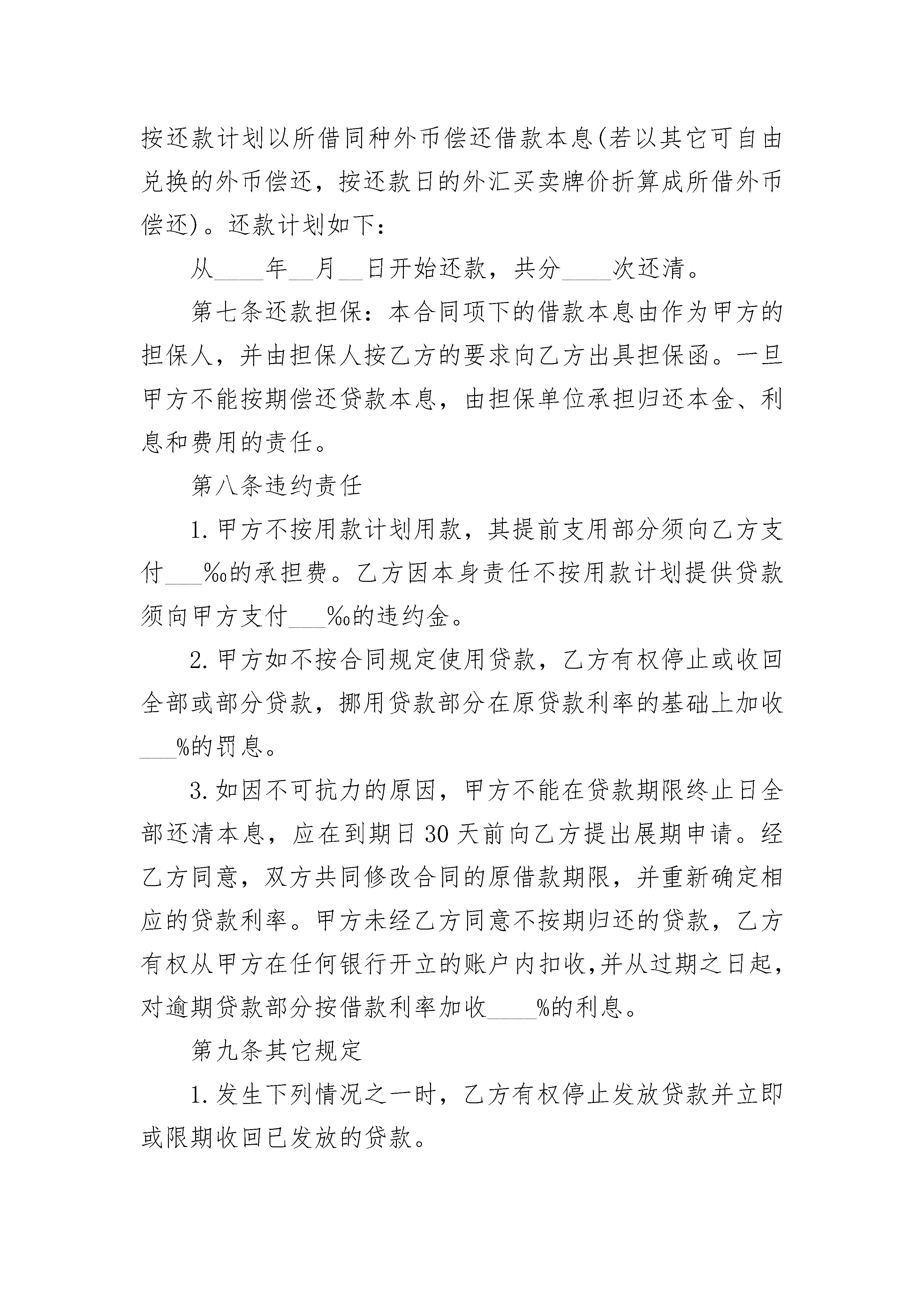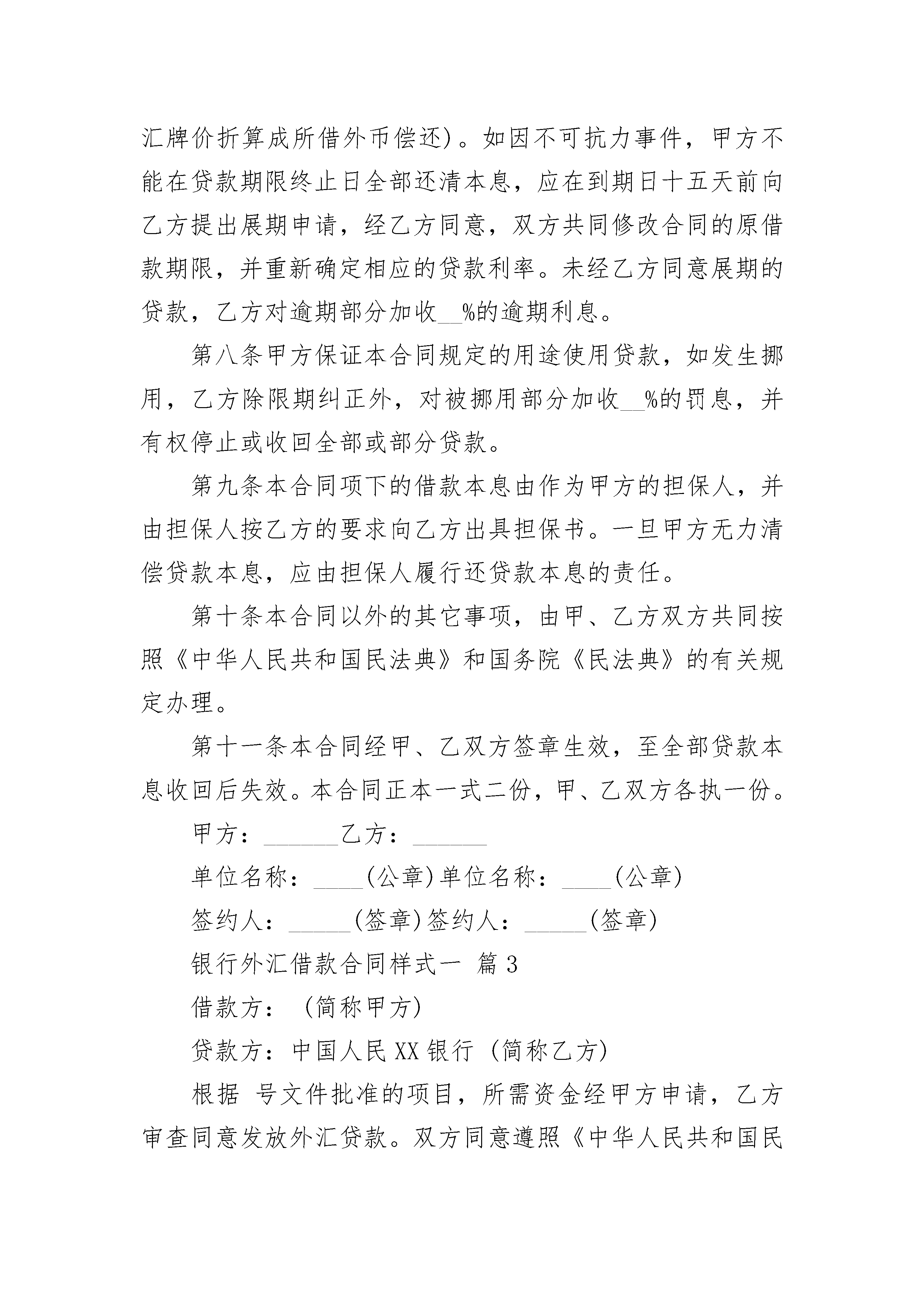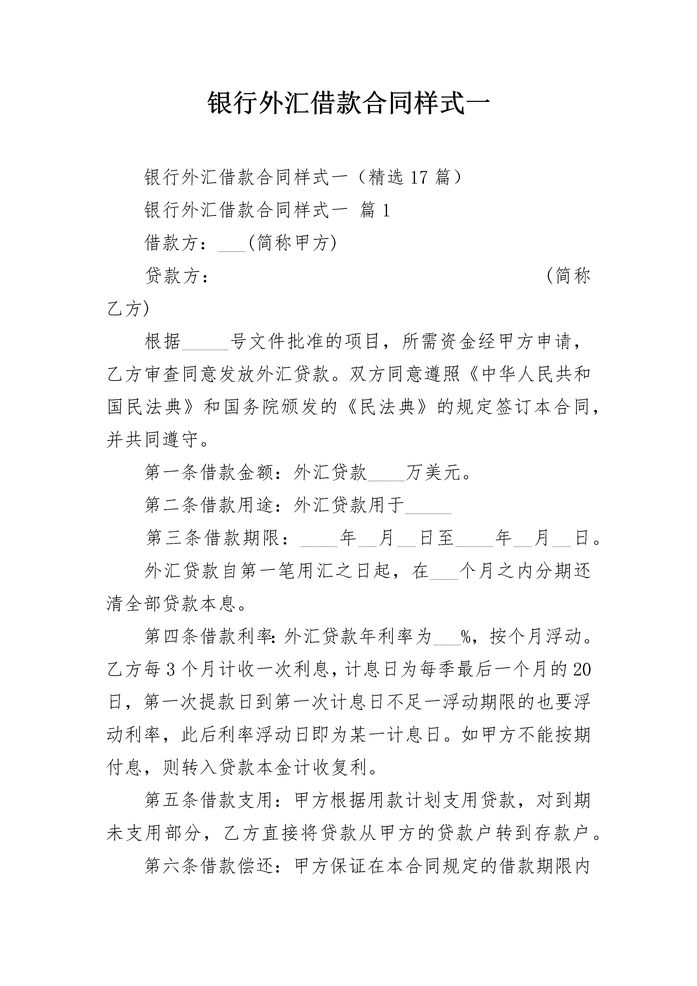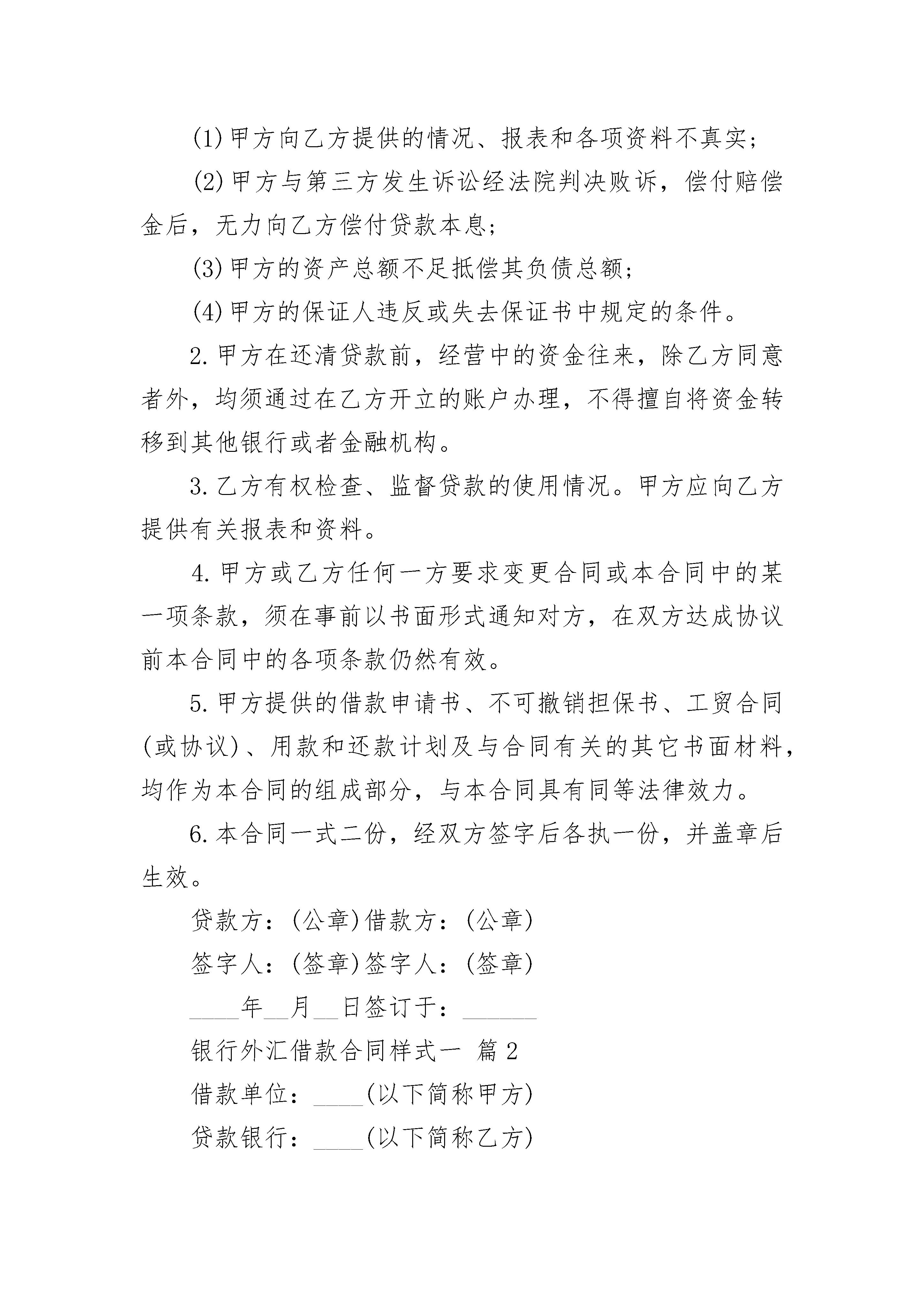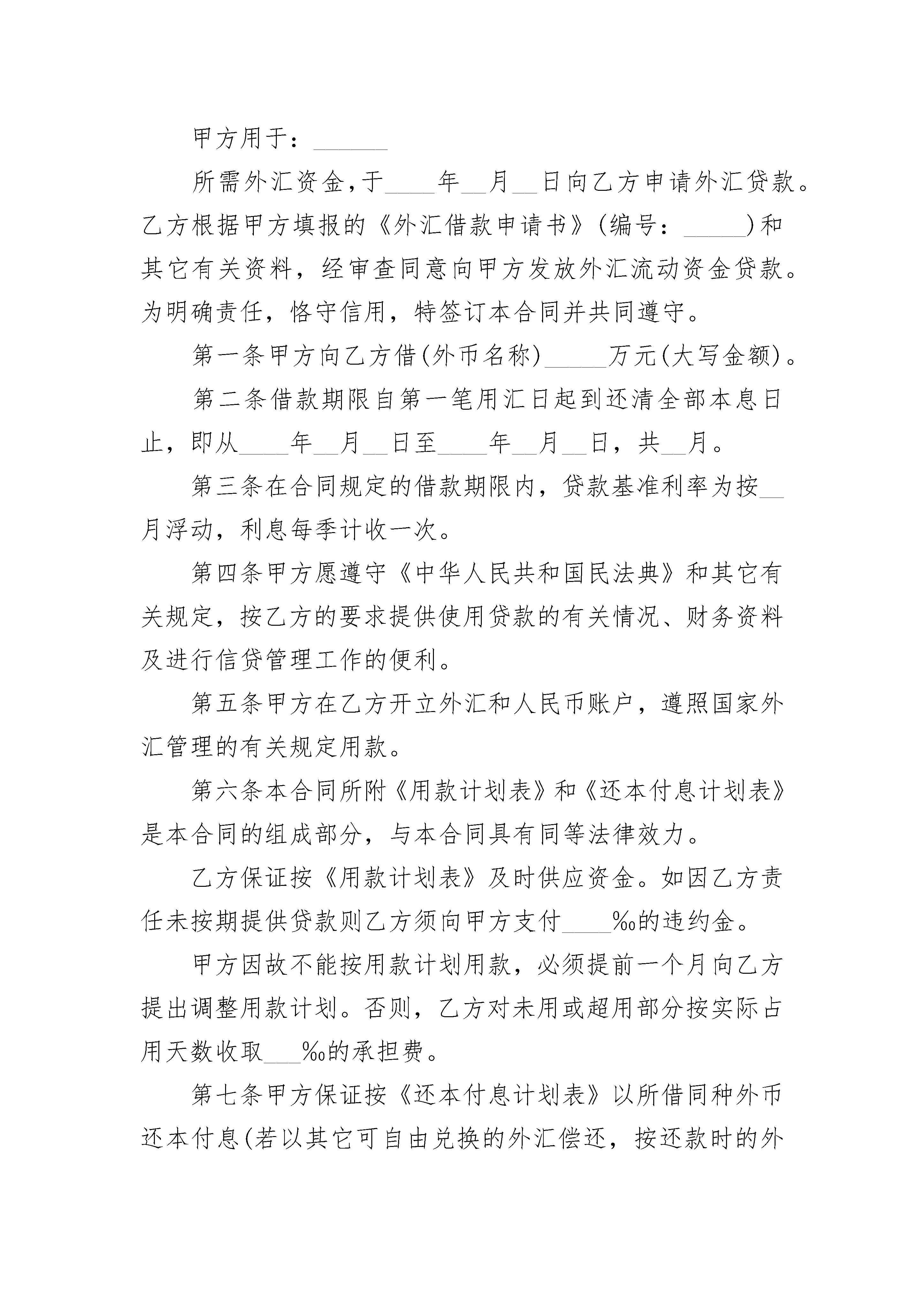 银行外汇借款合同样式一银行外汇借款合同样式一(精选17篇)银行外汇借款合同样式一篇1借款方:___(简称甲方)贷款方:(简称乙方)根据_____号文件批准的项目,所需资金经甲方申请,乙方审查同意发放外汇贷款。双方同意遵照《中华人民共和国民法典》和国务院颁发的《民法典》的规定签订本合同,并共同遵守。第一条借款金额:外汇贷款____万美元。第二条借款用途:外汇贷款用于_____第三条借款期限:____年__月__日至____年__月__日。外汇贷款自第一笔用汇之日起,在___个月之内分期还清全部贷款本息。第四条借款利率:外汇贷款年利率为___%,按个月浮动。乙方每3个月计收一次利息,计息日为每季最后一个月的20日,第一次提款日到第一次计息日不足一浮动期限的也要浮动利率,此后利率浮动日即为某一计息日。如甲方不能按期付息,则转入贷款本金计收复利。第五条借款支用:甲方根据用款计划支用贷款,对到期未支用部分,乙方直接将贷款从甲方的贷款户转到存款户。第六条借款偿还:甲方保证在本合同规定的借款期限内按还款计划以所借同种外币偿还借款本息(若以其它可自由兑换的外币偿还,按还款日的外汇买卖牌价折算成所借外币偿还)。还款计划如下:从____年__月__日开始还款,共分____次还清。第七条还款担保:本合同项下的借款本息由作为甲方的担保人,并由担保人按乙方的要求向乙方出具担保函。一旦甲方不能按期偿还贷款本息,由担保单位承担归还本金、利息和费用的责任。第八条违约责任1.甲方不按用款计划用款,其提前支用部分须向乙方支付___‰的承担费。乙方因本身责任不按用款计划提供贷款须向甲方支付___‰的违约金。2.甲方如不按合同规定使用贷款,乙方有权停止或收回全部或部分贷款,挪用贷款部分在原贷款利率的基础上加收___%的罚息。3.如因不可抗力的原因,甲方不能在贷款期限终止日全部还清本息,应在到期日30天前向乙方提出展期申请。经乙方同意,双方共同修改合同的原借款期限,并重新确定相应的贷款利率。甲方未经乙方同意不按期归还的贷款,乙方有权从甲方在任何银行开立的账户内扣收,并从过期之日起,对逾期贷款部分按借款利率加收____%的利息。第九条其它规定1.发生下列情况之一时,乙方有权停止发放贷款并立即或限期收回已发放的贷款。(1)甲方向乙方提供的情况、报表和各项资料不真实;(2)甲方与第三方发生诉讼经法院判决败诉,偿付赔偿金后,无力向乙方偿付贷款本息;(3)甲方的资产总额不足抵偿其负债总额;(4)甲方的保证人违反或失去保证书中规定的条件。2.甲方在还清贷款前,经营中的资金往来,除乙方同意者外,均须通过在乙方开立的账户办理,不得擅自将资金转移到其他银行或者金融机构。3.乙方有权检查、监督贷款的使用情况。甲方应向乙方提供有关报表和资料。4.甲方或乙方任何一方要求变更合同或本合同中的某一项条款,须在事前以书面形式通知对方,在双方达成协议前本合同中的各项条款仍然有效。5.甲方提供的借款申请书、不可撤销担保书、工贸合同(或协议)、用款和还款计划及与合同有关的其它书面材料,均作为本合同的组成部分,与本合同具有同等法律效力。6.本合同一式二份,经双方签字后各执一份,并盖章后生效。贷款方:(公章)借款方:(公章)签字人:(签章)签字人:(签章)____年__月__日签订于:______银行外汇借款合同样式一篇2借款单位:____(以下简称甲方)贷款银行:____(以下简称乙方)甲方用于:______所需外汇资金,于____年__月__日向乙方申请外汇贷款。乙方根据甲方填报的《外汇借款申请书》(编号:_____)和其它有关资料,经审查同意向甲方发放外汇流动资金贷款。为明确责任,恪守信用,特签订本合同并共同遵守。第一条甲方向乙方借(外币名称)_____万元(大写金额)。第二条借款期限自第一笔用汇日起到还清全部本息日止,即从____年__月__日至____年__月__日,共__月。第三条在合同规定的借款期限内,贷款基准利率为按__月浮动,利息每季计收一次。第四条甲方愿遵守《中华人民共和国民法典》和其它有关规定,按乙方的要求提供使用贷款的有关情况、财务资料及进行信贷管理工作的便利。第五条甲方在乙方开立外汇和人民币账户,遵照国家外汇管理的有关规定用款。第六条本合同所附《用款计划表》和《还本付息计划表》是本合同的组成部分,与本合同具有同等法律效力。乙方保证按《用款计划表》及时供应资金。如因乙方责任未按期提供贷款则乙方须向甲方支付____‰的违约金。甲方因故不能按用款计划用款,必须提前一个月向乙方提出调整用款计划。否则,乙方对未用或超用部分按实际占用天数收取___‰的承担费。第七条甲方保证按《还本付息计划表》以所借同种外币还本付息(若以其它可自由兑换的外汇偿还,按还款时的外汇牌价折算