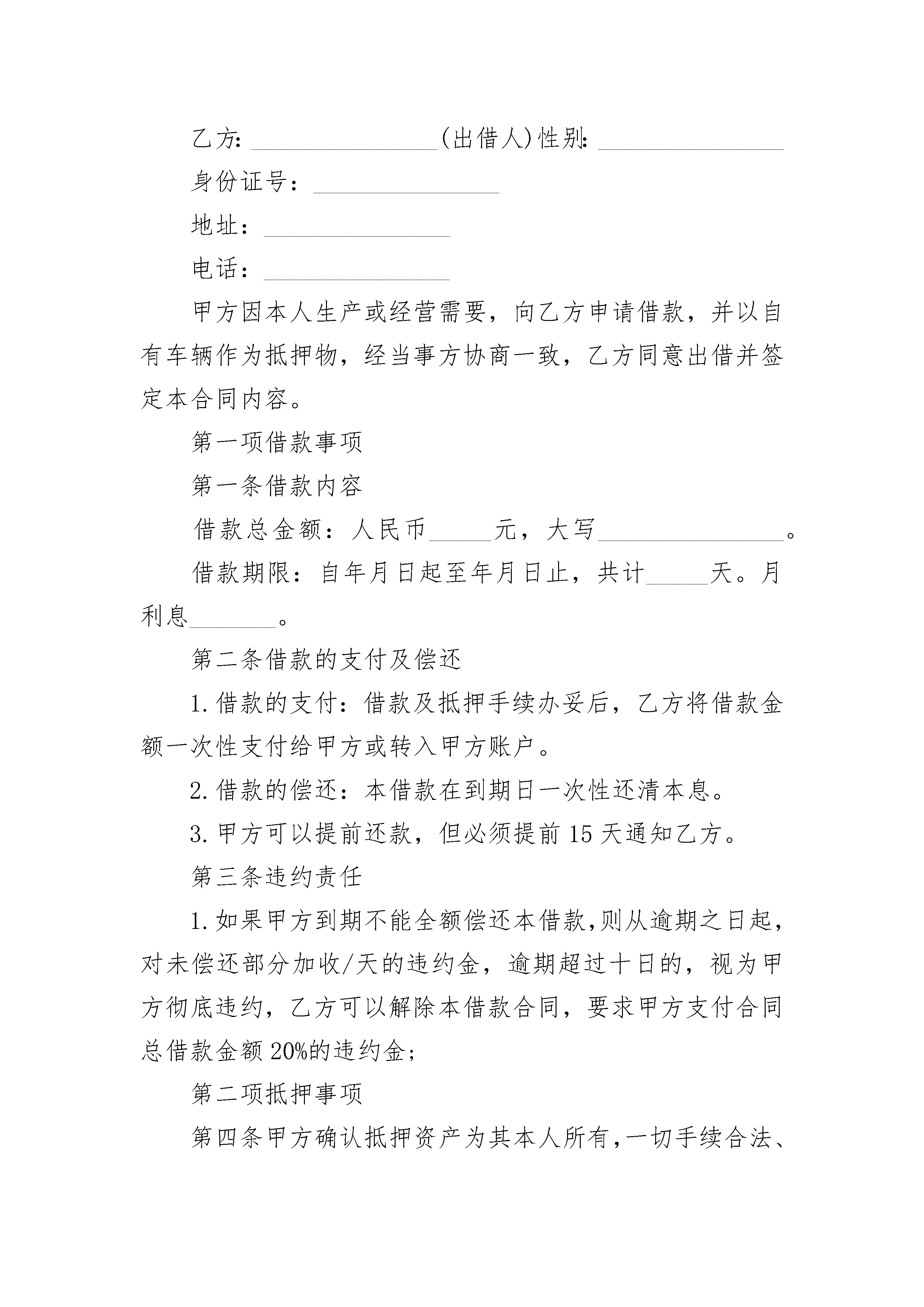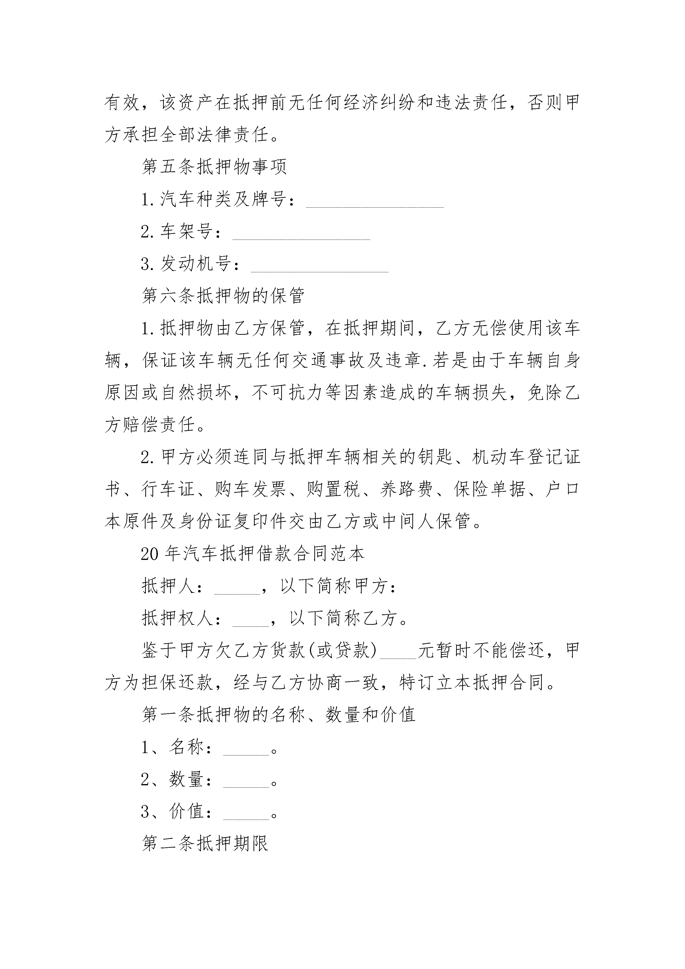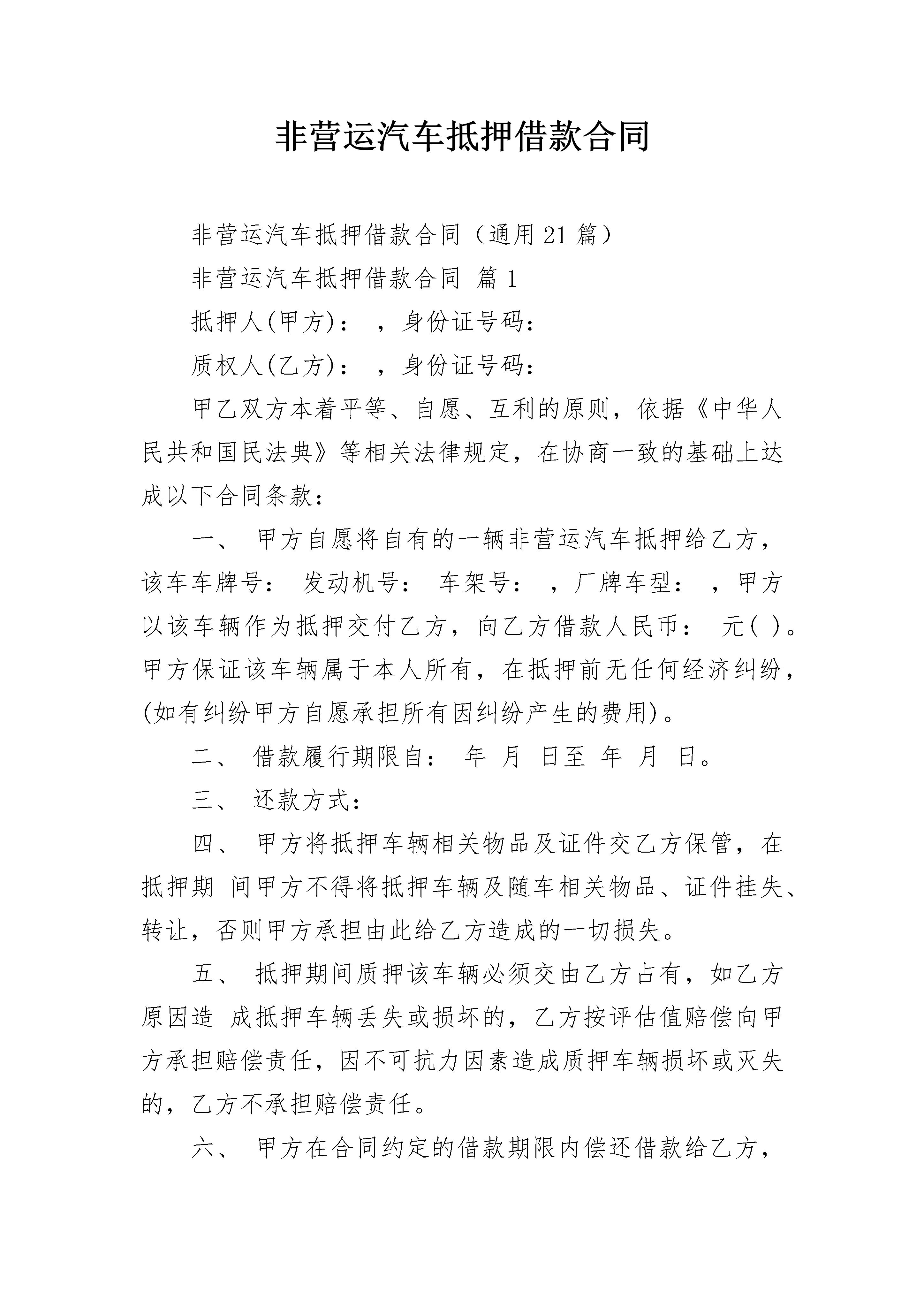 非营运汽车抵押借款合同非营运汽车抵押借款合同(通用21篇)非营运汽车抵押借款合同篇1抵押人(甲方):,身份证号码:质权人(乙方):,身份证号码:甲乙双方本着平等、自愿、互利的原则,依据《中华人民共和国民法典》等相关法律规定,在协商一致的基础上达成以下合同条款:一、甲方自愿将自有的一辆非营运汽车抵押给乙方,该车车牌号:发动机号:车架号:,厂牌车型:,甲方以该车辆作为抵押交付乙方,向乙方借款人民币:元()。甲方保证该车辆属于本人所有,在抵押前无任何经济纠纷,(如有纠纷甲方自愿承担所有因纠纷产生的费用)。二、借款履行期限自:年月日至年月日。三、还款方式:四、甲方将抵押车辆相关物品及证件交乙方保管,在抵押期间甲方不得将抵押车辆及随车相关物品、证件挂失、转让,否则甲方承担由此给乙方造成的一切损失。五、抵押期间质押该车辆必须交由乙方占有,如乙方原因造成抵押车辆丢失或损坏的,乙方按评估值赔偿向甲方承担赔偿责任,因不可抗力因素造成质押车辆损坏或灭失的,乙方不承担赔偿责任。六、甲方在合同约定的借款期限内偿还借款给乙方,如果甲方不能在合同约定的借款期限内偿还借款,乙方有权委托拍卖行拍卖,乙方拍卖该质押车辆所得的价款,优先用于收回借款,剩余部分退还甲方,不足部分乙方有权向甲方继续追偿。七、甲方承诺:由于本人未履行到期借款,车辆被乙方拍卖。甲方应无条件向乙方提供合法有效的过户手续,协助办理相关过户事项。八、乙方应对甲方交付随抵押车辆的相关物品、证件妥善保管,未经甲方同意在抵押期间内不得使用、转让、抵押及处分。否则承担由此造成的一切损失。九、本合同在甲方偿还借款后,乙方将车辆及相关物品证件完整无损返还甲方(以交付时质押车辆照片为完整标准),此时本合同自行终止。十、担保人承诺:由于甲方未履行到期借款,担保人自愿无条件向乙方偿还甲方借款。甲方签字:乙方签字:担保人:甲方电话:乙方电话:担保人电话:签订时间:签订时间:签订时间:非营运汽车抵押借款合同篇2编号:_______________甲方:_______________(借款人)性别:_______________身份证号:_______________地址:_______________电话:_______________乙方:_______________(出借人)性别:_______________身份证号:_______________地址:_______________电话:_______________甲方因本人生产或经营需要,向乙方申请借款,并以自有车辆作为抵押物,经当事方协商一致,乙方同意出借并签定本合同内容。第一项借款事项第一条借款内容借款总金额:人民币_____元,大写_______________。借款期限:自年月日起至年月日止,共计_____天。月利息_______。第二条借款的支付及偿还1.借款的支付:借款及抵押手续办妥后,乙方将借款金额一次性支付给甲方或转入甲方账户。2.借款的偿还:本借款在到期日一次性还清本息。3.甲方可以提前还款,但必须提前15天通知乙方。第三条违约责任1.如果甲方到期不能全额偿还本借款,则从逾期之日起,对未偿还部分加收/天的违约金,逾期超过十日的,视为甲方彻底违约,乙方可以解除本借款合同,要求甲方支付合同总借款金额20%的违约金;第二项抵押事项第四条甲方确认抵押资产为其本人所有,一切手续合法、有效,该资产在抵押前无任何经济纠纷和违法责任,否则甲方承担全部法律责任。第五条抵押物事项1.汽车种类及牌号:_______________2.车架号:_______________3.发动机号:_______________第六条抵押物的保管1.抵押物由乙方保管,在抵押期间,乙方无偿使用该车辆,保证该车辆无任何交通事故及违章.若是由于车辆自身原因或自然损坏,不可抗力等因素造成的车辆损失,免除乙方赔偿责任。2.甲方必须连同与抵押车辆相关的钥匙、机动车登记证书、行车证、购车发票、购置税、养路费、保险单据、户口本原件及身份证复印件交由乙方或中间人保管。20年汽车抵押借款合同范本抵押人:_____,以下简称甲方:抵押权人:____,以下简称乙方。鉴于甲方欠乙方货款(或贷款)____元暂时不能偿还,甲方为担保还款,经与乙方协商一致,特订立本抵押合同。第一条抵押物的名称、数量和价值1、名称:_____。2、数量:_____。3、价值:_____。第二条抵押期限抵押期限为____年,自____年__月__日起,至____年__月__日止。第三条抵押物的清点、暂管和保险1、清点:本合同生效后五天内,甲、乙双方共同清点检查抵押物的数量、质量,并列出清单,经核实无误后双方在清单上签名,加盖公章,以示认可。2、暂管:抵押物仍由甲方负责暂管完整无损,一切仓储及其它管理费用均由甲方承担。