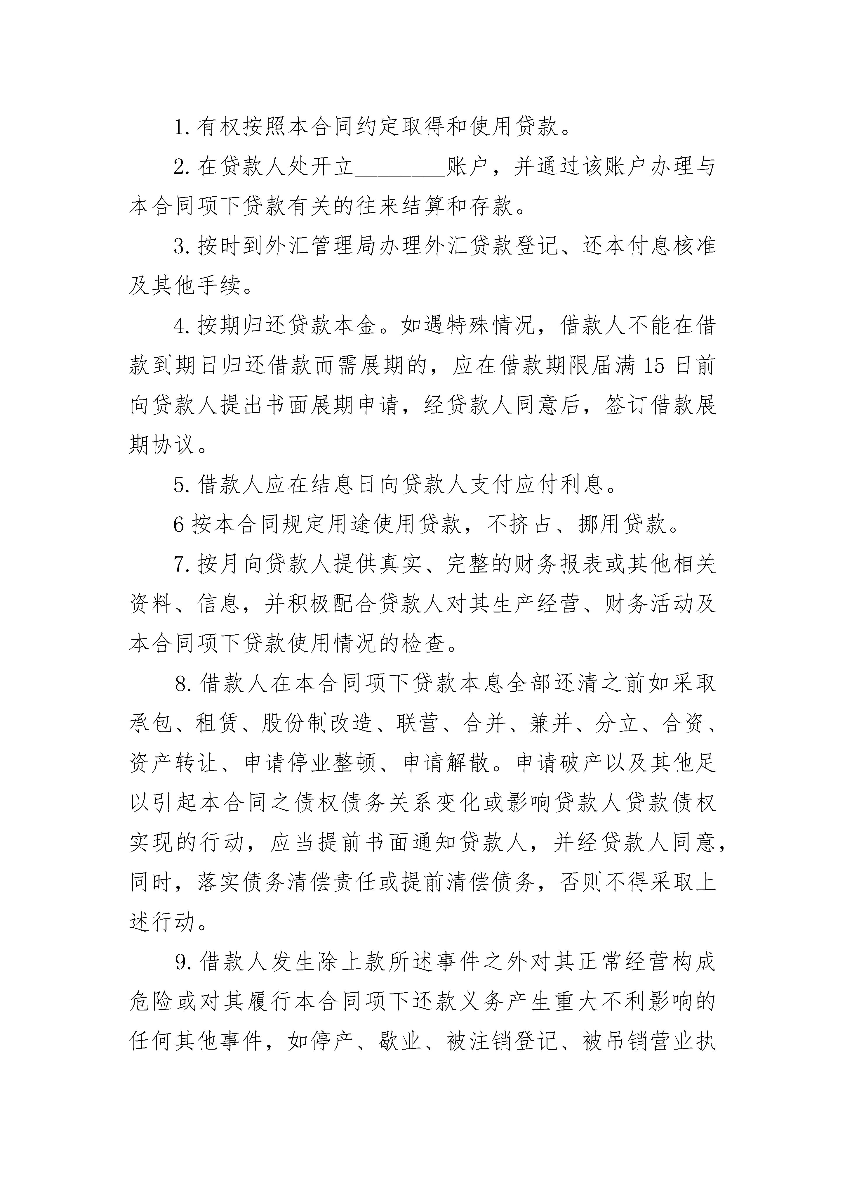 项目借款合同项目借款合同(通用20篇)项目借款合同篇1项目借款合同范本20__借款人(全称):________________________贷款人(全称):中国农业银行____________根据国家有关法律、法规和规章,财政部有关文件、中国农业银行总行与国外贷款机构签署的贷款框架协议和单个项目贷款协议,经借、贷双方当事人充分协商一致,特订立本合同,共同遵守。一、贷款人同意向借款人发放以下内容贷款1.借款种类:____________国政府贷款2.借款用途:____________________3.借款币种及金额(大写):____________4.借款与还款期限:(1)本合同项下贷款本金分____次偿还,偿还方式为____________(等额偿还/非等额偿还),每次偿还金额为________。偿还日为每年的____月____日和____月____日。第一次偿还日在________后第____个月,但不迟于________年____月____日。还款计划表将在第一次偿还后确定,并作为本合同的组成部分(或根据国外贷款机构的还款计划表执行)。(2)本合同记载的借款金额、借款日期、还款日期如与借款凭证记载不相一致时,以借款凭证记载为准。借款凭证为本合同的组成部分,与本合同具有同等法律效力。(3)借款人应当按期主动以原币种归还到期贷款本金和利息。(4)借款人提前还款,应当向贷款人提出书面申请,并征得贷款人同意,提前还款时利率不变。但需根据中国农业银行总行与国外贷款机构签订的贷款框架协议或单个项目贷款协议的规定,向国外贷款机构按贷款余额的____%支付提前还款贴水。5.利息及有关费用的计付:(1)本合同项下贷款利率为____%,为(固定/浮动)利率(浮动利率按国外贷款机构当期通知利率执行)。(2)本合同项下借款的结息日为每年的____________。(3)借款人应按已提取未偿还的贷款余额的____%向贷款人支付转贷手续费,支付日与本合同项下借款的结息日相同。(4)贷款人将按国外贷款机构的通知,在规定的日期向借款人划收以下费用①管理费:指国外贷款机构向借款人收取的为办理本合同项下的贷款所发生的费用。本合同生效后____天之内,借款人应按贷款总额的____%一次性支付。②承诺费:指借款人对已承诺但尚未提取的贷款向国外贷款机构支付的费用。按未提借款金额的____%/年,每________支付一次,直至提款完毕。支付日与本合同项下借款的结息日相同。于中国农业银行总行与国外贷款机构签署的单个项目贷款协议(签定/生效)后____天开始计算。③保险费(担保费):指借款人应向为本合同项下贷款提供保险的贷款国贷款保险机构支付的费用。借款人应按已提取未偿还的贷款余额的____%/年支付保险费,支付日与本合同项下借款的结息日相同(或借款人应在________之前,支付金额为________的保险费)。二、除非满足以下先决条件,否则贷款人有权拒绝提供本合同项下贷款:1.每次提款时,借款人已填妥有关借款凭证,并根据贷款人要求提供有关文件、资料、信息。2.借款人已按照有关法律、法规规定,办妥与本贷款有关的批准、登记及其他法定手续。3.若本合同项下贷款有抵押、质押担保,则借款人已根据贷款人要求办妥登记及/或保险等法律手续,且该担保、保险持续有效。三、贷款人权利和义务1.贷款人有权了解借款人的生产经营、财务活动、物资库存和贷款的使用等情况,要求借款人按期提供财务报表等文件、资料和信息。2.按照本合同规定收回或提前收回贷款本金、利息、罚息、逾期利息、复利和其他借款人应付费用时,贷款人均可直接从借款人任何账户中划收。3.在借款人履行本合同规定义务的前提下,按期足额向借款人发放贷款。四、借款人权利和义务1.有权按照本合同约定取得和使用贷款。2.在贷款人处开立________账户,并通过该账户办理与本合同项下贷款有关的往来结算和存款。3.按时到外汇管理局办理外汇贷款登记、还本付息核准及其他手续。4.按期归还贷款本金。如遇特殊情况,借款人不能在借款到期日归还借款而需展期的,应在借款期限届满15日前向贷款人提出书面展期申请,经贷款人同意后,签订借款展期协议。5.借款人应在结息日向贷款人支付应付利息。6按本合同规定用途使用贷款,不挤占、挪用贷款。7.按月向贷款人提供真实、完整的财务报表或其他相关资料、信息,并积极配合贷款人对其生产经营、财务活动及本合同项下贷款使用情况的检查。8.借款人在本合同项下贷款本息全部还清之前如采取承包、租赁、股份制改造、联营、合并、兼并、分立、合资、资产转让、申请停业整顿、申请解散。申请破产以及其他足以引起本合同之债权债务关系变化或影响贷款人贷款债权实现的行动,应当提前书面通知贷款人,并经贷款人同意,同时,落实债务清偿责任或提前清偿债务,否则不