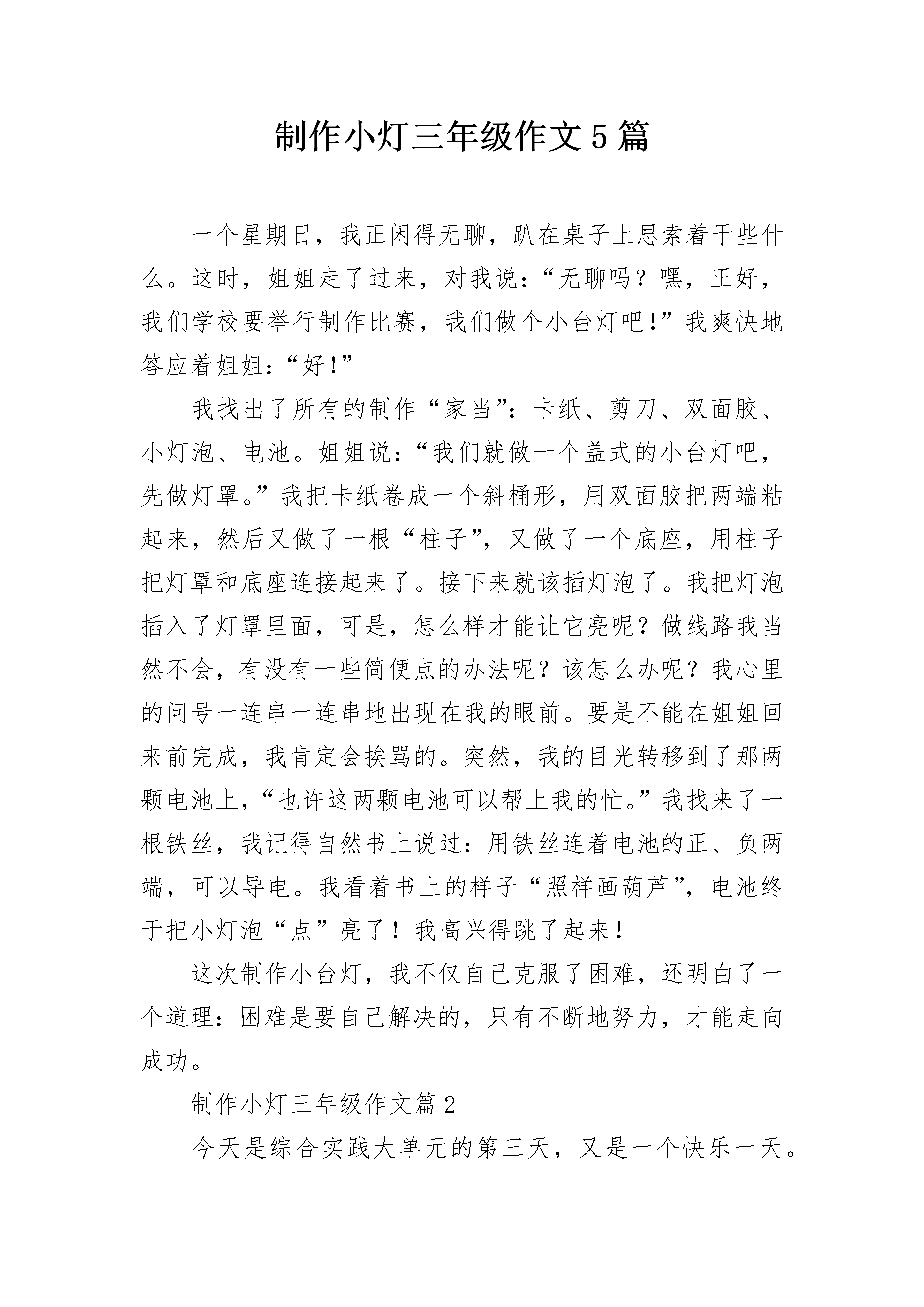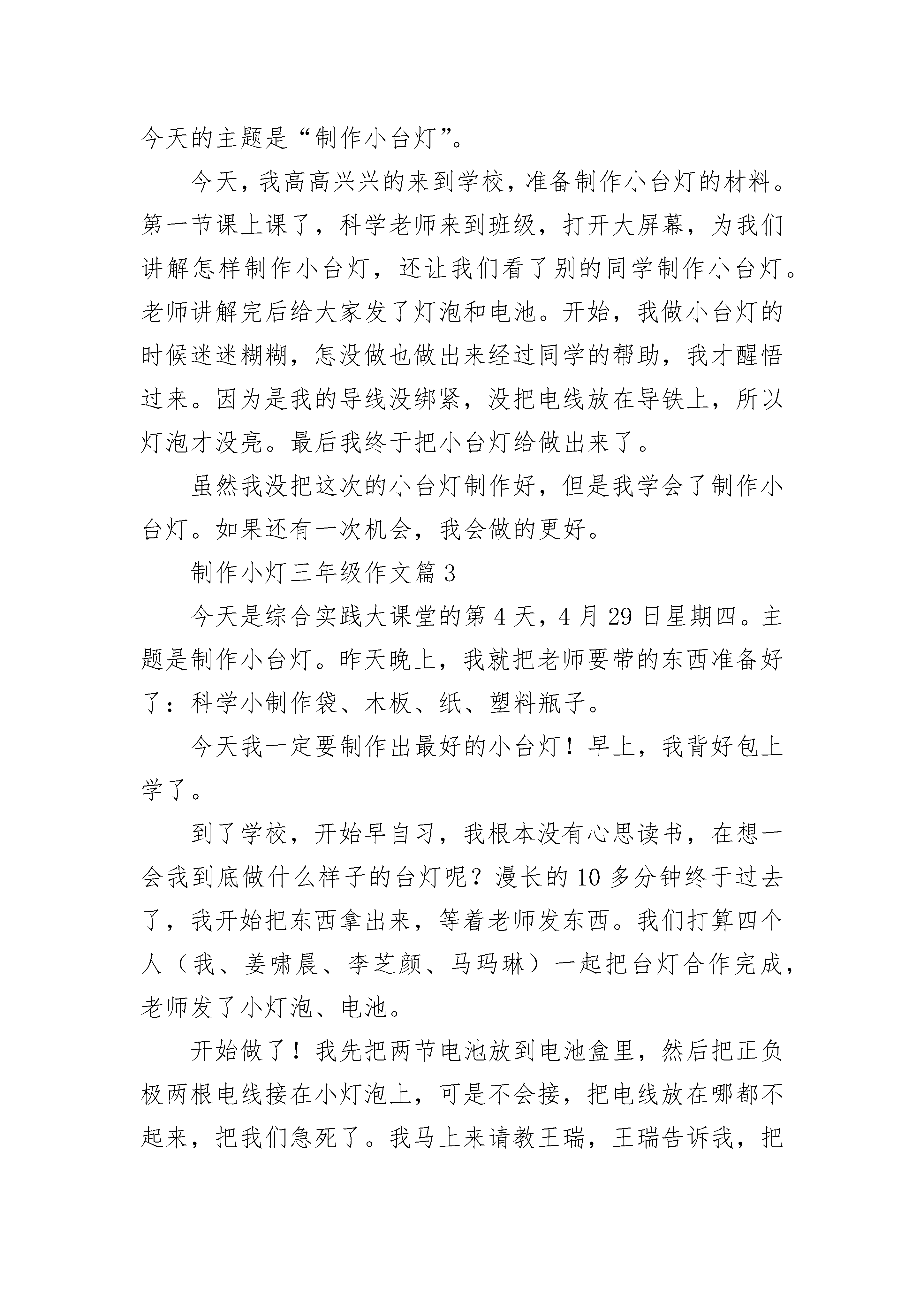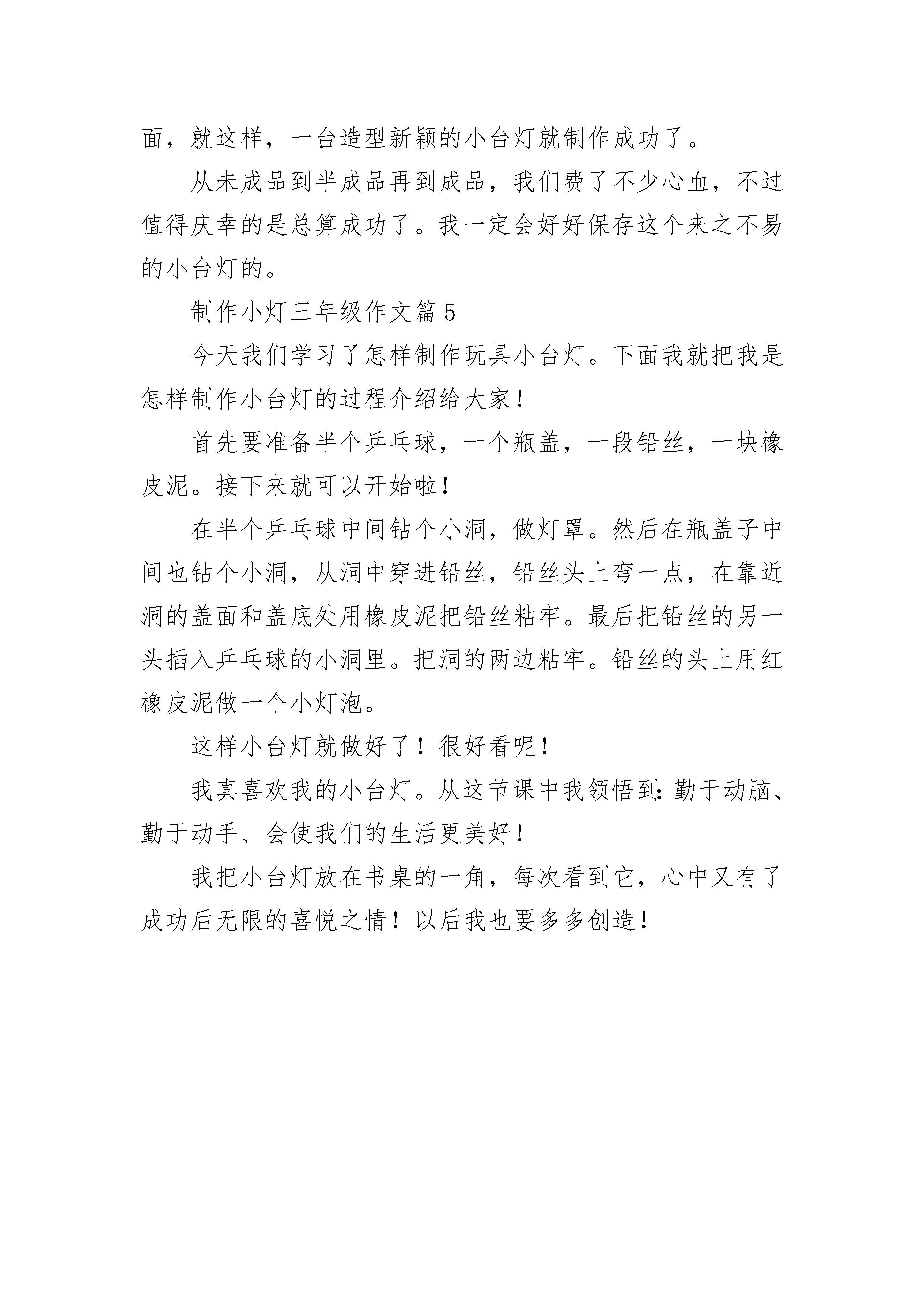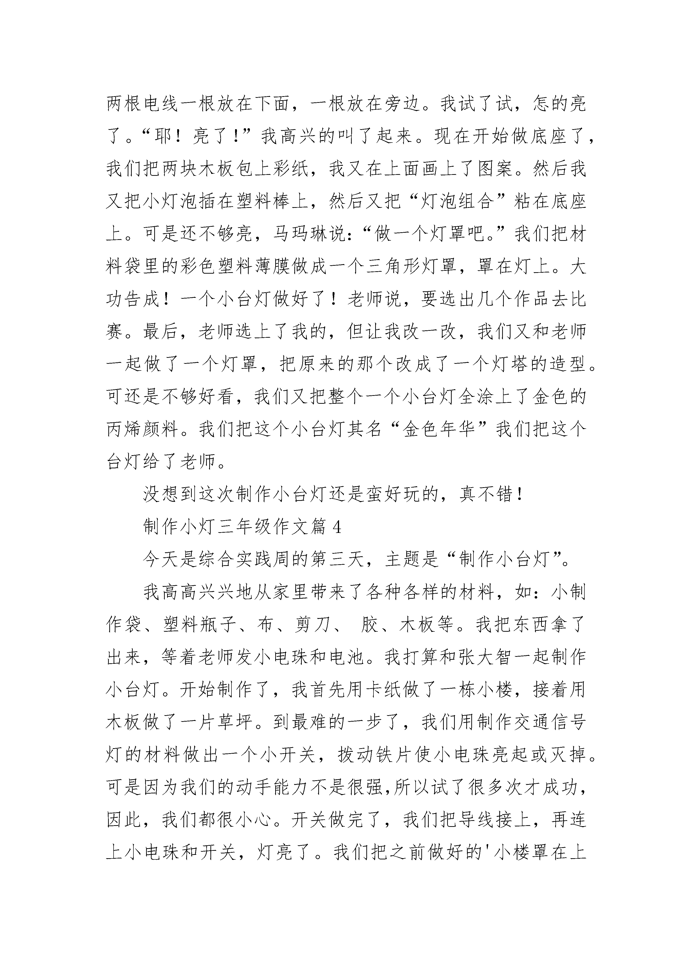 制作小灯三年级作文5篇一个星期日,我正闲得无聊,趴在桌子上思索着干些什么。这时,姐姐走了过来,对我说:“无聊吗?嘿,正好,我们学校要举行制作比赛,我们做个小台灯吧!”我爽快地答应着姐姐:“好!”我找出了所有的制作“家当”:卡纸、剪刀、双面胶、小灯泡、电池。姐姐说:“我们就做一个盖式的小台灯吧,先做灯罩。”我把卡纸卷成一个斜桶形,用双面胶把两端粘起来,然后又做了一根“柱子”,又做了一个底座,用柱子把灯罩和底座连接起来了。接下来就该插灯泡了。我把灯泡插入了灯罩里面,可是,怎么样才能让它亮呢?做线路我当然不会,有没有一些简便点的办法呢?该怎么办呢?我心里的问号一连串一连串地出现在我的眼前。要是不能在姐姐回来前完成,我肯定会挨骂的。突然,我的目光转移到了那两颗电池上,“也许这两颗电池可以帮上我的忙。”我找来了一根铁丝,我记得自然书上说过:用铁丝连着电池的正、负两端,可以导电。我看着书上的样子“照样画葫芦”,电池终于把小灯泡“点”亮了!我高兴得跳了起来!这次制作小台灯,我不仅自己克服了困难,还明白了一个道理:困难是要自己解决的,只有不断地努力,才能走向成功。制作小灯三年级作文篇2今天是综合实践大单元的第三天,又是一个快乐一天。今天的主题是“制作小台灯”。今天,我高高兴兴的来到学校,准备制作小台灯的材料。第一节课上课了,科学老师来到班级,打开大屏幕,为我们讲解怎样制作小台灯,还让我们看了别的同学制作小台灯。老师讲解完后给大家发了灯泡和电池。开始,我做小台灯的时候迷迷糊糊,怎没做也做出来经过同学的帮助,我才醒悟过来。因为是我的导线没绑紧,没把电线放在导铁上,所以灯泡才没亮。最后我终于把小台灯给做出来了。虽然我没把这次的小台灯制作好,但是我学会了制作小台灯。如果还有一次机会,我会做的更好。制作小灯三年级作文篇3今天是综合实践大课堂的第4天,4月29日星期四。主题是制作小台灯。昨天晚上,我就把老师要带的东西准备好了:科学小制作袋、木板、纸、塑料瓶子。今天我一定要制作出最好的小台灯!早上,我背好包上学了。到了学校,开始早自习,我根本没有心思读书,在想一会我到底做什么样子的台灯呢?漫长的10多分钟终于过去了,我开始把东西拿出来,等着老师发东西。我们打算四个人(我、姜啸晨、李芝颜、马玛琳)一起把台灯合作完成,老师发了小灯泡、电池。开始做了!我先把两节电池放到电池盒里,然后把正负极两根电线接在小灯泡上,可是不会接,把电线放在哪都不起来,把我们急死了。我马上来请教王瑞,王瑞告诉我,把两根电线一根放在下面,一根放在旁边。我试了试,怎的亮了。“耶!亮了!”我高兴的叫了起来。现在开始做底座了,我们把两块木板包上彩纸,我又在上面画上了图案。然后我又把小灯泡插在塑料棒上,然后又把“灯泡组合”粘在底座上。可是还不够亮,马玛琳说:“做一个灯罩吧。”我们把材料袋里的彩色塑料薄膜做成一个三角形灯罩,罩在灯上。大功告成!一个小台灯做好了!老师说,要选出几个作品去比赛。最后,老师选上了我的,但让我改一改,我们又和老师一起做了一个灯罩,把原来的那个改成了一个灯塔的造型。可还是不够好看,我们又把整个一个小台灯全涂上了金色的丙烯颜料。我们把这个小台灯其名“金色年华”我们把这个台灯给了老师。没想到这次制作小台灯还是蛮好玩的,真不错!制作小灯三年级作文篇4今天是综合实践周的第三天,主题是“制作小台灯”。我高高兴兴地从家里带来了各种各样的材料,如:小制作袋、塑料瓶子、布、剪刀、胶、木板等。我把东西拿了出来,等着老师发小电珠和电池。我打算和张大智一起制作小台灯。开始制作了,我首先用卡纸做了一栋小楼,接着用木板做了一片草坪。到最难的一步了,我们用制作交通信号灯的材料做出一个小开关,拨动铁片使小电珠亮起或灭掉。可是因为我们的动手能力不是很强,所以试了很多次才成功,因此,我们都很小心。开关做完了,我们把导线接上,再连上小电珠和开关,灯亮了。我们把之前做好的'小楼罩在上面,就这样,一台造型新颖的小台灯就制作成功了。从未成品到半成品再到成品,我们费了不少心血,不过值得庆幸的是总算成功了。我一定会好好保存这个来之不易的小台灯的。制作小灯三年级作文篇5今天我们学习了怎样制作玩具小台灯。下面我就把我是怎样制作小台灯的过程介绍给大家!首先要准备半个乒乓球,一个瓶盖,一段铅丝,一块橡皮泥。接下来就可以开始啦!在半个乒乓球中间钻个小洞,做灯罩。然后在瓶盖子中间也钻个小洞,从洞中穿进铅丝,铅丝头上弯一点,在靠近洞的盖面和盖底处用橡皮泥把铅丝粘牢。最后把铅丝的另一头插入乒乓球的小洞里。把洞的两边粘牢。铅丝的头上用红橡皮泥做一个小灯泡。这样小台灯就做好了!很好看呢!我真喜欢我的小台灯。从这节课中我领悟到:勤于动脑、勤于动手、会使我们的生活更美好!我把小台灯放在书桌的一角,每次看到它,心中又有了成功后无限的喜悦之情