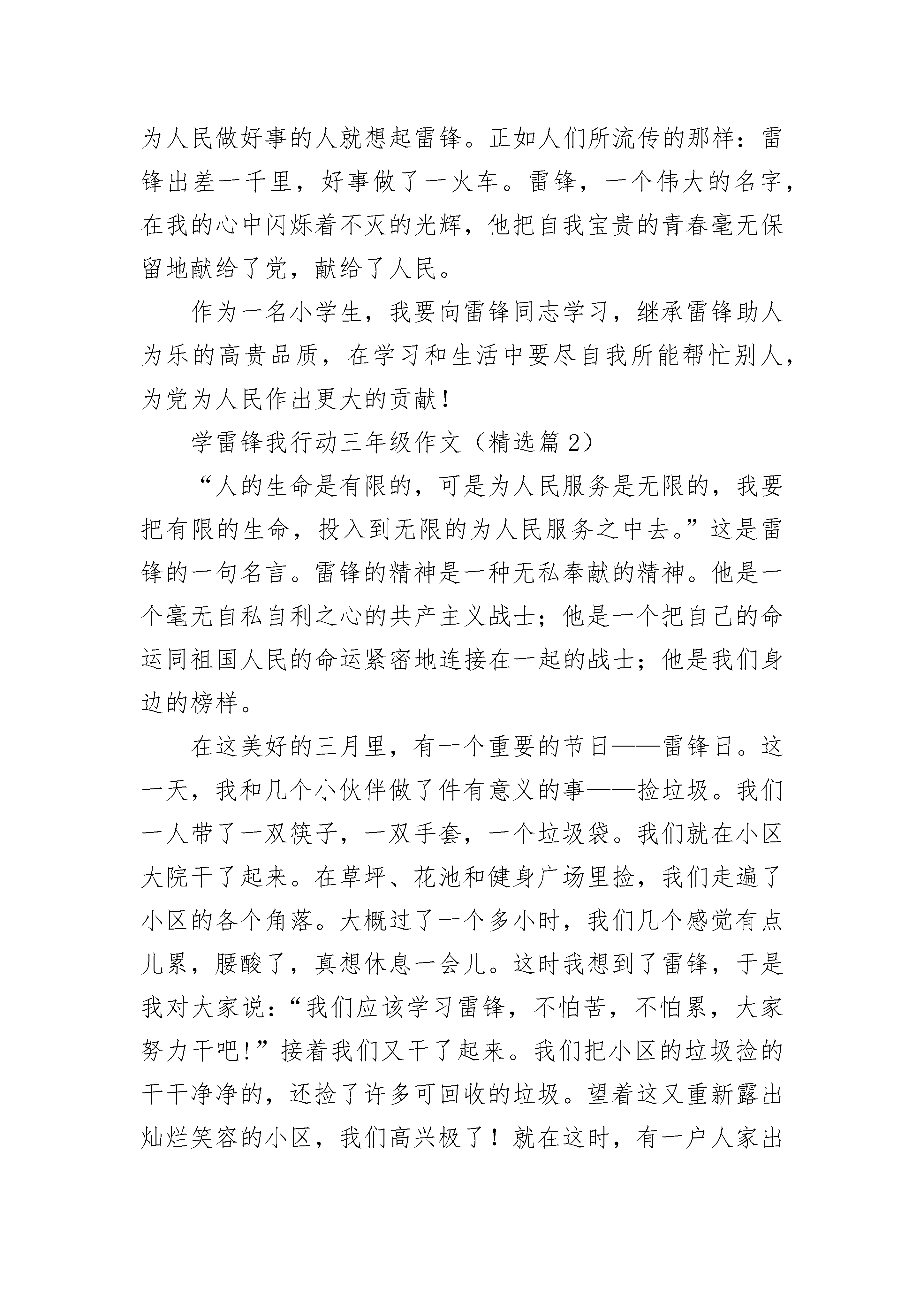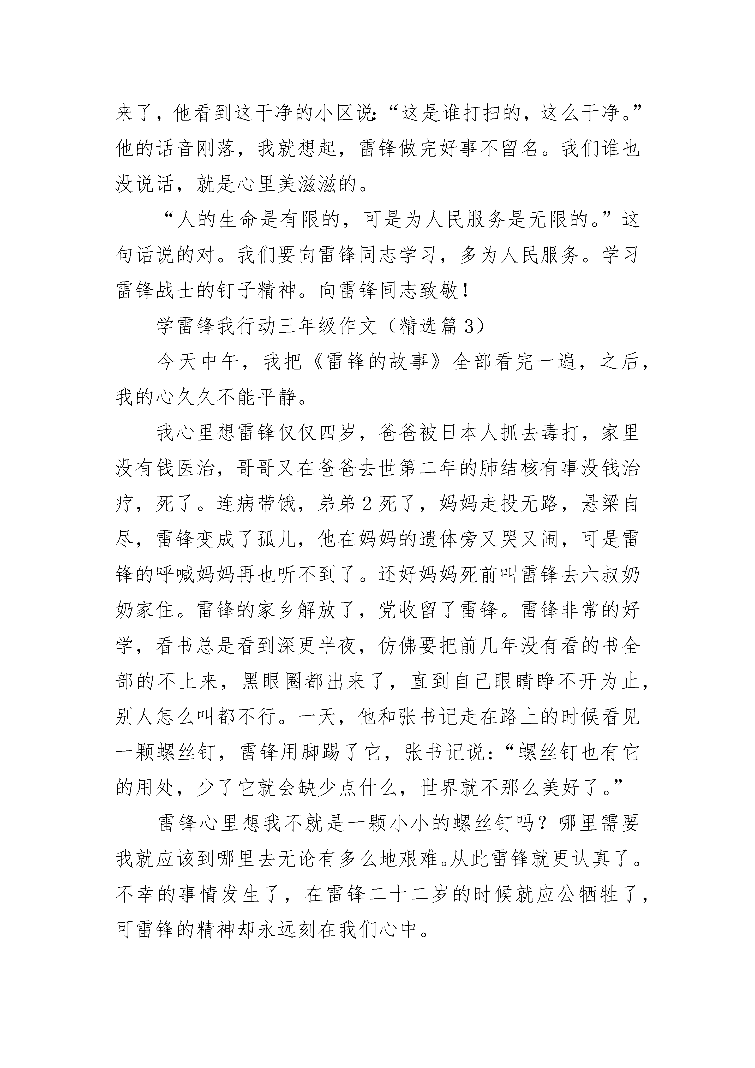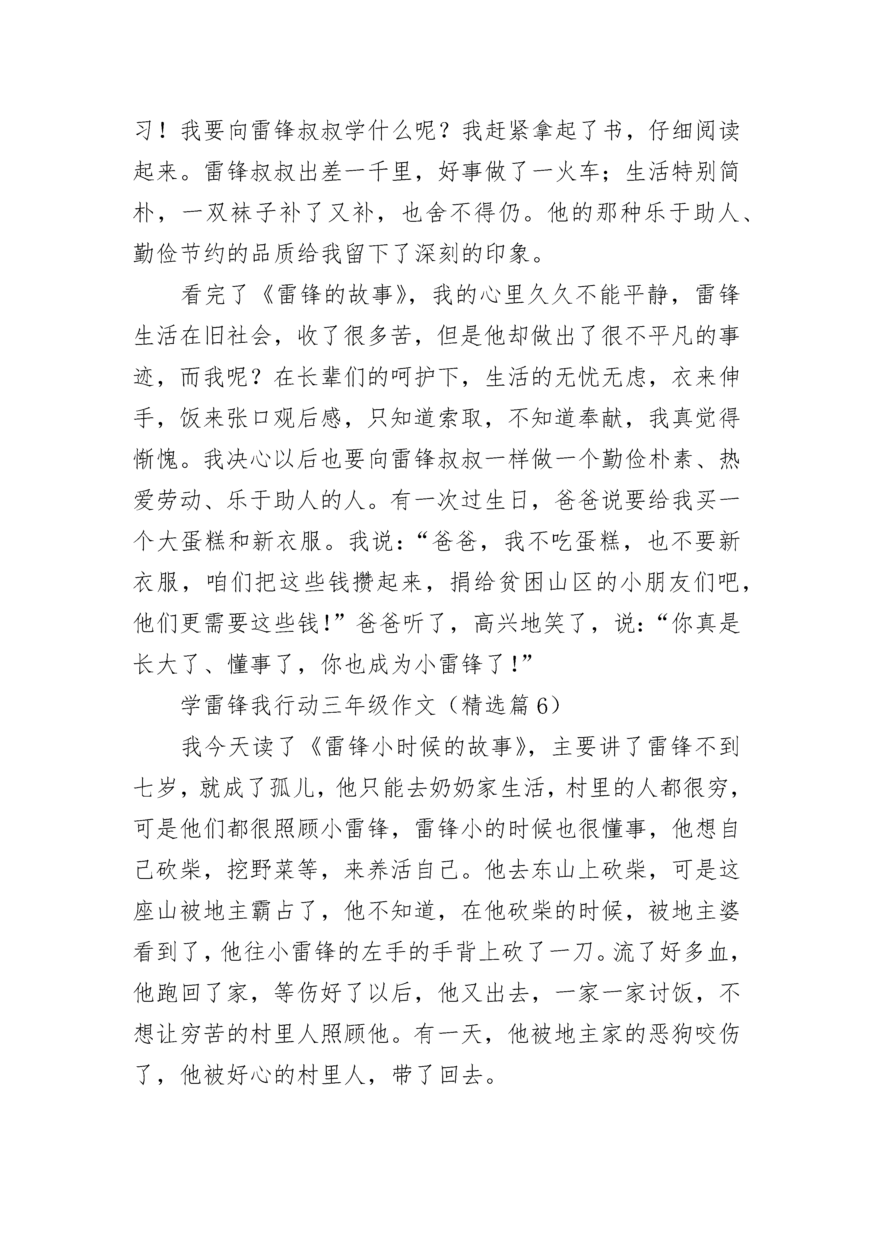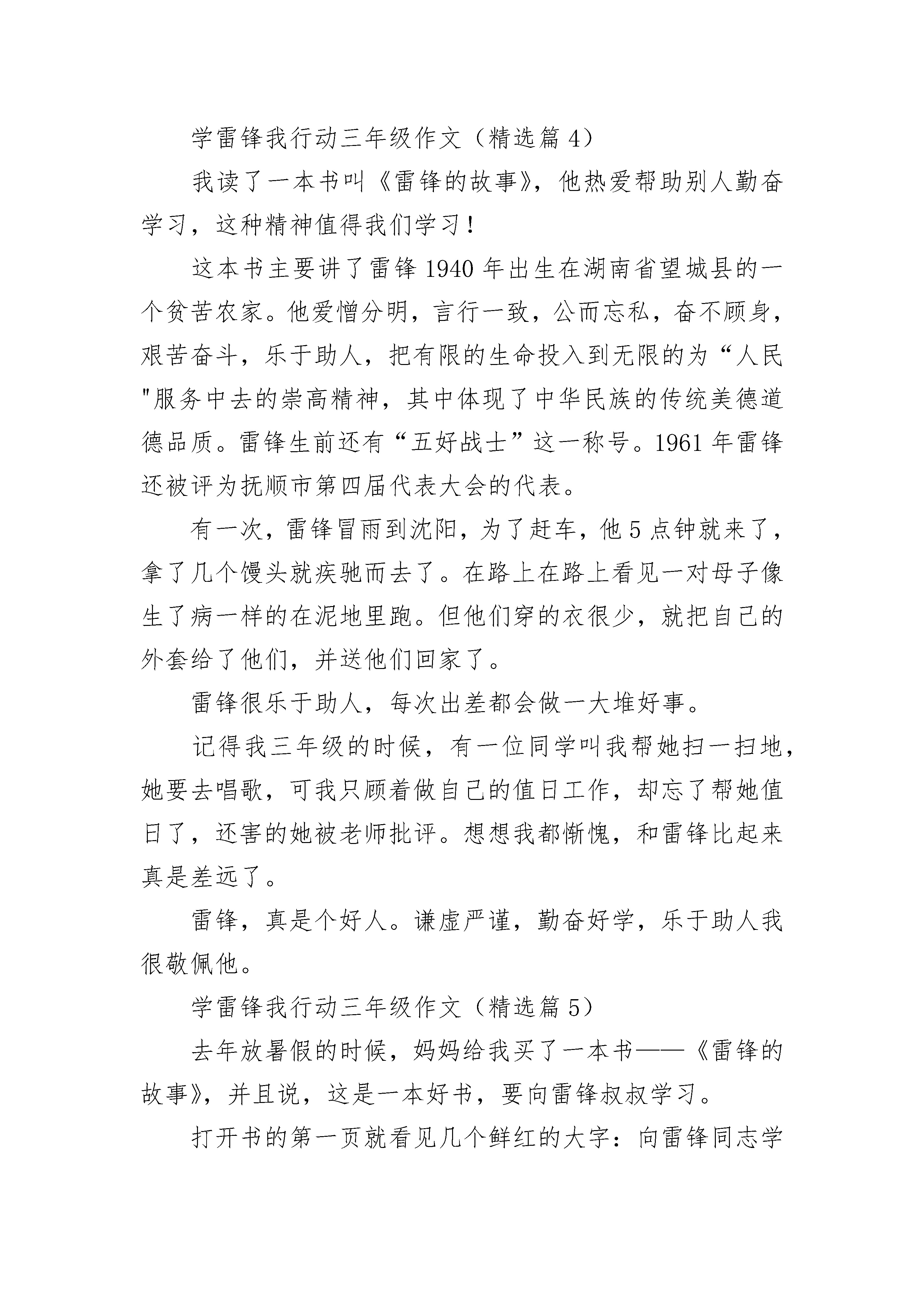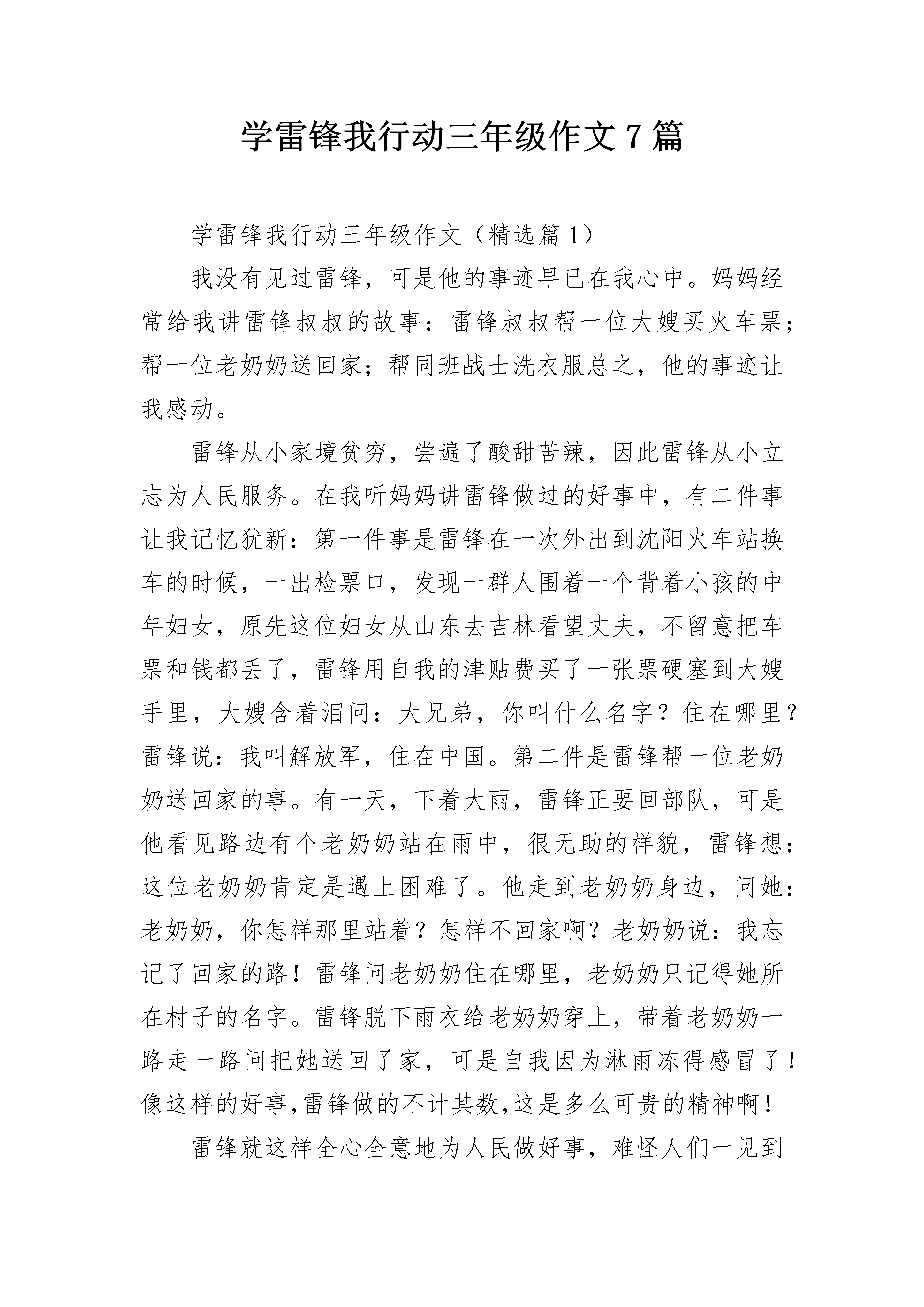 学雷锋我行动三年级作文7篇学雷锋我行动三年级作文(精选篇1)我没有见过雷锋,可是他的事迹早已在我心中。妈妈经常给我讲雷锋叔叔的故事:雷锋叔叔帮一位大嫂买火车票;帮一位老奶奶送回家;帮同班战士洗衣服总之,他的事迹让我感动。雷锋从小家境贫穷,尝遍了酸甜苦辣,因此雷锋从小立志为人民服务。在我听妈妈讲雷锋做过的好事中,有二件事让我记忆犹新:第一件事是雷锋在一次外出到沈阳火车站换车的时候,一出检票口,发现一群人围着一个背着小孩的中年妇女,原先这位妇女从山东去吉林看望丈夫,不留意把车票和钱都丢了,雷锋用自我的津贴费买了一张票硬塞到大嫂手里,大嫂含着泪问:大兄弟,你叫什么名字?住在哪里?雷锋说:我叫解放军,住在中国。第二件是雷锋帮一位老奶奶送回家的事。有一天,下着大雨,雷锋正要回部队,可是他看见路边有个老奶奶站在雨中,很无助的样貌,雷锋想:这位老奶奶肯定是遇上困难了。他走到老奶奶身边,问她:老奶奶,你怎样那里站着?怎样不回家啊?老奶奶说:我忘记了回家的路!雷锋问老奶奶住在哪里,老奶奶只记得她所在村子的名字。雷锋脱下雨衣给老奶奶穿上,带着老奶奶一路走一路问把她送回了家,可是自我因为淋雨冻得感冒了!像这样的好事,雷锋做的不计其数,这是多么可贵的精神啊!雷锋就这样全心全意地为人民做好事,难怪人们一见到为人民做好事的人就想起雷锋。正如人们所流传的那样:雷锋出差一千里,好事做了一火车。雷锋,一个伟大的名字,在我的心中闪烁着不灭的光辉,他把自我宝贵的青春毫无保留地献给了党,献给了人民。作为一名小学生,我要向雷锋同志学习,继承雷锋助人为乐的高贵品质,在学习和生活中要尽自我所能帮忙别人,为党为人民作出更大的贡献!学雷锋我行动三年级作文(精选篇2)“人的生命是有限的,可是为人民服务是无限的,我要把有限的生命,投入到无限的为人民服务之中去。”这是雷锋的一句名言。雷锋的精神是一种无私奉献的精神。他是一个毫无自私自利之心的共产主义战士;他是一个把自己的命运同祖国人民的命运紧密地连接在一起的战士;他是我们身边的榜样。在这美好的三月里,有一个重要的节日——雷锋日。这一天,我和几个小伙伴做了件有意义的事——捡垃圾。我们一人带了一双筷子,一双手套,一个垃圾袋。我们就在小区大院干了起来。在草坪、花池和健身广场里捡,我们走遍了小区的各个角落。大概过了一个多小时,我们几个感觉有点儿累,腰酸了,真想休息一会儿。这时我想到了雷锋,于是我对大家说:“我们应该学习雷锋,不怕苦,不怕累,大家努力干吧!”接着我们又干了起来。我们把小区的垃圾捡的干干净净的,还捡了许多可回收的垃圾。望着这又重新露出灿烂笑容的小区,我们高兴极了!就在这时,有一户人家出来了,他看到这干净的小区说:“这是谁打扫的,这么干净。”他的话音刚落,我就想起,雷锋做完好事不留名。我们谁也没说话,就是心里美滋滋的。“人的生命是有限的,可是为人民服务是无限的。”这句话说的对。我们要向雷锋同志学习,多为人民服务。学习雷锋战士的钉子精神。向雷锋同志致敬!学雷锋我行动三年级作文(精选篇3)今天中午,我把《雷锋的故事》全部看完一遍,之后,我的心久久不能平静。我心里想雷锋仅仅四岁,爸爸被日本人抓去毒打,家里没有钱医治,哥哥又在爸爸去世第二年的肺结核有事没钱治疗,死了。连病带饿,弟弟2死了,妈妈走投无路,悬梁自尽,雷锋变成了孤儿,他在妈妈的遗体旁又哭又闹,可是雷锋的呼喊妈妈再也听不到了。还好妈妈死前叫雷锋去六叔奶奶家住。雷锋的家乡解放了,党收留了雷锋。雷锋非常的好学,看书总是看到深更半夜,仿佛要把前几年没有看的书全部的不上来,黑眼圈都出来了,直到自己眼睛睁不开为止,别人怎么叫都不行。一天,他和张书记走在路上的时候看见一颗螺丝钉,雷锋用脚踢了它,张书记说:“螺丝钉也有它的用处,少了它就会缺少点什么,世界就不那么美好了。”雷锋心里想我不就是一颗小小的螺丝钉吗?哪里需要我就应该到哪里去无论有多么地艰难。从此雷锋就更认真了。不幸的事情发生了,在雷锋二十二岁的时候就应公牺牲了,可雷锋的精神却永远刻在我们心中。学雷锋我行动三年级作文(精选篇4)我读了一本书叫《雷锋的故事》,他热爱帮助别人勤奋学习,这种精神值得我们学习!这本书主要讲了雷锋1940年出生在湖南省望城县的一个贫苦农家。他爱憎分明,言行一致,公而忘私,奋不顾身,艰苦奋斗,乐于助人,把有限的生命投入到无限的为“人民"服务中去的崇高精神,其中体现了中华民族的传统美德道德品质。雷锋生前还有“五好战士”这一称号。1961年雷锋还被评为抚顺市第四届代表大会的代表。有一次,雷锋冒雨到沈阳,为了赶车,他5点钟就来了,拿了几个馒头就疾驰而去了。在路上在路上看见一对母子像生了病一样的在泥地里跑。但他们穿的衣很少,就把自己的外套给了他们,并送他们回家了。雷锋很乐于助人,每次出差都会做一大堆好事。记得我三年级的