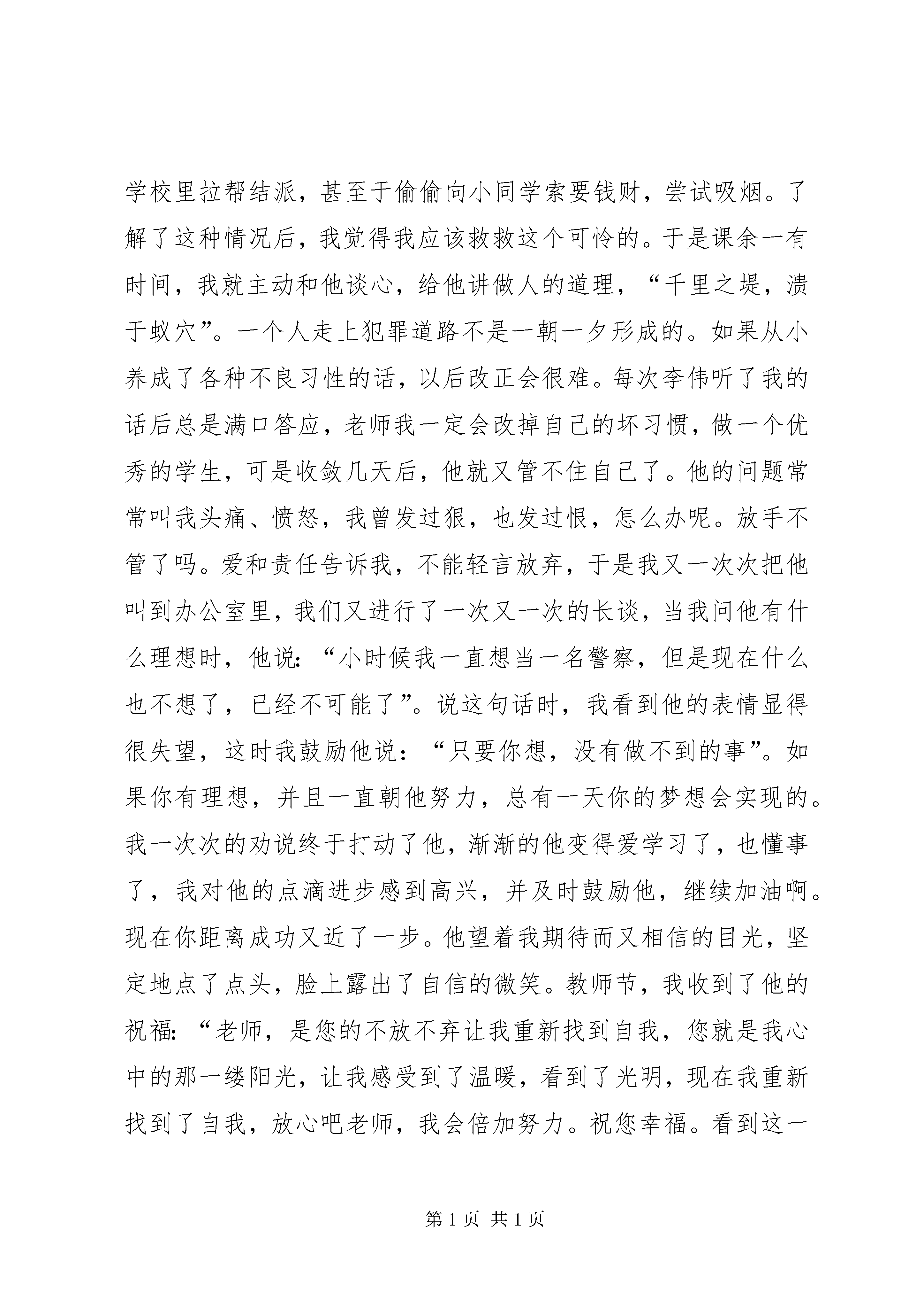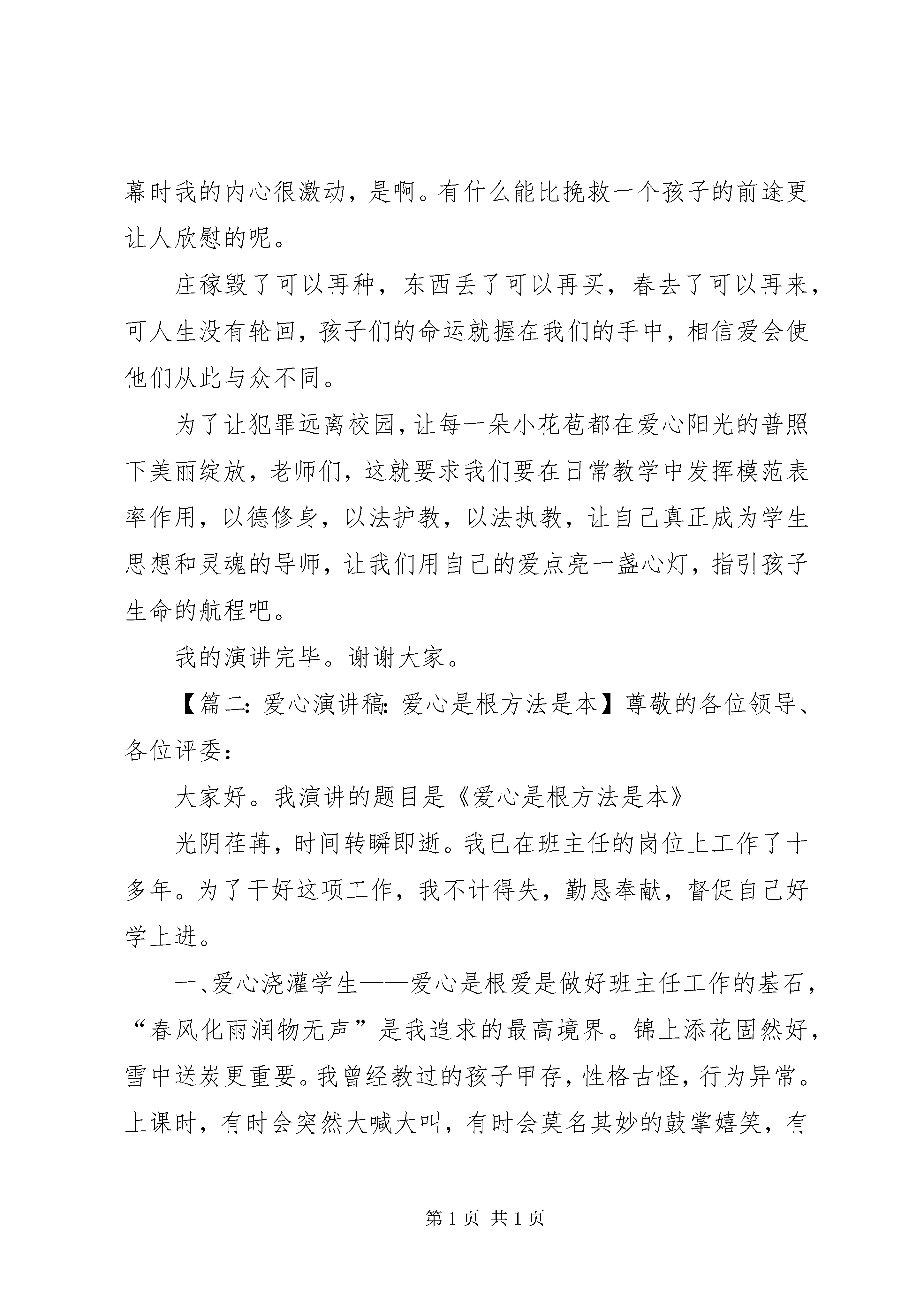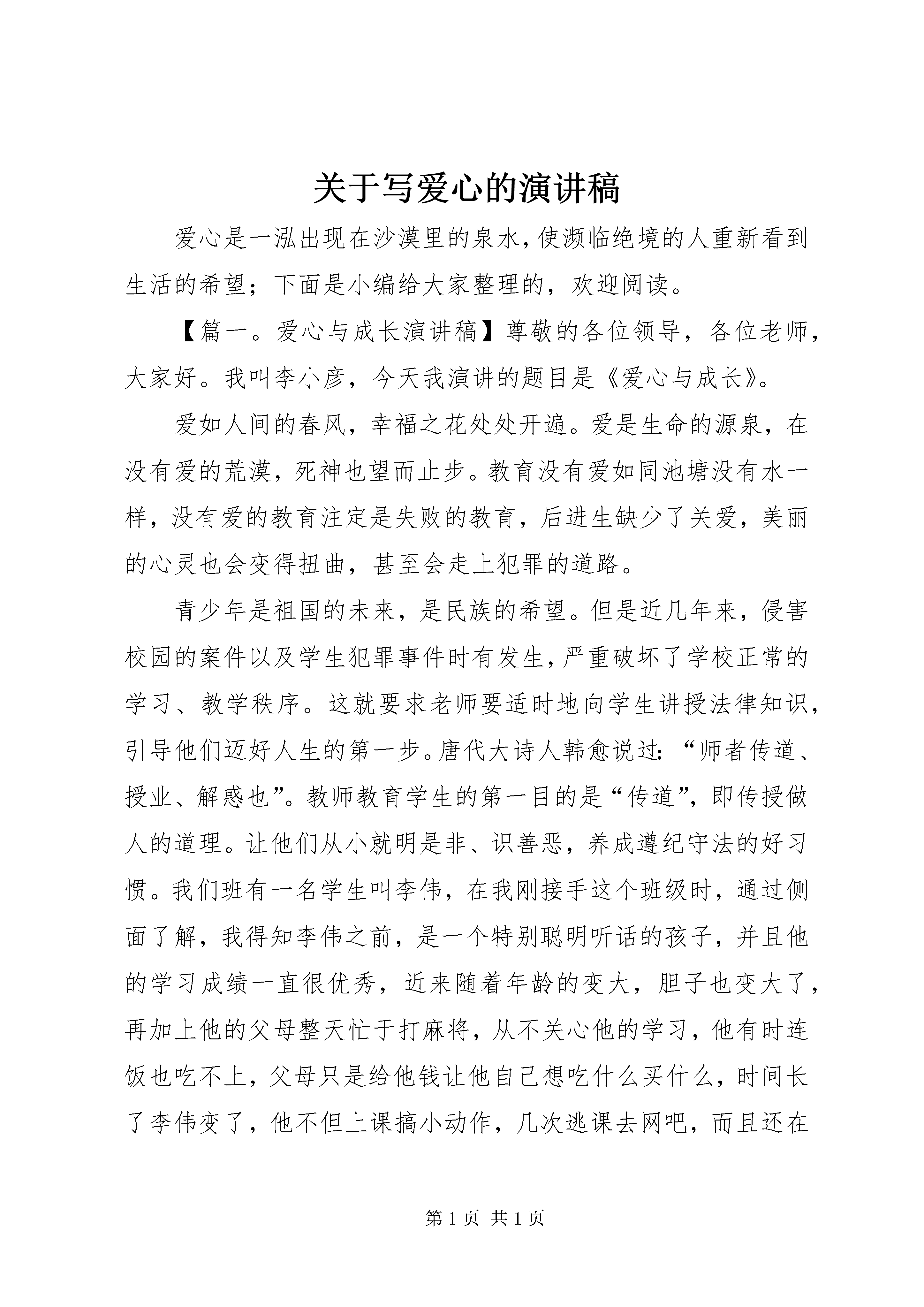 关于写爱心的演讲稿爱心是一泓出现在沙漠里的泉水,使濒临绝境的人重新看到生活的希望;下面是小编给大家整理的,欢迎阅读。【篇一。爱心与成长演讲稿】尊敬的各位领导,各位老师,大家好。我叫李小彦,今天我演讲的题目是《爱心与成长》。爱如人间的春风,幸福之花处处开遍。爱是生命的源泉,在没有爱的荒漠,死神也望而止步。教育没有爱如同池塘没有水一样,没有爱的教育注定是失败的教育,后进生缺少了关爱,美丽的心灵也会变得扭曲,甚至会走上犯罪的道路。青少年是祖国的未来,是民族的希望。但是近几年来,侵害校园的案件以及学生犯罪事件时有发生,严重破坏了学校正常的学习、教学秩序。这就要求老师要适时地向学生讲授法律知识,引导他们迈好人生的第一步。唐代大诗人韩愈说过:“师者传道、授业、解惑也”。教师教育学生的第一目的是“传道”,即传授做人的道理。让他们从小就明是非、识善恶,养成遵纪守法的好习惯。我们班有一名学生叫李伟,在我刚接手这个班级时,通过侧面了解,我得知李伟之前,是一个特别聪明听话的孩子,并且他的学习成绩一直很优秀,近来随着年龄的变大,胆子也变大了,再加上他的父母整天忙于打麻将,从不关心他的学习,他有时连饭也吃不上,父母只是给他钱让他自己想吃什么买什么,时间长了李伟变了,他不但上课搞小动作,几次逃课去网吧,而且还在学校里拉帮结派,甚至于偷偷向小同学索要钱财,尝试吸烟。了解了这种情况后,我觉得我应该救救这个可怜的。于是课余一有时间,我就主动和他谈心,给他讲做人的道理,“千里之堤,溃于蚁穴”。一个人走上犯罪道路不是一朝一夕形成的。如果从小养成了各种不良习性的话,以后改正会很难。每次李伟听了我的话后总是满口答应,老师我一定会改掉自己的坏习惯,做一个优秀的学生,可是收敛几天后,他就又管不住自己了。他的问题常常叫我头痛、愤怒,我曾发过狠,也发过恨,怎么办呢。放手不管了吗。爱和责任告诉我,不能轻言放弃,于是我又一次次把他叫到办公室里,我们又进行了一次又一次的长谈,当我问他有什么理想时,他说:“小时候我一直想当一名警察,但是现在什么也不想了,已经不可能了”。说这句话时,我看到他的表情显得很失望,这时我鼓励他说:“只要你想,没有做不到的事”。如果你有理想,并且一直朝他努力,总有一天你的梦想会实现的。我一次次的劝说终于打动了他,渐渐的他变得爱学习了,也懂事了,我对他的点滴进步感到高兴,并及时鼓励他,继续加油啊。现在你距离成功又近了一步。他望着我期待而又相信的目光,坚定地点了点头,脸上露出了自信的微笑。教师节,我收到了他的祝福:“老师,是您的不放不弃让我重新找到自我,您就是我心中的那一缕阳光,让我感受到了温暖,看到了光明,现在我重新找到了自我,放心吧老师,我会倍加努力。祝您幸福。看到这一幕时我的内心很激动,是啊。有什么能比挽救一个孩子的前途更让人欣慰的呢。庄稼毁了可以再种,东西丢了可以再买,春去了可以再来,可人生没有轮回,孩子们的命运就握在我们的手中,相信爱会使他们从此与众不同。为了让犯罪远离校园,让每一朵小花苞都在爱心阳光的普照下美丽绽放,老师们,这就要求我们要在日常教学中发挥模范表率作用,以德修身,以法护教,以法执教,让自己真正成为学生思想和灵魂的导师,让我们用自己的爱点亮一盏心灯,指引孩子生命的航程吧。我的演讲完毕。谢谢大家。【篇二:爱心演讲稿:爱心是根方法是本】尊敬的各位领导、各位评委:大家好。我演讲的题目是《爱心是根方法是本》光阴荏苒,时间转瞬即逝。我已在班主任的岗位上工作了十多年。为了干好这项工作,我不计得失,勤恳奉献,督促自己好学上进。一、爱心浇灌学生——爱心是根爱是做好班主任工作的基石,“春风化雨润物无声”是我追求的最高境界。锦上添花固然好,雪中送炭更重要。我曾经教过的孩子甲存,性格古怪,行为异常。上课时,有时会突然大喊大叫,有时会莫名其妙的鼓掌嬉笑,有时会钻入桌底爬来爬去。面对一个只有六岁多的孩子,任何道理的说教都是苍白的。我只能用我的爱去唤醒他沉睡的心灵。他的脸脏了,我会倒上一盆温水,帮他洗;他哭了,我会轻轻把他拦入怀里,抚摸他;他说话时,我会弯下腰,微笑着听他倾诉。慢慢的他变得懂事多了,课上也安静多了。经常会跑到我面前笑咪咪的看着我,有时会悄悄的告诉我他所谓的小秘密。在我爱心的呵护下,甲存同学终于融入了集体这个大家庭。一次,我感冒请假,当我第二天返校一进教室时,甲存突然跑到我的面前,抬起稚嫩的小脸一本正经地问我:“老师,您好了吗。”刹那间,我哽咽了,泪水盈满了眼眶。我摸着他的头,轻声说:“谢谢你,老师好了。”一句话刚说完,泪水就流了下来。我们常说“一份耕耘,一份收获”,可当这份收获突然降临时,作为老师我怎能不感到莫大的欣慰与幸福呢。我深信是爱让这朵花苏醒,让他绽放。爱心是根哪。二、人人有事做,事事有人做——方法是本“班级是我家,管