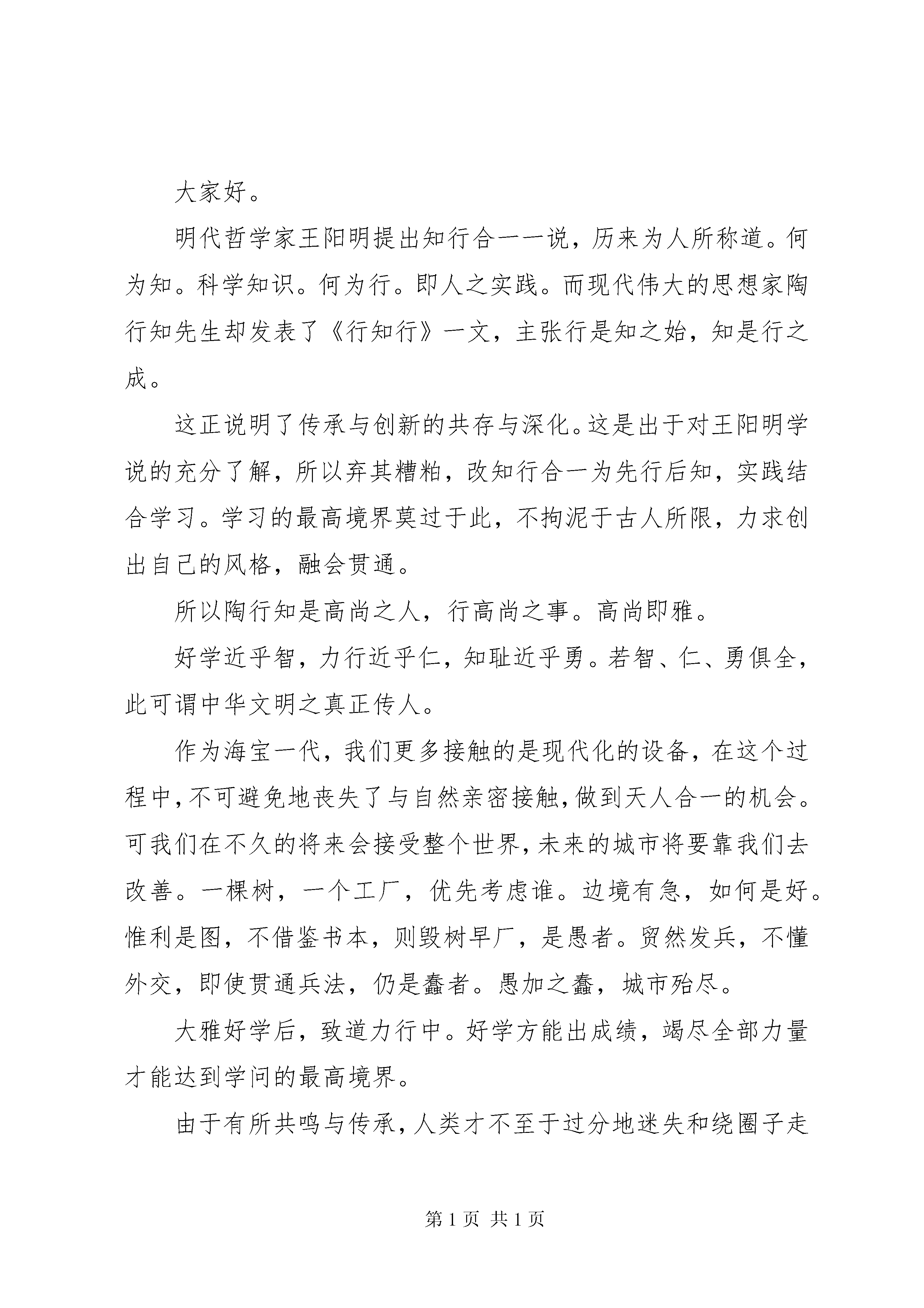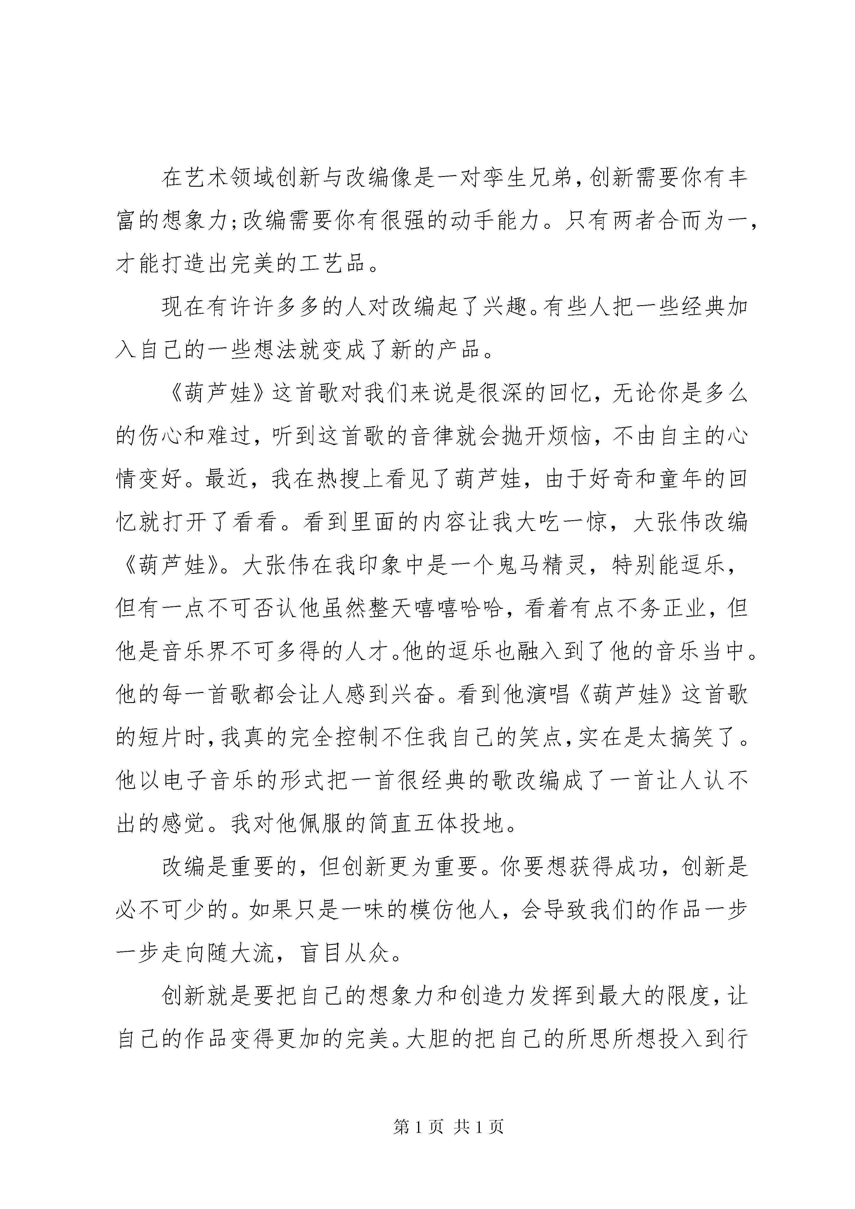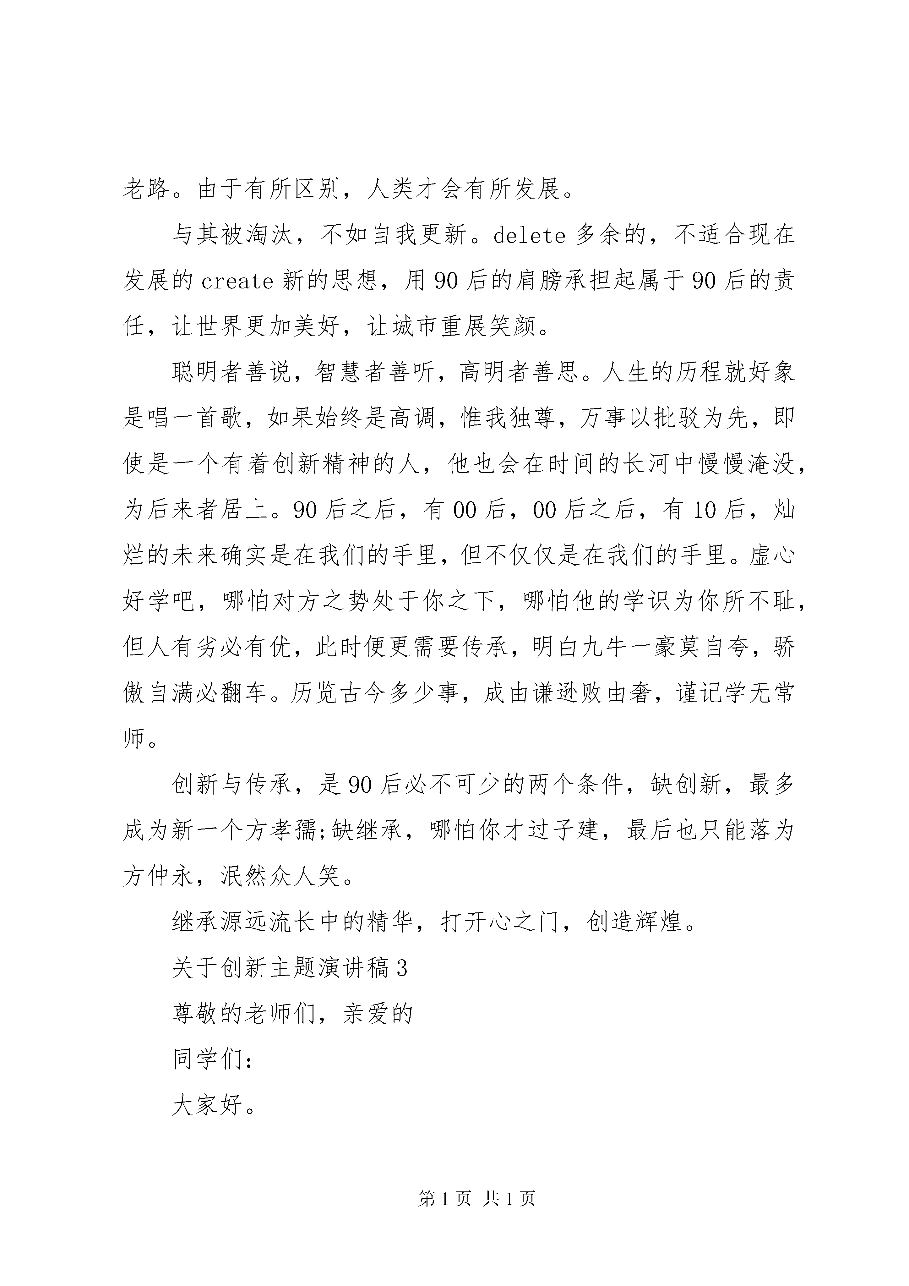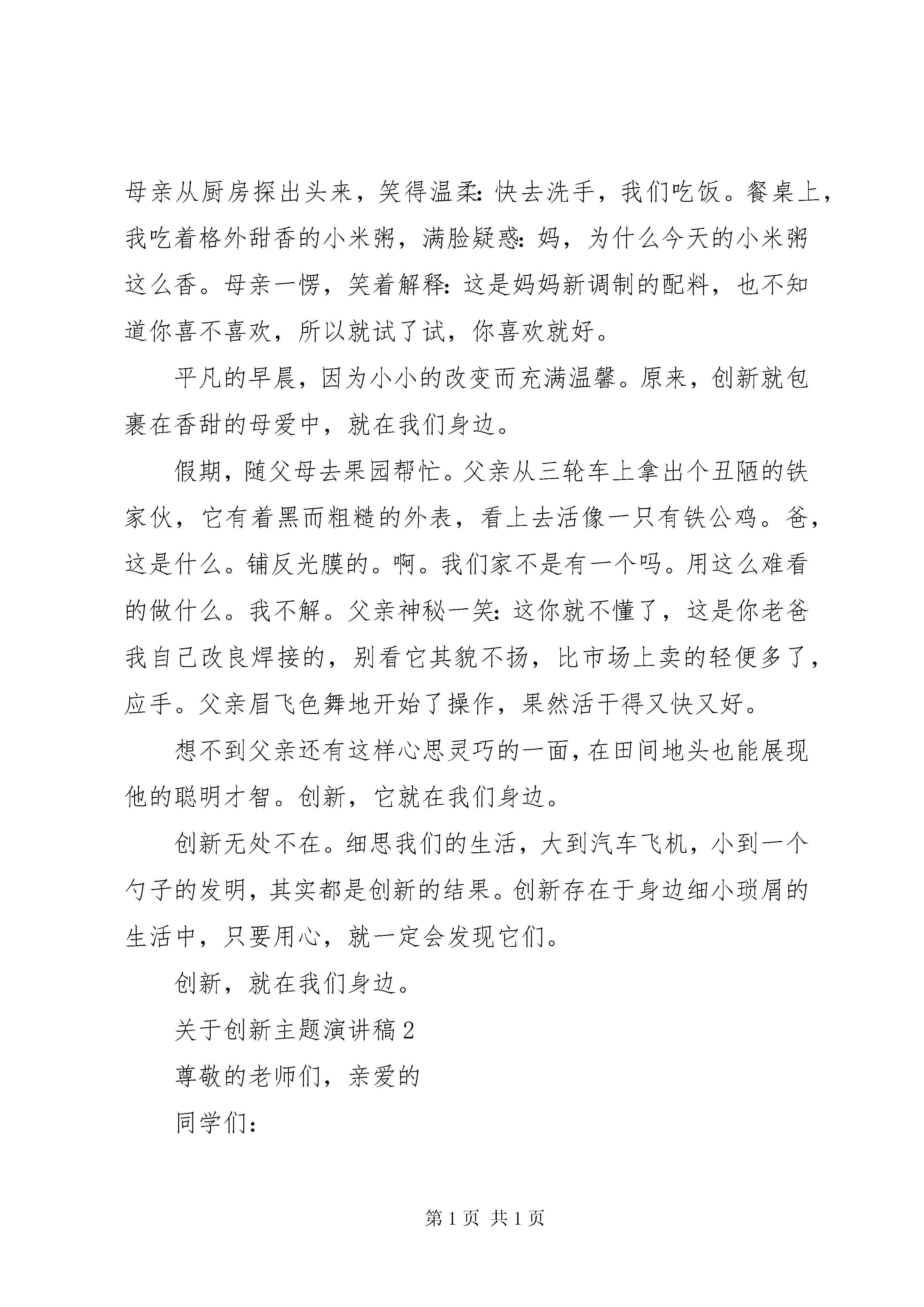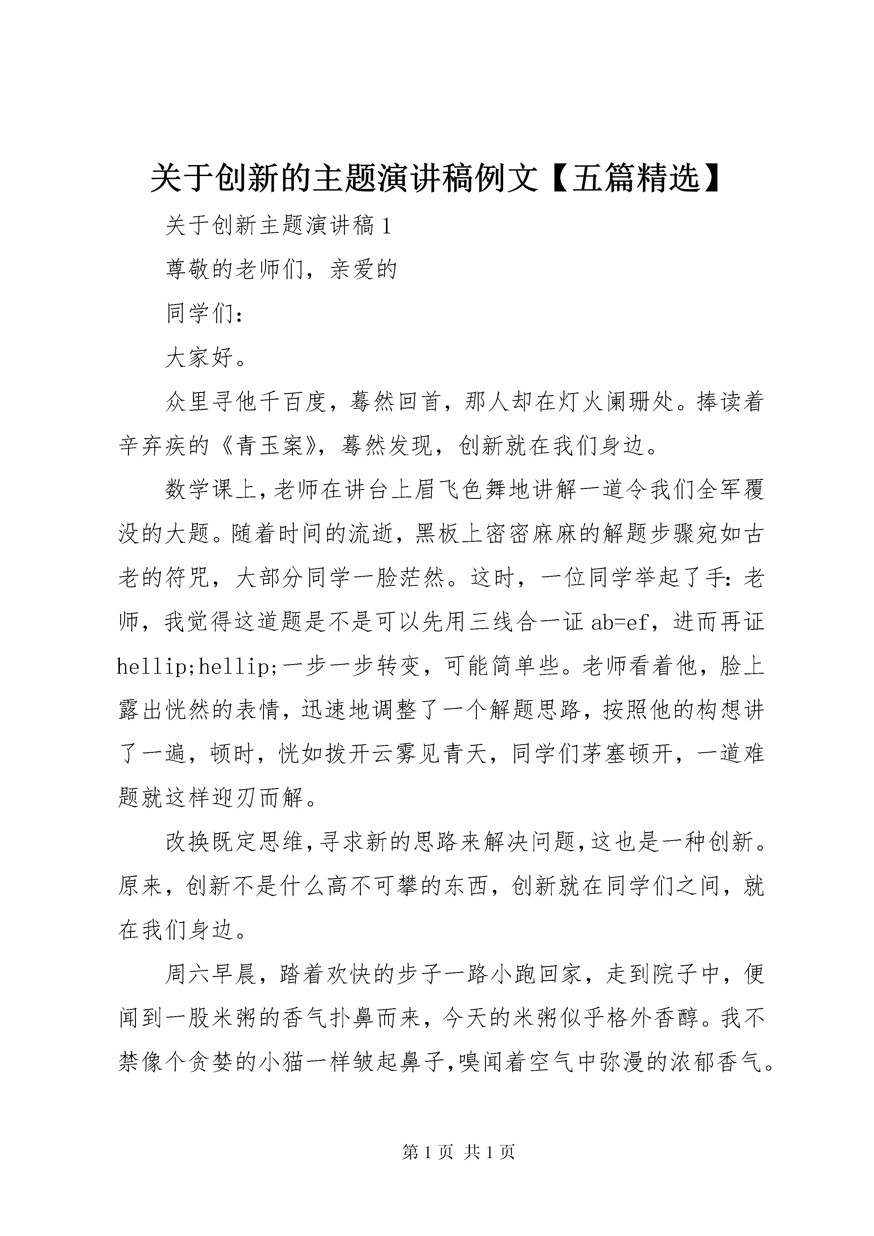 关于创新的主题演讲稿例文【五篇精选】关于创新主题演讲稿1尊敬的老师们,亲爱的同学们:大家好。众里寻他千百度,蓦然回首,那人却在灯火阑珊处。捧读着辛弃疾的《青玉案》,蓦然发现,创新就在我们身边。数学课上,老师在讲台上眉飞色舞地讲解一道令我们全军覆没的大题。随着时间的流逝,黑板上密密麻麻的解题步骤宛如古老的符咒,大部分同学一脸茫然。这时,一位同学举起了手:老师,我觉得这道题是不是可以先用三线合一证ab=ef,进而再证hellip;hellip;一步一步转变,可能简单些。老师看着他,脸上露出恍然的表情,迅速地调整了一个解题思路,按照他的构想讲了一遍,顿时,恍如拨开云雾见青天,同学们茅塞顿开,一道难题就这样迎刃而解。改换既定思维,寻求新的思路来解决问题,这也是一种创新。原来,创新不是什么高不可攀的东西,创新就在同学们之间,就在我们身边。周六早晨,踏着欢快的步子一路小跑回家,走到院子中,便闻到一股米粥的香气扑鼻而来,今天的米粥似乎格外香醇。我不禁像个贪婪的小猫一样皱起鼻子,嗅闻着空气中弥漫的浓郁香气。母亲从厨房探出头来,笑得温柔:快去洗手,我们吃饭。餐桌上,我吃着格外甜香的小米粥,满脸疑惑:妈,为什么今天的小米粥这么香。母亲一愣,笑着解释:这是妈妈新调制的配料,也不知道你喜不喜欢,所以就试了试,你喜欢就好。平凡的早晨,因为小小的改变而充满温馨。原来,创新就包裹在香甜的母爱中,就在我们身边。假期,随父母去果园帮忙。父亲从三轮车上拿出个丑陋的铁家伙,它有着黑而粗糙的外表,看上去活像一只有铁公鸡。爸,这是什么。铺反光膜的。啊。我们家不是有一个吗。用这么难看的做什么。我不解。父亲神秘一笑:这你就不懂了,这是你老爸我自己改良焊接的,别看它其貌不扬,比市场上卖的轻便多了,应手。父亲眉飞色舞地开始了操作,果然活干得又快又好。想不到父亲还有这样心思灵巧的一面,在田间地头也能展现他的聪明才智。创新,它就在我们身边。创新无处不在。细思我们的生活,大到汽车飞机,小到一个勺子的发明,其实都是创新的结果。创新存在于身边细小琐屑的生活中,只要用心,就一定会发现它们。创新,就在我们身边。关于创新主题演讲稿2尊敬的老师们,亲爱的同学们:大家好。明代哲学家王阳明提出知行合一一说,历来为人所称道。何为知。科学知识。何为行。即人之实践。而现代伟大的思想家陶行知先生却发表了《行知行》一文,主张行是知之始,知是行之成。这正说明了传承与创新的共存与深化。这是出于对王阳明学说的充分了解,所以弃其糟粕,改知行合一为先行后知,实践结合学习。学习的最高境界莫过于此,不拘泥于古人所限,力求创出自己的风格,融会贯通。所以陶行知是高尚之人,行高尚之事。高尚即雅。好学近乎智,力行近乎仁,知耻近乎勇。若智、仁、勇俱全,此可谓中华文明之真正传人。作为海宝一代,我们更多接触的是现代化的设备,在这个过程中,不可避免地丧失了与自然亲密接触,做到天人合一的机会。可我们在不久的将来会接受整个世界,未来的城市将要靠我们去改善。一棵树,一个工厂,优先考虑谁。边境有急,如何是好。惟利是图,不借鉴书本,则毁树早厂,是愚者。贸然发兵,不懂外交,即使贯通兵法,仍是蠢者。愚加之蠢,城市殆尽。大雅好学后,致道力行中。好学方能出成绩,竭尽全部力量才能达到学问的最高境界。由于有所共鸣与传承,人类才不至于过分地迷失和绕圈子走老路。由于有所区别,人类才会有所发展。与其被淘汰,不如自我更新。delete多余的,不适合现在发展的create新的思想,用90后的肩膀承担起属于90后的责任,让世界更加美好,让城市重展笑颜。聪明者善说,智慧者善听,高明者善思。人生的历程就好象是唱一首歌,如果始终是高调,惟我独尊,万事以批驳为先,即使是一个有着创新精神的人,他也会在时间的长河中慢慢淹没,为后来者居上。90后之后,有00后,00后之后,有10后,灿烂的未来确实是在我们的手里,但不仅仅是在我们的手里。虚心好学吧,哪怕对方之势处于你之下,哪怕他的学识为你所不耻,但人有劣必有优,此时便更需要传承,明白九牛一豪莫自夸,骄傲自满必翻车。历览古今多少事,成由谦逊败由奢,谨记学无常师。创新与传承,是90后必不可少的两个条件,缺创新,最多成为新一个方孝孺;缺继承,哪怕你才过子建,最后也只能落为方仲永,泯然众人笑。继承源远流长中的精华,打开心之门,创造辉煌。关于创新主题演讲稿3尊敬的老师们,亲爱的同学们:大家好。在艺术领域创新与改编像是一对孪生兄弟,创新需要你有丰富的想象力;改编需要你有很强的动手能力。只有两者合而为一,才能打造出完美的工艺品。现在有许许多多的人对改编起了兴趣。有些人把一些经典加入自己的一些想法就变成了新的产品。《葫芦娃》这首歌对我们来说是很深的回忆,无论你是多么的伤心和难过,听到这首歌的音律就会抛开烦恼,不由自主的心情变