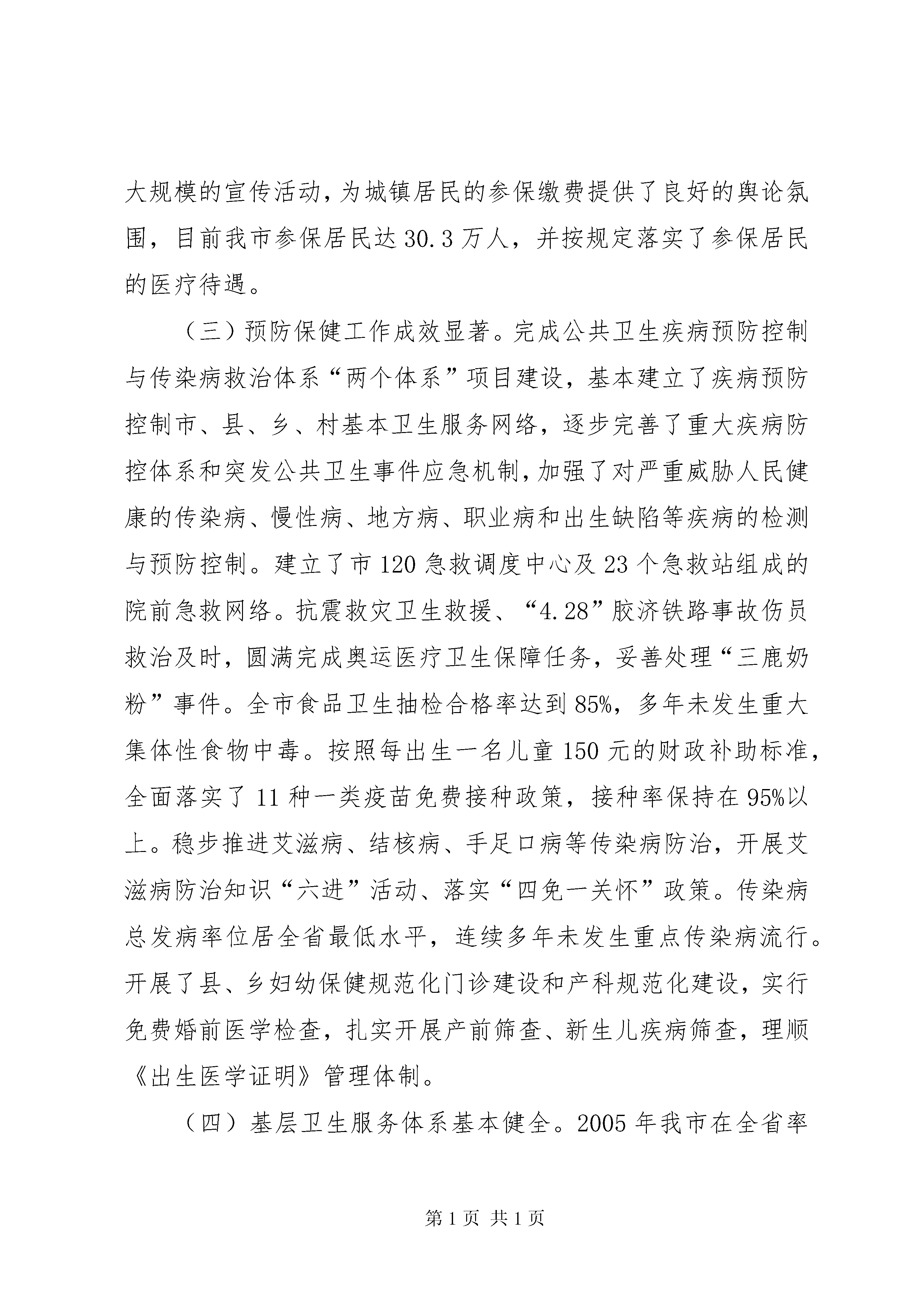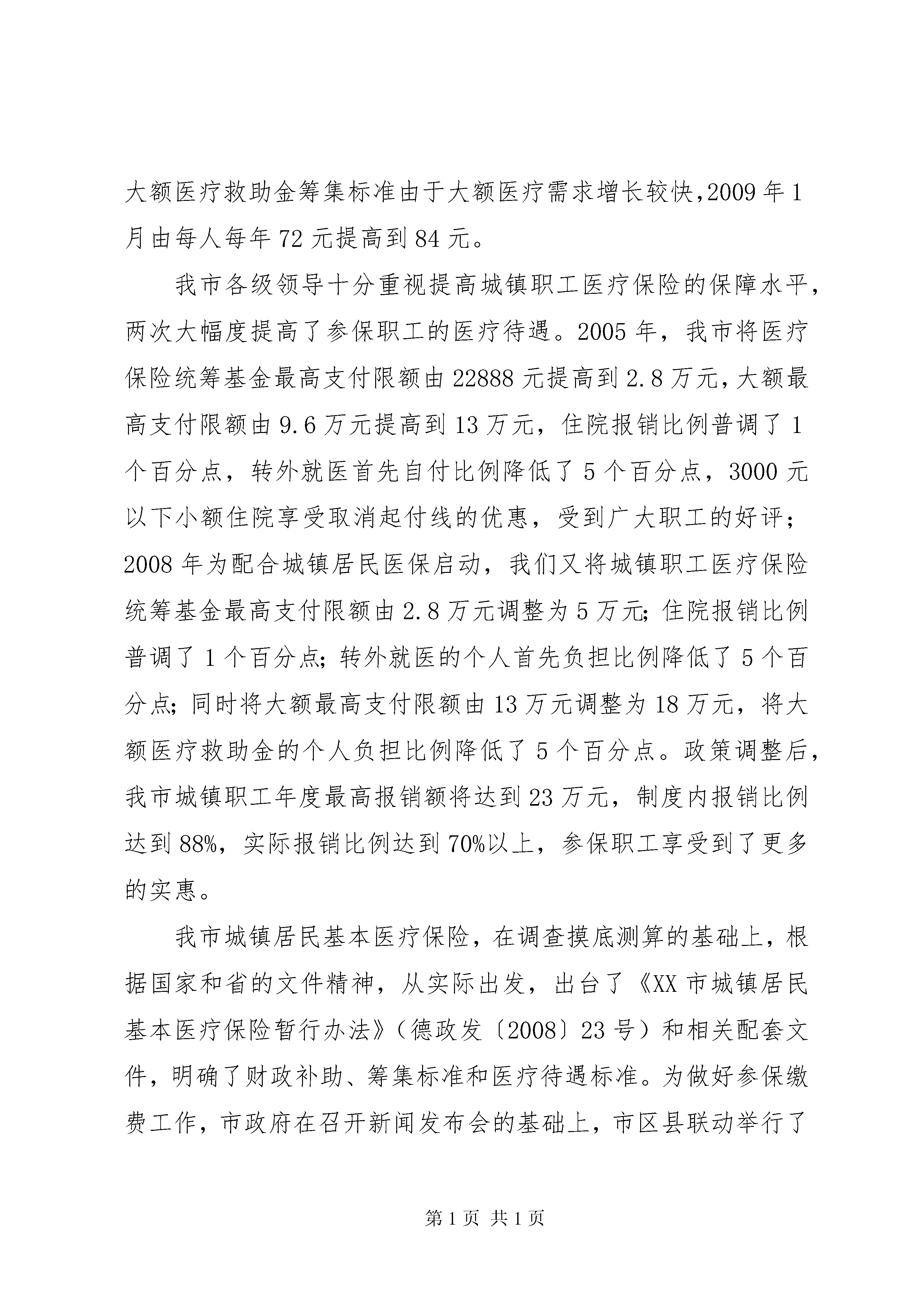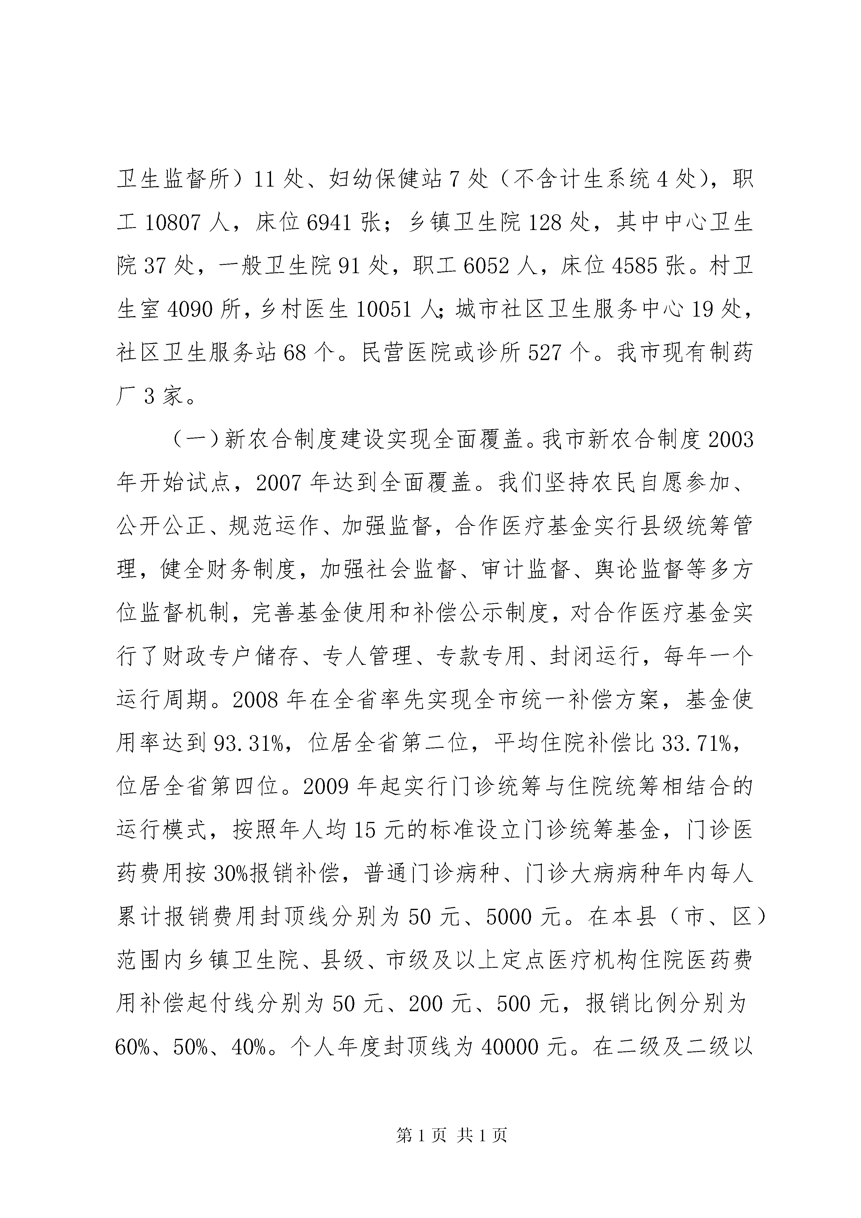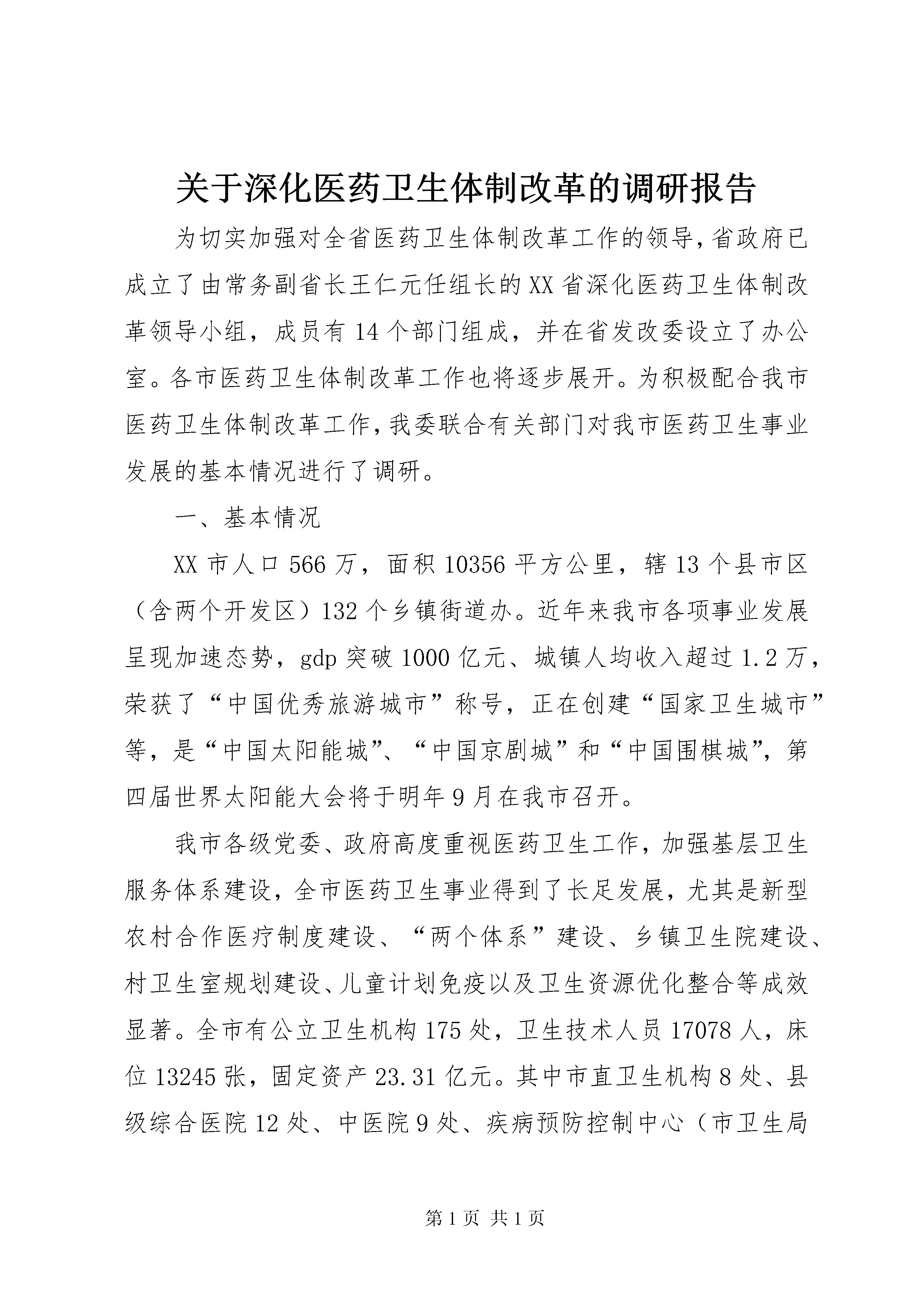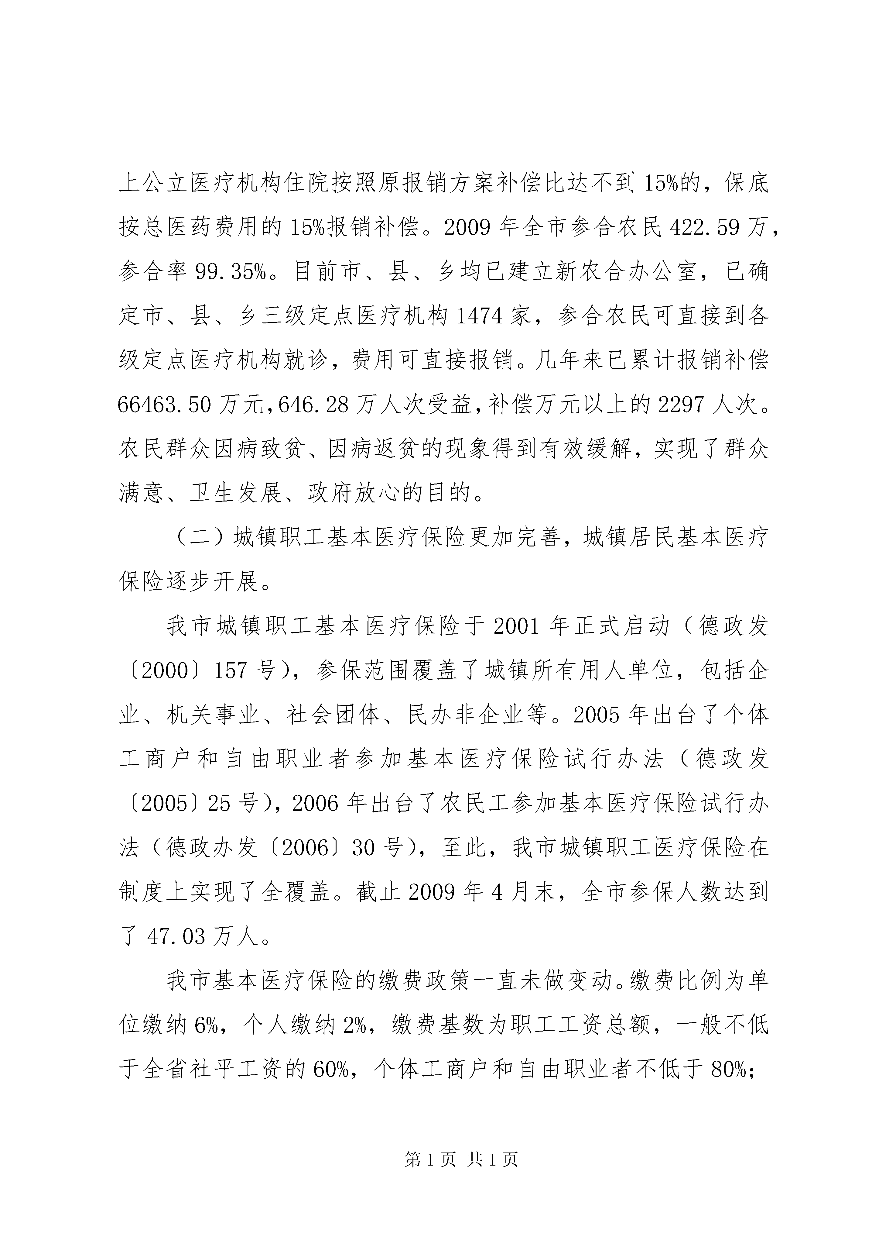关于深化医药卫生体制改革的调研报告为切实加强对全省医药卫生体制改革工作的领导,省政府已成立了由常务副省长王仁元任组长的XX省深化医药卫生体制改革领导小组,成员有14个部门组成,并在省发改委设立了办公室。各市医药卫生体制改革工作也将逐步展开。为积极配合我市医药卫生体制改革工作,我委联合有关部门对我市医药卫生事业发展的基本情况进行了调研。一、基本情况XX市人口566万,面积10356平方公里,辖13个县市区(含两个开发区)132个乡镇街道办。近年来我市各项事业发展呈现加速态势,gdp突破1000亿元、城镇人均收入超过1.2万,荣获了“中国优秀旅游城市”称号,正在创建“国家卫生城市”等,是“中国太阳能城”、“中国京剧城”和“中国围棋城”,第四届世界太阳能大会将于明年9月在我市召开。我市各级党委、政府高度重视医药卫生工作,加强基层卫生服务体系建设,全市医药卫生事业得到了长足发展,尤其是新型农村合作医疗制度建设、“两个体系”建设、乡镇卫生院建设、村卫生室规划建设、儿童计划免疫以及卫生资源优化整合等成效显著。全市有公立卫生机构175处,卫生技术人员17078人,床位13245张,固定资产23.31亿元。其中市直卫生机构8处、县级综合医院12处、中医院9处、疾病预防控制中心(市卫生局卫生监督所)11处、妇幼保健站7处(不含计生系统4处),职工10807人,床位6941张;乡镇卫生院128处,其中中心卫生院37处,一般卫生院91处,职工6052人,床位4585张。村卫生室4090所,乡村医生10051人;城市社区卫生服务中心19处,社区卫生服务站68个。民营医院或诊所527个。我市现有制药厂3家。(一)新农合制度建设实现全面覆盖。我市新农合制度2003年开始试点,2007年达到全面覆盖。我们坚持农民自愿参加、公开公正、规范运作、加强监督,合作医疗基金实行县级统筹管理,健全财务制度,加强社会监督、审计监督、舆论监督等多方位监督机制,完善基金使用和补偿公示制度,对合作医疗基金实行了财政专户储存、专人管理、专款专用、封闭运行,每年一个运行周期。2008年在全省率先实现全市统一补偿方案,基金使用率达到93.31%,位居全省第二位,平均住院补偿比33.71%,位居全省第四位。2009年起实行门诊统筹与住院统筹相结合的运行模式,按照年人均15元的标准设立门诊统筹基金,门诊医药费用按30%报销补偿,普通门诊病种、门诊大病病种年内每人累计报销费用封顶线分别为50元、5000元。在本县(市、区)范围内乡镇卫生院、县级、市级及以上定点医疗机构住院医药费用补偿起付线分别为50元、200元、500元,报销比例分别为60%、50%、40%。个人年度封顶线为40000元。在二级及二级以上公立医疗机构住院按照原报销方案补偿比达不到15%的,保底按总医药费用的15%报销补偿。2009年全市参合农民422.59万,参合率99.35%。目前市、县、乡均已建立新农合办公室,已确定市、县、乡三级定点医疗机构1474家,参合农民可直接到各级定点医疗机构就诊,费用可直接报销。几年来已累计报销补偿66463.50万元,646.28万人次受益,补偿万元以上的2297人次。农民群众因病致贫、因病返贫的现象得到有效缓解,实现了群众满意、卫生发展、政府放心的目的。(二)城镇职工基本医疗保险更加完善,城镇居民基本医疗保险逐步开展。我市城镇职工基本医疗保险于2001年正式启动(德政发〔2000〕157号),参保范围覆盖了城镇所有用人单位,包括企业、机关事业、社会团体、民办非企业等。2005年出台了个体工商户和自由职业者参加基本医疗保险试行办法(德政发〔2005〕25号),2006年出台了农民工参加基本医疗保险试行办法(德政办发〔2006〕30号),至此,我市城镇职工医疗保险在制度上实现了全覆盖。截止2009年4月末,全市参保人数达到了47.03万人。我市基本医疗保险的缴费政策一直未做变动。缴费比例为单位缴纳6%,个人缴纳2%,缴费基数为职工工资总额,一般不低于全省社平工资的60%,个体工商户和自由职业者不低于80%;大额医疗救助金筹集标准由于大额医疗需求增长较快,2009年1月由每人每年72元提高到84元。我市各级领导十分重视提高城镇职工医疗保险的保障水平,两次大幅度提高了参保职工的医疗待遇。2005年,我市将医疗保险统筹基金最高支付限额由22888元提高到2.8万元,大额最高支付限额由9.6万元提高到13万元,住院报销比例普调了1个百分点,转外就医首先自付比例降低了5个百分点,3000元以下小额住院享受取消起付线的优惠,受到广大职工的好评;2008年为配合城镇居民医保启动,我们又将城镇职工医疗保险统筹基金最高支付限额由2.8万元调整为5万元;住院报销比例普调了1个百分点;