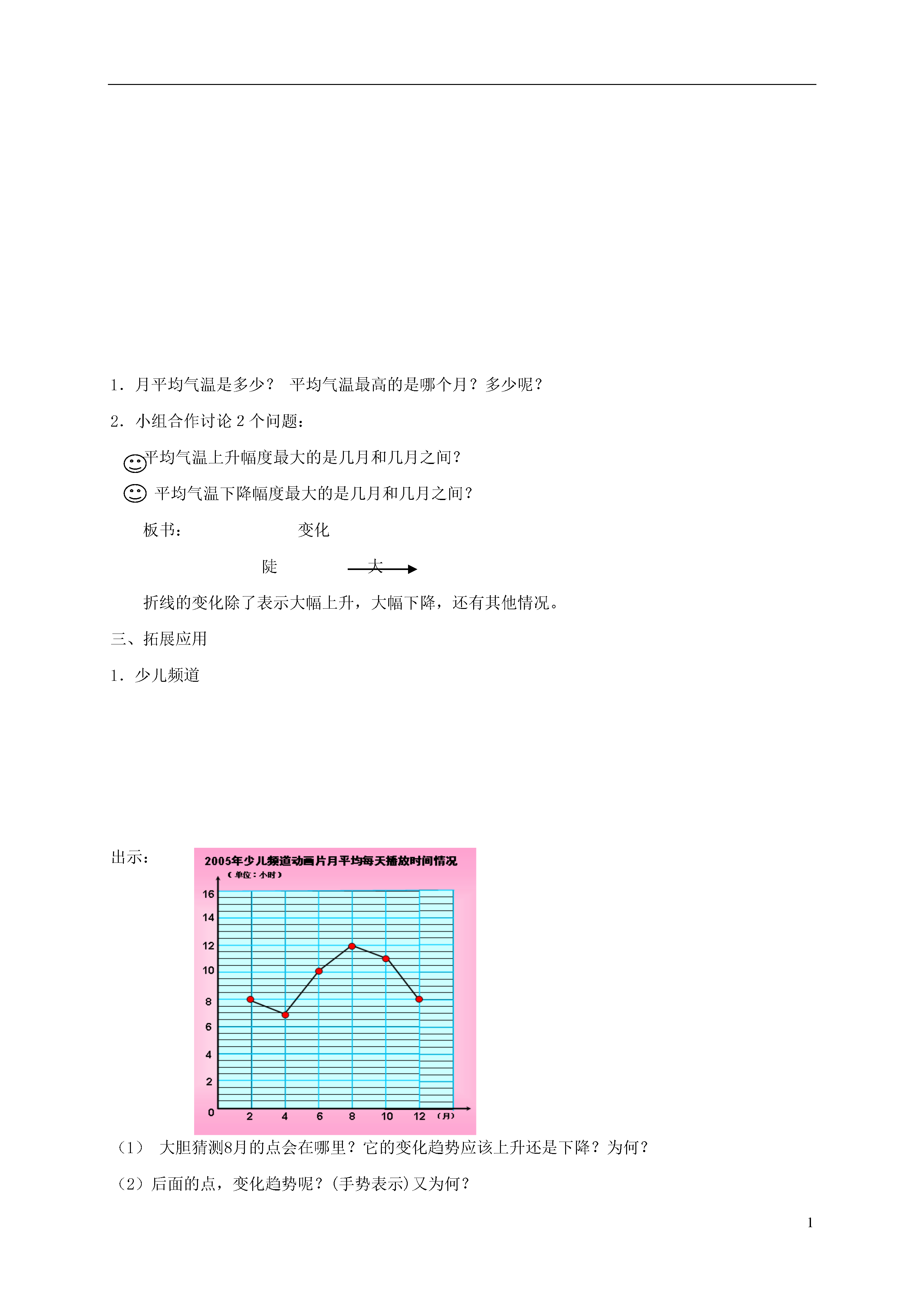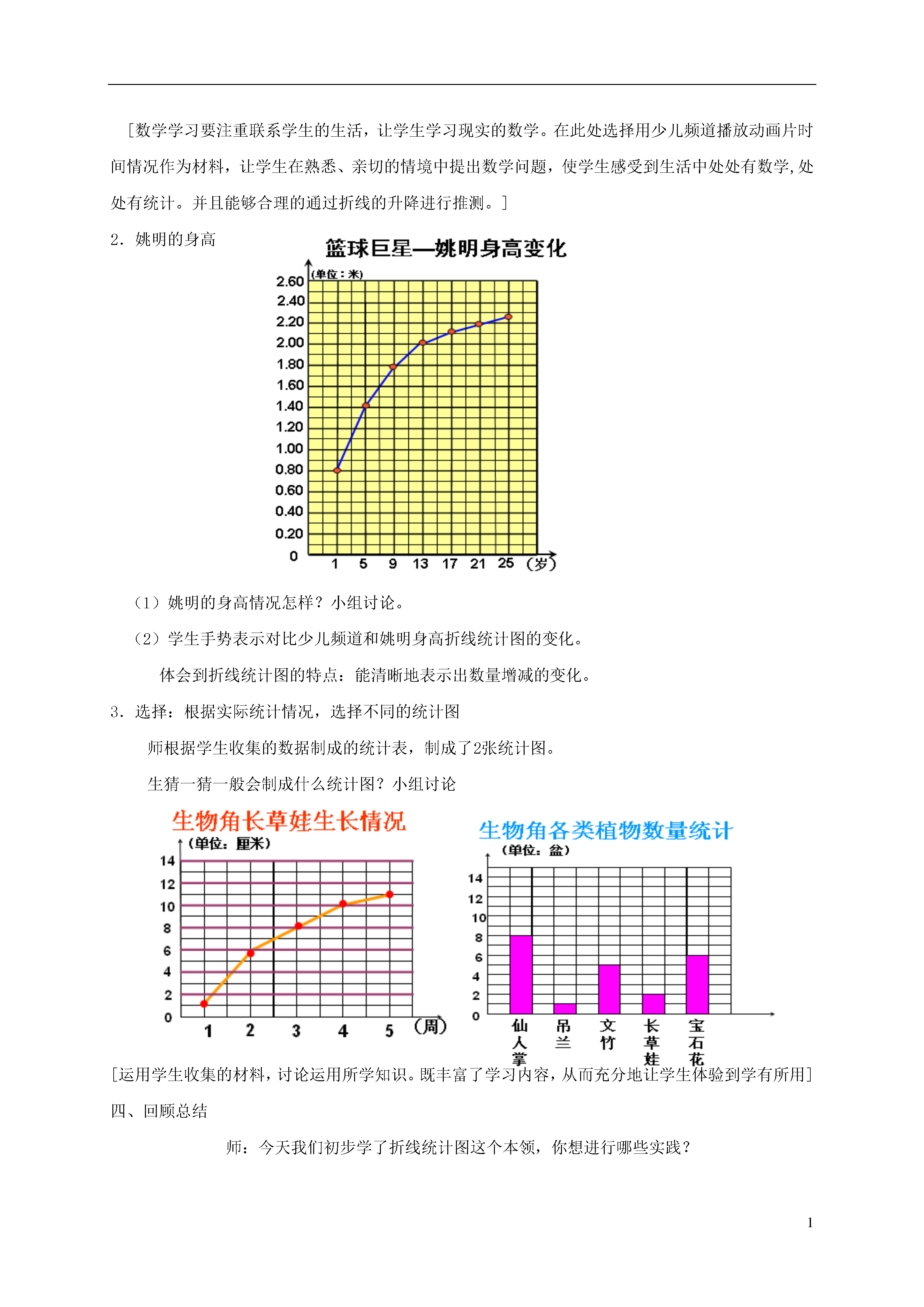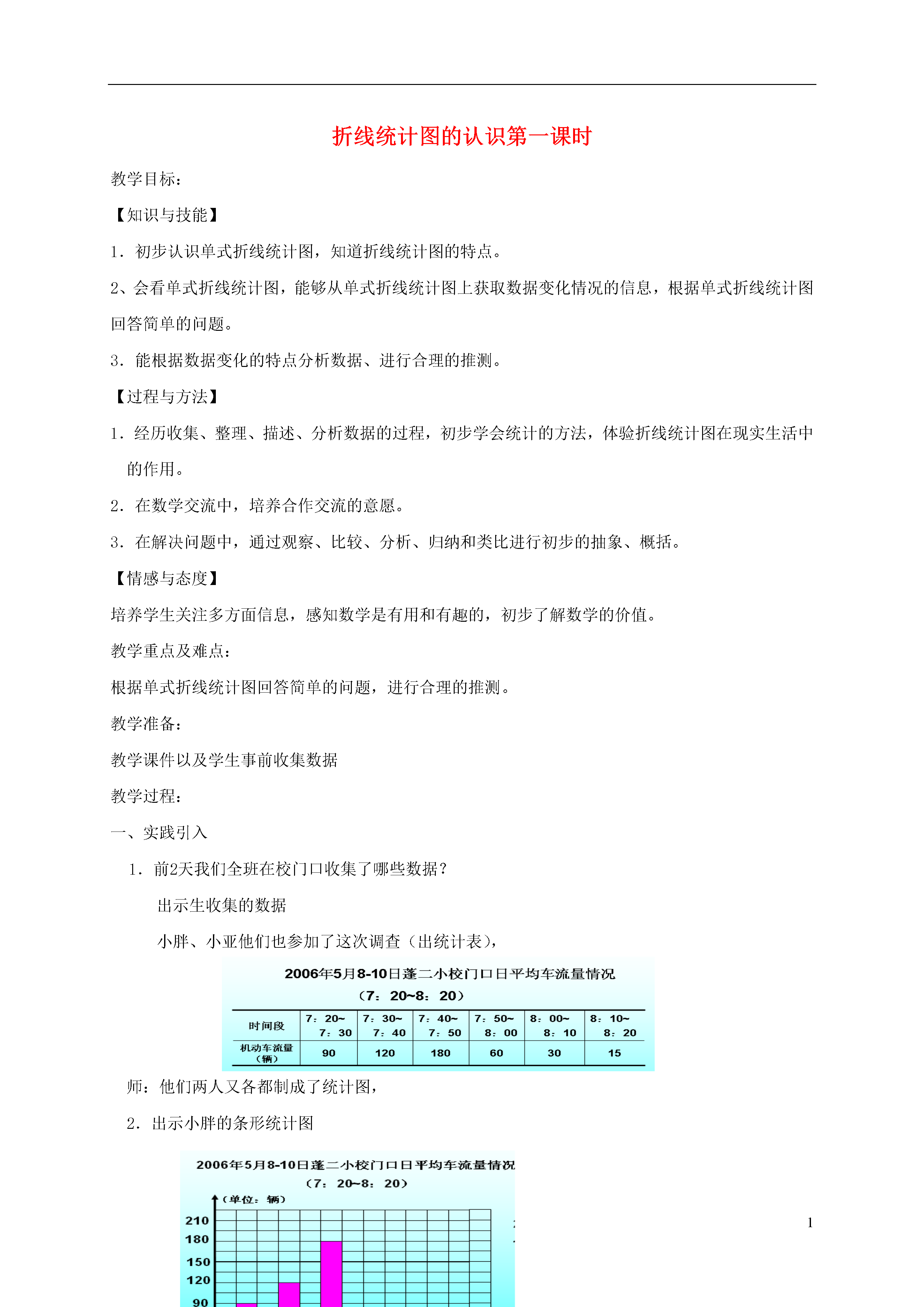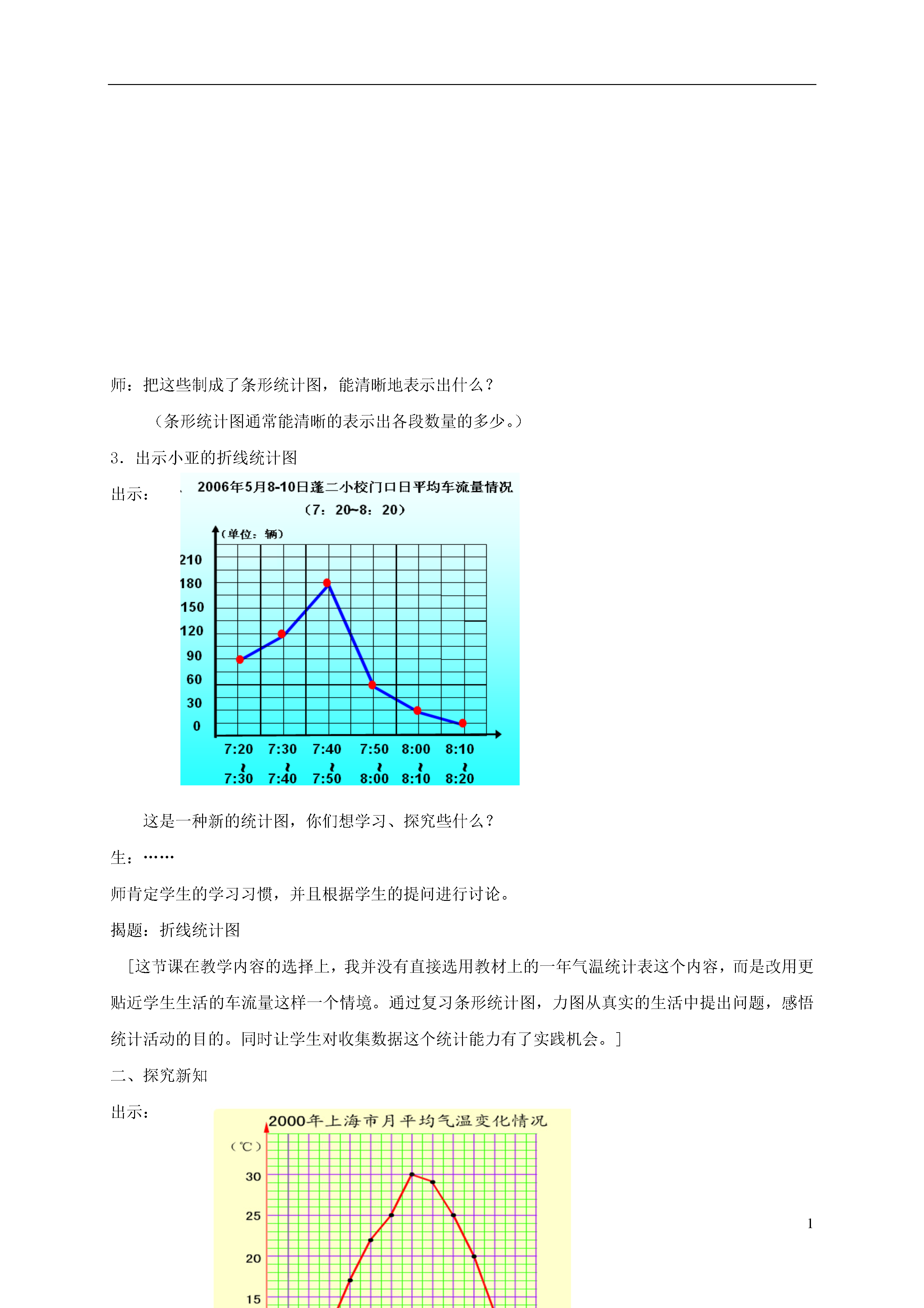 1折线统计图的认识第一课时教学目标:【知识与技能】1.初步认识单式折线统计图,知道折线统计图的特点。2、会看单式折线统计图,能够从单式折线统计图上获取数据变化情况的信息,根据单式折线统计图回答简单的问题。3.能根据数据变化的特点分析数据、进行合理的推测。【过程与方法】1.经历收集、整理、描述、分析数据的过程,初步学会统计的方法,体验折线统计图在现实生活中的作用。2.在数学交流中,培养合作交流的意愿。3.在解决问题中,通过观察、比较、分析、归纳和类比进行初步的抽象、概括。【情感与态度】培养学生关注多方面信息,感知数学是有用和有趣的,初步了解数学的价值。教学重点及难点:根据单式折线统计图回答简单的问题,进行合理的推测。教学准备:教学课件以及学生事前收集数据教学过程:一、实践引入1.前2天我们全班在校门口收集了哪些数据?出示生收集的数据小胖、小亚他们也参加了这次调查(出统计表),师:他们两人又各都制成了统计图,2.出示小胖的条形统计图师:把这些制成了条形统计图,能清晰地表示出什么?(条形统计图通常能清晰的表示出各段数量的多少。)3.出示小亚的折线统计图出示:这是一种新的统计图,你们想学习、探究些什么?生:……师肯定学生的学习习惯,并且根据学生的提问进行讨论。揭题:折线统计图[这节课在教学内容的选择上,我并没有直接选用教材上的一年气温统计表这个内容,而是改用更贴近学生生活的车流量这样一个情境。通过复习条形统计图,力图从真实的生活中提出问题,感悟统计活动的目的。同时让学生对收集数据这个统计能力有了实践机会。]二、探究新知出示:1.月平均气温是多少?平均气温最高的是哪个月?多少呢?2.小组合作讨论2个问题:平均气温上升幅度最大的是几月和几月之间?平均气温下降幅度最大的是几月和几月之间?板书:变化陡大折线的变化除了表示大幅上升,大幅下降,还有其他情况。三、拓展应用1.少儿频道出示:(1)大胆猜测8月的点会在哪里?它的变化趋势应该上升还是下降?为何?(2)后面的点,变化趋势呢?(手势表示)又为何?[数学学习要注重联系学生的生活,让学生学习现实的数学。在此处选择用少儿频道播放动画片时间情况作为材料,让学生在熟悉、亲切的情境中提出数学问题,使学生感受到生活中处处有数学,处处有统计。并且能够合理的通过折线的升降进行推测。]2.姚明的身高(1)姚明的身高情况怎样?小组讨论。(2)学生手势表示对比少儿频道和姚明身高折线统计图的变化。体会到折线统计图的特点:能清晰地表示出数量增减的变化。3.选择:根据实际统计情况,选择不同的统计图师根据学生收集的数据制成的统计表,制成了2张统计图。生猜一猜一般会制成什么统计图?小组讨论[运用学生收集的材料,讨论运用所学知识。既丰富了学习内容,从而充分地让学生体验到学有所用]四、回顾总结师:今天我们初步学了折线统计图这个本领,你想进行哪些实践?