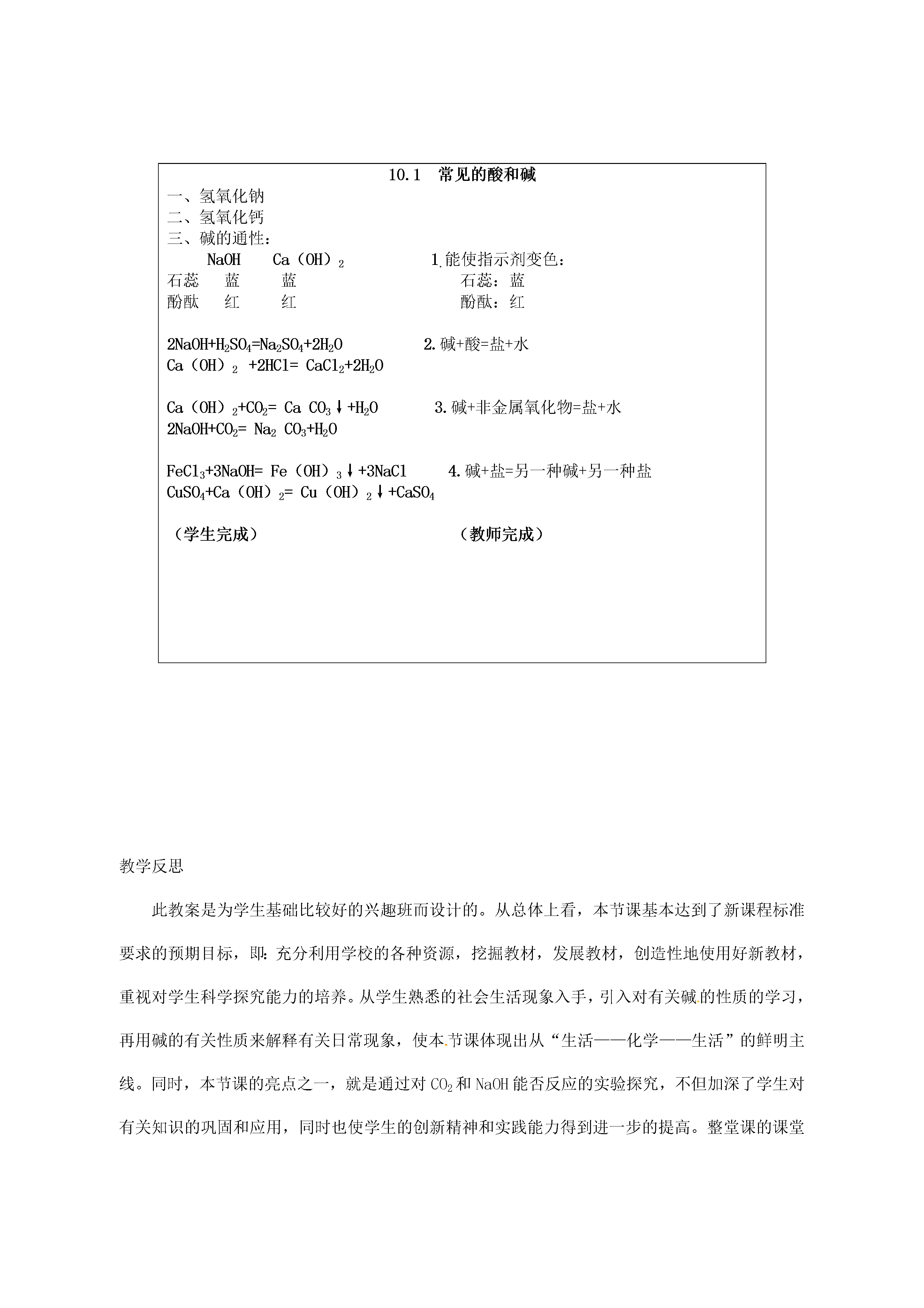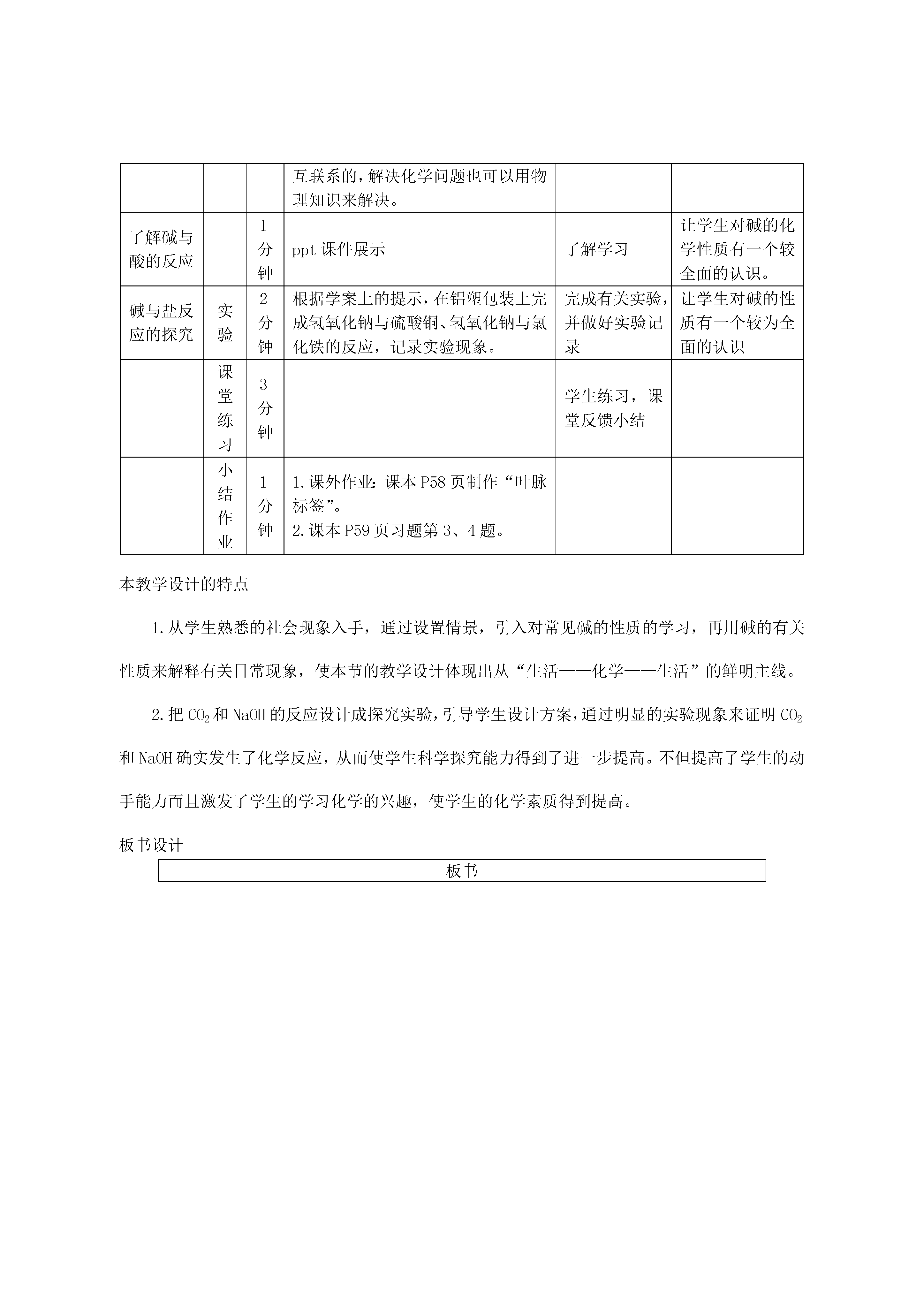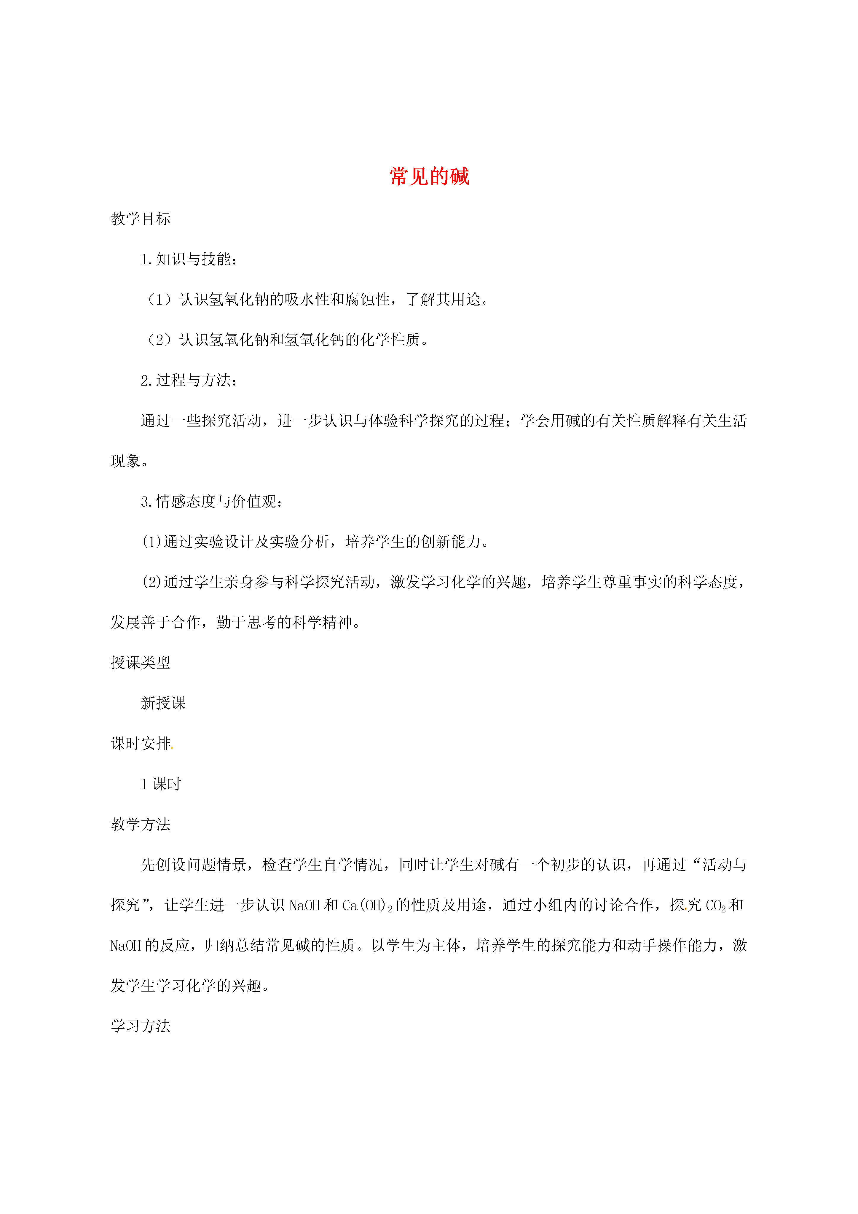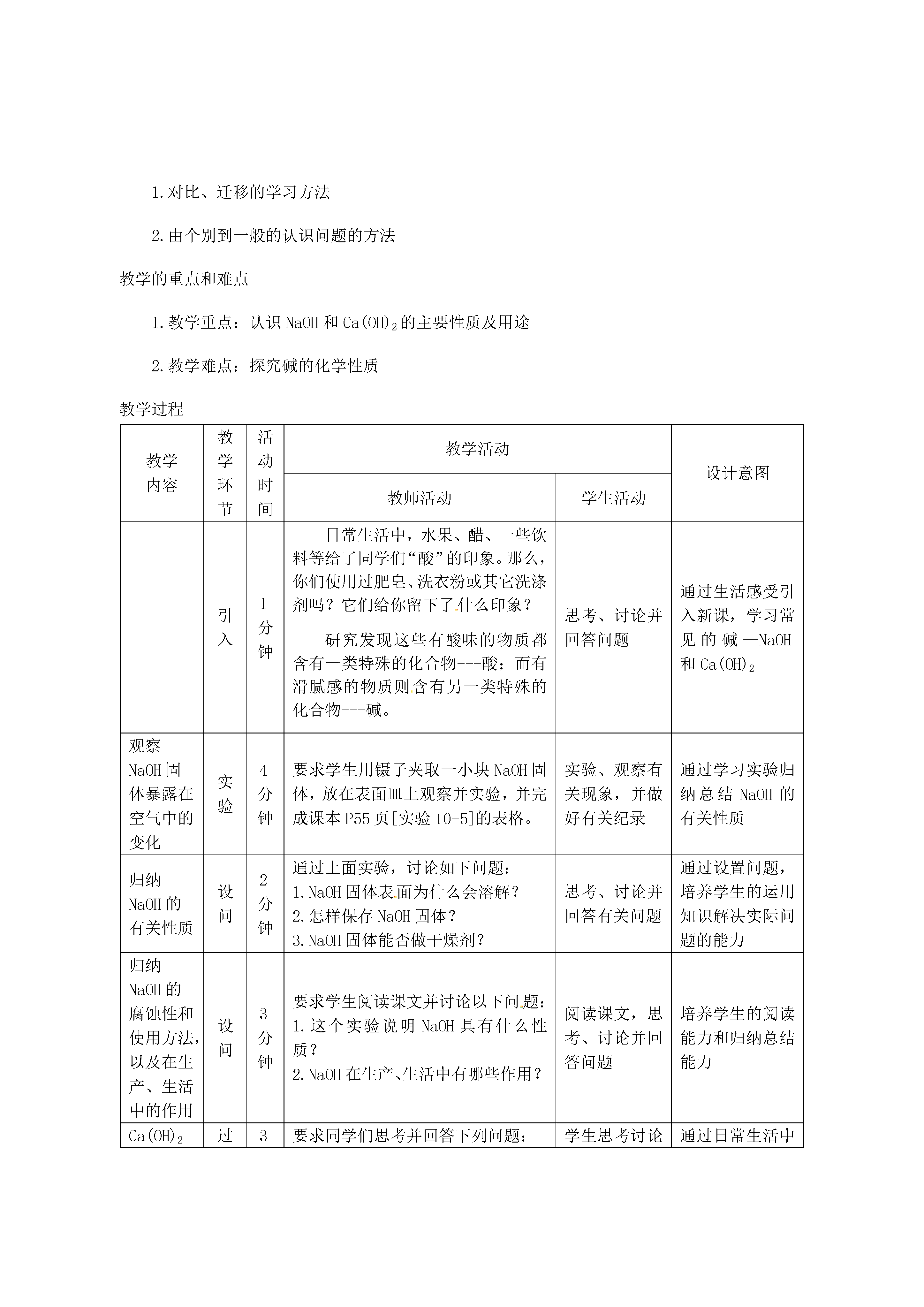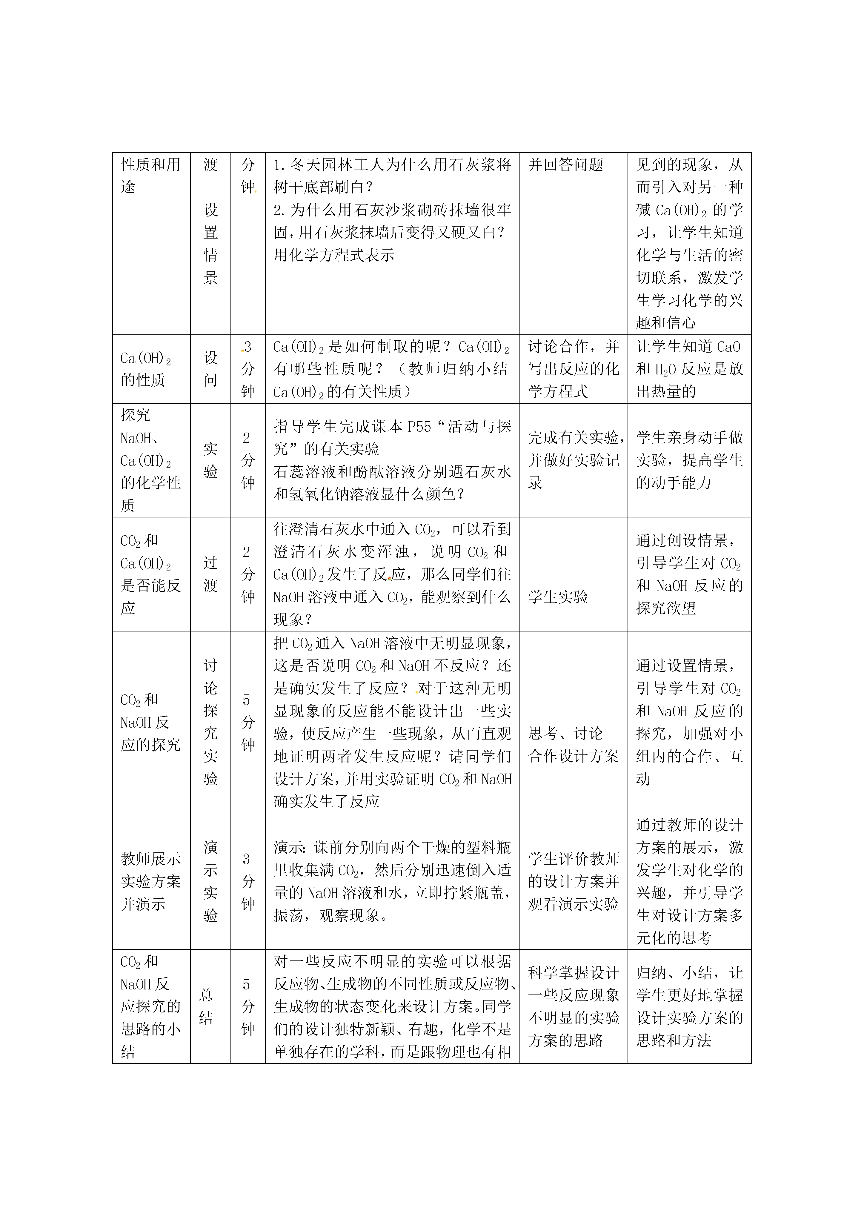 常见的碱教学目标1.知识与技能:(1)认识氢氧化钠的吸水性和腐蚀性,了解其用途。(2)认识氢氧化钠和氢氧化钙的化学性质。2.过程与方法:通过一些探究活动,进一步认识与体验科学探究的过程;学会用碱的有关性质解释有关生活现象。3.情感态度与价值观:(1)通过实验设计及实验分析,培养学生的创新能力。(2)通过学生亲身参与科学探究活动,激发学习化学的兴趣,培养学生尊重事实的科学态度,发展善于合作,勤于思考的科学精神。授课类型新授课课时安排1课时教学方法先创设问题情景,检查学生自学情况,同时让学生对碱有一个初步的认识,再通过“活动与探究”,让学生进一步认识NaOH和Ca(OH)2的性质及用途,通过小组内的讨论合作,探究CO2和NaOH的反应,归纳总结常见碱的性质。以学生为主体,培养学生的探究能力和动手操作能力,激发学生学习化学的兴趣。学习方法1.对比、迁移的学习方法2.由个别到一般的认识问题的方法教学的重点和难点1.教学重点:认识NaOH和Ca(OH)2的主要性质及用途2.教学难点:探究碱的化学性质教学过程教学内容教学环节活动时间教学活动设计意图教师活动学生活动引入1分钟日常生活中,水果、醋、一些饮料等给了同学们“酸”的印象。那么,你们使用过肥皂、洗衣粉或其它洗涤剂吗?它们给你留下了什么印象?研究发现这些有酸味的物质都含有一类特殊的化合物---酸;而有滑腻感的物质则含有另一类特殊的化合物---碱。思考、讨论并回答问题通过生活感受引入新课,学习常见的碱—NaOH和Ca(OH)2观察NaOH固体暴露在空气中的变化实验4分钟要求学生用镊子夹取一小块NaOH固体,放在表面皿上观察并实验,并完成课本P55页[实验10-5]的表格。实验、观察有关现象,并做好有关纪录通过学习实验归纳总结NaOH的有关性质归纳NaOH的有关性质设问2分钟通过上面实验,讨论如下问题:1.NaOH固体表面为什么会溶解?2.怎样保存NaOH固体?3.NaOH固体能否做干燥剂?思考、讨论并回答有关问题通过设置问题,培养学生的运用知识解决实际问题的能力归纳NaOH的腐蚀性和使用方法,以及在生产、生活中的作用设问3分钟要求学生阅读课文并讨论以下问题:1.这个实验说明NaOH具有什么性质?2.NaOH在生产、生活中有哪些作用?阅读课文,思考、讨论并回答问题培养学生的阅读能力和归纳总结能力Ca(OH)2性质和用途过渡设置情景3分钟要求同学们思考并回答下列问题:1.冬天园林工人为什么用石灰浆将树干底部刷白?2.为什么用石灰沙浆砌砖抹墙很牢固,用石灰浆抹墙后变得又硬又白?用化学方程式表示学生思考讨论并回答问题通过日常生活中见到的现象,从而引入对另一种碱Ca(OH)2的学习,让学生知道化学与生活的密切联系,激发学生学习化学的兴趣和信心Ca(OH)2的性质设问3分钟Ca(OH)2是如何制取的呢?Ca(OH)2有哪些性质呢?(教师归纳小结Ca(OH)2的有关性质)讨论合作,并写出反应的化学方程式让学生知道CaO和H2O反应是放出热量的探究NaOH、Ca(OH)2的化学性质实验2分钟指导学生完成课本P55“活动与探究”的有关实验石蕊溶液和酚酞溶液分别遇石灰水和氢氧化钠溶液显什么颜色?完成有关实验,并做好实验记录学生亲身动手做实验,提高学生的动手能力CO2和Ca(OH)2是否能反应过渡2分钟往澄清石灰水中通入CO2,可以看到澄清石灰水变浑浊,说明CO2和Ca(OH)2发生了反应,那么同学们往NaOH溶液中通入CO2,能观察到什么现象?学生实验通过创设情景,引导学生对CO2和NaOH反应的探究欲望CO2和NaOH反应的探究讨论探究实验5分钟把CO2通入NaOH溶液中无明显现象,这是否说明CO2和NaOH不反应?还是确实发生了反应?对于这种无明显现象的反应能不能设计出一些实验,使反应产生一些现象,从而直观地证明两者发生反应呢?请同学们设计方案,并用实验证明CO2和NaOH确实发生了反应思考、讨论合作设计方案通过设置情景,引导学生对CO2和NaOH反应的探究,加强对小组内的合作、互动教师展示实验方案并演示演示实验3分钟演示:课前分别向两个干燥的塑料瓶里收集满CO2,然后分别迅速倒入适量的NaOH溶液和水,立即拧紧瓶盖,振荡,观察现象。学生评价教师的设计方案并观看演示实验通过教师的设计方案的展示,激发学生对化学的兴趣,并引导学生对设计方案多元化的思考CO2和NaOH反应探究的思路的小结总结5分钟对一些反应不明显的实验可以根据反应物、生成物的不同性质或反应物、生成物的状态变化来设计方案。同学们的设计独特新颖、有趣,化学不是单独存在的学科,而是跟物理也有相互联系的,解决化学问题也可以用物理知识来解决。科学掌握设计一些反应现象