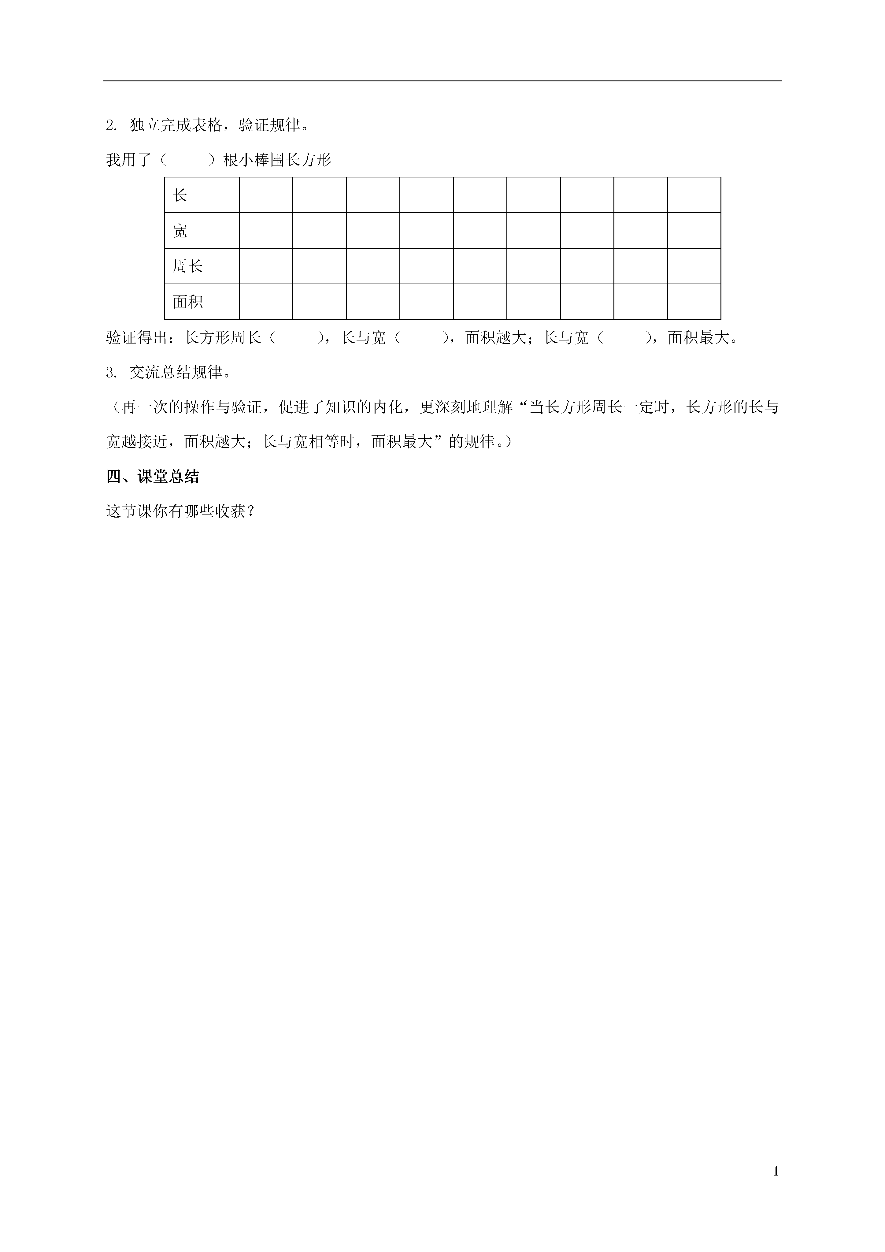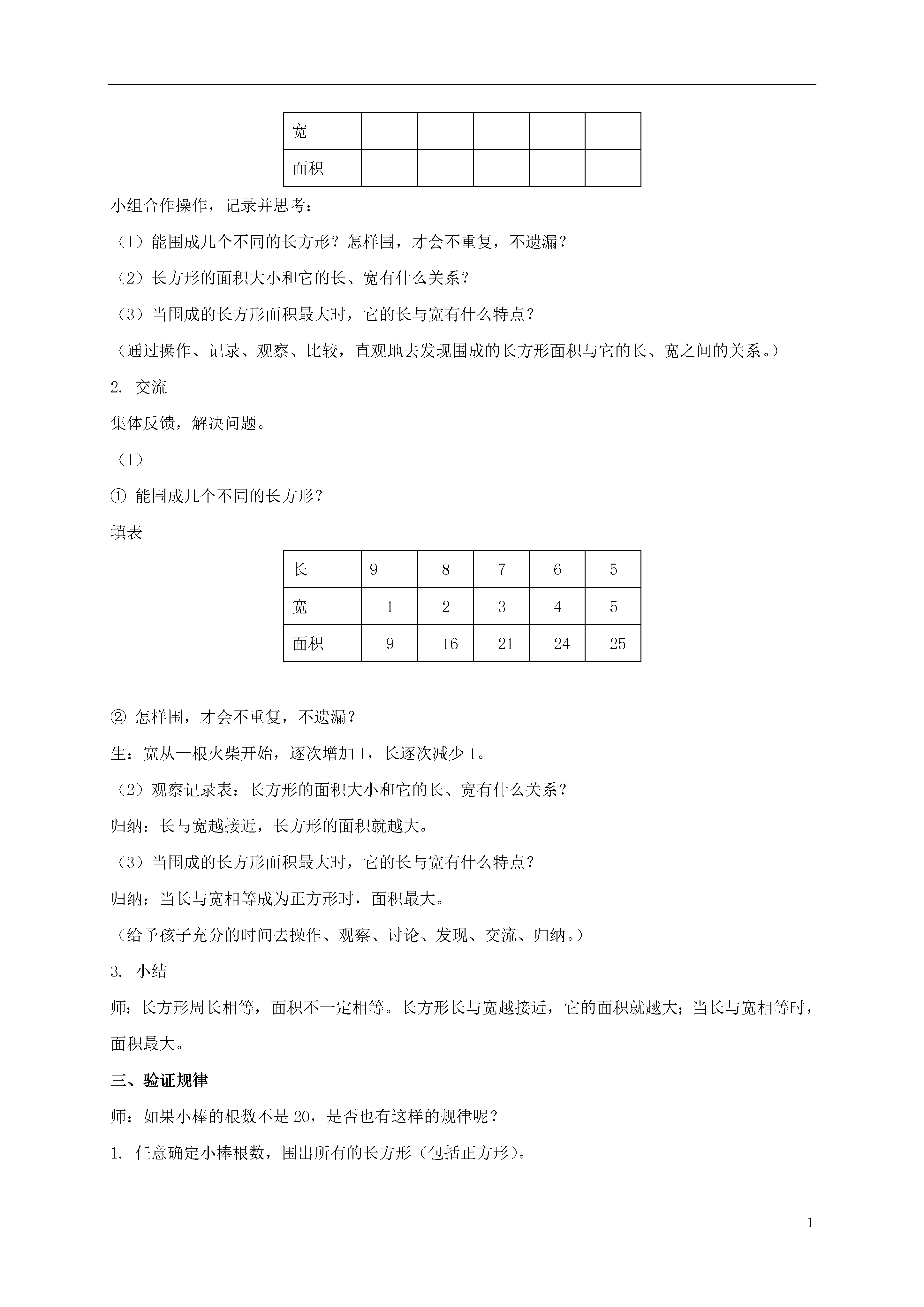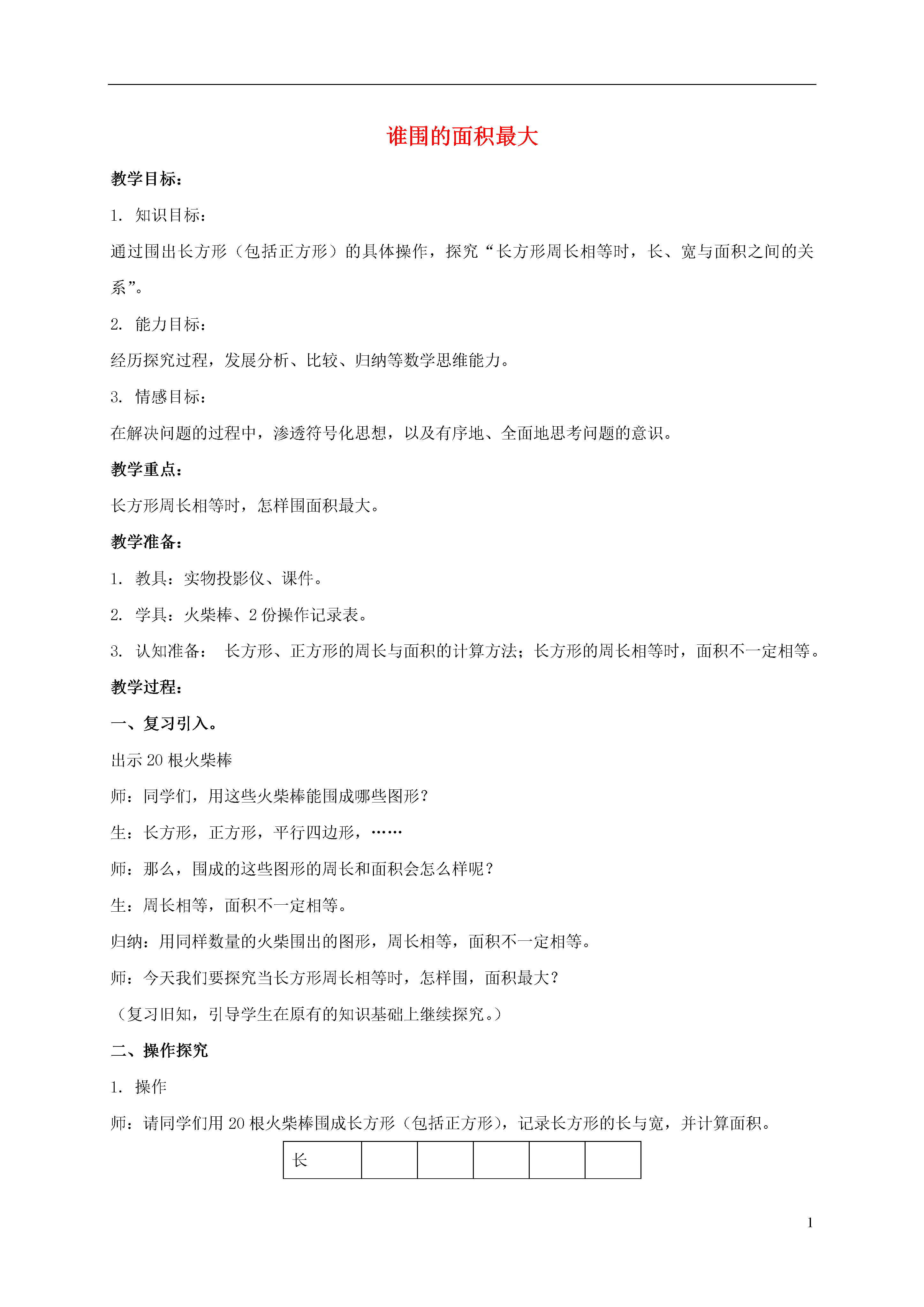 1谁围的面积最大教学目标:1.知识目标:通过围出长方形(包括正方形)的具体操作,探究“长方形周长相等时,长、宽与面积之间的关系”。2.能力目标:经历探究过程,发展分析、比较、归纳等数学思维能力。3.情感目标:在解决问题的过程中,渗透符号化思想,以及有序地、全面地思考问题的意识。教学重点:长方形周长相等时,怎样围面积最大。教学准备:1.教具:实物投影仪、课件。2.学具:火柴棒、2份操作记录表。3.认知准备:长方形、正方形的周长与面积的计算方法;长方形的周长相等时,面积不一定相等。教学过程:一、复习引入。出示20根火柴棒师:同学们,用这些火柴棒能围成哪些图形?生:长方形,正方形,平行四边形,……师:那么,围成的这些图形的周长和面积会怎么样呢?生:周长相等,面积不一定相等。归纳:用同样数量的火柴围出的图形,周长相等,面积不一定相等。师:今天我们要探究当长方形周长相等时,怎样围,面积最大?(复习旧知,引导学生在原有的知识基础上继续探究。)二、操作探究1.操作师:请同学们用20根火柴棒围成长方形(包括正方形),记录长方形的长与宽,并计算面积。长宽面积小组合作操作,记录并思考:(1)能围成几个不同的长方形?怎样围,才会不重复,不遗漏?(2)长方形的面积大小和它的长、宽有什么关系?(3)当围成的长方形面积最大时,它的长与宽有什么特点?(通过操作、记录、观察、比较,直观地去发现围成的长方形面积与它的长、宽之间的关系。)2.交流集体反馈,解决问题。(1)①能围成几个不同的长方形?填表长98765宽12345面积916212425②怎样围,才会不重复,不遗漏?生:宽从一根火柴开始,逐次增加1,长逐次减少1。(2)观察记录表:长方形的面积大小和它的长、宽有什么关系?归纳:长与宽越接近,长方形的面积就越大。(3)当围成的长方形面积最大时,它的长与宽有什么特点?归纳:当长与宽相等成为正方形时,面积最大。(给予孩子充分的时间去操作、观察、讨论、发现、交流、归纳。)3.小结师:长方形周长相等,面积不一定相等。长方形长与宽越接近,它的面积就越大;当长与宽相等时,面积最大。三、验证规律师:如果小棒的根数不是20,是否也有这样的规律呢?1.任意确定小棒根数,围出所有的长方形(包括正方形)。2.独立完成表格,验证规律。我用了()根小棒围长方形长宽周长面积验证得出:长方形周长(),长与宽(),面积越大;长与宽(),面积最大。3.交流总结规律。(再一次的操作与验证,促进了知识的内化,更深刻地理解“当长方形周长一定时,长方形的长与宽越接近,面积越大;长与宽相等时,面积最大”的规律。)四、课堂总结这节课你有哪些收获?