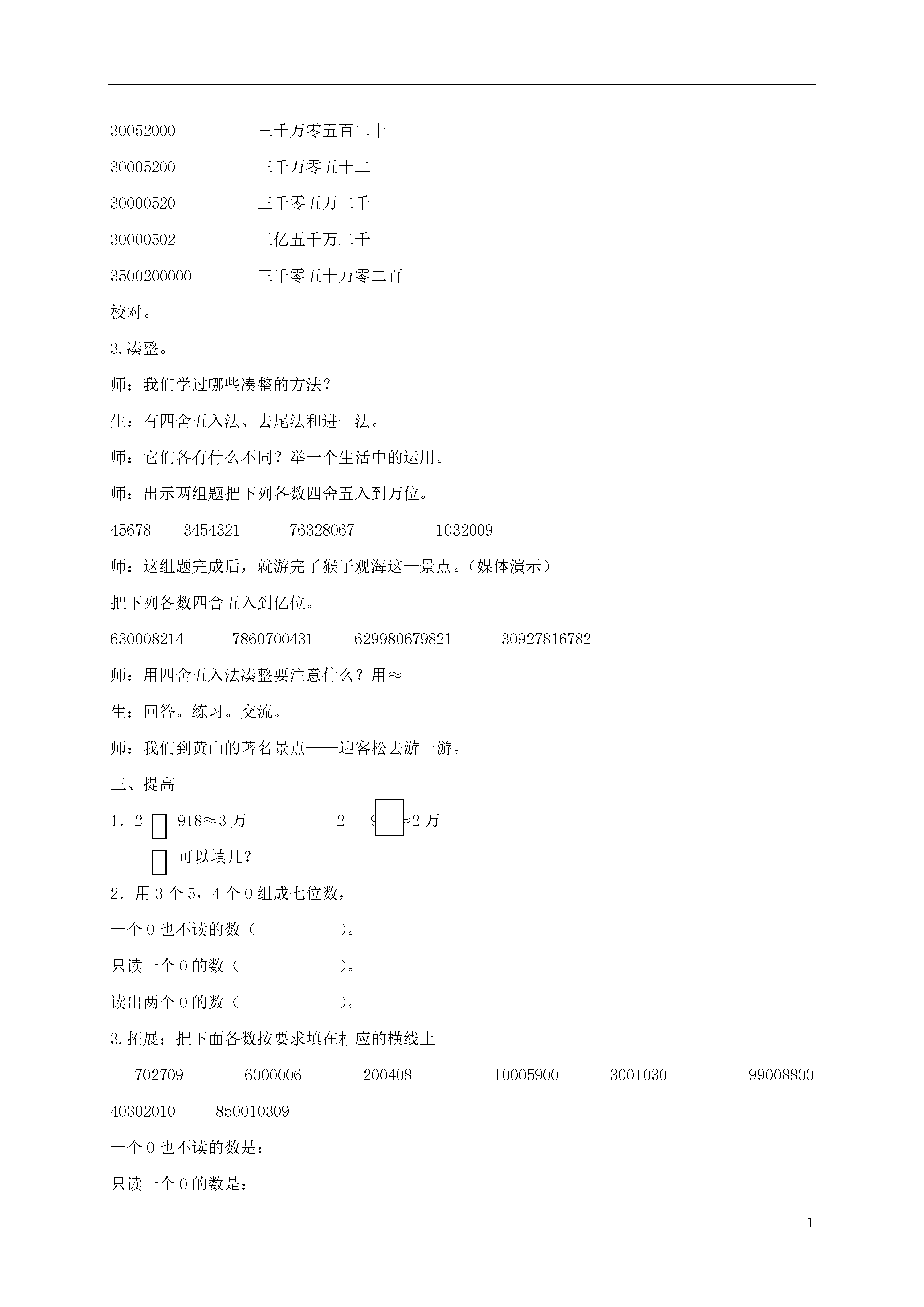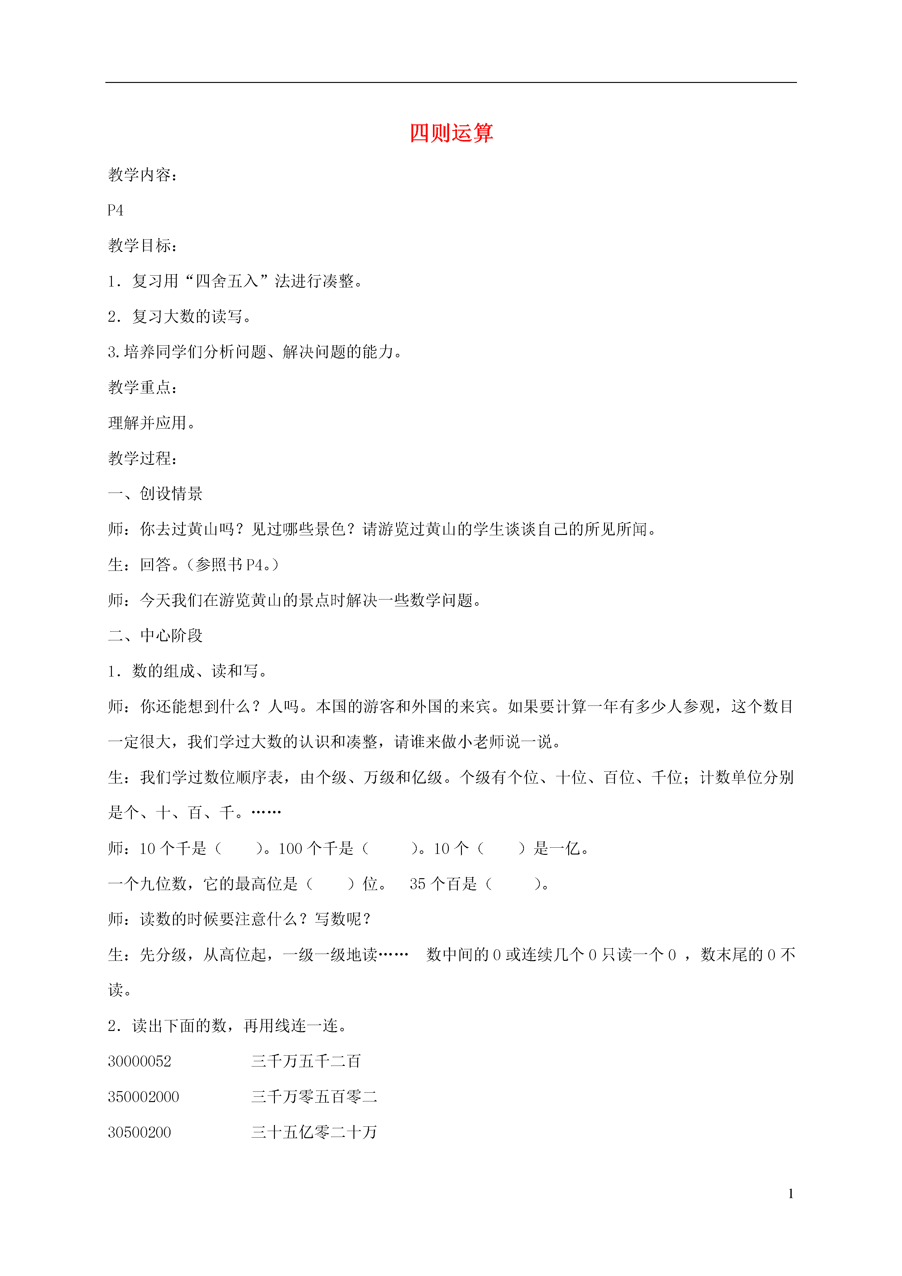 1四则运算教学内容:P4教学目标:1.复习用“四舍五入”法进行凑整。2.复习大数的读写。3.培养同学们分析问题、解决问题的能力。教学重点:理解并应用。教学过程:一、创设情景师:你去过黄山吗?见过哪些景色?请游览过黄山的学生谈谈自己的所见所闻。生:回答。(参照书P4。)师:今天我们在游览黄山的景点时解决一些数学问题。二、中心阶段1.数的组成、读和写。师:你还能想到什么?人吗。本国的游客和外国的来宾。如果要计算一年有多少人参观,这个数目一定很大,我们学过大数的认识和凑整,请谁来做小老师说一说。生:我们学过数位顺序表,由个级、万级和亿级。个级有个位、十位、百位、千位;计数单位分别是个、十、百、千。……师:10个千是()。100个千是()。10个()是一亿。一个九位数,它的最高位是()位。35个百是()。师:读数的时候要注意什么?写数呢?生:先分级,从高位起,一级一级地读……数中间的0或连续几个0只读一个0,数末尾的0不读。2.读出下面的数,再用线连一连。30000052三千万五千二百350002000三千万零五百零二30500200三十五亿零二十万30052000三千万零五百二十30005200三千万零五十二30000520三千零五万二千30000502三亿五千万二千3500200000三千零五十万零二百校对。3.凑整。师:我们学过哪些凑整的方法?生:有四舍五入法、去尾法和进一法。师:它们各有什么不同?举一个生活中的运用。师:出示两组题把下列各数四舍五入到万位。456783454321763280671032009师:这组题完成后,就游完了猴子观海这一景点。(媒体演示)把下列各数四舍五入到亿位。630008214786070043162998067982130927816782师:用四舍五入法凑整要注意什么?用≈生:回答。练习。交流。师:我们到黄山的著名景点——迎客松去游一游。三、提高1.2918≈3万2918≈2万可以填几?2.用3个5,4个0组成七位数,一个0也不读的数()。只读一个0的数()。读出两个0的数()。3.拓展:把下面各数按要求填在相应的横线上70270960000062004081000590030010309900880040302010850010309一个0也不读的数是:只读一个0的数是:只读两个0的数是:读3个0的数是:最高位是十万位的数有:与1亿最接近的数是:位数最多的数是: