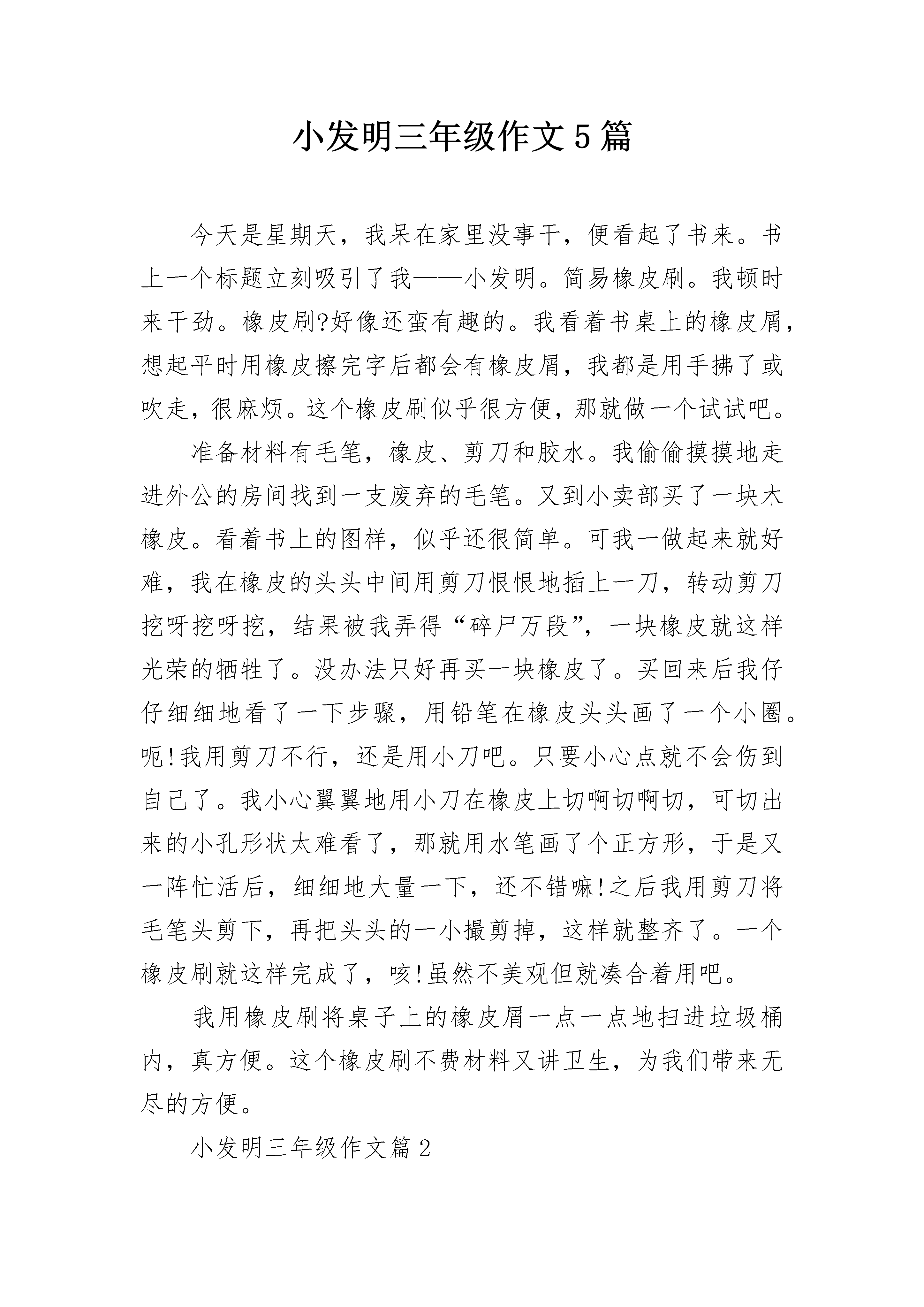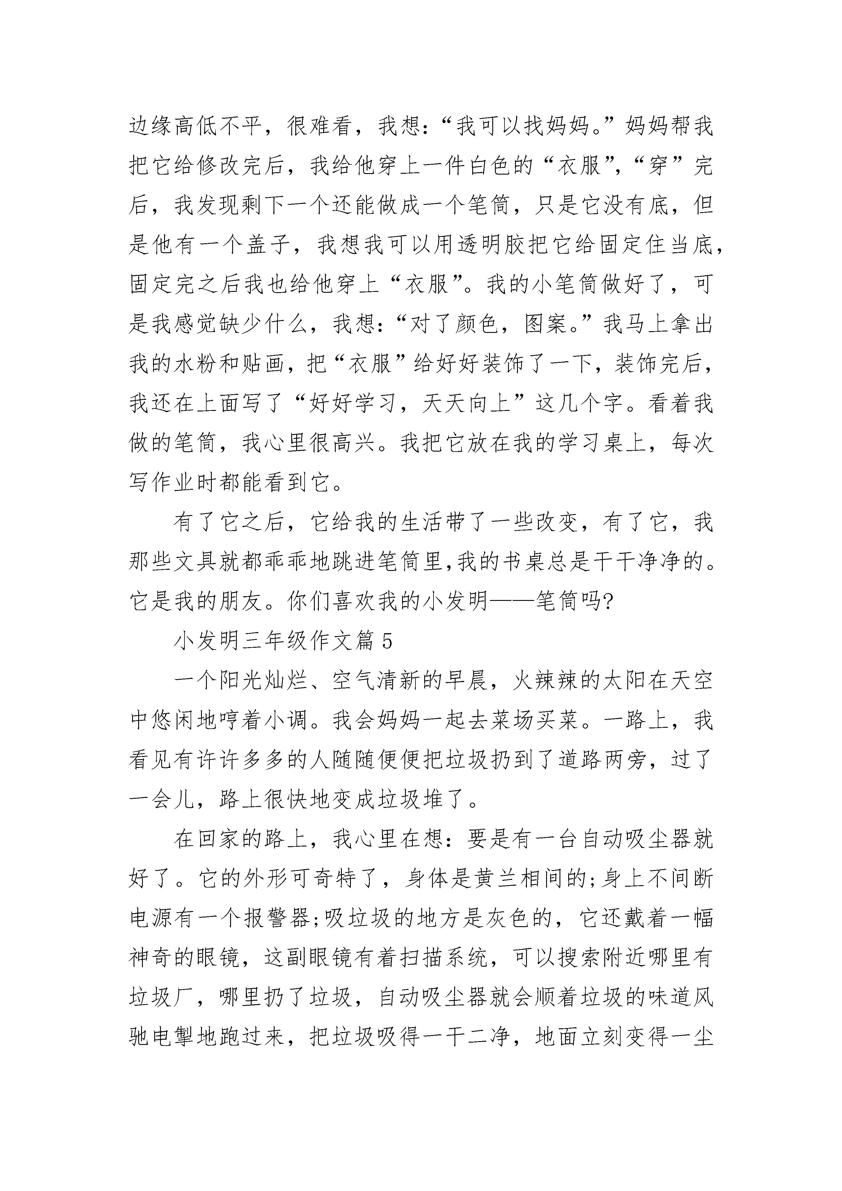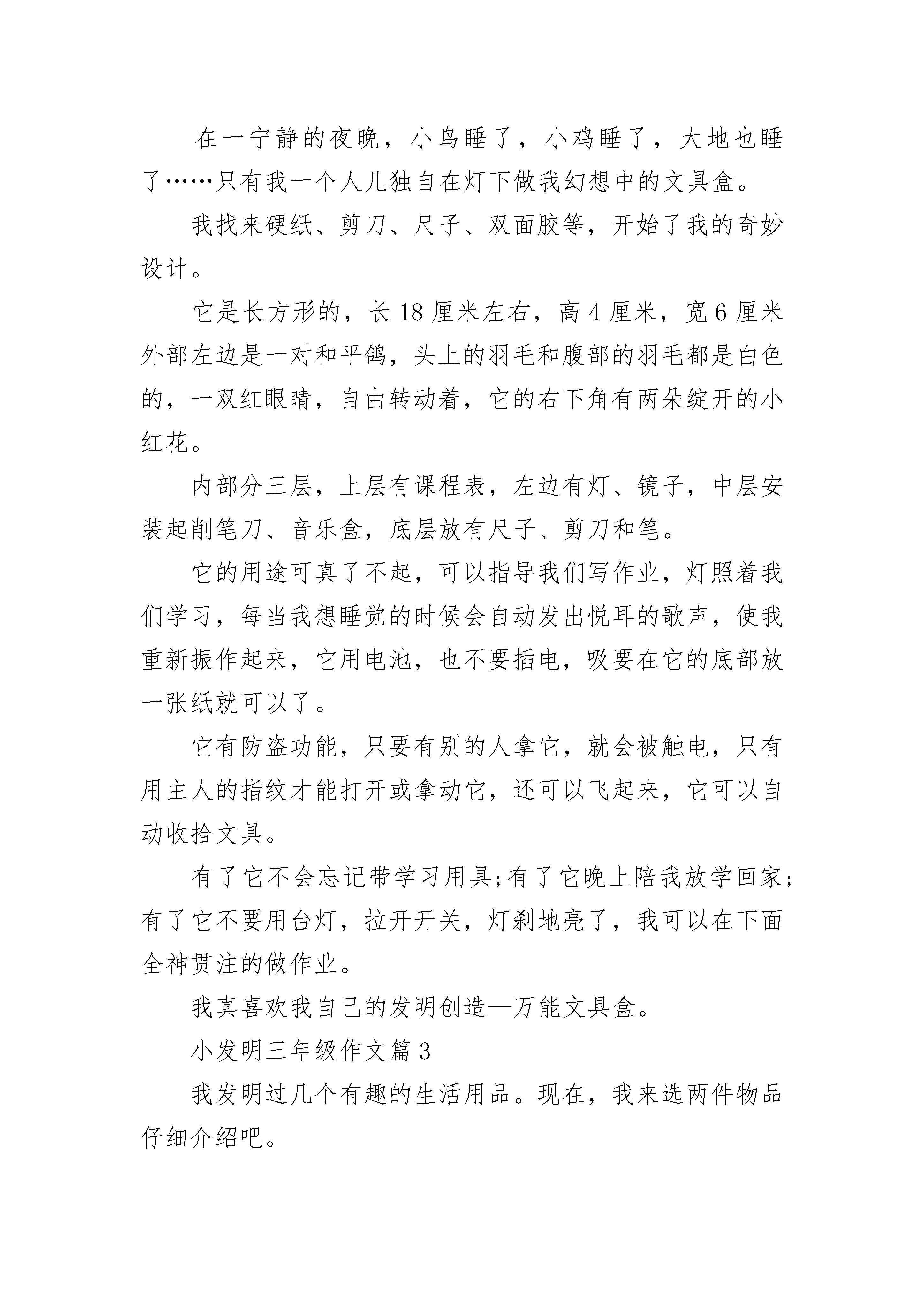 小发明三年级作文5篇今天是星期天,我呆在家里没事干,便看起了书来。书上一个标题立刻吸引了我——小发明。简易橡皮刷。我顿时来干劲。橡皮刷?好像还蛮有趣的。我看着书桌上的橡皮屑,想起平时用橡皮擦完字后都会有橡皮屑,我都是用手拂了或吹走,很麻烦。这个橡皮刷似乎很方便,那就做一个试试吧。准备材料有毛笔,橡皮、剪刀和胶水。我偷偷摸摸地走进外公的房间找到一支废弃的毛笔。又到小卖部买了一块木橡皮。看着书上的图样,似乎还很简单。可我一做起来就好难,我在橡皮的头头中间用剪刀恨恨地插上一刀,转动剪刀挖呀挖呀挖,结果被我弄得“碎尸万段”,一块橡皮就这样光荣的牺牲了。没办法只好再买一块橡皮了。买回来后我仔仔细细地看了一下步骤,用铅笔在橡皮头头画了一个小圈。呃!我用剪刀不行,还是用小刀吧。只要小心点就不会伤到自己了。我小心翼翼地用小刀在橡皮上切啊切啊切,可切出来的小孔形状太难看了,那就用水笔画了个正方形,于是又一阵忙活后,细细地大量一下,还不错嘛!之后我用剪刀将毛笔头剪下,再把头头的一小撮剪掉,这样就整齐了。一个橡皮刷就这样完成了,咳!虽然不美观但就凑合着用吧。我用橡皮刷将桌子上的橡皮屑一点一点地扫进垃圾桶内,真方便。这个橡皮刷不费材料又讲卫生,为我们带来无尽的方便。小发明三年级作文篇2在一宁静的夜晚,小鸟睡了,小鸡睡了,大地也睡了……只有我一个人儿独自在灯下做我幻想中的文具盒。我找来硬纸、剪刀、尺子、双面胶等,开始了我的奇妙设计。它是长方形的,长18厘米左右,高4厘米,宽6厘米外部左边是一对和平鸽,头上的羽毛和腹部的羽毛都是白色的,一双红眼睛,自由转动着,它的右下角有两朵绽开的小红花。内部分三层,上层有课程表,左边有灯、镜子,中层安装起削笔刀、音乐盒,底层放有尺子、剪刀和笔。它的用途可真了不起,可以指导我们写作业,灯照着我们学习,每当我想睡觉的时候会自动发出悦耳的歌声,使我重新振作起来,它用电池,也不要插电,吸要在它的底部放一张纸就可以了。它有防盗功能,只要有别的人拿它,就会被触电,只有用主人的指纹才能打开或拿动它,还可以飞起来,它可以自动收拾文具。有了它不会忘记带学习用具;有了它晚上陪我放学回家;有了它不要用台灯,拉开开关,灯刹地亮了,我可以在下面全神贯注的做作业。我真喜欢我自己的发明创造—万能文具盒。小发明三年级作文篇3我发明过几个有趣的生活用品。现在,我来选两件物品仔细介绍吧。我的第一件发明是多功能笔。我做它是因为同学们经常丢三落四,并且要用时还要慌慌张张地找,便决定多功能笔。它是一个荧光外壳和各种笑声芯做成的。它的做法是把用完的荧光笔去掉芯,扎上几定小孔,再把各种笔芯插入,最后在笔的末尾塞上橡皮或修正液,就大功告成啦。多功能笔的优点是:功能多,省时,不用要什么笔,才赶忙找起来,并且变废为宝,节约能源。可多功能笔也有许多缺点,如:太重,用起来不方便,而且不易分辨笔芯种类。第的第二件小发明是合体勺叉。当我看到人们吃饭时,经常需要汤勺和叉子,便把叉子和勺子结合起来,就组成了合体勺叉。它的做法是:找一根刚能把勺子把儿和叉子把儿塞进去那样粗细的管子,把它们从两端塞进去就可以了。要用什么,反过来就可以了。既简单,又实用,真是棒极了!我的这些发明虽然很实用,但还有很多缺点。我一定要更加努力学习,仔细观察,将来发明更多有益的用品,帮助人们,为将来报效祖国打下基础。小发明三年级作文篇4以前我的学习桌乱七八糟的,可是有一天我想到做一个笔筒。我先拿出一个薯片盒,要把它剪开,可是我力气太小了,根本剪不动,我只好拿着盒子去找妈妈帮我剪,妈妈告诉我;“先用软尺在盒子中间画一个圈,再用小刀把他给切开。”我费了九牛二虎之力,把薯片筒给一分为二,可是切完后,边缘高低不平,很难看,我想:“我可以找妈妈。”妈妈帮我把它给修改完后,我给他穿上一件白色的“衣服”,“穿”完后,我发现剩下一个还能做成一个笔筒,只是它没有底,但是他有一个盖子,我想我可以用透明胶把它给固定住当底,固定完之后我也给他穿上“衣服”。我的小笔筒做好了,可是我感觉缺少什么,我想:“对了颜色,图案。”我马上拿出我的水粉和贴画,把“衣服”给好好装饰了一下,装饰完后,我还在上面写了“好好学习,天天向上”这几个字。看着我做的笔筒,我心里很高兴。我把它放在我的学习桌上,每次写作业时都能看到它。有了它之后,它给我的生活带了一些改变,有了它,我那些文具就都乖乖地跳进笔筒里,我的书桌总是干干净净的。它是我的朋友。你们喜欢我的小发明——笔筒吗?小发明三年级作文篇5一个阳光灿烂、空气清新的早晨,火辣辣的太阳在天空中悠闲地哼着小调。我会妈妈一起去菜场买菜。一路上,我看见有许许多多的人随随便便把垃圾扔到了道路两旁,过了一会儿,路上很快地变成垃圾堆了。在回家的路上,我心里在想:要是有一台自动吸尘器就好了。它的外形可奇特了,身体是黄兰相间