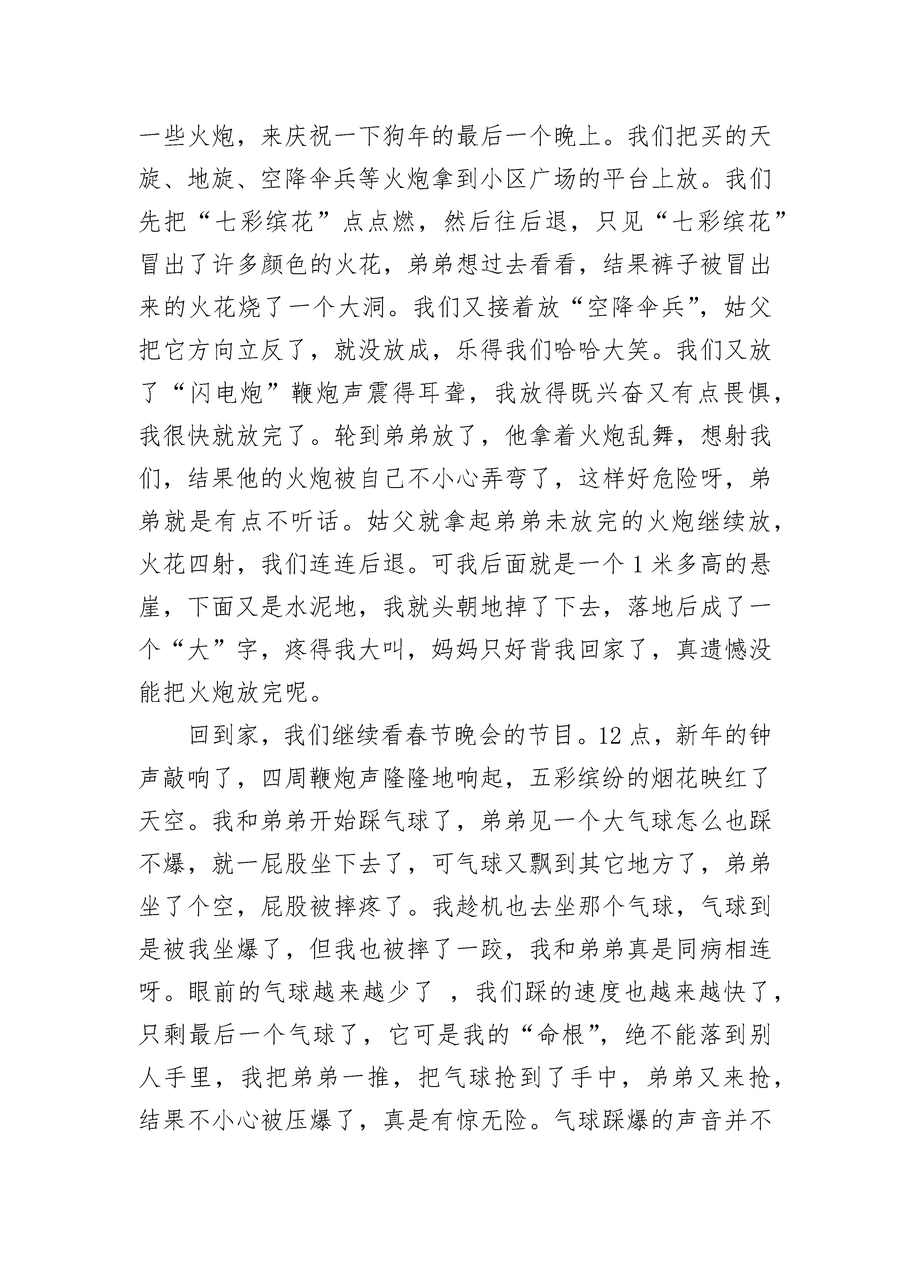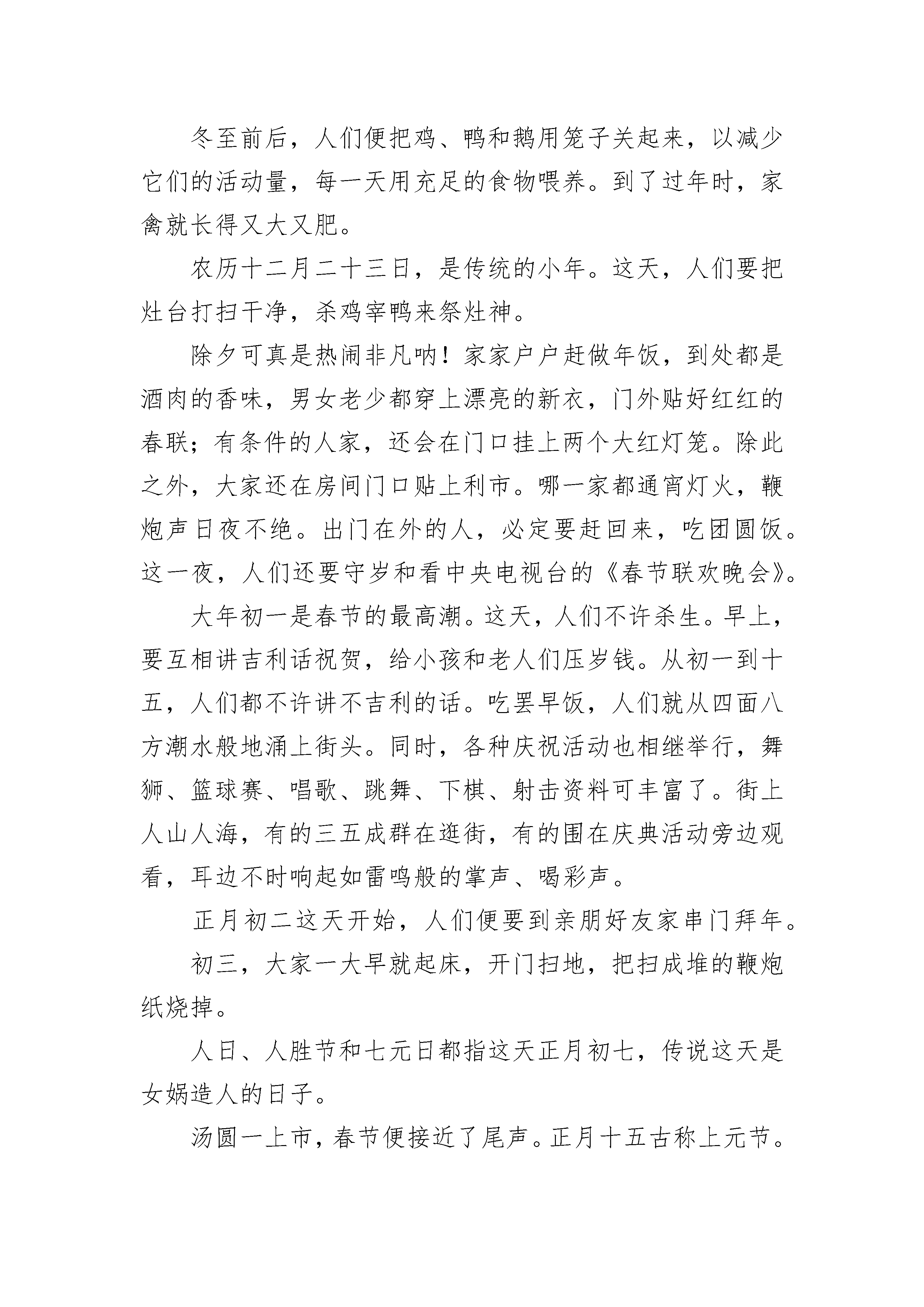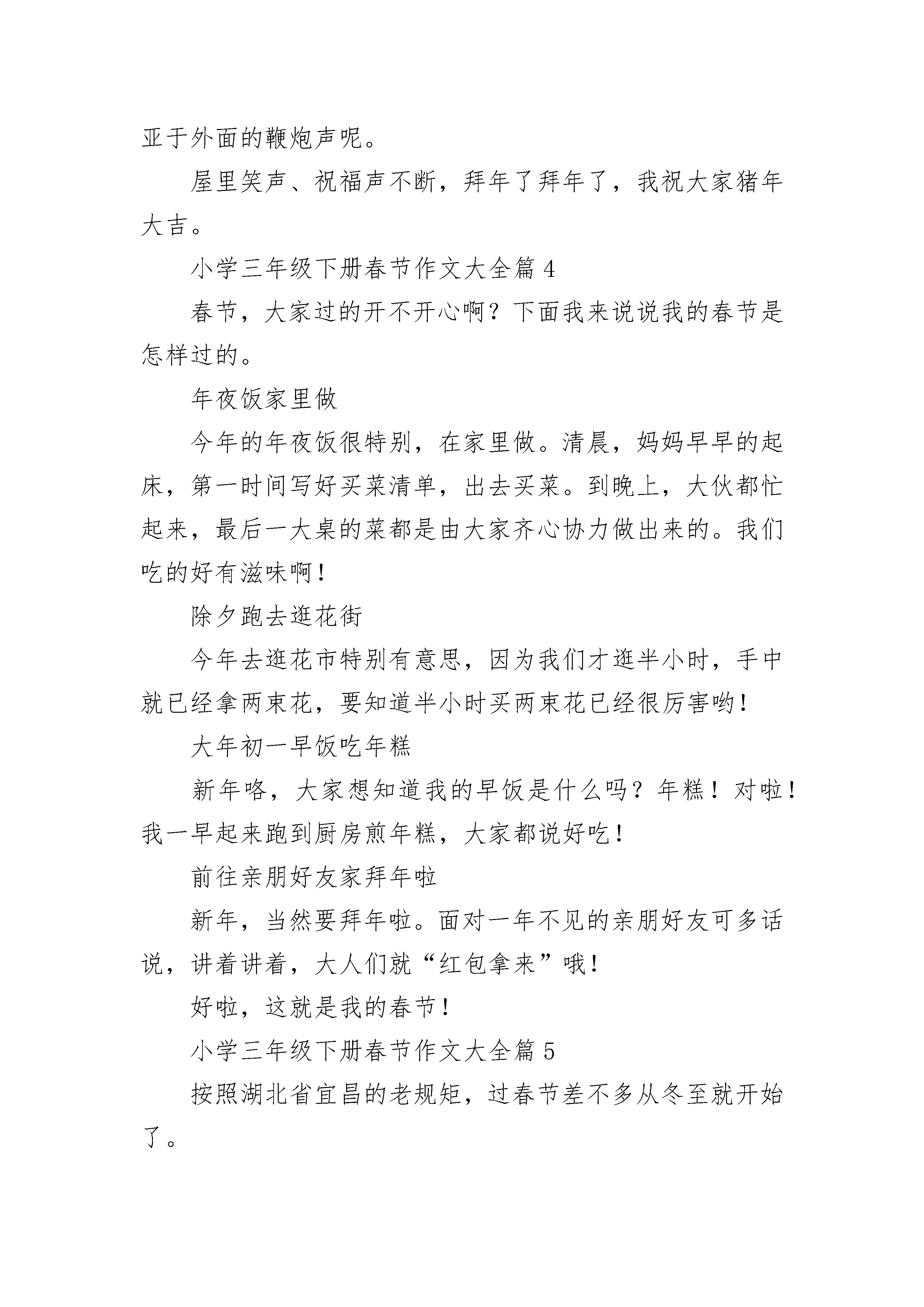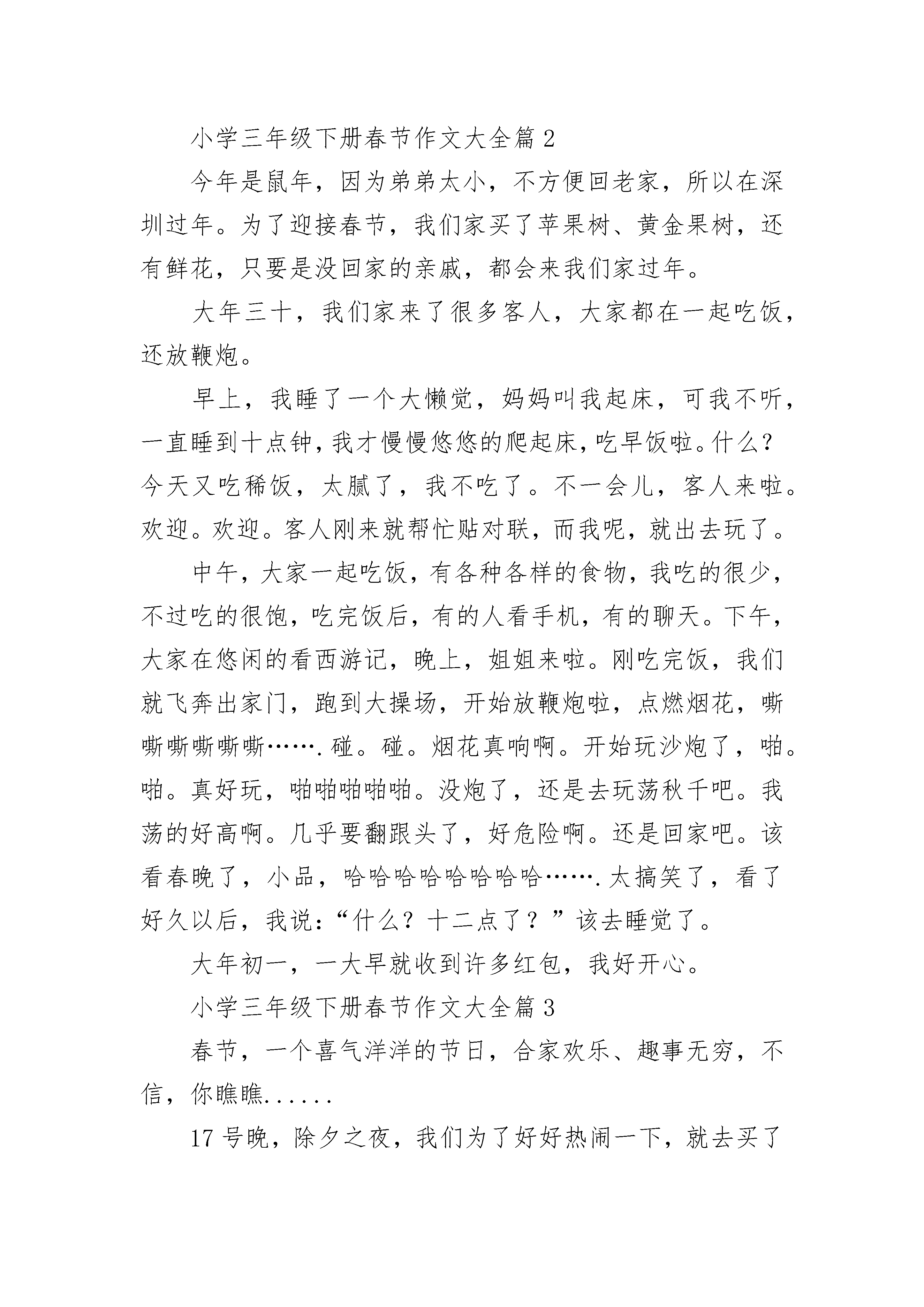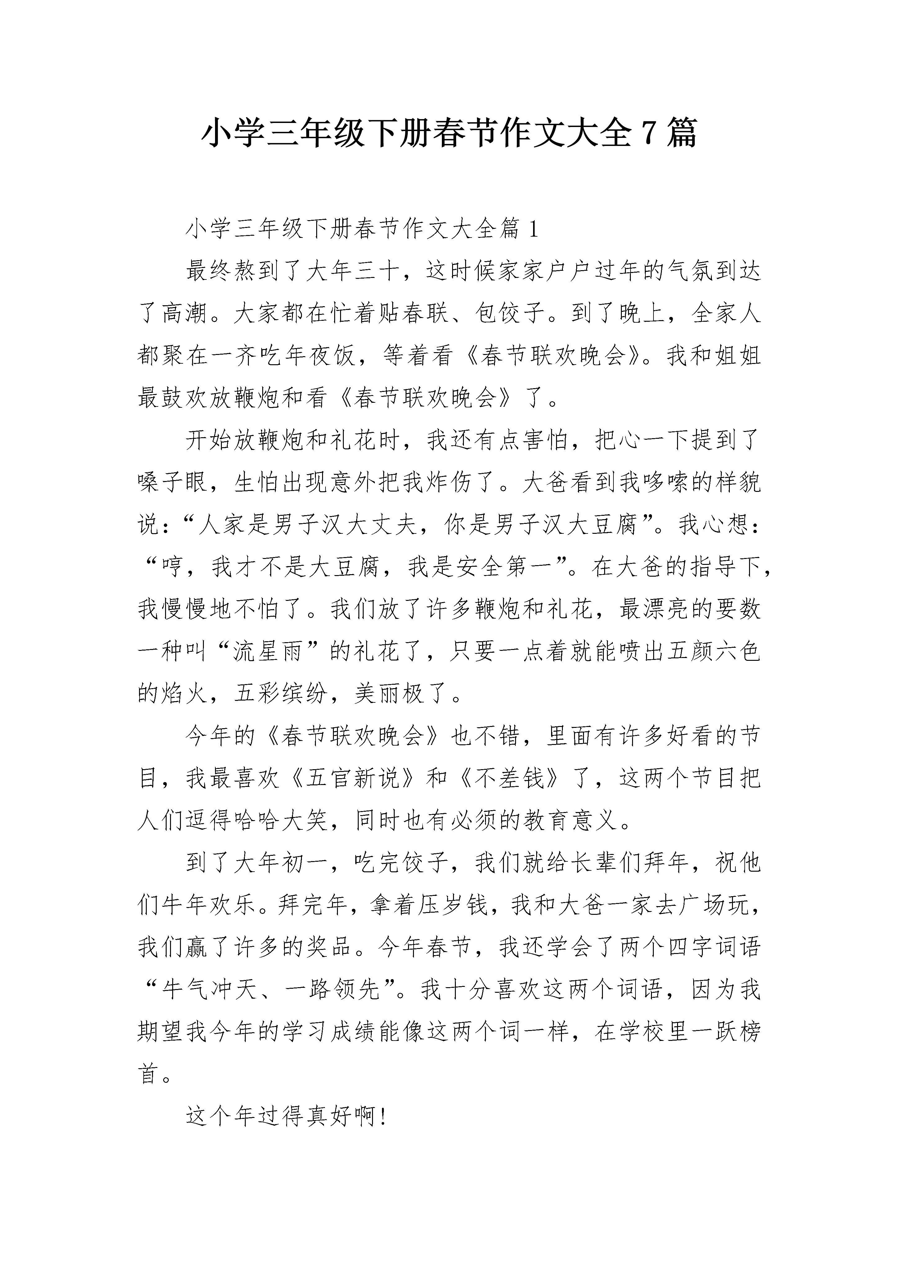 小学三年级下册春节作文大全7篇小学三年级下册春节作文大全篇1最终熬到了大年三十,这时候家家户户过年的气氛到达了高潮。大家都在忙着贴春联、包饺子。到了晚上,全家人都聚在一齐吃年夜饭,等着看《春节联欢晚会》。我和姐姐最鼓欢放鞭炮和看《春节联欢晚会》了。开始放鞭炮和礼花时,我还有点害怕,把心一下提到了嗓子眼,生怕出现意外把我炸伤了。大爸看到我哆嗦的样貌说:“人家是男子汉大丈夫,你是男子汉大豆腐”。我心想:“哼,我才不是大豆腐,我是安全第一”。在大爸的指导下,我慢慢地不怕了。我们放了许多鞭炮和礼花,最漂亮的要数一种叫“流星雨”的礼花了,只要一点着就能喷出五颜六色的焰火,五彩缤纷,美丽极了。今年的《春节联欢晚会》也不错,里面有许多好看的节目,我最喜欢《五官新说》和《不差钱》了,这两个节目把人们逗得哈哈大笑,同时也有必须的教育意义。到了大年初一,吃完饺子,我们就给长辈们拜年,祝他们牛年欢乐。拜完年,拿着压岁钱,我和大爸一家去广场玩,我们赢了许多的奖品。今年春节,我还学会了两个四字词语“牛气冲天、一路领先”。我十分喜欢这两个词语,因为我期望我今年的学习成绩能像这两个词一样,在学校里一跃榜首。这个年过得真好啊!小学三年级下册春节作文大全篇2今年是鼠年,因为弟弟太小,不方便回老家,所以在深圳过年。为了迎接春节,我们家买了苹果树、黄金果树,还有鲜花,只要是没回家的亲戚,都会来我们家过年。大年三十,我们家来了很多客人,大家都在一起吃饭,还放鞭炮。早上,我睡了一个大懒觉,妈妈叫我起床,可我不听,一直睡到十点钟,我才慢慢悠悠的爬起床,吃早饭啦。什么?今天又吃稀饭,太腻了,我不吃了。不一会儿,客人来啦。欢迎。欢迎。客人刚来就帮忙贴对联,而我呢,就出去玩了。中午,大家一起吃饭,有各种各样的食物,我吃的很少,不过吃的很饱,吃完饭后,有的人看手机,有的聊天。下午,大家在悠闲的看西游记,晚上,姐姐来啦。刚吃完饭,我们就飞奔出家门,跑到大操场,开始放鞭炮啦,点燃烟花,嘶嘶嘶嘶嘶嘶…….碰。碰。烟花真响啊。开始玩沙炮了,啪。啪。真好玩,啪啪啪啪啪。没炮了,还是去玩荡秋千吧。我荡的好高啊。几乎要翻跟头了,好危险啊。还是回家吧。该看春晚了,小品,哈哈哈哈哈哈哈哈…….太搞笑了,看了好久以后,我说:“什么?十二点了?”该去睡觉了。大年初一,一大早就收到许多红包,我好开心。小学三年级下册春节作文大全篇3春节,一个喜气洋洋的节日,合家欢乐、趣事无穷,不信,你瞧瞧......17号晚,除夕之夜,我们为了好好热闹一下,就去买了一些火炮,来庆祝一下狗年的最后一个晚上。我们把买的天旋、地旋、空降伞兵等火炮拿到小区广场的平台上放。我们先把“七彩缤花”点点燃,然后往后退,只见“七彩缤花”冒出了许多颜色的火花,弟弟想过去看看,结果裤子被冒出来的火花烧了一个大洞。我们又接着放“空降伞兵”,姑父把它方向立反了,就没放成,乐得我们哈哈大笑。我们又放了“闪电炮”鞭炮声震得耳聋,我放得既兴奋又有点畏惧,我很快就放完了。轮到弟弟放了,他拿着火炮乱舞,想射我们,结果他的火炮被自己不小心弄弯了,这样好危险呀,弟弟就是有点不听话。姑父就拿起弟弟未放完的火炮继续放,火花四射,我们连连后退。可我后面就是一个1米多高的悬崖,下面又是水泥地,我就头朝地掉了下去,落地后成了一个“大”字,疼得我大叫,妈妈只好背我回家了,真遗憾没能把火炮放完呢。回到家,我们继续看春节晚会的节目。12点,新年的钟声敲响了,四周鞭炮声隆隆地响起,五彩缤纷的烟花映红了天空。我和弟弟开始踩气球了,弟弟见一个大气球怎么也踩不爆,就一屁股坐下去了,可气球又飘到其它地方了,弟弟坐了个空,屁股被摔疼了。我趁机也去坐那个气球,气球到是被我坐爆了,但我也被摔了一跤,我和弟弟真是同病相连呀。眼前的气球越来越少了,我们踩的速度也越来越快了,只剩最后一个气球了,它可是我的“命根”,绝不能落到别人手里,我把弟弟一推,把气球抢到了手中,弟弟又来抢,结果不小心被压爆了,真是有惊无险。气球踩爆的声音并不亚于外面的鞭炮声呢。屋里笑声、祝福声不断,拜年了拜年了,我祝大家猪年大吉。小学三年级下册春节作文大全篇4春节,大家过的开不开心啊?下面我来说说我的春节是怎样过的。年夜饭家里做今年的年夜饭很特别,在家里做。清晨,妈妈早早的起床,第一时间写好买菜清单,出去买菜。到晚上,大伙都忙起来,最后一大桌的菜都是由大家齐心协力做出来的。我们吃的好有滋味啊!除夕跑去逛花街今年去逛花市特别有意思,因为我们才逛半小时,手中就已经拿两束花,要知道半小时买两束花已经很厉害哟!大年初一早饭吃年糕新年咯,大家想知道我的早饭是什么吗?年糕!对啦!我一早起来跑到厨房煎年糕,大家都说好吃!前往亲朋好友家拜年啦新年,当然要拜年啦。面对一年不见的亲朋好友可多话说,讲着讲着,大人们就“红包拿来”哦!好啦,这就