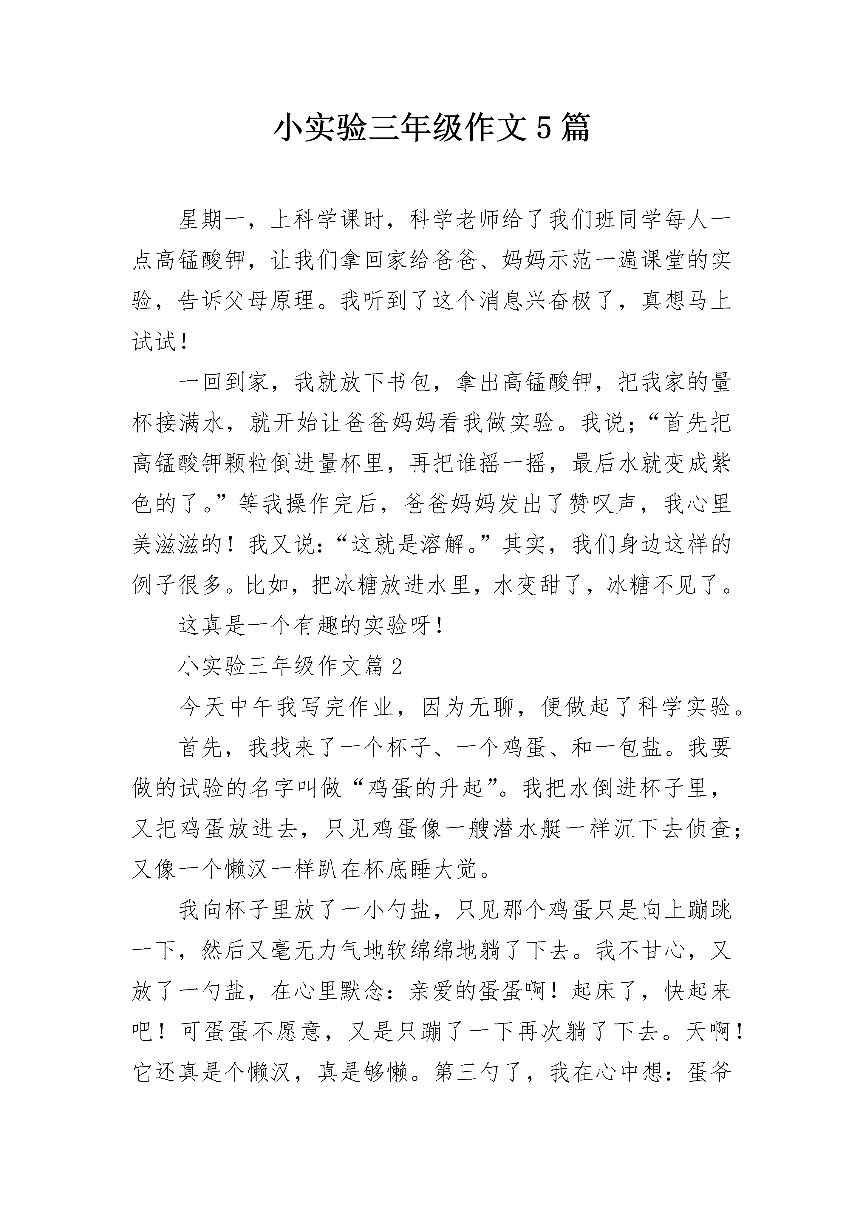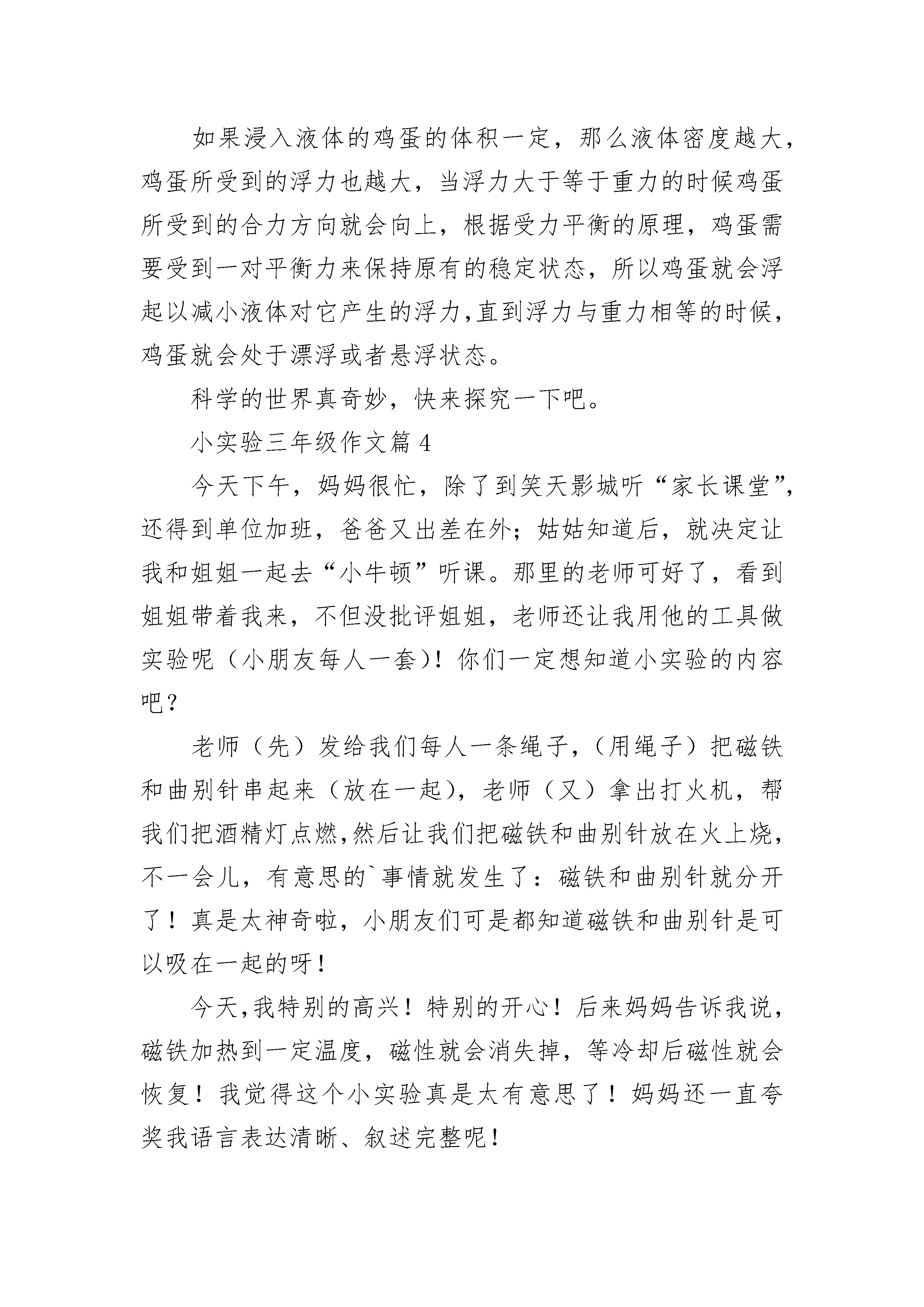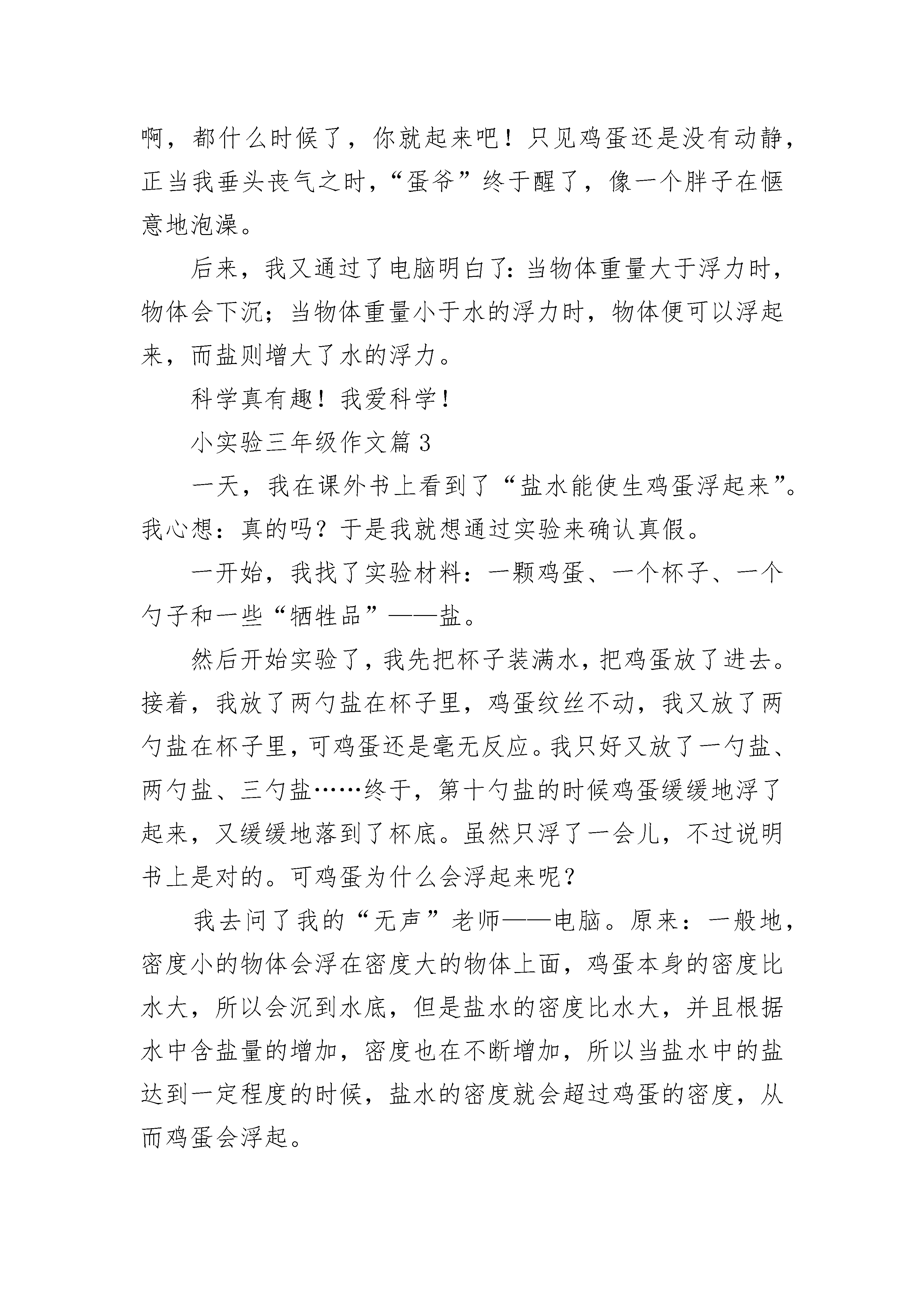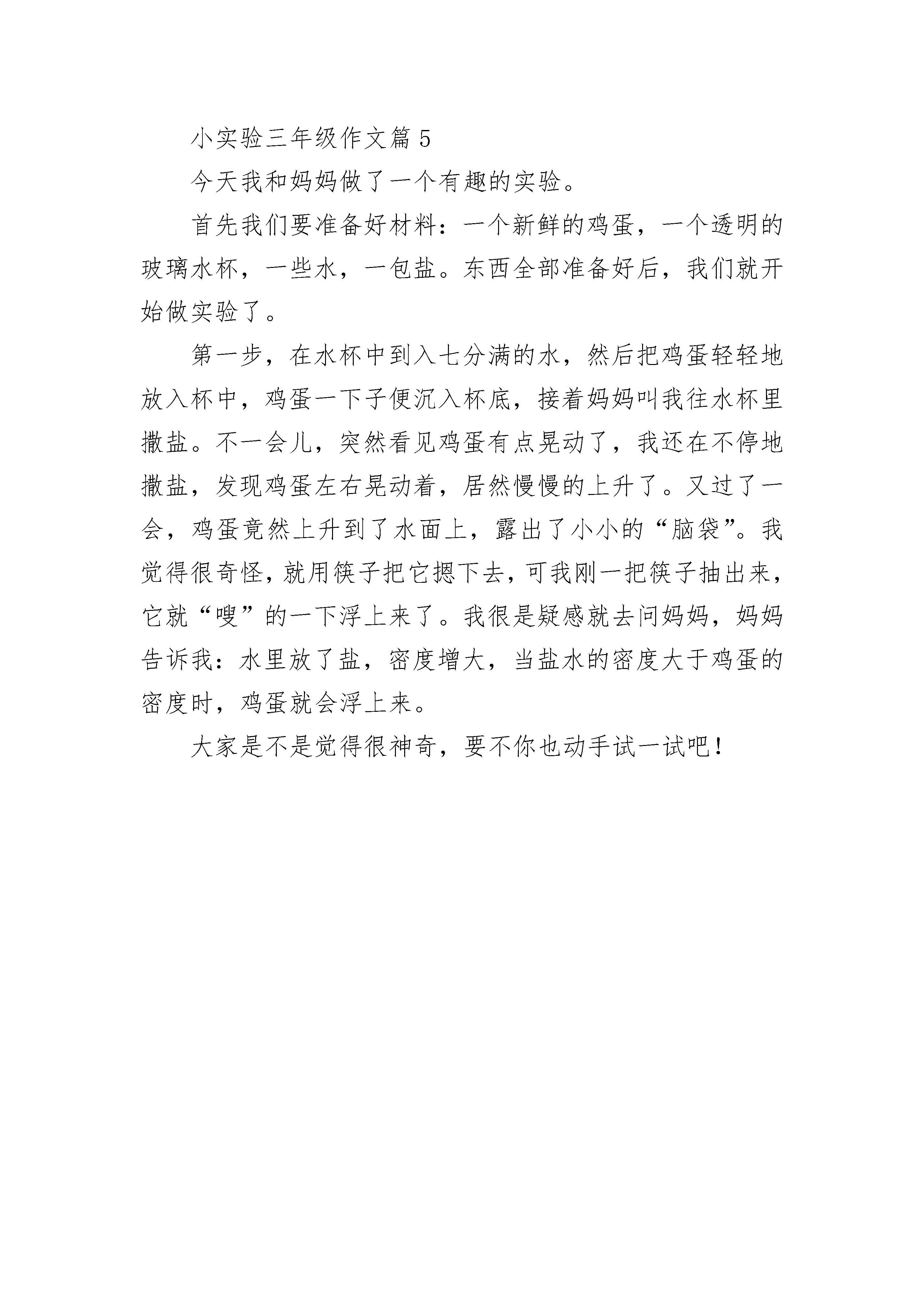 小实验三年级作文5篇星期一,上科学课时,科学老师给了我们班同学每人一点高锰酸钾,让我们拿回家给爸爸、妈妈示范一遍课堂的实验,告诉父母原理。我听到了这个消息兴奋极了,真想马上试试!一回到家,我就放下书包,拿出高锰酸钾,把我家的量杯接满水,就开始让爸爸妈妈看我做实验。我说;“首先把高锰酸钾颗粒倒进量杯里,再把谁摇一摇,最后水就变成紫色的了。”等我操作完后,爸爸妈妈发出了赞叹声,我心里美滋滋的!我又说:“这就是溶解。”其实,我们身边这样的例子很多。比如,把冰糖放进水里,水变甜了,冰糖不见了。这真是一个有趣的实验呀!小实验三年级作文篇2今天中午我写完作业,因为无聊,便做起了科学实验。首先,我找来了一个杯子、一个鸡蛋、和一包盐。我要做的试验的名字叫做“鸡蛋的升起”。我把水倒进杯子里,又把鸡蛋放进去,只见鸡蛋像一艘潜水艇一样沉下去侦查;又像一个懒汉一样趴在杯底睡大觉。我向杯子里放了一小勺盐,只见那个鸡蛋只是向上蹦跳一下,然后又毫无力气地软绵绵地躺了下去。我不甘心,又放了一勺盐,在心里默念:亲爱的蛋蛋啊!起床了,快起来吧!可蛋蛋不愿意,又是只蹦了一下再次躺了下去。天啊!它还真是个懒汉,真是够懒。第三勺了,我在心中想:蛋爷啊,都什么时候了,你就起来吧!只见鸡蛋还是没有动静,正当我垂头丧气之时,“蛋爷”终于醒了,像一个胖子在惬意地泡澡。后来,我又通过了电脑明白了:当物体重量大于浮力时,物体会下沉;当物体重量小于水的浮力时,物体便可以浮起来,而盐则增大了水的浮力。科学真有趣!我爱科学!小实验三年级作文篇3一天,我在课外书上看到了“盐水能使生鸡蛋浮起来”。我心想:真的吗?于是我就想通过实验来确认真假。一开始,我找了实验材料:一颗鸡蛋、一个杯子、一个勺子和一些“牺牲品”——盐。然后开始实验了,我先把杯子装满水,把鸡蛋放了进去。接着,我放了两勺盐在杯子里,鸡蛋纹丝不动,我又放了两勺盐在杯子里,可鸡蛋还是毫无反应。我只好又放了一勺盐、两勺盐、三勺盐……终于,第十勺盐的时候鸡蛋缓缓地浮了起来,又缓缓地落到了杯底。虽然只浮了一会儿,不过说明书上是对的。可鸡蛋为什么会浮起来呢?我去问了我的“无声”老师——电脑。原来:一般地,密度小的物体会浮在密度大的物体上面,鸡蛋本身的密度比水大,所以会沉到水底,但是盐水的密度比水大,并且根据水中含盐量的增加,密度也在不断增加,所以当盐水中的盐达到一定程度的时候,盐水的密度就会超过鸡蛋的密度,从而鸡蛋会浮起。如果浸入液体的鸡蛋的体积一定,那么液体密度越大,鸡蛋所受到的浮力也越大,当浮力大于等于重力的时候鸡蛋所受到的合力方向就会向上,根据受力平衡的原理,鸡蛋需要受到一对平衡力来保持原有的稳定状态,所以鸡蛋就会浮起以减小液体对它产生的浮力,直到浮力与重力相等的时候,鸡蛋就会处于漂浮或者悬浮状态。科学的世界真奇妙,快来探究一下吧。小实验三年级作文篇4今天下午,妈妈很忙,除了到笑天影城听“家长课堂”,还得到单位加班,爸爸又出差在外;姑姑知道后,就决定让我和姐姐一起去“小牛顿”听课。那里的老师可好了,看到姐姐带着我来,不但没批评姐姐,老师还让我用他的工具做实验呢(小朋友每人一套)!你们一定想知道小实验的内容吧?老师(先)发给我们每人一条绳子,(用绳子)把磁铁和曲别针串起来(放在一起),老师(又)拿出打火机,帮我们把酒精灯点燃,然后让我们把磁铁和曲别针放在火上烧,不一会儿,有意思的`事情就发生了:磁铁和曲别针就分开了!真是太神奇啦,小朋友们可是都知道磁铁和曲别针是可以吸在一起的呀!今天,我特别的高兴!特别的开心!后来妈妈告诉我说,磁铁加热到一定温度,磁性就会消失掉,等冷却后磁性就会恢复!我觉得这个小实验真是太有意思了!妈妈还一直夸奖我语言表达清晰、叙述完整呢!小实验三年级作文篇5今天我和妈妈做了一个有趣的实验。首先我们要准备好材料:一个新鲜的鸡蛋,一个透明的玻璃水杯,一些水,一包盐。东西全部准备好后,我们就开始做实验了。第一步,在水杯中到入七分满的水,然后把鸡蛋轻轻地放入杯中,鸡蛋一下子便沉入杯底,接着妈妈叫我往水杯里撒盐。不一会儿,突然看见鸡蛋有点晃动了,我还在不停地撒盐,发现鸡蛋左右晃动着,居然慢慢的上升了。又过了一会,鸡蛋竟然上升到了水面上,露出了小小的“脑袋”。我觉得很奇怪,就用筷子把它摁下去,可我刚一把筷子抽出来,它就“嗖”的一下浮上来了。我很是疑感就去问妈妈,妈妈告诉我:水里放了盐,密度增大,当盐水的密度大于鸡蛋的密度时,鸡蛋就会浮上来。大家是不是觉得很神奇,要不你也动手试一试吧!