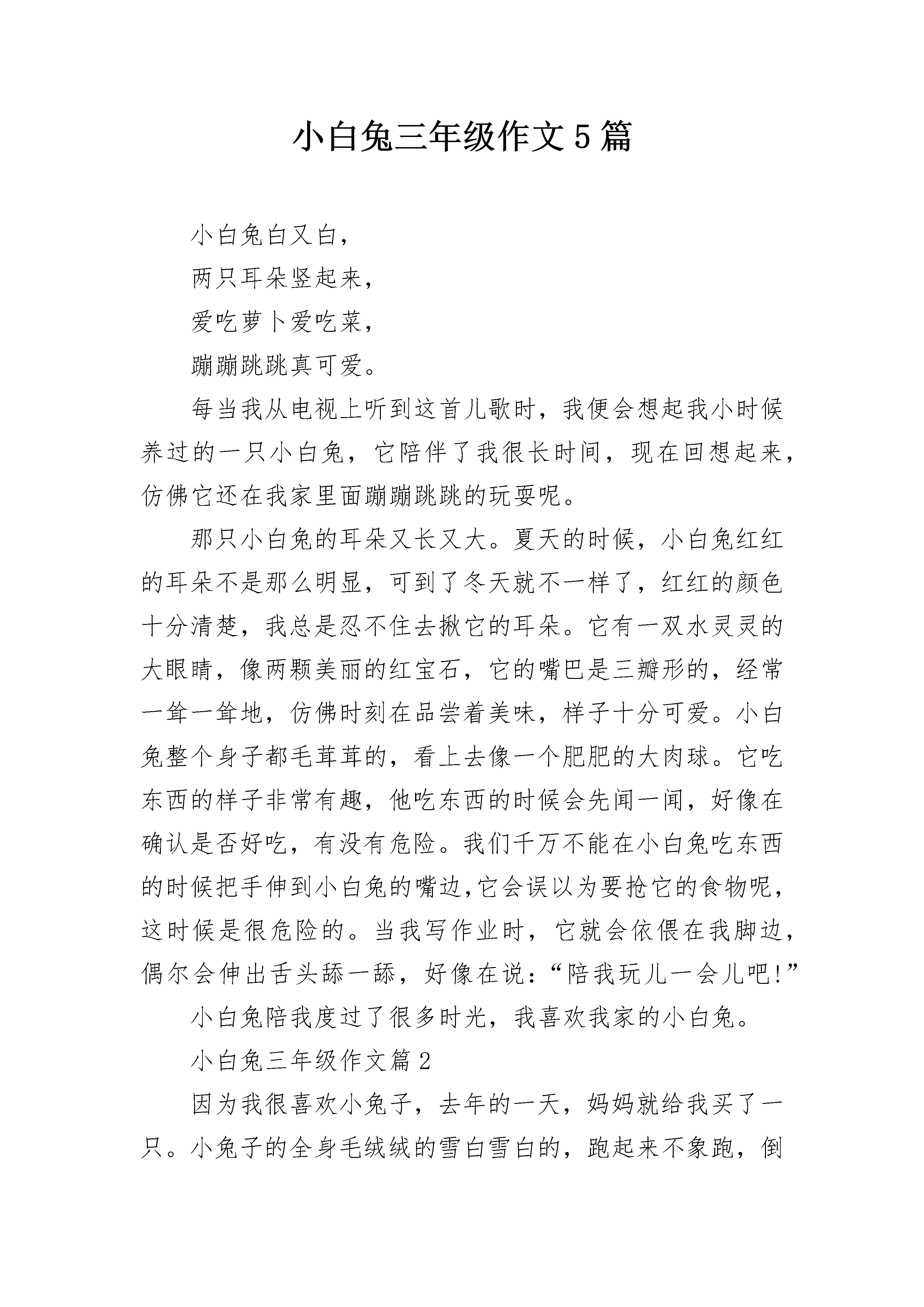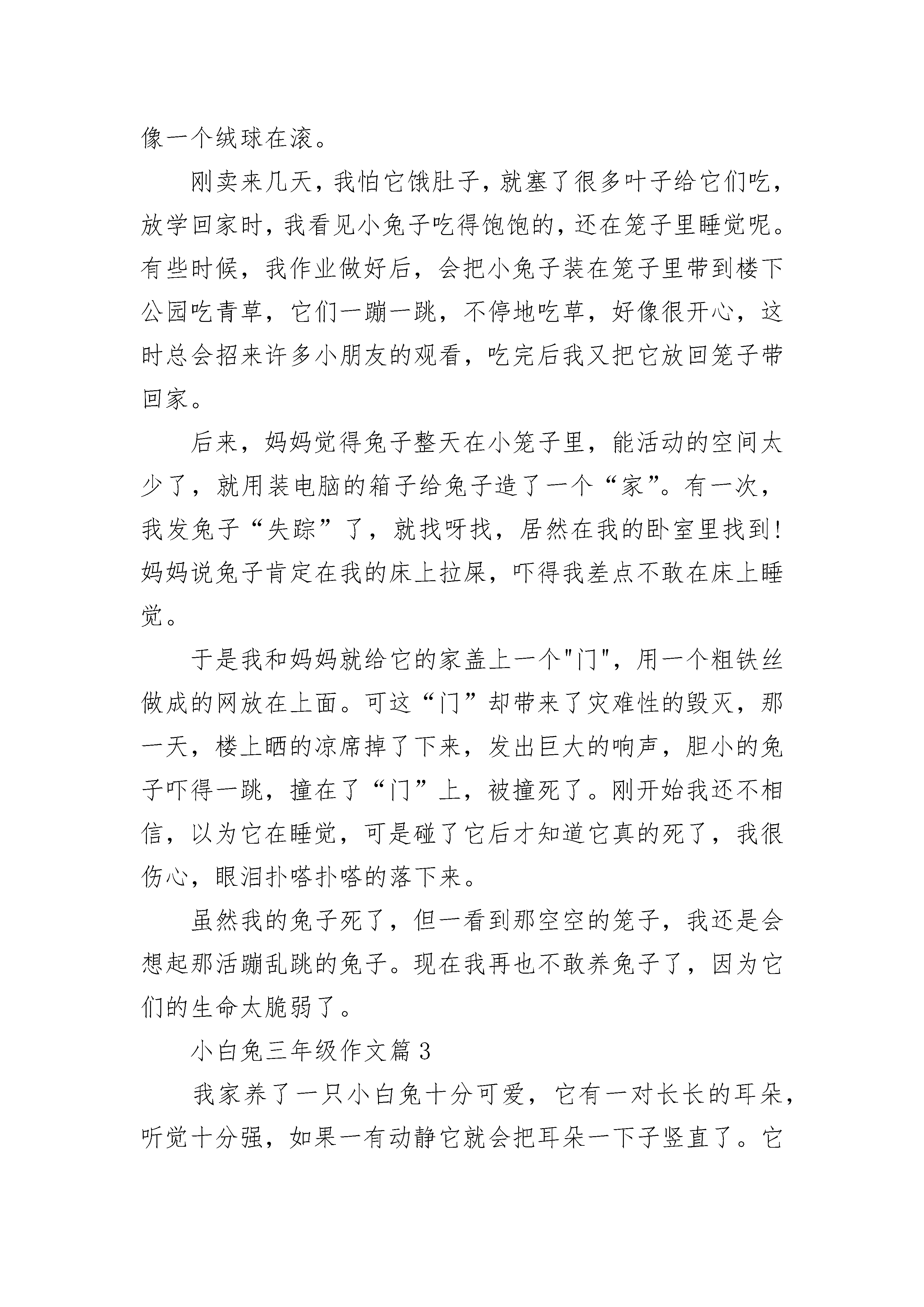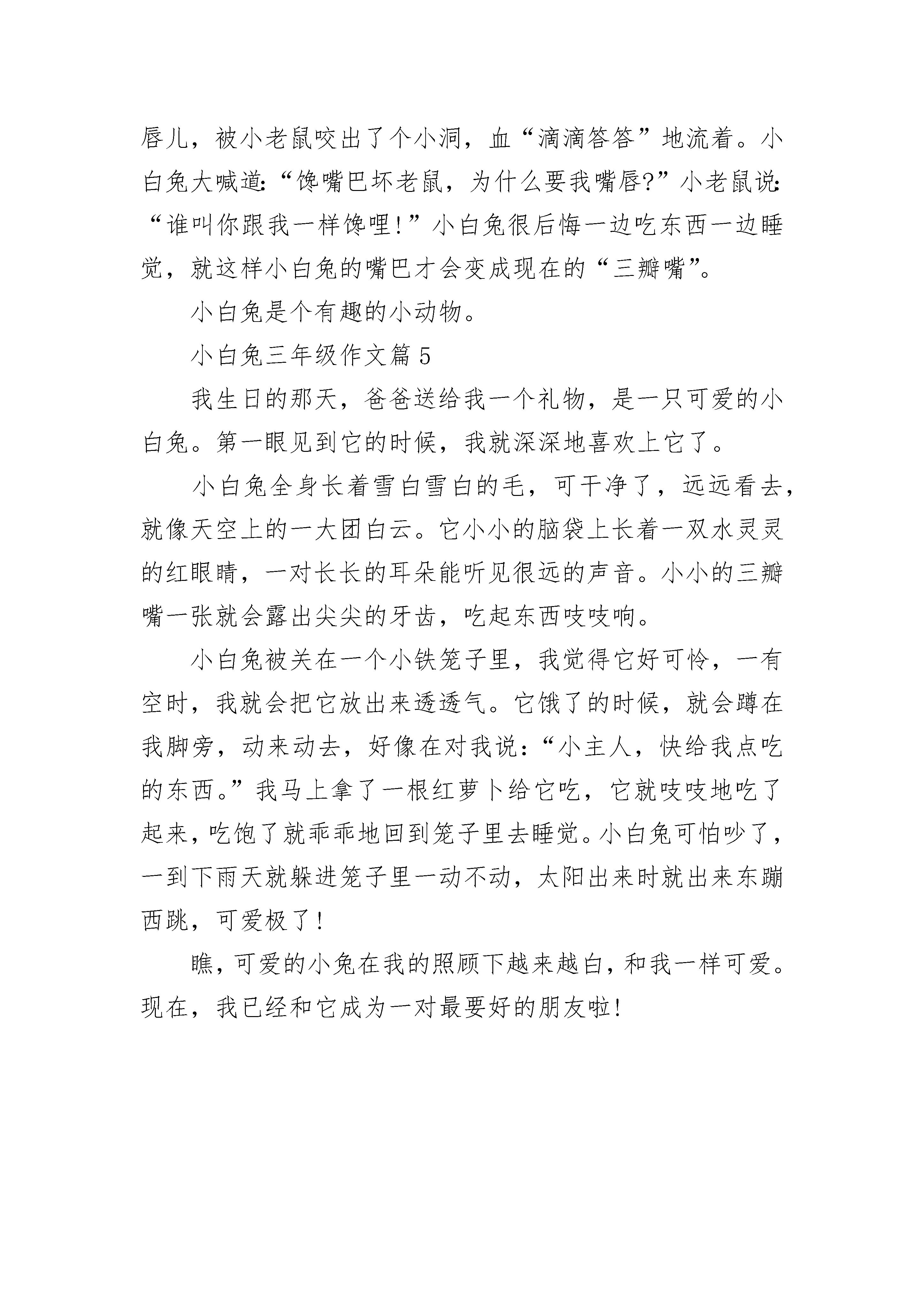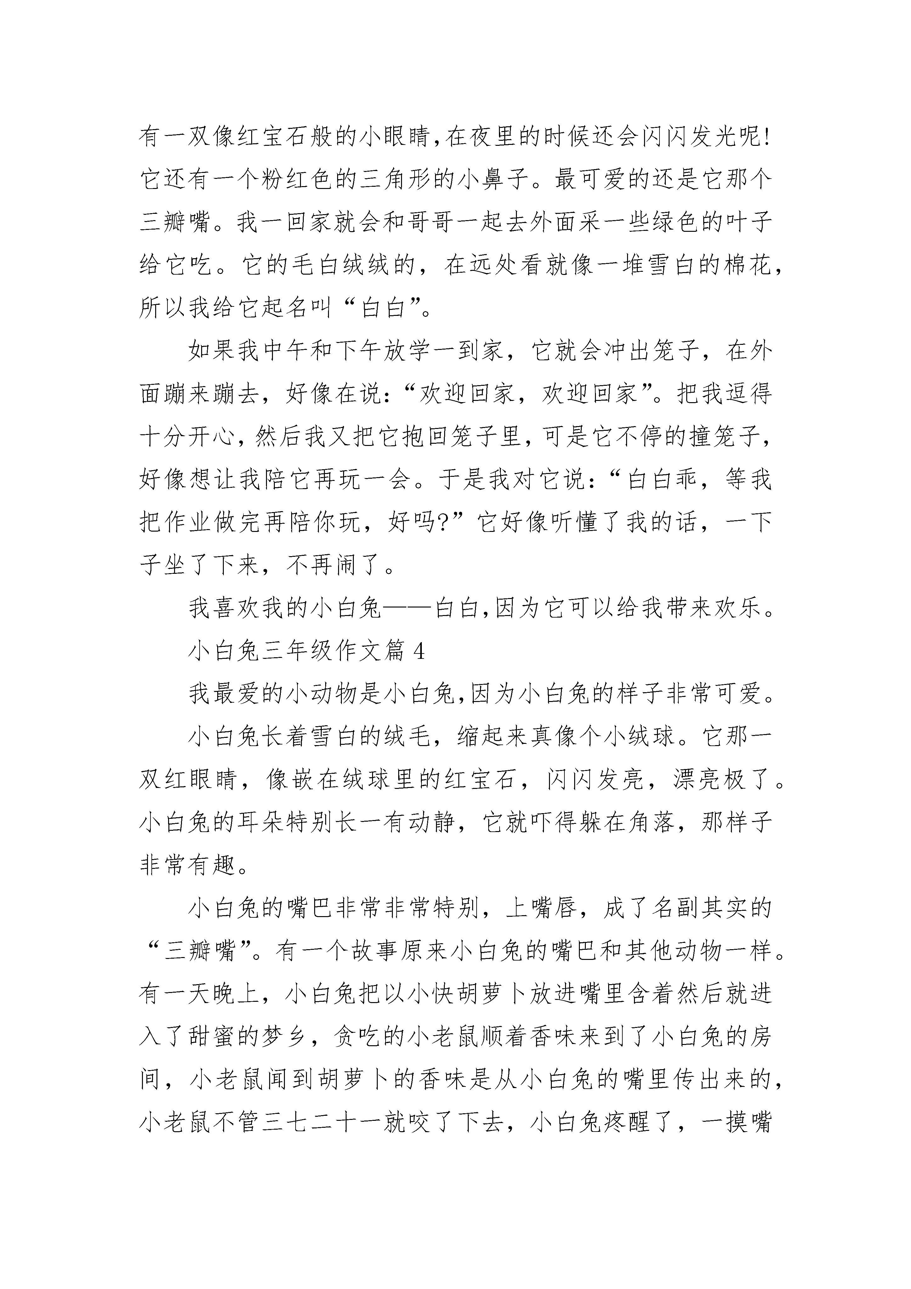 小白兔三年级作文5篇小白兔白又白,两只耳朵竖起来,爱吃萝卜爱吃菜,蹦蹦跳跳真可爱。每当我从电视上听到这首儿歌时,我便会想起我小时候养过的一只小白兔,它陪伴了我很长时间,现在回想起来,仿佛它还在我家里面蹦蹦跳跳的玩耍呢。那只小白兔的耳朵又长又大。夏天的时候,小白兔红红的耳朵不是那么明显,可到了冬天就不一样了,红红的颜色十分清楚,我总是忍不住去揪它的耳朵。它有一双水灵灵的大眼睛,像两颗美丽的红宝石,它的嘴巴是三瓣形的,经常一耸一耸地,仿佛时刻在品尝着美味,样子十分可爱。小白兔整个身子都毛茸茸的,看上去像一个肥肥的大肉球。它吃东西的样子非常有趣,他吃东西的时候会先闻一闻,好像在确认是否好吃,有没有危险。我们千万不能在小白兔吃东西的时候把手伸到小白兔的嘴边,它会误以为要抢它的食物呢,这时候是很危险的。当我写作业时,它就会依偎在我脚边,偶尔会伸出舌头舔一舔,好像在说:“陪我玩儿一会儿吧!”小白兔陪我度过了很多时光,我喜欢我家的小白兔。小白兔三年级作文篇2因为我很喜欢小兔子,去年的一天,妈妈就给我买了一只。小兔子的全身毛绒绒的雪白雪白的,跑起来不象跑,倒像一个绒球在滚。刚卖来几天,我怕它饿肚子,就塞了很多叶子给它们吃,放学回家时,我看见小兔子吃得饱饱的,还在笼子里睡觉呢。有些时候,我作业做好后,会把小兔子装在笼子里带到楼下公园吃青草,它们一蹦一跳,不停地吃草,好像很开心,这时总会招来许多小朋友的观看,吃完后我又把它放回笼子带回家。后来,妈妈觉得兔子整天在小笼子里,能活动的空间太少了,就用装电脑的箱子给兔子造了一个“家”。有一次,我发兔子“失踪”了,就找呀找,居然在我的卧室里找到!妈妈说兔子肯定在我的床上拉屎,吓得我差点不敢在床上睡觉。于是我和妈妈就给它的家盖上一个"门",用一个粗铁丝做成的网放在上面。可这“门”却带来了灾难性的毁灭,那一天,楼上晒的凉席掉了下来,发出巨大的响声,胆小的兔子吓得一跳,撞在了“门”上,被撞死了。刚开始我还不相信,以为它在睡觉,可是碰了它后才知道它真的死了,我很伤心,眼泪扑嗒扑嗒的落下来。虽然我的兔子死了,但一看到那空空的笼子,我还是会想起那活蹦乱跳的兔子。现在我再也不敢养兔子了,因为它们的生命太脆弱了。小白兔三年级作文篇3我家养了一只小白兔十分可爱,它有一对长长的耳朵,听觉十分强,如果一有动静它就会把耳朵一下子竖直了。它有一双像红宝石般的小眼睛,在夜里的时候还会闪闪发光呢!它还有一个粉红色的三角形的小鼻子。最可爱的还是它那个三瓣嘴。我一回家就会和哥哥一起去外面采一些绿色的叶子给它吃。它的毛白绒绒的,在远处看就像一堆雪白的棉花,所以我给它起名叫“白白”。如果我中午和下午放学一到家,它就会冲出笼子,在外面蹦来蹦去,好像在说:“欢迎回家,欢迎回家”。把我逗得十分开心,然后我又把它抱回笼子里,可是它不停的撞笼子,好像想让我陪它再玩一会。于是我对它说:“白白乖,等我把作业做完再陪你玩,好吗?”它好像听懂了我的话,一下子坐了下来,不再闹了。我喜欢我的小白兔——白白,因为它可以给我带来欢乐。小白兔三年级作文篇4我最爱的小动物是小白兔,因为小白兔的样子非常可爱。小白兔长着雪白的绒毛,缩起来真像个小绒球。它那一双红眼睛,像嵌在绒球里的红宝石,闪闪发亮,漂亮极了。小白兔的耳朵特别长一有动静,它就吓得躲在角落,那样子非常有趣。小白兔的嘴巴非常非常特别,上嘴唇,成了名副其实的“三瓣嘴”。有一个故事原来小白兔的嘴巴和其他动物一样。有一天晚上,小白兔把以小快胡萝卜放进嘴里含着然后就进入了甜蜜的梦乡,贪吃的小老鼠顺着香味来到了小白兔的房间,小老鼠闻到胡萝卜的香味是从小白兔的嘴里传出来的,小老鼠不管三七二十一就咬了下去,小白兔疼醒了,一摸嘴唇儿,被小老鼠咬出了个小洞,血“滴滴答答”地流着。小白兔大喊道:“馋嘴巴坏老鼠,为什么要我嘴唇?”小老鼠说:“谁叫你跟我一样馋哩!”小白兔很后悔一边吃东西一边睡觉,就这样小白兔的嘴巴才会变成现在的“三瓣嘴”。小白兔是个有趣的小动物。小白兔三年级作文篇5我生日的那天,爸爸送给我一个礼物,是一只可爱的小白兔。第一眼见到它的时候,我就深深地喜欢上它了。小白兔全身长着雪白雪白的毛,可干净了,远远看去,就像天空上的一大团白云。它小小的脑袋上长着一双水灵灵的红眼睛,一对长长的耳朵能听见很远的声音。小小的三瓣嘴一张就会露出尖尖的牙齿,吃起东西吱吱响。小白兔被关在一个小铁笼子里,我觉得它好可怜,一有空时,我就会把它放出来透透气。它饿了的时候,就会蹲在我脚旁,动来动去,好像在对我说:“小主人,快给我点吃的东西。”我马上拿了一根红萝卜给它吃,它就吱吱地吃了起来,吃饱了就乖乖地回到笼子里去睡觉。小白兔可怕吵了,一到下雨天就躲进笼子里一动不动,太阳出来时就出来东蹦西跳,可爱极了!瞧,可爱的小兔在我的照顾下越来越白,和我一样可爱