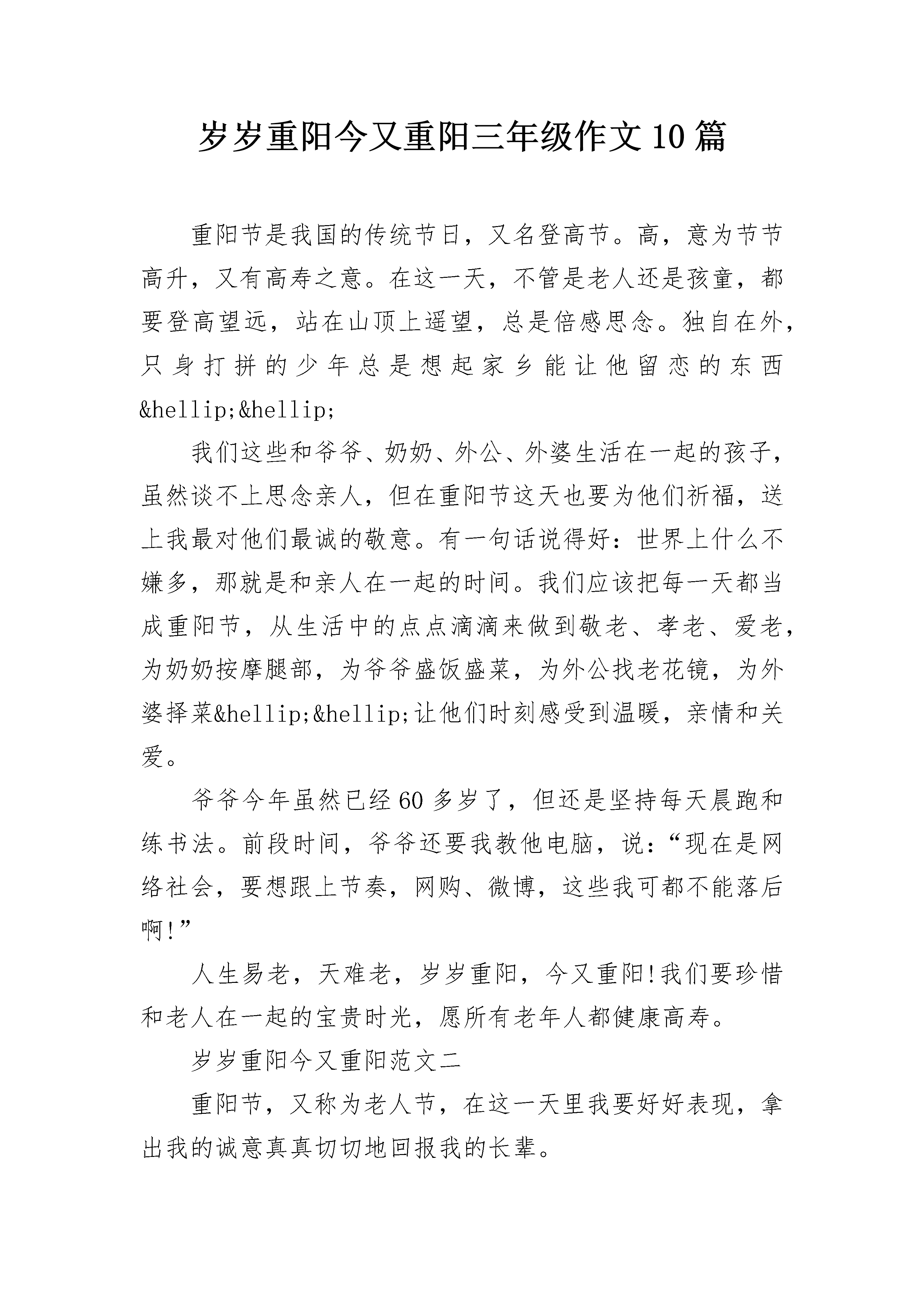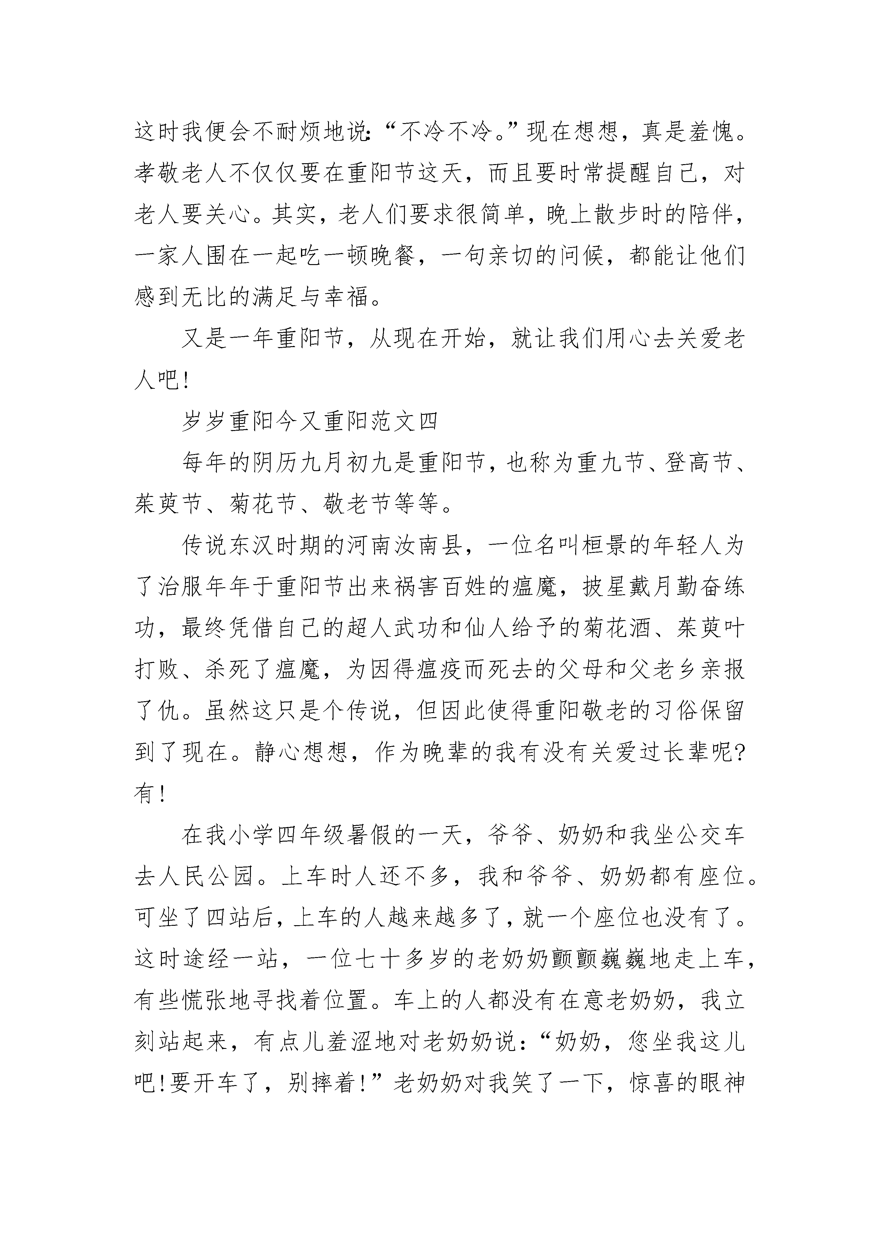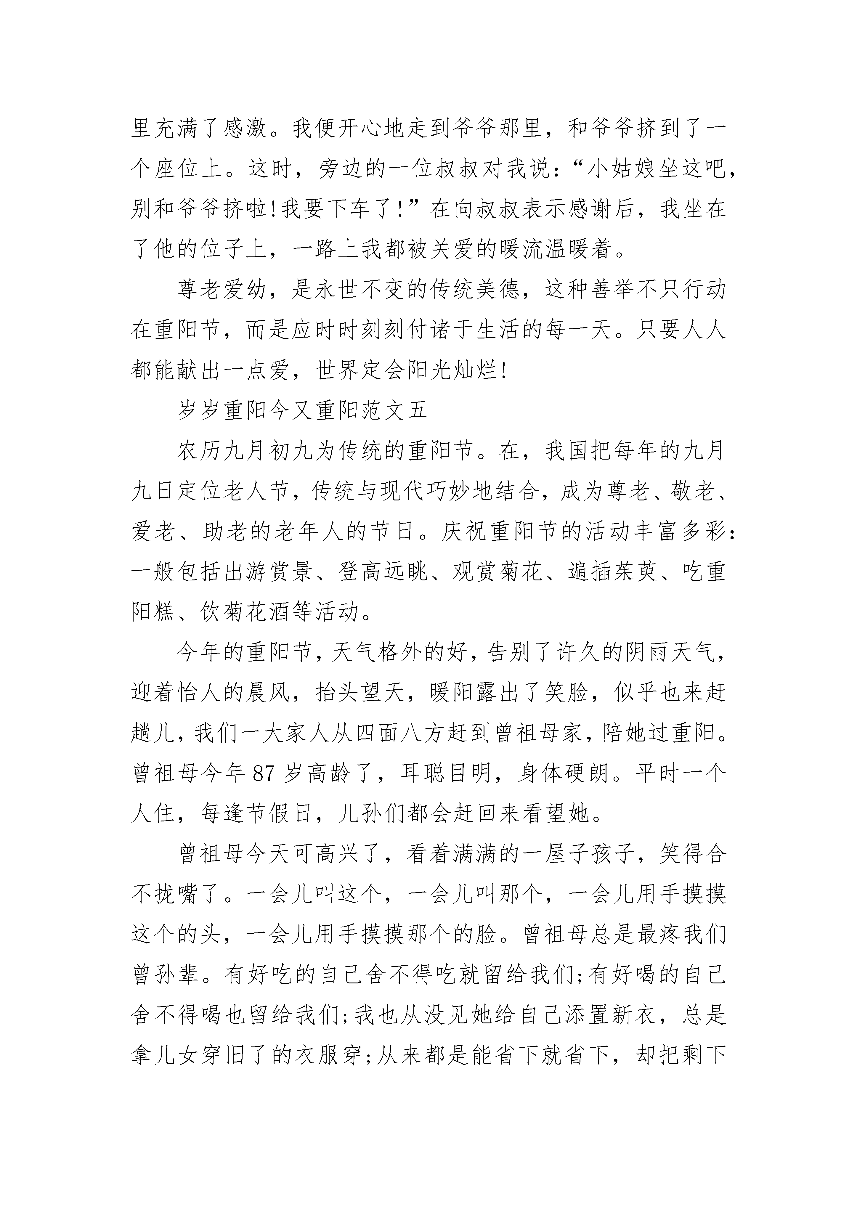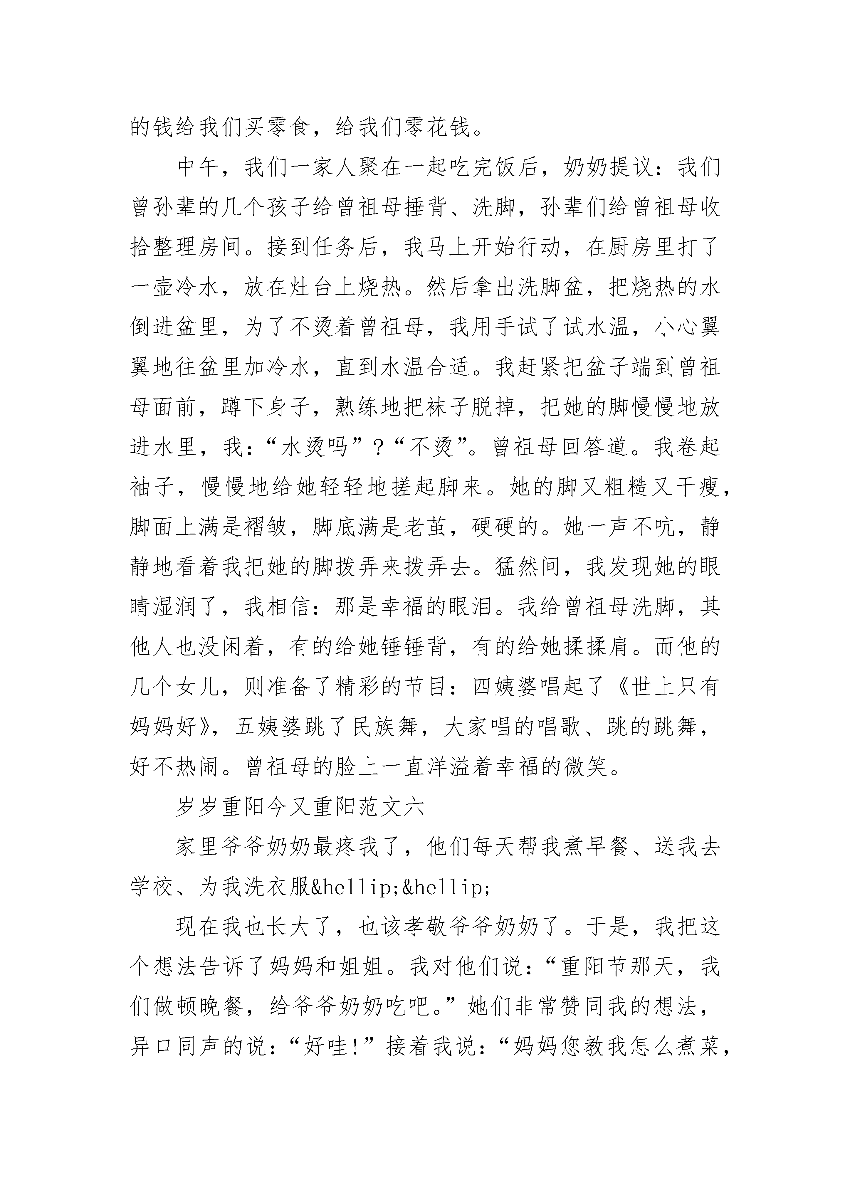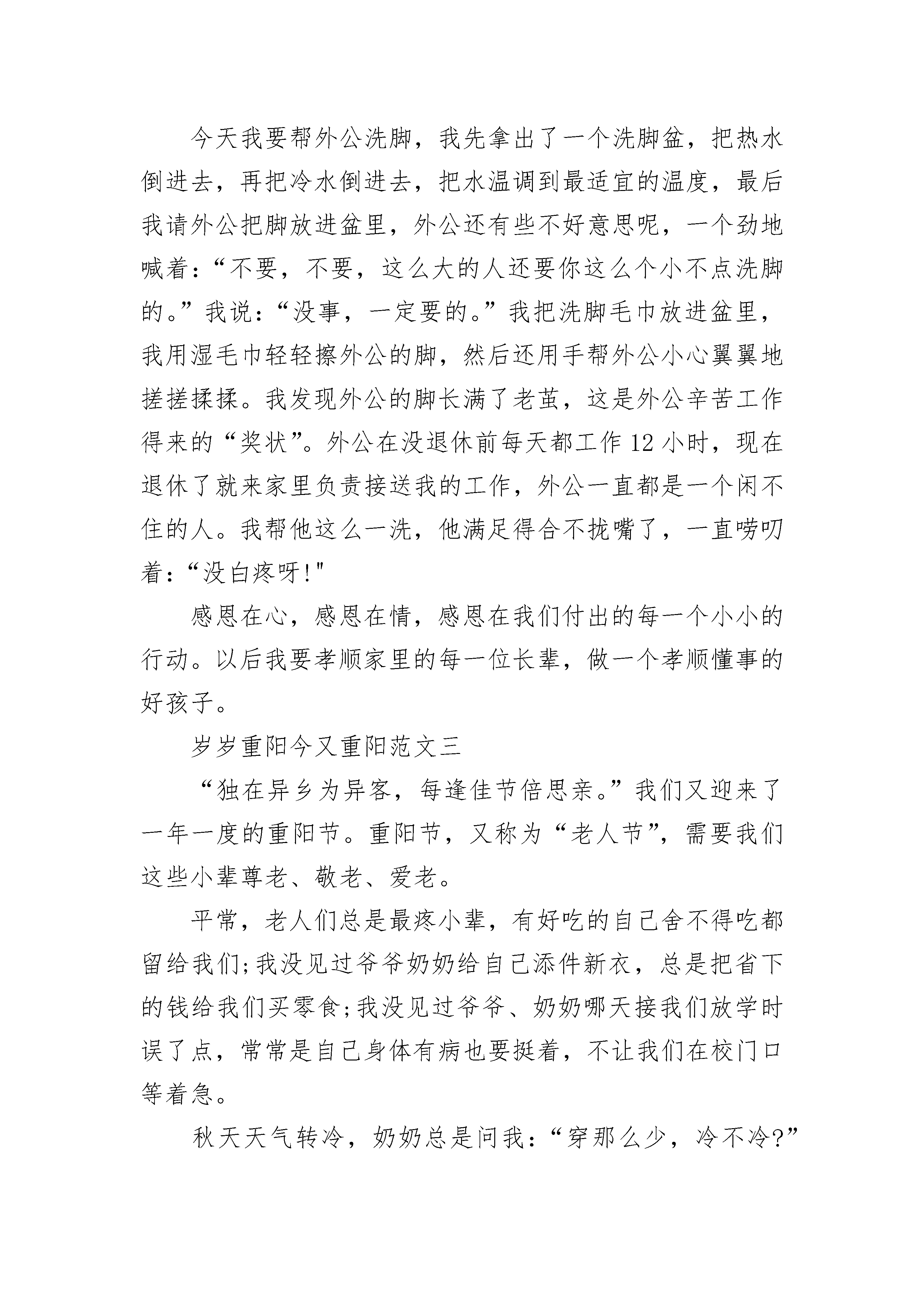 岁岁重阳今又重阳三年级作文10篇重阳节是我国的传统节日,又名登高节。高,意为节节高升,又有高寿之意。在这一天,不管是老人还是孩童,都要登高望远,站在山顶上遥望,总是倍感思念。独自在外,只身打拼的少年总是想起家乡能让他留恋的东西……我们这些和爷爷、奶奶、外公、外婆生活在一起的孩子,虽然谈不上思念亲人,但在重阳节这天也要为他们祈福,送上我最对他们最诚的敬意。有一句话说得好:世界上什么不嫌多,那就是和亲人在一起的时间。我们应该把每一天都当成重阳节,从生活中的点点滴滴来做到敬老、孝老、爱老,为奶奶按摩腿部,为爷爷盛饭盛菜,为外公找老花镜,为外婆择菜……让他们时刻感受到温暖,亲情和关爱。爷爷今年虽然已经60多岁了,但还是坚持每天晨跑和练书法。前段时间,爷爷还要我教他电脑,说:“现在是网络社会,要想跟上节奏,网购、微博,这些我可都不能落后啊!”人生易老,天难老,岁岁重阳,今又重阳!我们要珍惜和老人在一起的宝贵时光,愿所有老年人都健康高寿。岁岁重阳今又重阳范文二重阳节,又称为老人节,在这一天里我要好好表现,拿出我的诚意真真切切地回报我的长辈。今天我要帮外公洗脚,我先拿出了一个洗脚盆,把热水倒进去,再把冷水倒进去,把水温调到最适宜的温度,最后我请外公把脚放进盆里,外公还有些不好意思呢,一个劲地喊着:“不要,不要,这么大的人还要你这么个小不点洗脚的。”我说:“没事,一定要的。”我把洗脚毛巾放进盆里,我用湿毛巾轻轻擦外公的脚,然后还用手帮外公小心翼翼地搓搓揉揉。我发现外公的脚长满了老茧,这是外公辛苦工作得来的“奖状”。外公在没退休前每天都工作12小时,现在退休了就来家里负责接送我的工作,外公一直都是一个闲不住的人。我帮他这么一洗,他满足得合不拢嘴了,一直唠叨着:“没白疼呀!"感恩在心,感恩在情,感恩在我们付出的每一个小小的行动。以后我要孝顺家里的每一位长辈,做一个孝顺懂事的好孩子。岁岁重阳今又重阳范文三“独在异乡为异客,每逢佳节倍思亲。”我们又迎来了一年一度的重阳节。重阳节,又称为“老人节”,需要我们这些小辈尊老、敬老、爱老。平常,老人们总是最疼小辈,有好吃的自己舍不得吃都留给我们;我没见过爷爷奶奶给自己添件新衣,总是把省下的钱给我们买零食;我没见过爷爷、奶奶哪天接我们放学时误了点,常常是自己身体有病也要挺着,不让我们在校门口等着急。秋天天气转冷,奶奶总是问我:“穿那么少,冷不冷?”这时我便会不耐烦地说:“不冷不冷。”现在想想,真是羞愧。孝敬老人不仅仅要在重阳节这天,而且要时常提醒自己,对老人要关心。其实,老人们要求很简单,晚上散步时的陪伴,一家人围在一起吃一顿晚餐,一句亲切的问候,都能让他们感到无比的满足与幸福。又是一年重阳节,从现在开始,就让我们用心去关爱老人吧!岁岁重阳今又重阳范文四每年的阴历九月初九是重阳节,也称为重九节、登高节、茱萸节、菊花节、敬老节等等。传说东汉时期的河南汝南县,一位名叫桓景的年轻人为了治服年年于重阳节出来祸害百姓的瘟魔,披星戴月勤奋练功,最终凭借自己的超人武功和仙人给予的菊花酒、茱萸叶打败、杀死了瘟魔,为因得瘟疫而死去的父母和父老乡亲报了仇。虽然这只是个传说,但因此使得重阳敬老的习俗保留到了现在。静心想想,作为晚辈的我有没有关爱过长辈呢?有!在我小学四年级暑假的一天,爷爷、奶奶和我坐公交车去人民公园。上车时人还不多,我和爷爷、奶奶都有座位。可坐了四站后,上车的人越来越多了,就一个座位也没有了。这时途经一站,一位七十多岁的老奶奶颤颤巍巍地走上车,有些慌张地寻找着位置。车上的人都没有在意老奶奶,我立刻站起来,有点儿羞涩地对老奶奶说:“奶奶,您坐我这儿吧!要开车了,别摔着!”老奶奶对我笑了一下,惊喜的眼神里充满了感激。我便开心地走到爷爷那里,和爷爷挤到了一个座位上。这时,旁边的一位叔叔对我说:“小姑娘坐这吧,别和爷爷挤啦!我要下车了!”在向叔叔表示感谢后,我坐在了他的位子上,一路上我都被关爱的暖流温暖着。尊老爱幼,是永世不变的传统美德,这种善举不只行动在重阳节,而是应时时刻刻付诸于生活的每一天。只要人人都能献出一点爱,世界定会阳光灿烂!岁岁重阳今又重阳范文五农历九月初九为传统的重阳节。在,我国把每年的九月九日定位老人节,传统与现代巧妙地结合,成为尊老、敬老、爱老、助老的老年人的节日。庆祝重阳节的活动丰富多彩:一般包括出游赏景、登高远眺、观赏菊花、遍插茱萸、吃重阳糕、饮菊花酒等活动。今年的重阳节,天气格外的好,告别了许久的阴雨天气,迎着怡人的晨风,抬头望天,暖阳露出了笑脸,似乎也来赶趟儿,我们一大家人从四面八方赶到曾祖母家,陪她过重阳。曾祖母今年87岁高龄了,耳聪目明,身体硬朗。平时一个人住,每逢节假日,儿孙们都会赶回来看望她。曾祖母今天可高兴了,看着满满的一屋子孩
