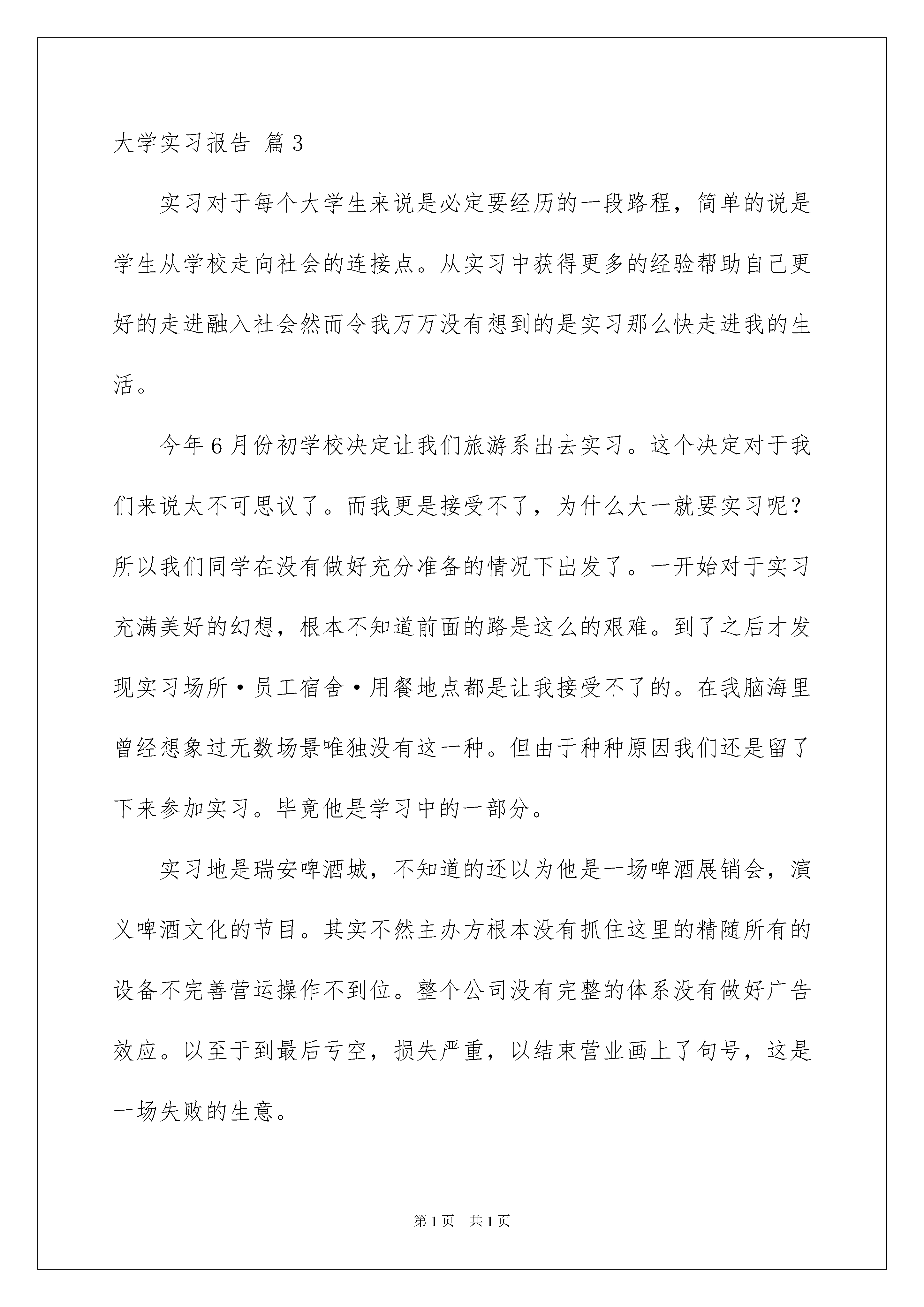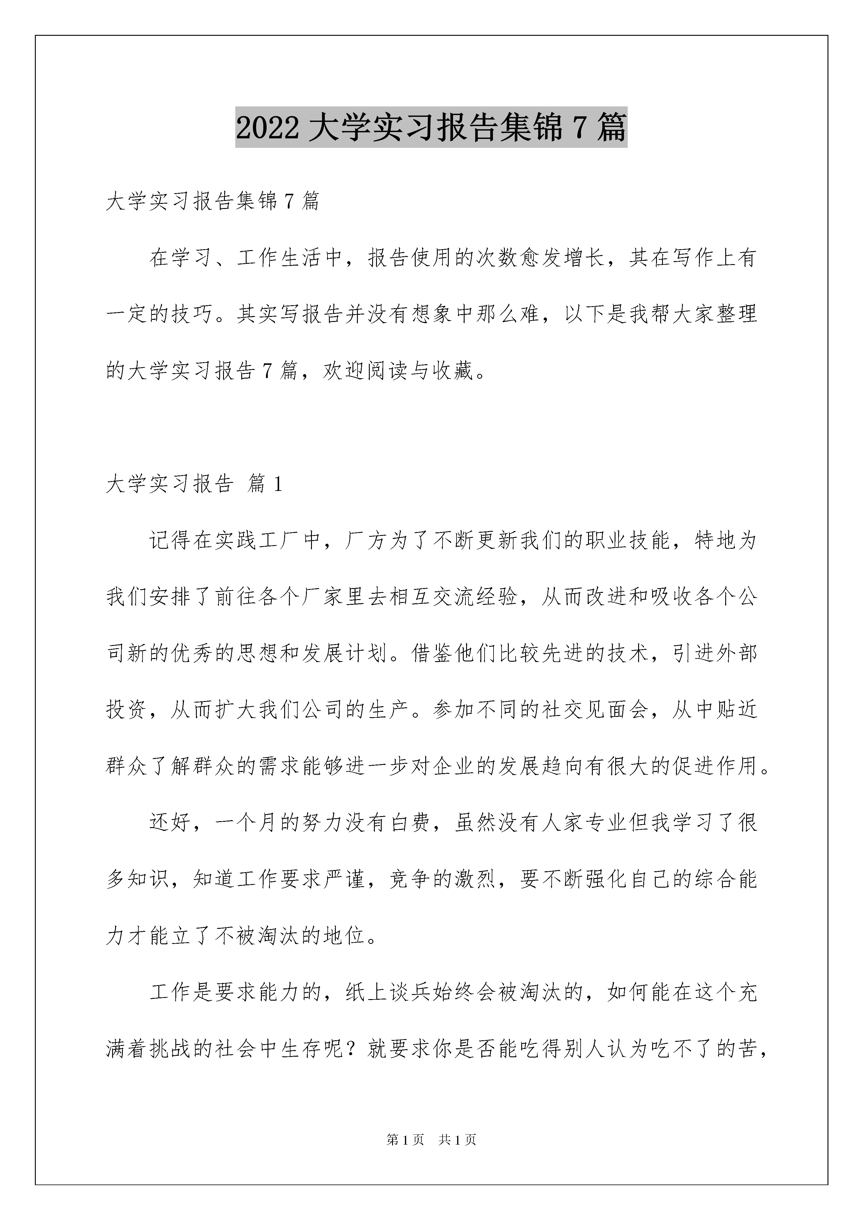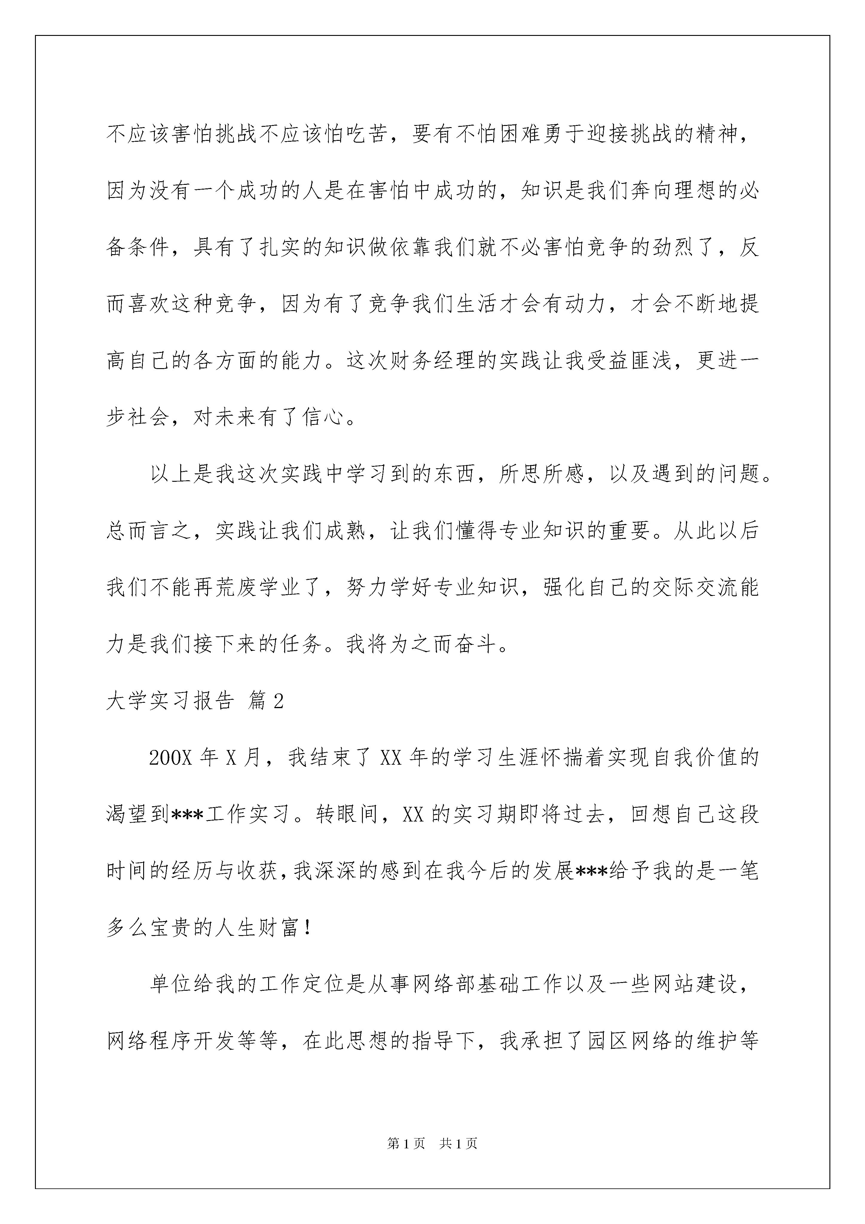 2022大学实习报告集锦7篇大学实习报告集锦7篇在学习、工作生活中,报告使用的次数愈发增长,其在写作上有一定的技巧。其实写报告并没有想象中那么难,以下是我帮大家整理的大学实习报告7篇,欢迎阅读与收藏。大学实习报告篇1记得在实践工厂中,厂方为了不断更新我们的职业技能,特地为我们安排了前往各个厂家里去相互交流经验,从而改进和吸收各个公司新的优秀的思想和发展计划。借鉴他们比较先进的技术,引进外部投资,从而扩大我们公司的生产。参加不同的社交见面会,从中贴近群众了解群众的需求能够进一步对企业的发展趋向有很大的促进作用。还好,一个月的努力没有白费,虽然没有人家专业但我学习了很多知识,知道工作要求严谨,竞争的激烈,要不断强化自己的综合能力才能立了不被淘汰的地位。工作是要求能力的,纸上谈兵始终会被淘汰的,如何能在这个充满着挑战的社会中生存呢?就要求你是否能吃得别人认为吃不了的苦,不应该害怕挑战不应该怕吃苦,要有不怕困难勇于迎接挑战的精神,因为没有一个成功的人是在害怕中成功的,知识是我们奔向理想的必备条件,具有了扎实的知识做依靠我们就不必害怕竞争的劲烈了,反而喜欢这种竞争,因为有了竞争我们生活才会有动力,才会不断地提高自己的各方面的能力。这次财务经理的实践让我受益匪浅,更进一步社会,对未来有了信心。以上是我这次实践中学习到的东西,所思所感,以及遇到的问题。总而言之,实践让我们成熟,让我们懂得专业知识的重要。从此以后我们不能再荒废学业了,努力学好专业知识,强化自己的交际交流能力是我们接下来的任务。我将为之而奋斗。大学实习报告篇2200X年X月,我结束了XX年的学习生涯怀揣着实现自我价值的渴望到***工作实习。转眼间,XX的实习期即将过去,回想自己这段时间的经历与收获,我深深的感到在我今后的发展***给予我的是一笔多么宝贵的人生财富!单位给我的工作定位是从事网络部基础工作以及一些网站建设,网络程序开发等等,在此思想的指导下,我承担了园区网络的维护等基础工作,包括线路检修,交换设备更换,新用户入户等等这方面工作并很快掌握了其中的原理和方法,从学校的理论知识到过去一年的实践工作,其中的角色转变离不开单位各级领导以及同事们的帮助和指导。网站建设方面,和**共同进行了**网站的改造,使用全新的后台,使**网站的功能更加的强大,管理更加的有条理和方便,取得了不错的社会效应。积极参加单位组织的各种活动,团结同事,养成了极强的团队互助精神。参加学习了“**培训”,学习了“**”建设的基本思想和方法。并在实践中掌握了**建设软“**”的使用方法。所做的这些都是对自己一个极大的促进和提高。经过几个月的实践和实习,我对未充满了美好的憧憬,我要更进一步的要求自己。首先继续学习,不断提升理论素养。在信息时代,学习是不断地汲取新信息,获得事业进步的动力。走上工作岗位后,我积极响应单位号召,结合工作实际,不断学习理论、业务知识和社会知识,用先进的理论武装头脑,用精良的业务知识提升能力,以广博的社会知识拓展视野,努力实践,自觉进行角色转化。只有将理论付诸于实践才能实现理论自身的价值,也只有将理论付诸于实践才能使理论得以检验。同样,一个人的价值也是通过实践活动实现的,也只有通过实践才能锻炼人的品质,彰现人的意志。其次从学校走向社会,首要面临的问题便是角色转换的问题。从一个学生转化为一个单位人,在思想的层面上,必须认识到二者的社会角色之间存在着较大的差异。学生时代只是单纯的学习知识,而社会实践则意味着继续学习,并将知识应用于实践,学生时代可以自己选择交往的对象,而社会人则更多地被他人所选择。诸此种种的差异。不胜枚举。但仅仅在思想的层面上认识到这一点还是不够的,而是必须在实际的工作和生活中潜心体会,并自觉的进行这种角色的转换。最后提高工作积极性和主动性,我们不管做什么事都要有激情。只有激情的圣火点燃了,才可以发挥自如,才可以做到最佳,才可以不留遗憾。一年的实习期很快过去了,是开端也是结束。展现在自己面前的是一片任自己驰骋的沃土,也分明感受到了沉甸甸的责任。在今后的工作和生活中,我将继续学习,深入实践,不断提升自我,努力创造业绩,继续为中心创造更多的价值。大学实习报告篇3实习对于每个大学生来说是必定要经历的一段路程,简单的说是学生从学校走向社会的连接点。从实习中获得更多的经验帮助自己更好的走进融入社会然而令我万万没有想到的是实习那么快走进我的生活。今年6月份初学校决定让我们旅游系出去实习。这个决定对于我们来说太不可思议了。而我更是接受不了,为什么大一就要实习呢?所以我们同学在没有做好充分准备的情况下出发了。一开始对于实习充满美好的