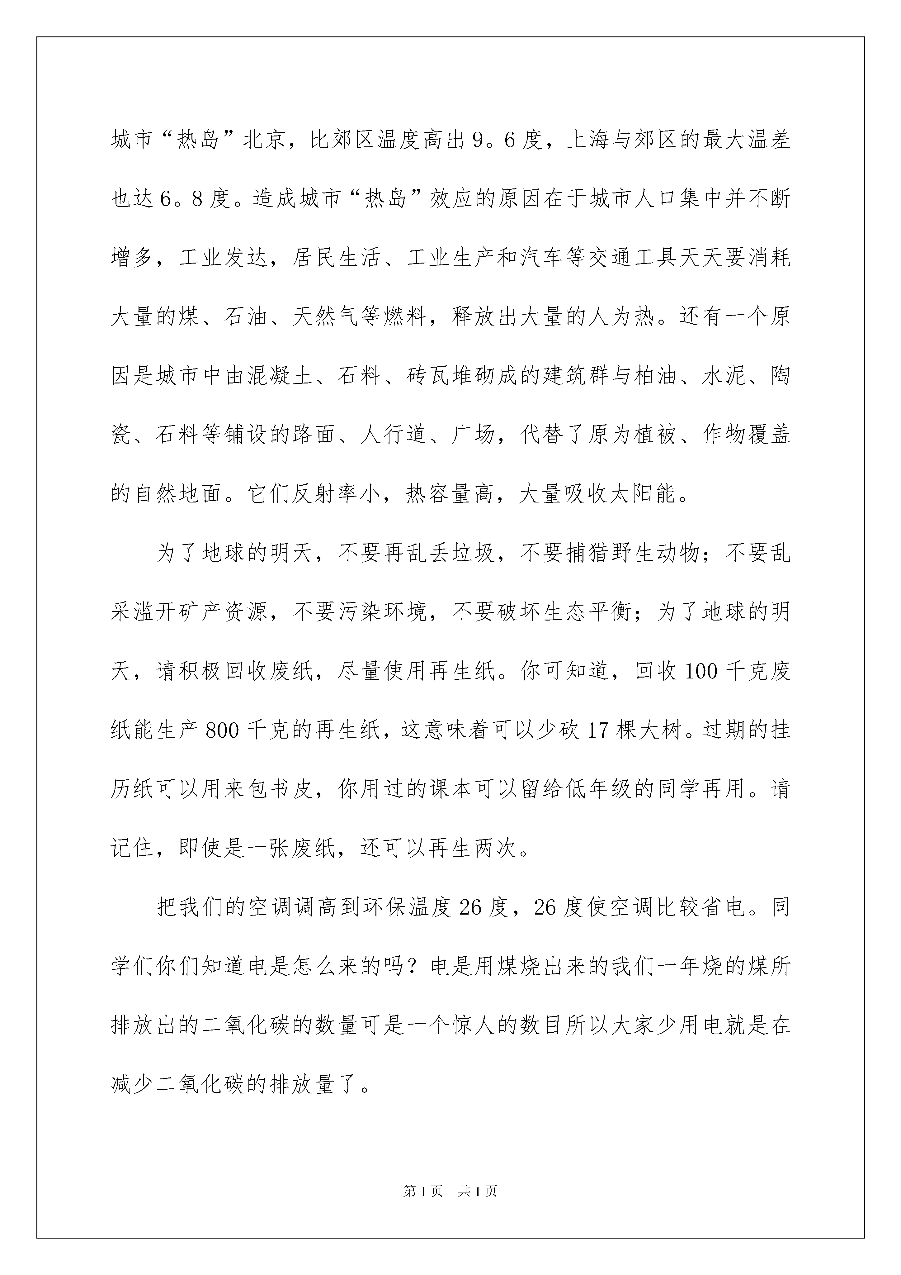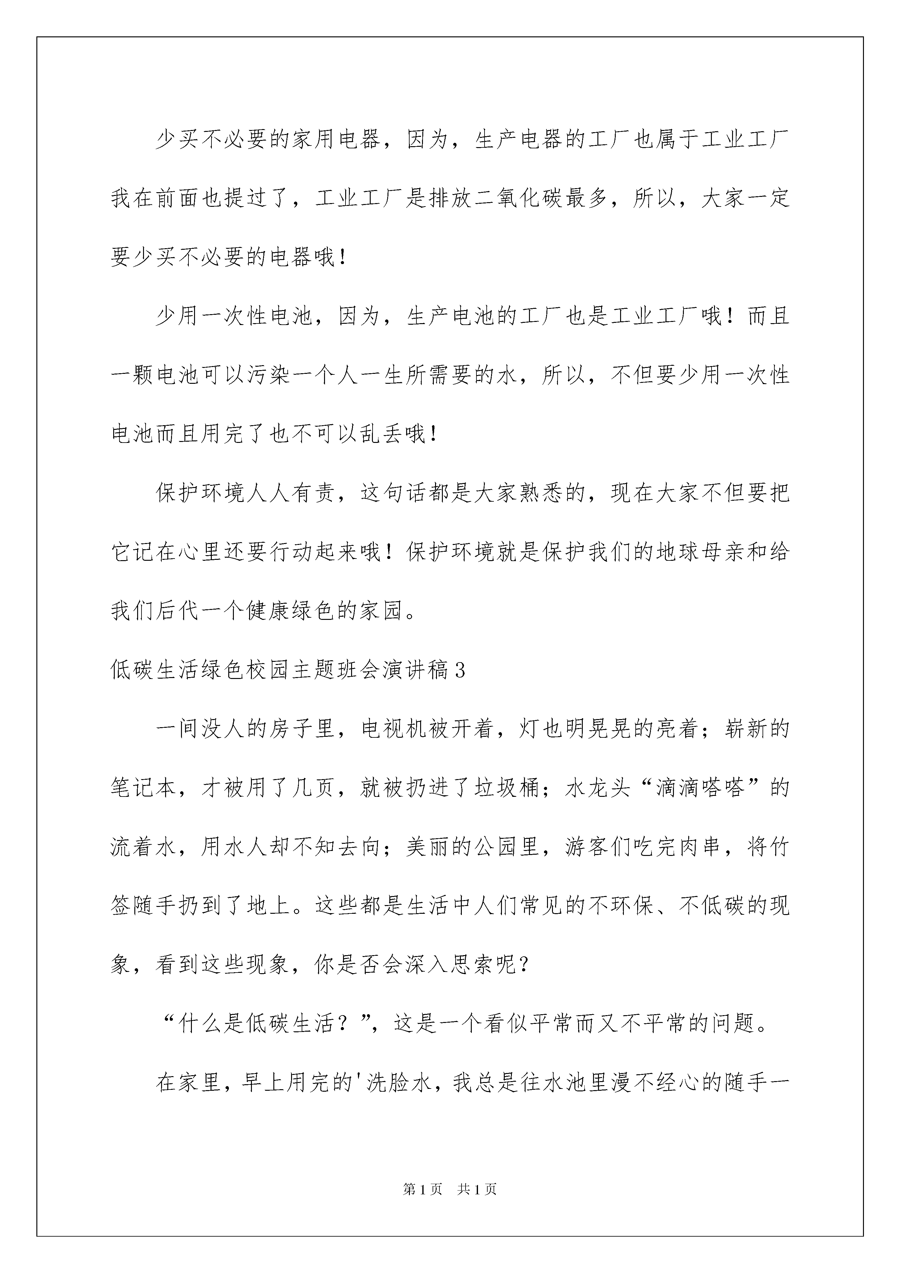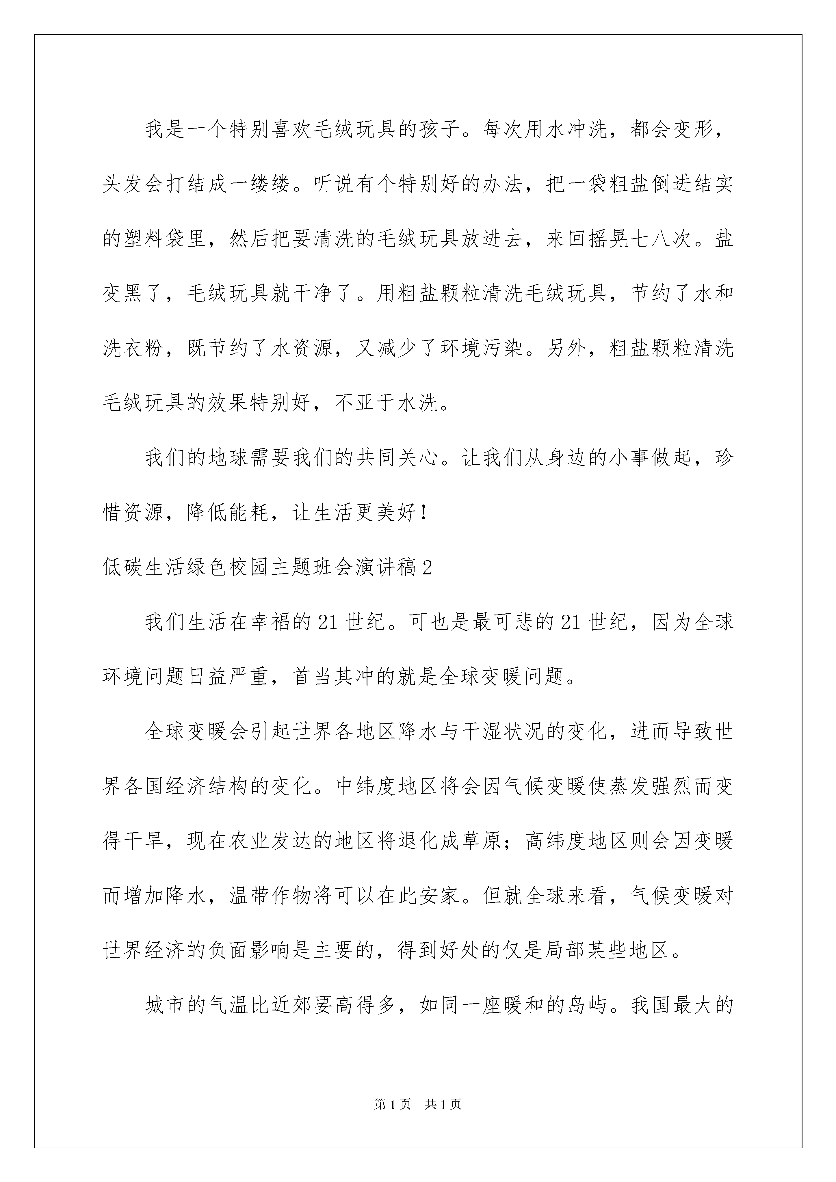 2022低碳生活绿色校园主题班会演讲稿低碳生活绿色校园主题班会演讲稿演讲稿在写作上具有一定的格式要求。随着社会不断地进步,我们可以使用演讲稿的机会越来越多,相信许多人会觉得演讲稿很难写吧,以下是我帮大家整理的低碳生活绿色校园主题班会演讲稿,欢迎大家借鉴与参考,希望对大家有所帮助。低碳生活绿色校园主题班会演讲稿1低碳生活就是要减少日常生活中消耗的能量,从而减少碳的排放,尤其是二氧化碳的排放。低碳生活,对于普通人来说,是一种态度,而不是一种能力。我们应该积极倡导和实践低碳生活,注重节约用电、燃料和节气,从点滴做起。在低碳生活的号召下,我也开始了“低碳之旅”。我家刚装修完,房子里的甲醛等有害物质经常让我们家不放心。我在网上找到了一个简单经济的方法。将菠萝皮铺在一张纸上,放在每个房间的角落,可以去除甲醛。我们马上就做了,每个角落都放了凤梨皮,空气清新到完全闻不到刺鼻的味道。后来在《百科全书》上找到了一些关于菠萝的信息。菠萝皮含有一种可以吸收甲醛的物质,既环保又健康。我是一个特别喜欢毛绒玩具的孩子。每次用水冲洗,都会变形,头发会打结成一缕缕。听说有个特别好的办法,把一袋粗盐倒进结实的塑料袋里,然后把要清洗的毛绒玩具放进去,来回摇晃七八次。盐变黑了,毛绒玩具就干净了。用粗盐颗粒清洗毛绒玩具,节约了水和洗衣粉,既节约了水资源,又减少了环境污染。另外,粗盐颗粒清洗毛绒玩具的效果特别好,不亚于水洗。我们的地球需要我们的共同关心。让我们从身边的小事做起,珍惜资源,降低能耗,让生活更美好!低碳生活绿色校园主题班会演讲稿2我们生活在幸福的21世纪。可也是最可悲的21世纪,因为全球环境问题日益严重,首当其冲的就是全球变暖问题。全球变暖会引起世界各地区降水与干湿状况的变化,进而导致世界各国经济结构的变化。中纬度地区将会因气候变暖使蒸发强烈而变得干旱,现在农业发达的地区将退化成草原;高纬度地区则会因变暖而增加降水,温带作物将可以在此安家。但就全球来看,气候变暖对世界经济的负面影响是主要的,得到好处的仅是局部某些地区。城市的气温比近郊要高得多,如同一座暖和的岛屿。我国最大的城市“热岛”北京,比郊区温度高出9。6度,上海与郊区的最大温差也达6。8度。造成城市“热岛”效应的原因在于城市人口集中并不断增多,工业发达,居民生活、工业生产和汽车等交通工具天天要消耗大量的煤、石油、天然气等燃料,释放出大量的人为热。还有一个原因是城市中由混凝土、石料、砖瓦堆砌成的建筑群与柏油、水泥、陶瓷、石料等铺设的路面、人行道、广场,代替了原为植被、作物覆盖的自然地面。它们反射率小,热容量高,大量吸收太阳能。为了地球的明天,不要再乱丢垃圾,不要捕猎野生动物;不要乱采滥开矿产资源,不要污染环境,不要破坏生态平衡;为了地球的明天,请积极回收废纸,尽量使用再生纸。你可知道,回收100千克废纸能生产800千克的再生纸,这意味着可以少砍17棵大树。过期的挂历纸可以用来包书皮,你用过的课本可以留给低年级的同学再用。请记住,即使是一张废纸,还可以再生两次。把我们的空调调高到环保温度26度,26度使空调比较省电。同学们你们知道电是怎么来的吗?电是用煤烧出来的我们一年烧的煤所排放出的二氧化碳的数量可是一个惊人的数目所以大家少用电就是在减少二氧化碳的排放量了。少买不必要的家用电器,因为,生产电器的工厂也属于工业工厂我在前面也提过了,工业工厂是排放二氧化碳最多,所以,大家一定要少买不必要的电器哦!少用一次性电池,因为,生产电池的工厂也是工业工厂哦!而且一颗电池可以污染一个人一生所需要的水,所以,不但要少用一次性电池而且用完了也不可以乱丢哦!保护环境人人有责,这句话都是大家熟悉的,现在大家不但要把它记在心里还要行动起来哦!保护环境就是保护我们的地球母亲和给我们后代一个健康绿色的家园。低碳生活绿色校园主题班会演讲稿3一间没人的房子里,电视机被开着,灯也明晃晃的亮着;崭新的笔记本,才被用了几页,就被扔进了垃圾桶;水龙头“滴滴嗒嗒”的流着水,用水人却不知去向;美丽的公园里,游客们吃完肉串,将竹签随手扔到了地上。这些都是生活中人们常见的不环保、不低碳的现象,看到这些现象,你是否会深入思索呢?“什么是低碳生活?”,这是一个看似平常而又不平常的问题。在家里,早上用完的'洗脸水,我总是往水池里漫不经心的随手一倒,而妈妈却把这些多余的水节约起来,有谁方便完时,她都是用这些平时省下来的水冲马桶;在学校里,我时不时会看见金校长,在地上捡起同学们不小心遗落的垃圾;在大街上,我们也会看见那些环卫工人们在清扫着路面,他们不辞辛苦,日复一日,不就是在保卫着一个城市的清洁吗?有句老话