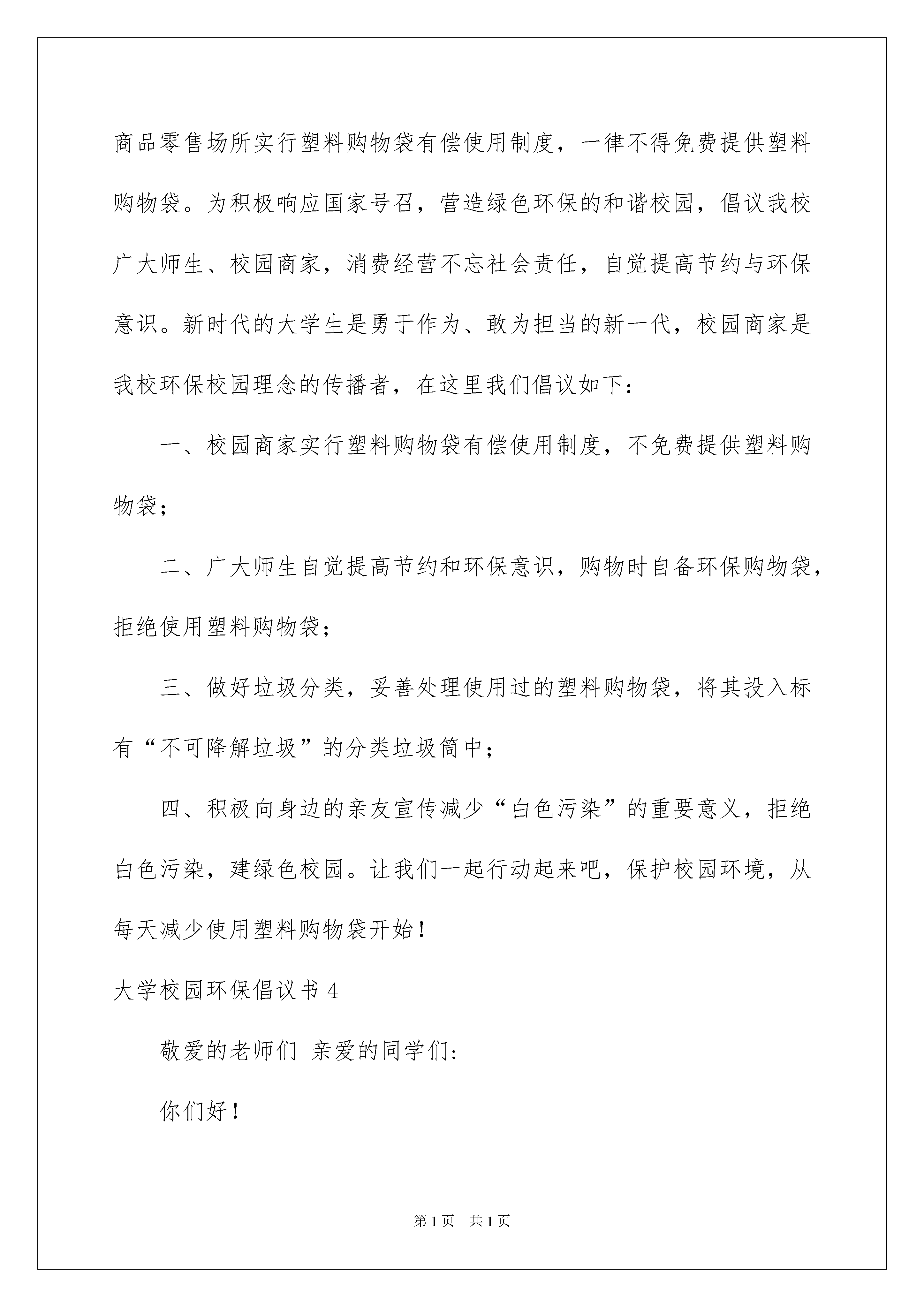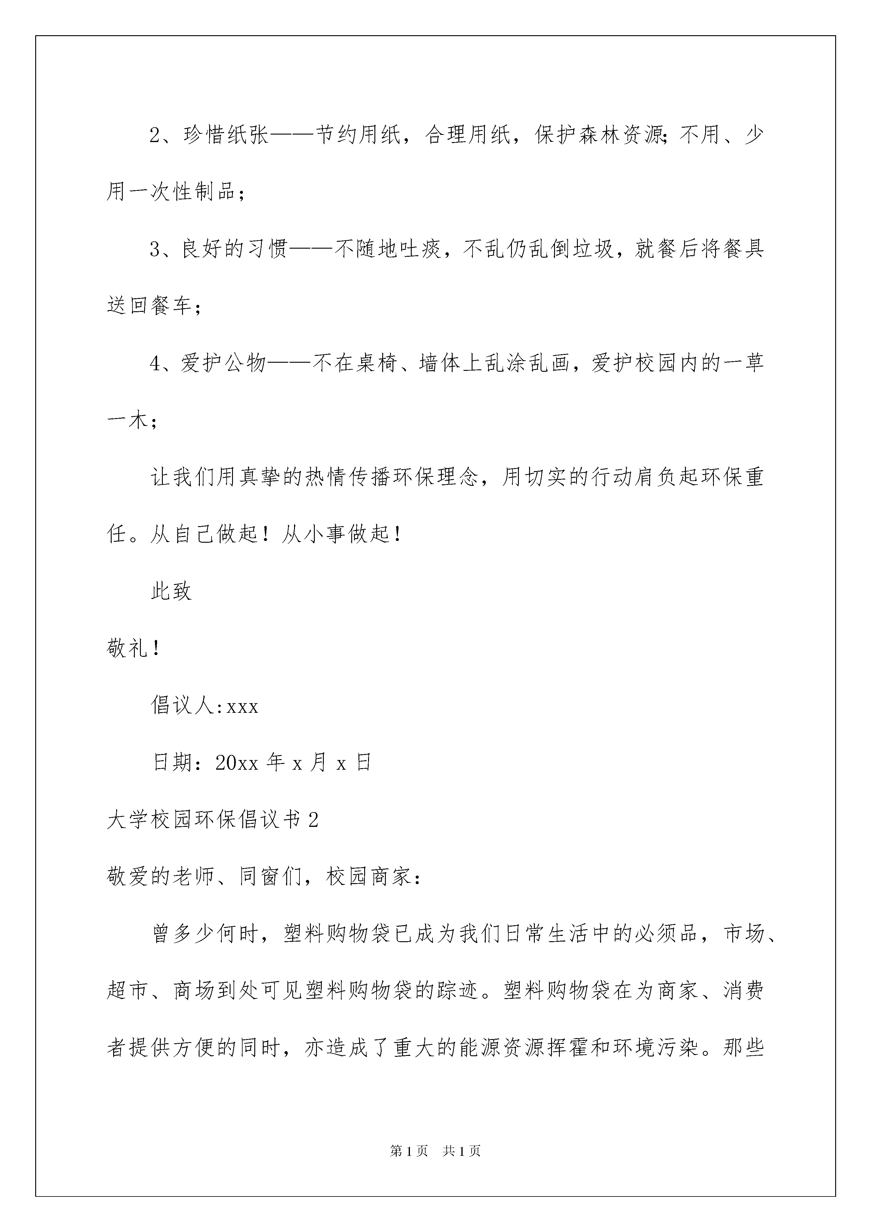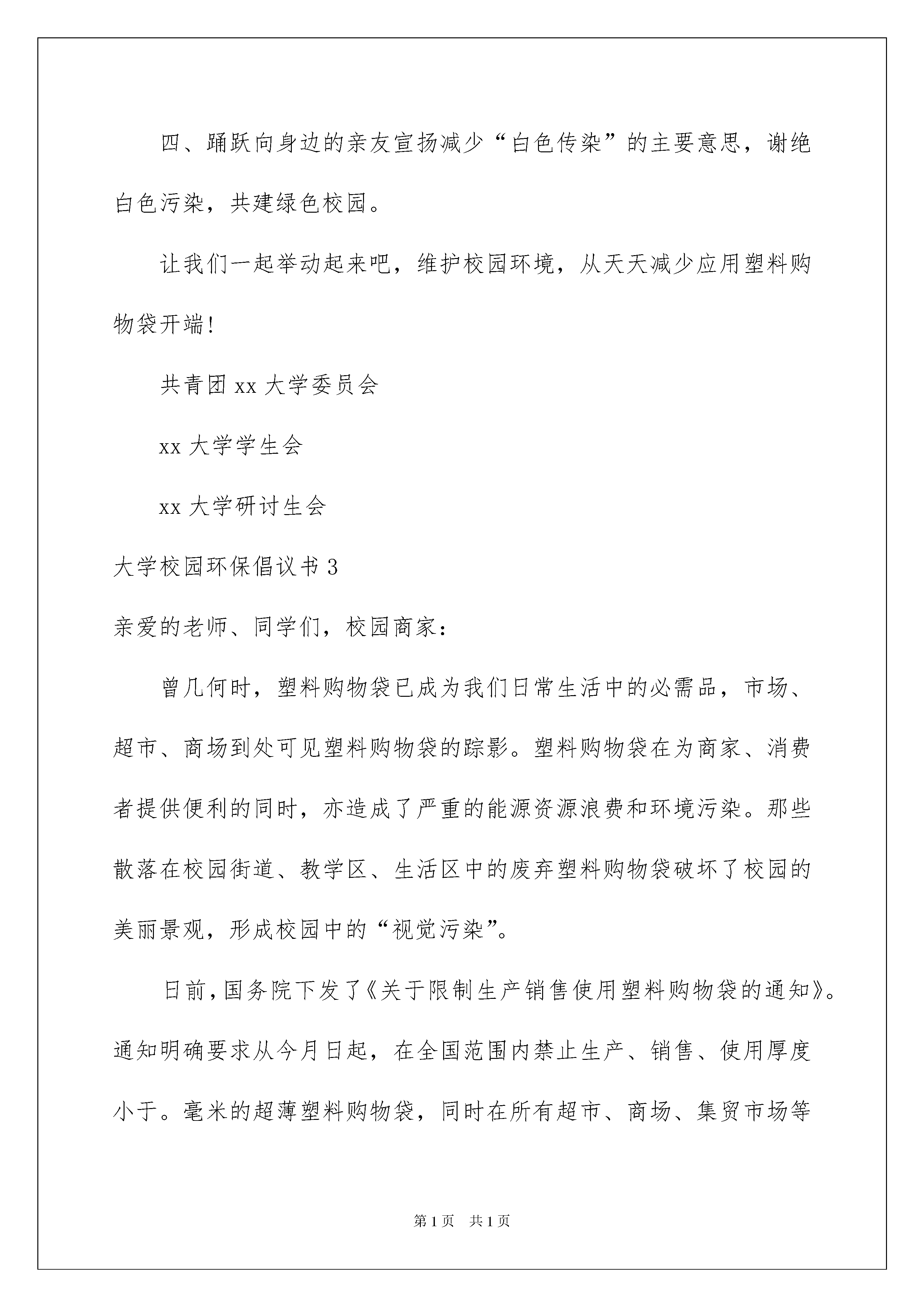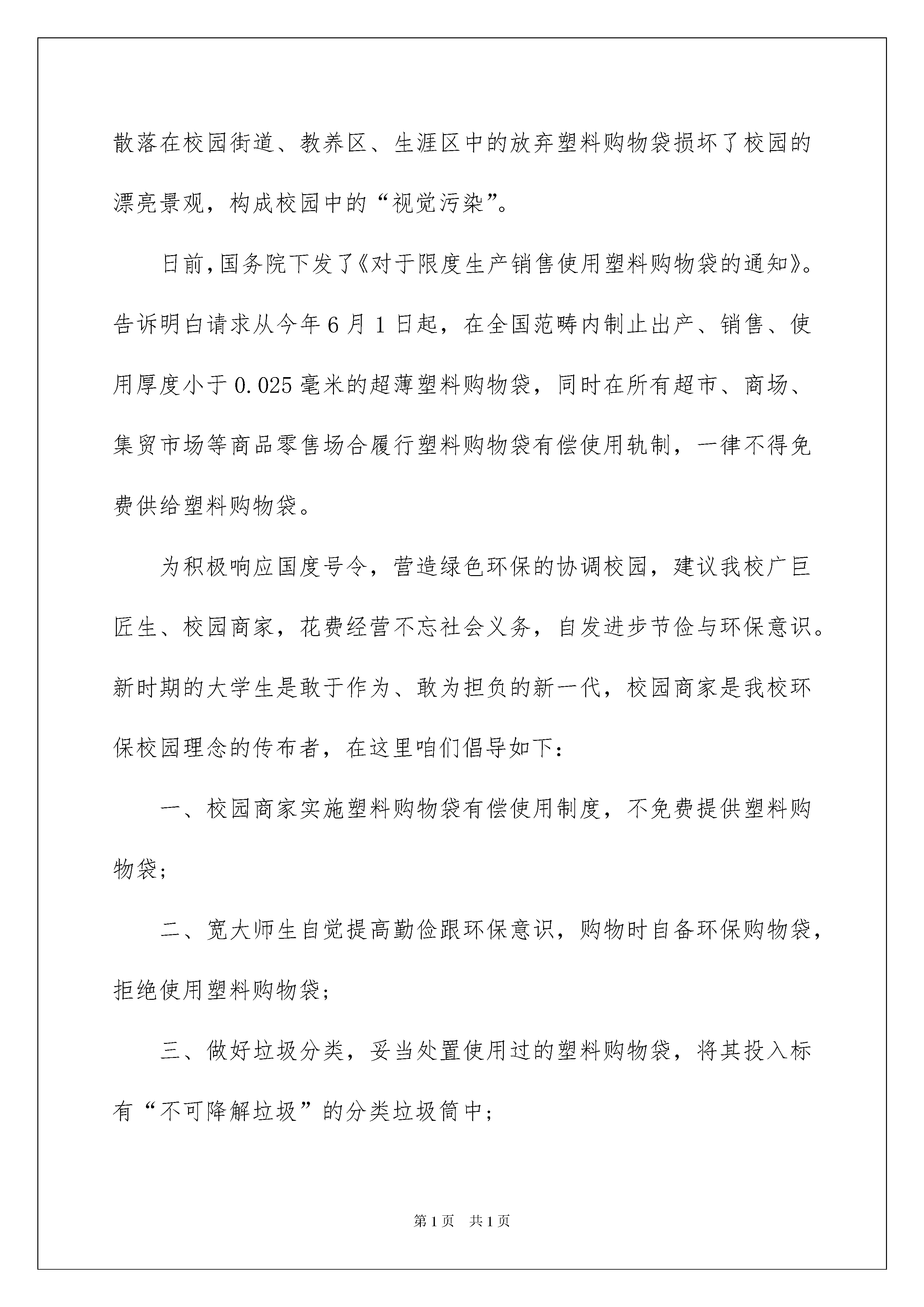 2022大学校园环保倡议书大学校园环保倡议书在不断进步的时代,能够利用到倡议书的场合越来越多,倡议书有利于倡议者交代清楚倡议活动的原因,以及当时的各种背景事实。怎么写倡议书才能避免踩雷呢?以下是我收集整理的大学校园环保倡议书,欢迎阅读与收藏。大学校园环保倡议书1敬爱的老师们,亲爱的同学们:你们好!阳光明媚,空气清新,鸟语花香是我们梦寐以求的校园环境。多来,我校一直努力绿化、美化、净化校园。并通过多种渠道普及环保理念,倡导绿色文明,一更好的营造人文和谐的育人环境。但是,肆意被浪费,乱仍乱倒,不文明就餐等现象也时常出现在同学们身边。在此院学生会生活部特向全院师生发出以下倡议:1、以节水、节电、节粮为荣——随手关紧水龙头,节省每一度电,珍惜粮食;2、珍惜纸张——节约用纸,合理用纸,保护森林资源;不用、少用一次性制品;3、良好的习惯——不随地吐痰,不乱仍乱倒垃圾,就餐后将餐具送回餐车;4、爱护公物——不在桌椅、墙体上乱涂乱画,爱护校园内的一草一木;让我们用真挚的热情传播环保理念,用切实的行动肩负起环保重任。从自己做起!从小事做起!此致敬礼!倡议人:xxx日期:20xx年x月x日大学校园环保倡议书2敬爱的老师、同窗们,校园商家:曾多少何时,塑料购物袋已成为我们日常生活中的必须品,市场、超市、商场到处可见塑料购物袋的踪迹。塑料购物袋在为商家、消费者提供方便的同时,亦造成了重大的能源资源挥霍和环境污染。那些散落在校园街道、教养区、生涯区中的放弃塑料购物袋损坏了校园的漂亮景观,构成校园中的“视觉污染”。日前,国务院下发了《对于限度生产销售使用塑料购物袋的通知》。告诉明白请求从今年6月1日起,在全国范畴内制止出产、销售、使用厚度小于0.025毫米的超薄塑料购物袋,同时在所有超市、商场、集贸市场等商品零售场合履行塑料购物袋有偿使用轨制,一律不得免费供给塑料购物袋。为积极响应国度号令,营造绿色环保的协调校园,建议我校广巨匠生、校园商家,花费经营不忘社会义务,自发进步节俭与环保意识。新时期的大学生是敢于作为、敢为担负的新一代,校园商家是我校环保校园理念的传布者,在这里咱们倡导如下:一、校园商家实施塑料购物袋有偿使用制度,不免费提供塑料购物袋;二、宽大师生自觉提高勤俭跟环保意识,购物时自备环保购物袋,拒绝使用塑料购物袋;三、做好垃圾分类,妥当处置使用过的塑料购物袋,将其投入标有“不可降解垃圾”的分类垃圾筒中;四、踊跃向身边的亲友宣扬减少“白色传染”的主要意思,谢绝白色污染,共建绿色校园。让我们一起举动起来吧,维护校园环境,从天天减少应用塑料购物袋开端!共青团xx大学委员会xx大学学生会xx大学研讨生会大学校园环保倡议书3亲爱的老师、同学们,校园商家:曾几何时,塑料购物袋已成为我们日常生活中的必需品,市场、超市、商场到处可见塑料购物袋的踪影。塑料购物袋在为商家、消费者提供便利的同时,亦造成了严重的能源资源浪费和环境污染。那些散落在校园街道、教学区、生活区中的废弃塑料购物袋破坏了校园的美丽景观,形成校园中的“视觉污染”。日前,国务院下发了《关于限制生产销售使用塑料购物袋的通知》。通知明确要求从今月日起,在全国范围内禁止生产、销售、使用厚度小于。毫米的超薄塑料购物袋,同时在所有超市、商场、集贸市场等商品零售场所实行塑料购物袋有偿使用制度,一律不得免费提供塑料购物袋。为积极响应国家号召,营造绿色环保的和谐校园,倡议我校广大师生、校园商家,消费经营不忘社会责任,自觉提高节约与环保意识。新时代的大学生是勇于作为、敢为担当的新一代,校园商家是我校环保校园理念的传播者,在这里我们倡议如下:一、校园商家实行塑料购物袋有偿使用制度,不免费提供塑料购物袋;二、广大师生自觉提高节约和环保意识,购物时自备环保购物袋,拒绝使用塑料购物袋;三、做好垃圾分类,妥善处理使用过的塑料购物袋,将其投入标有“不可降解垃圾”的分类垃圾筒中;四、积极向身边的亲友宣传减少“白色污染”的重要意义,拒绝白色污染,建绿色校园。让我们一起行动起来吧,保护校园环境,从每天减少使用塑料购物袋开始!大学校园环保倡议书4敬爱的老师们亲爱的同学们:你们好!阳光明媚,空气清新,鸟语花香是我们梦寐以求的校园环境。多年来,我校一直努力绿化、美化、净化校园。并通过多种渠道普及环保理念,倡导绿色文明,一更好的'营造人文和谐的育人环境。但是,肆意被浪费,乱仍乱倒,不文明就餐等现象也时常出现在同学们身边。在此院学生会生活部特向全院师生发出以下倡议:1、以节水、节电、节粮为荣——随手关紧水龙头,节省每一度电,珍惜粮食;2、珍惜纸张——节约用纸,合理用纸,保护森林资源;不用、少