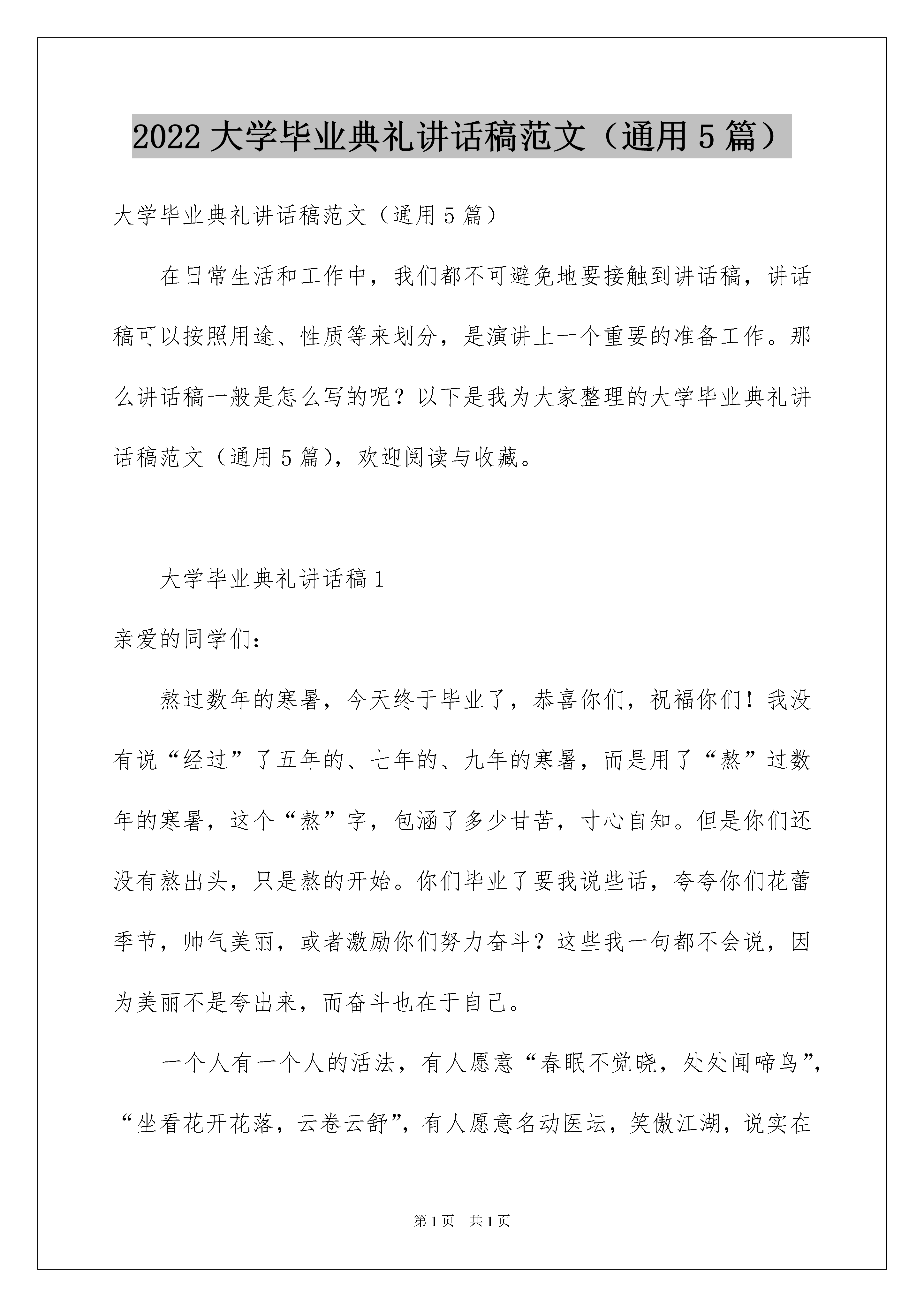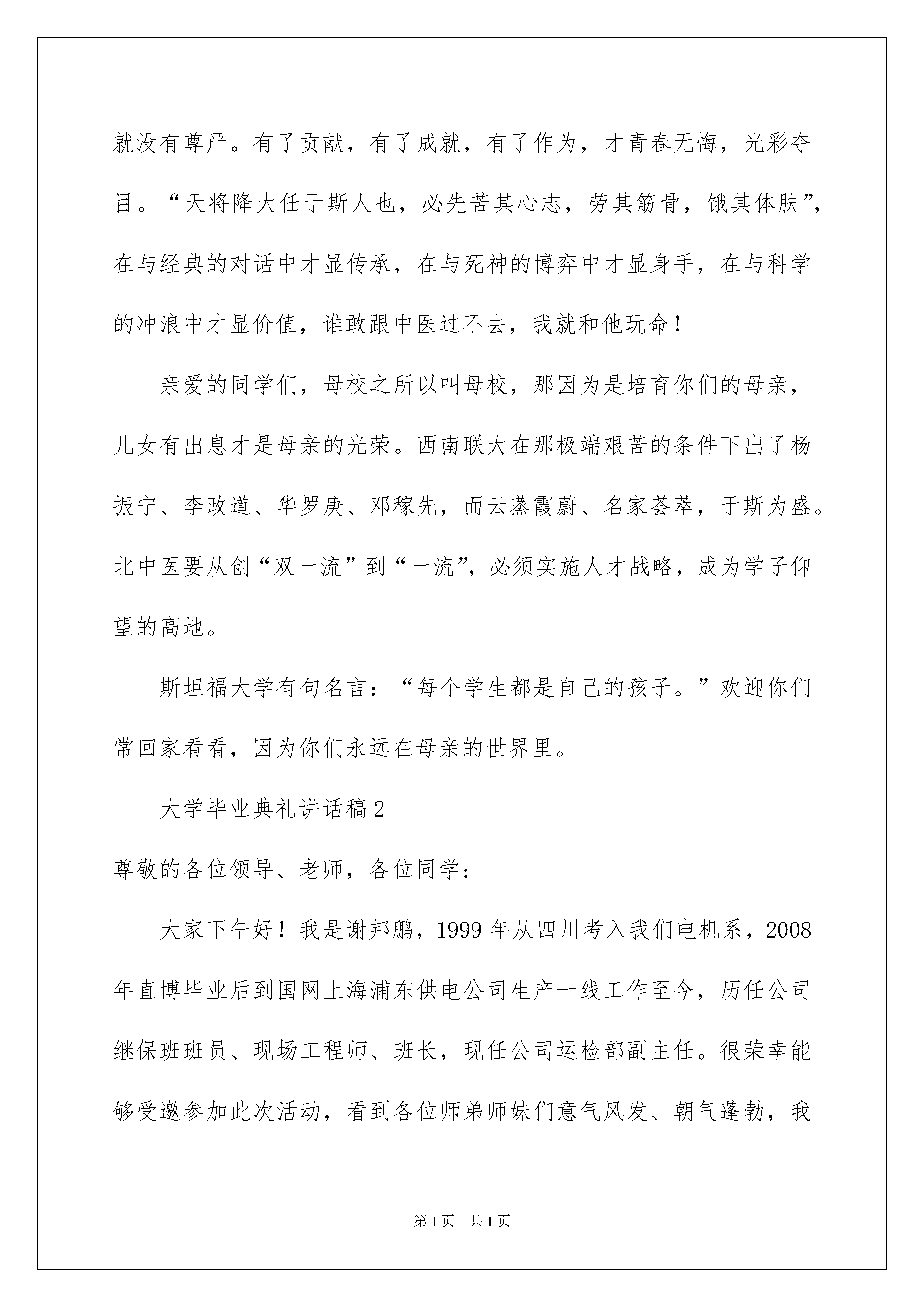 2022大学毕业典礼讲话稿范文(通用5篇)大学毕业典礼讲话稿范文(通用5篇)在日常生活和工作中,我们都不可避免地要接触到讲话稿,讲话稿可以按照用途、性质等来划分,是演讲上一个重要的准备工作。那么讲话稿一般是怎么写的呢?以下是我为大家整理的大学毕业典礼讲话稿范文(通用5篇),欢迎阅读与收藏。大学毕业典礼讲话稿1亲爱的同学们:熬过数年的寒暑,今天终于毕业了,恭喜你们,祝福你们!我没有说“经过”了五年的、七年的、九年的寒暑,而是用了“熬”过数年的寒暑,这个“熬”字,包涵了多少甘苦,寸心自知。但是你们还没有熬出头,只是熬的开始。你们毕业了要我说些话,夸夸你们花蕾季节,帅气美丽,或者激励你们努力奋斗?这些我一句都不会说,因为美丽不是夸出来,而奋斗也在于自己。一个人有一个人的活法,有人愿意“春眠不觉晓,处处闻啼鸟”,“坐看花开花落,云卷云舒”,有人愿意名动医坛,笑傲江湖,说实在的,谁也管不着谁,因为是自己掌握着命运之舟。中药讲四气五味,升降浮沉,人生亦如是。若干年后,该升的升,该降的降;该浮的浮,该沉的沉,优胜劣汰,那是大自然的法则,生物进化论。人生是有信仰的,没有信仰的人生是苍白的;人生是有追求的,没有追求的人生是颓废的;人生是有情怀的,没有情怀的人生是灰暗的。其实,怎么个活法,是与为谁而活联系在一起的。为自己活,爱怎么活就怎么活。为国家活,就要中国不被人卡脖子,像东风导弹女神祝学军那样研制高超音速导弹,让对方无法拦截;为民族活,就要像袁隆平那样,用杂交水稻养活14亿人口;为中医活,就要像屠呦呦那样,挽救无数人的生命,为全世界送上中医药的厚礼。清夜扪心自问,我们的眷念是什么?我们的初心是什么?今天,中医药迎来了最好的发展时机,但是有人压,有人黑,谁来补短板,强弱项,激活力?我们不要总是在回顾历史,谁来书写历史,谁来改写历史,让她重回中西医并重的地位,让她重回世界医学之巅?没有贡献,就没有自信;没有成就,就没有话语权;没有作为,就没有尊严。有了贡献,有了成就,有了作为,才青春无悔,光彩夺目。“天将降大任于斯人也,必先苦其心志,劳其筋骨,饿其体肤”,在与经典的对话中才显传承,在与死神的博弈中才显身手,在与科学的冲浪中才显价值,谁敢跟中医过不去,我就和他玩命!亲爱的同学们,母校之所以叫母校,那因为是培育你们的母亲,儿女有出息才是母亲的光荣。西南联大在那极端艰苦的条件下出了杨振宁、李政道、华罗庚、邓稼先,而云蒸霞蔚、名家荟萃,于斯为盛。北中医要从创“双一流”到“一流”,必须实施人才战略,成为学子仰望的高地。斯坦福大学有句名言:“每个学生都是自己的孩子。”欢迎你们常回家看看,因为你们永远在母亲的世界里。大学毕业典礼讲话稿2尊敬的各位领导、老师,各位同学:大家下午好!我是谢邦鹏,1999年从四川考入我们电机系,2008年直博毕业后到国网上海浦东供电公司生产一线工作至今,历任公司继保班班员、现场工程师、班长,现任公司运检部副主任。很荣幸能够受邀参加此次活动,看到各位师弟师妹们意气风发、朝气蓬勃,我的心情也非常激动。岁月如梭,转眼间我在电力生产一线也已工作十年,下面就结合我的工作经历,跟大家分享一些我的工作感悟。一是要坚定信念,坚守初心。清华人,都是有梦想、有追求的,我们渴望能够在工作中实现自己的人生价值。记得小学时老师曾问我长大后想要做什么,我的回答是做“工程师”,清华九年电气专业的学习,更是让我立志于成为我国电力生产的专家和电力技术应用的先行官。博士毕业后,我毅然选择了进入国家电网公司。刚进单位的头两年是最困难的。生活上,孤身一人在上海,实习期收入很低,房租就占掉近一半;工作上的打击是最大的,不但工作中搭不上手,甚至根本不知道师傅在讲啥,因为我是四川人,根本听不懂上海话。记得2009年教师节,我在出租屋里给梅生伟老师打电话问候时,梅老师问我过得怎么样,我说“过得挺好的”,其实眼泪都差点掉下来……支撑我坚持下来的,就是清华人自强不息的信念,就是我一直的追求和梦想。二是要精益求精,传承匠心。产业工人队伍从来不缺匠人,像我们单位有一位邱永椿师傅,80岁了,还一笔一笔的工工整整的写了90万字的电气试验教材手稿,严谨精细的精神着实让人震撼与佩服。清华人也从来不缺匠心,记得曾嵘老师就曾经在给我们上课时说过:“清华人,扫地也要扫得最干净”。所以刚到一线,工作中碰到困难时,我也对我自己说:要做就要做最好的一线工人!到班组前三年,我是班组里拧螺丝、接线头、看图纸、做笔记最多的人,加班更是常事。精益求精的做好身边的每一件小事,完成班组派给我的每一项任务,让我很快得到了同事们的认可,技术技能也有了质的飞跃,我还被评