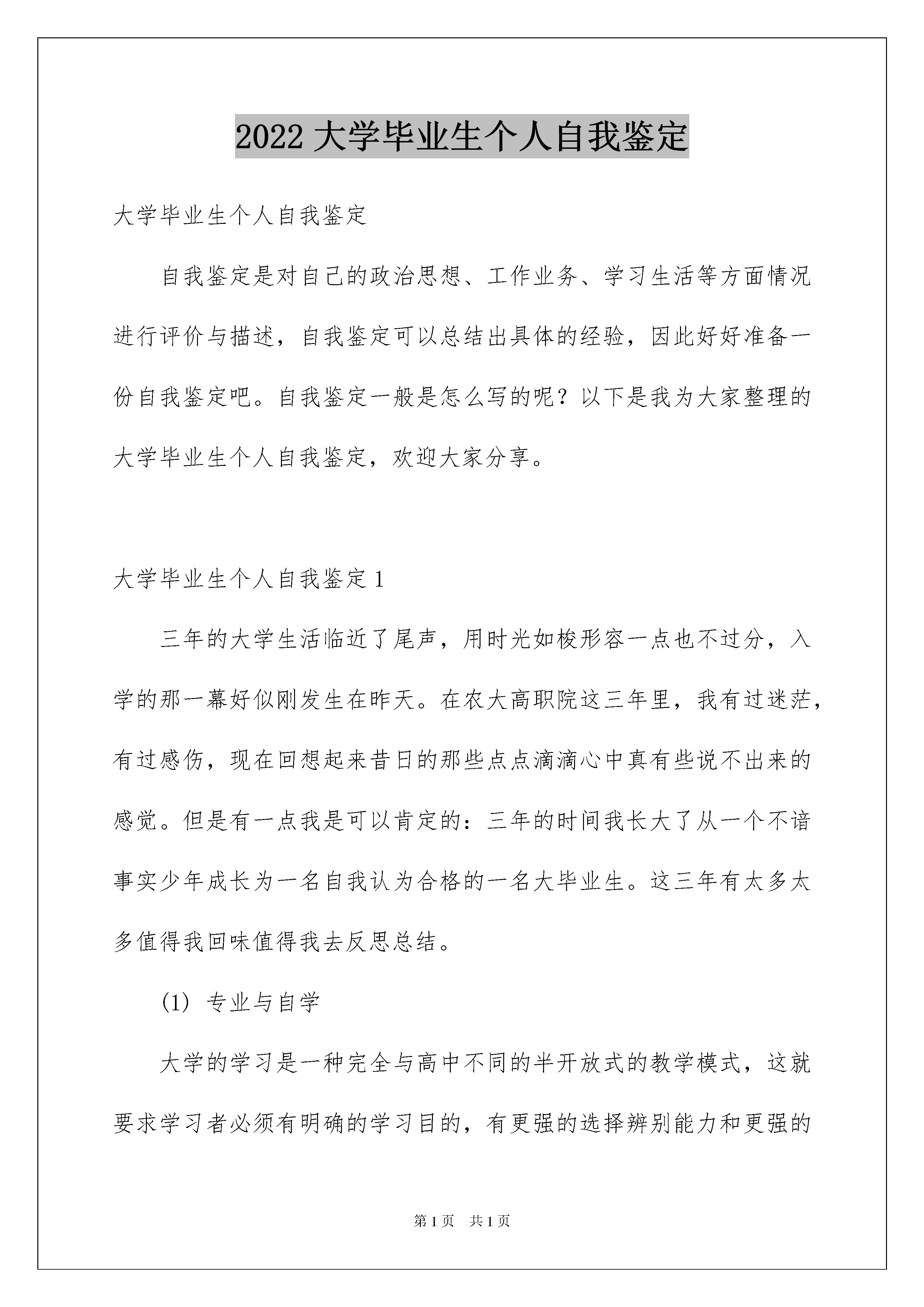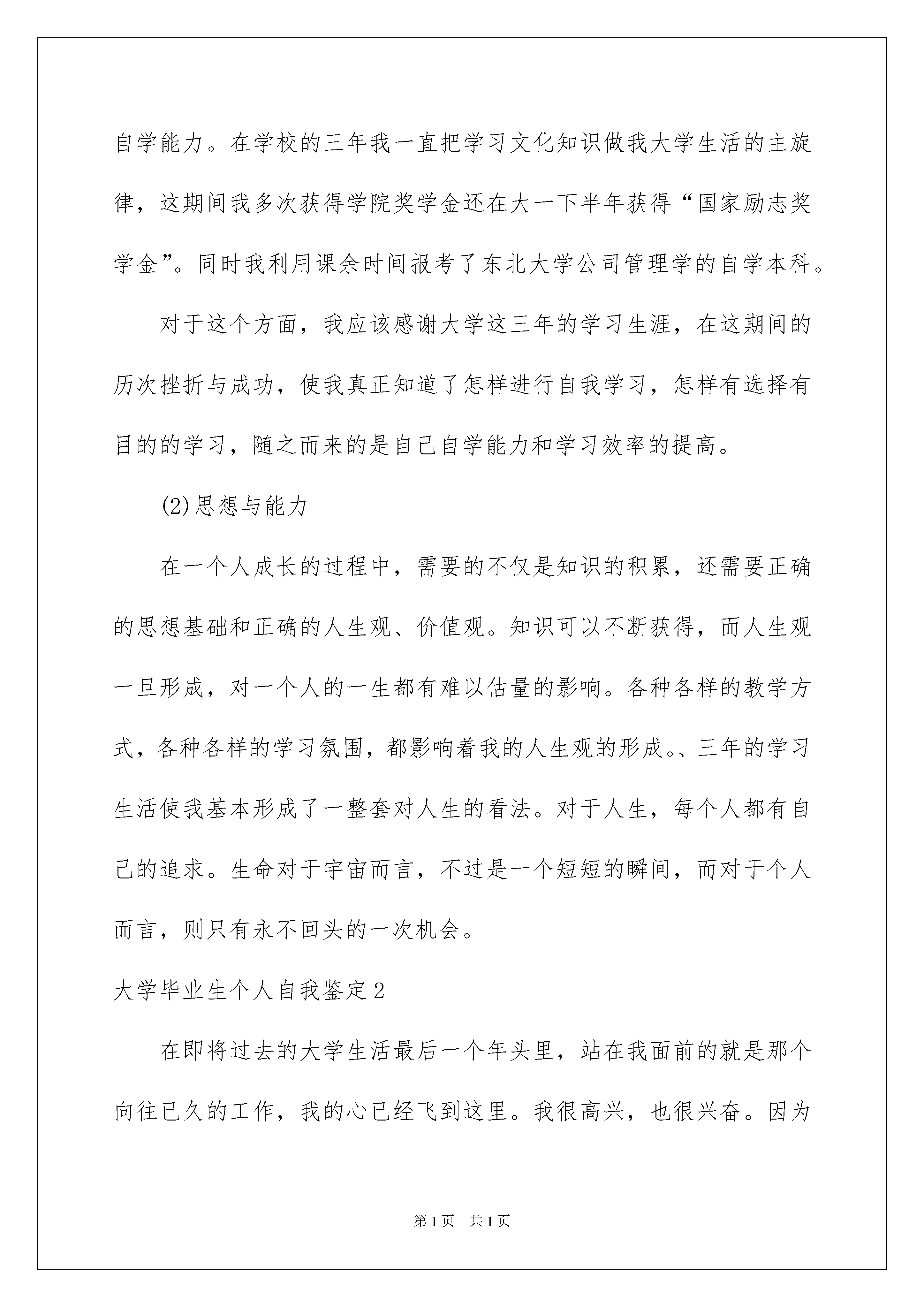 2022大学毕业生个人自我鉴定大学毕业生个人自我鉴定自我鉴定是对自己的政治思想、工作业务、学习生活等方面情况进行评价与描述,自我鉴定可以总结出具体的经验,因此好好准备一份自我鉴定吧。自我鉴定一般是怎么写的呢?以下是我为大家整理的大学毕业生个人自我鉴定,欢迎大家分享。大学毕业生个人自我鉴定1三年的大学生活临近了尾声,用时光如梭形容一点也不过分,入学的那一幕好似刚发生在昨天。在农大高职院这三年里,我有过迷茫,有过感伤,现在回想起来昔日的那些点点滴滴心中真有些说不出来的感觉。但是有一点我是可以肯定的:三年的时间我长大了从一个不谙事实少年成长为一名自我认为合格的一名大毕业生。这三年有太多太多值得我回味值得我去反思总结。(1)专业与自学大学的学习是一种完全与高中不同的半开放式的教学模式,这就要求学习者必须有明确的学习目的,有更强的选择辨别能力和更强的自学能力。在学校的三年我一直把学习文化知识做我大学生活的主旋律,这期间我多次获得学院奖学金还在大一下半年获得“国家励志奖学金”。同时我利用课余时间报考了东北大学公司管理学的自学本科。对于这个方面,我应该感谢大学这三年的学习生涯,在这期间的历次挫折与成功,使我真正知道了怎样进行自我学习,怎样有选择有目的的学习,随之而来的是自己自学能力和学习效率的提高。(2)思想与能力在一个人成长的过程中,需要的不仅是知识的积累,还需要正确的思想基础和正确的人生观、价值观。知识可以不断获得,而人生观一旦形成,对一个人的一生都有难以估量的影响。各种各样的教学方式,各种各样的学习氛围,都影响着我的人生观的形成。、三年的学习生活使我基本形成了一整套对人生的看法。对于人生,每个人都有自己的追求。生命对于宇宙而言,不过是一个短短的瞬间,而对于个人而言,则只有永不回头的一次机会。大学毕业生个人自我鉴定2在即将过去的大学生活最后一个年头里,站在我面前的就是那个向往已久的工作,我的心已经飞到这里。我很高兴,也很兴奋。因为我终于可以在这个巨大的舞台上展现自我。时间过得真的很快,不知不觉我已经来到深圳有一个月了。在校园里生活了数十载,而社会与校园是不同的两个世界,也许我们不能完全立刻适应这激烈竞争的社会。但我们要学会逐步适应这个社会。我想我这一个月的时间算是我一个即将从大学毕业的学生过渡到工作岗位并迈向社会的第一步。三月十四日式我实习正式开始的第一天。刚到**公司一切对于我来说都是新鲜和陌生的,渴望着认识,了解和汲取我所欠缺的东西。集团老总考虑到我的专业和特长,把我调到了公司的财务部去做。我开始公司财务部的工作是从一份报告开始的,虽然何总出了一个简单的题目,但是我还是做得不好。之后王总通过这一份报告向我灌输着如何做好财务人员的一些最基本的东西,以及我在实习期间要努力的方向。之后的几份报告虽然也是做的不好,但是在王总的指导下还是一次比一次做的好一点了。在这段期间,王总像老师指导学生一样的去指导我有些东西要如何去做,但他不会像小学时候老师教小学生一样去一笔一画的写字。而是总会告诉我一个方向,剩下的东西还是要靠我自己走。他说如果什么都告诉我了,那对我的成长也是一种不利的影响。我也能理解王总的这一番话,所以还是努力的去尝试,虽然经常的还会犯一些小错误,但是我想只有这样才能更快的让一个人去适应并做好一些东西。接下来通过一些银行的人员谈到融资的问题是我真正的进入实战的融资体验的开始。首先,国内的银行大致分两类。一方面为国有商业银行,如中行、农行、工行、建行;另一方面是股份制商业银行,如招商银行、华夏银行,兴业银行等。一些银行在政策和制度上面会有一些差异,这就对公司而言,多渠道的得知一些信息,看哪家银行的政策或者制度更会对我公司融资层面给予更大的帮助。其中的如何选择问题是要考虑的。就一个对于公司增资计息的问题,之前找的中,农,工,建四家国有银行由于中行在这方面有限制,所以是不能做的。涉及公司变更营业执照的有关事宜,这几家银行对于增资款项的储蓄是没有利息的,而对于兴业银行来说是能做这个业务的。虽然只是很短的时间,但是就考虑到增资的金额来说,也是一笔不小的金额。如果没有考虑到这个层面的问题,那么这笔钱也就是不存在的。所以对外联系还是要保持信息渠道的多样性和广泛性。其次,对于银行的一些专业术语,以及银行对信贷的控制流程是要掌握的,因为每次和银行的人员去打交道的时候,银行的人员都会和我们讲一些银行的专业层面的术语,很多一部分都是我在学校的时候学习过,但是没有实际掌握并灵活运用。如果能熟练的掌握并灵活的运用,就能使我们在商谈中更加游刃有余,就能使我们站在比对方更高的层面去看清这些事情,也就更能在融资