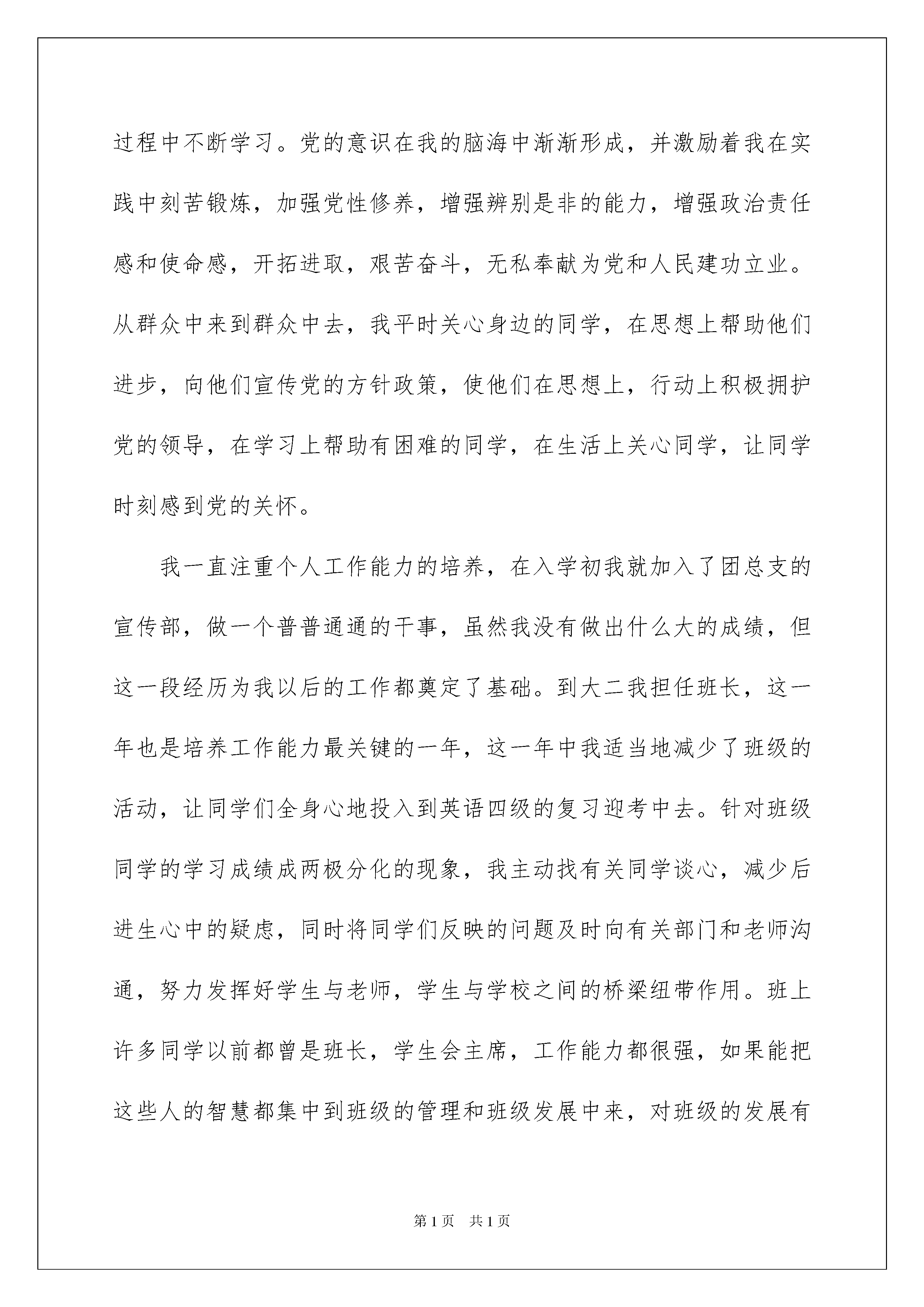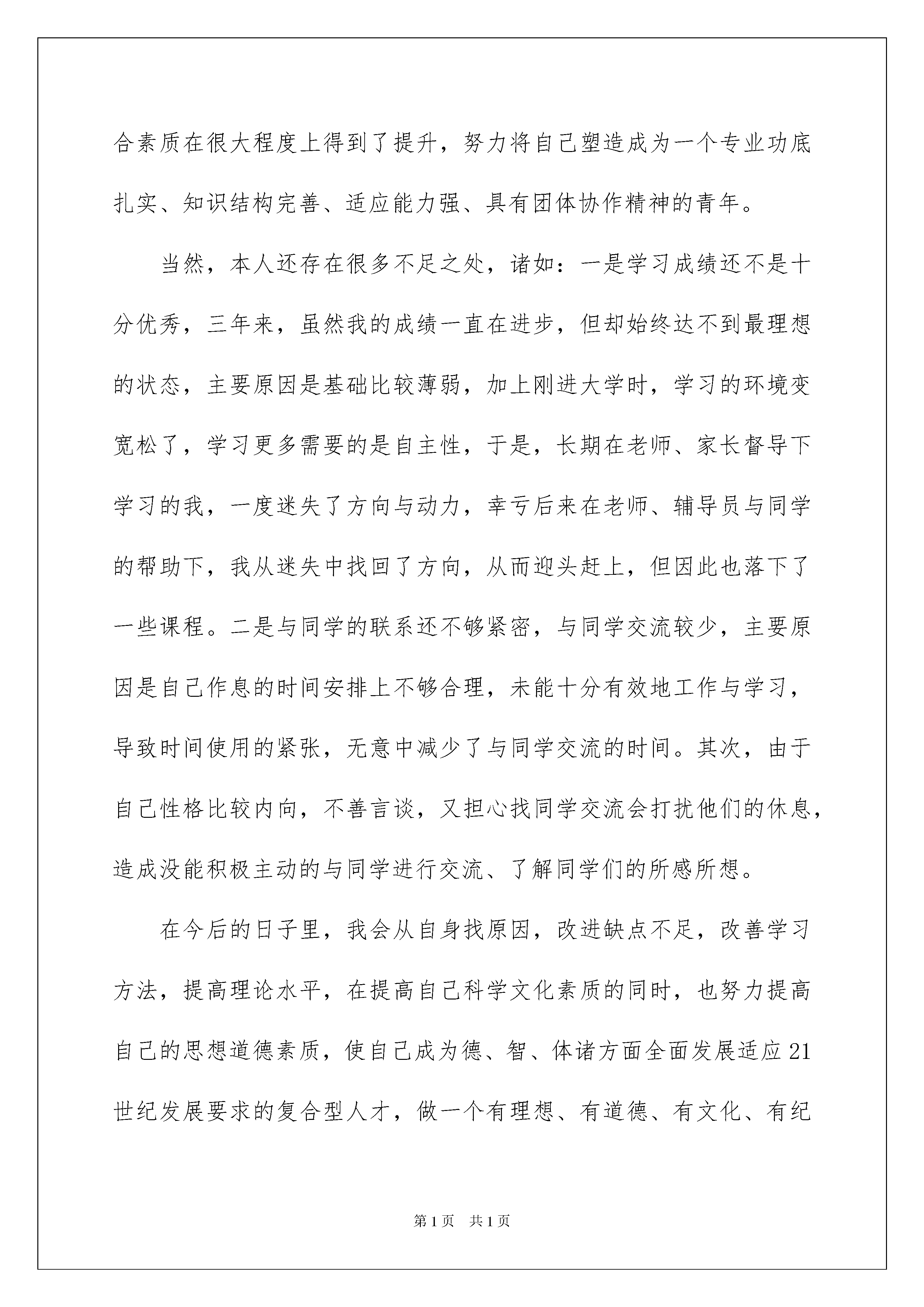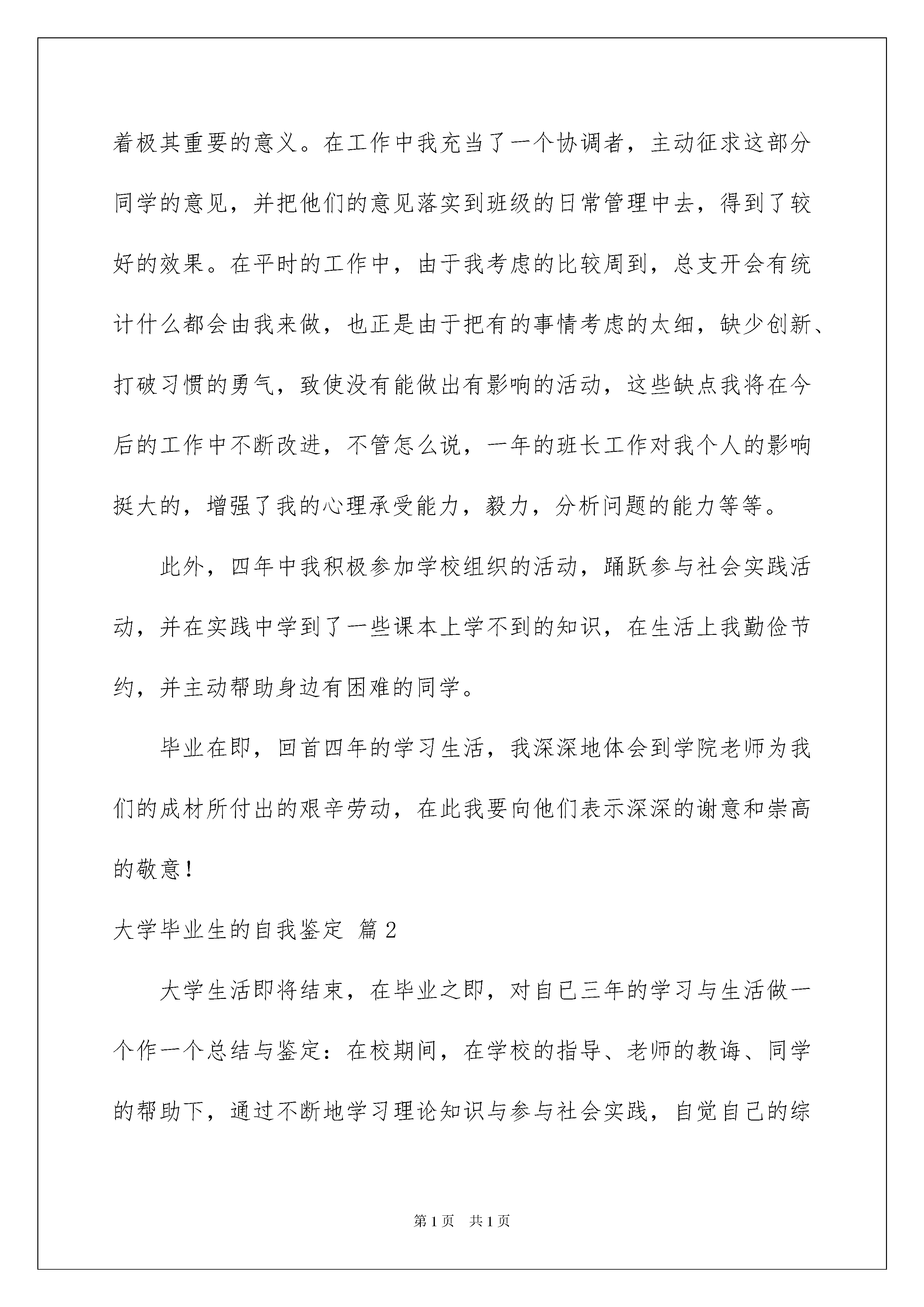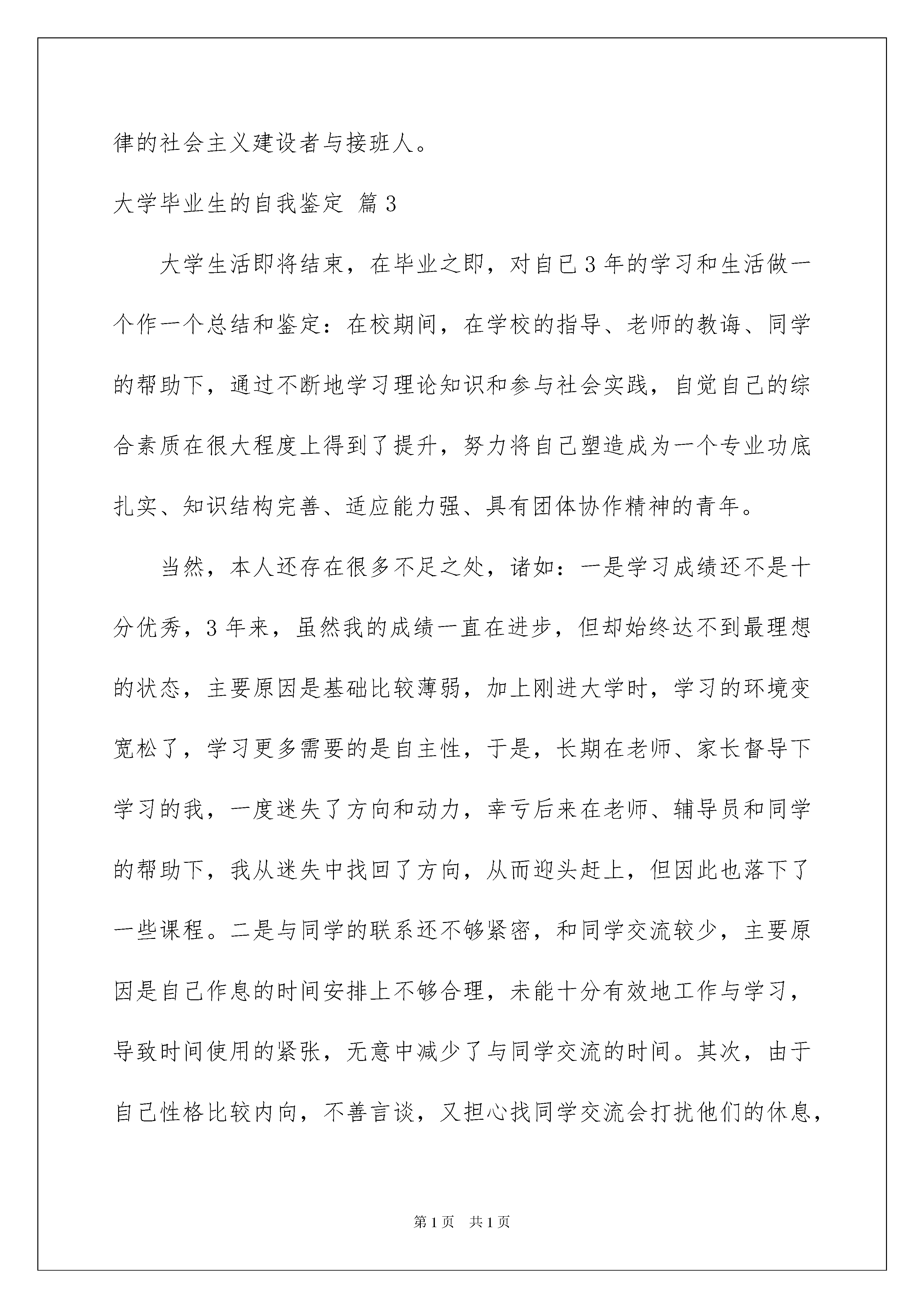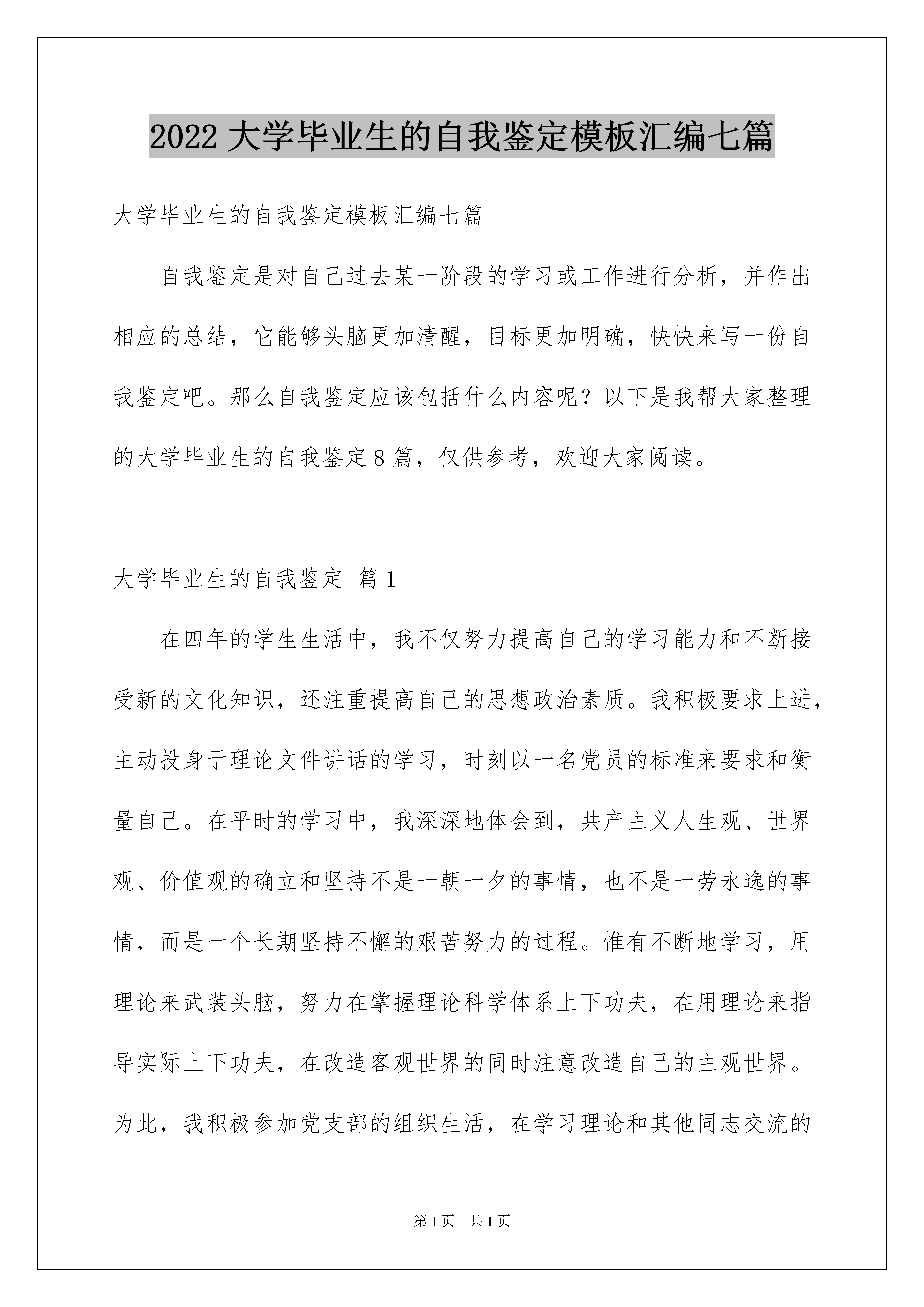 2022大学毕业生的自我鉴定模板汇编七篇大学毕业生的自我鉴定模板汇编七篇自我鉴定是对自己过去某一阶段的学习或工作进行分析,并作出相应的总结,它能够头脑更加清醒,目标更加明确,快快来写一份自我鉴定吧。那么自我鉴定应该包括什么内容呢?以下是我帮大家整理的大学毕业生的自我鉴定8篇,仅供参考,欢迎大家阅读。大学毕业生的自我鉴定篇1在四年的学生生活中,我不仅努力提高自己的学习能力和不断接受新的文化知识,还注重提高自己的思想政治素质。我积极要求上进,主动投身于理论文件讲话的学习,时刻以一名党员的标准来要求和衡量自己。在平时的学习中,我深深地体会到,共产主义人生观、世界观、价值观的确立和坚持不是一朝一夕的事情,也不是一劳永逸的事情,而是一个长期坚持不懈的艰苦努力的过程。惟有不断地学习,用理论来武装头脑,努力在掌握理论科学体系上下功夫,在用理论来指导实际上下功夫,在改造客观世界的同时注意改造自己的主观世界。为此,我积极参加党支部的组织生活,在学习理论和其他同志交流的过程中不断学习。党的意识在我的脑海中渐渐形成,并激励着我在实践中刻苦锻炼,加强党性修养,增强辨别是非的能力,增强政治责任感和使命感,开拓进取,艰苦奋斗,无私奉献为党和人民建功立业。从群众中来到群众中去,我平时关心身边的同学,在思想上帮助他们进步,向他们宣传党的方针政策,使他们在思想上,行动上积极拥护党的领导,在学习上帮助有困难的同学,在生活上关心同学,让同学时刻感到党的关怀。我一直注重个人工作能力的培养,在入学初我就加入了团总支的宣传部,做一个普普通通的干事,虽然我没有做出什么大的成绩,但这一段经历为我以后的工作都奠定了基础。到大二我担任班长,这一年也是培养工作能力最关键的一年,这一年中我适当地减少了班级的活动,让同学们全身心地投入到英语四级的复习迎考中去。针对班级同学的学习成绩成两极分化的现象,我主动找有关同学谈心,减少后进生心中的疑虑,同时将同学们反映的问题及时向有关部门和老师沟通,努力发挥好学生与老师,学生与学校之间的桥梁纽带作用。班上许多同学以前都曾是班长,学生会主席,工作能力都很强,如果能把这些人的智慧都集中到班级的管理和班级发展中来,对班级的发展有着极其重要的意义。在工作中我充当了一个协调者,主动征求这部分同学的意见,并把他们的意见落实到班级的日常管理中去,得到了较好的效果。在平时的工作中,由于我考虑的比较周到,总支开会有统计什么都会由我来做,也正是由于把有的事情考虑的太细,缺少创新、打破习惯的勇气,致使没有能做出有影响的活动,这些缺点我将在今后的工作中不断改进,不管怎么说,一年的班长工作对我个人的影响挺大的,增强了我的心理承受能力,毅力,分析问题的能力等等。此外,四年中我积极参加学校组织的活动,踊跃参与社会实践活动,并在实践中学到了一些课本上学不到的知识,在生活上我勤俭节约,并主动帮助身边有困难的同学。毕业在即,回首四年的学习生活,我深深地体会到学院老师为我们的成材所付出的艰辛劳动,在此我要向他们表示深深的谢意和崇高的敬意!大学毕业生的自我鉴定篇2大学生活即将结束,在毕业之即,对自已三年的学习与生活做一个作一个总结与鉴定:在校期间,在学校的指导、老师的教诲、同学的帮助下,通过不断地学习理论知识与参与社会实践,自觉自己的综合素质在很大程度上得到了提升,努力将自己塑造成为一个专业功底扎实、知识结构完善、适应能力强、具有团体协作精神的青年。当然,本人还存在很多不足之处,诸如:一是学习成绩还不是十分优秀,三年来,虽然我的成绩一直在进步,但却始终达不到最理想的状态,主要原因是基础比较薄弱,加上刚进大学时,学习的环境变宽松了,学习更多需要的是自主性,于是,长期在老师、家长督导下学习的我,一度迷失了方向与动力,幸亏后来在老师、辅导员与同学的帮助下,我从迷失中找回了方向,从而迎头赶上,但因此也落下了一些课程。二是与同学的联系还不够紧密,与同学交流较少,主要原因是自己作息的时间安排上不够合理,未能十分有效地工作与学习,导致时间使用的紧张,无意中减少了与同学交流的时间。其次,由于自己性格比较内向,不善言谈,又担心找同学交流会打扰他们的休息,造成没能积极主动的与同学进行交流、了解同学们的所感所想。在今后的日子里,我会从自身找原因,改进缺点不足,改善学习方法,提高理论水平,在提高自己科学文化素质的同时,也努力提高自己的思想道德素质,使自己成为德、智、体诸方面全面发展适应21世纪发展要求的复合型人才,做一个有理想、有道德、有文化、有纪律的社会主义建设者与接班人。大学毕业生的自我鉴定篇3大学生活即将结束,在毕业之即,对自已3年的学习和生活做