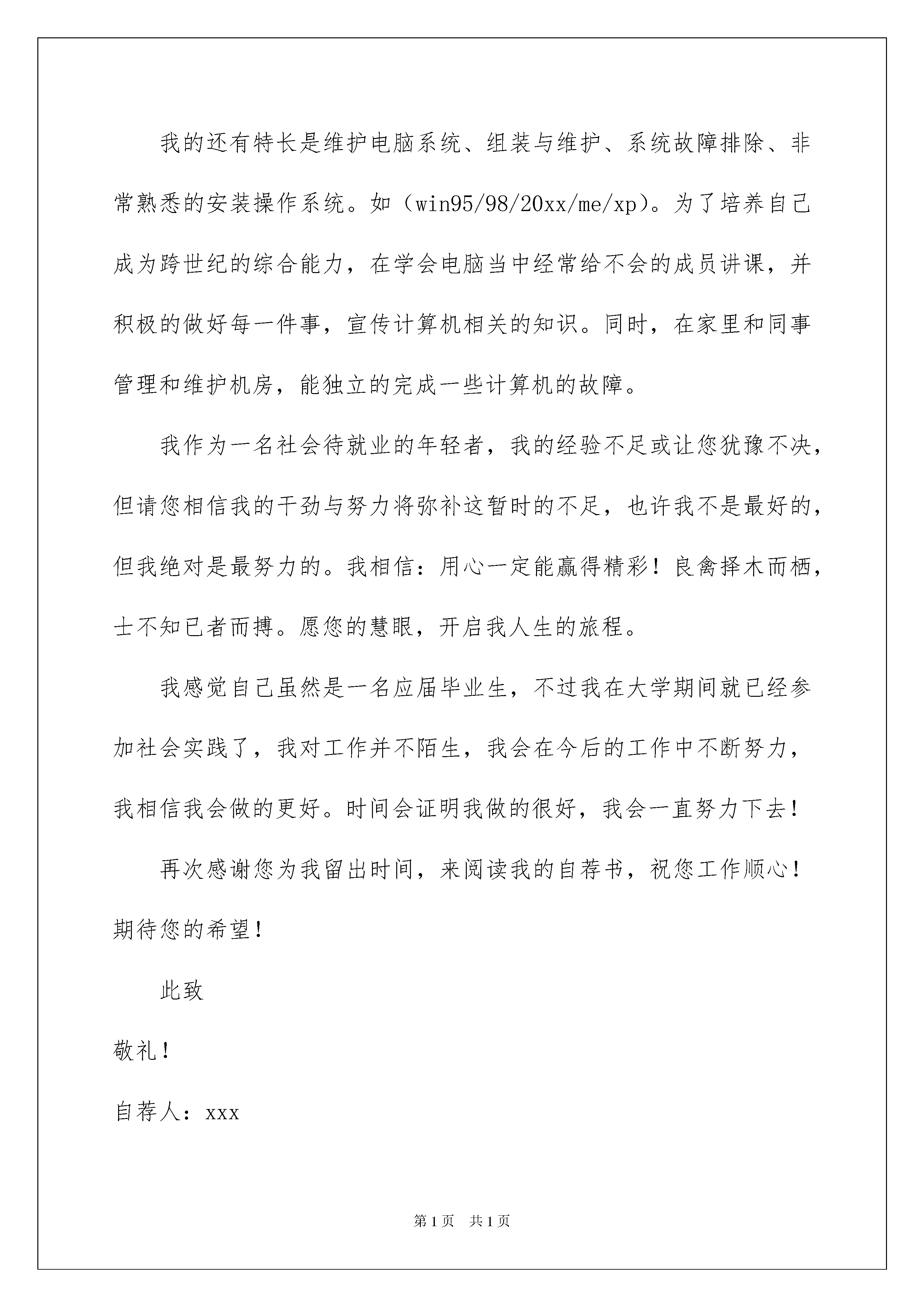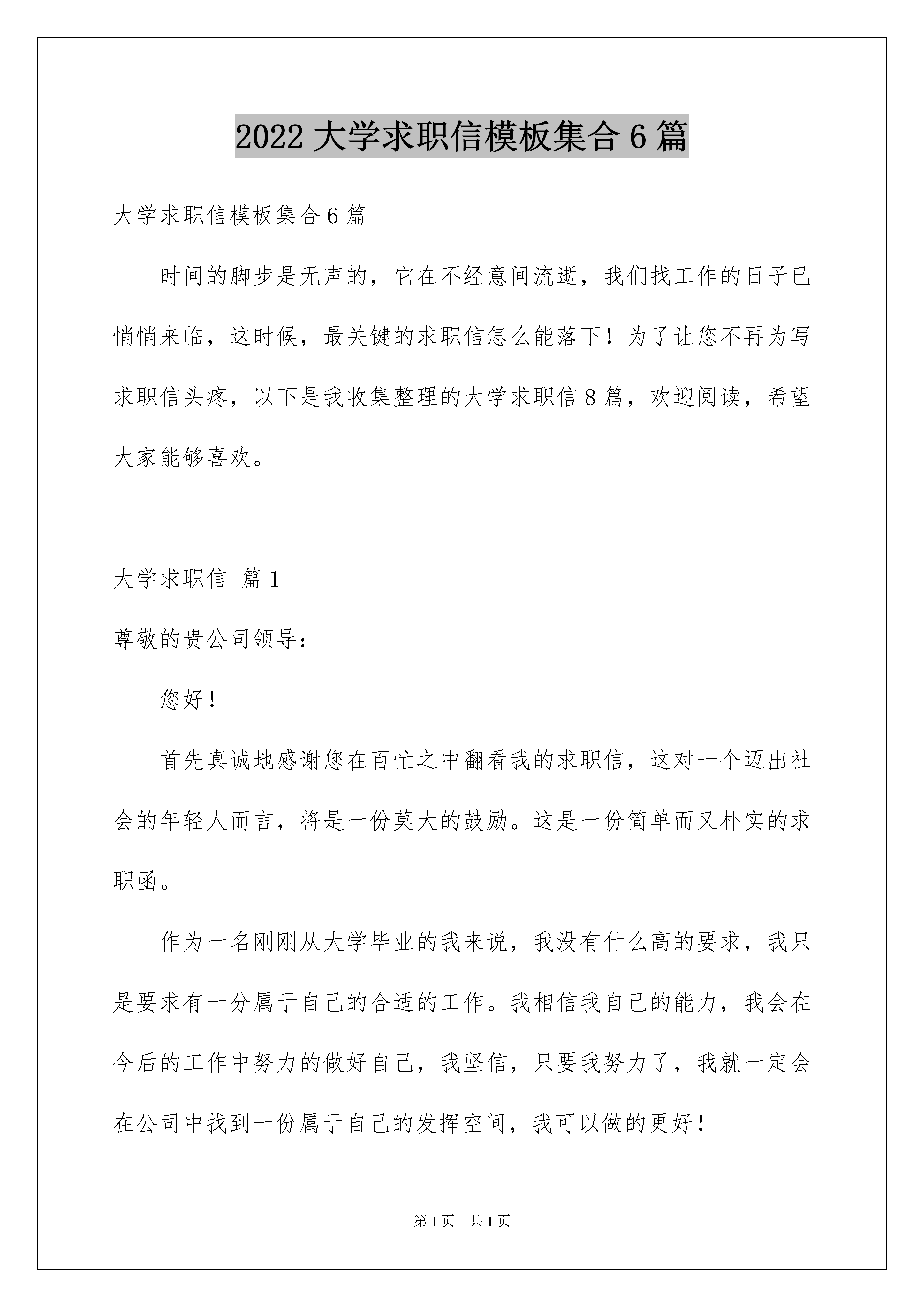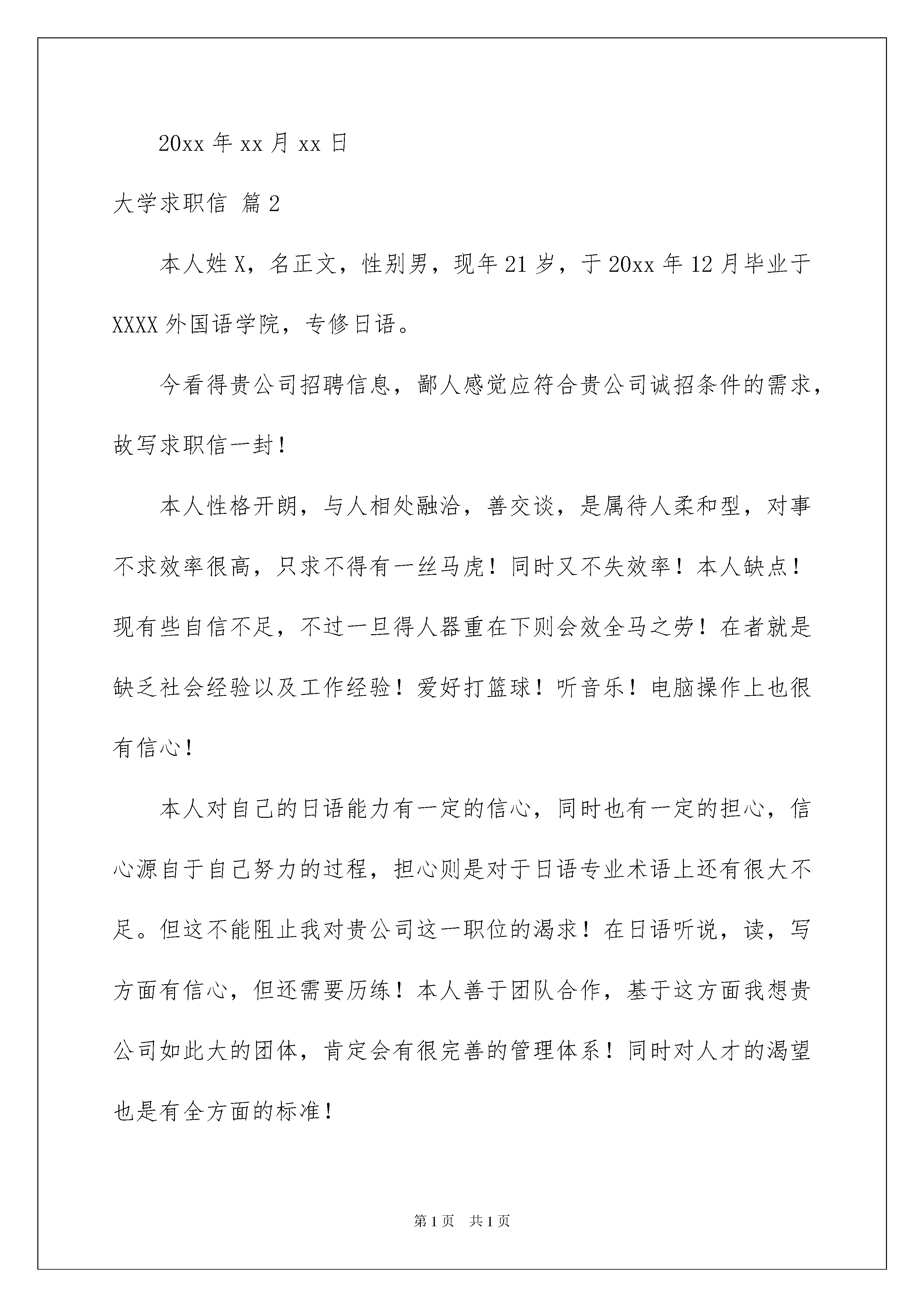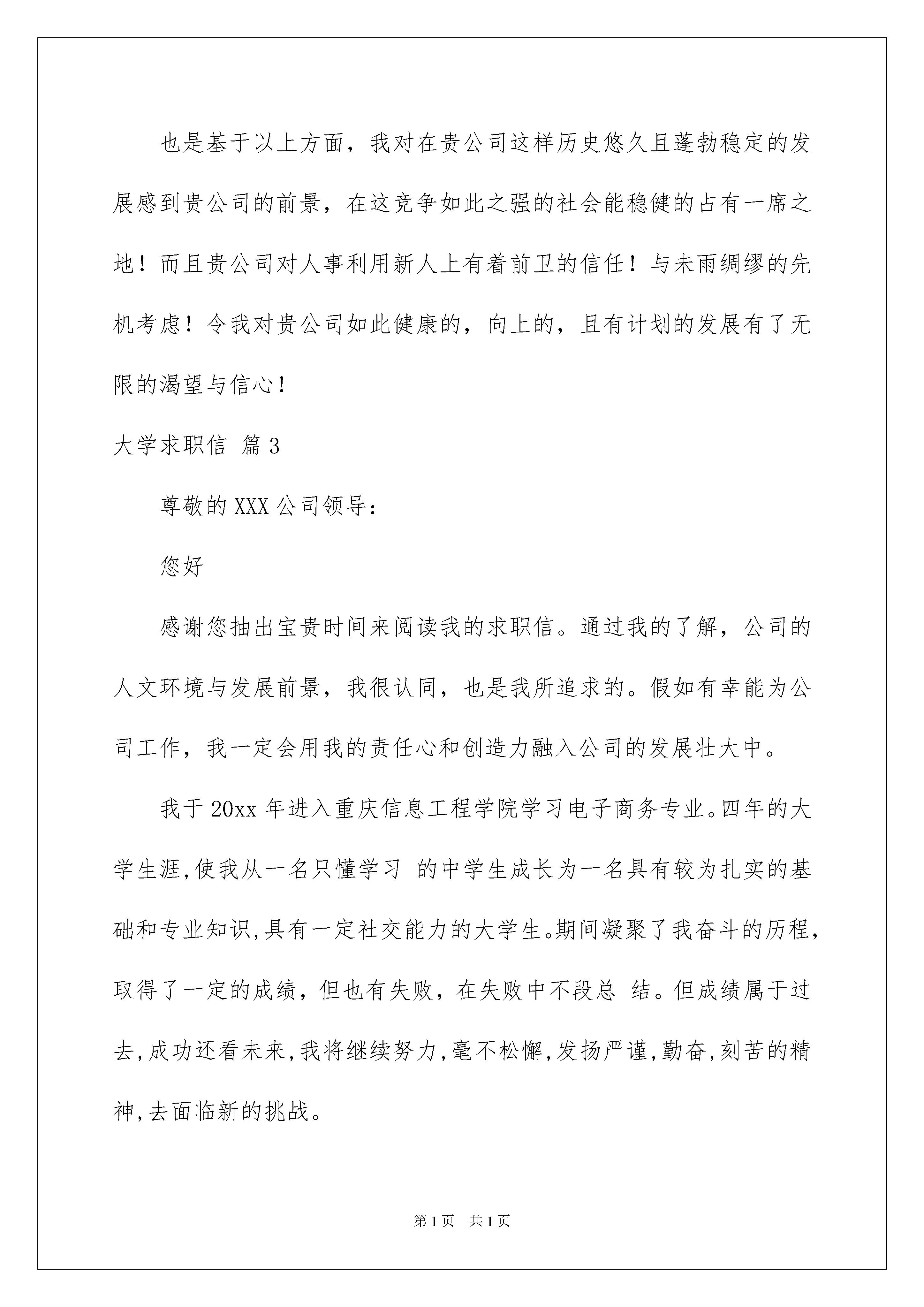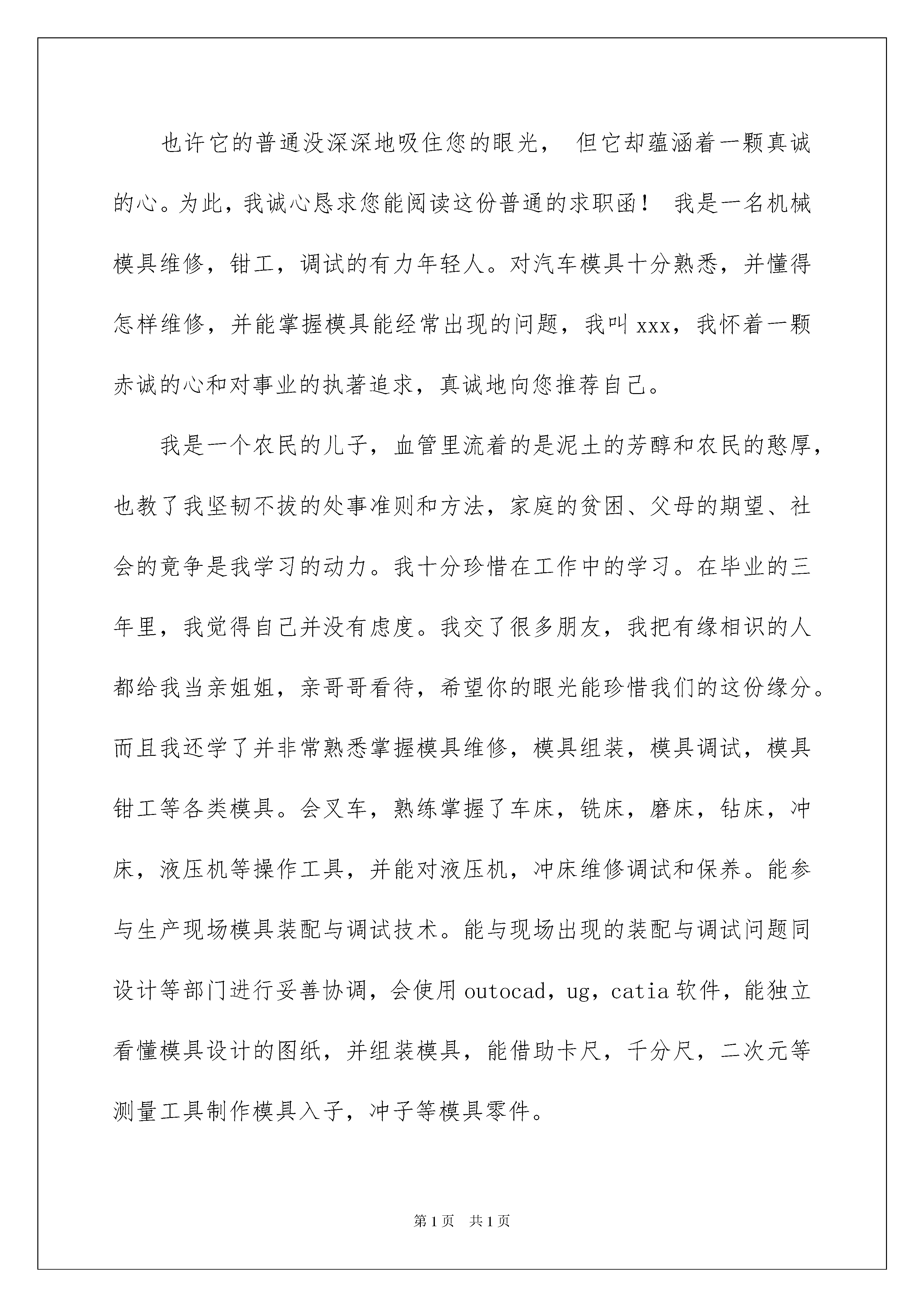 2022大学求职信模板集合6篇大学求职信模板集合6篇时间的脚步是无声的,它在不经意间流逝,我们找工作的日子已悄悄来临,这时候,最关键的求职信怎么能落下!为了让您不再为写求职信头疼,以下是我收集整理的大学求职信8篇,欢迎阅读,希望大家能够喜欢。大学求职信篇1尊敬的贵公司领导:您好!首先真诚地感谢您在百忙之中翻看我的求职信,这对一个迈出社会的年轻人而言,将是一份莫大的鼓励。这是一份简单而又朴实的求职函。作为一名刚刚从大学毕业的我来说,我没有什么高的要求,我只是要求有一分属于自己的合适的工作。我相信我自己的能力,我会在今后的工作中努力的做好自己,我坚信,只要我努力了,我就一定会在公司中找到一份属于自己的发挥空间,我可以做的更好!也许它的普通没深深地吸住您的眼光,但它却蕴涵着一颗真诚的心。为此,我诚心恳求您能阅读这份普通的求职函!我是一名机械模具维修,钳工,调试的有力年轻人。对汽车模具十分熟悉,并懂得怎样维修,并能掌握模具能经常出现的问题,我叫xxx,我怀着一颗赤诚的心和对事业的执著追求,真诚地向您推荐自己。我是一个农民的儿子,血管里流着的是泥土的芳醇和农民的憨厚,也教了我坚韧不拔的处事准则和方法,家庭的贫困、父母的期望、社会的竟争是我学习的动力。我十分珍惜在工作中的学习。在毕业的三年里,我觉得自己并没有虑度。我交了很多朋友,我把有缘相识的人都给我当亲姐姐,亲哥哥看待,希望你的眼光能珍惜我们的这份缘分。而且我还学了并非常熟悉掌握模具维修,模具组装,模具调试,模具钳工等各类模具。会叉车,熟练掌握了车床,铣床,磨床,钻床,冲床,液压机等操作工具,并能对液压机,冲床维修调试和保养。能参与生产现场模具装配与调试技术。能与现场出现的装配与调试问题同设计等部门进行妥善协调,会使用outocad,ug,catia软件,能独立看懂模具设计的图纸,并组装模具,能借助卡尺,千分尺,二次元等测量工具制作模具入子,冲子等模具零件。我的还有特长是维护电脑系统、组装与维护、系统故障排除、非常熟悉的安装操作系统。如(win95/98/20xx/me/xp)。为了培养自己成为跨世纪的综合能力,在学会电脑当中经常给不会的成员讲课,并积极的做好每一件事,宣传计算机相关的知识。同时,在家里和同事管理和维护机房,能独立的完成一些计算机的故障。我作为一名社会待就业的年轻者,我的经验不足或让您犹豫不决,但请您相信我的干劲与努力将弥补这暂时的不足,也许我不是最好的,但我绝对是最努力的。我相信:用心一定能赢得精彩!良禽择木而栖,士不知已者而搏。愿您的慧眼,开启我人生的旅程。我感觉自己虽然是一名应届毕业生,不过我在大学期间就已经参加社会实践了,我对工作并不陌生,我会在今后的工作中不断努力,我相信我会做的更好。时间会证明我做的很好,我会一直努力下去!再次感谢您为我留出时间,来阅读我的自荐书,祝您工作顺心!期待您的希望!此致敬礼!自荐人:xxx20xx年xx月xx日大学求职信篇2本人姓X,名正文,性别男,现年21岁,于20xx年12月毕业于XXXX外国语学院,专修日语。今看得贵公司招聘信息,鄙人感觉应符合贵公司诚招条件的需求,故写求职信一封!本人性格开朗,与人相处融洽,善交谈,是属待人柔和型,对事不求效率很高,只求不得有一丝马虎!同时又不失效率!本人缺点!现有些自信不足,不过一旦得人器重在下则会效全马之劳!在者就是缺乏社会经验以及工作经验!爱好打篮球!听音乐!电脑操作上也很有信心!本人对自己的日语能力有一定的信心,同时也有一定的担心,信心源自于自己努力的过程,担心则是对于日语专业术语上还有很大不足。但这不能阻止我对贵公司这一职位的渴求!在日语听说,读,写方面有信心,但还需要历练!本人善于团队合作,基于这方面我想贵公司如此大的团体,肯定会有很完善的管理体系!同时对人才的渴望也是有全方面的标准!也是基于以上方面,我对在贵公司这样历史悠久且蓬勃稳定的发展感到贵公司的前景,在这竞争如此之强的社会能稳健的占有一席之地!而且贵公司对人事利用新人上有着前卫的信任!与未雨绸缪的先机考虑!令我对贵公司如此健康的,向上的,且有计划的发展有了无限的渴望与信心!大学求职信篇3尊敬的XXX公司领导:您好感谢您抽出宝贵时间来阅读我的求职信。通过我的了解,公司的人文环境与发展前景,我很认同,也是我所追求的。假如有幸能为公司工作,我一定会用我的责任心和创造力融入公司的发展壮大中。我于20xx年进入重庆信息工程学院学习电子商务专业。四年的大学生涯,使我从一名只懂学习的中学生成长为一名具有较为扎实的基础和专业知识,具有一定社交能力的大学生。期间凝聚了我奋斗的历程,取得