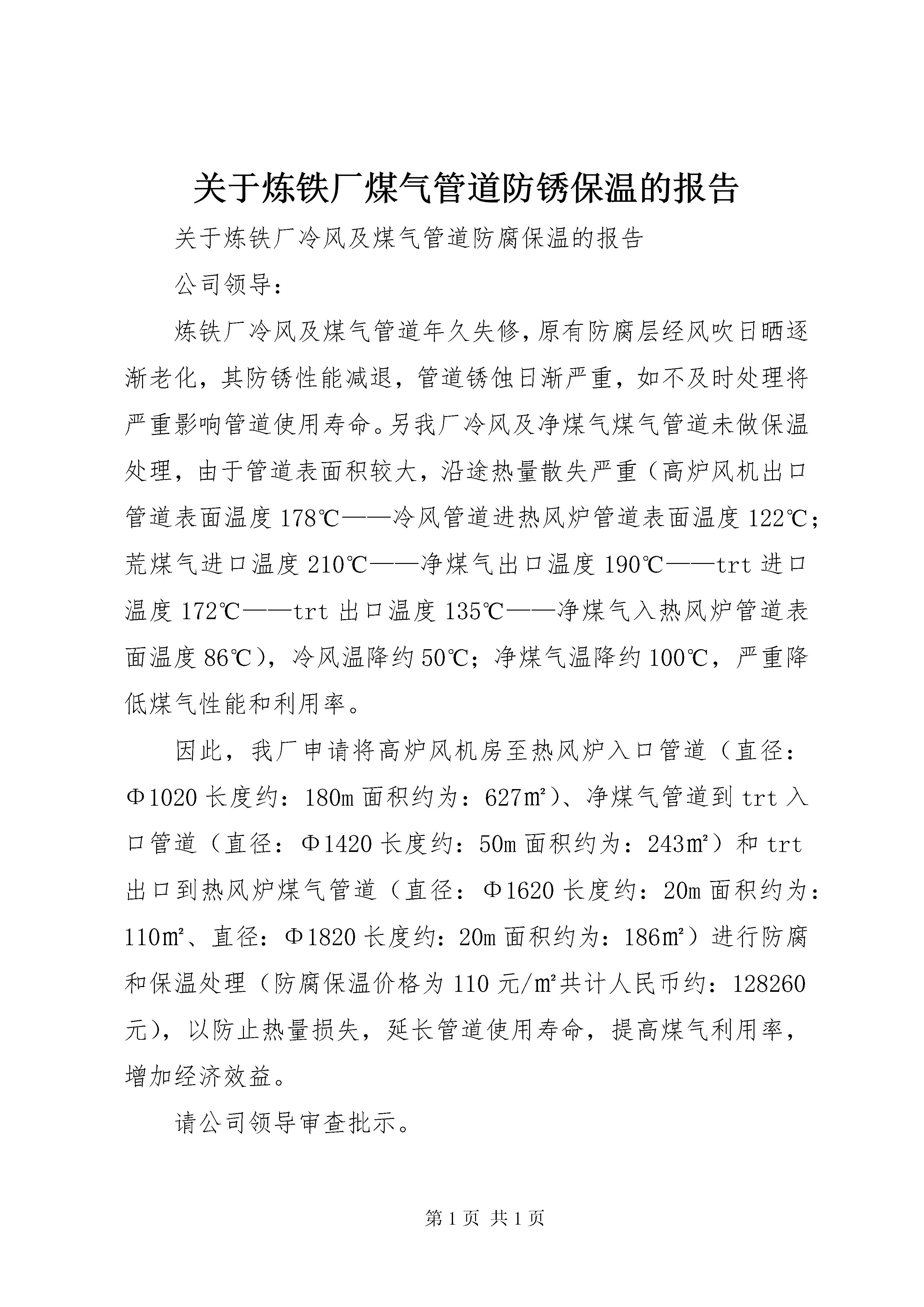 关于炼铁厂煤气管道防锈保温的报告关于炼铁厂冷风及煤气管道防腐保温的报告公司领导:炼铁厂冷风及煤气管道年久失修,原有防腐层经风吹日晒逐渐老化,其防锈性能减退,管道锈蚀日渐严重,如不及时处理将严重影响管道使用寿命。另我厂冷风及净煤气煤气管道未做保温处理,由于管道表面积较大,沿途热量散失严重(高炉风机出口管道表面温度178℃——冷风管道进热风炉管道表面温度122℃;荒煤气进口温度210℃——净煤气出口温度190℃——trt进口温度172℃——trt出口温度135℃——净煤气入热风炉管道表面温度86℃),冷风温降约50℃;净煤气温降约100℃,严重降低煤气性能和利用率。因此,我厂申请将高炉风机房至热风炉入口管道(直径:Φ1020长度约:180m面积约为:627㎡)、净煤气管道到trt入口管道(直径:Φ1420长度约:50m面积约为:243㎡)和trt出口到热风炉煤气管道(直径:Φ1620长度约:20m面积约为:110㎡、直径:Φ1820长度约:20m面积约为:186㎡)进行防腐和保温处理(防腐保温价格为110元/㎡共计人民币约:128260元),以防止热量损失,延长管道使用寿命,提高煤气利用率,增加经济效益。请公司领导审查批示。炼铁厂2013-3-31