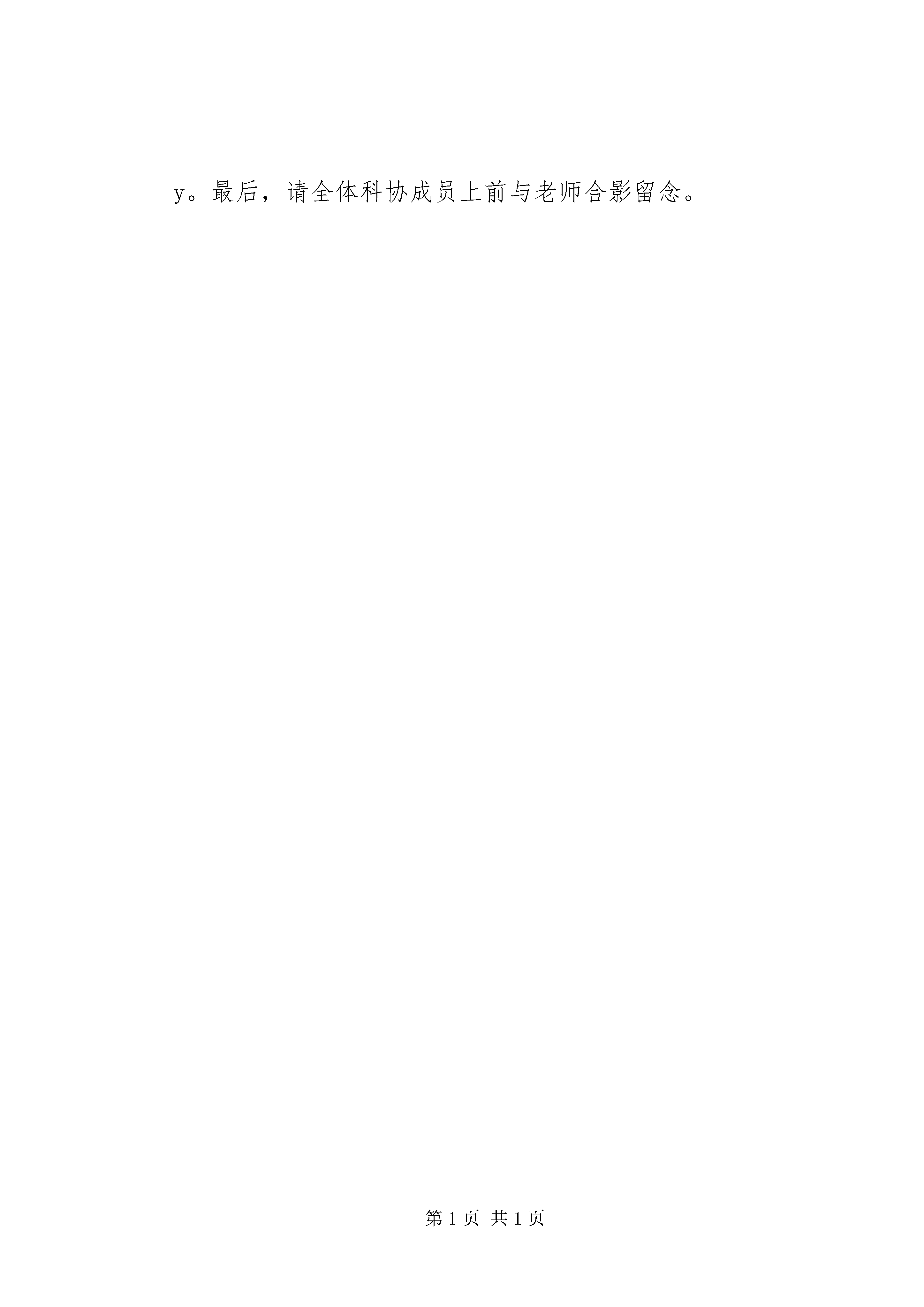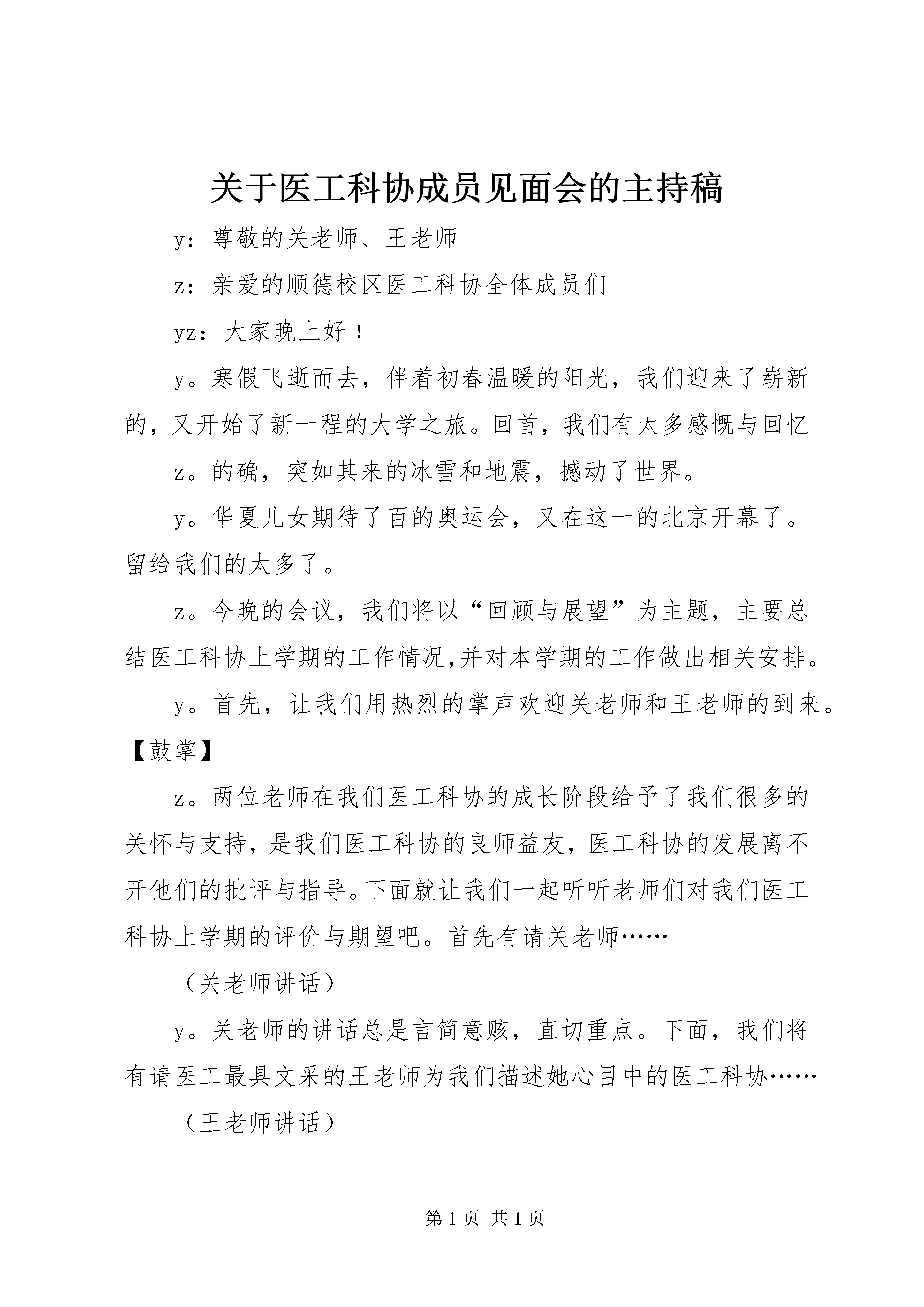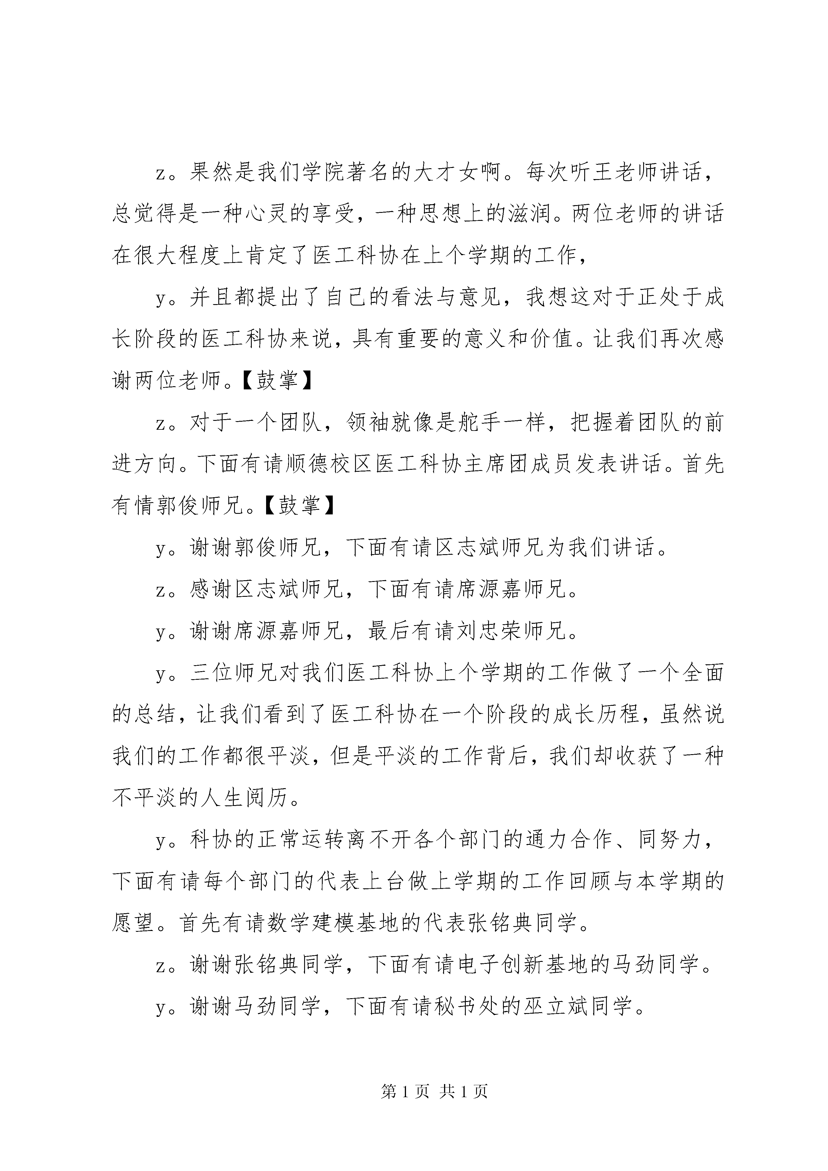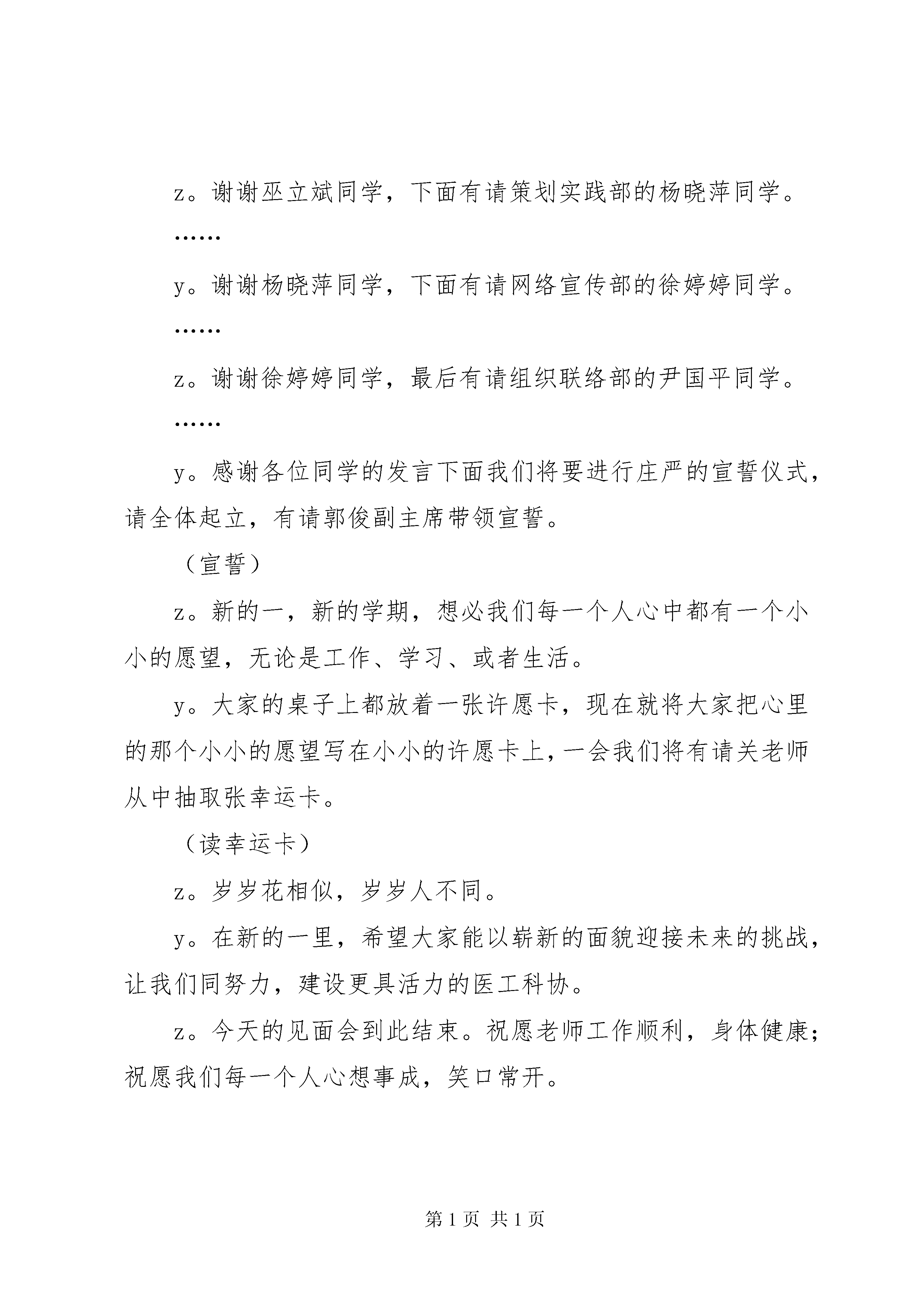 关于医工科协成员见面会的主持稿y:尊敬的关老师、王老师z:亲爱的顺德校区医工科协全体成员们yz:大家晚上好﹗y。寒假飞逝而去,伴着初春温暖的阳光,我们迎来了崭新的,又开始了新一程的大学之旅。回首,我们有太多感慨与回忆z。的确,突如其来的冰雪和地震,撼动了世界。y。华夏儿女期待了百的奥运会,又在这一的北京开幕了。留给我们的太多了。z。今晚的会议,我们将以“回顾与展望”为主题,主要总结医工科协上学期的工作情况,并对本学期的工作做出相关安排。y。首先,让我们用热烈的掌声欢迎关老师和王老师的到来。【鼓掌】z。两位老师在我们医工科协的成长阶段给予了我们很多的关怀与支持,是我们医工科协的良师益友,医工科协的发展离不开他们的批评与指导。下面就让我们一起听听老师们对我们医工科协上学期的评价与期望吧。首先有请关老师……(关老师讲话)y。关老师的讲话总是言简意赅,直切重点。下面,我们将有请医工最具文采的王老师为我们描述她心目中的医工科协……(王老师讲话)z。果然是我们学院著名的大才女啊。每次听王老师讲话,总觉得是一种心灵的享受,一种思想上的滋润。两位老师的讲话在很大程度上肯定了医工科协在上个学期的工作,y。并且都提出了自己的看法与意见,我想这对于正处于成长阶段的医工科协来说,具有重要的意义和价值。让我们再次感谢两位老师。【鼓掌】z。对于一个团队,领袖就像是舵手一样,把握着团队的前进方向。下面有请顺德校区医工科协主席团成员发表讲话。首先有情郭俊师兄。【鼓掌】y。谢谢郭俊师兄,下面有请区志斌师兄为我们讲话。z。感谢区志斌师兄,下面有请席源嘉师兄。y。谢谢席源嘉师兄,最后有请刘忠荣师兄。y。三位师兄对我们医工科协上个学期的工作做了一个全面的总结,让我们看到了医工科协在一个阶段的成长历程,虽然说我们的工作都很平淡,但是平淡的工作背后,我们却收获了一种不平淡的人生阅历。y。科协的正常运转离不开各个部门的通力合作、同努力,下面有请每个部门的代表上台做上学期的工作回顾与本学期的愿望。首先有请数学建模基地的代表张铭典同学。z。谢谢张铭典同学,下面有请电子创新基地的马劲同学。y。谢谢马劲同学,下面有请秘书处的巫立斌同学。z。谢谢巫立斌同学,下面有请策划实践部的杨晓萍同学。……y。谢谢杨晓萍同学,下面有请网络宣传部的徐婷婷同学。……z。谢谢徐婷婷同学,最后有请组织联络部的尹国平同学。……y。感谢各位同学的发言下面我们将要进行庄严的宣誓仪式,请全体起立,有请郭俊副主席带领宣誓。(宣誓)z。新的一,新的学期,想必我们每一个人心中都有一个小小的愿望,无论是工作、学习、或者生活。y。大家的桌子上都放着一张许愿卡,现在就将大家把心里的那个小小的愿望写在小小的许愿卡上,一会我们将有请关老师从中抽取张幸运卡。(读幸运卡)z。岁岁花相似,岁岁人不同。y。在新的一里,希望大家能以崭新的面貌迎接未来的挑战,让我们同努力,建设更具活力的医工科协。z。今天的见面会到此结束。祝愿老师工作顺利,身体健康;祝愿我们每一个人心想事成,笑口常开。y。最后,请全体科协成员上前与老师合影留念。