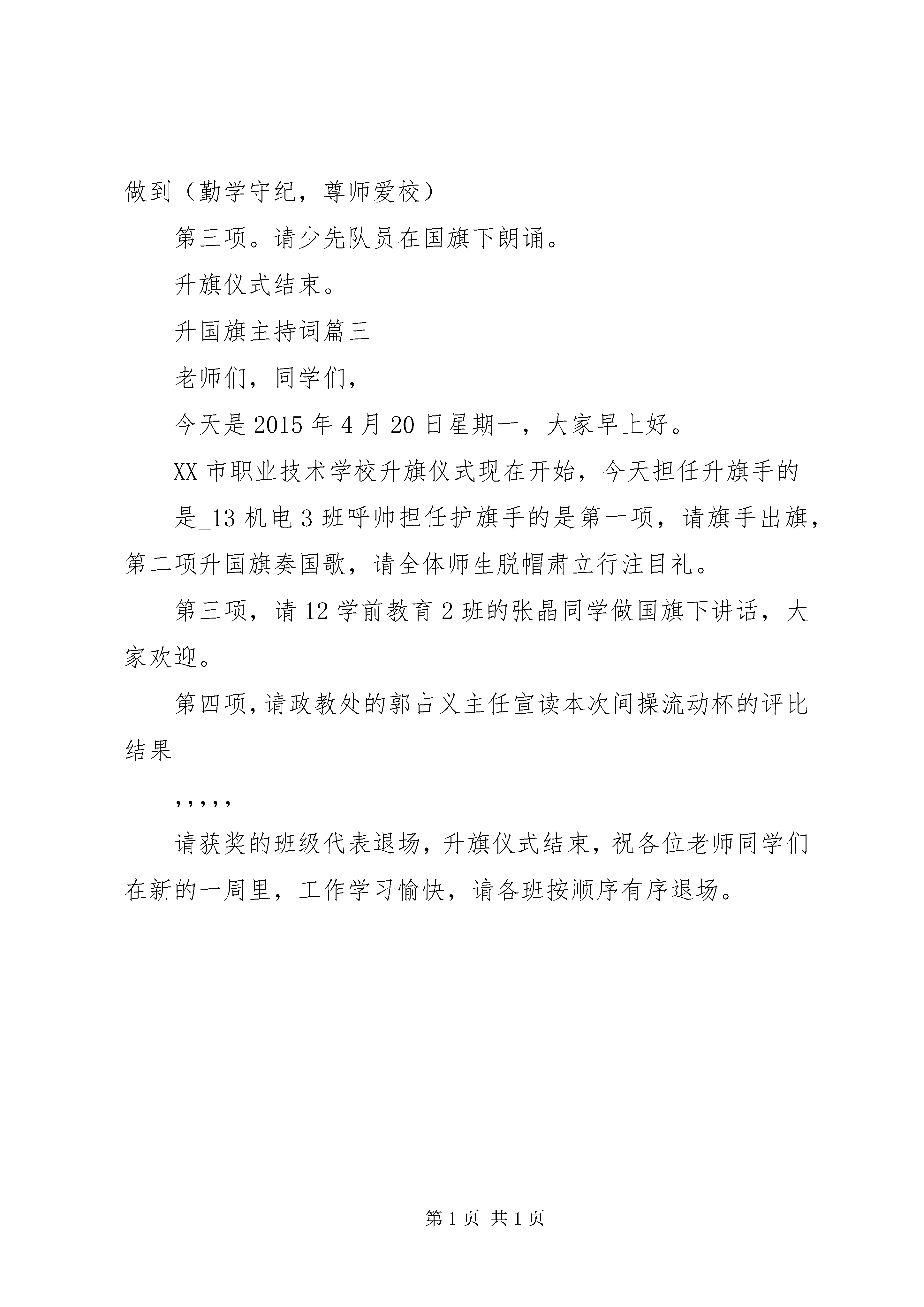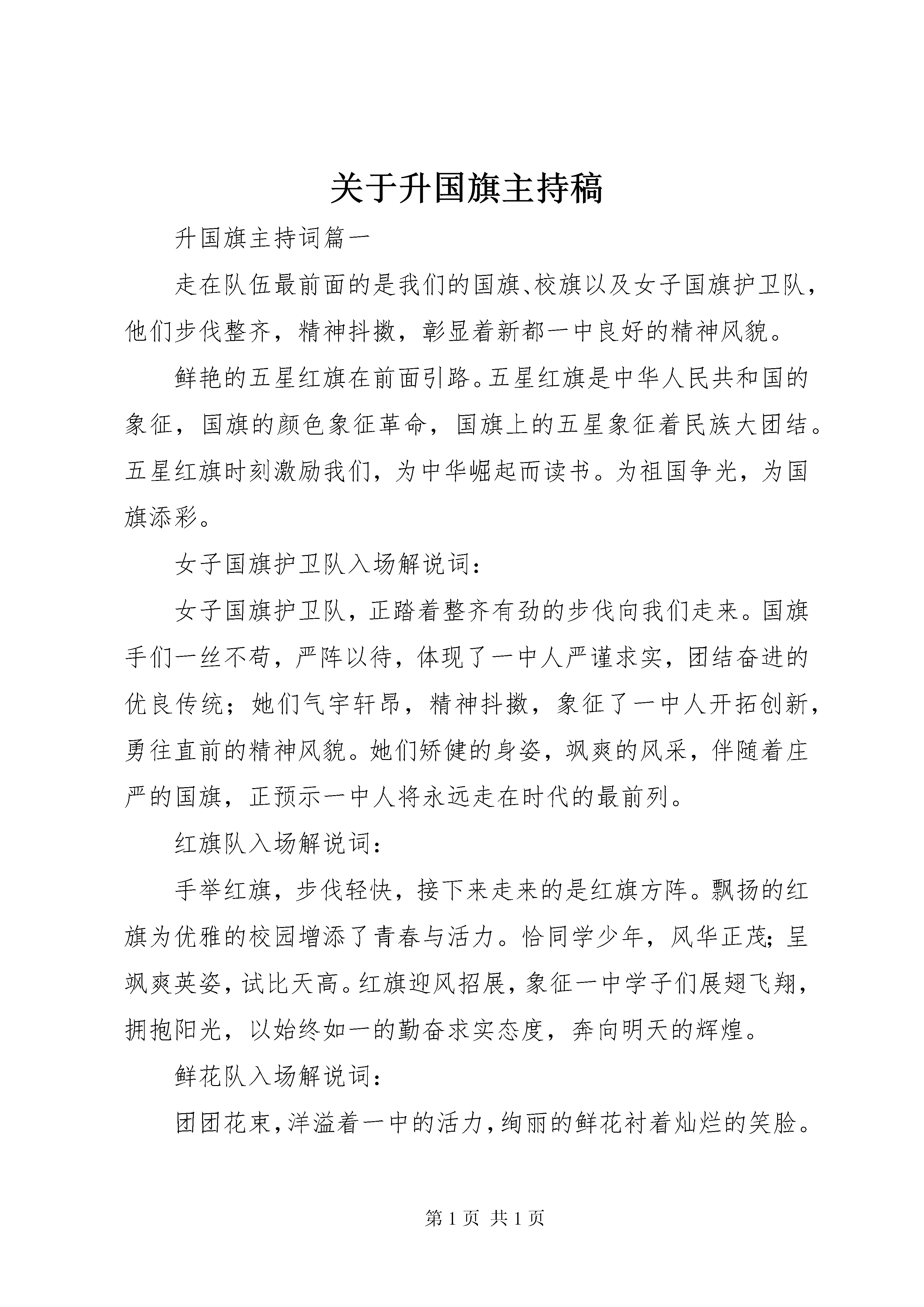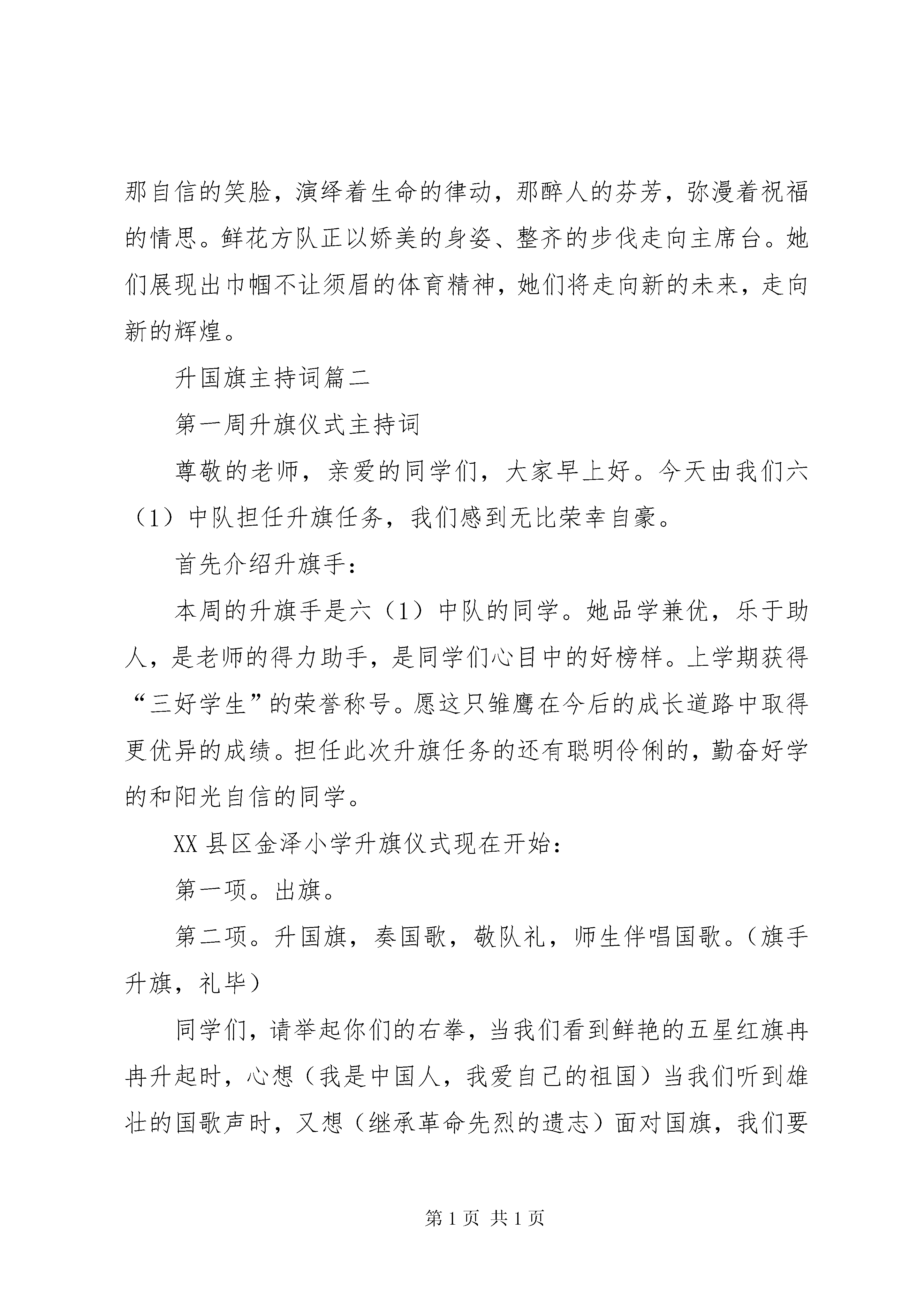 关于升国旗主持稿升国旗主持词篇一走在队伍最前面的是我们的国旗、校旗以及女子国旗护卫队,他们步伐整齐,精神抖擞,彰显着新都一中良好的精神风貌。鲜艳的五星红旗在前面引路。五星红旗是中华人民共和国的象征,国旗的颜色象征革命,国旗上的五星象征着民族大团结。五星红旗时刻激励我们,为中华崛起而读书。为祖国争光,为国旗添彩。女子国旗护卫队入场解说词:女子国旗护卫队,正踏着整齐有劲的步伐向我们走来。国旗手们一丝不苟,严阵以待,体现了一中人严谨求实,团结奋进的优良传统;她们气宇轩昂,精神抖擞,象征了一中人开拓创新,勇往直前的精神风貌。她们矫健的身姿,飒爽的风采,伴随着庄严的国旗,正预示一中人将永远走在时代的最前列。红旗队入场解说词:手举红旗,步伐轻快,接下来走来的是红旗方阵。飘扬的红旗为优雅的校园增添了青春与活力。恰同学少年,风华正茂;呈飒爽英姿,试比天高。红旗迎风招展,象征一中学子们展翅飞翔,拥抱阳光,以始终如一的勤奋求实态度,奔向明天的辉煌。鲜花队入场解说词:团团花束,洋溢着一中的活力,绚丽的鲜花衬着灿烂的笑脸。那自信的笑脸,演绎着生命的律动,那醉人的芬芳,弥漫着祝福的情思。鲜花方队正以娇美的身姿、整齐的步伐走向主席台。她们展现出巾帼不让须眉的体育精神,她们将走向新的未来,走向新的辉煌。升国旗主持词篇二第一周升旗仪式主持词尊敬的老师,亲爱的同学们,大家早上好。今天由我们六(1)中队担任升旗任务,我们感到无比荣幸自豪。首先介绍升旗手:本周的升旗手是六(1)中队的同学。她品学兼优,乐于助人,是老师的得力助手,是同学们心目中的好榜样。上学期获得“三好学生”的荣誉称号。愿这只雏鹰在今后的成长道路中取得更优异的成绩。担任此次升旗任务的还有聪明伶俐的,勤奋好学的和阳光自信的同学。XX县区金泽小学升旗仪式现在开始:第一项。出旗。第二项。升国旗,奏国歌,敬队礼,师生伴唱国歌。(旗手升旗,礼毕)同学们,请举起你们的右拳,当我们看到鲜艳的五星红旗冉冉升起时,心想(我是中国人,我爱自己的祖国)当我们听到雄壮的国歌声时,又想(继承革命先烈的遗志)面对国旗,我们要做到(勤学守纪,尊师爱校)第三项。请少先队员在国旗下朗诵。升旗仪式结束。升国旗主持词篇三老师们,同学们,今天是2015年4月20日星期一,大家早上好。XX市职业技术学校升旗仪式现在开始,今天担任升旗手的是_13机电3班呼帅担任护旗手的是第一项,请旗手出旗,第二项升国旗奏国歌,请全体师生脱帽肃立行注目礼。第三项,请12学前教育2班的张晶同学做国旗下讲话,大家欢迎。第四项,请政教处的郭占义主任宣读本次间操流动杯的评比结果,,,,,请获奖的班级代表退场,升旗仪式结束,祝各位老师同学们在新的一周里,工作学习愉快,请各班按顺序有序退场。