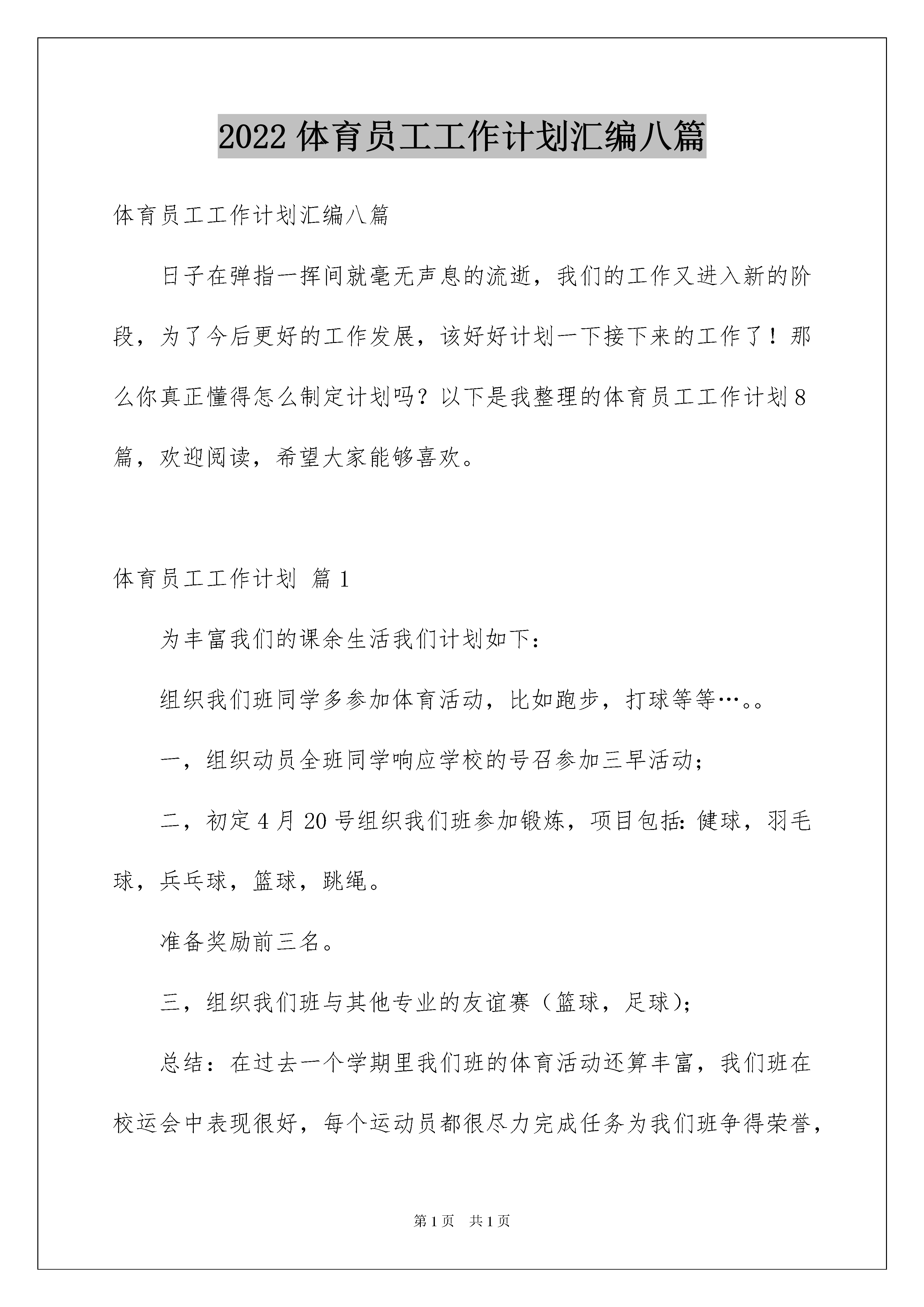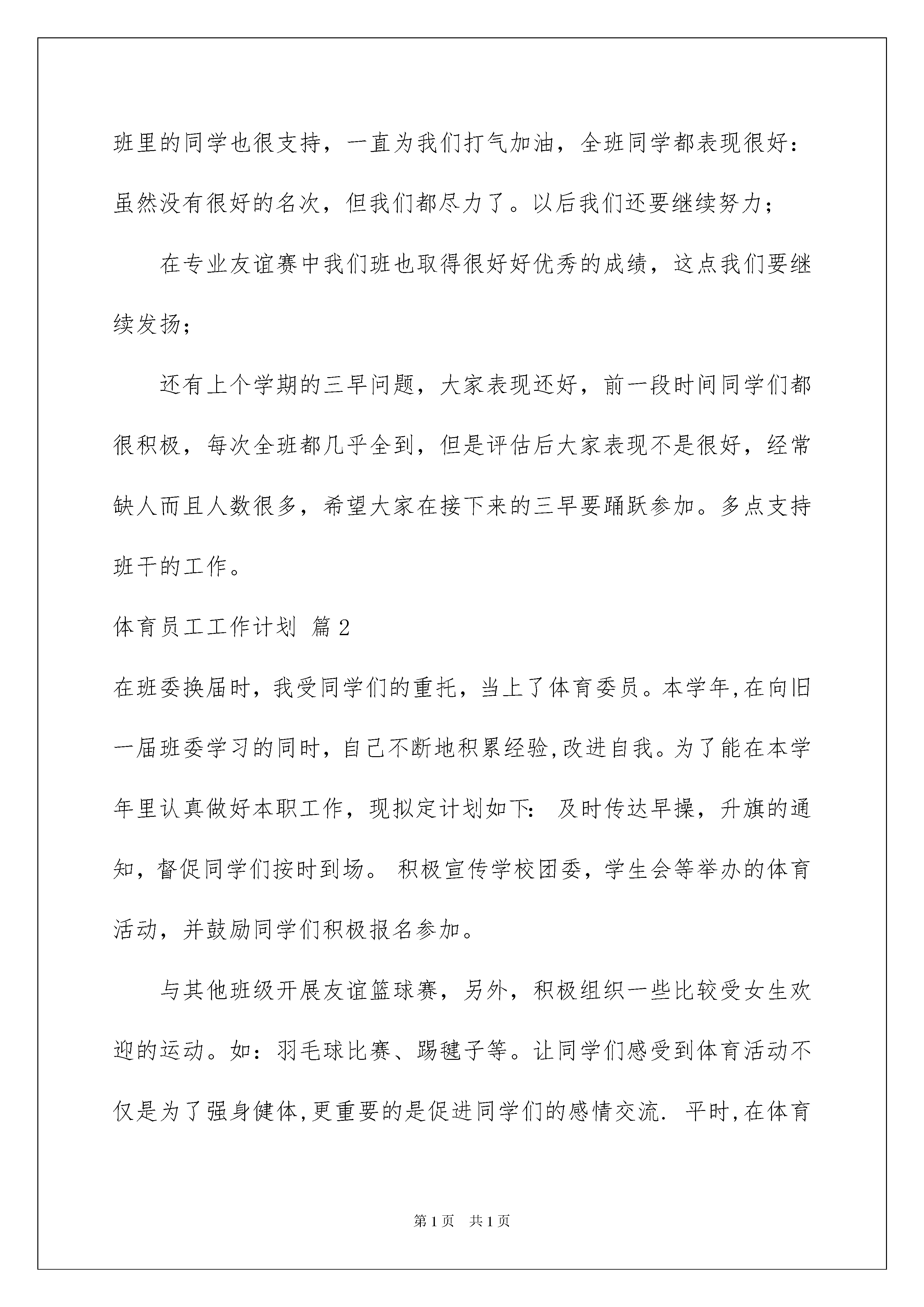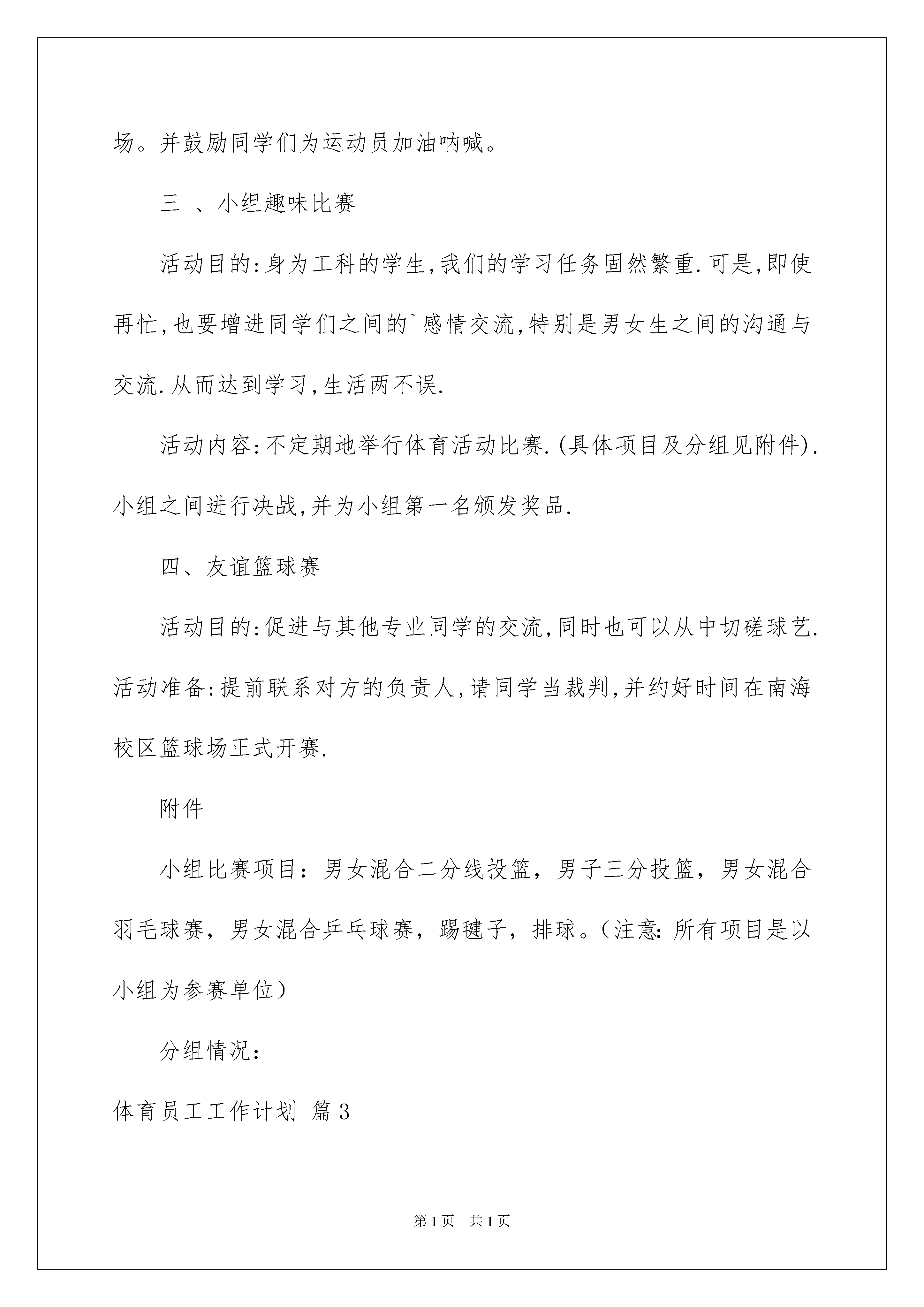 2022体育员工工作计划汇编八篇体育员工工作计划汇编八篇日子在弹指一挥间就毫无声息的流逝,我们的工作又进入新的阶段,为了今后更好的工作发展,该好好计划一下接下来的工作了!那么你真正懂得怎么制定计划吗?以下是我整理的体育员工工作计划8篇,欢迎阅读,希望大家能够喜欢。体育员工工作计划篇1为丰富我们的课余生活我们计划如下:组织我们班同学多参加体育活动,比如跑步,打球等等…。。一,组织动员全班同学响应学校的号召参加三早活动;二,初定4月20号组织我们班参加锻炼,项目包括:健球,羽毛球,兵乓球,篮球,跳绳。准备奖励前三名。三,组织我们班与其他专业的友谊赛(篮球,足球);总结:在过去一个学期里我们班的体育活动还算丰富,我们班在校运会中表现很好,每个运动员都很尽力完成任务为我们班争得荣誉,班里的同学也很支持,一直为我们打气加油,全班同学都表现很好:虽然没有很好的名次,但我们都尽力了。以后我们还要继续努力;在专业友谊赛中我们班也取得很好好优秀的成绩,这点我们要继续发扬;还有上个学期的三早问题,大家表现还好,前一段时间同学们都很积极,每次全班都几乎全到,但是评估后大家表现不是很好,经常缺人而且人数很多,希望大家在接下来的三早要踊跃参加。多点支持班干的工作。体育员工工作计划篇2在班委换届时,我受同学们的重托,当上了体育委员。本学年,在向旧一届班委学习的同时,自己不断地积累经验,改进自我。为了能在本学年里认真做好本职工作,现拟定计划如下:及时传达早操,升旗的通知,督促同学们按时到场。积极宣传学校团委,学生会等举办的体育活动,并鼓励同学们积极报名参加。与其他班级开展友谊篮球赛,另外,积极组织一些比较受女生欢迎的运动。如:羽毛球比赛、踢毽子等。让同学们感受到体育活动不仅是为了强身健体,更重要的是促进同学们的感情交流.平时,在体育运动过程中注重培养同学们的团队意识,合作意识,拼搏精神,让青春活力四射.在运动过程中提醒同学们注意安全,以及受伤时该如何及时处理,每当举行完一些体育赛事,进行一次总结,有何进步,有何欠缺.积极配合其他班委及上级的工作。具体内容一、电信杯篮球赛活动目的:积极响应国家教育部.国家体育总局.共青团中央的号召.同时,利用20xx年亚运会的契机,激发同学们的体育锻炼热情.活动主题:贺羊城激情亚运,展电信魅力篮球活动准备:利用空余时间与队员进行热身训练,着重培养团队意识,合作意识,从而提高整支球队的战术素养.每场比赛前,安排好首发阵容以及在比赛当中的轮换阵容.并号召同学们为球员加油鼓气.二、院运会活动目的:点燃同学们体育活动的热情之火,促进同学们身心健康的良好发展。活动准备:及时传达比赛项目的竞赛规程和通知参赛人员按时到场。并鼓励同学们为运动员加油呐喊。三、小组趣味比赛活动目的:身为工科的学生,我们的学习任务固然繁重.可是,即使再忙,也要增进同学们之间的`感情交流,特别是男女生之间的沟通与交流.从而达到学习,生活两不误.活动内容:不定期地举行体育活动比赛.(具体项目及分组见附件).小组之间进行决战,并为小组第一名颁发奖品.四、友谊篮球赛活动目的:促进与其他专业同学的交流,同时也可以从中切磋球艺.活动准备:提前联系对方的负责人,请同学当裁判,并约好时间在南海校区篮球场正式开赛.附件小组比赛项目:男女混合二分线投篮,男子三分投篮,男女混合羽毛球赛,男女混合乒乓球赛,踢毽子,排球。(注意:所有项目是以小组为参赛单位)分组情况:体育员工工作计划篇3新的学期已经开始,我很荣幸担任xx计本2班体育委员。这是我上大学以来第一次担任班级委员。我会做好本职的工作不让班级同学失望。因此特拟定这学期工作计划:一、学好专业是最重要的。认真学习专业的知识,做好班干带头作用。多为同学们着想。做好本分,帮他人之不能,做之他人之难。二、构建和谐班级。大学不仅是知识的海洋,还是一个部学做人的宝典。做人既要学会为已还要学会为人。不管是现在还是未来,我们都不能在社会独立起来,都要与人相处、合作。和谐的环境是合作的基础。在大学,和谐更显为重要,没有一个良好的环境,那会学习得好;没有一个和谐的班级,小环境都不能合作、和谐相处,又怎能在大社会合作和谐相处呢?因此构建和谐班级极为重要。三、组织活动,增强集体观念、团结、活力。众所周知。健康的身体是革命的本钱。没有一个好身体。是不能做什么的。大三已经没有体育课了,课外活动显得更加重要了。课外活动便是增强体质的最有力的保障。因此我们要经常活动,多参加点有益课外活动。在活动的同时我们会有更多的时间互相了解,互相促进。具体工作计划如下:1、组织同学们积极参与各项体育活动:如动员同学们积极参