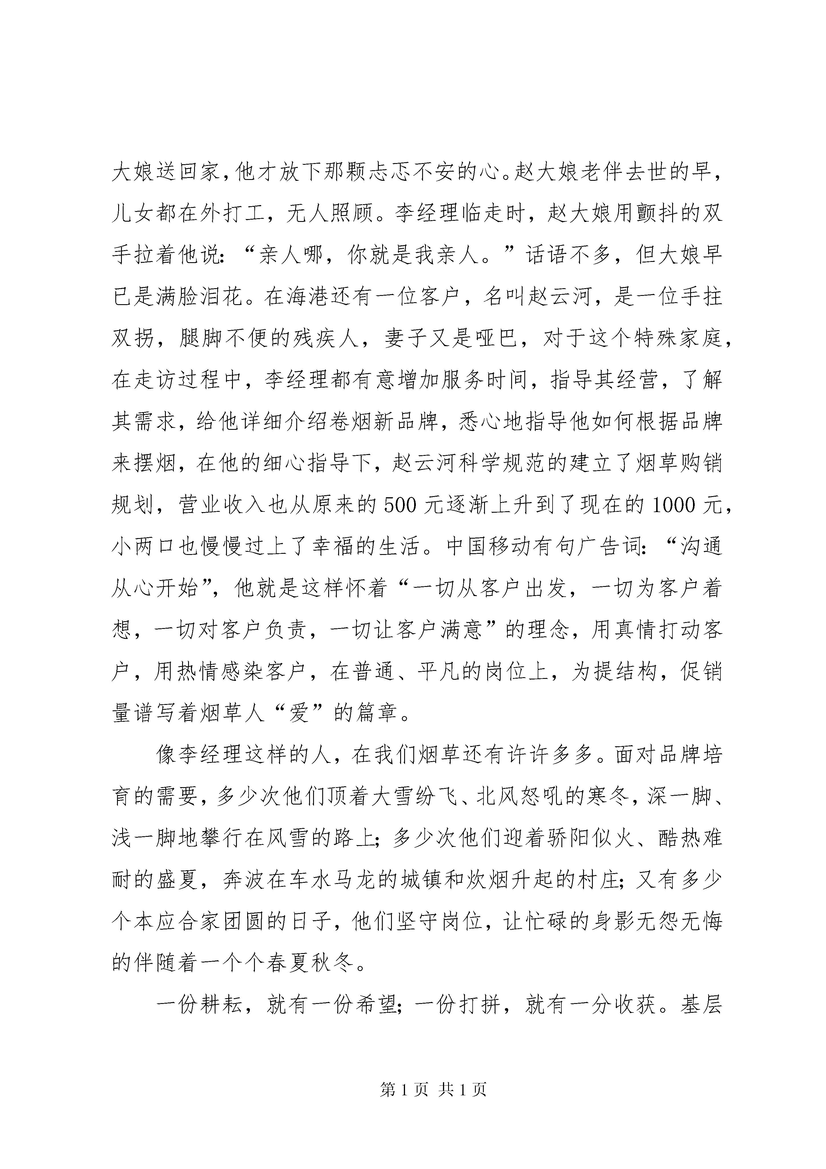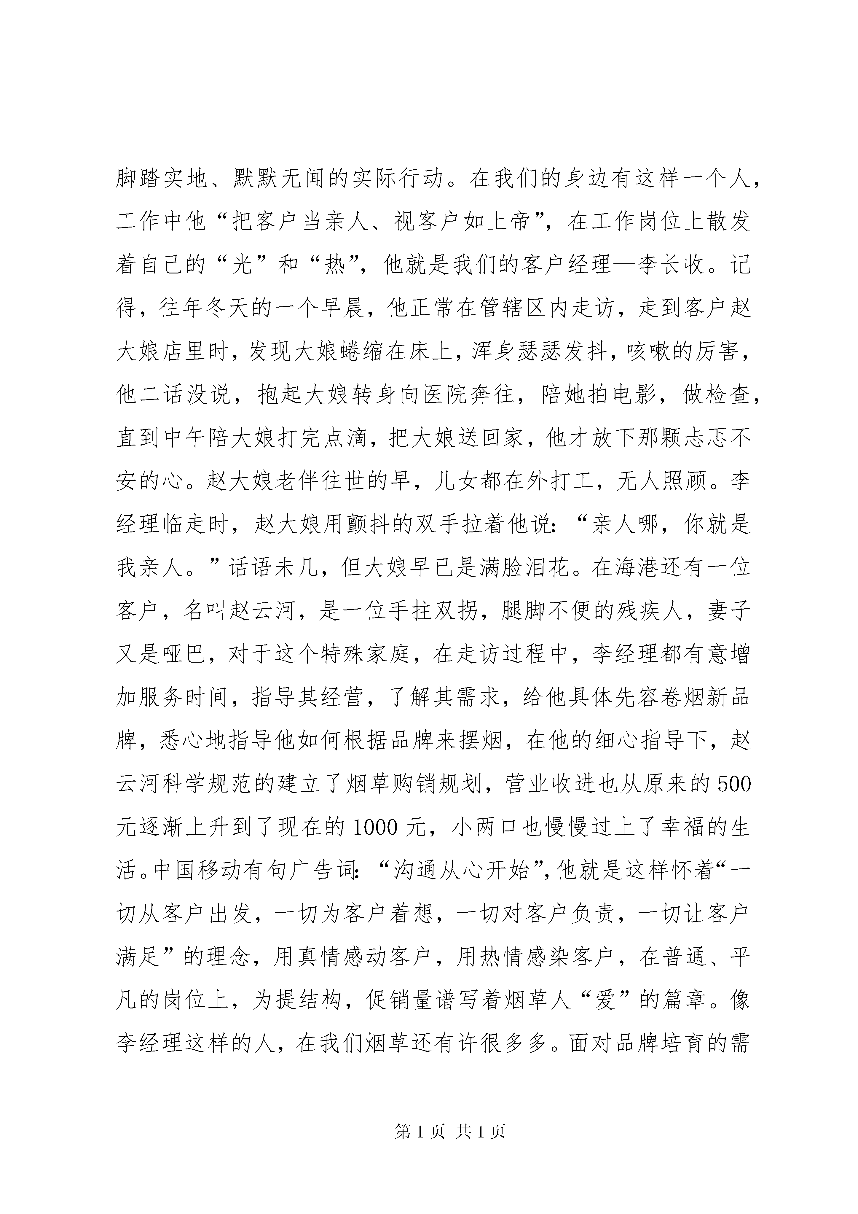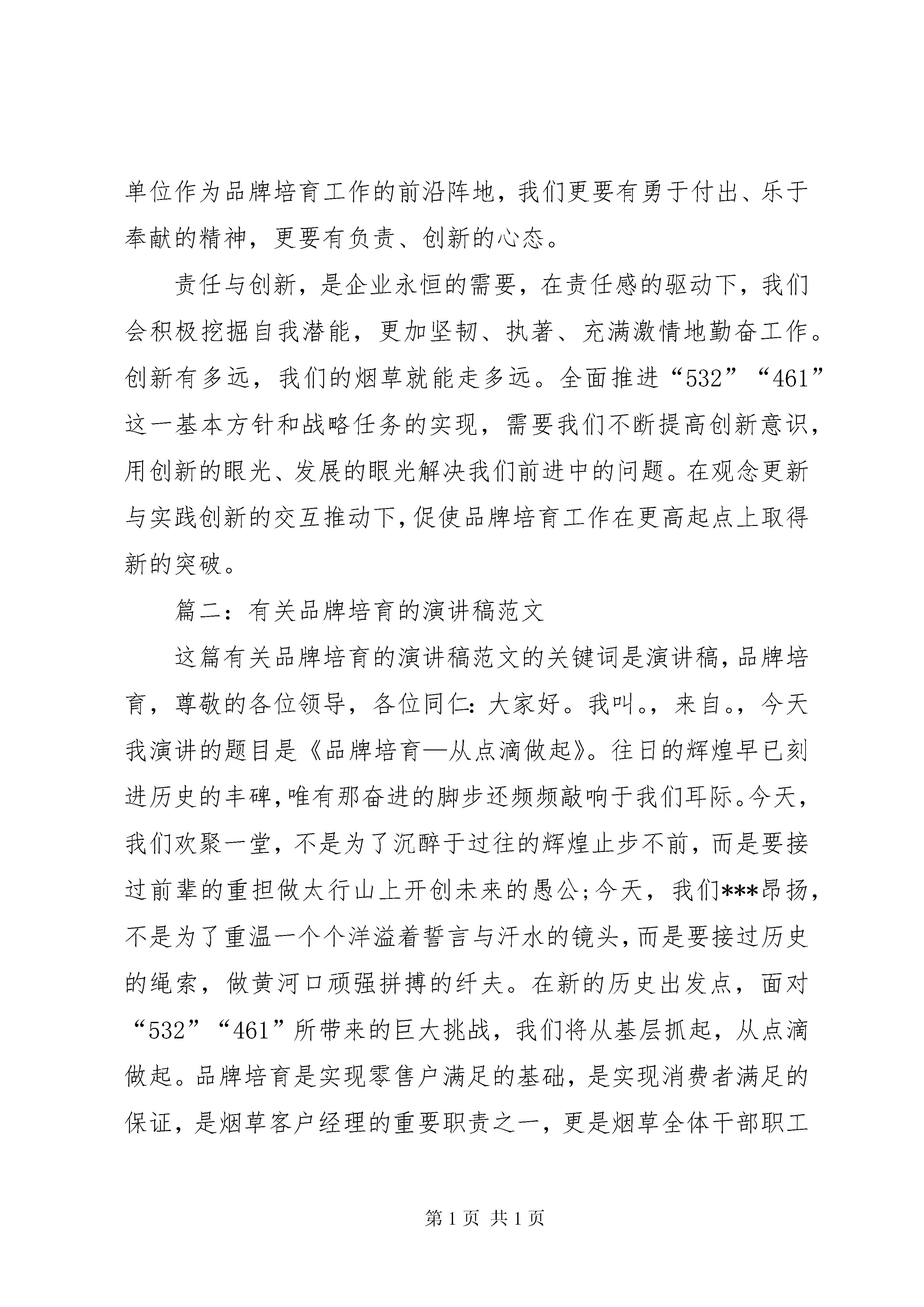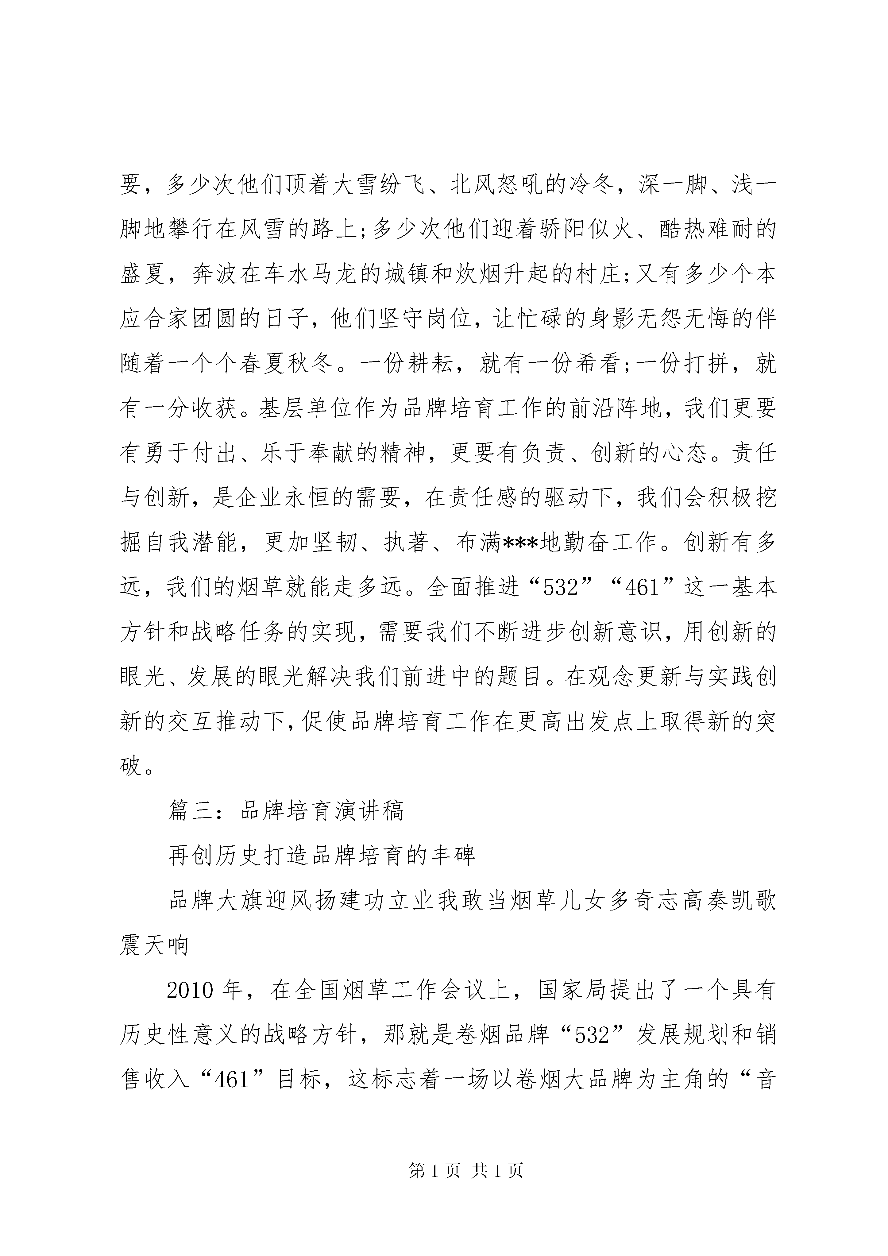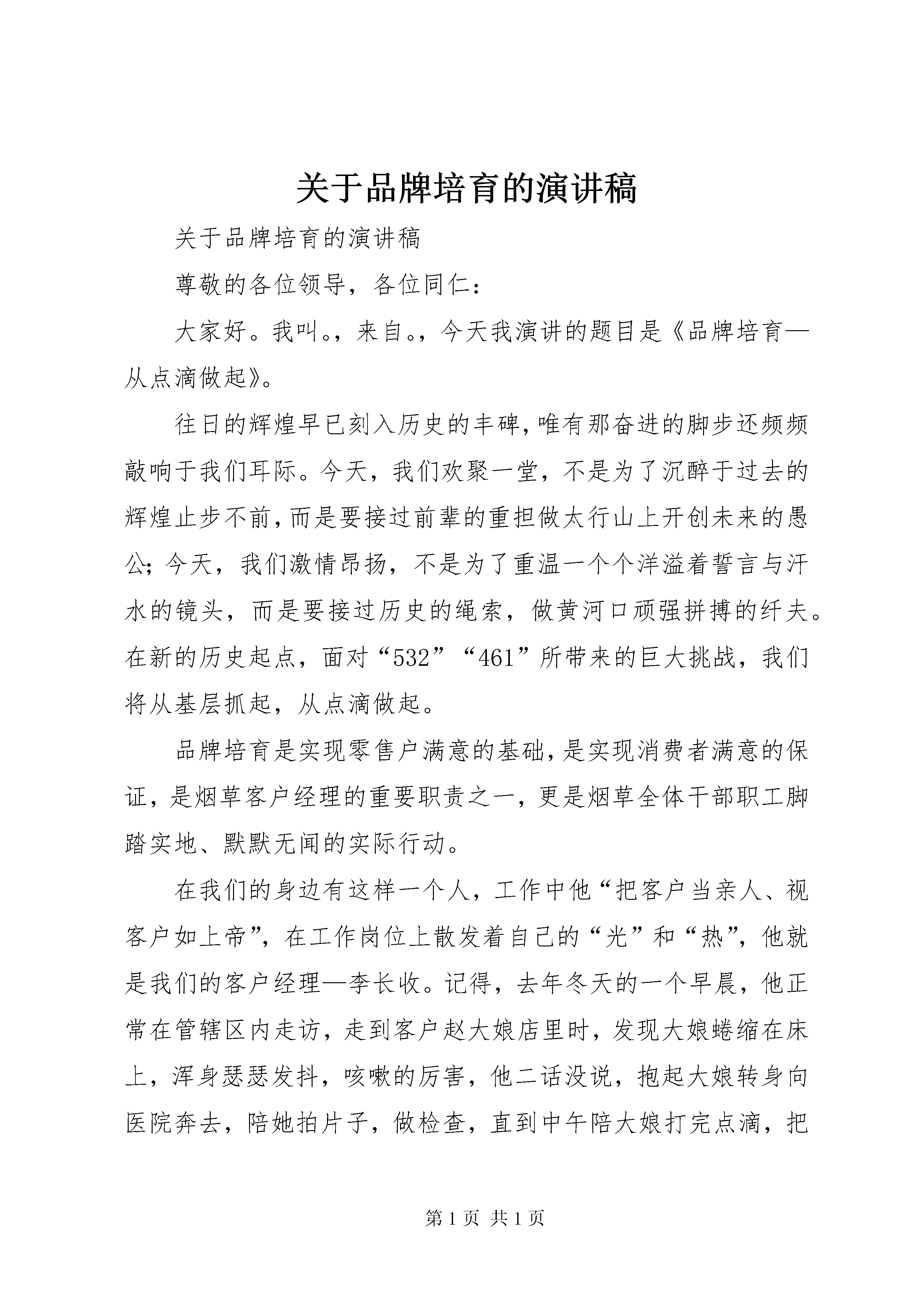关于品牌培育的演讲稿关于品牌培育的演讲稿尊敬的各位领导,各位同仁:大家好。我叫。,来自。,今天我演讲的题目是《品牌培育—从点滴做起》。往日的辉煌早已刻入历史的丰碑,唯有那奋进的脚步还频频敲响于我们耳际。今天,我们欢聚一堂,不是为了沉醉于过去的辉煌止步不前,而是要接过前辈的重担做太行山上开创未来的愚公;今天,我们激情昂扬,不是为了重温一个个洋溢着誓言与汗水的镜头,而是要接过历史的绳索,做黄河口顽强拼搏的纤夫。在新的历史起点,面对“532”“461”所带来的巨大挑战,我们将从基层抓起,从点滴做起。品牌培育是实现零售户满意的基础,是实现消费者满意的保证,是烟草客户经理的重要职责之一,更是烟草全体干部职工脚踏实地、默默无闻的实际行动。在我们的身边有这样一个人,工作中他“把客户当亲人、视客户如上帝”,在工作岗位上散发着自己的“光”和“热”,他就是我们的客户经理—李长收。记得,去年冬天的一个早晨,他正常在管辖区内走访,走到客户赵大娘店里时,发现大娘蜷缩在床上,浑身瑟瑟发抖,咳嗽的厉害,他二话没说,抱起大娘转身向医院奔去,陪她拍片子,做检查,直到中午陪大娘打完点滴,把大娘送回家,他才放下那颗忐忑不安的心。赵大娘老伴去世的早,儿女都在外打工,无人照顾。李经理临走时,赵大娘用颤抖的双手拉着他说:“亲人哪,你就是我亲人。”话语不多,但大娘早已是满脸泪花。在海港还有一位客户,名叫赵云河,是一位手拄双拐,腿脚不便的残疾人,妻子又是哑巴,对于这个特殊家庭,在走访过程中,李经理都有意增加服务时间,指导其经营,了解其需求,给他详细介绍卷烟新品牌,悉心地指导他如何根据品牌来摆烟,在他的细心指导下,赵云河科学规范的建立了烟草购销规划,营业收入也从原来的500元逐渐上升到了现在的1000元,小两口也慢慢过上了幸福的生活。中国移动有句广告词:“沟通从心开始”,他就是这样怀着“一切从客户出发,一切为客户着想,一切对客户负责,一切让客户满意”的理念,用真情打动客户,用热情感染客户,在普通、平凡的岗位上,为提结构,促销量谱写着烟草人“爱”的篇章。像李经理这样的人,在我们烟草还有许许多多。面对品牌培育的需要,多少次他们顶着大雪纷飞、北风怒吼的寒冬,深一脚、浅一脚地攀行在风雪的路上;多少次他们迎着骄阳似火、酷热难耐的盛夏,奔波在车水马龙的城镇和炊烟升起的村庄;又有多少个本应合家团圆的日子,他们坚守岗位,让忙碌的身影无怨无悔的伴随着一个个春夏秋冬。一份耕耘,就有一份希望;一份打拼,就有一分收获。基层单位作为品牌培育工作的前沿阵地,我们更要有勇于付出、乐于奉献的精神,更要有负责、创新的心态。责任与创新,是企业永恒的需要,在责任感的驱动下,我们会积极挖掘自我潜能,更加坚韧、执著、充满激情地勤奋工作。创新有多远,我们的烟草就能走多远。全面推进“532”“461”这一基本方针和战略任务的实现,需要我们不断提高创新意识,用创新的眼光、发展的眼光解决我们前进中的问题。在观念更新与实践创新的交互推动下,促使品牌培育工作在更高起点上取得新的突破。篇二:有关品牌培育的演讲稿范文这篇有关品牌培育的演讲稿范文的关键词是演讲稿,品牌培育,尊敬的各位领导,各位同仁:大家好。我叫。,来自。,今天我演讲的题目是《品牌培育—从点滴做起》。往日的辉煌早已刻进历史的丰碑,唯有那奋进的脚步还频频敲响于我们耳际。今天,我们欢聚一堂,不是为了沉醉于过往的辉煌止步不前,而是要接过前辈的重担做太行山上开创未来的愚公;今天,我们***昂扬,不是为了重温一个个洋溢着誓言与汗水的镜头,而是要接过历史的绳索,做黄河口顽强拼搏的纤夫。在新的历史出发点,面对“532”“461”所带来的巨大挑战,我们将从基层抓起,从点滴做起。品牌培育是实现零售户满足的基础,是实现消费者满足的保证,是烟草客户经理的重要职责之一,更是烟草全体干部职工脚踏实地、默默无闻的实际行动。在我们的身边有这样一个人,工作中他“把客户当亲人、视客户如上帝”,在工作岗位上散发着自己的“光”和“热”,他就是我们的客户经理—李长收。记得,往年冬天的一个早晨,他正常在管辖区内走访,走到客户赵大娘店里时,发现大娘蜷缩在床上,浑身瑟瑟发抖,咳嗽的厉害,他二话没说,抱起大娘转身向医院奔往,陪她拍电影,做检查,直到中午陪大娘打完点滴,把大娘送回家,他才放下那颗忐忑不安的心。赵大娘老伴往世的早,儿女都在外打工,无人照顾。李经理临走时,赵大娘用颤抖的双手拉着他说:“亲人哪,你就是我亲人。”话语未几,但大娘早已是满脸泪花。在海港还有一位客户,名叫赵云河,是一位手拄双拐,腿脚不便的残疾人,妻子又是哑巴,对于这个特殊家庭,在走访过程中,李经理都有意增加服务时间,指导其经营,了解其需求,给他具体先容卷烟新品牌,悉心地指导他如何根据品牌来摆烟,在他的细心指导下,赵云河科学
