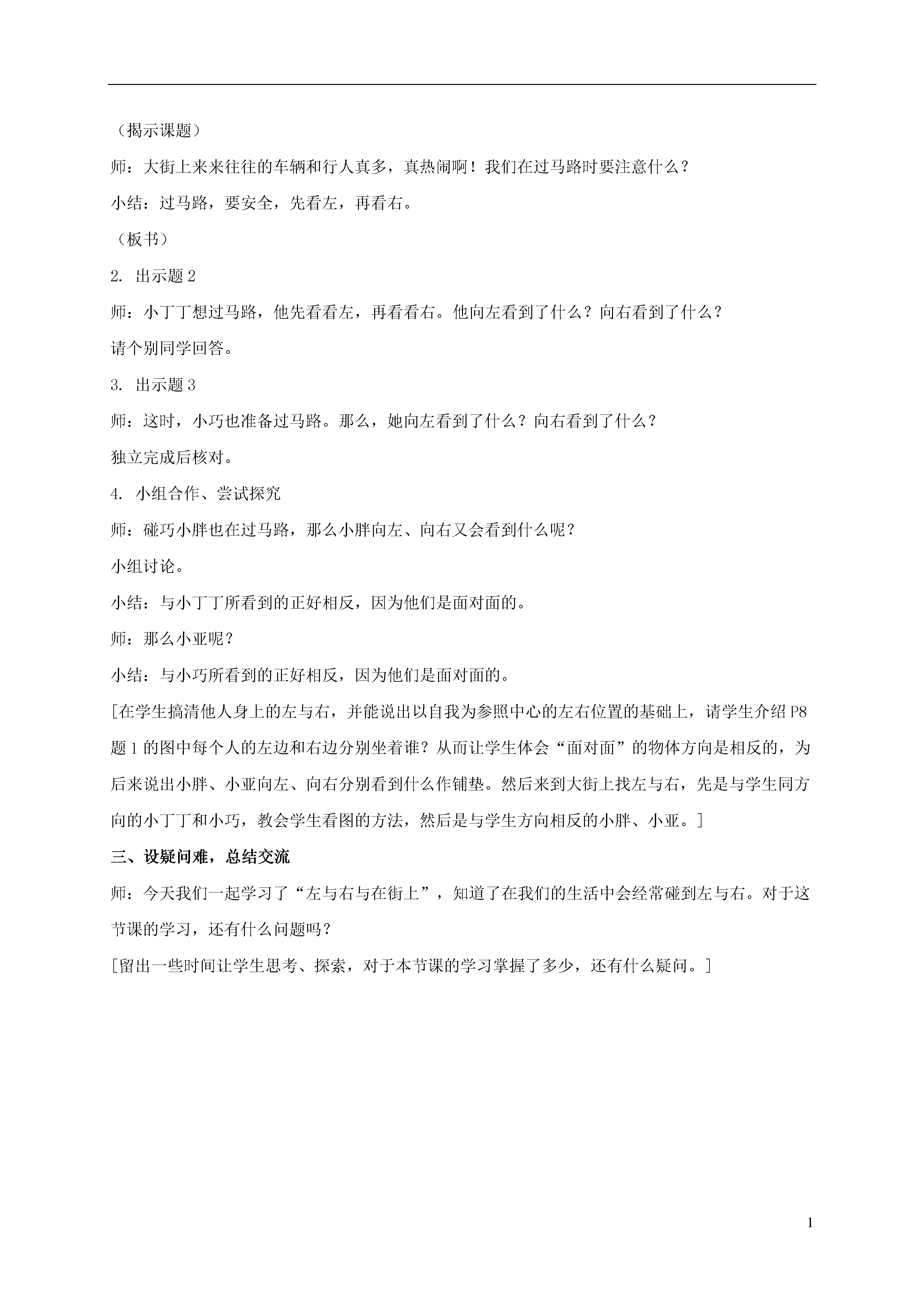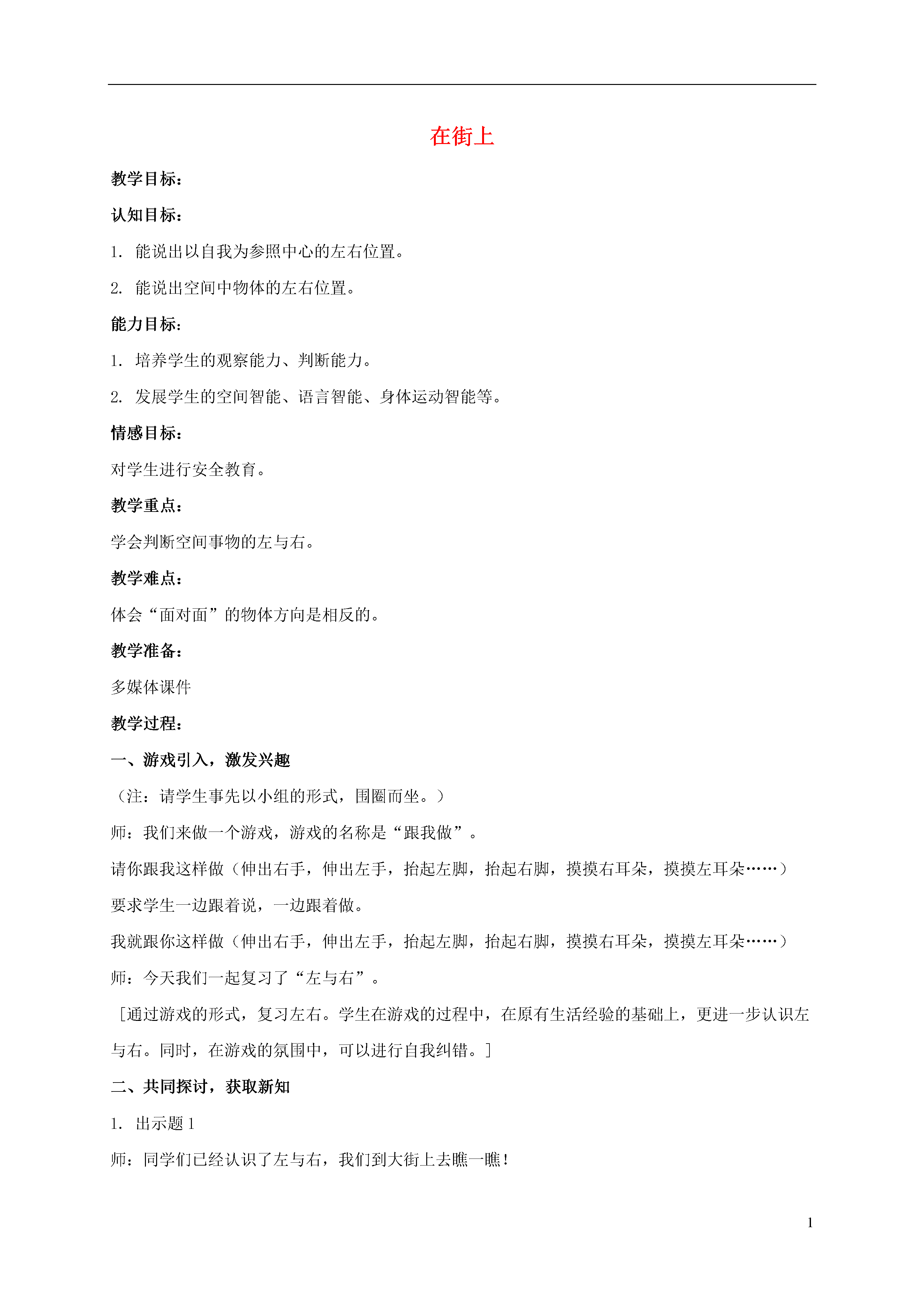 1在街上教学目标:认知目标:1.能说出以自我为参照中心的左右位置。2.能说出空间中物体的左右位置。能力目标:1.培养学生的观察能力、判断能力。2.发展学生的空间智能、语言智能、身体运动智能等。情感目标:对学生进行安全教育。教学重点:学会判断空间事物的左与右。教学难点:体会“面对面”的物体方向是相反的。教学准备:多媒体课件教学过程:一、游戏引入,激发兴趣(注:请学生事先以小组的形式,围圈而坐。)师:我们来做一个游戏,游戏的名称是“跟我做”。请你跟我这样做(伸出右手,伸出左手,抬起左脚,抬起右脚,摸摸右耳朵,摸摸左耳朵……)要求学生一边跟着说,一边跟着做。我就跟你这样做(伸出右手,伸出左手,抬起左脚,抬起右脚,摸摸右耳朵,摸摸左耳朵……)师:今天我们一起复习了“左与右”。[通过游戏的形式,复习左右。学生在游戏的过程中,在原有生活经验的基础上,更进一步认识左与右。同时,在游戏的氛围中,可以进行自我纠错。]二、共同探讨,获取新知1.出示题1师:同学们已经认识了左与右,我们到大街上去瞧一瞧!(揭示课题)师:大街上来来往往的车辆和行人真多,真热闹啊!我们在过马路时要注意什么?小结:过马路,要安全,先看左,再看右。(板书)2.出示题2师:小丁丁想过马路,他先看看左,再看看右。他向左看到了什么?向右看到了什么?请个别同学回答。3.出示题3师:这时,小巧也准备过马路。那么,她向左看到了什么?向右看到了什么?独立完成后核对。4.小组合作、尝试探究师:碰巧小胖也在过马路,那么小胖向左、向右又会看到什么呢?小组讨论。小结:与小丁丁所看到的正好相反,因为他们是面对面的。师:那么小亚呢?小结:与小巧所看到的正好相反,因为他们是面对面的。[在学生搞清他人身上的左与右,并能说出以自我为参照中心的左右位置的基础上,请学生介绍P8题1的图中每个人的左边和右边分别坐着谁?从而让学生体会“面对面”的物体方向是相反的,为后来说出小胖、小亚向左、向右分别看到什么作铺垫。然后来到大街上找左与右,先是与学生同方向的小丁丁和小巧,教会学生看图的方法,然后是与学生方向相反的小胖、小亚。]三、设疑问难,总结交流师:今天我们一起学习了“左与右与在街上”,知道了在我们的生活中会经常碰到左与右。对于这节课的学习,还有什么问题吗?[留出一些时间让学生思考、探索,对于本节课的学习掌握了多少,还有什么疑问。]