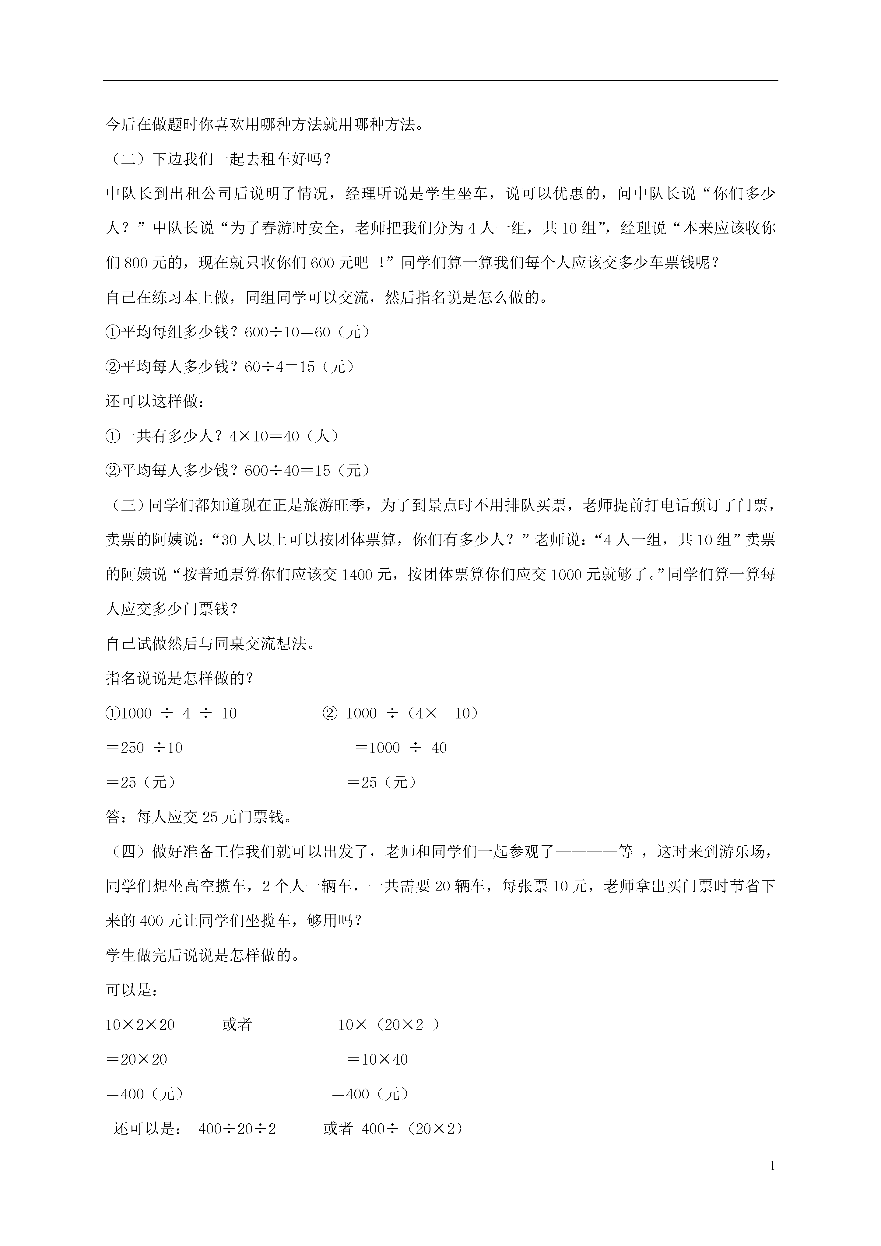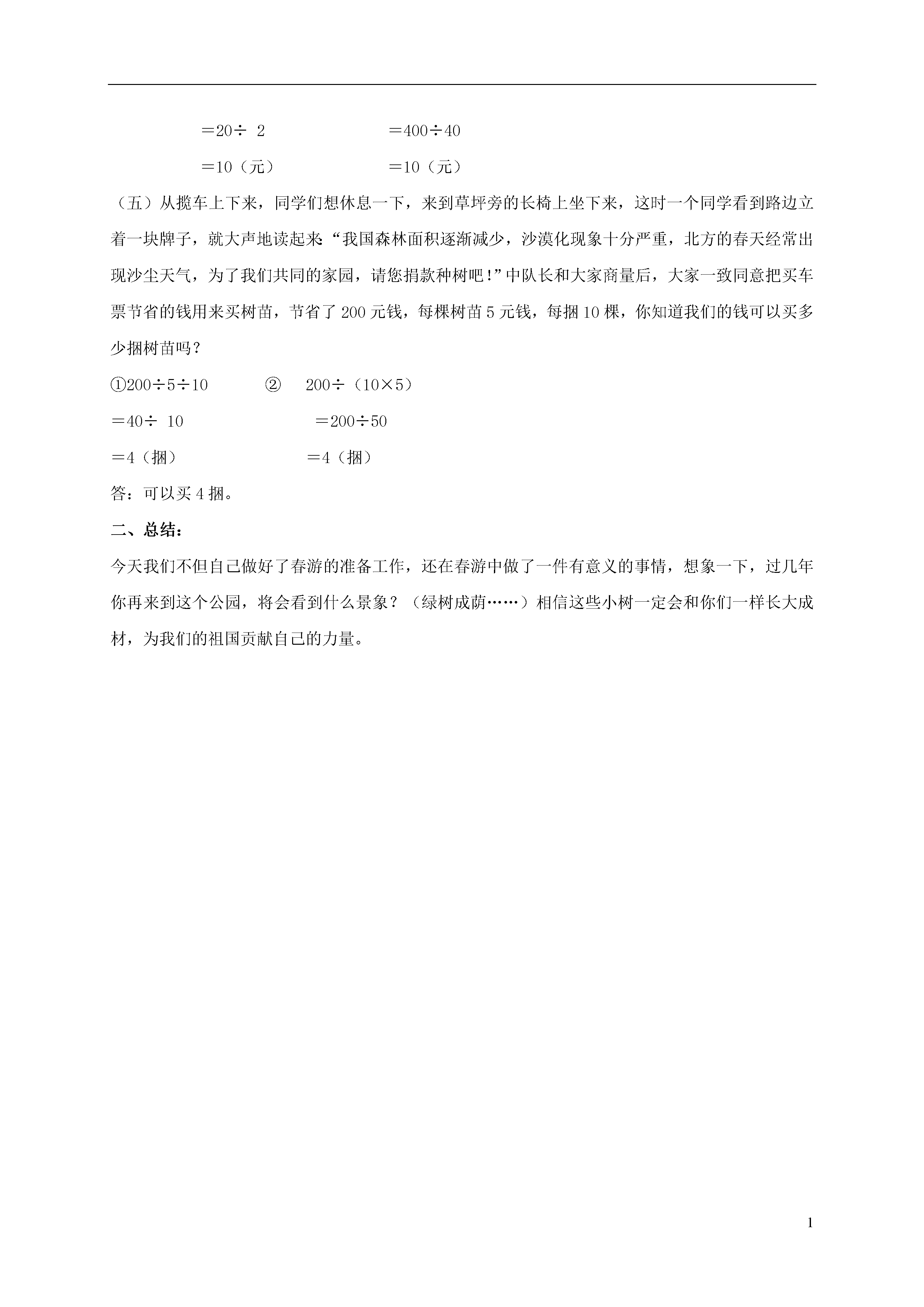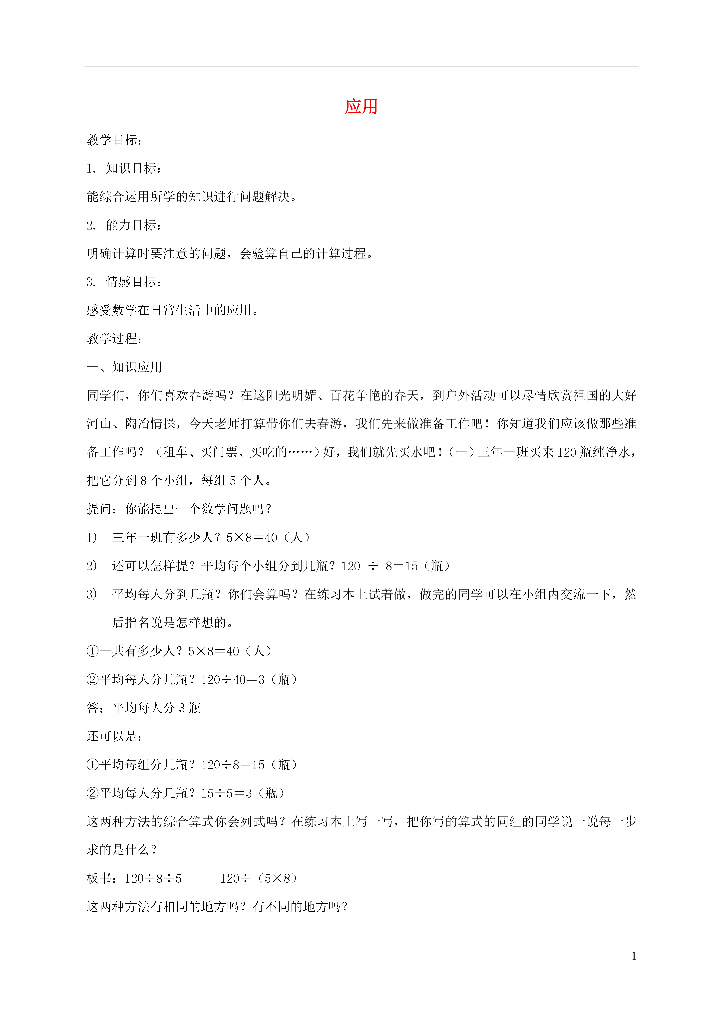 1应用教学目标:1.知识目标:能综合运用所学的知识进行问题解决。2.能力目标:明确计算时要注意的问题,会验算自己的计算过程。3.情感目标:感受数学在日常生活中的应用。教学过程:一、知识应用同学们,你们喜欢春游吗?在这阳光明媚、百花争艳的春天,到户外活动可以尽情欣赏祖国的大好河山、陶冶情操,今天老师打算带你们去春游,我们先来做准备工作吧!你知道我们应该做那些准备工作吗?(租车、买门票、买吃的……)好,我们就先买水吧!(一)三年一班买来120瓶纯净水,把它分到8个小组,每组5个人。提问:你能提出一个数学问题吗?三年一班有多少人?5×8=40(人)还可以怎样提?平均每个小组分到几瓶?120÷8=15(瓶)平均每人分到几瓶?你们会算吗?在练习本上试着做,做完的同学可以在小组内交流一下,然后指名说是怎样想的。①一共有多少人?5×8=40(人)②平均每人分几瓶?120÷40=3(瓶)答:平均每人分3瓶。还可以是:①平均每组分几瓶?120÷8=15(瓶)②平均每人分几瓶?15÷5=3(瓶)这两种方法的综合算式你会列式吗?在练习本上写一写,把你写的算式的同组的同学说一说每一步求的是什么?板书:120÷8÷5120÷(5×8)这两种方法有相同的地方吗?有不同的地方吗?今后在做题时你喜欢用哪种方法就用哪种方法。(二)下边我们一起去租车好吗?中队长到出租公司后说明了情况,经理听说是学生坐车,说可以优惠的,问中队长说“你们多少人?”中队长说“为了春游时安全,老师把我们分为4人一组,共10组”,经理说“本来应该收你们800元的,现在就只收你们600元吧!”同学们算一算我们每个人应该交多少车票钱呢?自己在练习本上做,同组同学可以交流,然后指名说是怎么做的。①平均每组多少钱?600÷10=60(元)②平均每人多少钱?60÷4=15(元)还可以这样做:①一共有多少人?4×10=40(人)②平均每人多少钱?600÷40=15(元)(三)同学们都知道现在正是旅游旺季,为了到景点时不用排队买票,老师提前打电话预订了门票,卖票的阿姨说:“30人以上可以按团体票算,你们有多少人?”老师说:“4人一组,共10组”卖票的阿姨说“按普通票算你们应该交1400元,按团体票算你们应交1000元就够了。”同学们算一算每人应交多少门票钱?自己试做然后与同桌交流想法。指名说说是怎样做的?①1000÷4÷10②1000÷(4×10)=250÷10=1000÷40=25(元)=25(元)答:每人应交25元门票钱。(四)做好准备工作我们就可以出发了,老师和同学们一起参观了————等,这时来到游乐场,同学们想坐高空揽车,2个人一辆车,一共需要20辆车,每张票10元,老师拿出买门票时节省下来的400元让同学们坐揽车,够用吗?学生做完后说说是怎样做的。可以是:10×2×20或者10×(20×2)=20×20=10×40=400(元)=400(元)还可以是:400÷20÷2或者400÷(20×2)=20÷2=400÷40=10(元)=10(元)(五)从揽车上下来,同学们想休息一下,来到草坪旁的长椅上坐下来,这时一个同学看到路边立着一块牌子,就大声地读起来:“我国森林面积逐渐减少,沙漠化现象十分严重,北方的春天经常出现沙尘天气,为了我们共同的家园,请您捐款种树吧!”中队长和大家商量后,大家一致同意把买车票节省的钱用来买树苗,节省了200元钱,每棵树苗5元钱,每捆10棵,你知道我们的钱可以买多少捆树苗吗?①200÷5÷10②200÷(10×5)=40÷10=200÷50=4(捆)=4(捆)答:可以买4捆。二、总结:今天我们不但自己做好了春游的准备工作,还在春游中做了一件有意义的事情,想象一下,过几年你再来到这个公园,将会看到什么景象?(绿树成荫……)相信这些小树一定会和你们一样长大成材,为我们的祖国贡献自己的力量。