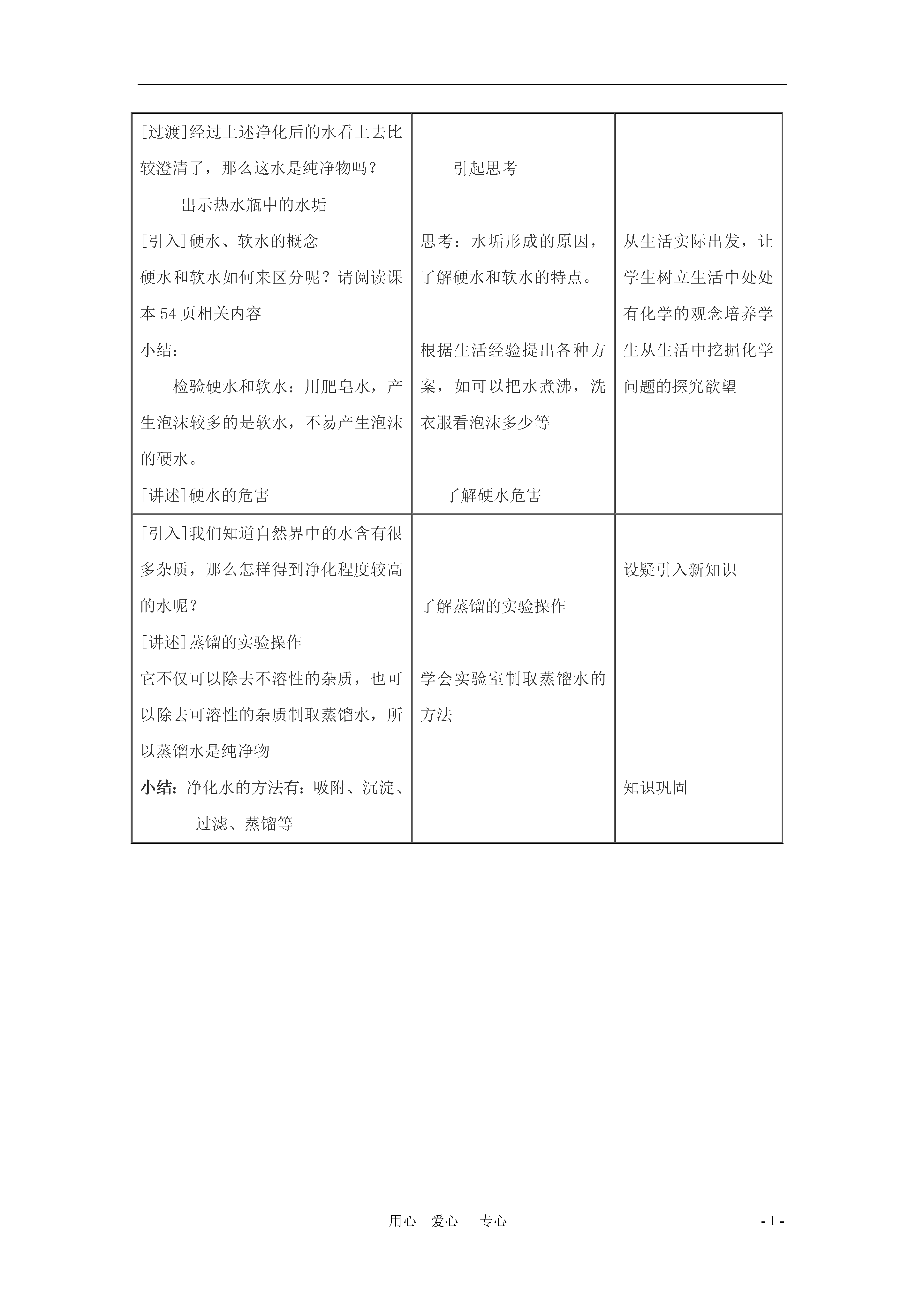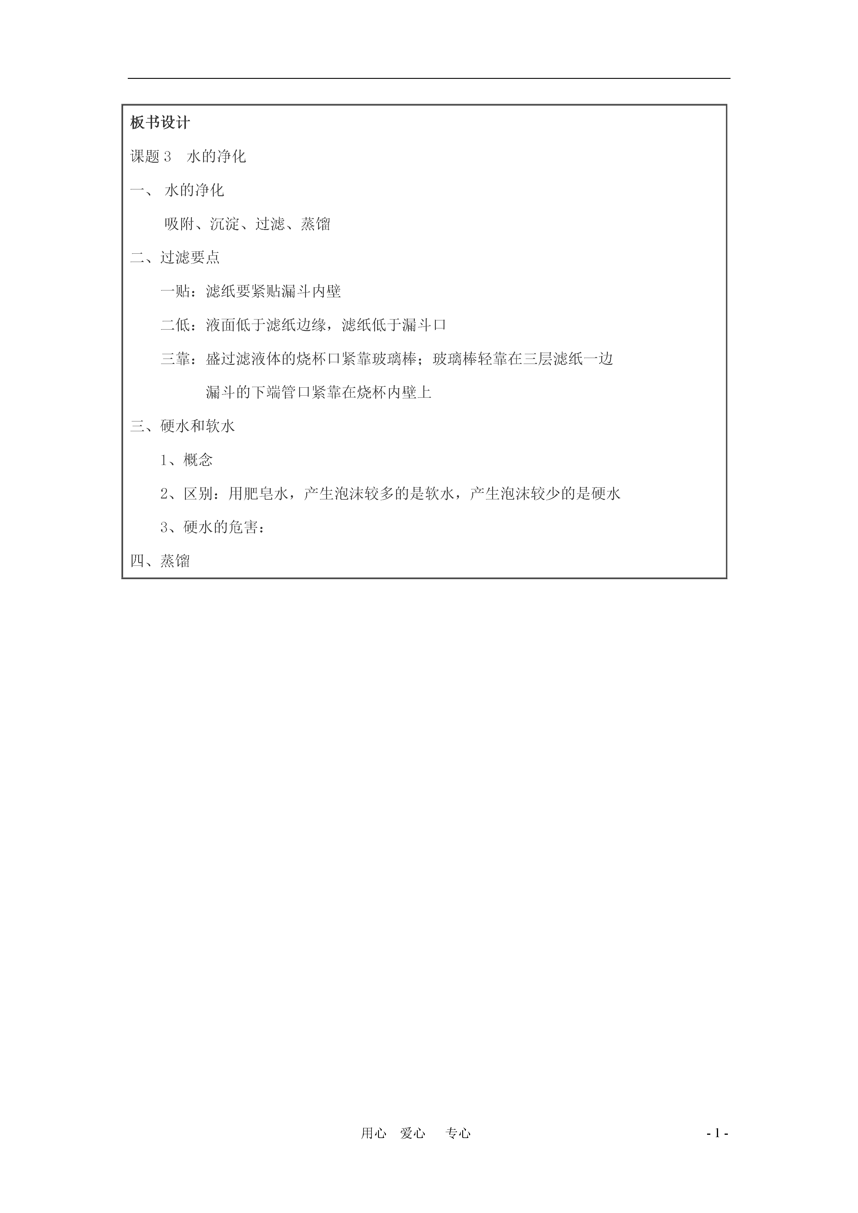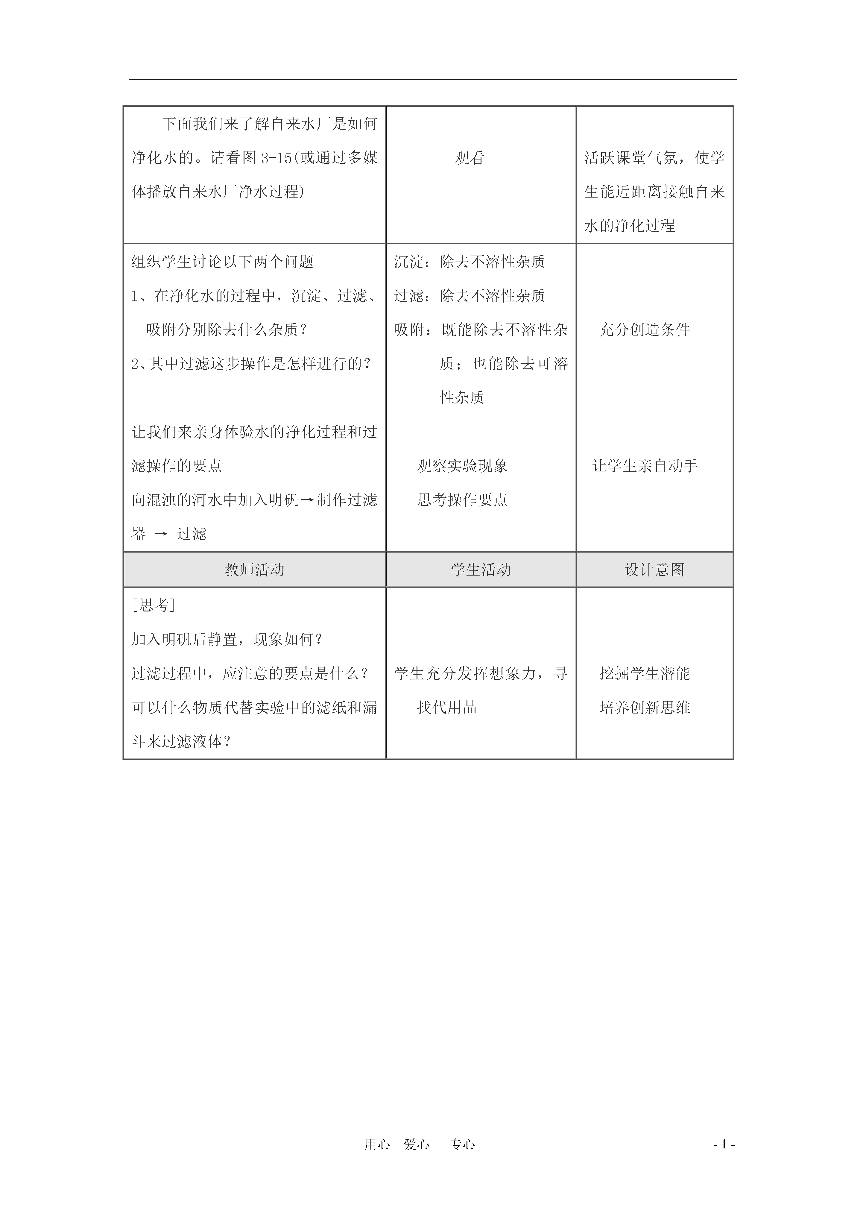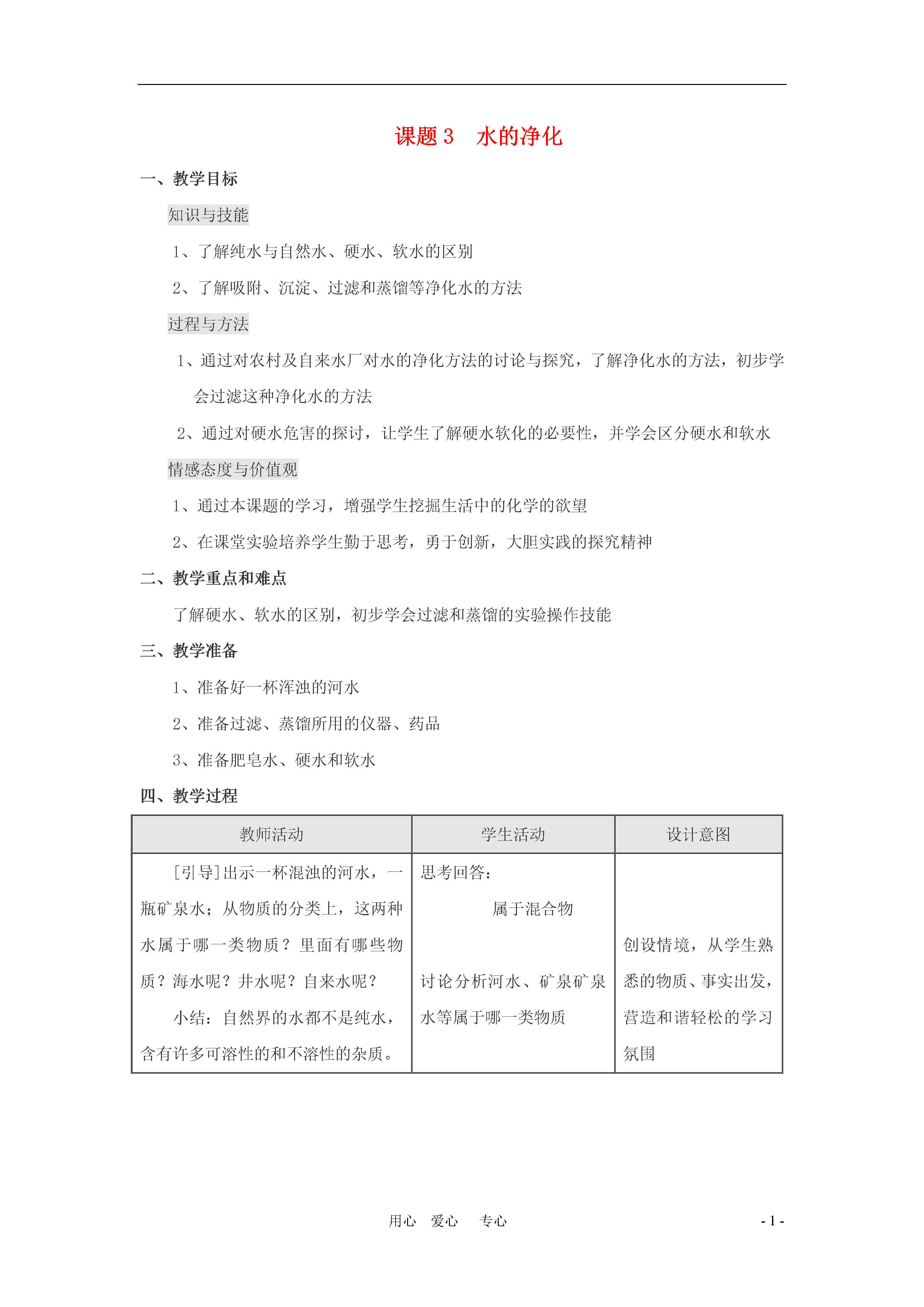 -1-用心爱心专心课题3水的净化一、教学目标知识与技能1、了解纯水与自然水、硬水、软水的区别2、了解吸附、沉淀、过滤和蒸馏等净化水的方法过程与方法1、通过对农村及自来水厂对水的净化方法的讨论与探究,了解净化水的方法,初步学会过滤这种净化水的方法2、通过对硬水危害的探讨,让学生了解硬水软化的必要性,并学会区分硬水和软水情感态度与价值观1、通过本课题的学习,增强学生挖掘生活中的化学的欲望2、在课堂实验培养学生勤于思考,勇于创新,大胆实践的探究精神二、教学重点和难点了解硬水、软水的区别,初步学会过滤和蒸馏的实验操作技能三、教学准备1、准备好一杯浑浊的河水2、准备过滤、蒸馏所用的仪器、药品3、准备肥皂水、硬水和软水四、教学过程教师活动学生活动设计意图[引导]出示一杯混浊的河水,一瓶矿泉水;从物质的分类上,这两种水属于哪一类物质?里面有哪些物质?海水呢?井水呢?自来水呢?小结:自然界的水都不是纯水,含有许多可溶性的和不溶性的杂质。思考回答:属于混合物讨论分析河水、矿泉矿泉水等属于哪一类物质创设情境,从学生熟悉的物质、事实出发,营造和谐轻松的学习氛围下面我们来了解自来水厂是如何净化水的。请看图3-15(或通过多媒体播放自来水厂净水过程)观看活跃课堂气氛,使学生能近距离接触自来水的净化过程组织学生讨论以下两个问题1、在净化水的过程中,沉淀、过滤、吸附分别除去什么杂质?2、其中过滤这步操作是怎样进行的?让我们来亲身体验水的净化过程和过滤操作的要点向混浊的河水中加入明矾→制作过滤器→过滤沉淀:除去不溶性杂质过滤:除去不溶性杂质吸附:既能除去不溶性杂质;也能除去可溶性杂质观察实验现象思考操作要点充分创造条件让学生亲自动手教师活动学生活动设计意图[思考]加入明矾后静置,现象如何?过滤过程中,应注意的要点是什么?可以什么物质代替实验中的滤纸和漏斗来过滤液体?学生充分发挥想象力,寻找代用品挖掘学生潜能培养创新思维[过渡]经过上述净化后的水看上去比较澄清了,那么这水是纯净物吗?出示热水瓶中的水垢[引入]硬水、软水的概念硬水和软水如何来区分呢?请阅读课本54页相关内容小结:检验硬水和软水:用肥皂水,产生泡沫较多的是软水,不易产生泡沫的硬水。[讲述]硬水的危害引起思考思考:水垢形成的原因,了解硬水和软水的特点。根据生活经验提出各种方案,如可以把水煮沸,洗衣服看泡沫多少等了解硬水危害从生活实际出发,让学生树立生活中处处有化学的观念培养学生从生活中挖掘化学问题的探究欲望[引入]我们知道自然界中的水含有很多杂质,那么怎样得到净化程度较高的水呢?[讲述]蒸馏的实验操作它不仅可以除去不溶性的杂质,也可以除去可溶性的杂质制取蒸馏水,所以蒸馏水是纯净物小结:净化水的方法有:吸附、沉淀、过滤、蒸馏等了解蒸馏的实验操作学会实验室制取蒸馏水的方法设疑引入新知识知识巩固板书设计课题3水的净化水的净化吸附、沉淀、过滤、蒸馏二、过滤要点一贴:滤纸要紧贴漏斗内壁二低:液面低于滤纸边缘,滤纸低于漏斗口三靠:盛过滤液体的烧杯口紧靠玻璃棒;玻璃棒轻靠在三层滤纸一边漏斗的下端管口紧靠在烧杯内壁上三、硬水和软水1、概念2、区别:用肥皂水,产生泡沫较多的是软水,产生泡沫较少的是硬水3、硬水的危害:四、蒸馏