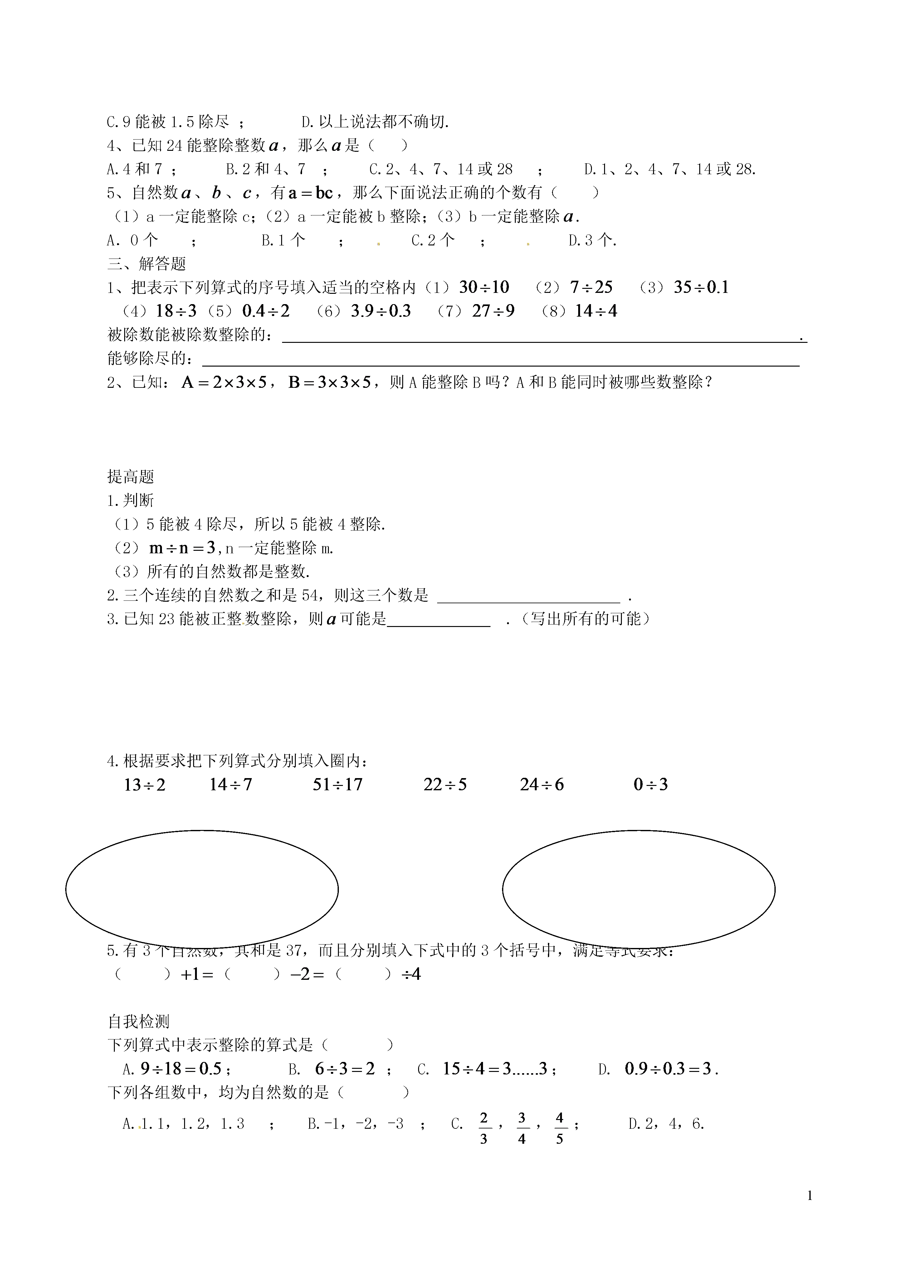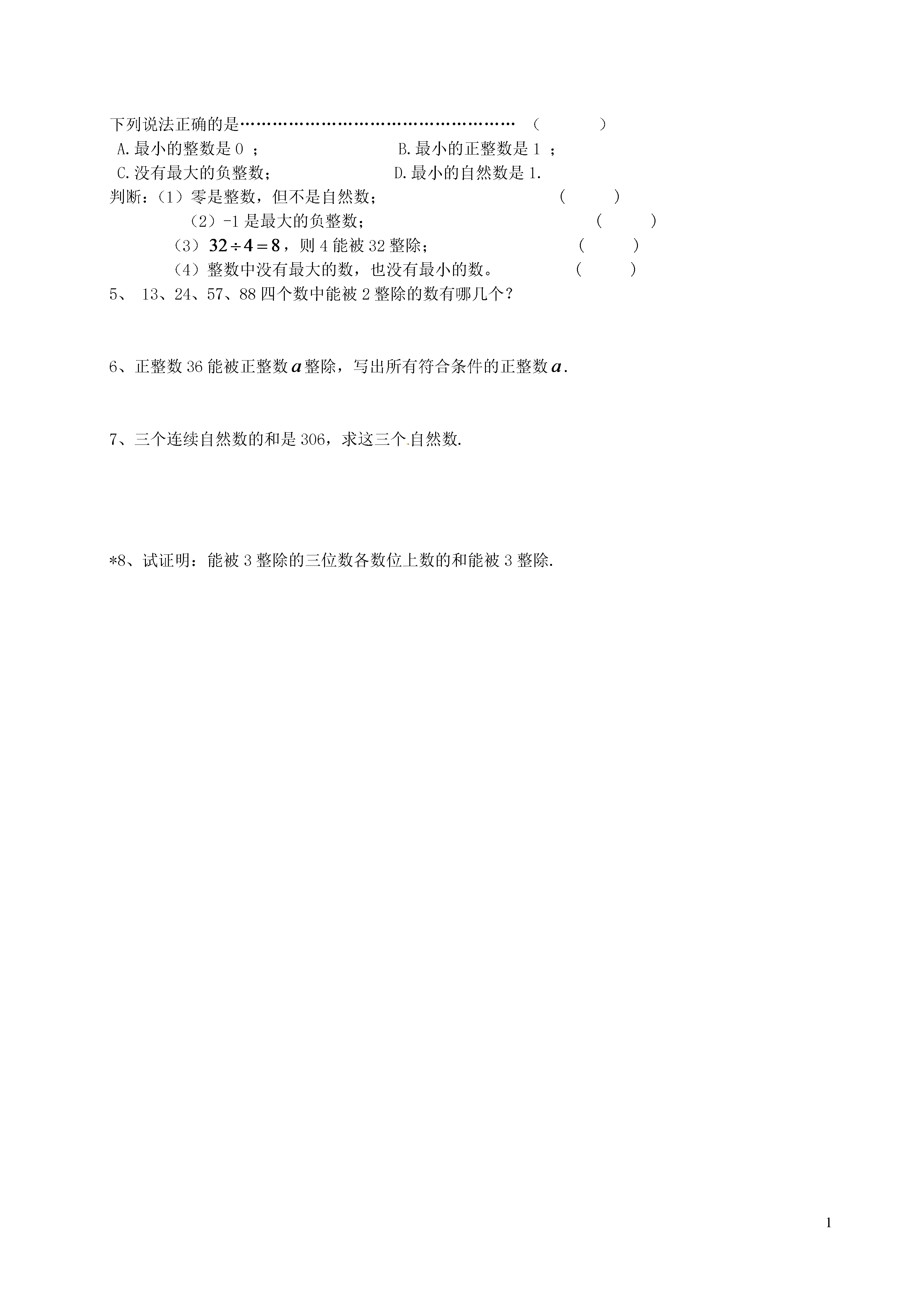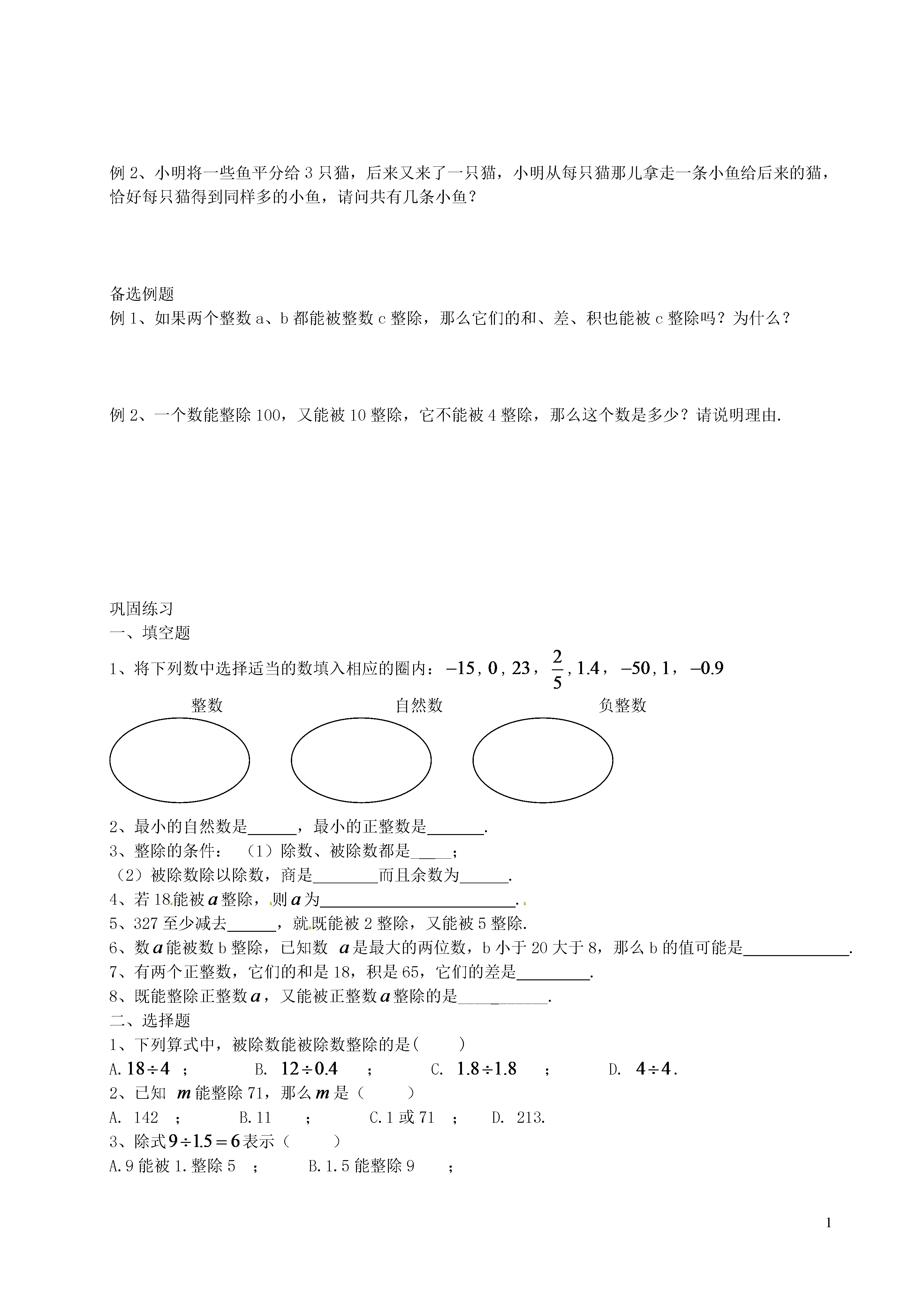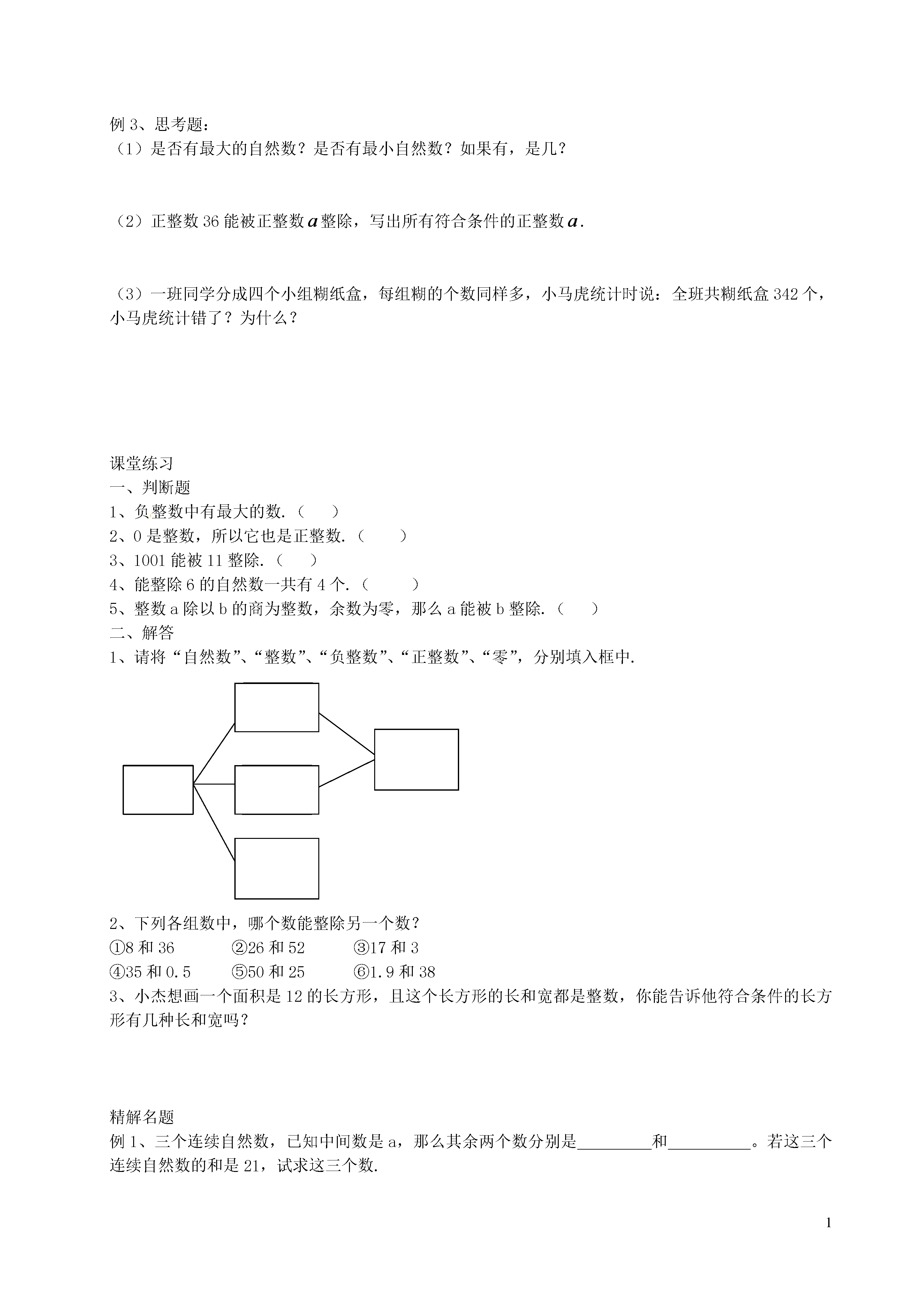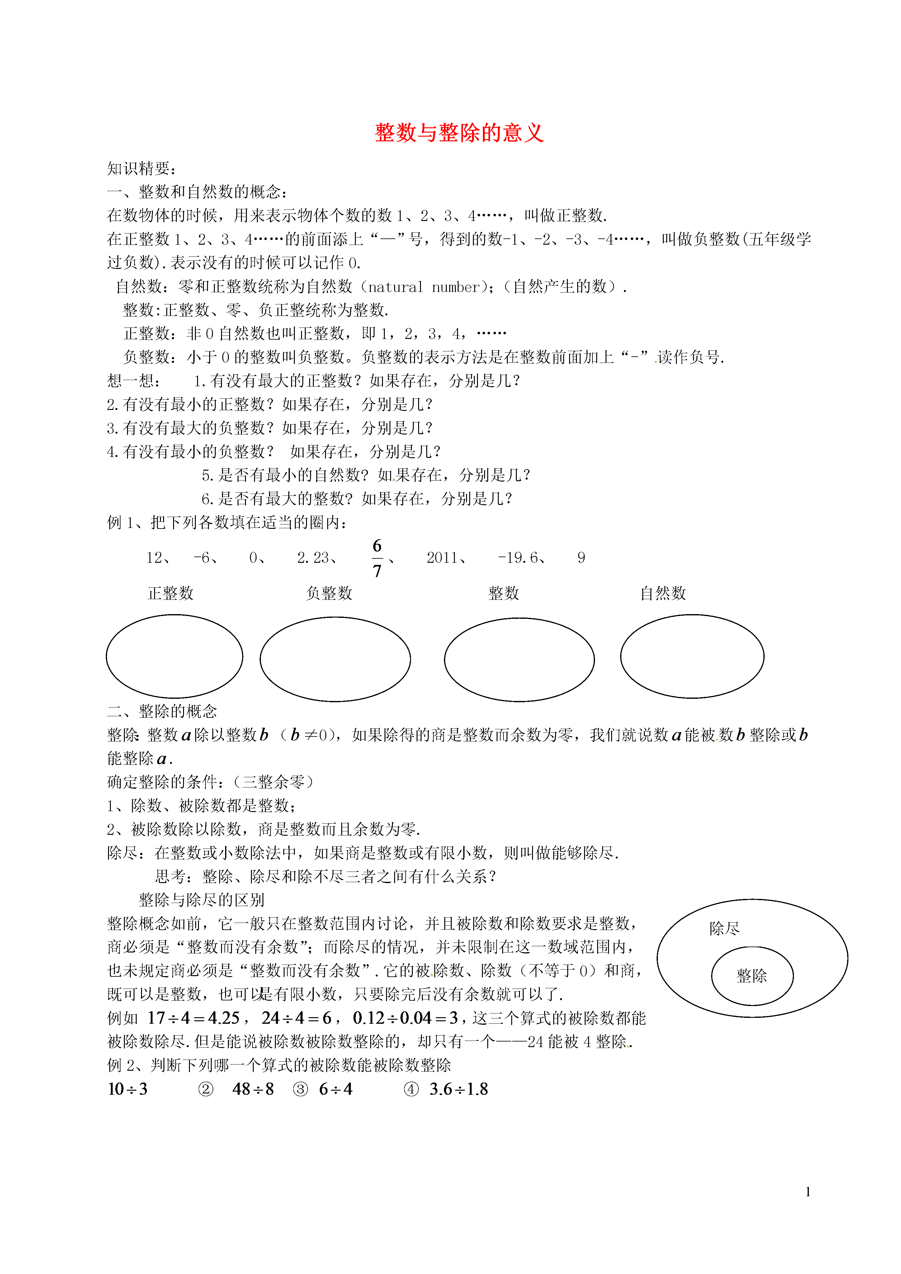 1整数与整除的意义知识精要:一、整数和自然数的概念:在数物体的时候,用来表示物体个数的数1、2、3、4……,叫做正整数.在正整数1、2、3、4……的前面添上“—”号,得到的数-1、-2、-3、-4……,叫做负整数(五年级学过负数).表示没有的时候可以记作0.自然数:零和正整数统称为自然数(naturalnumber);(自然产生的数).整数:正整数、零、负正整统称为整数.正整数:非0自然数也叫正整数,即1,2,3,4,……负整数:小于0的整数叫负整数。负整数的表示方法是在整数前面加上“-”读作负号.想一想:1.有没有最大的正整数?如果存在,分别是几?2.有没有最小的正整数?如果存在,分别是几?3.有没有最大的负整数?如果存在,分别是几?4.有没有最小的负整数?如果存在,分别是几?5.是否有最小的自然数?如果存在,分别是几?6.是否有最大的整数?如果存在,分别是几?例1、把下列各数填在适当的圈内:12、-6、0、2.23、、2011、-19.6、9正整数负整数整数自然数二、整除的概念整除:整数除以整数(≠0),如果除得的商是整数而余数为零,我们就说数能被数整除或能整除.确定整除的条件:(三整余零)1、除数、被除数都是整数;2、被除数除以除数,商是整数而且余数为零.除尽:在整数或小数除法中,如果商是整数或有限小数,则叫做能够除尽.思考:整除、除尽和除不尽三者之间有什么关系?整除与除尽的区别整除除尽整除概念如前,它一般只在整数范围内讨论,并且被除数和除数要求是整数,商必须是“整数而没有余数”;而除尽的情况,并未限制在这一数域范围内,也未规定商必须是“整数而没有余数”.它的被除数、除数(不等于0)和商,既可以是整数,也可以是有限小数,只要除完后没有余数就可以了.例如,,,这三个算式的被除数都能被除数除尽.但是能说被除数被除数整除的,却只有一个——24能被4整除.例2、判断下列哪一个算式的被除数能被除数整除②③④例3、思考题:(1)是否有最大的自然数?是否有最小自然数?如果有,是几?(2)正整数36能被正整数整除,写出所有符合条件的正整数.(3)一班同学分成四个小组糊纸盒,每组糊的个数同样多,小马虎统计时说:全班共糊纸盒342个,小马虎统计错了?为什么?课堂练习一、判断题1、负整数中有最大的数.()2、0是整数,所以它也是正整数.()3、1001能被11整除.()4、能整除6的自然数一共有4个.()5、整数a除以b的商为整数,余数为零,那么a能被b整除.()二、解答1、请将“自然数”、“整数”、“负整数”、“正整数”、“零”,分别填入框中.2、下列各组数中,哪个数能整除另一个数?①8和36②26和52③17和3④35和0.5⑤50和25⑥1.9和383、小杰想画一个面积是12的长方形,且这个长方形的长和宽都是整数,你能告诉他符合条件的长方形有几种长和宽吗?精解名题例1、三个连续自然数,已知中间数是a,那么其余两个数分别是和。若这三个连续自然数的和是21,试求这三个数.例2、小明将一些鱼平分给3只猫,后来又来了一只猫,小明从每只猫那儿拿走一条小鱼给后来的猫,恰好每只猫得到同样多的小鱼,请问共有几条小鱼?备选例题例1、如果两个整数a、b都能被整数c整除,那么它们的和、差、积也能被c整除吗?为什么?例2、一个数能整除100,又能被10整除,它不能被4整除,那么这个数是多少?请说明理由.巩固练习一、填空题1、将下列数中选择适当的数填入相应的圈内:,,,,,,,整数自然数负整数2、最小的自然数是,最小的正整数是.3、整除的条件:(1)除数、被除数都是_____;(2)被除数除以除数,商是而且余数为.4、若18能被整除,则为.5、327至少减去,就既能被2整除,又能被5整除.6、数能被数b整除,已知数是最大的两位数,b小于20大于8,那么b的值可能是.7、有两个正整数,它们的和是18,积是65,它们的差是.8、既能整除正整数,又能被正整数整除的是___________.二、选择题1、下列算式中,被除数能被除数整除的是()A.;B.;C.;D..2、已知能整除71,那么是()A.142;B.11;C.1或71;D.213.3、除式表示()A.9能被1.整除5;B.1.5能整除9;C.9能被1.5除尽;D.以上说法都不确切.4、已知24能整除整数,那么是()A.4和7;B.2和4、7;C.2、4、7、14或28;D.1、2、4、7、14或28.5、自然数、、,有,那么下面说法正确的个数有()(1)a
