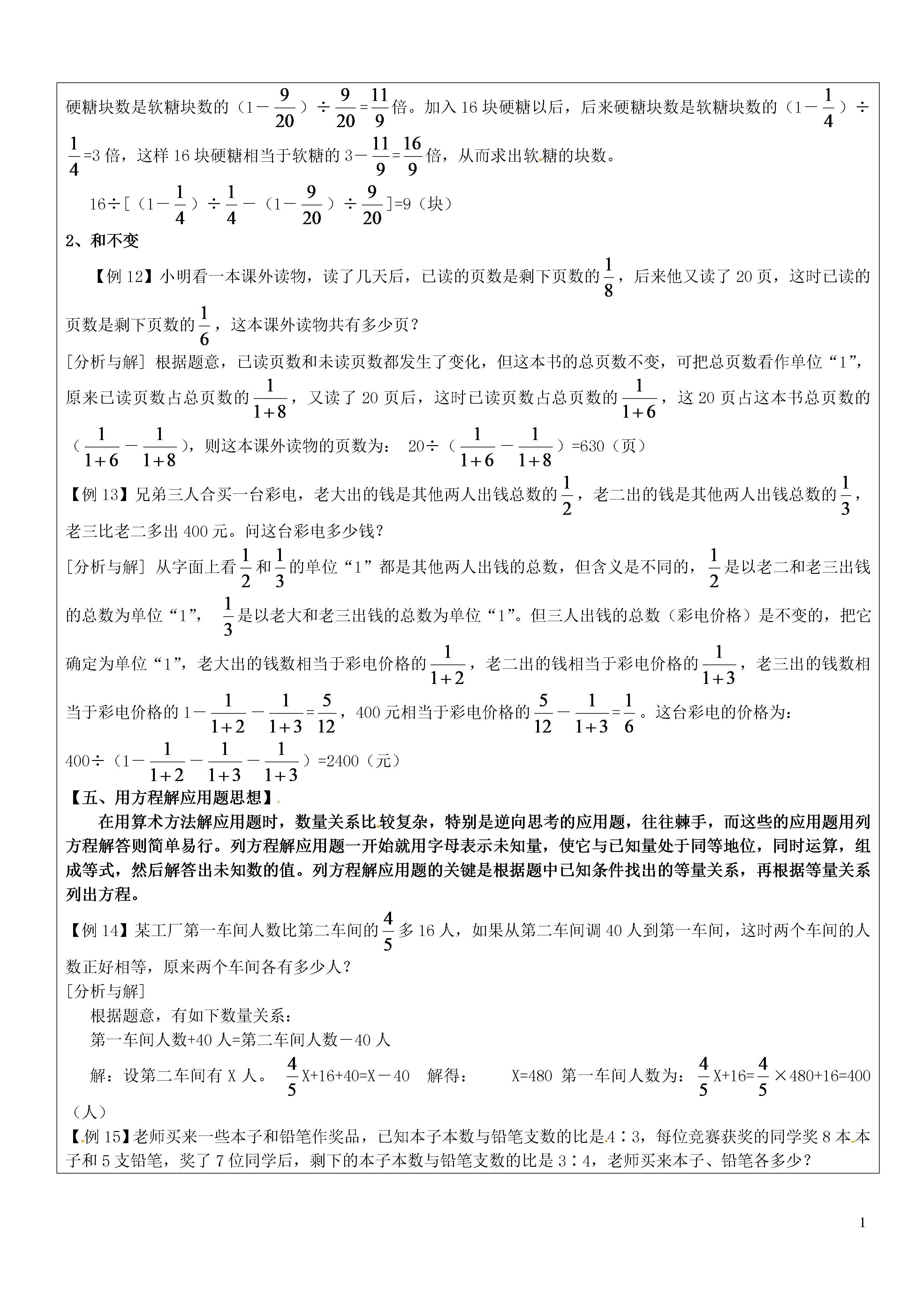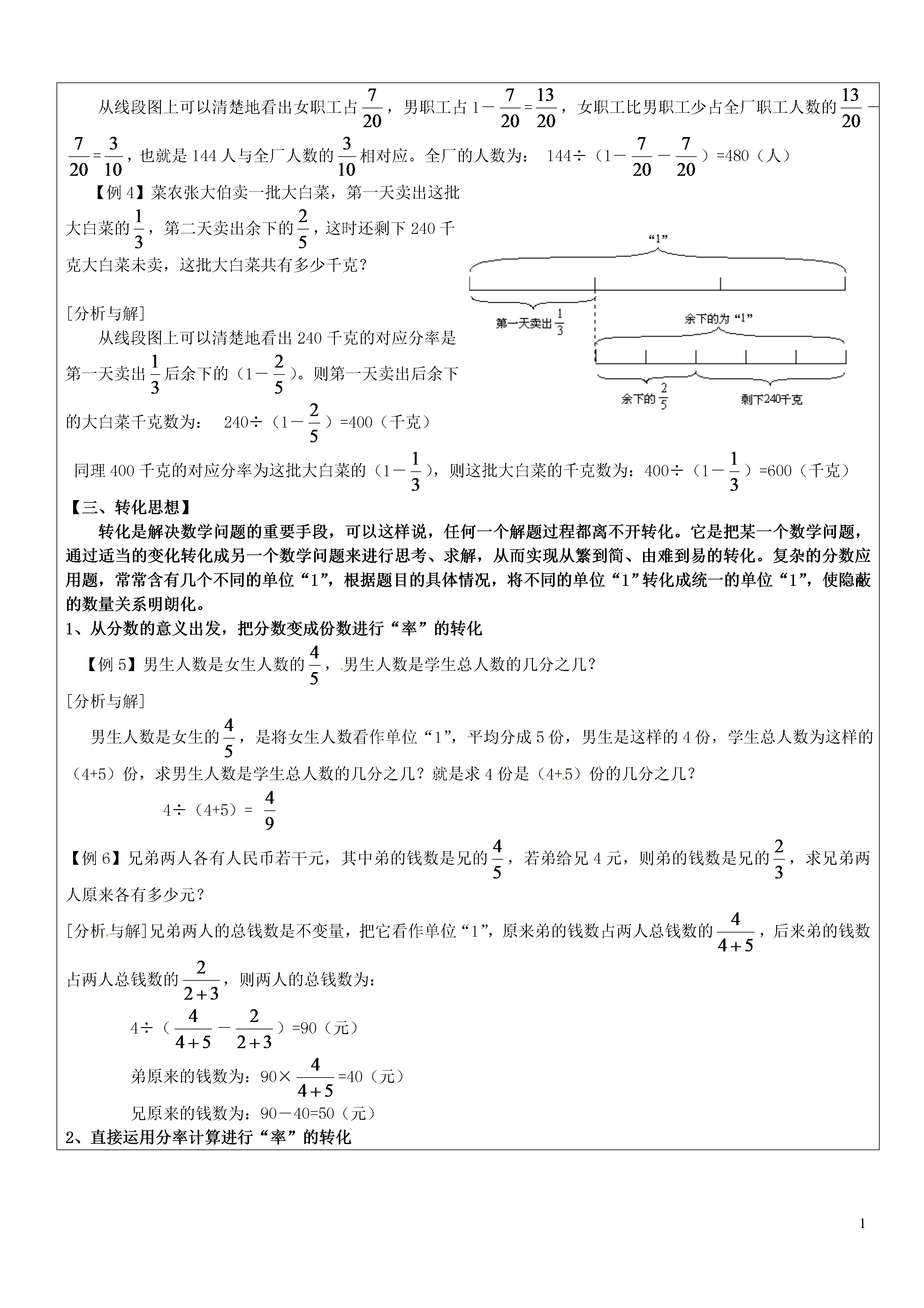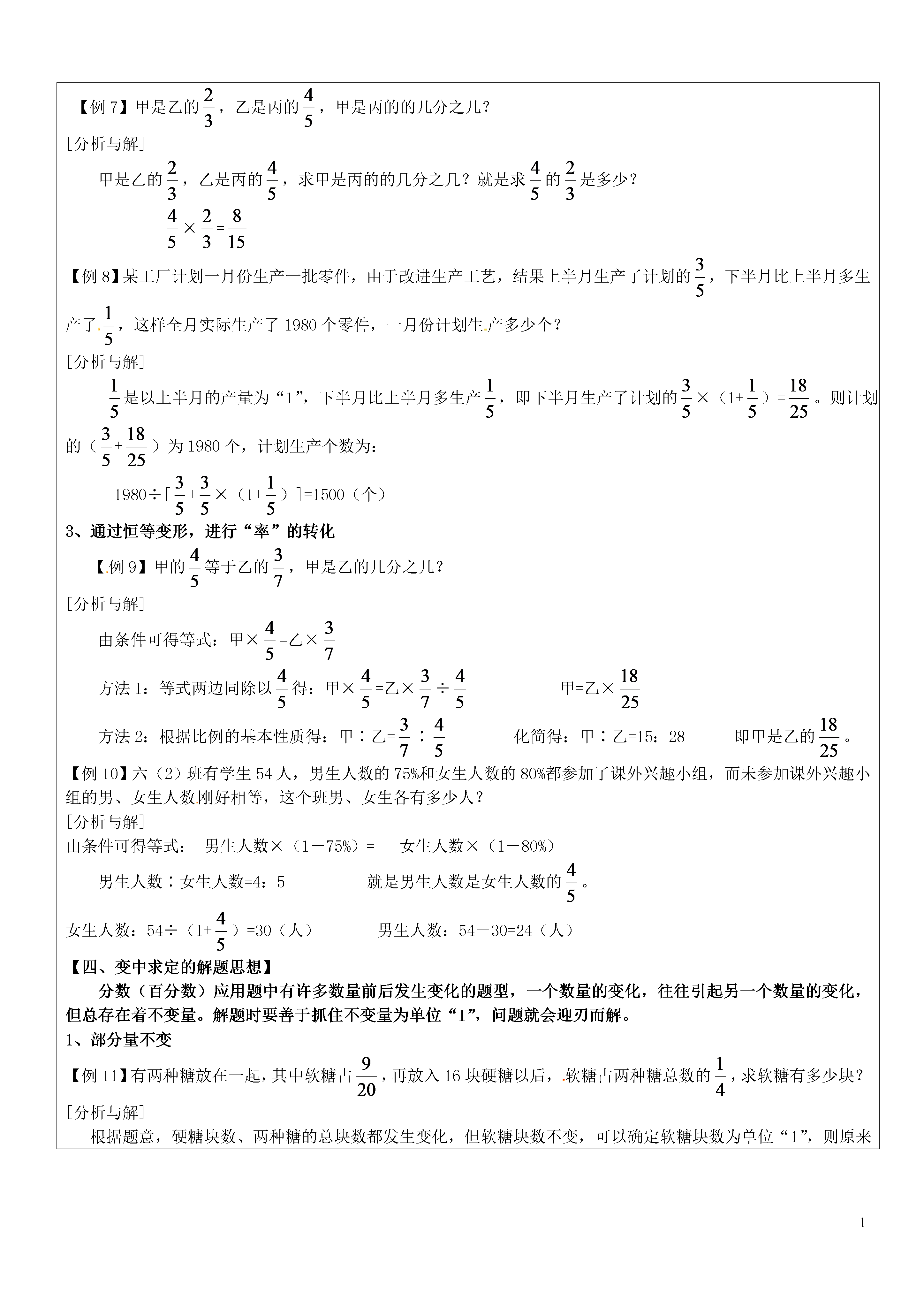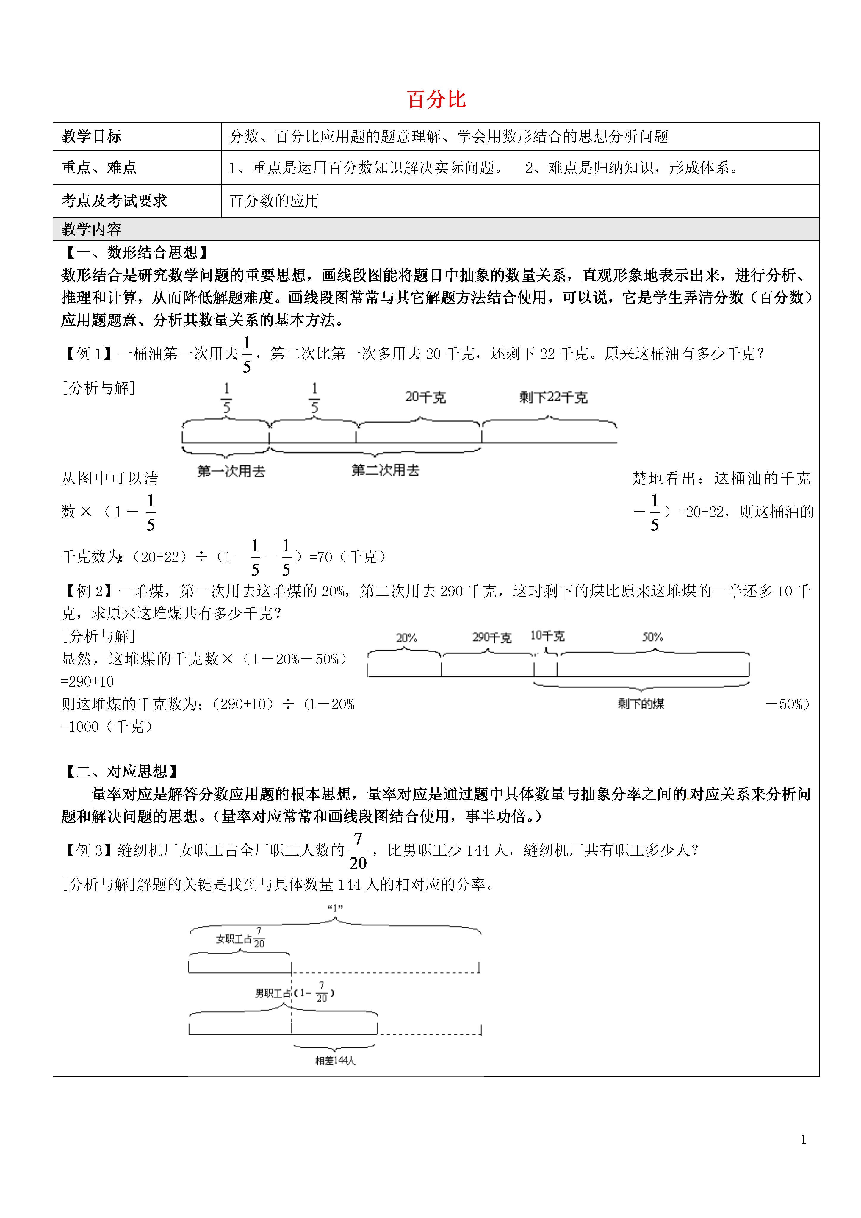 1百分比教学目标分数、百分比应用题的题意理解、学会用数形结合的思想分析问题重点、难点1、重点是运用百分数知识解决实际问题。2、难点是归纳知识,形成体系。考点及考试要求百分数的应用教学内容【一、数形结合思想】数形结合是研究数学问题的重要思想,画线段图能将题目中抽象的数量关系,直观形象地表示出来,进行分析、推理和计算,从而降低解题难度。画线段图常常与其它解题方法结合使用,可以说,它是学生弄清分数(百分数)应用题题意、分析其数量关系的基本方法。【例1】一桶油第一次用去,第二次比第一次多用去20千克,还剩下22千克。原来这桶油有多少千克?[分析与解]从图中可以清楚地看出:这桶油的千克数×(1--)=20+22,则这桶油的千克数为:(20+22)÷(1--)=70(千克)【例2】一堆煤,第一次用去这堆煤的20%,第二次用去290千克,这时剩下的煤比原来这堆煤的一半还多10千克,求原来这堆煤共有多少千克?[分析与解]显然,这堆煤的千克数×(1-20%-50%)=290+10则这堆煤的千克数为:(290+10)÷(1-20%-50%)=1000(千克)【二、对应思想】量率对应是解答分数应用题的根本思想,量率对应是通过题中具体数量与抽象分率之间的对应关系来分析问题和解决问题的思想。(量率对应常常和画线段图结合使用,事半功倍。)【例3】缝纫机厂女职工占全厂职工人数的,比男职工少144人,缝纫机厂共有职工多少人?[分析与解]解题的关键是找到与具体数量144人的相对应的分率。从线段图上可以清楚地看出女职工占,男职工占1-=,女职工比男职工少占全厂职工人数的-=,也就是144人与全厂人数的相对应。全厂的人数为:144÷(1--)=480(人)【例4】菜农张大伯卖一批大白菜,第一天卖出这批大白菜的,第二天卖出余下的,这时还剩下240千克大白菜未卖,这批大白菜共有多少千克?[分析与解]从线段图上可以清楚地看出240千克的对应分率是第一天卖出后余下的(1-)。则第一天卖出后余下的大白菜千克数为:240÷(1-)=400(千克)同理400千克的对应分率为这批大白菜的(1-),则这批大白菜的千克数为:400÷(1-)=600(千克)【三、转化思想】转化是解决数学问题的重要手段,可以这样说,任何一个解题过程都离不开转化。它是把某一个数学问题,通过适当的变化转化成另一个数学问题来进行思考、求解,从而实现从繁到简、由难到易的转化。复杂的分数应用题,常常含有几个不同的单位“1”,根据题目的具体情况,将不同的单位“1”转化成统一的单位“1”,使隐蔽的数量关系明朗化。1、从分数的意义出发,把分数变成份数进行“率”的转化【例5】男生人数是女生人数的,男生人数是学生总人数的几分之几?[分析与解]男生人数是女生的,是将女生人数看作单位“1”,平均分成5份,男生是这样的4份,学生总人数为这样的(4+5)份,求男生人数是学生总人数的几分之几?就是求4份是(4+5)份的几分之几?4÷(4+5)=【例6】兄弟两人各有人民币若干元,其中弟的钱数是兄的,若弟给兄4元,则弟的钱数是兄的,求兄弟两人原来各有多少元?[分析与解]兄弟两人的总钱数是不变量,把它看作单位“1”,原来弟的钱数占两人总钱数的,后来弟的钱数占两人总钱数的,则两人的总钱数为:4÷(-)=90(元)弟原来的钱数为:90×=40(元)兄原来的钱数为:90-40=50(元)2、直接运用分率计算进行“率”的转化【例7】甲是乙的,乙是丙的,甲是丙的的几分之几?[分析与解]甲是乙的,乙是丙的,求甲是丙的的几分之几?就是求的是多少?×=【例8】某工厂计划一月份生产一批零件,由于改进生产工艺,结果上半月生产了计划的,下半月比上半月多生产了,这样全月实际生产了1980个零件,一月份计划生产多少个?[分析与解]是以上半月的产量为“1”,下半月比上半月多生产,即下半月生产了计划的×(1+)=。则计划的(+)为1980个,计划生产个数为:1980÷[+×(1+)]=1500(个)3、通过恒等变形,进行“率”的转化【例9】甲的等于乙的,甲是乙的几分之几?[分析与解]由条件可得等式:甲×=乙×方法1:等式两边同除以得:甲×=乙×÷甲=乙×方法2:根据比例的基本性质得:甲∶乙=∶化简得:甲∶乙=15:28即甲是乙的。【例10】六(2)班有学生54人,男生人数的75%和女生人数的80%都参加了课外兴趣小组,而未参加课外兴趣小组的男、女生人数刚好相等,这个班男、女生各有多少人?[分析与解]由条件可得等式:男生人数×(1-75%)=女生人数×(1-80%)男生人数∶女生人数=4:5就是男生人数是女生人数的。女生人数:5