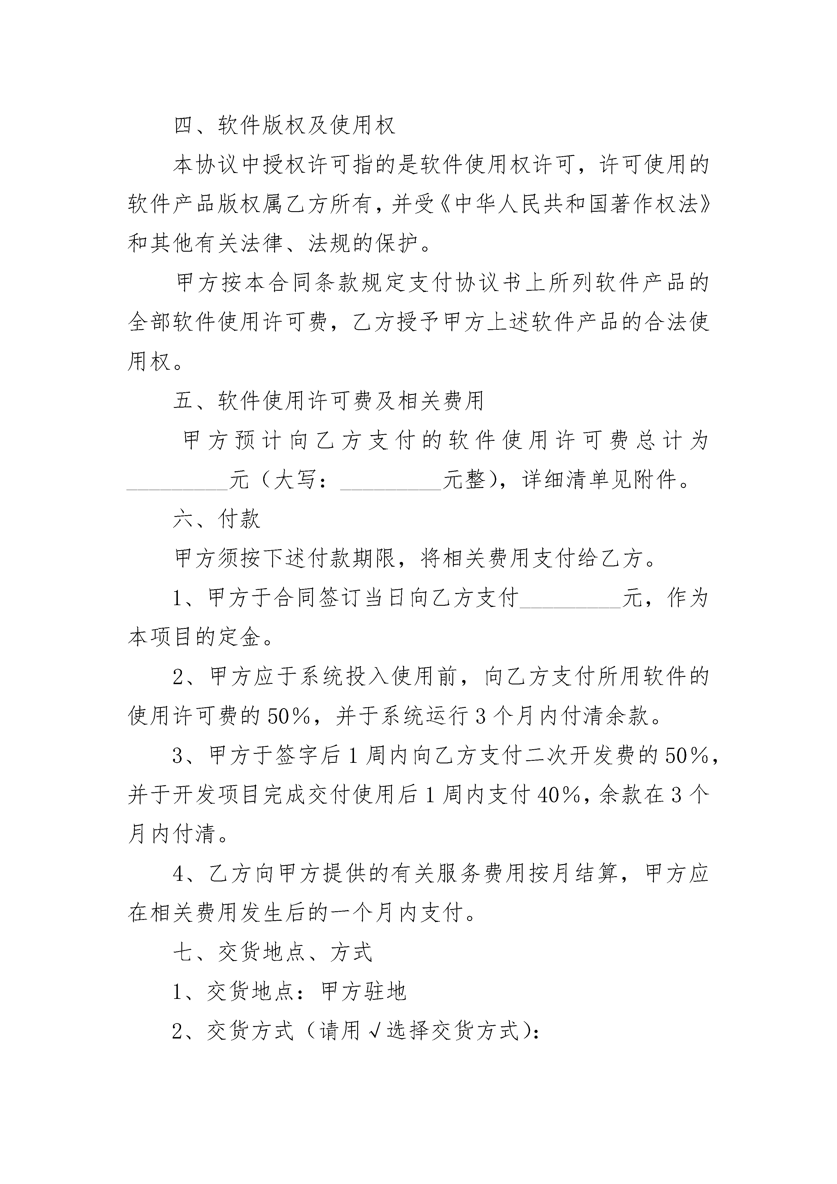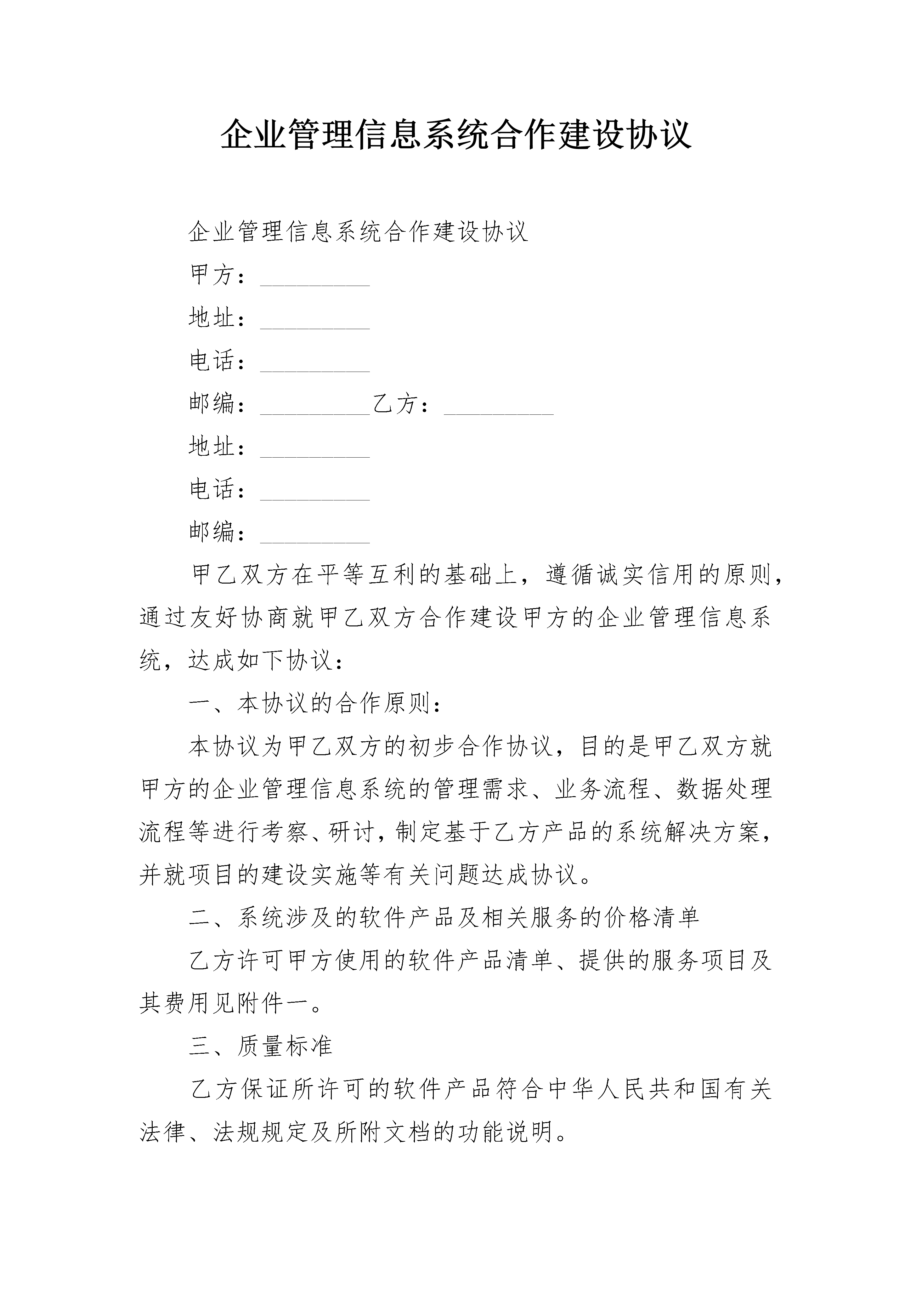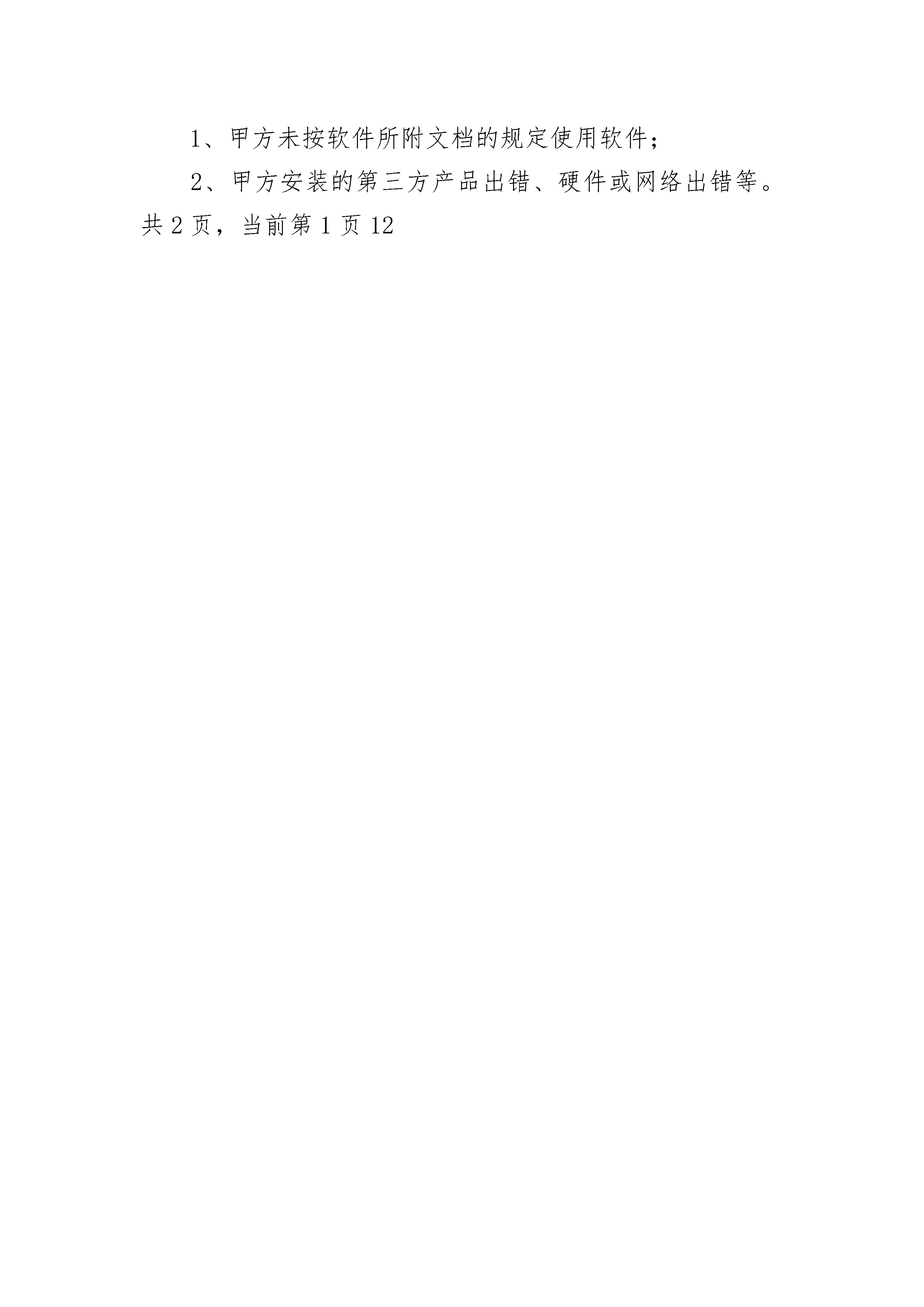 企业管理信息系统合作建设协议企业管理信息系统合作建设协议甲方:_________地址:_________电话:_________邮编:_________乙方:_________地址:_________电话:_________邮编:_________甲乙双方在平等互利的基础上,遵循诚实信用的原则,通过友好协商就甲乙双方合作建设甲方的企业管理信息系统,达成如下协议:一、本协议的合作原则:本协议为甲乙双方的初步合作协议,目的是甲乙双方就甲方的企业管理信息系统的管理需求、业务流程、数据处理流程等进行考察、研讨,制定基于乙方产品的系统解决方案,并就项目的建设实施等有关问题达成协议。二、系统涉及的软件产品及相关服务的价格清单乙方许可甲方使用的软件产品清单、提供的服务项目及其费用见附件一。三、质量标准乙方保证所许可的软件产品符合中华人民共和国有关法律、法规规定及所附文档的功能说明。四、软件版权及使用权本协议中授权许可指的是软件使用权许可,许可使用的软件产品版权属乙方所有,并受《中华人民共和国著作权法》和其他有关法律、法规的保护。甲方按本合同条款规定支付协议书上所列软件产品的全部软件使用许可费,乙方授予甲方上述软件产品的合法使用权。五、软件使用许可费及相关费用甲方预计向乙方支付的软件使用许可费总计为_________元(大写:_________元整),详细清单见附件。六、付款甲方须按下述付款期限,将相关费用支付给乙方。1、甲方于合同签订当日向乙方支付_________元,作为本项目的定金。2、甲方应于系统投入使用前,向乙方支付所用软件的使用许可费的50%,并于系统运行3个月内付清余款。3、甲方于签字后1周内向乙方支付二次开发费的50%,并于开发项目完成交付使用后1周内支付40%,余款在3个月内付清。4、乙方向甲方提供的有关服务费用按月结算,甲方应在相关费用发生后的一个月内支付。七、交货地点、方式1、交货地点:甲方驻地2、交货方式(请用√选择交货方式):□乙方上门安装;□甲方自提;□邮寄。八、限制规定1、乙方许可甲方使用的软件产品,只限于甲方本身使用,未经乙方书面同意,甲方不得将协议项下的权利或信息转让给任何一方,包括甲方的关联公司。2、未经乙方书面授权,甲方不得将乙方授予的软件使用权进行出租、销售、转让或非存档目的的拷贝及其他商业用途。3、未经乙方书面授权,甲方不得对乙方的软件产品进行修改、反编译、反汇编或其他任何反向工程。九、服务1、甲、乙双方在本协议的附件中未明确的有关服务的内容、要求和费用,视同甲方放弃要求乙方为其提供相关服务。如甲方提出新的要求,双方应另行协商,并签订相关补充协议。2、乙方按甲方要求提供服务后,有权按服务内容和收费标准收取相应的费用。3、甲方已付清上月服务费用后,乙方有义务满足甲方新的合理服务要求。十、软件保证及保证范围乙方保证所许可使用的软件产品,符合所附文档的功能说明。下述原因引发的软件问题不在本保证的范围内:1、甲方未按软件所附文档的规定使用软件;2、甲方安装的第三方产品出错、硬件或网络出错等。,当前12