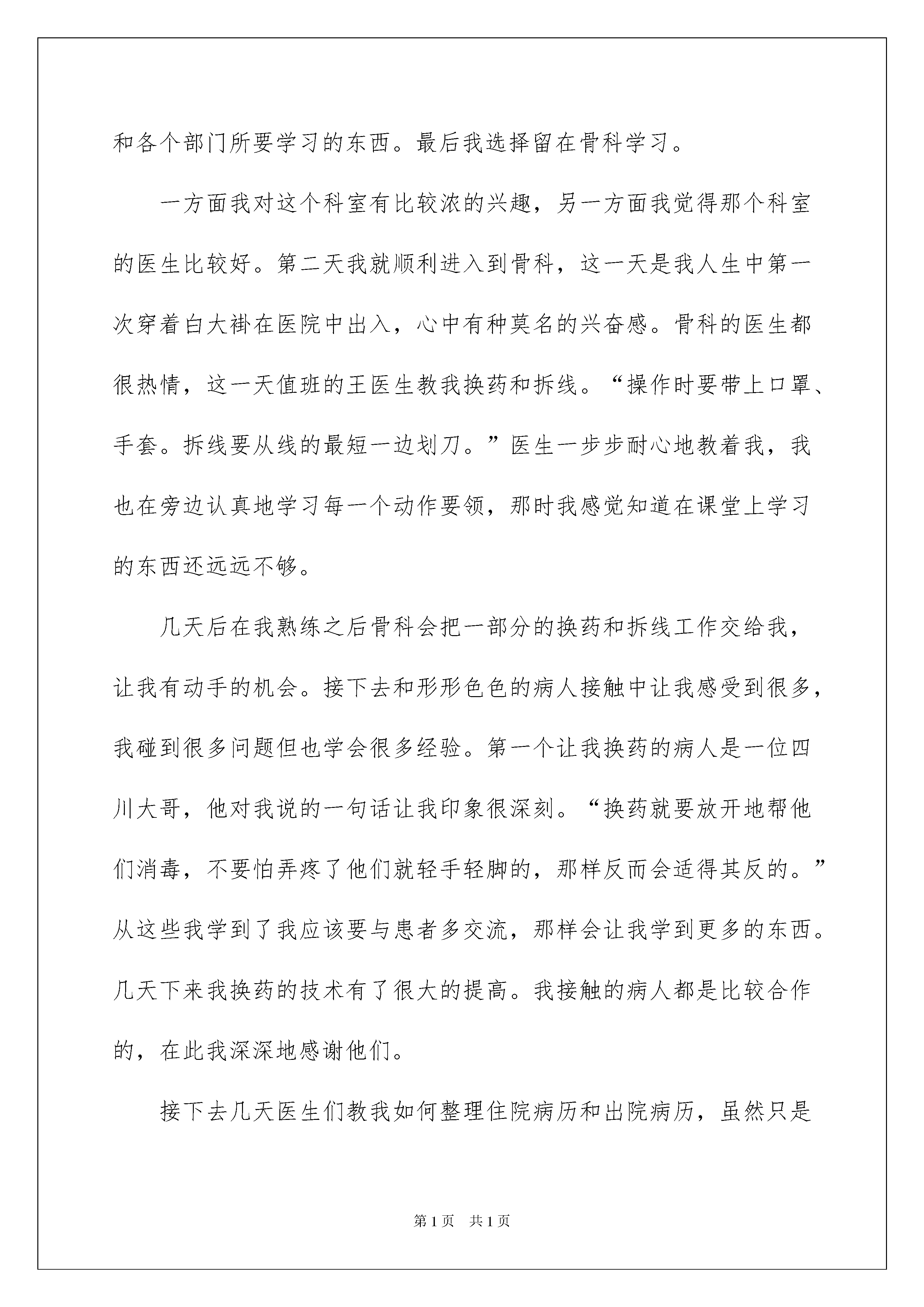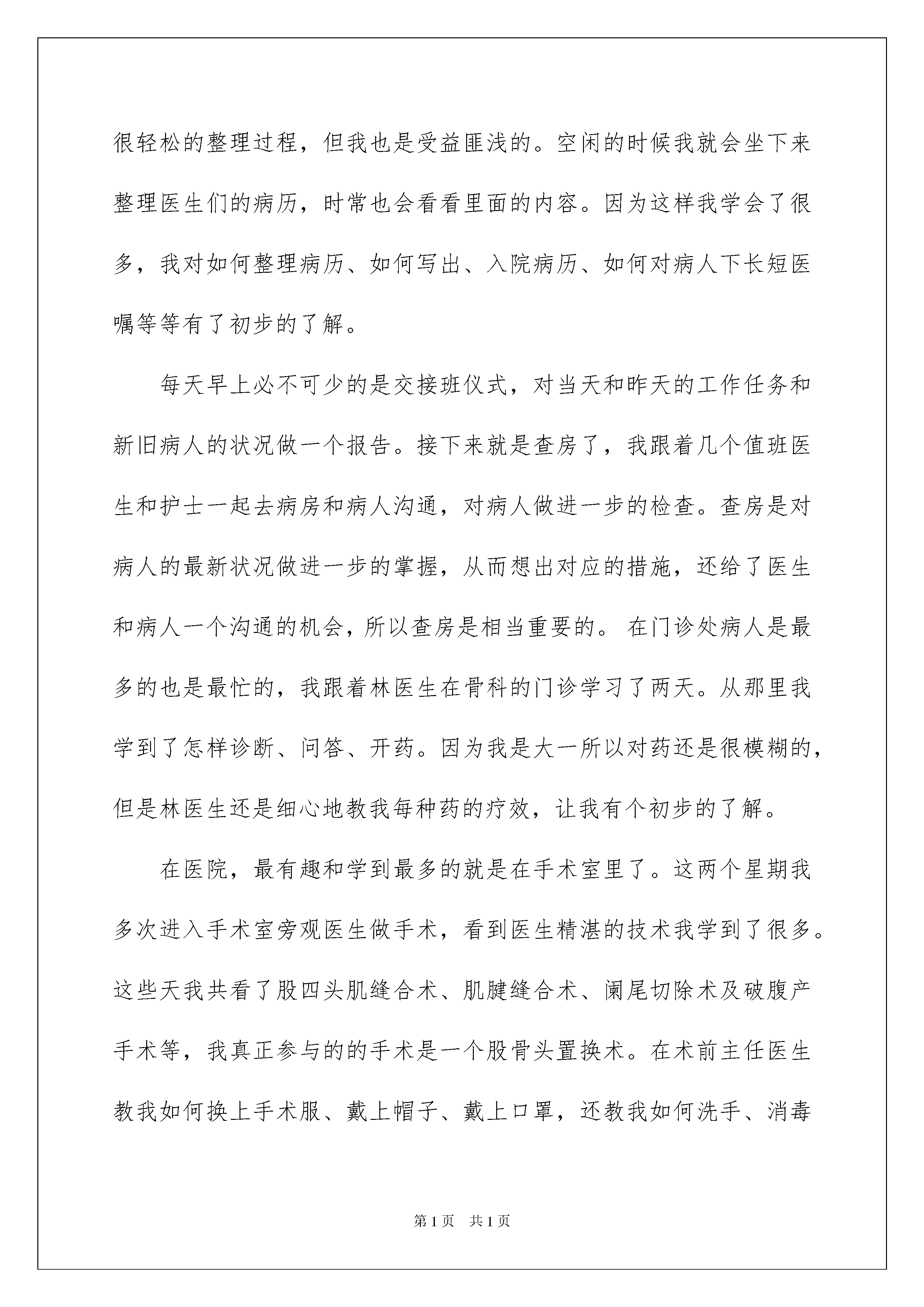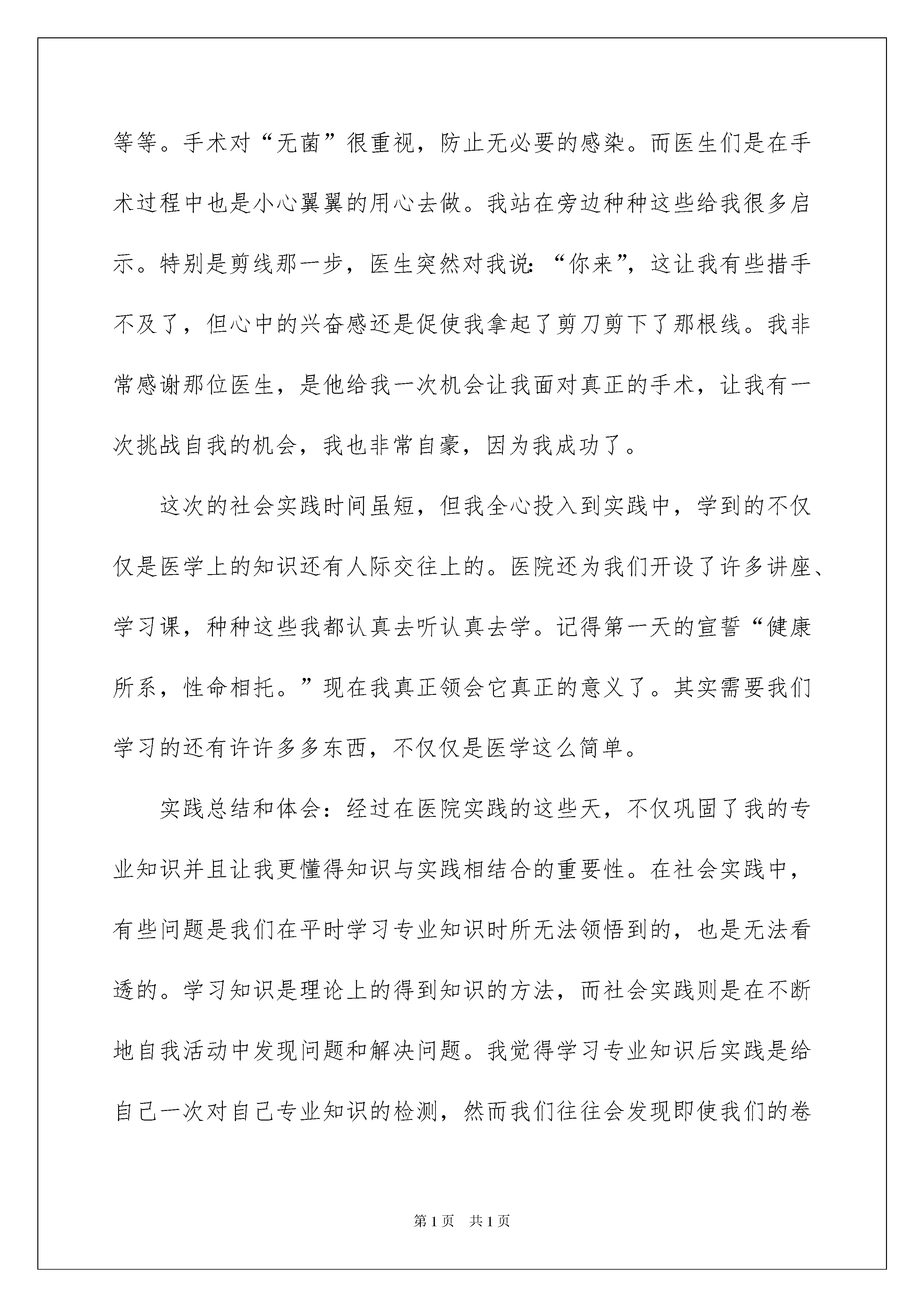 2022大学生假期社会实践报告大学生假期社会实践报告随着人们自身素质提升,报告使用的次数愈发增长,我们在写报告的时候要注意逻辑的合理性。相信许多人会觉得报告很难写吧,下面是我精心整理的大学生假期社会实践报告,仅供参考,大家一起来看看吧。大学生假期社会实践报告1学院:基础学院专业:临床医学班级:xxx姓名:xxx学号:xxxx实践单位:温州市苍南县第三人民医院实践时间:xx年x月x日至xx年x月x日共15天实践目的:我是一名医学生,我觉得暑期能去医院社会实践是一个很好的机会锻炼我们。社会实践是每一位大学生必须拥有的一段经历,它使我们在实践中巩固知识,社会实践又是对每一位大学生知识的一种检验,它让我们学到了很多在课堂上根本学不到的知识,开阔了视野,又增长了见识,为我们以后进一步走向社会打下坚实基础,也是我们走向工作岗位的第一步。通过社会实践我们能对我们的专业做初步的了解,为我们以后的学习方向奠定一个基础,让自己对以后的就业前景更有信心。因为地理比较近、经人介绍等原因我选择去温州市苍南县第三人民医院参加社会实践。据了解苍南县第三人民医院(江南医院)创建于1959年,历史悠久,是一所融医疗、教学、科研、预防为一体的大型综合性医院,20xx年6月成为上海市第一人民医院苍南分院。相继接受金乡医院为分院,医院规模进一步扩大。医院占地面积9500平方米,建筑总面积两万余平方米,医院实际开放床位200余张。该院科室设置齐全,拥有内科、外科、骨科、妇产科、儿科、急诊科血透室等临床科室及检验科、CT室、电子胃肠镜室、放射科、B超室等辅助科室。先后成为苍南县胆道外科治疗中心、苍南县新生儿急救中心。实践内容:7月21号我在几个师兄师姐的带领下在医院各个部门转了一圈,大致了解了下医院的结构和各个部门的具体位置和各个部门所要学习的东西。最后我选择留在骨科学习。一方面我对这个科室有比较浓的兴趣,另一方面我觉得那个科室的医生比较好。第二天我就顺利进入到骨科,这一天是我人生中第一次穿着白大褂在医院中出入,心中有种莫名的兴奋感。骨科的医生都很热情,这一天值班的王医生教我换药和拆线。“操作时要带上口罩、手套。拆线要从线的最短一边划刀。”医生一步步耐心地教着我,我也在旁边认真地学习每一个动作要领,那时我感觉知道在课堂上学习的东西还远远不够。几天后在我熟练之后骨科会把一部分的换药和拆线工作交给我,让我有动手的机会。接下去和形形色色的病人接触中让我感受到很多,我碰到很多问题但也学会很多经验。第一个让我换药的病人是一位四川大哥,他对我说的一句话让我印象很深刻。“换药就要放开地帮他们消毒,不要怕弄疼了他们就轻手轻脚的,那样反而会适得其反的。”从这些我学到了我应该要与患者多交流,那样会让我学到更多的东西。几天下来我换药的技术有了很大的提高。我接触的病人都是比较合作的,在此我深深地感谢他们。接下去几天医生们教我如何整理住院病历和出院病历,虽然只是很轻松的整理过程,但我也是受益匪浅的。空闲的时候我就会坐下来整理医生们的病历,时常也会看看里面的内容。因为这样我学会了很多,我对如何整理病历、如何写出、入院病历、如何对病人下长短医嘱等等有了初步的了解。每天早上必不可少的是交接班仪式,对当天和昨天的工作任务和新旧病人的状况做一个报告。接下来就是查房了,我跟着几个值班医生和护士一起去病房和病人沟通,对病人做进一步的检查。查房是对病人的最新状况做进一步的掌握,从而想出对应的措施,还给了医生和病人一个沟通的机会,所以查房是相当重要的。在门诊处病人是最多的也是最忙的,我跟着林医生在骨科的门诊学习了两天。从那里我学到了怎样诊断、问答、开药。因为我是大一所以对药还是很模糊的,但是林医生还是细心地教我每种药的疗效,让我有个初步的了解。在医院,最有趣和学到最多的就是在手术室里了。这两个星期我多次进入手术室旁观医生做手术,看到医生精湛的技术我学到了很多。这些天我共看了股四头肌缝合术、肌腱缝合术、阑尾切除术及破腹产手术等,我真正参与的的手术是一个股骨头置换术。在术前主任医生教我如何换上手术服、戴上帽子、戴上口罩,还教我如何洗手、消毒等等。手术对“无菌”很重视,防止无必要的感染。而医生们是在手术过程中也是小心翼翼的用心去做。我站在旁边种种这些给我很多启示。特别是剪线那一步,医生突然对我说:“你来”,这让我有些措手不及了,但心中的兴奋感还是促使我拿起了剪刀剪下了那根线。我非常感谢那位医生,是他给我一次机会让我面对真正的手术,让我有一次挑战自我的机会,我也非常自豪,因为我成功了。这次的社会实践时间虽短,但我全心投入到实践中,学到的不仅仅是医学上的知识还有人际交