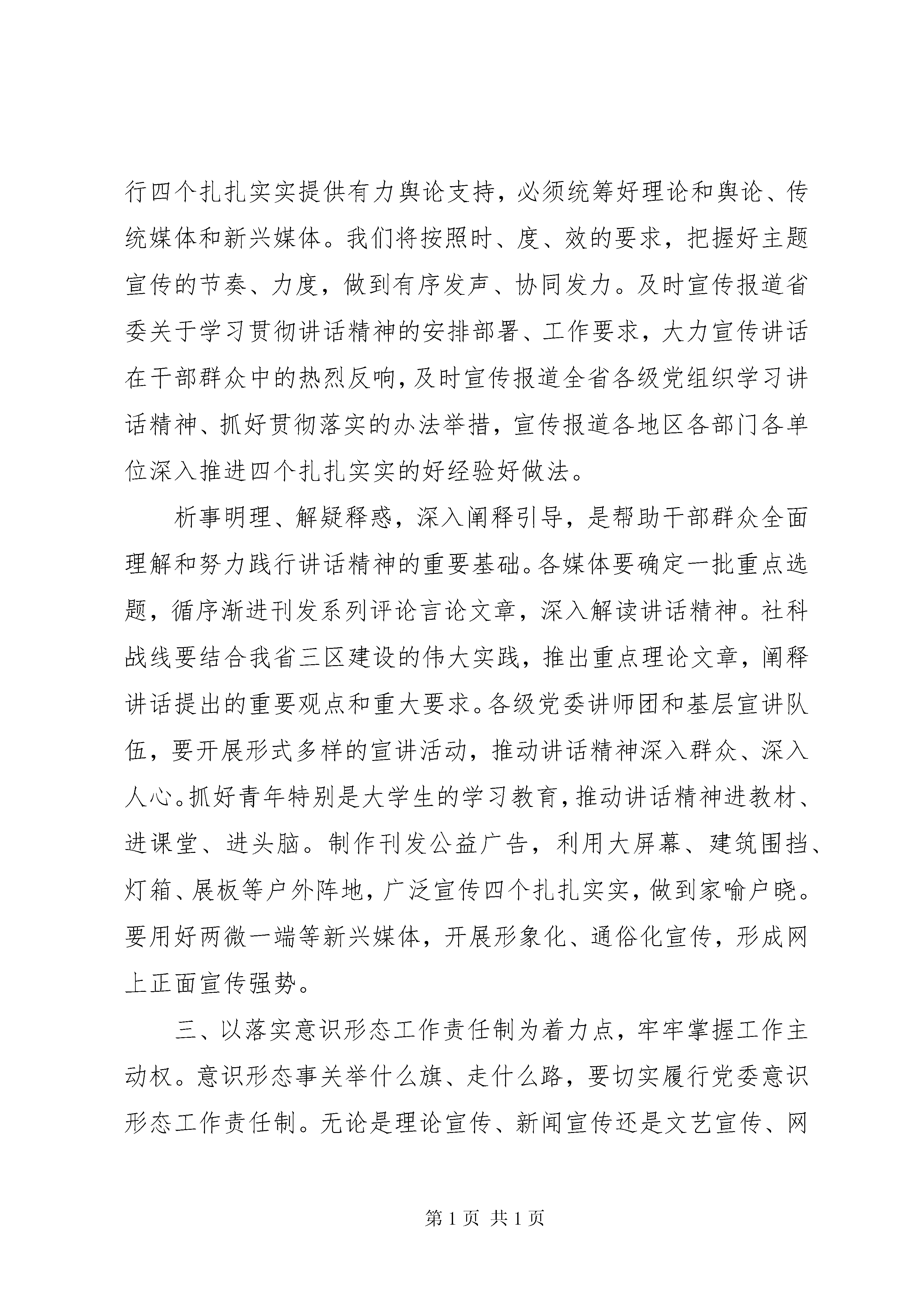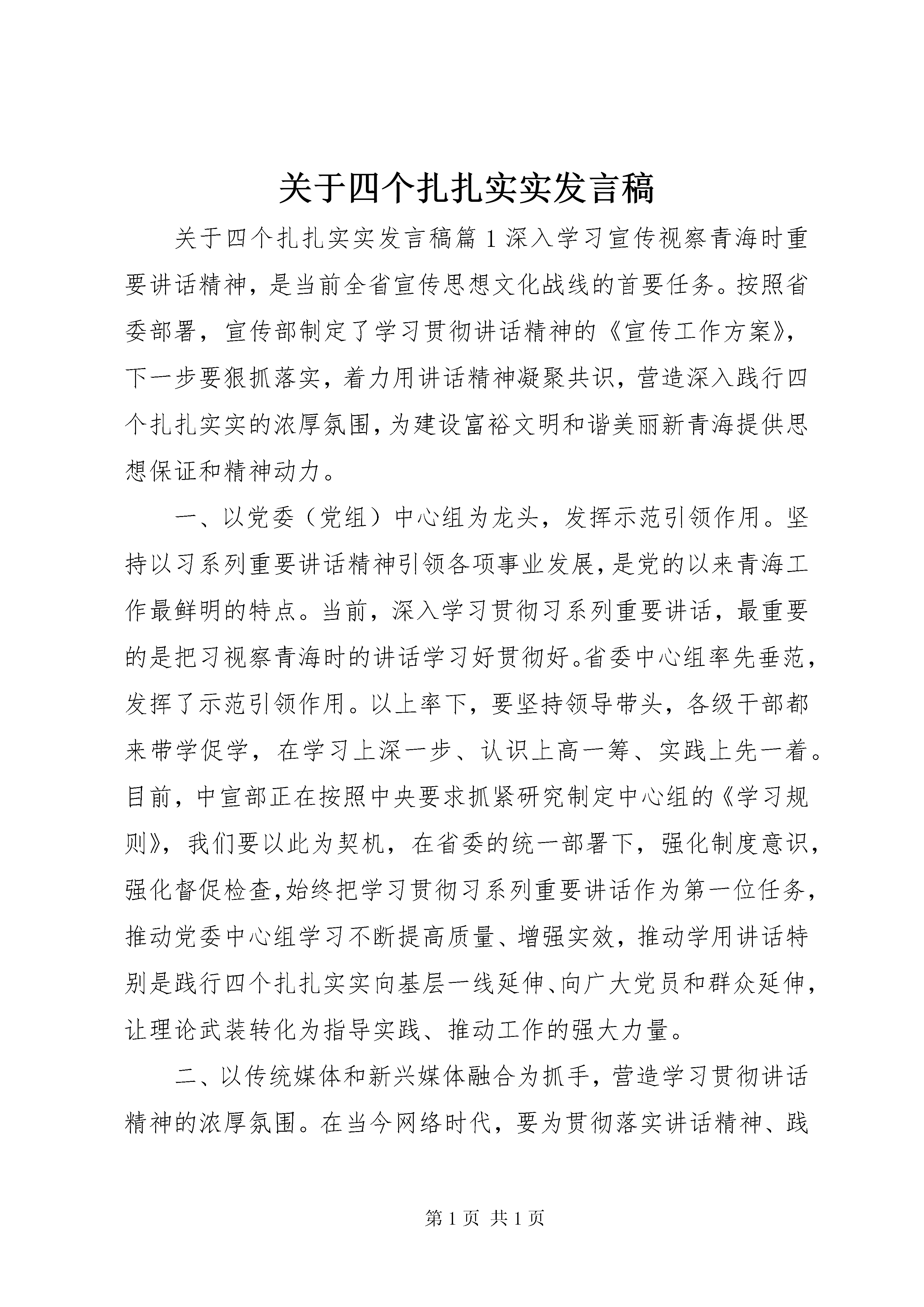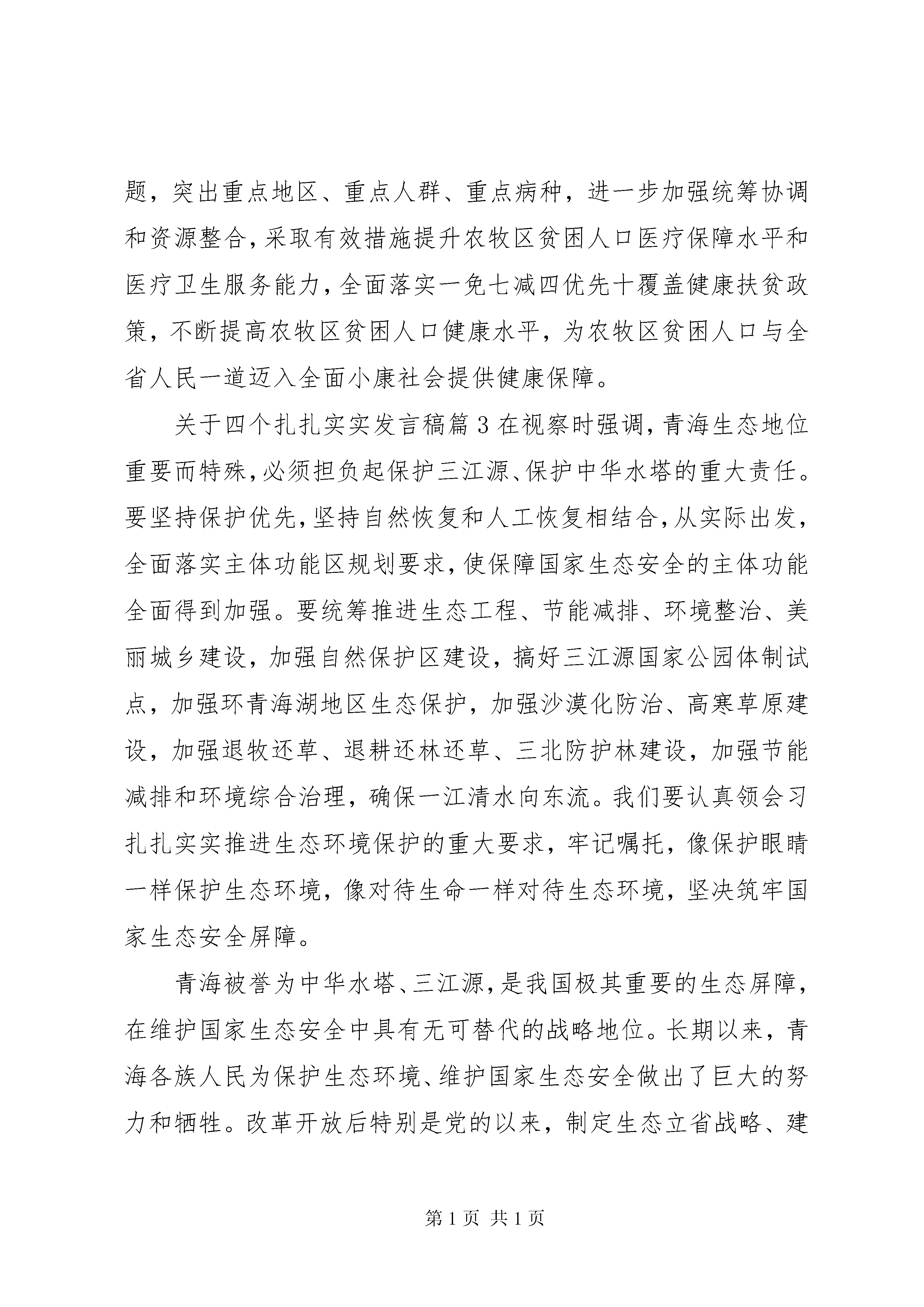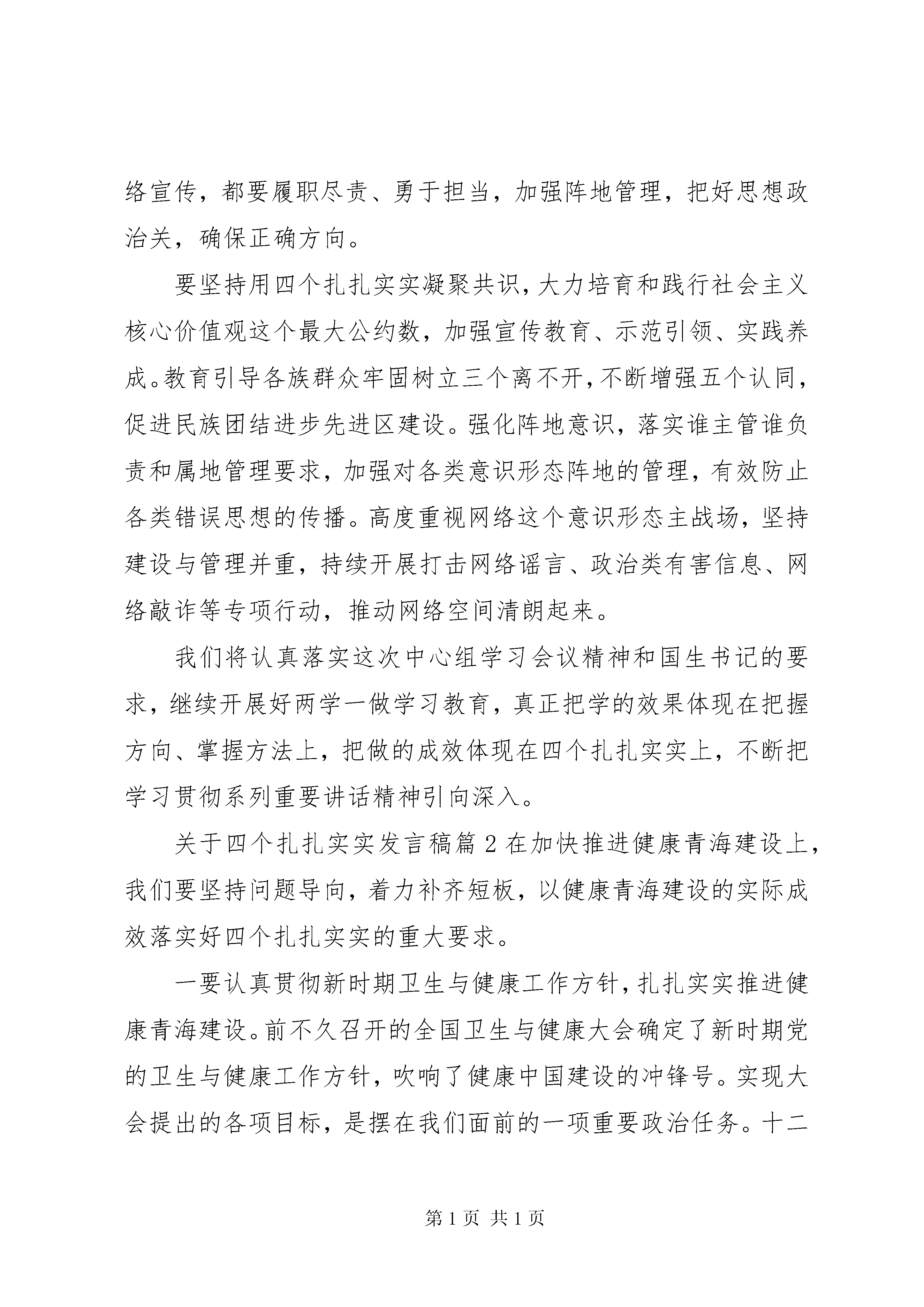 关于四个扎扎实实发言稿关于四个扎扎实实发言稿篇1深入学习宣传视察青海时重要讲话精神,是当前全省宣传思想文化战线的首要任务。按照省委部署,宣传部制定了学习贯彻讲话精神的《宣传工作方案》,下一步要狠抓落实,着力用讲话精神凝聚共识,营造深入践行四个扎扎实实的浓厚氛围,为建设富裕文明和谐美丽新青海提供思想保证和精神动力。一、以党委(党组)中心组为龙头,发挥示范引领作用。坚持以习系列重要讲话精神引领各项事业发展,是党的以来青海工作最鲜明的特点。当前,深入学习贯彻习系列重要讲话,最重要的是把习视察青海时的讲话学习好贯彻好。省委中心组率先垂范,发挥了示范引领作用。以上率下,要坚持领导带头,各级干部都来带学促学,在学习上深一步、认识上高一筹、实践上先一着。目前,中宣部正在按照中央要求抓紧研究制定中心组的《学习规则》,我们要以此为契机,在省委的统一部署下,强化制度意识,强化督促检查,始终把学习贯彻习系列重要讲话作为第一位任务,推动党委中心组学习不断提高质量、增强实效,推动学用讲话特别是践行四个扎扎实实向基层一线延伸、向广大党员和群众延伸,让理论武装转化为指导实践、推动工作的强大力量。二、以传统媒体和新兴媒体融合为抓手,营造学习贯彻讲话精神的浓厚氛围。在当今网络时代,要为贯彻落实讲话精神、践行四个扎扎实实提供有力舆论支持,必须统筹好理论和舆论、传统媒体和新兴媒体。我们将按照时、度、效的要求,把握好主题宣传的节奏、力度,做到有序发声、协同发力。及时宣传报道省委关于学习贯彻讲话精神的安排部署、工作要求,大力宣传讲话在干部群众中的热烈反响,及时宣传报道全省各级党组织学习讲话精神、抓好贯彻落实的办法举措,宣传报道各地区各部门各单位深入推进四个扎扎实实的好经验好做法。析事明理、解疑释惑,深入阐释引导,是帮助干部群众全面理解和努力践行讲话精神的重要基础。各媒体要确定一批重点选题,循序渐进刊发系列评论言论文章,深入解读讲话精神。社科战线要结合我省三区建设的伟大实践,推出重点理论文章,阐释讲话提出的重要观点和重大要求。各级党委讲师团和基层宣讲队伍,要开展形式多样的宣讲活动,推动讲话精神深入群众、深入人心。抓好青年特别是大学生的学习教育,推动讲话精神进教材、进课堂、进头脑。制作刊发公益广告,利用大屏幕、建筑围挡、灯箱、展板等户外阵地,广泛宣传四个扎扎实实,做到家喻户晓。要用好两微一端等新兴媒体,开展形象化、通俗化宣传,形成网上正面宣传强势。三、以落实意识形态工作责任制为着力点,牢牢掌握工作主动权。意识形态事关举什么旗、走什么路,要切实履行党委意识形态工作责任制。无论是理论宣传、新闻宣传还是文艺宣传、网络宣传,都要履职尽责、勇于担当,加强阵地管理,把好思想政治关,确保正确方向。要坚持用四个扎扎实实凝聚共识,大力培育和践行社会主义核心价值观这个最大公约数,加强宣传教育、示范引领、实践养成。教育引导各族群众牢固树立三个离不开,不断增强五个认同,促进民族团结进步先进区建设。强化阵地意识,落实谁主管谁负责和属地管理要求,加强对各类意识形态阵地的管理,有效防止各类错误思想的传播。高度重视网络这个意识形态主战场,坚持建设与管理并重,持续开展打击网络谣言、政治类有害信息、网络敲诈等专项行动,推动网络空间清朗起来。我们将认真落实这次中心组学习会议精神和国生书记的要求,继续开展好两学一做学习教育,真正把学的效果体现在把握方向、掌握方法上,把做的成效体现在四个扎扎实实上,不断把学习贯彻系列重要讲话精神引向深入。关于四个扎扎实实发言稿篇2在加快推进健康青海建设上,我们要坚持问题导向,着力补齐短板,以健康青海建设的实际成效落实好四个扎扎实实的重大要求。一要认真贯彻新时期卫生与健康工作方针,扎扎实实推进健康青海建设。前不久召开的全国卫生与健康大会确定了新时期党的卫生与健康工作方针,吹响了健康中国建设的冲锋号。实现大会提出的各项目标,是摆在我们面前的一项重要政治任务。十二五期间,我省卫生与健康事业取得了显著成就,尤其是医药卫生体制改革,使人民群众的获得感显著增强。但同时,随着工业化、城镇化、人口老龄化以及疾病谱变化也给维护和促进健康带来一系列新挑战,服务供给约束与健康需求不断增长之间的矛盾依然突出。因此,我们要认真贯彻落实习重要讲话精神和大会各项部署,牢牢把握以基层为重点,以改革创新为动力,预防为主,中西医并重,将健康融入所有政策,人民共建共享的新时期卫生与健康工作方针,树立大卫生、大健康理念,扎扎实实推进健康青海建设。二要继续扎实推进医药卫生体制改革,使改革红利更多惠及人民群众。新一轮医改启动以来,我省坚持保基本、强基层、建机制,医疗、医保、医药联动改革,取得了阶段性成效,医疗保障制度实现全覆盖、基本药物制度实现全覆盖、医疗卫生服务体系实现全覆盖、基本公共卫生和重大