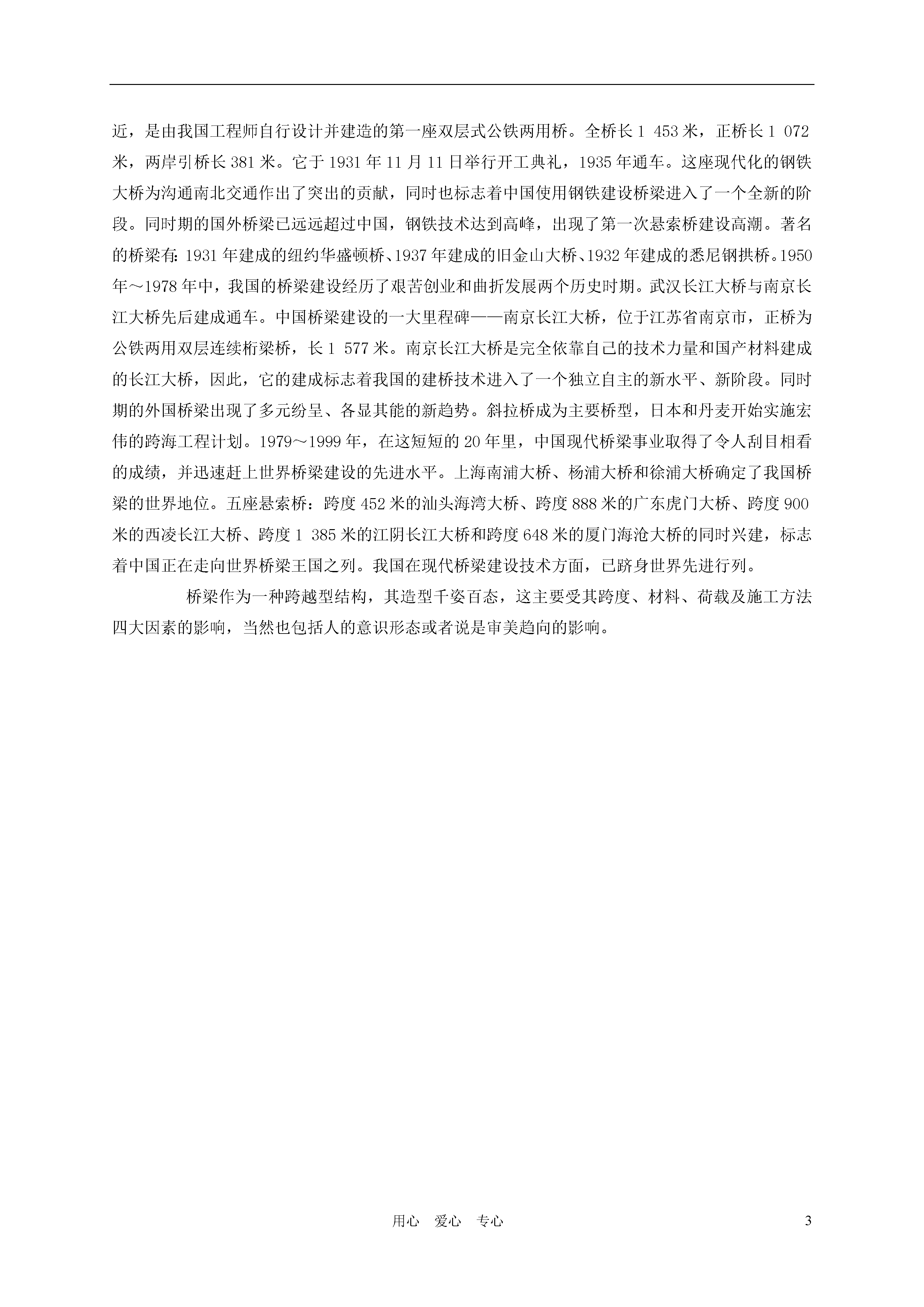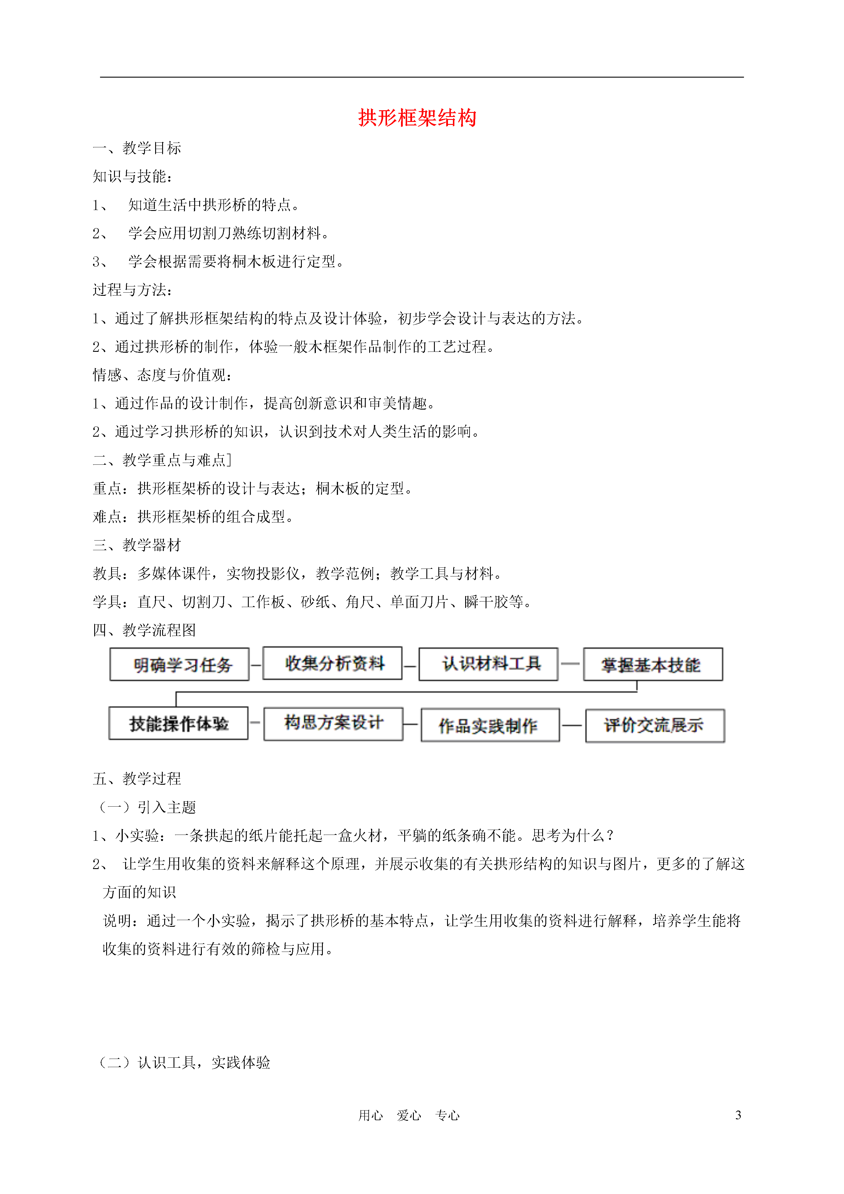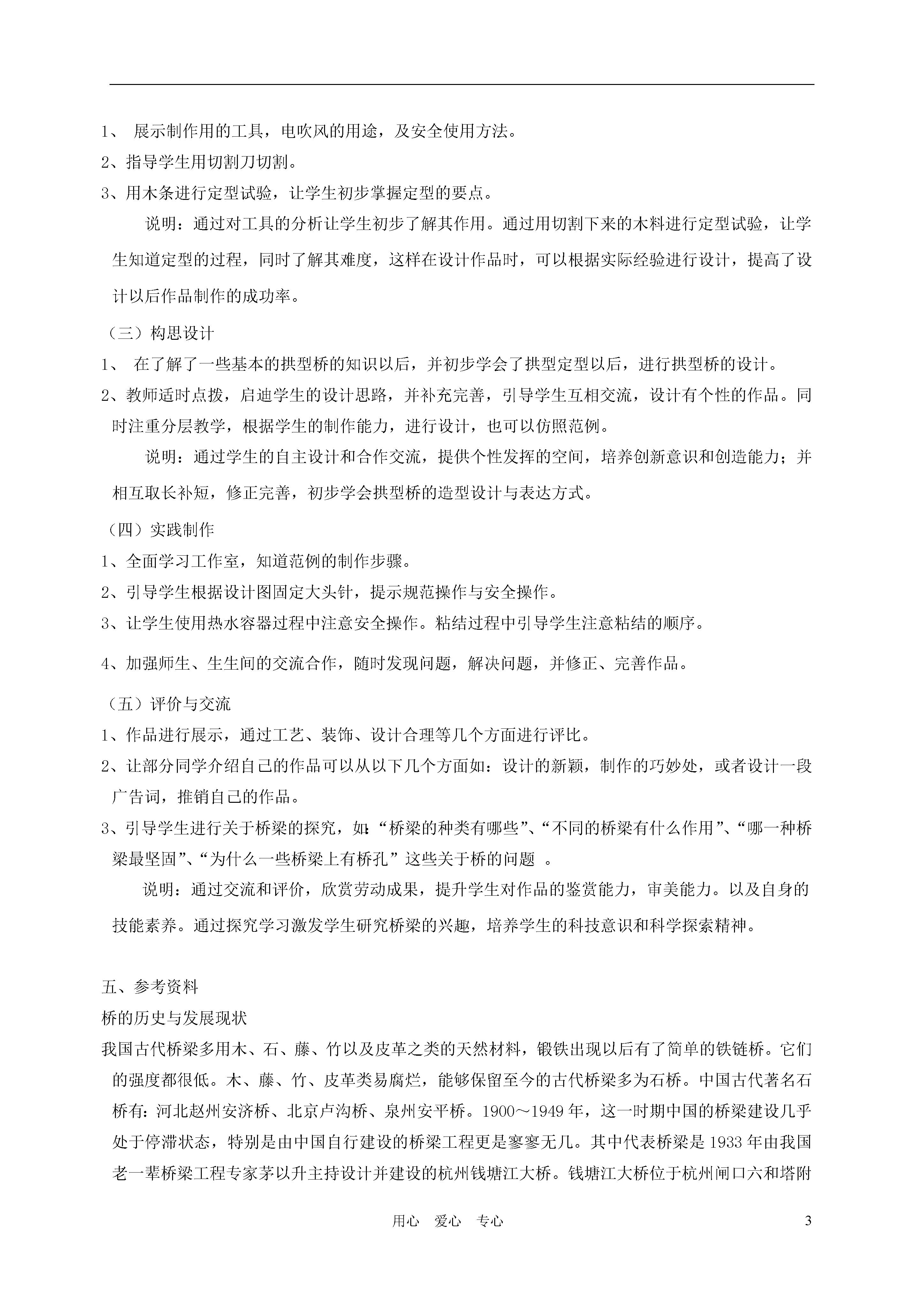3用心爱心专心拱形框架结构一、教学目标知识与技能:知道生活中拱形桥的特点。学会应用切割刀熟练切割材料。学会根据需要将桐木板进行定型。过程与方法:1、通过了解拱形框架结构的特点及设计体验,初步学会设计与表达的方法。2、通过拱形桥的制作,体验一般木框架作品制作的工艺过程。情感、态度与价值观:1、通过作品的设计制作,提高创新意识和审美情趣。2、通过学习拱形桥的知识,认识到技术对人类生活的影响。二、教学重点与难点]重点:拱形框架桥的设计与表达;桐木板的定型。难点:拱形框架桥的组合成型。三、教学器材教具:多媒体课件,实物投影仪,教学范例;教学工具与材料。学具:直尺、切割刀、工作板、砂纸、角尺、单面刀片、瞬干胶等。四、教学流程图五、教学过程(一)引入主题1、小实验:一条拱起的纸片能托起一盒火材,平躺的纸条确不能。思考为什么?2、让学生用收集的资料来解释这个原理,并展示收集的有关拱形结构的知识与图片,更多的了解这方面的知识说明:通过一个小实验,揭示了拱形桥的基本特点,让学生用收集的资料进行解释,培养学生能将收集的资料进行有效的筛检与应用。(二)认识工具,实践体验1、展示制作用的工具,电吹风的用途,及安全使用方法。2、指导学生用切割刀切割。3、用木条进行定型试验,让学生初步掌握定型的要点。说明:通过对工具的分析让学生初步了解其作用。通过用切割下来的木料进行定型试验,让学生知道定型的过程,同时了解其难度,这样在设计作品时,可以根据实际经验进行设计,提高了设计以后作品制作的成功率。(三)构思设计1、在了解了一些基本的拱型桥的知识以后,并初步学会了拱型定型以后,进行拱型桥的设计。2、教师适时点拨,启迪学生的设计思路,并补充完善,引导学生互相交流,设计有个性的作品。同时注重分层教学,根据学生的制作能力,进行设计,也可以仿照范例。说明:通过学生的自主设计和合作交流,提供个性发挥的空间,培养创新意识和创造能力;并相互取长补短,修正完善,初步学会拱型桥的造型设计与表达方式。(四)实践制作1、全面学习工作室,知道范例的制作步骤。2、引导学生根据设计图固定大头针,提示规范操作与安全操作。3、让学生使用热水容器过程中注意安全操作。粘结过程中引导学生注意粘结的顺序。4、加强师生、生生间的交流合作,随时发现问题,解决问题,并修正、完善作品。(五)评价与交流1、作品进行展示,通过工艺、装饰、设计合理等几个方面进行评比。2、让部分同学介绍自己的作品可以从以下几个方面如:设计的新颖,制作的巧妙处,或者设计一段广告词,推销自己的作品。3、引导学生进行关于桥梁的探究,如:“桥梁的种类有哪些”、“不同的桥梁有什么作用”、“哪一种桥梁最坚固”、“为什么一些桥梁上有桥孔”这些关于桥的问题。说明:通过交流和评价,欣赏劳动成果,提升学生对作品的鉴赏能力,审美能力。以及自身的技能素养。通过探究学习激发学生研究桥梁的兴趣,培养学生的科技意识和科学探索精神。五、参考资料桥的历史与发展现状我国古代桥梁多用木、石、藤、竹以及皮革之类的天然材料,锻铁出现以后有了简单的铁链桥。它们的强度都很低。木、藤、竹、皮革类易腐烂,能够保留至今的古代桥梁多为石桥。中国古代著名石桥有:河北赵州安济桥、北京卢沟桥、泉州安平桥。1900~1949年,这一时期中国的桥梁建设几乎处于停滞状态,特别是由中国自行建设的桥梁工程更是寥寥无几。其中代表桥梁是1933年由我国老一辈桥梁工程专家茅以升主持设计并建设的杭州钱塘江大桥。钱塘江大桥位于杭州闸口六和塔附近,是由我国工程师自行设计并建造的第一座双层式公铁两用桥。全桥长1453米,正桥长1072米,两岸引桥长381米。它于1931年11月11日举行开工典礼,1935年通车。这座现代化的钢铁大桥为沟通南北交通作出了突出的贡献,同时也标志着中国使用钢铁建设桥梁进入了一个全新的阶段。同时期的国外桥梁已远远超过中国,钢铁技术达到高峰,出现了第一次悬索桥建设高潮。著名的桥梁有:1931年建成的纽约华盛顿桥、1937年建成的旧金山大桥、1932年建成的悉尼钢拱桥。1950年~1978年中,我国的桥梁建设经历了艰苦创业和曲折发展两个历史时期。武汉长江大桥与南京长江大桥先后建成通车。中国桥梁建设的一大里程碑——南京长江大桥,位于江苏省南京市,正桥为公铁两用双层连续桁梁桥,长1577米。南京长江大桥是完全依靠自己的技术力量和国产材料建成的长江大桥,因此,它的建成标志着我国的建桥技术进入了一个独立自主的新水平、新阶段。同时期的外国桥梁出现了多元纷呈、各显其能的新趋势。斜拉桥成为主要桥型,日本和丹麦开始实施宏伟的跨海工程计划。1979~1999年,在这短短的20年里,中国现代桥梁事业取得