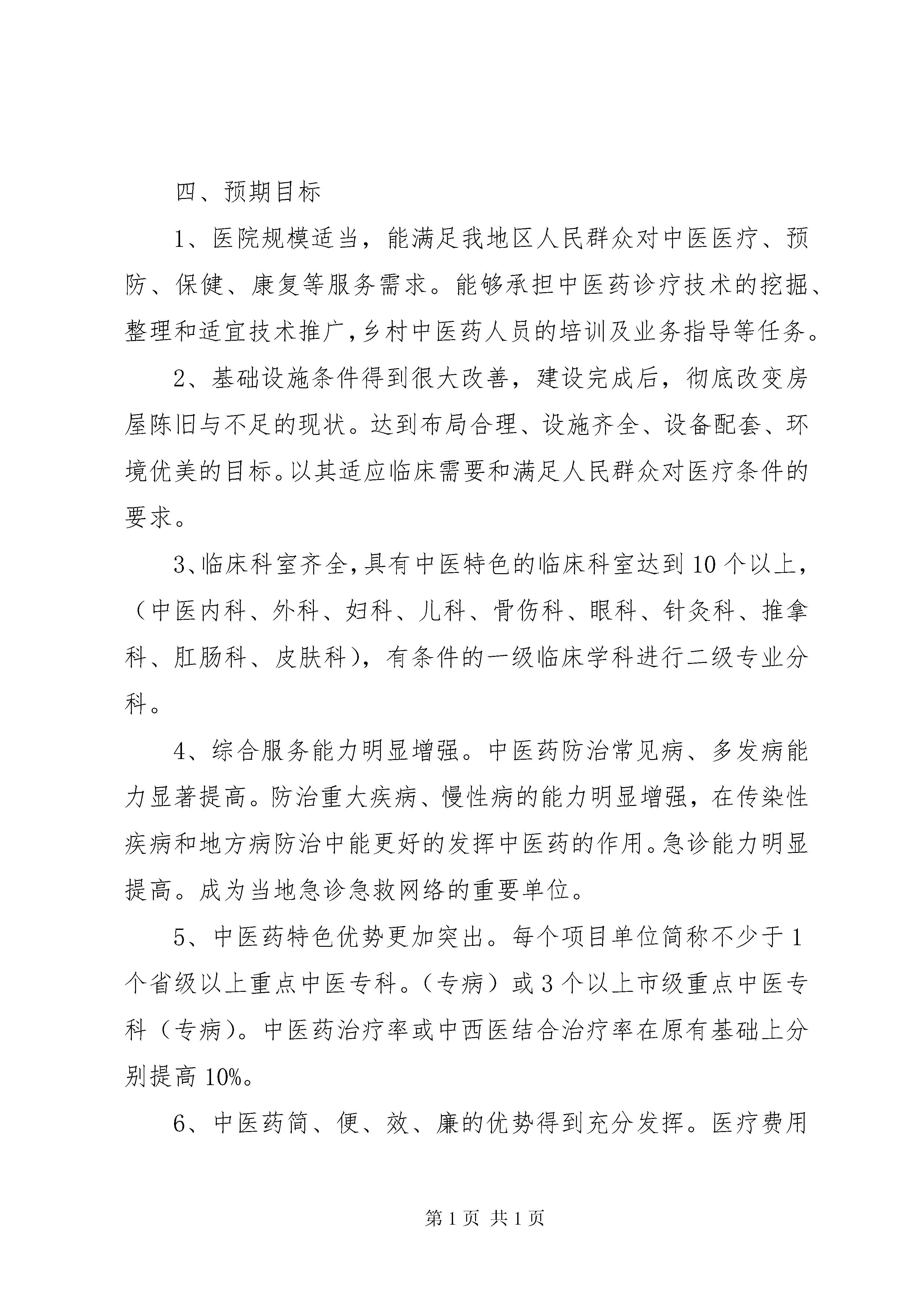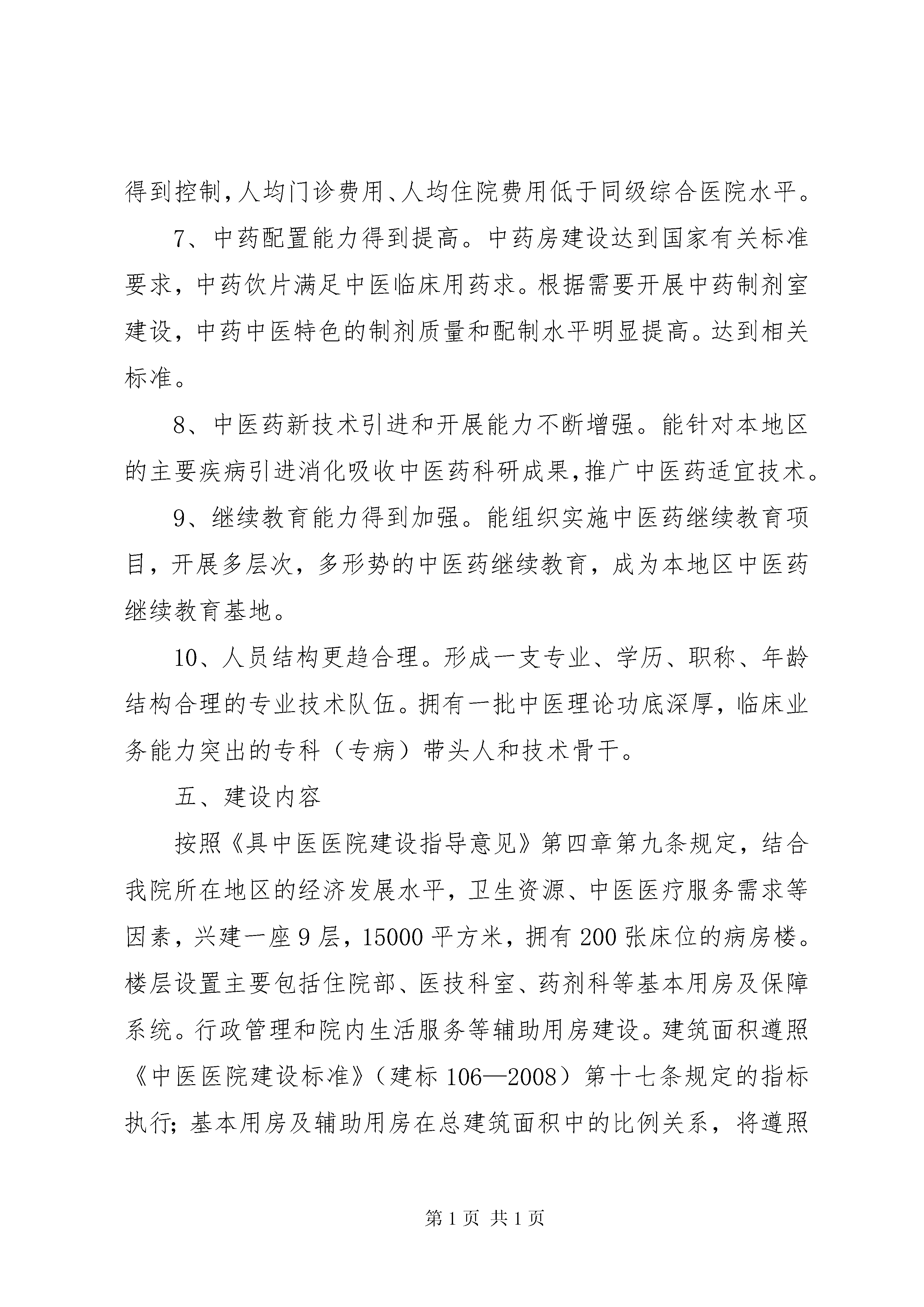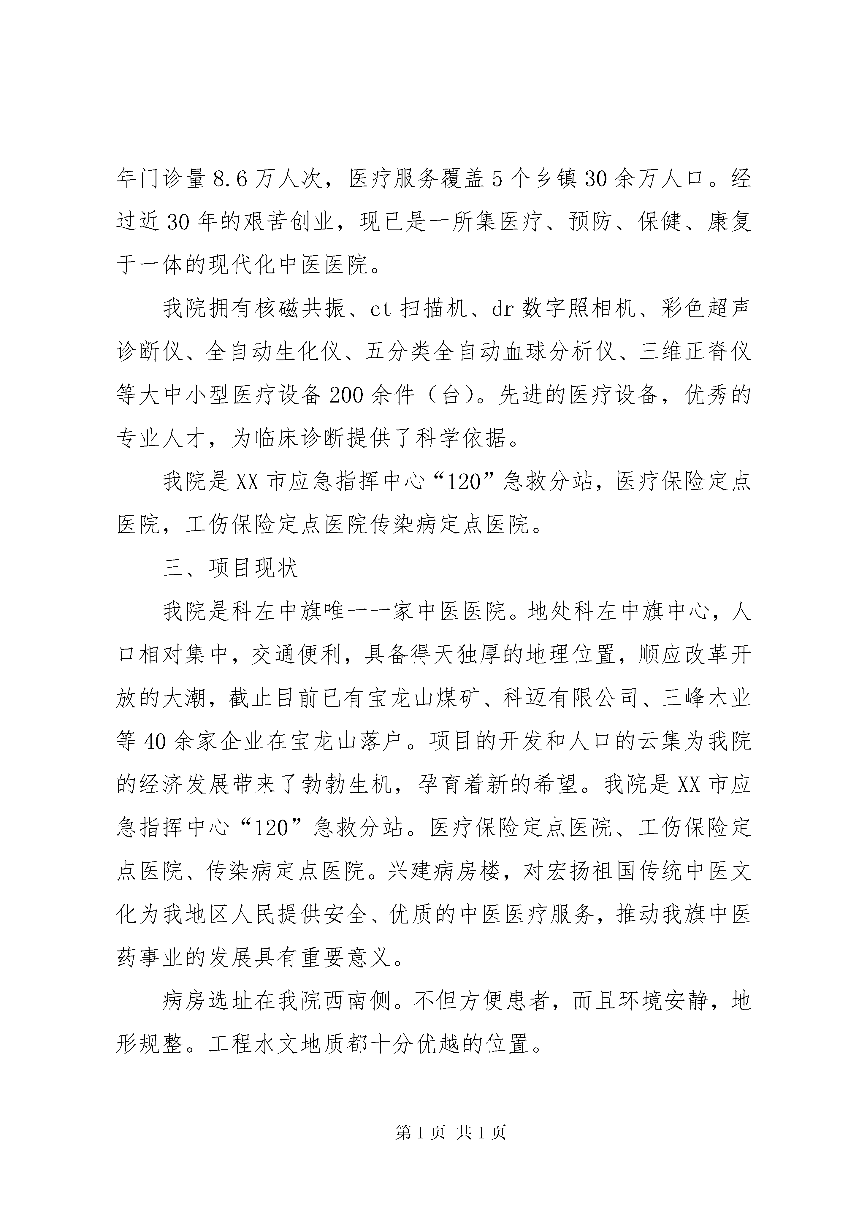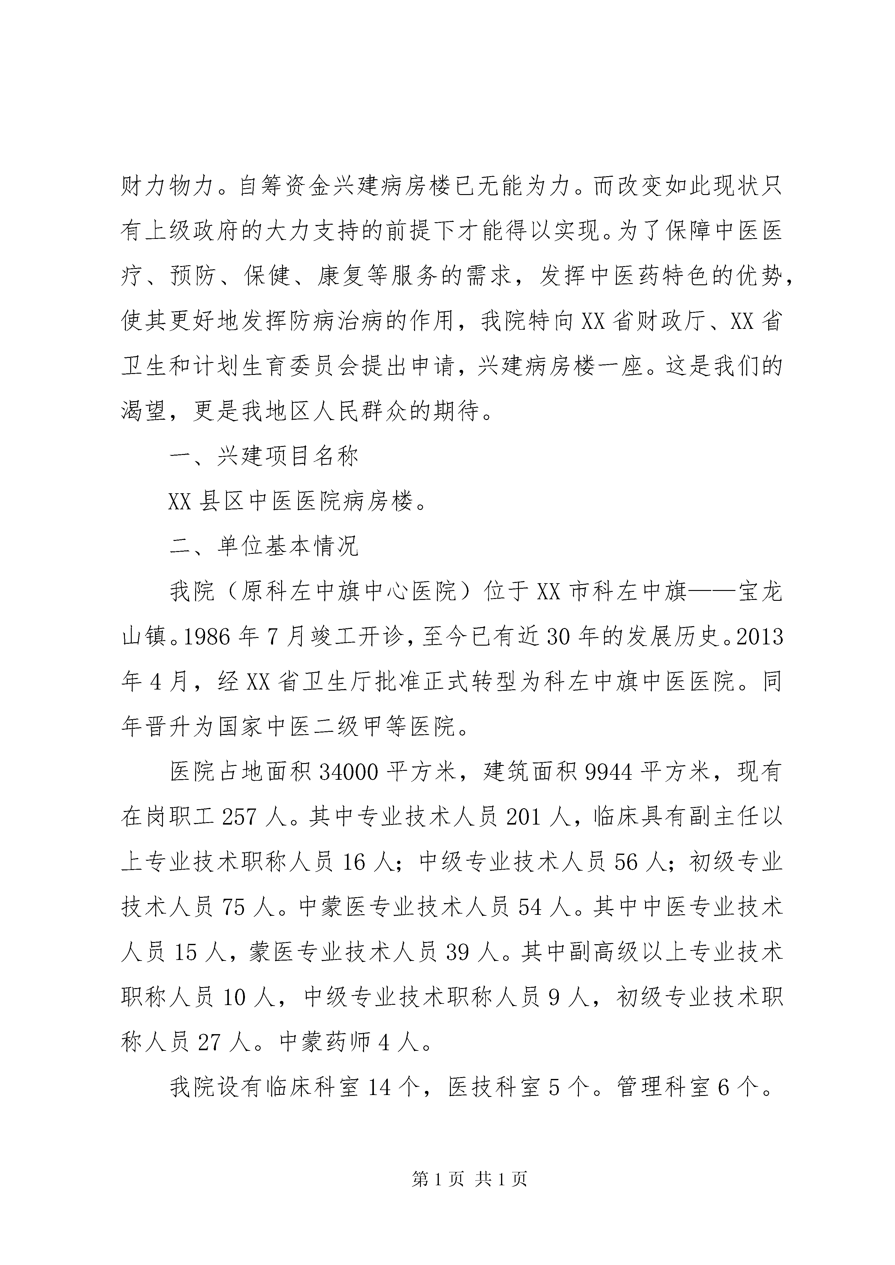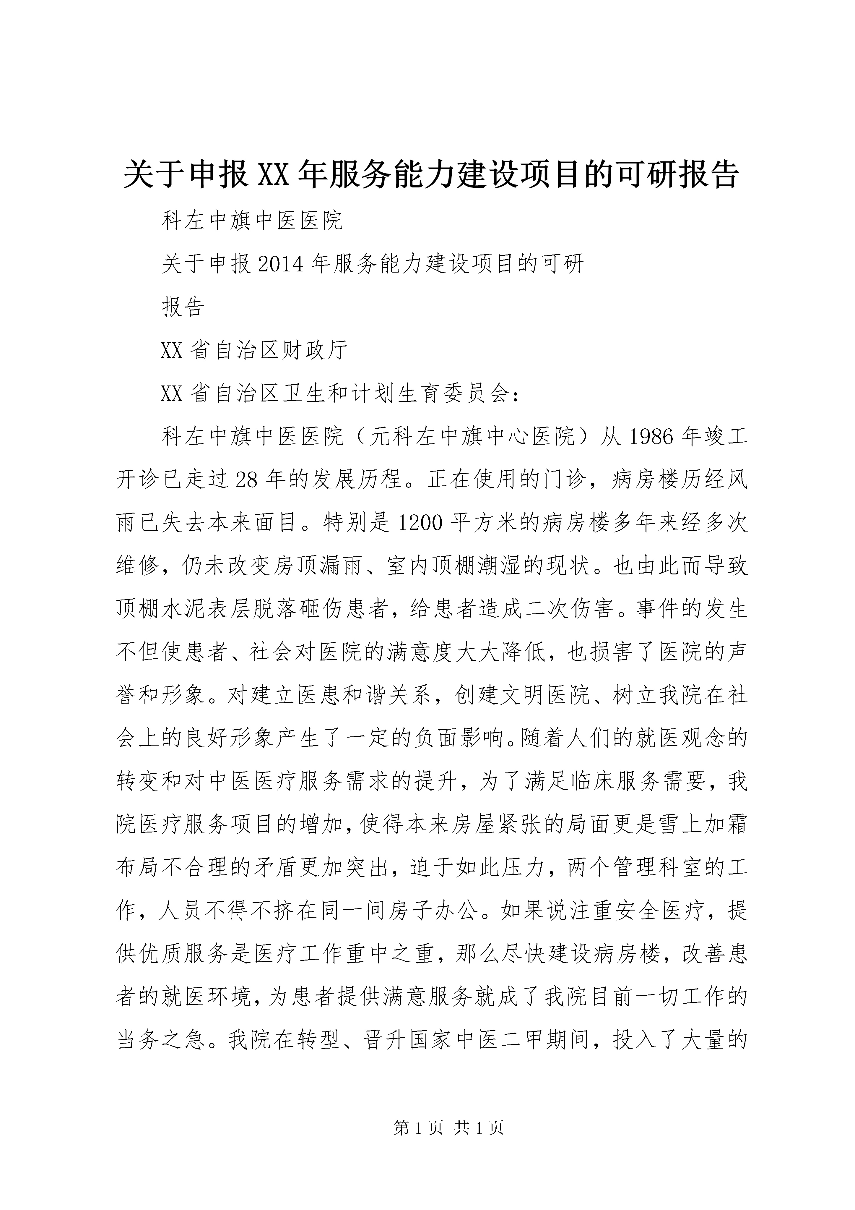 关于申报XX年服务能力建设项目的可研报告科左中旗中医医院关于申报2014年服务能力建设项目的可研报告XX省自治区财政厅XX省自治区卫生和计划生育委员会:科左中旗中医医院(元科左中旗中心医院)从1986年竣工开诊已走过28年的发展历程。正在使用的门诊,病房楼历经风雨已失去本来面目。特别是1200平方米的病房楼多年来经多次维修,仍未改变房顶漏雨、室内顶棚潮湿的现状。也由此而导致顶棚水泥表层脱落砸伤患者,给患者造成二次伤害。事件的发生不但使患者、社会对医院的满意度大大降低,也损害了医院的声誉和形象。对建立医患和谐关系,创建文明医院、树立我院在社会上的良好形象产生了一定的负面影响。随着人们的就医观念的转变和对中医医疗服务需求的提升,为了满足临床服务需要,我院医疗服务项目的增加,使得本来房屋紧张的局面更是雪上加霜布局不合理的矛盾更加突出,迫于如此压力,两个管理科室的工作,人员不得不挤在同一间房子办公。如果说注重安全医疗,提供优质服务是医疗工作重中之重,那么尽快建设病房楼,改善患者的就医环境,为患者提供满意服务就成了我院目前一切工作的当务之急。我院在转型、晋升国家中医二甲期间,投入了大量的财力物力。自筹资金兴建病房楼已无能为力。而改变如此现状只有上级政府的大力支持的前提下才能得以实现。为了保障中医医疗、预防、保健、康复等服务的需求,发挥中医药特色的优势,使其更好地发挥防病治病的作用,我院特向XX省财政厅、XX省卫生和计划生育委员会提出申请,兴建病房楼一座。这是我们的渴望,更是我地区人民群众的期待。一、兴建项目名称XX县区中医医院病房楼。二、单位基本情况我院(原科左中旗中心医院)位于XX市科左中旗——宝龙山镇。1986年7月竣工开诊,至今已有近30年的发展历史。2013年4月,经XX省卫生厅批准正式转型为科左中旗中医医院。同年晋升为国家中医二级甲等医院。医院占地面积34000平方米,建筑面积9944平方米,现有在岗职工257人。其中专业技术人员201人,临床具有副主任以上专业技术职称人员16人;中级专业技术人员56人;初级专业技术人员75人。中蒙医专业技术人员54人。其中中医专业技术人员15人,蒙医专业技术人员39人。其中副高级以上专业技术职称人员10人,中级专业技术职称人员9人,初级专业技术职称人员27人。中蒙药师4人。我院设有临床科室14个,医技科室5个。管理科室6个。年门诊量8.6万人次,医疗服务覆盖5个乡镇30余万人口。经过近30年的艰苦创业,现已是一所集医疗、预防、保健、康复于一体的现代化中医医院。我院拥有核磁共振、ct扫描机、dr数字照相机、彩色超声诊断仪、全自动生化仪、五分类全自动血球分析仪、三维正脊仪等大中小型医疗设备200余件(台)。先进的医疗设备,优秀的专业人才,为临床诊断提供了科学依据。我院是XX市应急指挥中心“120”急救分站,医疗保险定点医院,工伤保险定点医院传染病定点医院。三、项目现状我院是科左中旗唯一一家中医医院。地处科左中旗中心,人口相对集中,交通便利,具备得天独厚的地理位置,顺应改革开放的大潮,截止目前已有宝龙山煤矿、科迈有限公司、三峰木业等40余家企业在宝龙山落户。项目的开发和人口的云集为我院的经济发展带来了勃勃生机,孕育着新的希望。我院是XX市应急指挥中心“120”急救分站。医疗保险定点医院、工伤保险定点医院、传染病定点医院。兴建病房楼,对宏扬祖国传统中医文化为我地区人民提供安全、优质的中医医疗服务,推动我旗中医药事业的发展具有重要意义。病房选址在我院西南侧。不但方便患者,而且环境安静,地形规整。工程水文地质都十分优越的位置。四、预期目标1、医院规模适当,能满足我地区人民群众对中医医疗、预防、保健、康复等服务需求。能够承担中医药诊疗技术的挖掘、整理和适宜技术推广,乡村中医药人员的培训及业务指导等任务。2、基础设施条件得到很大改善,建设完成后,彻底改变房屋陈旧与不足的现状。达到布局合理、设施齐全、设备配套、环境优美的目标。以其适应临床需要和满足人民群众对医疗条件的要求。3、临床科室齐全,具有中医特色的临床科室达到10个以上,(中医内科、外科、妇科、儿科、骨伤科、眼科、针灸科、推拿科、肛肠科、皮肤科),有条件的一级临床学科进行二级专业分科。4、综合服务能力明显增强。中医药防治常见病、多发病能力显著提高。防治重大疾病、慢性病的能力明显增强,在传染性疾病和地方病防治中能更好的发挥中医药的作用。急诊能力明显提高。成为当地急诊急救网络的重要单位。5、中医药特色优势更加突出。每个项目单位简称不少于1个省级以上重点中医专科。(专病)或3个以上市级重点中医专科(专病)。中医药治疗率或中西医结合治疗率在原有基础上分别提高10%。6、中医药简、便、效、廉的优势得到充分发挥。医疗费用得到控制,人均门诊