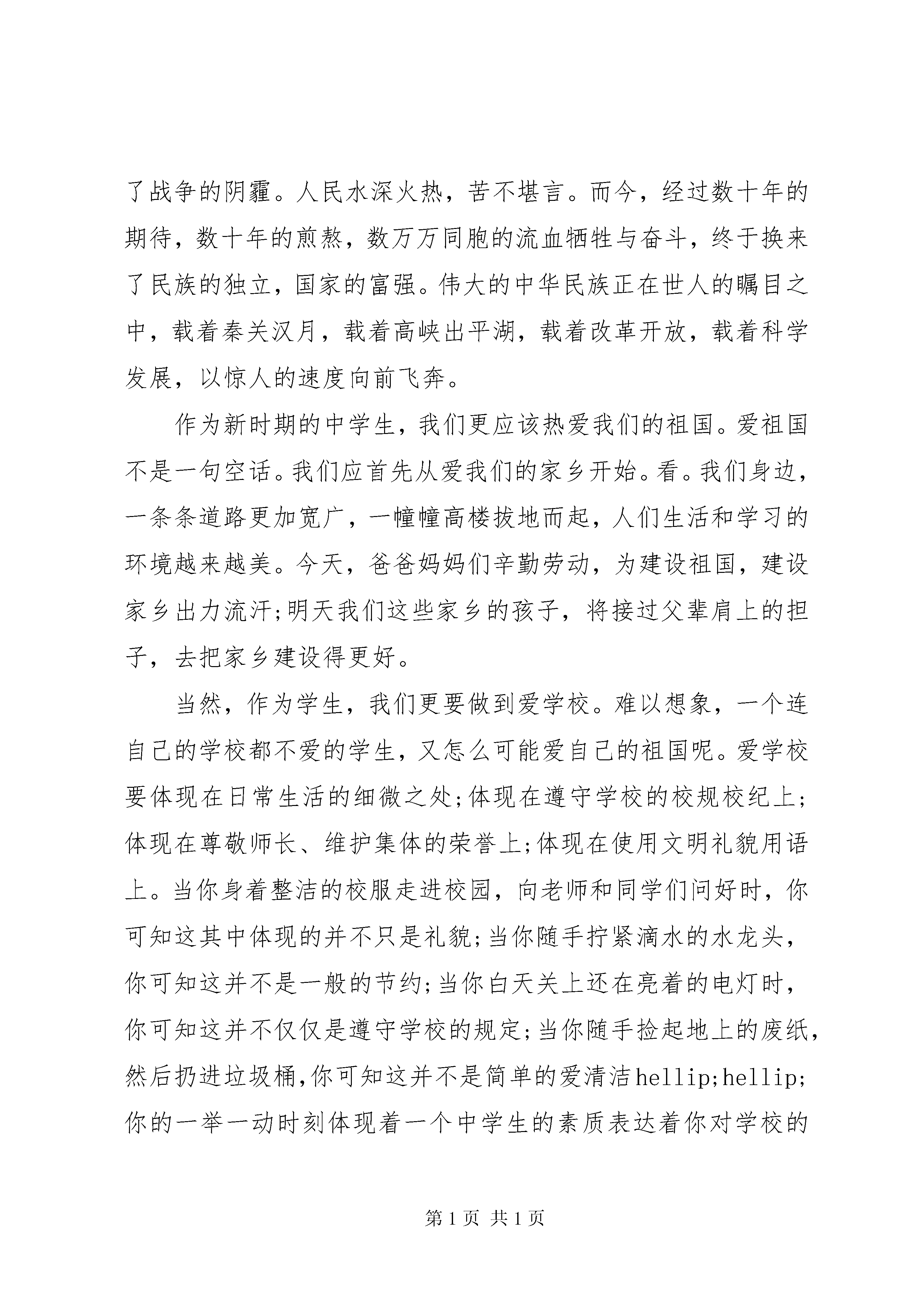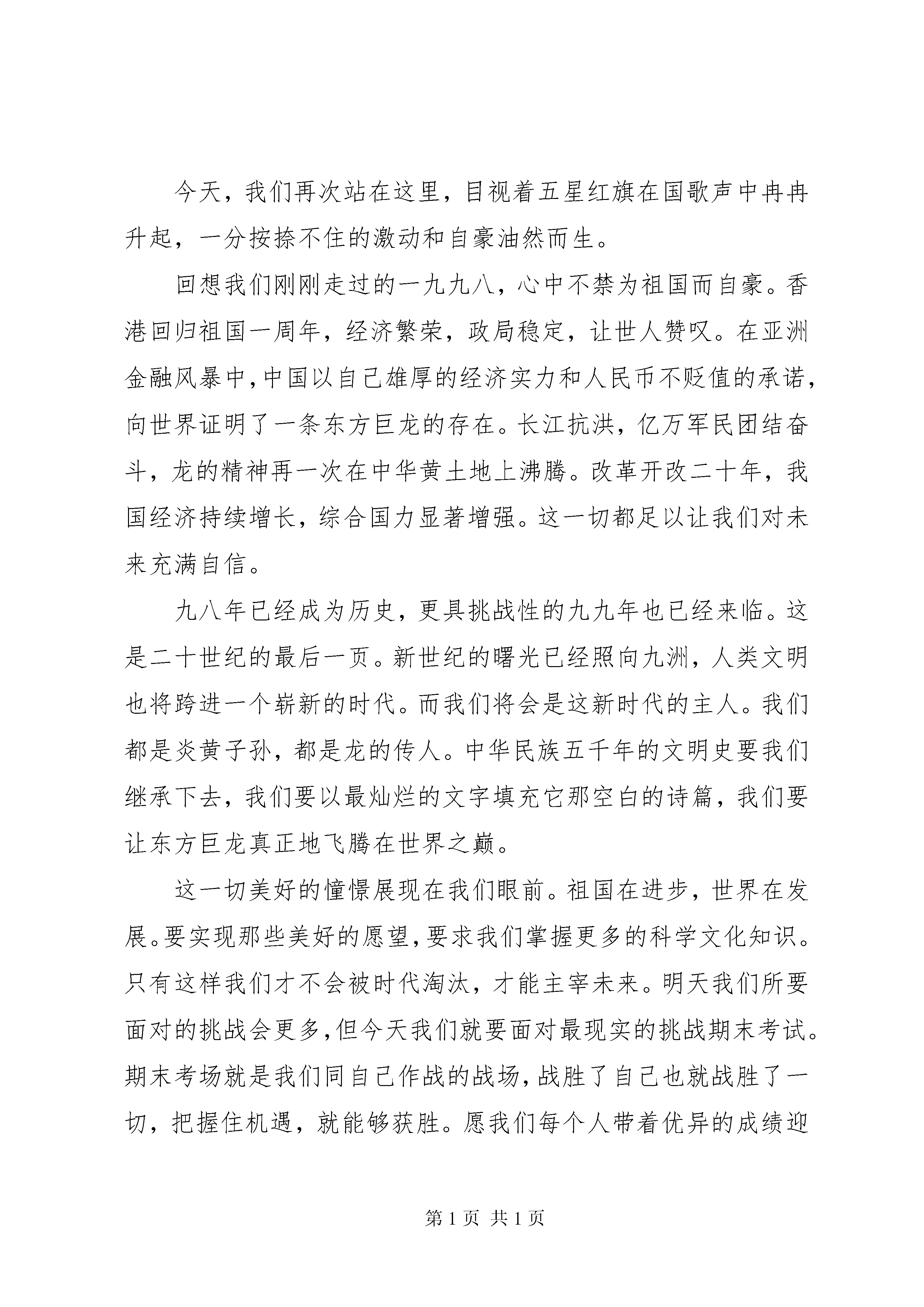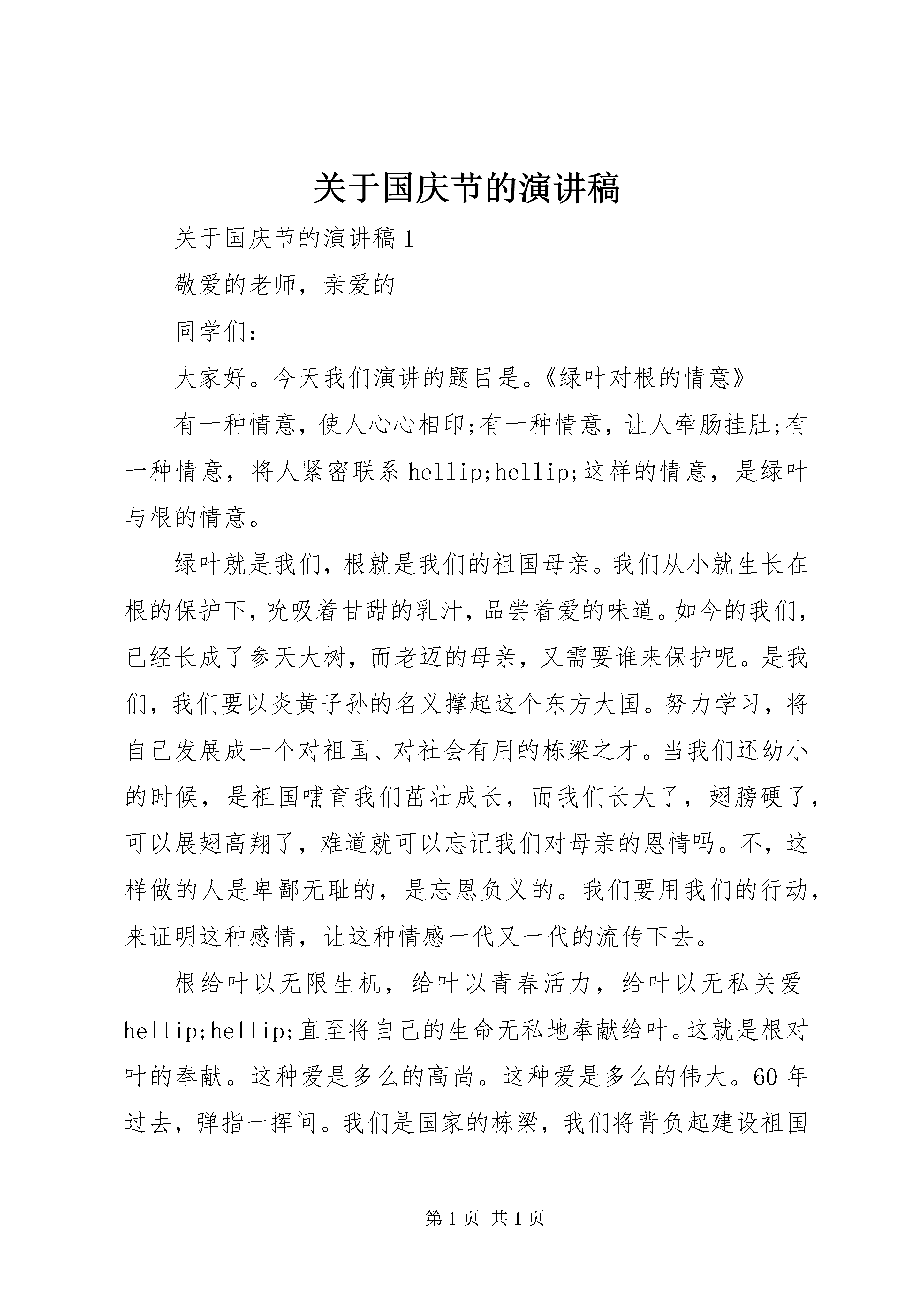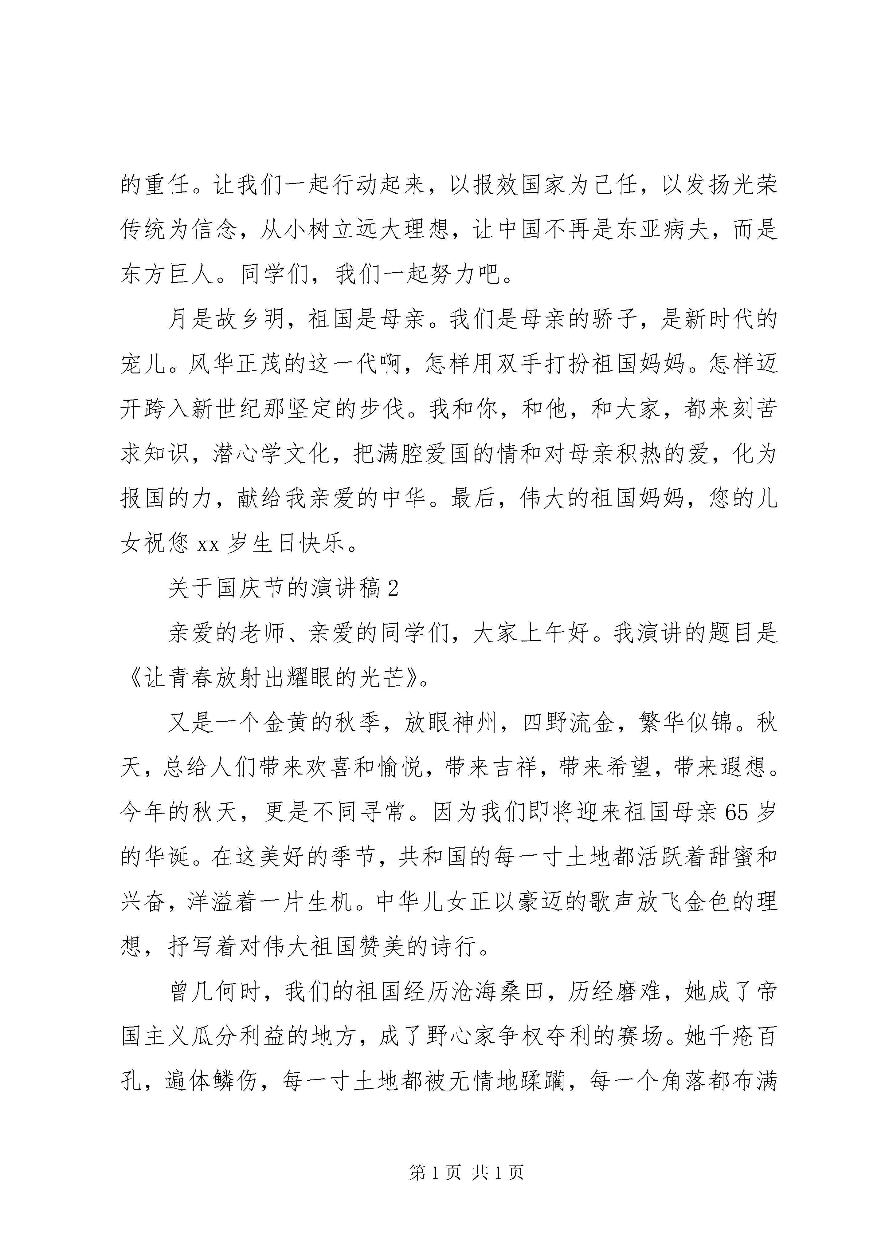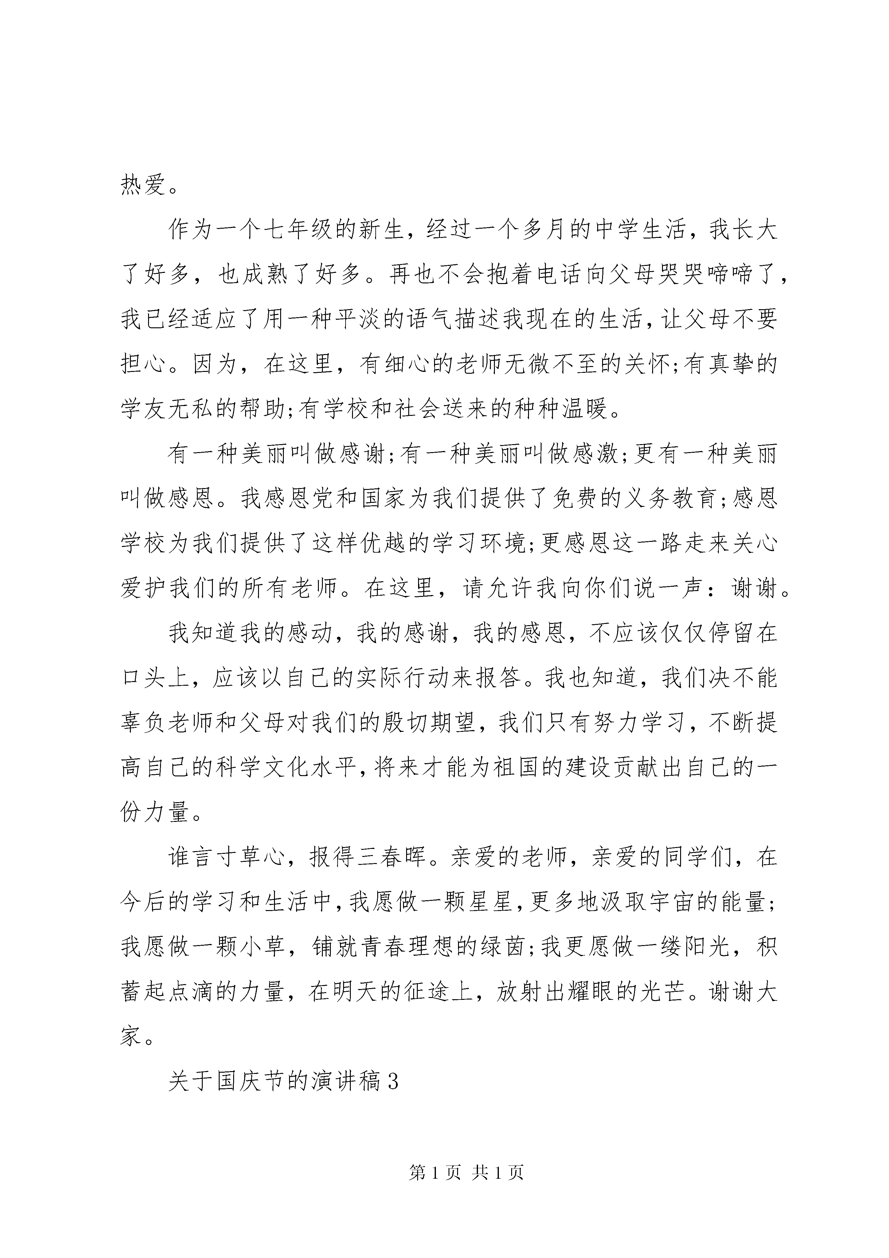 关于国庆节的演讲稿关于国庆节的演讲稿1敬爱的老师,亲爱的同学们:大家好。今天我们演讲的题目是。《绿叶对根的情意》有一种情意,使人心心相印;有一种情意,让人牵肠挂肚;有一种情意,将人紧密联系hellip;hellip;这样的情意,是绿叶与根的情意。绿叶就是我们,根就是我们的祖国母亲。我们从小就生长在根的保护下,吮吸着甘甜的乳汁,品尝着爱的味道。如今的我们,已经长成了参天大树,而老迈的母亲,又需要谁来保护呢。是我们,我们要以炎黄子孙的名义撑起这个东方大国。努力学习,将自己发展成一个对祖国、对社会有用的栋梁之才。当我们还幼小的时候,是祖国哺育我们茁壮成长,而我们长大了,翅膀硬了,可以展翅高翔了,难道就可以忘记我们对母亲的恩情吗。不,这样做的人是卑鄙无耻的,是忘恩负义的。我们要用我们的行动,来证明这种感情,让这种情感一代又一代的流传下去。根给叶以无限生机,给叶以青春活力,给叶以无私关爱hellip;hellip;直至将自己的生命无私地奉献给叶。这就是根对叶的奉献。这种爱是多么的高尚。这种爱是多么的伟大。60年过去,弹指一挥间。我们是国家的栋梁,我们将背负起建设祖国的重任。让我们一起行动起来,以报效国家为己任,以发扬光荣传统为信念,从小树立远大理想,让中国不再是东亚病夫,而是东方巨人。同学们,我们一起努力吧。月是故乡明,祖国是母亲。我们是母亲的骄子,是新时代的宠儿。风华正茂的这一代啊,怎样用双手打扮祖国妈妈。怎样迈开跨入新世纪那坚定的步伐。我和你,和他,和大家,都来刻苦求知识,潜心学文化,把满腔爱国的情和对母亲积热的爱,化为报国的力,献给我亲爱的中华。最后,伟大的祖国妈妈,您的儿女祝您xx岁生日快乐。关于国庆节的演讲稿2亲爱的老师、亲爱的同学们,大家上午好。我演讲的题目是《让青春放射出耀眼的光芒》。又是一个金黄的秋季,放眼神州,四野流金,繁华似锦。秋天,总给人们带来欢喜和愉悦,带来吉祥,带来希望,带来遐想。今年的秋天,更是不同寻常。因为我们即将迎来祖国母亲65岁的华诞。在这美好的季节,共和国的每一寸土地都活跃着甜蜜和兴奋,洋溢着一片生机。中华儿女正以豪迈的歌声放飞金色的理想,抒写着对伟大祖国赞美的诗行。曾几何时,我们的祖国经历沧海桑田,历经磨难,她成了帝国主义瓜分利益的地方,成了野心家争权夺利的赛场。她千疮百孔,遍体鳞伤,每一寸土地都被无情地蹂躏,每一个角落都布满了战争的阴霾。人民水深火热,苦不堪言。而今,经过数十年的期待,数十年的煎熬,数万万同胞的流血牺牲与奋斗,终于换来了民族的独立,国家的富强。伟大的中华民族正在世人的瞩目之中,载着秦关汉月,载着高峡出平湖,载着改革开放,载着科学发展,以惊人的速度向前飞奔。作为新时期的中学生,我们更应该热爱我们的祖国。爱祖国不是一句空话。我们应首先从爱我们的家乡开始。看。我们身边,一条条道路更加宽广,一幢幢高楼拔地而起,人们生活和学习的环境越来越美。今天,爸爸妈妈们辛勤劳动,为建设祖国,建设家乡出力流汗;明天我们这些家乡的孩子,将接过父辈肩上的担子,去把家乡建设得更好。当然,作为学生,我们更要做到爱学校。难以想象,一个连自己的学校都不爱的学生,又怎么可能爱自己的祖国呢。爱学校要体现在日常生活的细微之处;体现在遵守学校的校规校纪上;体现在尊敬师长、维护集体的荣誉上;体现在使用文明礼貌用语上。当你身着整洁的校服走进校园,向老师和同学们问好时,你可知这其中体现的并不只是礼貌;当你随手拧紧滴水的水龙头,你可知这并不是一般的节约;当你白天关上还在亮着的电灯时,你可知这并不仅仅是遵守学校的规定;当你随手捡起地上的废纸,然后扔进垃圾桶,你可知这并不是简单的爱清洁hellip;hellip;你的一举一动时刻体现着一个中学生的素质表达着你对学校的热爱。作为一个七年级的新生,经过一个多月的中学生活,我长大了好多,也成熟了好多。再也不会抱着电话向父母哭哭啼啼了,我已经适应了用一种平淡的语气描述我现在的生活,让父母不要担心。因为,在这里,有细心的老师无微不至的关怀;有真挚的学友无私的帮助;有学校和社会送来的种种温暖。有一种美丽叫做感谢;有一种美丽叫做感激;更有一种美丽叫做感恩。我感恩党和国家为我们提供了免费的义务教育;感恩学校为我们提供了这样优越的学习环境;更感恩这一路走来关心爱护我们的所有老师。在这里,请允许我向你们说一声:谢谢。我知道我的感动,我的感谢,我的感恩,不应该仅仅停留在口头上,应该以自己的实际行动来报答。我也知道,我们决不能辜负老师和父母对我们的殷切期望,我们只有努力学习,不断提高自己的科学文化水平,将来才能为祖国的建设贡献出自己的一份力量。谁言寸草心,报得三春晖。亲爱的老师,亲爱的同学们,在今后的学习和生活中,我愿做一颗星星,更多地汲取宇宙的能量;我愿做一颗小草,铺就青春理想的绿茵