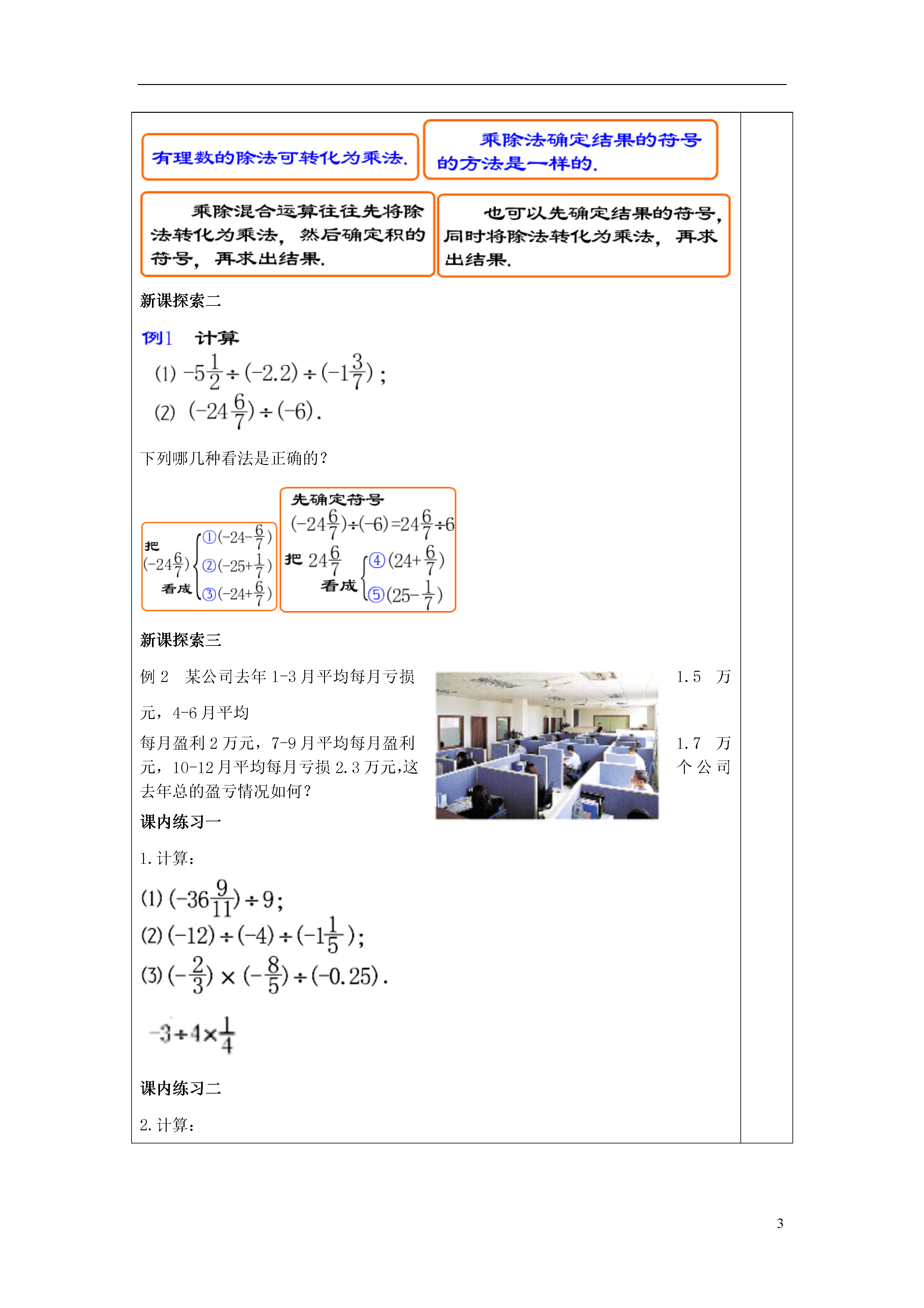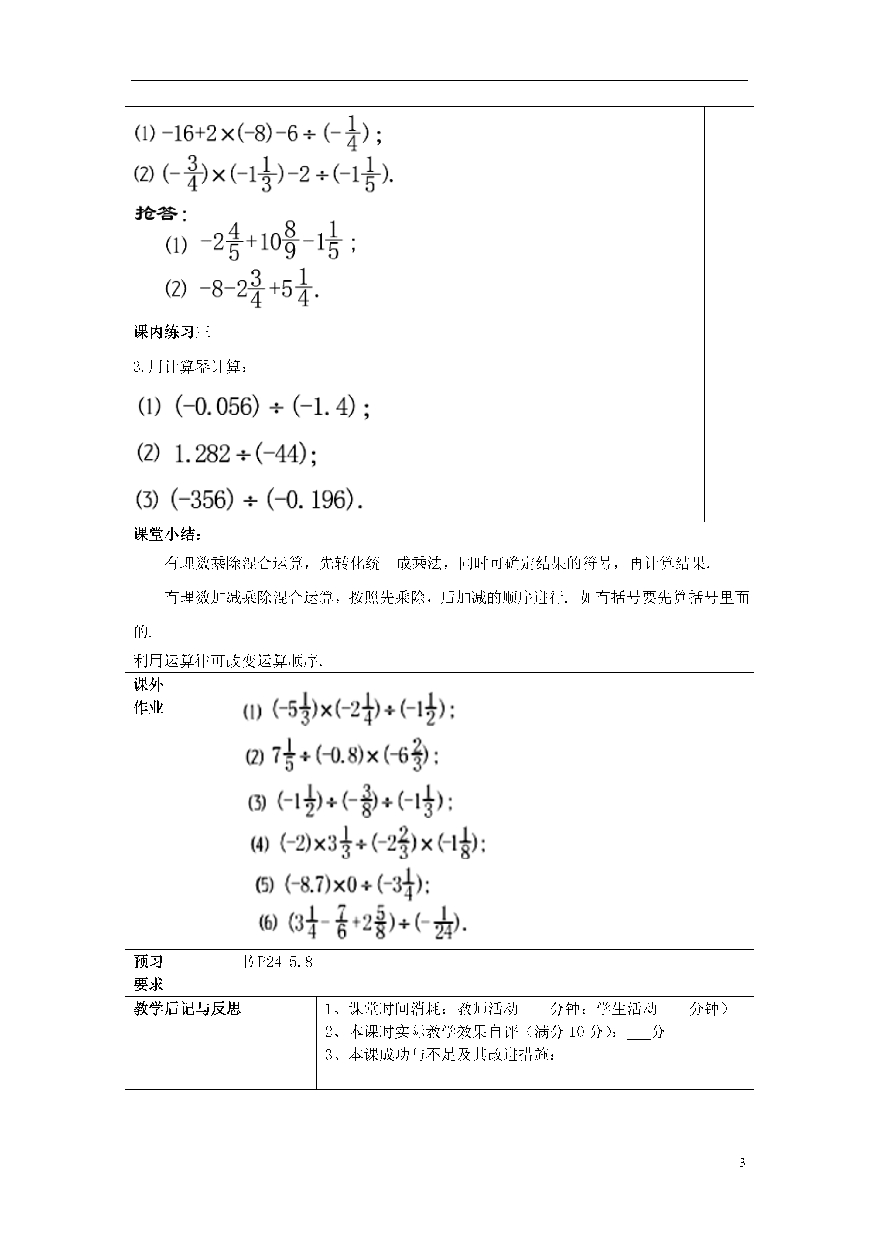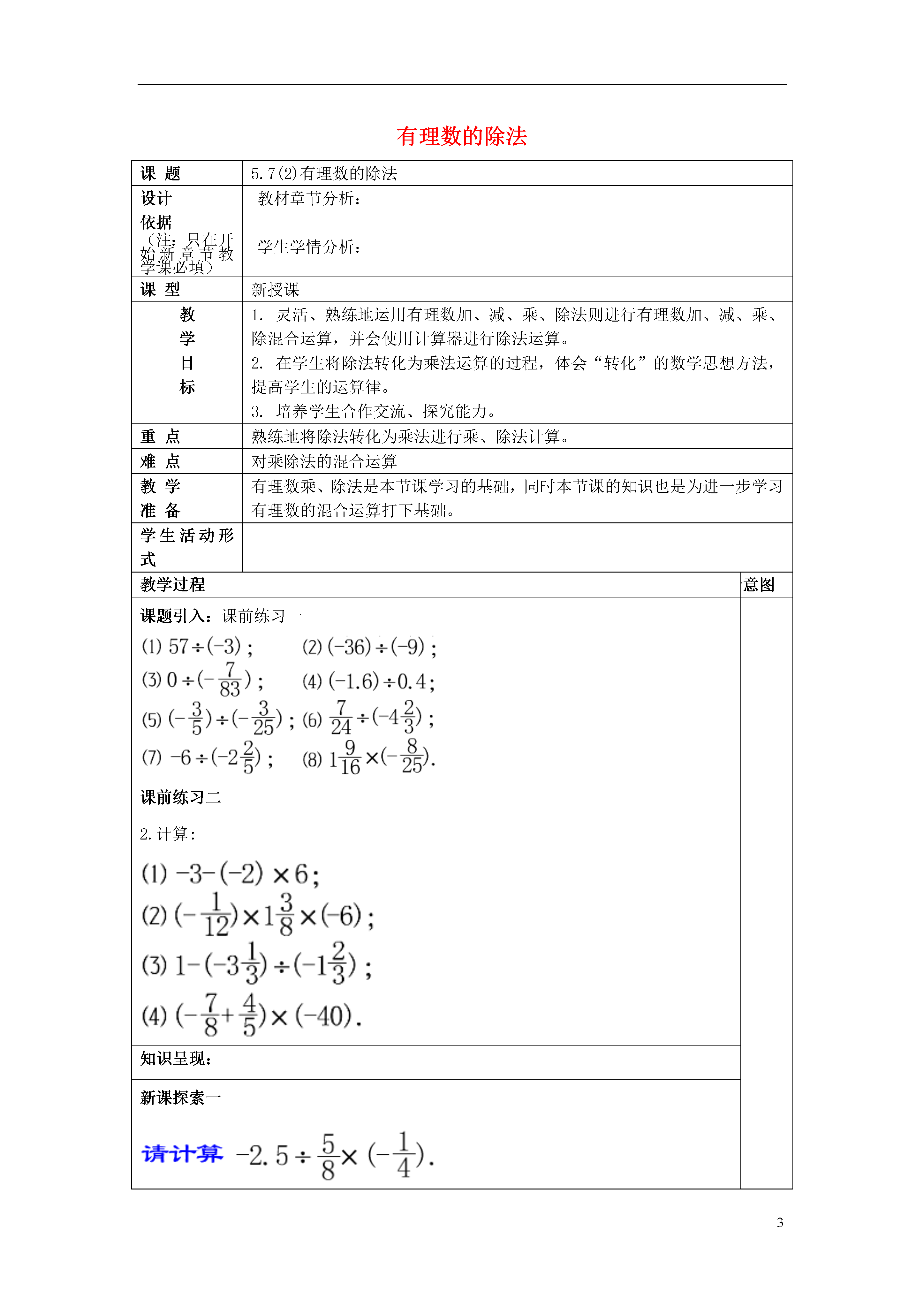 3有理数的除法课题5.7(2)有理数的除法设计依据(注:只在开始新章节教学课必填)教材章节分析:学生学情分析:课型新授课教学目标1.灵活、熟练地运用有理数加、减、乘、除法则进行有理数加、减、乘、除混合运算,并会使用计算器进行除法运算。2.在学生将除法转化为乘法运算的过程,体会“转化”的数学思想方法,提高学生的运算律。3.培养学生合作交流、探究能力。重点熟练地将除法转化为乘法进行乘、除法计算。难点对乘除法的混合运算教学准备有理数乘、除法是本节课学习的基础,同时本节课的知识也是为进一步学习有理数的混合运算打下基础。学生活动形式教学过程设计意图课题引入:课前练习一课前练习二2.计算:知识呈现:新课探索一新课探索二下列哪几种看法是正确的?新课探索三例2某公司去年1-3月平均每月亏损1.5万元,4-6月平均每月盈利2万元,7-9月平均每月盈利1.7万元,10-12月平均每月亏损2.3万元,这个公司去年总的盈亏情况如何?课内练习一1.计算:课内练习二2.计算:课内练习三3.用计算器计算:课堂小结:有理数乘除混合运算,先转化统一成乘法,同时可确定结果的符号,再计算结果.有理数加减乘除混合运算,按照先乘除,后加减的顺序进行.如有括号要先算括号里面的.利用运算律可改变运算顺序.课外作业预习要求书P245.8教学后记与反思1、课堂时间消耗:教师活动分钟;学生活动分钟)2、本课时实际教学效果自评(满分10分):分3、本课成功与不足及其改进措施: