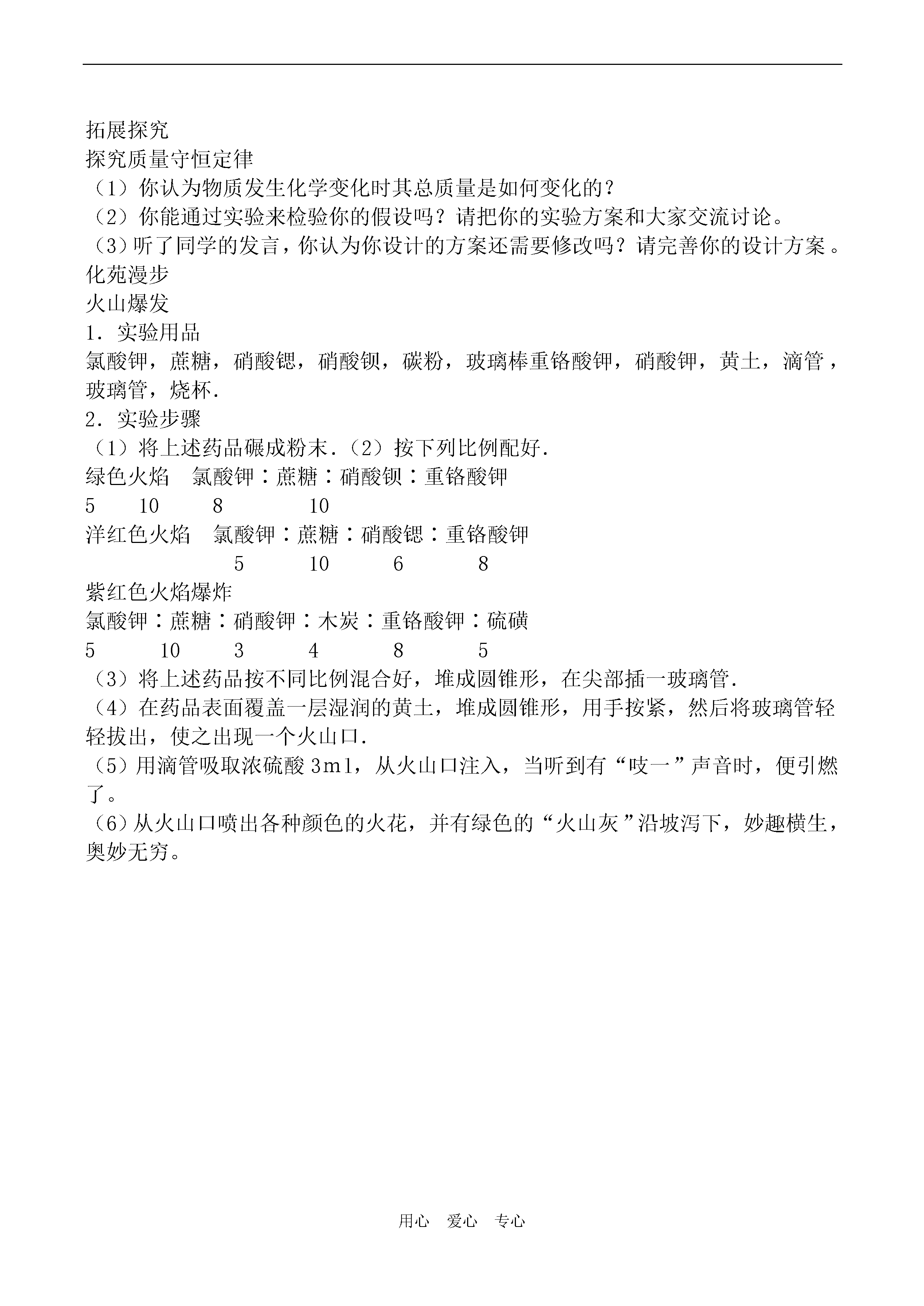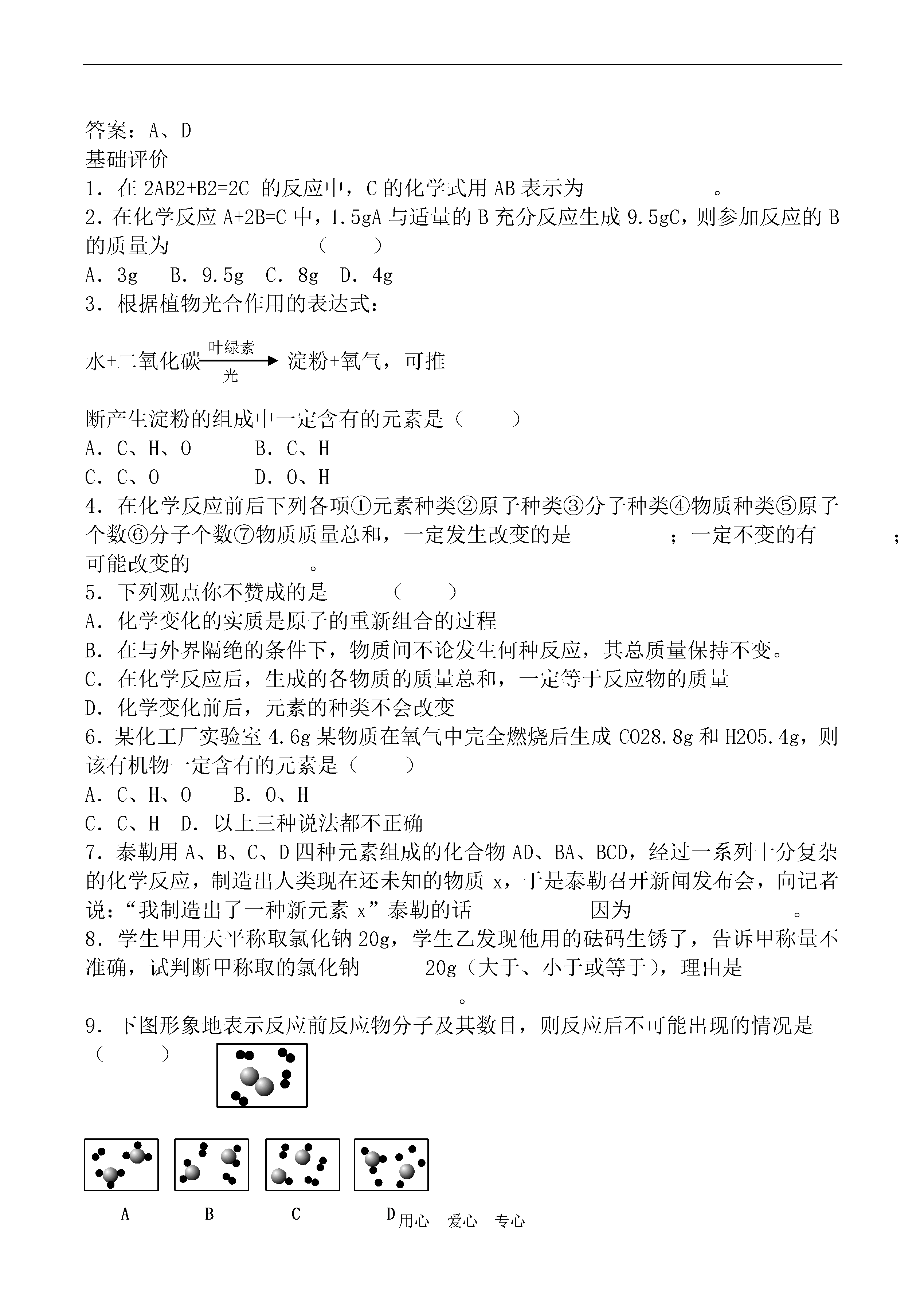 用心爱心专心定量认识化学变化自学导航1.物质在发生化学变化时,一定有()A.新物质生成B.能量变化C.颜色变化D.生成气体或沉淀2.火柴燃烧是变化,反应后灰烬的质量比反应前;酒精灯里的酒精燃烧后(有、无)灰烬,属_变化。3.铁钉生锈属变化,颜色变为,质量比铁钉(增大、减少)。4.这个规律叫质量守恒定律。5.物质发生化学反应前后质量守恒,是因为反应前后没有改变,没有增减,也没有变化指点迷津例1:小丁在化验室里检验一种新材料的组成时,发现新材料在纯氧中燃烧只生成CO2和H2O,于是他就认为新材料是由C、H、O三种元素组织的,他的判断正确吗?正确的判断应该是什么?思路分析:根据质量守恒定律,在化学反应中,反应前后原子的种类没有改变,原子的个数没有增减,原子质量没有改变,因此反应物、生成物所含元素种类应该相同。由题意可知,生成物中含C、H、O三种元素。在该物质中肯定含有C、H两种元素,而氧元素可能全部来自氧气,也可能部分来自新材料,即该化合物可能含有氧元素。答案:他的判断不正确,正确的判断应该是:一定含C、H元素,可能含O元素。例2、下列说法能用质量守恒定律解释的是()A.镁带在空气中燃烧后,生成物的质量比镁带质量增加了B.蜡烛完全燃烧后,生成水和二氧化碳的质量之和等于蜡烛质量C.水的质量和受热变成水蒸汽的质量相等D.高锰酸钾受热分解后,剩余固体的质量比反应物质量轻思路分析:应用质量守恒定律分析和解释问题时,要注意:“发生反应的”“反应生成的”“质量总和”等关键词语。A中是镁和氧气反应生成氧化镁,氧化镁的质量必然大于镁的质量,故A正确。B中是蜡烛和氧气反应生成CO2和H2O,反应生成CO2和H2O的质量总和应该等于参加反应的蜡烛和氧气的质量之和,故B错误。C中的变化不属于化学变化,所以不能用质量守恒定律来解释。D中高锰酸钾受热分解生成锰酸钾、二氧化锰和氧气,所以剩余固体锰酸钾、二氧化锰的质量比高锰酸钾的质量轻,故D正确。答案:A、D基础评价1.在2AB2+B2=2C的反应中,C的化学式用AB表示为。2.在化学反应A+2B=C中,1.5gA与适量的B充分反应生成9.5gC,则参加反应的B的质量为()A.3gB.9.5gC.8gD.4g3.根据植物光合作用的表达式:叶绿素光水+二氧化碳淀粉+氧气,可推断产生淀粉的组成中一定含有的元素是()A.C、H、OB.C、HC.C、OD.O、H4.在化学反应前后下列各项①元素种类②原子种类③分子种类④物质种类⑤原子个数⑥分子个数⑦物质质量总和,一定发生改变的是;一定不变的有;可能改变的。5.下列观点你不赞成的是()A.化学变化的实质是原子的重新组合的过程B.在与外界隔绝的条件下,物质间不论发生何种反应,其总质量保持不变。C.在化学反应后,生成的各物质的质量总和,一定等于反应物的质量D.化学变化前后,元素的种类不会改变6.某化工厂实验室4.6g某物质在氧气中完全燃烧后生成CO28.8g和H2O5.4g,则该有机物一定含有的元素是()A.C、H、OB.O、HC.C、HD.以上三种说法都不正确7.泰勒用A、B、C、D四种元素组成的化合物AD、BA、BCD,经过一系列十分复杂的化学反应,制造出人类现在还未知的物质x,于是泰勒召开新闻发布会,向记者说:“我制造出了一种新元素x”泰勒的话因为。8.学生甲用天平称取氯化钠20g,学生乙发现他用的砝码生锈了,告诉甲称量不准确,试判断甲称取的氯化钠20g(大于、小于或等于),理由是。9.下图形象地表示反应前反应物分子及其数目,则反应后不可能出现的情况是()拓展探究探究质量守恒定律(1)你认为物质发生化学变化时其总质量是如何变化的?(2)你能通过实验来检验你的假设吗?请把你的实验方案和大家交流讨论。(3)听了同学的发言,你认为你设计的方案还需要修改吗?请完善你的设计方案。化苑漫步火山爆发1.实验用品氯酸钾,蔗糖,硝酸锶,硝酸钡,碳粉,玻璃棒重铬酸钾,硝酸钾,黄土,滴管,玻璃管,烧杯.2.实验步骤(1)将上述药品碾成粉末.(2)按下列比例配好.绿色火焰氯酸钾∶蔗糖∶硝酸钡∶重铬酸钾510810洋红色火焰氯酸钾∶蔗糖∶硝酸锶∶重铬酸钾51068紫红色火焰爆炸氯酸钾∶蔗糖∶硝酸钾∶木炭∶重铬酸钾∶硫磺5103485(3)将上述药品按不同比例混合好,堆成圆锥形,在尖部插一玻璃管.(4)在药品表面覆盖一层湿润的黄土,堆成圆锥形,用手按紧,然后将玻璃管轻轻拔出,使之出现一个火山口.(5)用滴管吸取浓硫酸3ml,从火山口注入,当听到有“吱一”声音时,便引燃了。(6)从火山口喷出各种颜色的火花,并有绿色的“火山灰”沿坡泻下