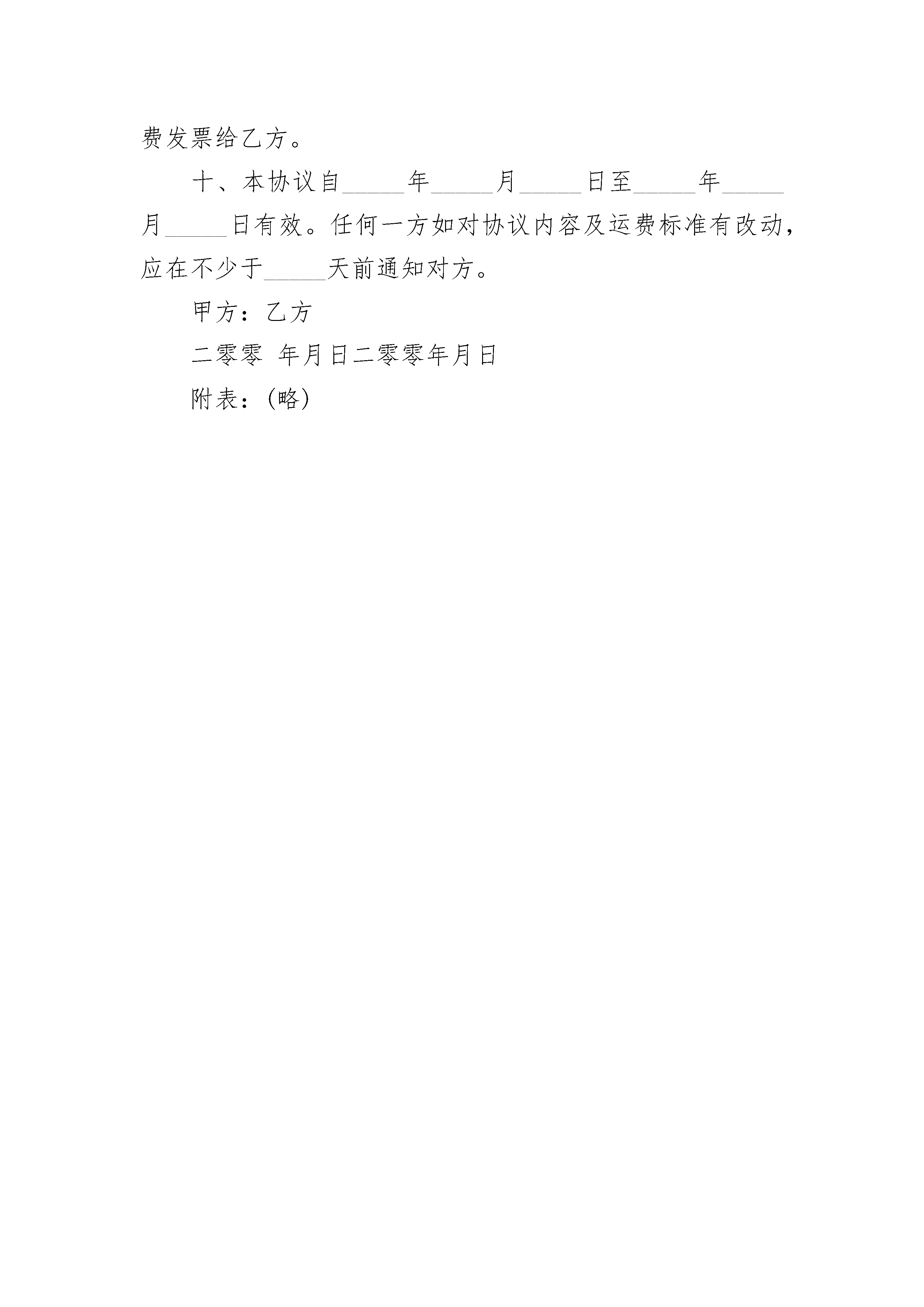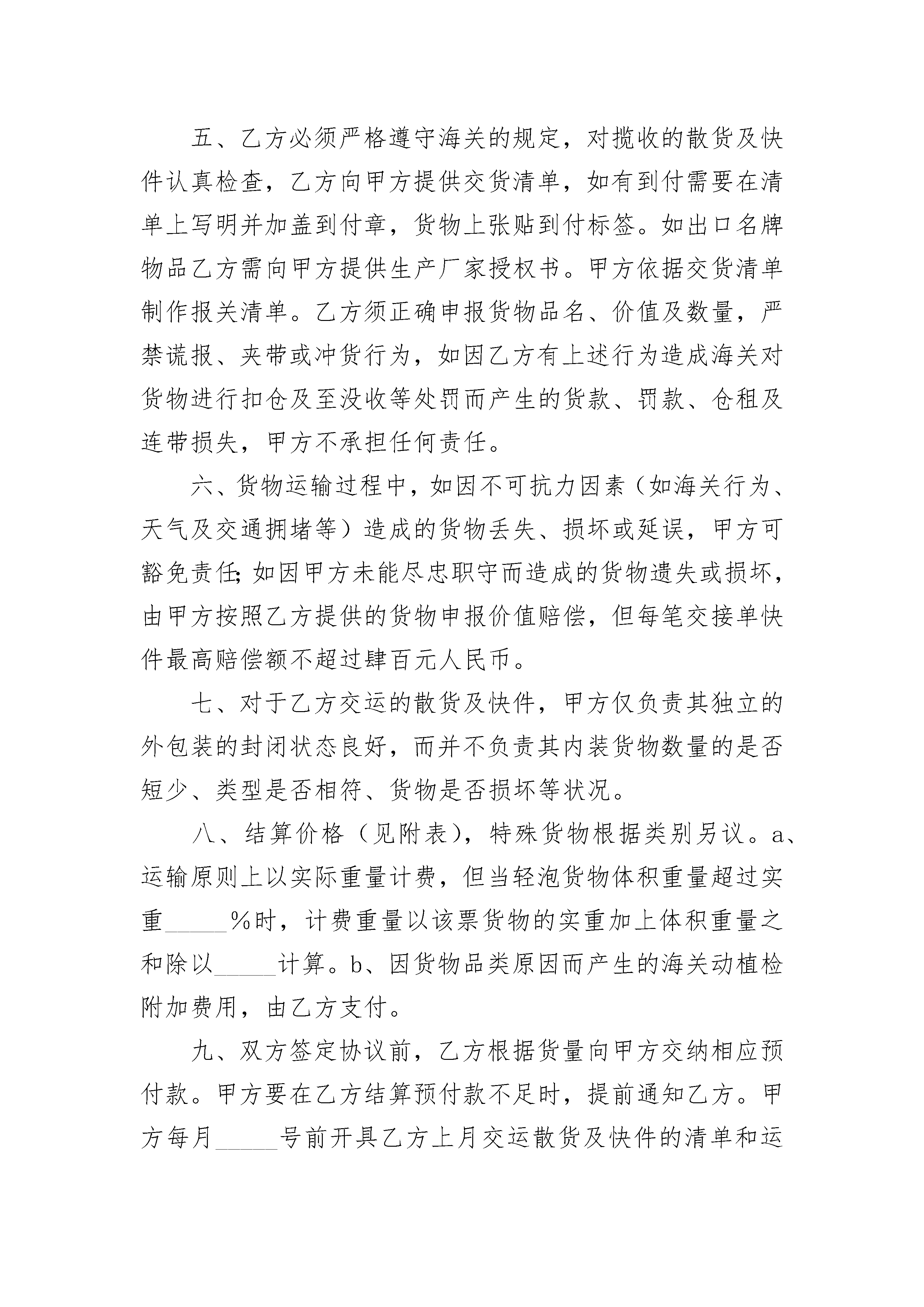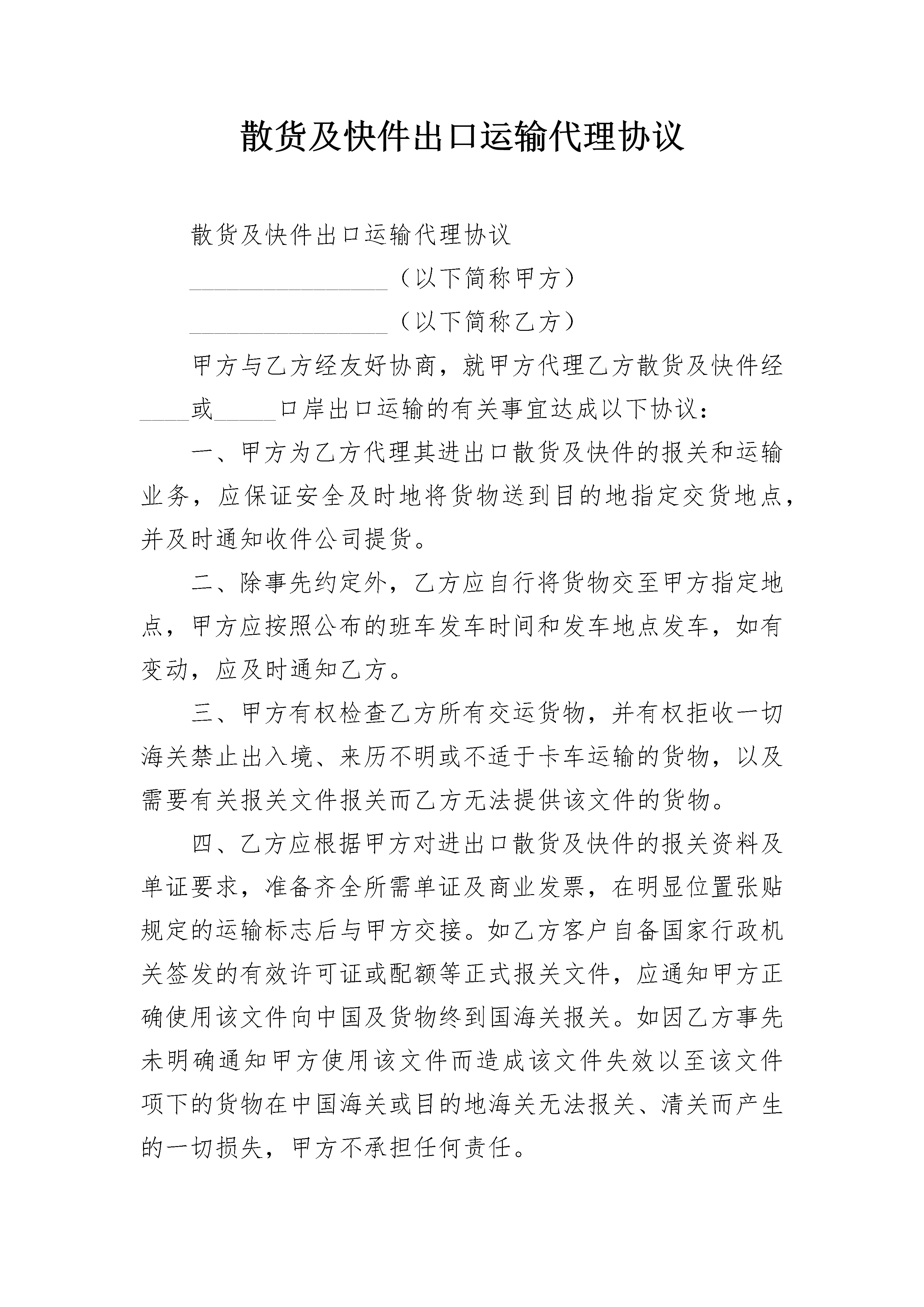 散货及快件出口运输代理协议散货及快件出口运输代理协议________________(以下简称甲方)________________(以下简称乙方)甲方与乙方经友好协商,就甲方代理乙方散货及快件经____或_____口岸出口运输的有关事宜达成以下协议:一、甲方为乙方代理其进出口散货及快件的报关和运输业务,应保证安全及时地将货物送到目的地指定交货地点,并及时通知收件公司提货。二、除事先约定外,乙方应自行将货物交至甲方指定地点,甲方应按照公布的班车发车时间和发车地点发车,如有变动,应及时通知乙方。三、甲方有权检查乙方所有交运货物,并有权拒收一切海关禁止出入境、来历不明或不适于卡车运输的货物,以及需要有关报关文件报关而乙方无法提供该文件的货物。四、乙方应根据甲方对进出口散货及快件的报关资料及单证要求,准备齐全所需单证及商业发票,在明显位置张贴规定的运输标志后与甲方交接。如乙方客户自备国家行政机关签发的有效许可证或配额等正式报关文件,应通知甲方正确使用该文件向中国及货物终到国海关报关。如因乙方事先未明确通知甲方使用该文件而造成该文件失效以至该文件项下的货物在中国海关或目的地海关无法报关、清关而产生的一切损失,甲方不承担任何责任。五、乙方必须严格遵守海关的规定,对揽收的散货及快件认真检查,乙方向甲方提供交货清单,如有到付需要在清单上写明并加盖到付章,货物上张贴到付标签。如出口名牌物品乙方需向甲方提供生产厂家授权书。甲方依据交货清单制作报关清单。乙方须正确申报货物品名、价值及数量,严禁谎报、夹带或冲货行为,如因乙方有上述行为造成海关对货物进行扣仓及至没收等处罚而产生的货款、罚款、仓租及连带损失,甲方不承担任何责任。六、货物运输过程中,如因不可抗力因素(如海关行为、天气及交通拥堵等)造成的货物丢失、损坏或延误,甲方可豁免责任;如因甲方未能尽忠职守而造成的货物遗失或损坏,由甲方按照乙方提供的货物申报价值赔偿,但每笔交接单快件最高赔偿额不超过肆百元人民币。七、对于乙方交运的散货及快件,甲方仅负责其独立的外包装的封闭状态良好,而并不负责其内装货物数量的是否短少、类型是否相符、货物是否损坏等状况。八、结算价格(见附表),特殊货物根据类别另议。a、运输原则上以实际重量计费,但当轻泡货物体积重量超过实重_____%时,计费重量以该票货物的实重加上体积重量之和除以_____计算。b、因货物品类原因而产生的海关动植检附加费用,由乙方支付。九、双方签定协议前,乙方根据货量向甲方交纳相应预付款。甲方要在乙方结算预付款不足时,提前通知乙方。甲方每月_____号前开具乙方上月交运散货及快件的清单和运费发票给乙方。十、本协议自_____年_____月_____日至_____年_____月_____日有效。任何一方如对协议内容及运费标准有改动,应在不少于_____天前通知对方。甲方:乙方二零零年月日二零零年月日附表:(略)