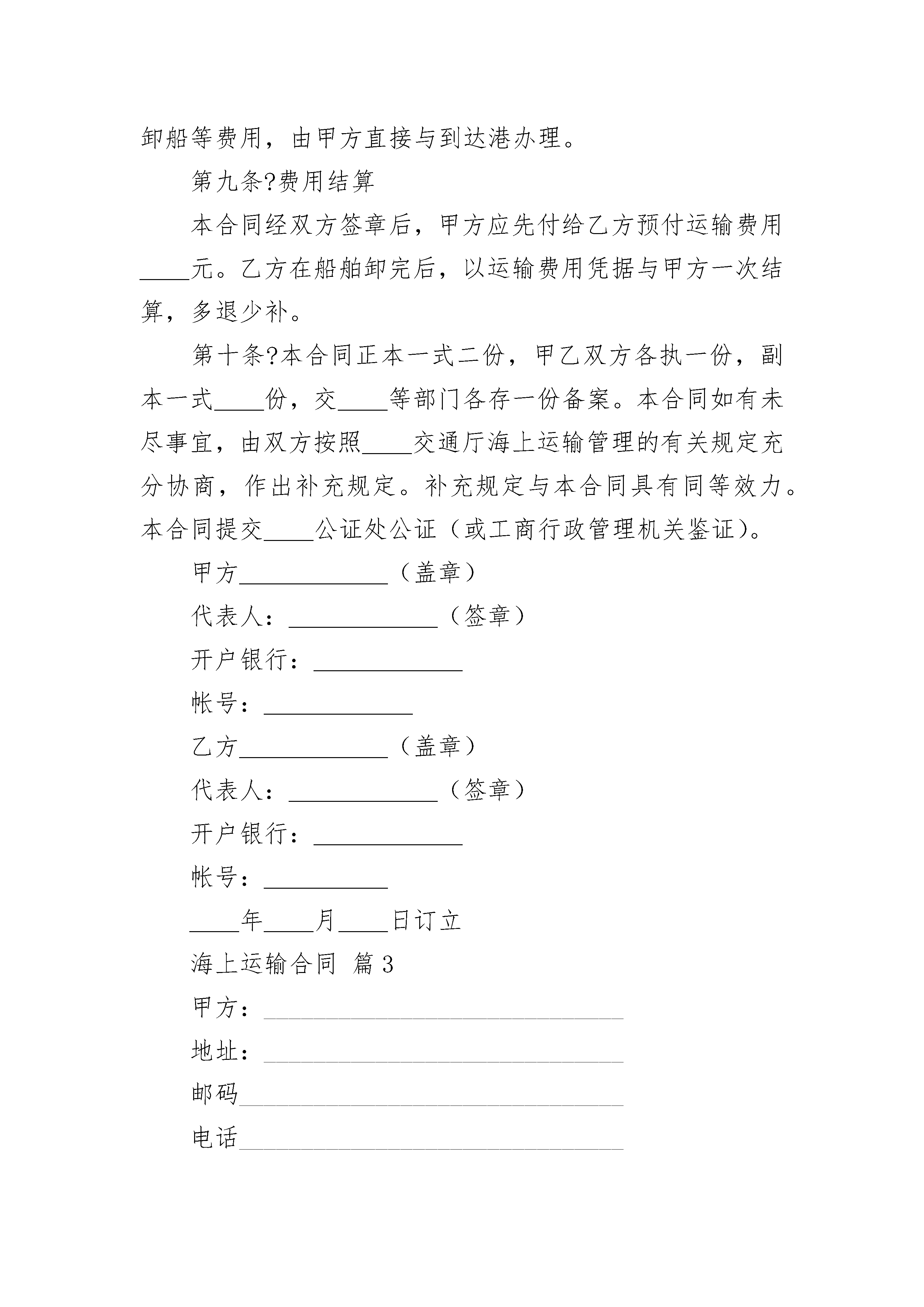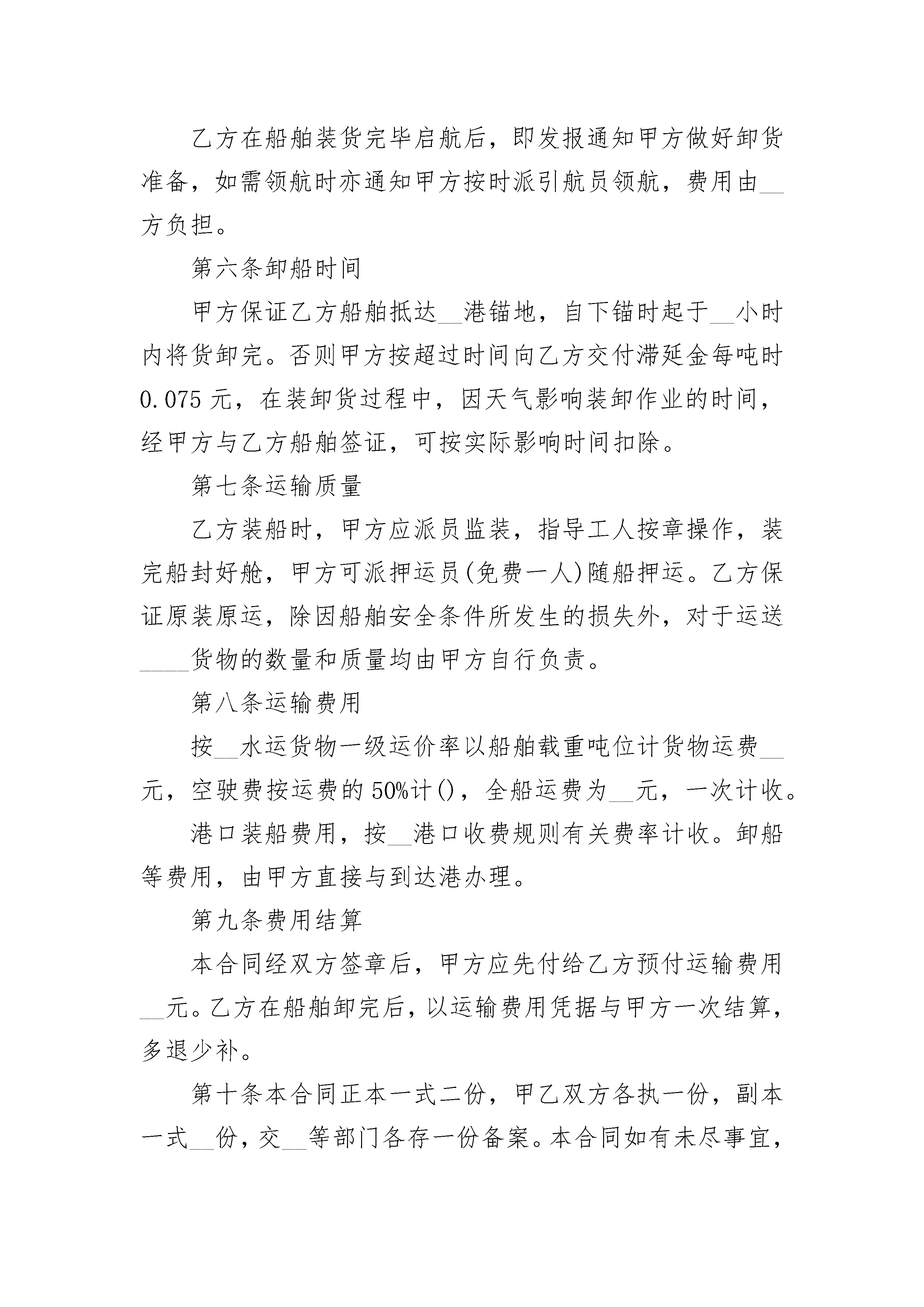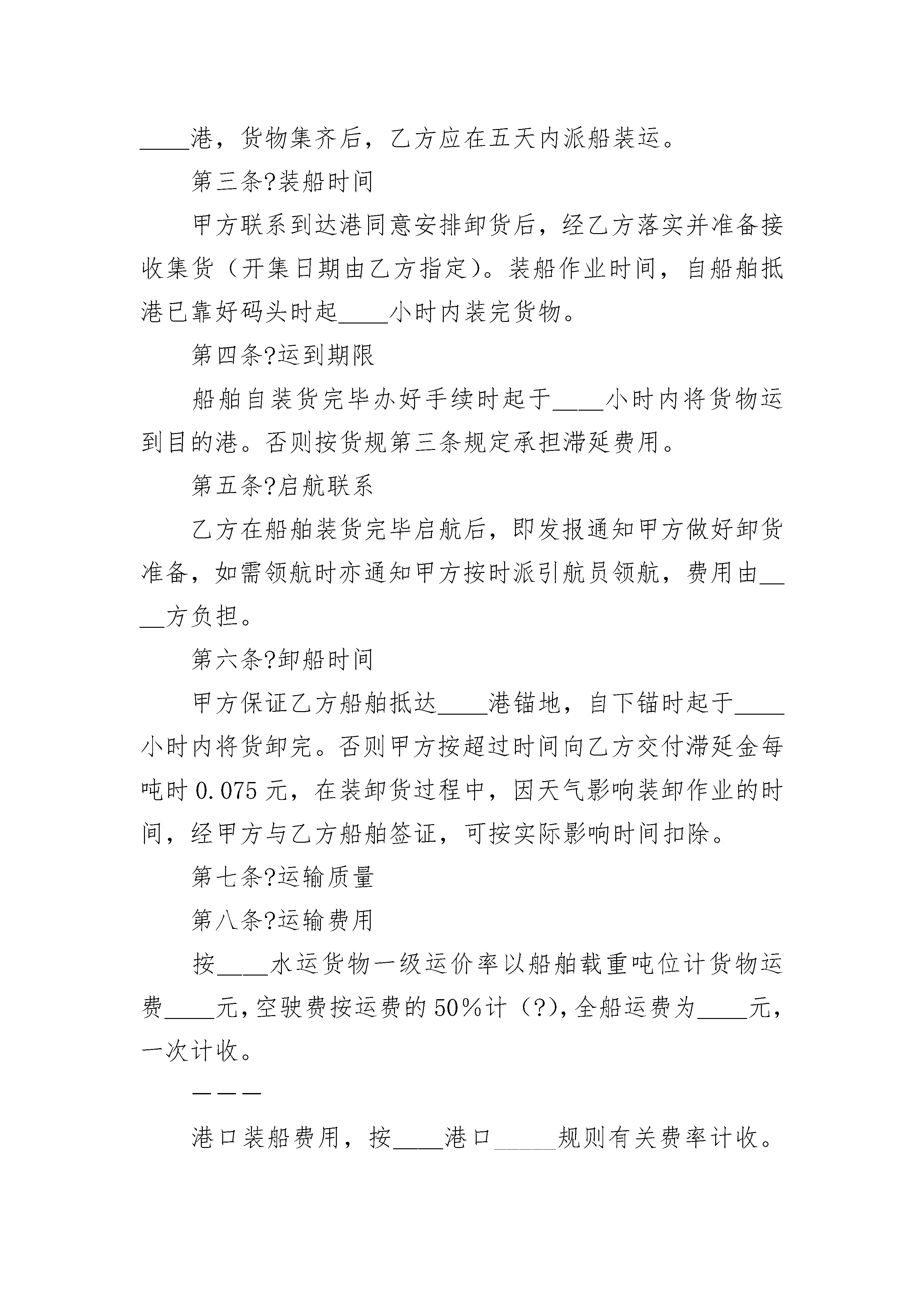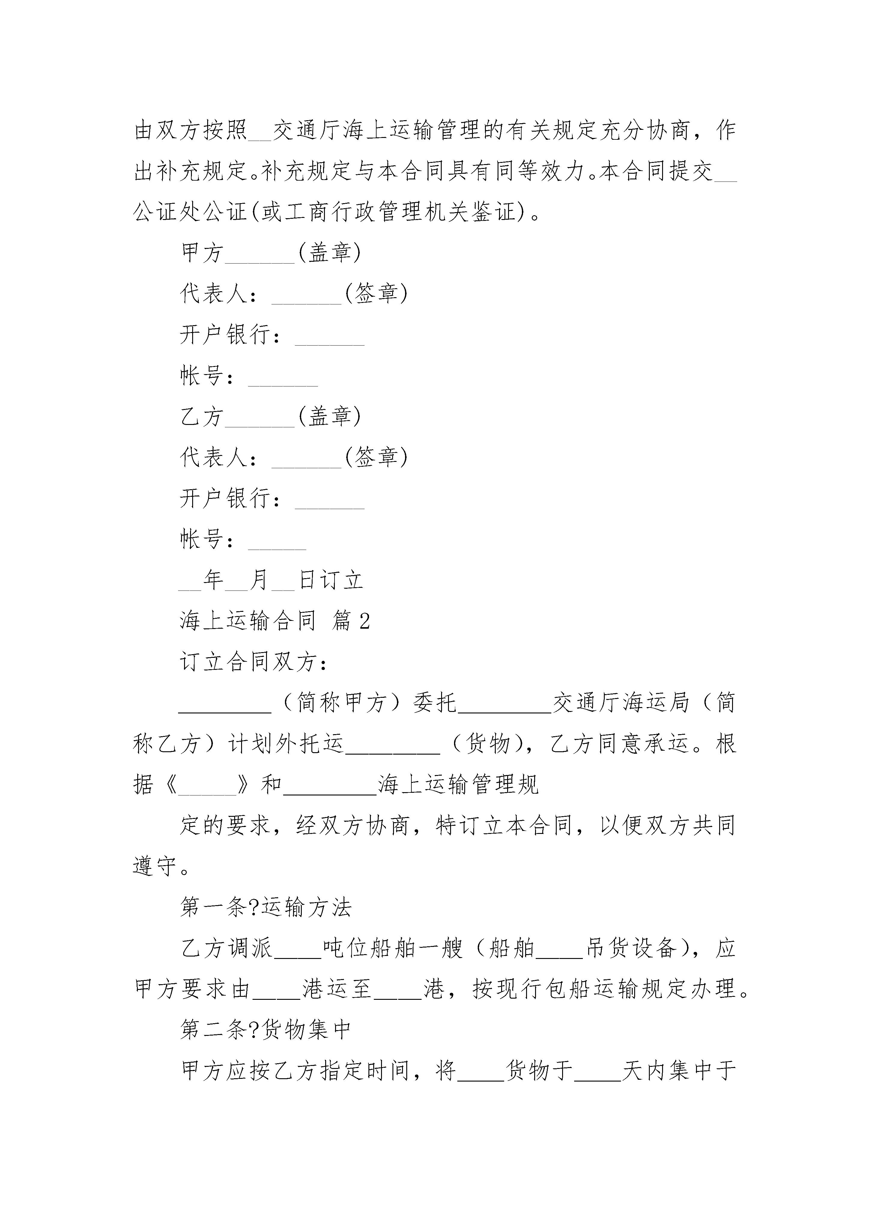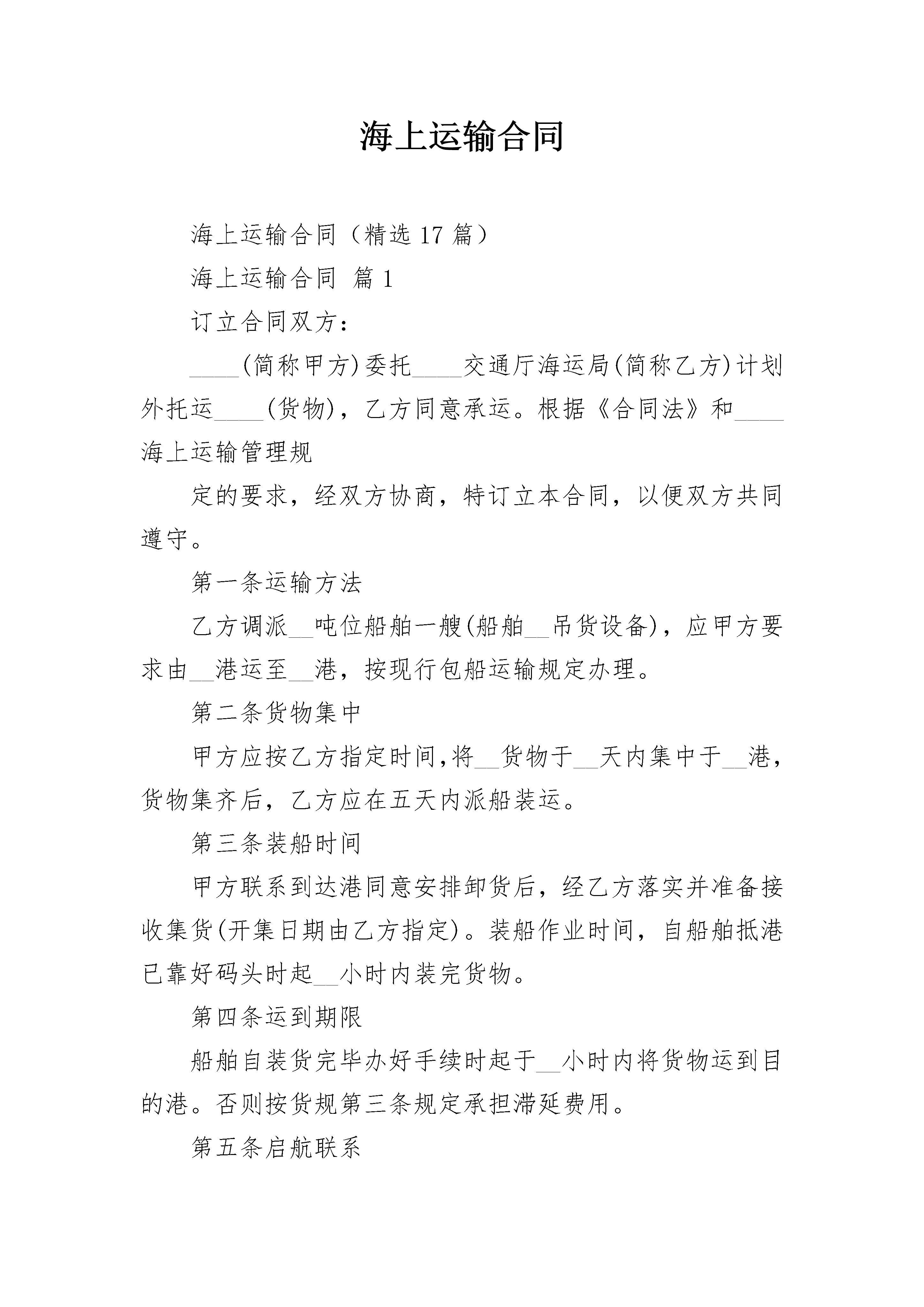 海上运输合同海上运输合同(精选17篇)海上运输合同篇1订立合同双方:____(简称甲方)委托____交通厅海运局(简称乙方)计划外托运____(货物),乙方同意承运。根据《合同法》和____海上运输管理规定的要求,经双方协商,特订立本合同,以便双方共同遵守。第一条运输方法乙方调派__吨位船舶一艘(船舶__吊货设备),应甲方要求由__港运至__港,按现行包船运输规定办理。第二条货物集中甲方应按乙方指定时间,将__货物于__天内集中于__港,货物集齐后,乙方应在五天内派船装运。第三条装船时间甲方联系到达港同意安排卸货后,经乙方落实并准备接收集货(开集日期由乙方指定)。装船作业时间,自船舶抵港已靠好码头时起__小时内装完货物。第四条运到期限船舶自装货完毕办好手续时起于__小时内将货物运到目的港。否则按货规第三条规定承担滞延费用。第五条启航联系乙方在船舶装货完毕启航后,即发报通知甲方做好卸货准备,如需领航时亦通知甲方按时派引航员领航,费用由__方负担。第六条卸船时间甲方保证乙方船舶抵达__港锚地,自下锚时起于__小时内将货卸完。否则甲方按超过时间向乙方交付滞延金每吨时0.075元,在装卸货过程中,因天气影响装卸作业的时间,经甲方与乙方船舶签证,可按实际影响时间扣除。第七条运输质量乙方装船时,甲方应派员监装,指导工人按章操作,装完船封好舱,甲方可派押运员(免费一人)随船押运。乙方保证原装原运,除因船舶安全条件所发生的损失外,对于运送____货物的数量和质量均由甲方自行负责。第八条运输费用按__水运货物一级运价率以船舶载重吨位计货物运费__元,空驶费按运费的50%计(),全船运费为__元,一次计收。港口装船费用,按__港口收费规则有关费率计收。卸船等费用,由甲方直接与到达港办理。第九条费用结算本合同经双方签章后,甲方应先付给乙方预付运输费用__元。乙方在船舶卸完后,以运输费用凭据与甲方一次结算,多退少补。第十条本合同正本一式二份,甲乙双方各执一份,副本一式__份,交__等部门各存一份备案。本合同如有未尽事宜,由双方按照__交通厅海上运输管理的有关规定充分协商,作出补充规定。补充规定与本合同具有同等效力。本合同提交__公证处公证(或工商行政管理机关鉴证)。甲方______(盖章)代表人:______(签章)开户银行:______帐号:______乙方______(盖章)代表人:______(签章)开户银行:______帐号:_______年__月__日订立海上运输合同篇2订立合同双方:____(简称甲方)委托____交通厅海运局(简称乙方)计划外托运____(货物),乙方同意承运。根据《_____》和____海上运输管理规定的要求,经双方协商,特订立本合同,以便双方共同遵守。第一条?运输方法乙方调派__吨位船舶一艘(船舶__吊货设备),应甲方要求由__港运至__港,按现行包船运输规定办理。第二条?货物集中甲方应按乙方指定时间,将__货物于__天内集中于__港,货物集齐后,乙方应在五天内派船装运。第三条?装船时间甲方联系到达港同意安排卸货后,经乙方落实并准备接收集货(开集日期由乙方指定)。装船作业时间,自船舶抵港已靠好码头时起__小时内装完货物。第四条?运到期限船舶自装货完毕办好手续时起于__小时内将货物运到目的港。否则按货规第三条规定承担滞延费用。第五条?启航联系乙方在船舶装货完毕启航后,即发报通知甲方做好卸货准备,如需领航时亦通知甲方按时派引航员领航,费用由__方负担。第六条?卸船时间甲方保证乙方船舶抵达__港锚地,自下锚时起于__小时内将货卸完。否则甲方按超过时间向乙方交付滞延金每吨时0.075元,在装卸货过程中,因天气影响装卸作业的时间,经甲方与乙方船舶签证,可按实际影响时间扣除。第七条?运输质量第八条?运输费用按__水运货物一级运价率以船舶载重吨位计货物运费__元,空驶费按运费的50%计(?),全船运费为__元,一次计收。---港口装船费用,按__港口_____规则有关费率计收。卸船等费用,由甲方直接与到达港办理。第九条?费用结算本合同经双方签章后,甲方应先付给乙方预付运输费用__元。乙方在船舶卸完后,以运输费用凭据与甲方一次结算,多退少补。第十条?本合同正本一式二份,甲乙双方各执一份,副本一式__份,交__等部门各存一份备案。本合同如有未尽事宜,由双方按照__交通厅海上运输管理的有关规定充分协商,作出补充规定。补充规定与本合同具有同等效力。本合同提交__公证处公证(或工商行政管理机关鉴证)。甲方______(盖章)代表人:______(签章)开户银行:______帐号:______乙方______(盖章)代表人:______(签章)开户银行:______帐号:_______年__月__日订立海上运输合同篇3甲方:_______