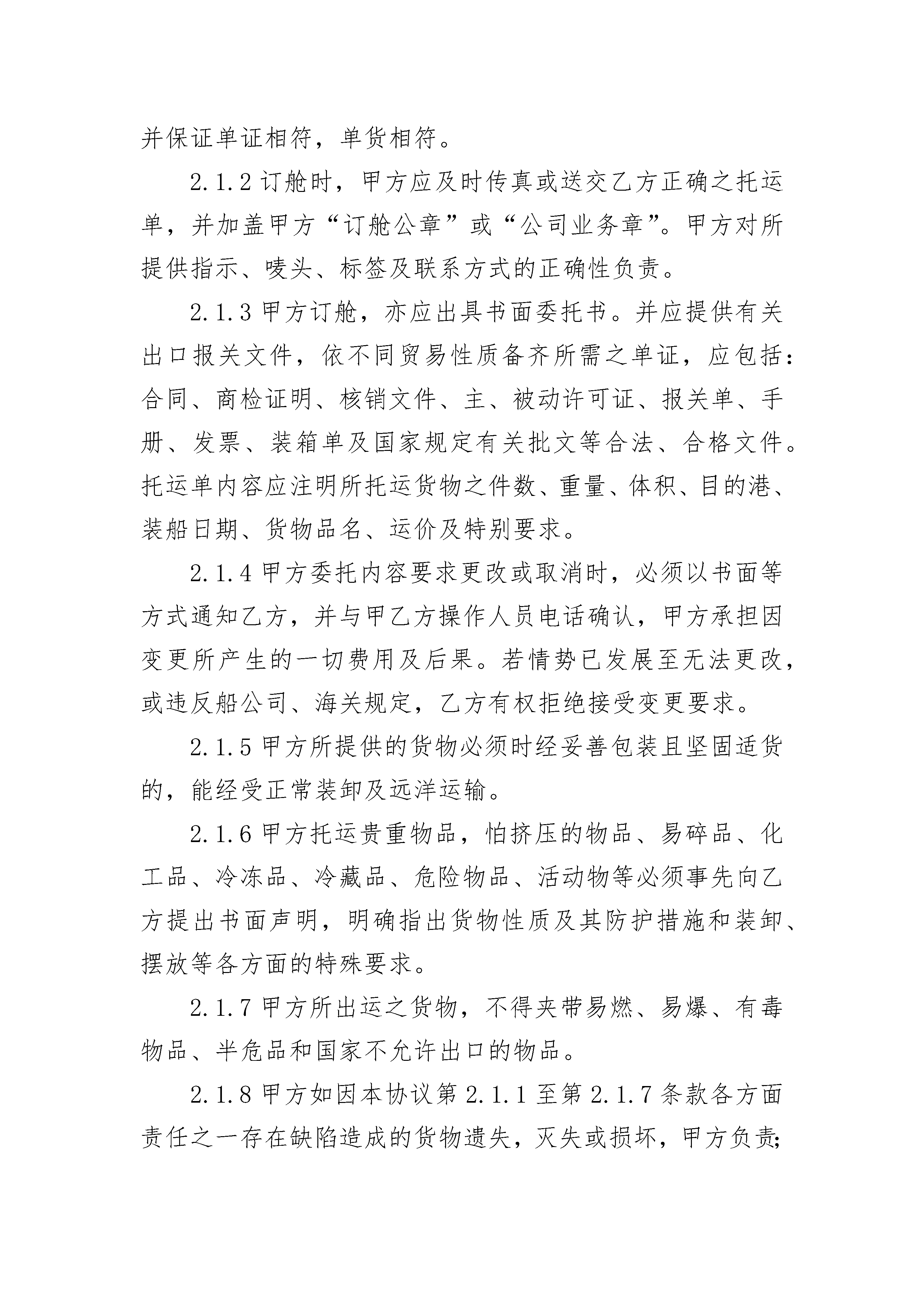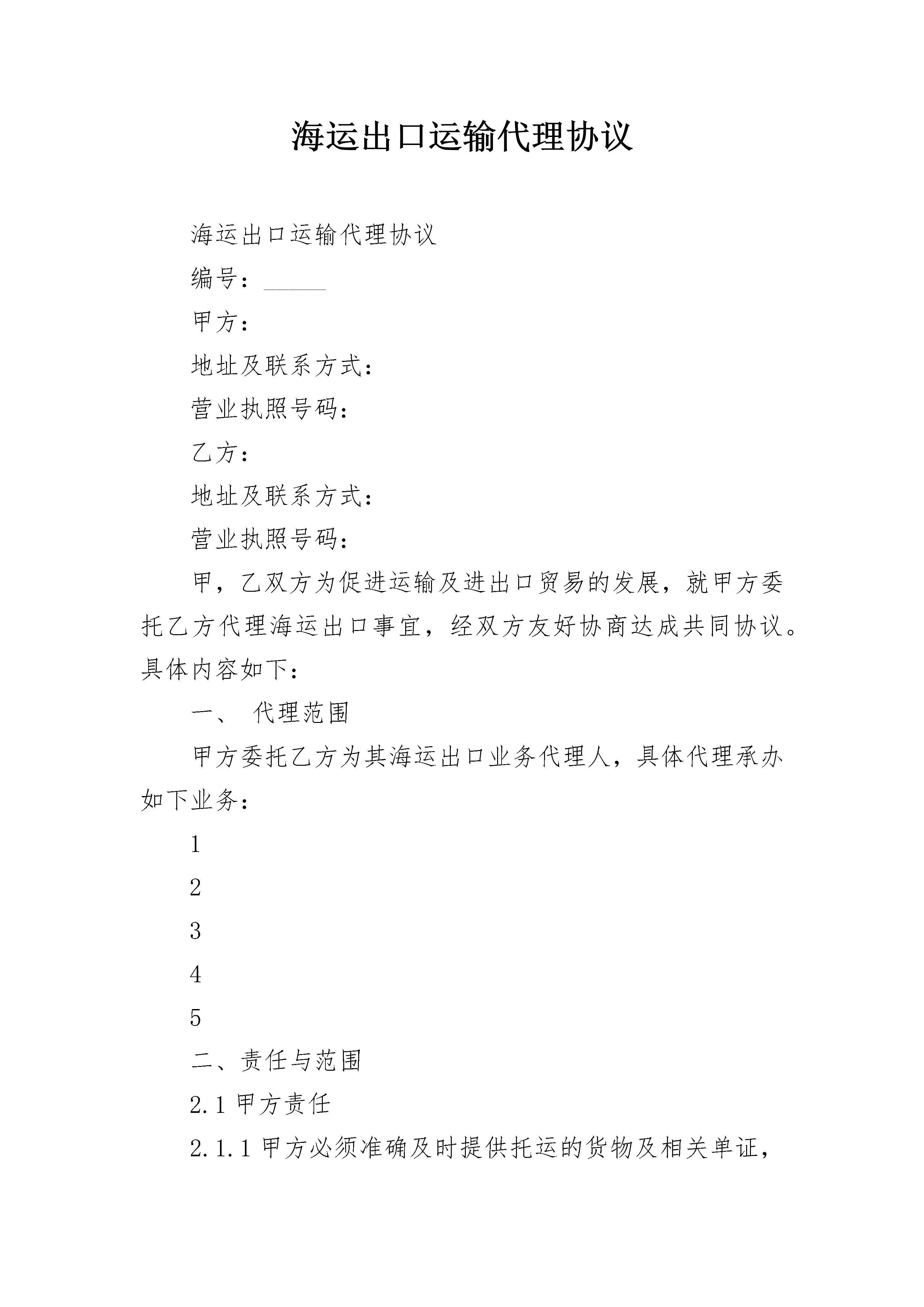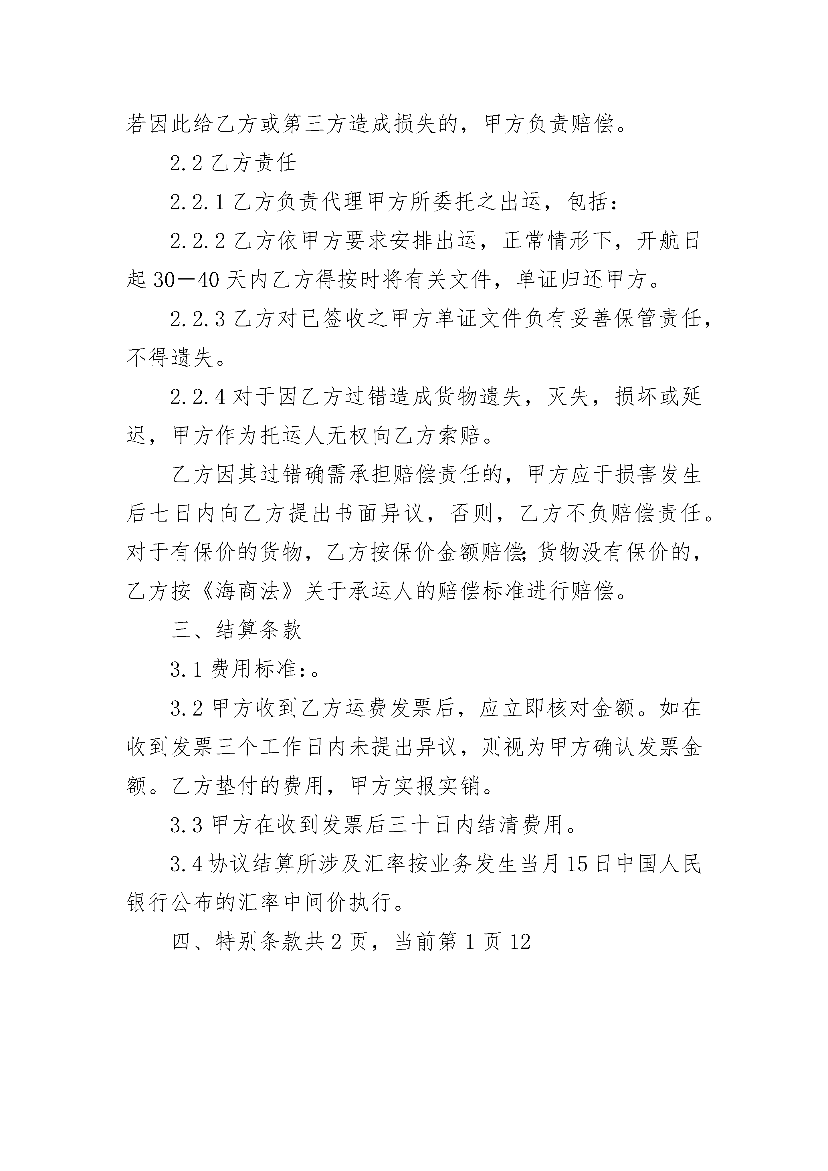 海运出口运输代理协议海运出口运输代理协议编号:_____甲方:地址及联系方式:营业执照号码:乙方:地址及联系方式:营业执照号码:甲,乙双方为促进运输及进出口贸易的发展,就甲方委托乙方代理海运出口事宜,经双方友好协商达成共同协议。具体内容如下:一、代理范围甲方委托乙方为其海运出口业务代理人,具体代理承办如下业务:12345二、责任与范围2.1甲方责任2.1.1甲方必须准确及时提供托运的货物及相关单证,并保证单证相符,单货相符。2.1.2订舱时,甲方应及时传真或送交乙方正确之托运单,并加盖甲方“订舱公章”或“公司业务章”。甲方对所提供指示、唛头、标签及联系方式的正确性负责。2.1.3甲方订舱,亦应出具书面委托书。并应提供有关出口报关文件,依不同贸易性质备齐所需之单证,应包括:合同、商检证明、核销文件、主、被动许可证、报关单、手册、发票、装箱单及国家规定有关批文等合法、合格文件。托运单内容应注明所托运货物之件数、重量、体积、目的港、装船日期、货物品名、运价及特别要求。2.1.4甲方委托内容要求更改或取消时,必须以书面等方式通知乙方,并与甲乙方操作人员电话确认,甲方承担因变更所产生的一切费用及后果。若情势已发展至无法更改,或违反船公司、海关规定,乙方有权拒绝接受变更要求。2.1.5甲方所提供的货物必须时经妥善包装且坚固适货的,能经受正常装卸及远洋运输。2.1.6甲方托运贵重物品,怕挤压的物品、易碎品、化工品、冷冻品、冷藏品、危险物品、活动物等必须事先向乙方提出书面声明,明确指出货物性质及其防护措施和装卸、摆放等各方面的特殊要求。2.1.7甲方所出运之货物,不得夹带易燃、易爆、有毒物品、半危品和国家不允许出口的物品。2.1.8甲方如因本协议第2.1.1至第2.1.7条款各方面责任之一存在缺陷造成的货物遗失,灭失或损坏,甲方负责;若因此给乙方或第三方造成损失的,甲方负责赔偿。2.2乙方责任2.2.1乙方负责代理甲方所委托之出运,包括:2.2.2乙方依甲方要求安排出运,正常情形下,开航日起30-40天内乙方得按时将有关文件,单证归还甲方。2.2.3乙方对已签收之甲方单证文件负有妥善保管责任,不得遗失。2.2.4对于因乙方过错造成货物遗失,灭失,损坏或延迟,甲方作为托运人无权向乙方索赔。乙方因其过错确需承担赔偿责任的,甲方应于损害发生后七日内向乙方提出书面异议,否则,乙方不负赔偿责任。对于有保价的货物,乙方按保价金额赔偿;货物没有保价的,乙方按《海商法》关于承运人的赔偿标准进行赔偿。三、结算条款3.1费用标准:。3.2甲方收到乙方运费发票后,应立即核对金额。如在收到发票三个工作日内未提出异议,则视为甲方确认发票金额。乙方垫付的费用,甲方实报实销。3.3甲方在收到发票后三十日内结清费用。3.4协议结算所涉及汇率按业务发生当月15日中国人民银行公布的汇率中间价执行。四、特别条款,当前12
