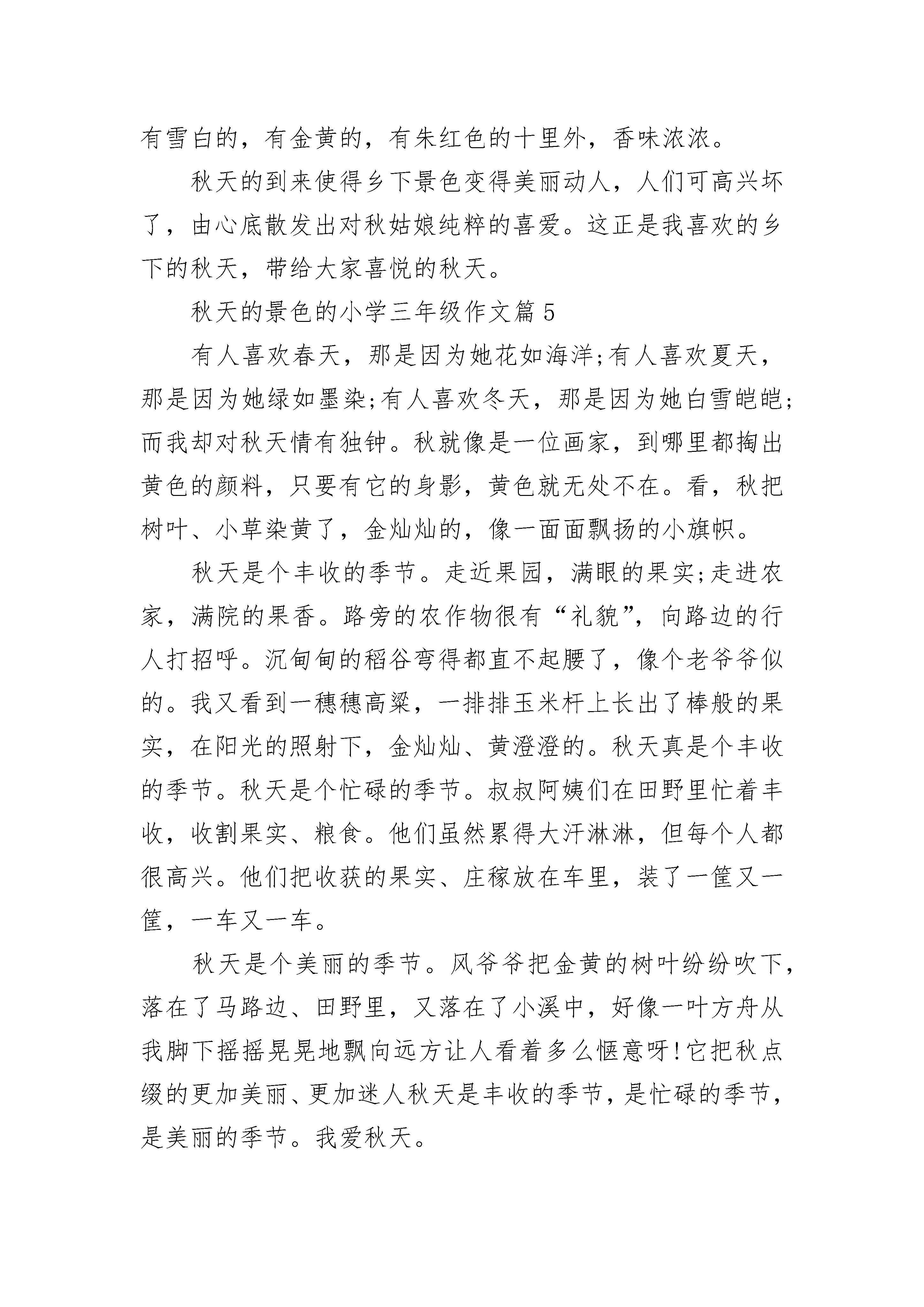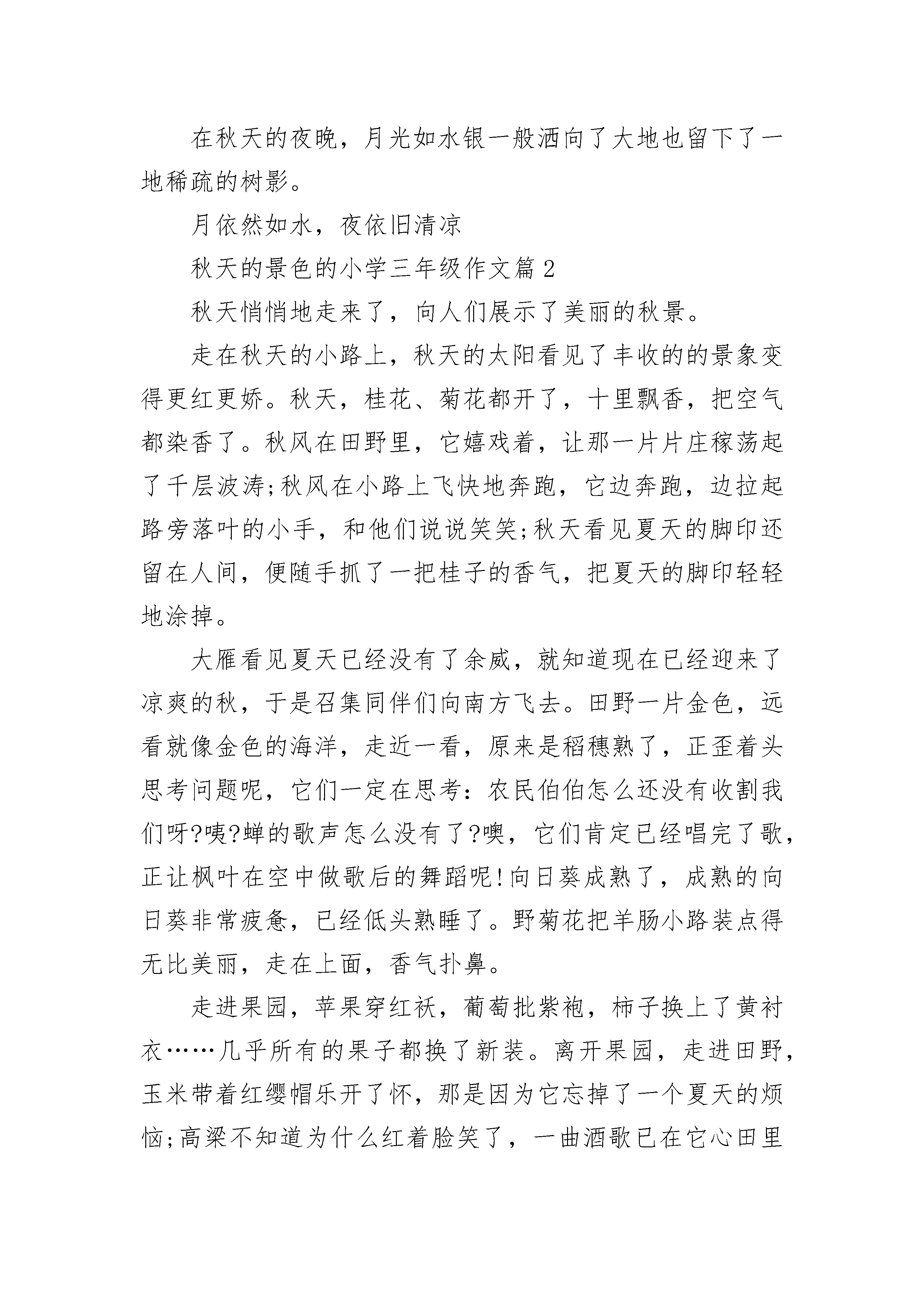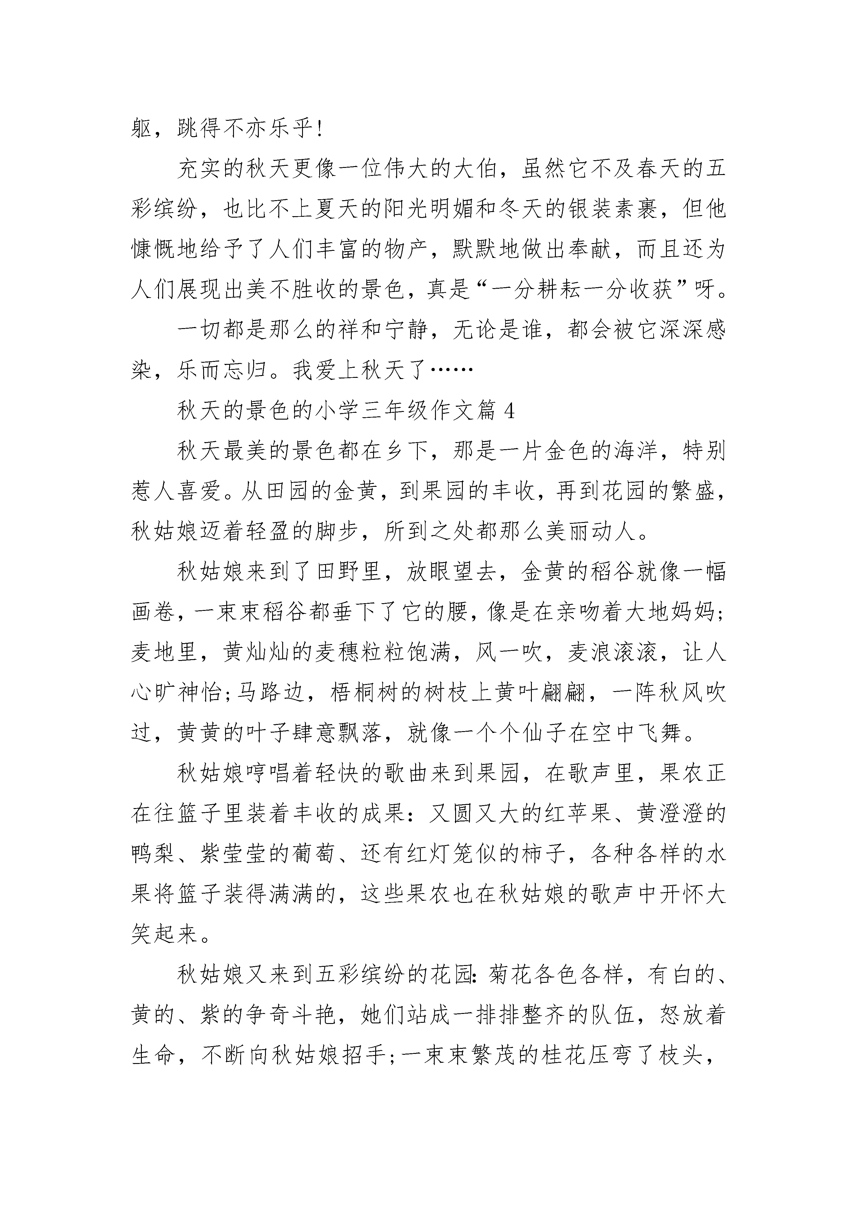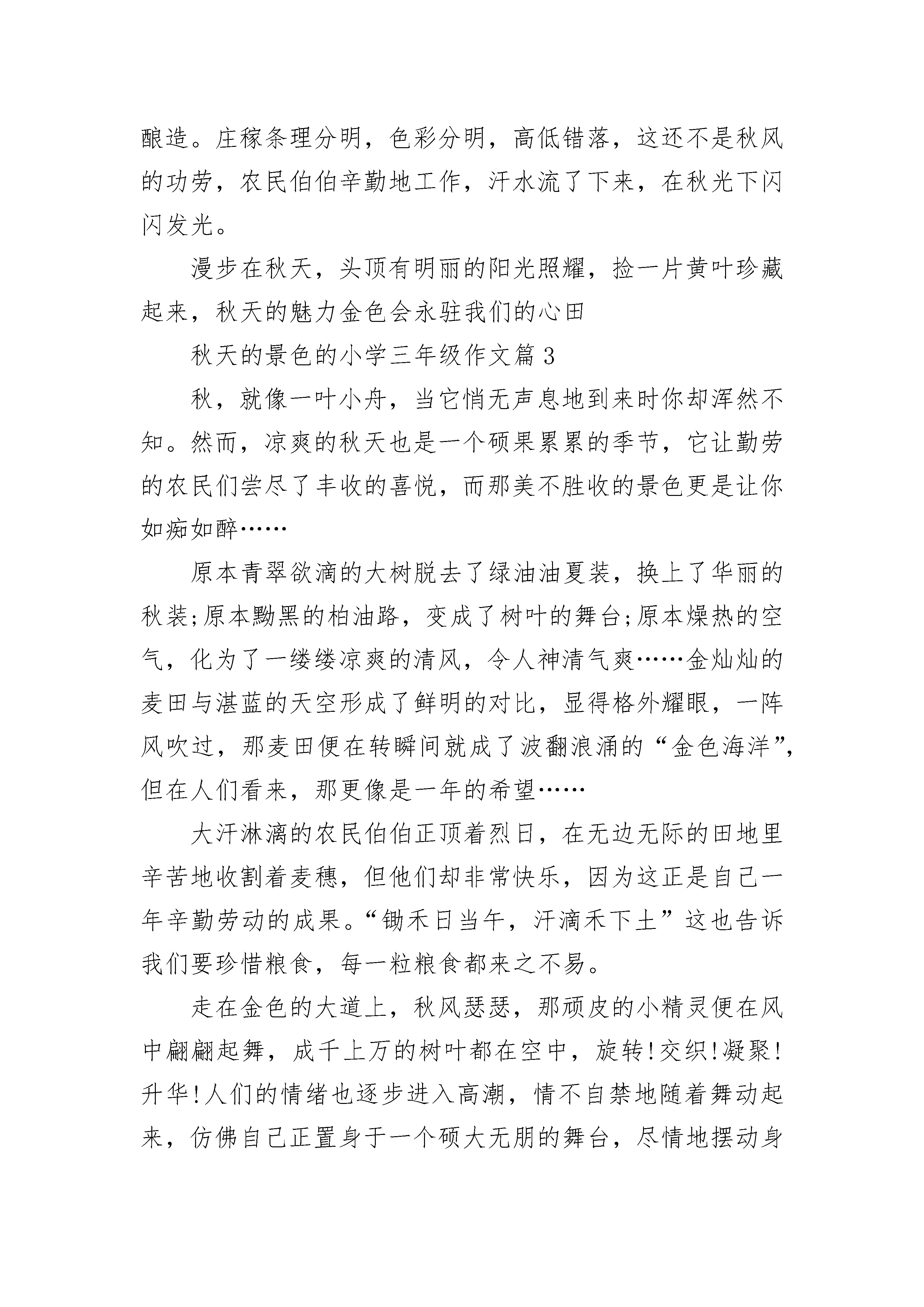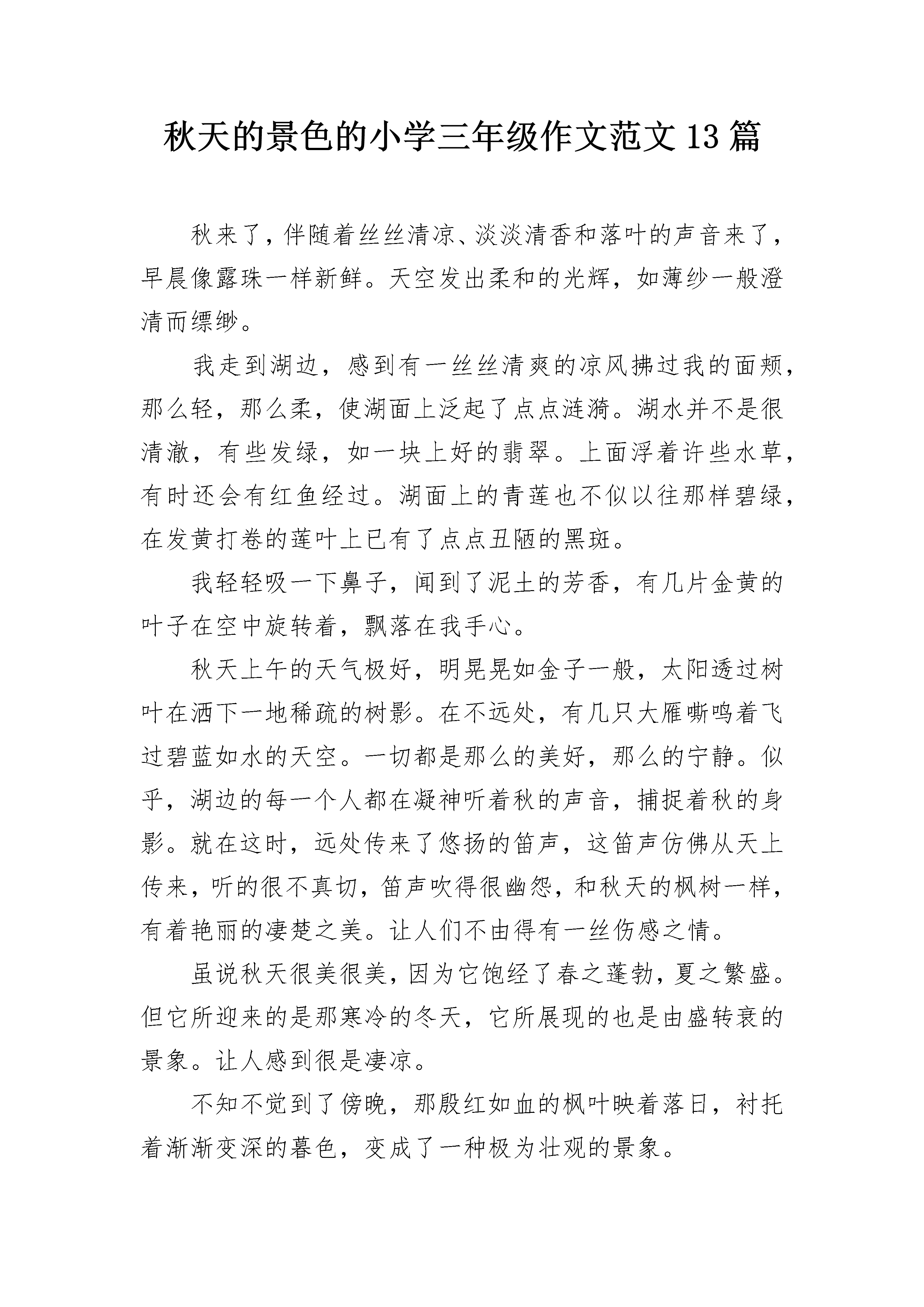 秋天的景色的小学三年级作文范文13篇秋来了,伴随着丝丝清凉、淡淡清香和落叶的声音来了,早晨像露珠一样新鲜。天空发出柔和的光辉,如薄纱一般澄清而缥缈。我走到湖边,感到有一丝丝清爽的凉风拂过我的面颊,那么轻,那么柔,使湖面上泛起了点点涟漪。湖水并不是很清澈,有些发绿,如一块上好的翡翠。上面浮着许些水草,有时还会有红鱼经过。湖面上的青莲也不似以往那样碧绿,在发黄打卷的莲叶上已有了点点丑陋的黑斑。我轻轻吸一下鼻子,闻到了泥土的芳香,有几片金黄的叶子在空中旋转着,飘落在我手心。秋天上午的天气极好,明晃晃如金子一般,太阳透过树叶在洒下一地稀疏的树影。在不远处,有几只大雁嘶鸣着飞过碧蓝如水的天空。一切都是那么的美好,那么的宁静。似乎,湖边的每一个人都在凝神听着秋的声音,捕捉着秋的身影。就在这时,远处传来了悠扬的笛声,这笛声仿佛从天上传来,听的很不真切,笛声吹得很幽怨,和秋天的枫树一样,有着艳丽的凄楚之美。让人们不由得有一丝伤感之情。虽说秋天很美很美,因为它饱经了春之蓬勃,夏之繁盛。但它所迎来的是那寒冷的冬天,它所展现的也是由盛转衰的景象。让人感到很是凄凉。不知不觉到了傍晚,那殷红如血的枫叶映着落日,衬托着渐渐变深的暮色,变成了一种极为壮观的景象。在秋天的夜晚,月光如水银一般洒向了大地也留下了一地稀疏的树影。月依然如水,夜依旧清凉秋天的景色的小学三年级作文篇2秋天悄悄地走来了,向人们展示了美丽的秋景。走在秋天的小路上,秋天的太阳看见了丰收的的景象变得更红更娇。秋天,桂花、菊花都开了,十里飘香,把空气都染香了。秋风在田野里,它嬉戏着,让那一片片庄稼荡起了千层波涛;秋风在小路上飞快地奔跑,它边奔跑,边拉起路旁落叶的小手,和他们说说笑笑;秋天看见夏天的脚印还留在人间,便随手抓了一把桂子的香气,把夏天的脚印轻轻地涂掉。大雁看见夏天已经没有了余威,就知道现在已经迎来了凉爽的秋,于是召集同伴们向南方飞去。田野一片金色,远看就像金色的海洋,走近一看,原来是稻穗熟了,正歪着头思考问题呢,它们一定在思考:农民伯伯怎么还没有收割我们呀?咦?蝉的歌声怎么没有了?噢,它们肯定已经唱完了歌,正让枫叶在空中做歌后的舞蹈呢!向日葵成熟了,成熟的向日葵非常疲惫,已经低头熟睡了。野菊花把羊肠小路装点得无比美丽,走在上面,香气扑鼻。走进果园,苹果穿红袄,葡萄批紫袍,柿子换上了黄衬衣……几乎所有的果子都换了新装。离开果园,走进田野,玉米带着红缨帽乐开了怀,那是因为它忘掉了一个夏天的烦恼;高梁不知道为什么红着脸笑了,一曲酒歌已在它心田里酿造。庄稼条理分明,色彩分明,高低错落,这还不是秋风的功劳,农民伯伯辛勤地工作,汗水流了下来,在秋光下闪闪发光。漫步在秋天,头顶有明丽的阳光照耀,捡一片黄叶珍藏起来,秋天的魅力金色会永驻我们的心田秋天的景色的小学三年级作文篇3秋,就像一叶小舟,当它悄无声息地到来时你却浑然不知。然而,凉爽的秋天也是一个硕果累累的季节,它让勤劳的农民们尝尽了丰收的喜悦,而那美不胜收的景色更是让你如痴如醉……原本青翠欲滴的大树脱去了绿油油夏装,换上了华丽的秋装;原本黝黑的柏油路,变成了树叶的舞台;原本燥热的空气,化为了一缕缕凉爽的清风,令人神清气爽……金灿灿的麦田与湛蓝的天空形成了鲜明的对比,显得格外耀眼,一阵风吹过,那麦田便在转瞬间就成了波翻浪涌的“金色海洋”,但在人们看来,那更像是一年的希望……大汗淋漓的农民伯伯正顶着烈日,在无边无际的田地里辛苦地收割着麦穗,但他们却非常快乐,因为这正是自己一年辛勤劳动的成果。“锄禾日当午,汗滴禾下土”这也告诉我们要珍惜粮食,每一粒粮食都来之不易。走在金色的大道上,秋风瑟瑟,那顽皮的小精灵便在风中翩翩起舞,成千上万的树叶都在空中,旋转!交织!凝聚!升华!人们的情绪也逐步进入高潮,情不自禁地随着舞动起来,仿佛自己正置身于一个硕大无朋的舞台,尽情地摆动身躯,跳得不亦乐乎!充实的秋天更像一位伟大的大伯,虽然它不及春天的五彩缤纷,也比不上夏天的阳光明媚和冬天的银装素裹,但他慷慨地给予了人们丰富的物产,默默地做出奉献,而且还为人们展现出美不胜收的景色,真是“一分耕耘一分收获”呀。一切都是那么的祥和宁静,无论是谁,都会被它深深感染,乐而忘归。我爱上秋天了……秋天的景色的小学三年级作文篇4秋天最美的景色都在乡下,那是一片金色的海洋,特别惹人喜爱。从田园的金黄,到果园的丰收,再到花园的繁盛,秋姑娘迈着轻盈的脚步,所到之处都那么美丽动人。秋姑娘来到了田野里,放眼望去,金黄的稻谷就像一幅画卷,一束束稻谷都垂下了它的腰,像是在亲吻着大地妈妈;麦地里,黄灿灿的麦穗粒粒饱满,风一吹,麦浪滚滚,让人心旷神怡;马路边,梧桐树的树枝上黄叶翩翩,一阵秋风吹过,黄黄的叶子肆意飘落,就像一个个仙子在空中飞舞。秋姑娘哼唱着轻快的歌曲来到果园,在歌声里,果农正在往篮子里装