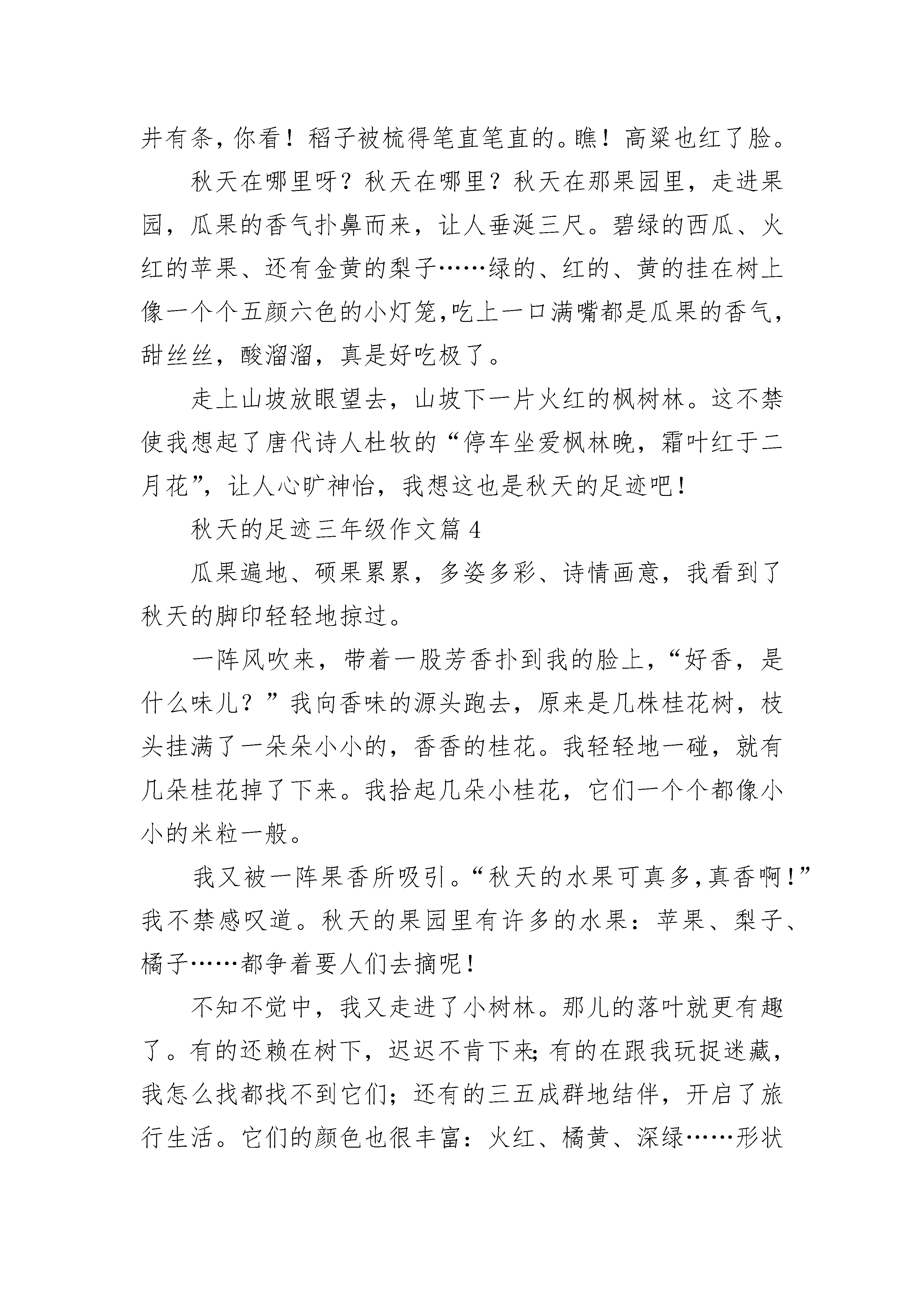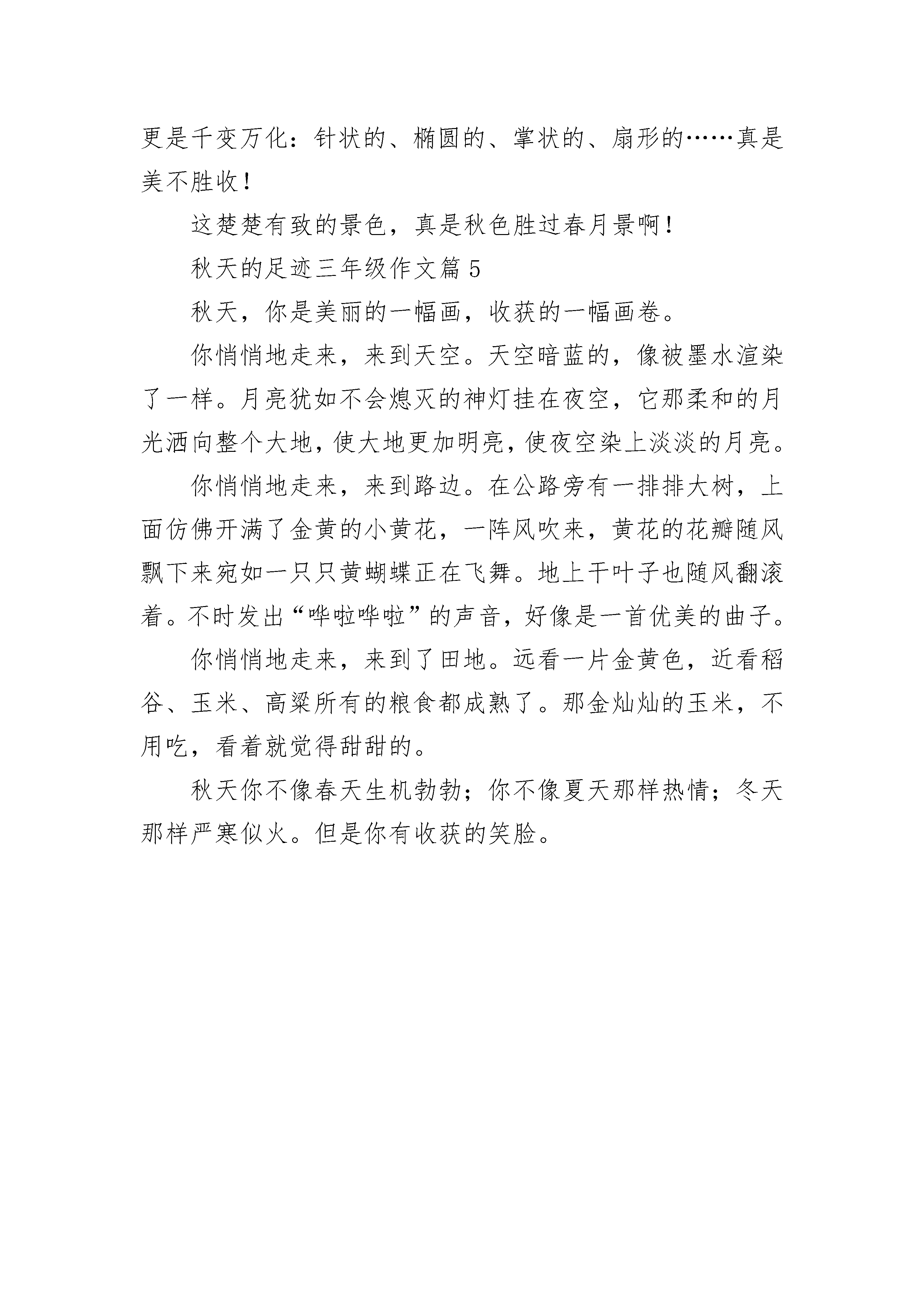 秋天的足迹三年级作文5篇不知不觉中,秋天已经穿梭在大街小巷了。瞧!大街上的男男女女换去了短裙、短裤,换上了长裤和中裤。看!一片片落叶在空中旋转。这时候秋之韵、秋之味再浓不过了。凉风微拂,却不闻知了的欢声笑语了,寂静一片。枫树红了,在山林中,那绿中的红便是枫树了,枫林像一点点火苗,在林里燃烧,在清风中舞蹈,象征着勃勃生机,菊花也开了,这是秋飘逸的轻纱。在绿叶丛中,总能看见一两朵菊花,一片片纤细的花瓣组成了一朵朵黄金的菊花,千姿百态,婀娜多姿。虽然现在的菊花在四季里都可以见到,但令人觉得没有秋天的好看,娇艳。过了一会下起了大雨,我赶紧匆匆忙忙的跑进了卧室跟奶奶说,您等会出去买菜的时候一定要记得带以下东西:伞,雨鞋,雨衣。我问奶奶,你知道了吗?奶奶说:“知道了,乖孩子。”雨没了,我往窗外一望,看见了一棵梧桐树,观察了一下发现梧桐树的叶子一直在掉。这下我终于明白了现在是秋天了。秋天的足迹三年级作文篇2刚送走热情的夏姐姐,可爱的秋姑娘,提着她那金色的长裙子悄悄地走来了。我要追随她的身影,寻找秋的踪迹。伴着秋风,我来到了乡村的田野。看,田野里的稻子,被层层稻穗压弯了腰,可稻子还是随风舞动,好似翻起了金色的波浪。田野里的高粱也开始耍小孩子脾气了,他涨红了脸,好像生气地在说:“我已经成熟了,快点来摘我,我要到外面的世界去看看啊!香甜的瓜果,勾住了我前进的脚步,走进果园,硕果累累,瓜果飘香,好一派丰收的景象。葡萄有红的、白的、淡绿的,五光十色,仿佛一颗颗彩色的玛瑙,在阳光下显得格外漂亮。石榴里的果实也来凑热闹,争先恐后地挤破”屋子“要去看看外面精彩的世界。芬芳扑鼻的桂花香,像一双无形的手,又将我拖进美丽的花园里。俗话说:”桂花香飘十里。“果然她们竟相开放出金黄色的小花,一团团、一簇簇,好似繁星点点,时不时传来阵阵沁人心脾的花香。艳丽多姿的菊花也绽开了一朵朵”笑脸“在跟秋姑娘打热乎呢!跟着秋姑娘,我一路走走停停。我找到了一个丰收的秋天,一个瓜果飘香的秋天,一个芳香四溢的秋天。秋天的足迹三年级作文篇3有的人喜欢万物复苏的春天,有的人喜欢骄阳似火的夏天,有的人喜欢白雪皑皑的冬天。而我最喜欢的是硕果累累的秋天。秋天在哪里呀?秋天在哪里?秋天在那田野里。大片大片的稻子和高粱成熟了,稻子金黄金黄的像一片片金黄的云朵,高粱火红火红的像一片火红的海。秋风把它们梳理得井井有条,你看!稻子被梳得笔直笔直的。瞧!高粱也红了脸。秋天在哪里呀?秋天在哪里?秋天在那果园里,走进果园,瓜果的香气扑鼻而来,让人垂涎三尺。碧绿的西瓜、火红的苹果、还有金黄的梨子……绿的、红的、黄的挂在树上像一个个五颜六色的小灯笼,吃上一口满嘴都是瓜果的香气,甜丝丝,酸溜溜,真是好吃极了。走上山坡放眼望去,山坡下一片火红的枫树林。这不禁使我想起了唐代诗人杜牧的“停车坐爱枫林晚,霜叶红于二月花”,让人心旷神怡,我想这也是秋天的足迹吧!秋天的足迹三年级作文篇4瓜果遍地、硕果累累,多姿多彩、诗情画意,我看到了秋天的脚印轻轻地掠过。一阵风吹来,带着一股芳香扑到我的脸上,“好香,是什么味儿?”我向香味的源头跑去,原来是几株桂花树,枝头挂满了一朵朵小小的,香香的桂花。我轻轻地一碰,就有几朵桂花掉了下来。我拾起几朵小桂花,它们一个个都像小小的米粒一般。我又被一阵果香所吸引。“秋天的水果可真多,真香啊!”我不禁感叹道。秋天的果园里有许多的水果:苹果、梨子、橘子……都争着要人们去摘呢!不知不觉中,我又走进了小树林。那儿的落叶就更有趣了。有的还赖在树下,迟迟不肯下来;有的在跟我玩捉迷藏,我怎么找都找不到它们;还有的三五成群地结伴,开启了旅行生活。它们的颜色也很丰富:火红、橘黄、深绿……形状更是千变万化:针状的、椭圆的、掌状的、扇形的……真是美不胜收!这楚楚有致的景色,真是秋色胜过春月景啊!秋天的足迹三年级作文篇5秋天,你是美丽的一幅画,收获的一幅画卷。你悄悄地走来,来到天空。天空暗蓝的,像被墨水渲染了一样。月亮犹如不会熄灭的神灯挂在夜空,它那柔和的月光洒向整个大地,使大地更加明亮,使夜空染上淡淡的月亮。你悄悄地走来,来到路边。在公路旁有一排排大树,上面仿佛开满了金黄的小黄花,一阵风吹来,黄花的花瓣随风飘下来宛如一只只黄蝴蝶正在飞舞。地上干叶子也随风翻滚着。不时发出“哗啦哗啦”的声音,好像是一首优美的曲子。你悄悄地走来,来到了田地。远看一片金黄色,近看稻谷、玉米、高粱所有的粮食都成熟了。那金灿灿的玉米,不用吃,看着就觉得甜甜的。秋天你不像春天生机勃勃;你不像夏天那样热情;冬天那样严寒似火。但是你有收获的笑脸。