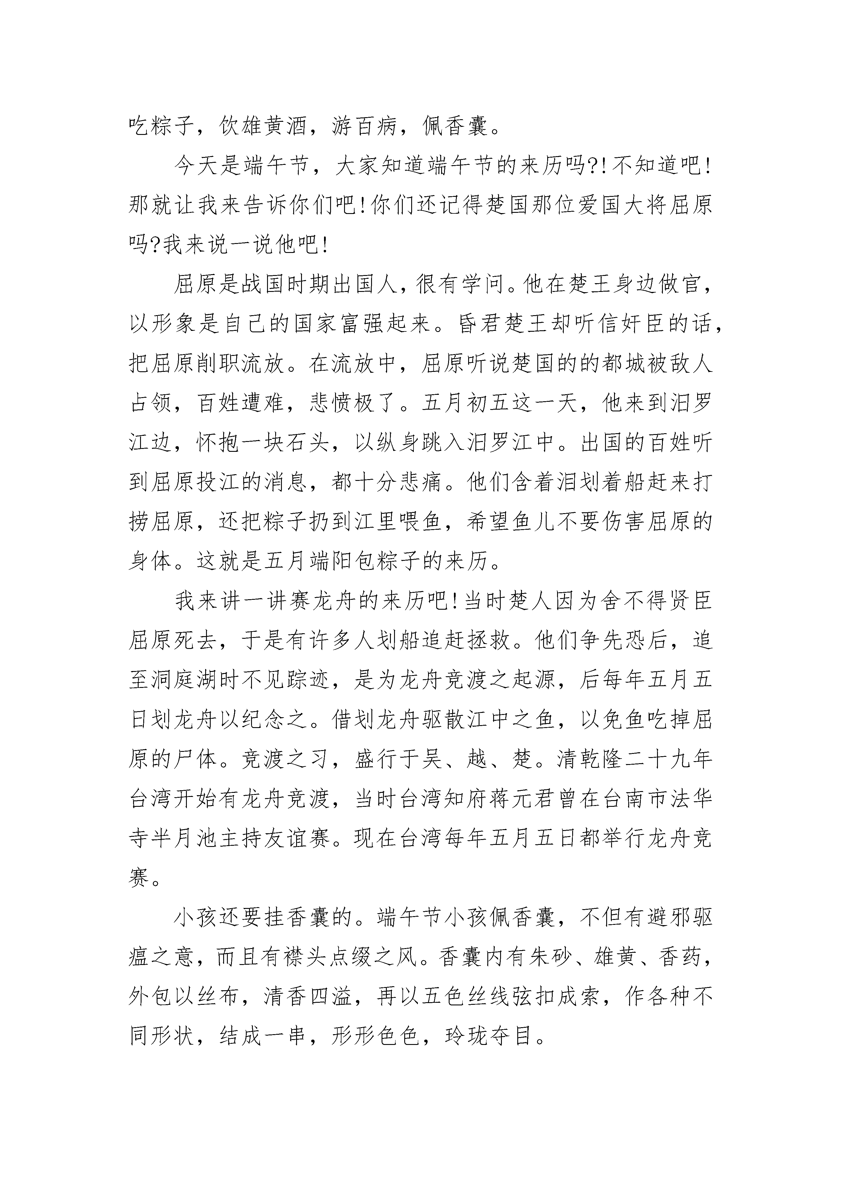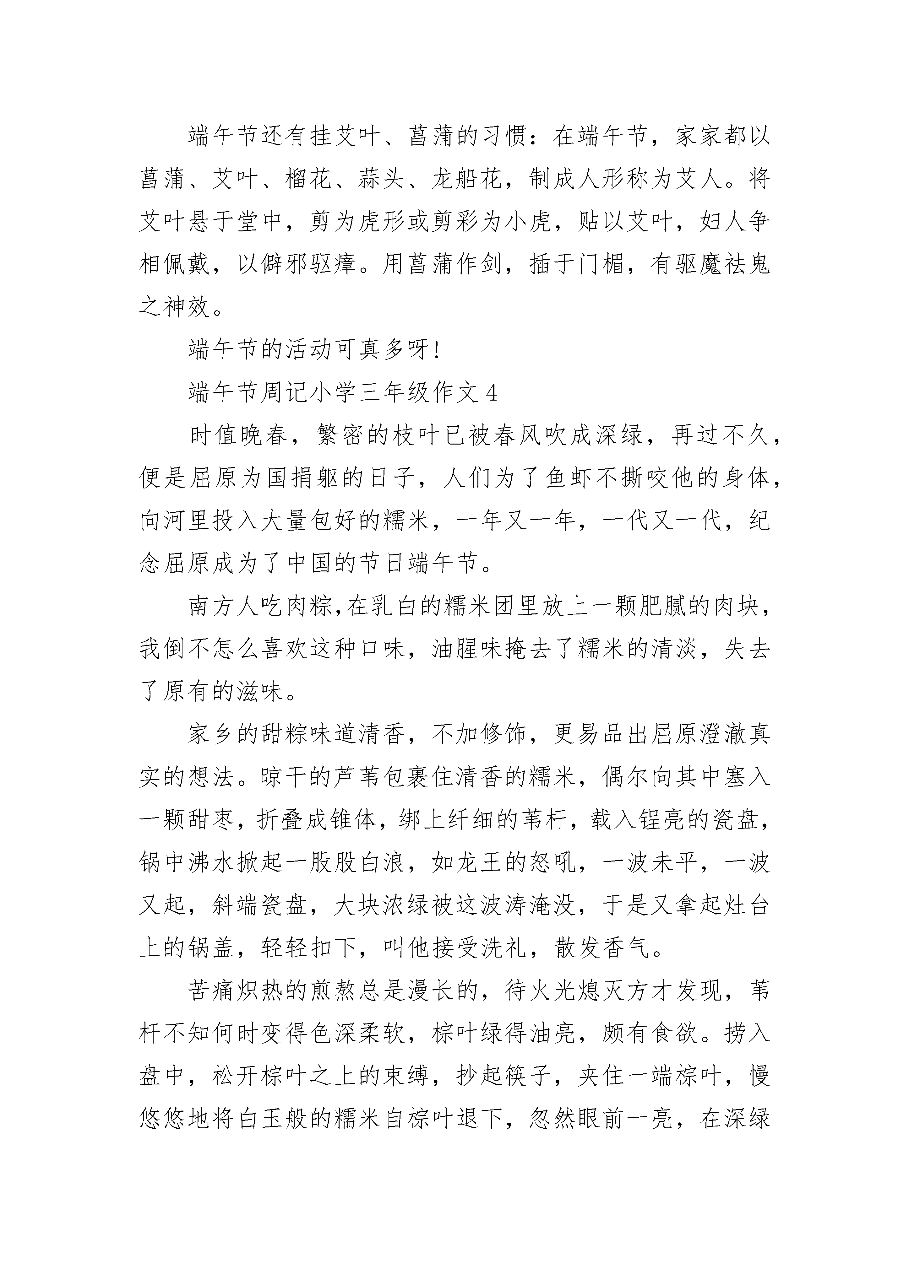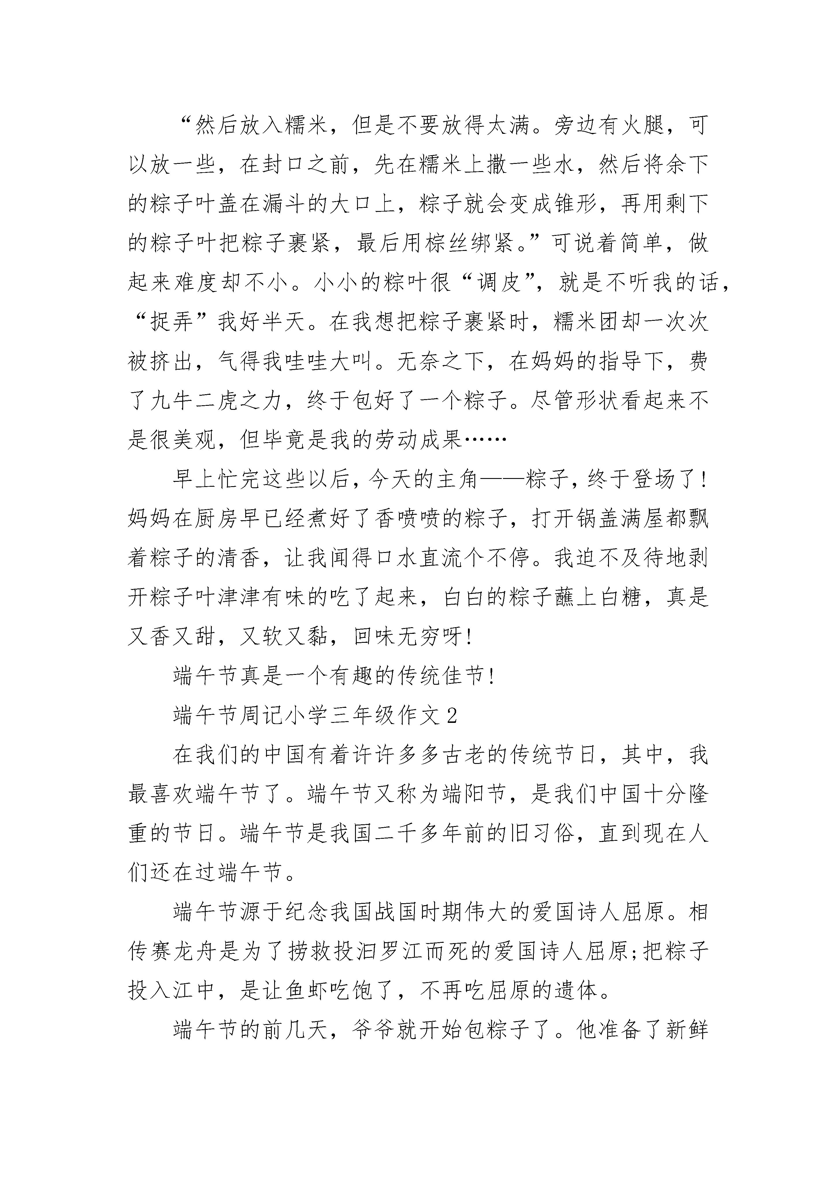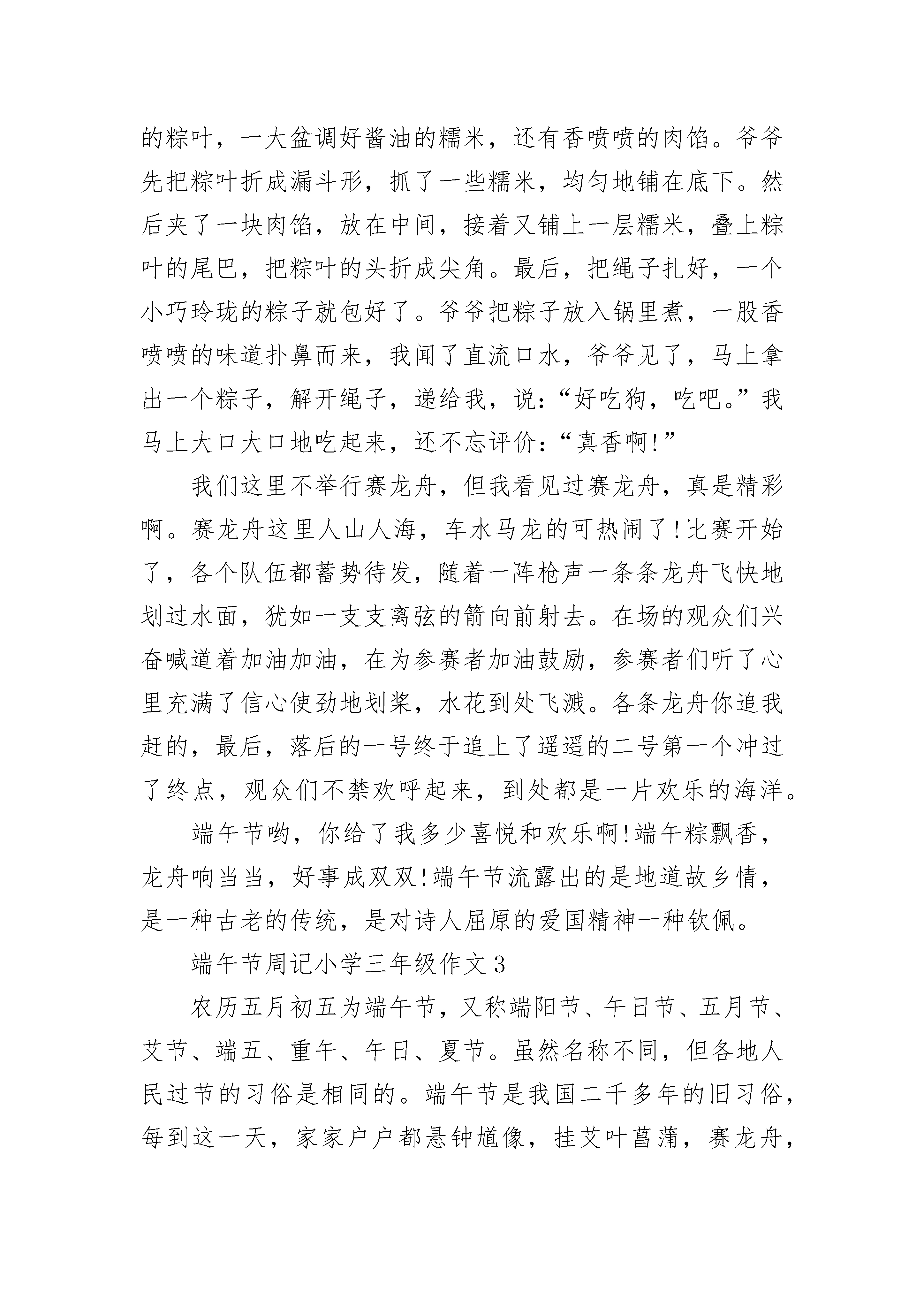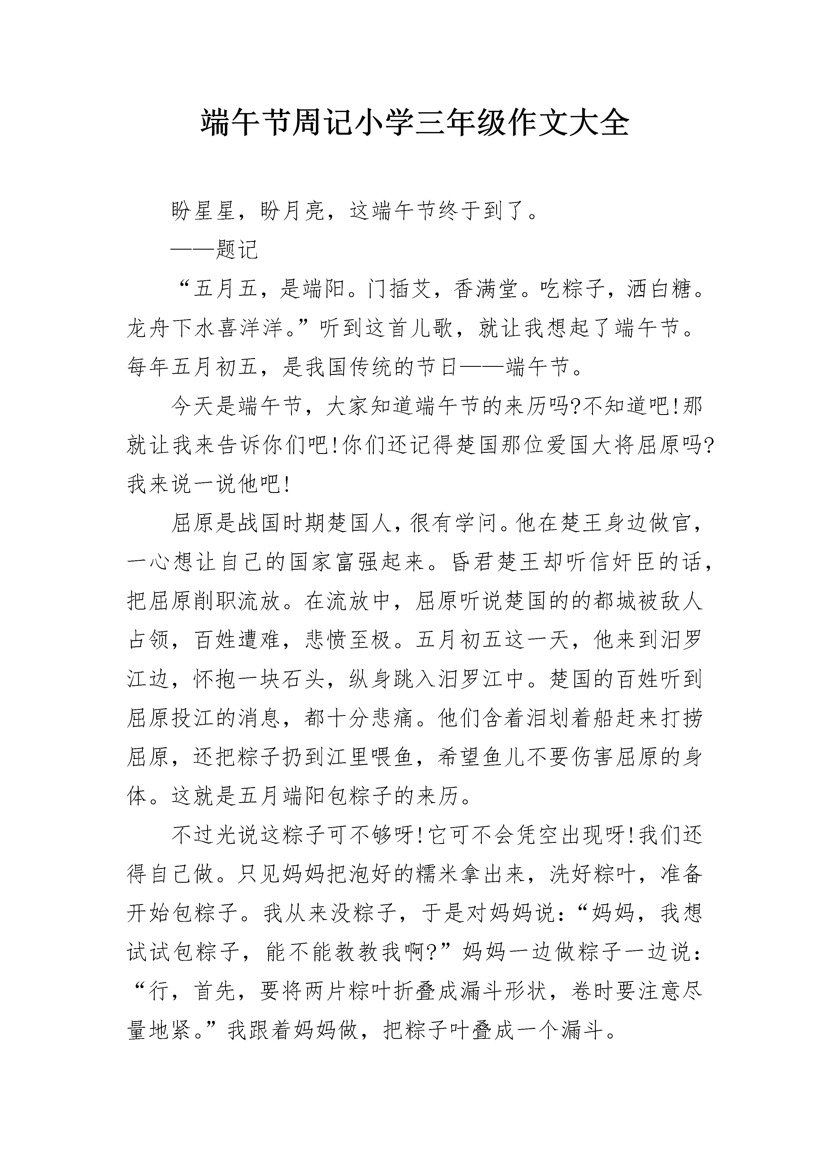 端午节周记小学三年级作文大全盼星星,盼月亮,这端午节终于到了。——题记“五月五,是端阳。门插艾,香满堂。吃粽子,洒白糖。龙舟下水喜洋洋。”听到这首儿歌,就让我想起了端午节。每年五月初五,是我国传统的节日——端午节。今天是端午节,大家知道端午节的来历吗?不知道吧!那就让我来告诉你们吧!你们还记得楚国那位爱国大将屈原吗?我来说一说他吧!屈原是战国时期楚国人,很有学问。他在楚王身边做官,一心想让自己的国家富强起来。昏君楚王却听信奸臣的话,把屈原削职流放。在流放中,屈原听说楚国的的都城被敌人占领,百姓遭难,悲愤至极。五月初五这一天,他来到汨罗江边,怀抱一块石头,纵身跳入汨罗江中。楚国的百姓听到屈原投江的消息,都十分悲痛。他们含着泪划着船赶来打捞屈原,还把粽子扔到江里喂鱼,希望鱼儿不要伤害屈原的身体。这就是五月端阳包粽子的来历。不过光说这粽子可不够呀!它可不会凭空出现呀!我们还得自己做。只见妈妈把泡好的糯米拿出来,洗好粽叶,准备开始包粽子。我从来没粽子,于是对妈妈说:“妈妈,我想试试包粽子,能不能教教我啊?”妈妈一边做粽子一边说:“行,首先,要将两片粽叶折叠成漏斗形状,卷时要注意尽量地紧。”我跟着妈妈做,把粽子叶叠成一个漏斗。“然后放入糯米,但是不要放得太满。旁边有火腿,可以放一些,在封口之前,先在糯米上撒一些水,然后将余下的粽子叶盖在漏斗的大口上,粽子就会变成锥形,再用剩下的粽子叶把粽子裹紧,最后用棕丝绑紧。”可说着简单,做起来难度却不小。小小的粽叶很“调皮”,就是不听我的话,“捉弄”我好半天。在我想把粽子裹紧时,糯米团却一次次被挤出,气得我哇哇大叫。无奈之下,在妈妈的指导下,费了九牛二虎之力,终于包好了一个粽子。尽管形状看起来不是很美观,但毕竟是我的劳动成果……早上忙完这些以后,今天的主角——粽子,终于登场了!妈妈在厨房早已经煮好了香喷喷的粽子,打开锅盖满屋都飘着粽子的清香,让我闻得口水直流个不停。我迫不及待地剥开粽子叶津津有味的吃了起来,白白的粽子蘸上白糖,真是又香又甜,又软又黏,回味无穷呀!端午节真是一个有趣的传统佳节!端午节周记小学三年级作文2在我们的中国有着许许多多古老的传统节日,其中,我最喜欢端午节了。端午节又称为端阳节,是我们中国十分隆重的节日。端午节是我国二千多年前的旧习俗,直到现在人们还在过端午节。端午节源于纪念我国战国时期伟大的爱国诗人屈原。相传赛龙舟是为了捞救投汩罗江而死的爱国诗人屈原;把粽子投入江中,是让鱼虾吃饱了,不再吃屈原的遗体。端午节的前几天,爷爷就开始包粽子了。他准备了新鲜的粽叶,一大盆调好酱油的糯米,还有香喷喷的肉馅。爷爷先把粽叶折成漏斗形,抓了一些糯米,均匀地铺在底下。然后夹了一块肉馅,放在中间,接着又铺上一层糯米,叠上粽叶的尾巴,把粽叶的头折成尖角。最后,把绳子扎好,一个小巧玲珑的粽子就包好了。爷爷把粽子放入锅里煮,一股香喷喷的味道扑鼻而来,我闻了直流口水,爷爷见了,马上拿出一个粽子,解开绳子,递给我,说:“好吃狗,吃吧。”我马上大口大口地吃起来,还不忘评价:“真香啊!”我们这里不举行赛龙舟,但我看见过赛龙舟,真是精彩啊。赛龙舟这里人山人海,车水马龙的可热闹了!比赛开始了,各个队伍都蓄势待发,随着一阵枪声一条条龙舟飞快地划过水面,犹如一支支离弦的箭向前射去。在场的观众们兴奋喊道着加油加油,在为参赛者加油鼓励,参赛者们听了心里充满了信心使劲地划桨,水花到处飞溅。各条龙舟你追我赶的,最后,落后的一号终于追上了遥遥的二号第一个冲过了终点,观众们不禁欢呼起来,到处都是一片欢乐的海洋。端午节哟,你给了我多少喜悦和欢乐啊!端午粽飘香,龙舟响当当,好事成双双!端午节流露出的是地道故乡情,是一种古老的传统,是对诗人屈原的爱国精神一种钦佩。端午节周记小学三年级作文3农历五月初五为端午节,又称端阳节、午日节、五月节、艾节、端五、重午、午日、夏节。虽然名称不同,但各地人民过节的习俗是相同的。端午节是我国二千多年的旧习俗,每到这一天,家家户户都悬钟馗像,挂艾叶菖蒲,赛龙舟,吃粽子,饮雄黄酒,游百病,佩香囊。今天是端午节,大家知道端午节的来历吗?!不知道吧!那就让我来告诉你们吧!你们还记得楚国那位爱国大将屈原吗?我来说一说他吧!屈原是战国时期出国人,很有学问。他在楚王身边做官,以形象是自己的国家富强起来。昏君楚王却听信奸臣的话,把屈原削职流放。在流放中,屈原听说楚国的的都城被敌人占领,百姓遭难,悲愤极了。五月初五这一天,他来到汨罗江边,怀抱一块石头,以纵身跳入汨罗江中。出国的百姓听到屈原投江的消息,都十分悲痛。他们含着泪划着船赶来打捞屈原,还把粽子扔到江里喂鱼,希望鱼儿不要伤害屈原的身体。这就是五月端阳包粽子的来历。我来讲一讲赛龙舟的来历吧!当时楚人因为舍不得贤臣屈原死去,于是有许多人划船追赶拯救。他们争先恐后,追至洞